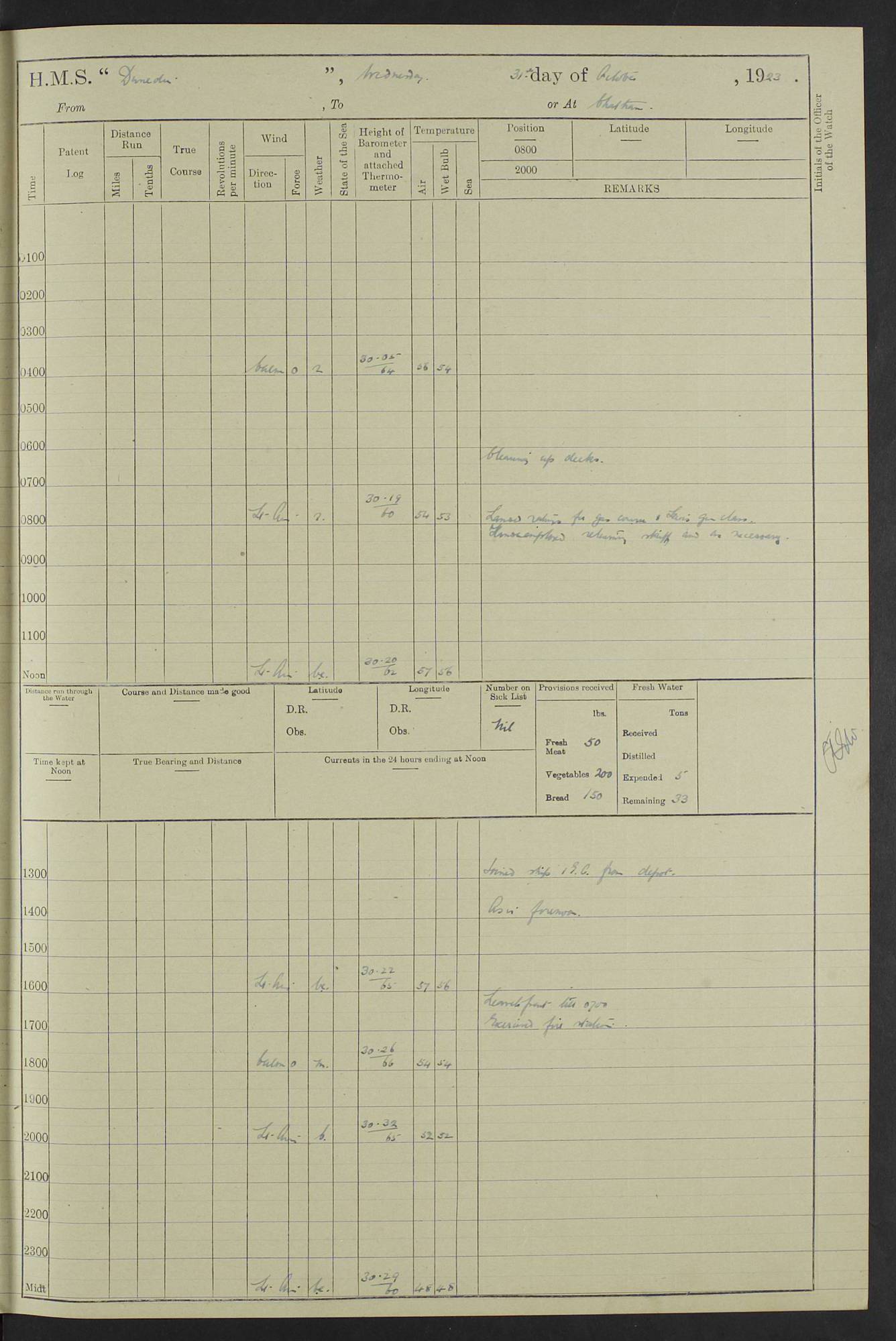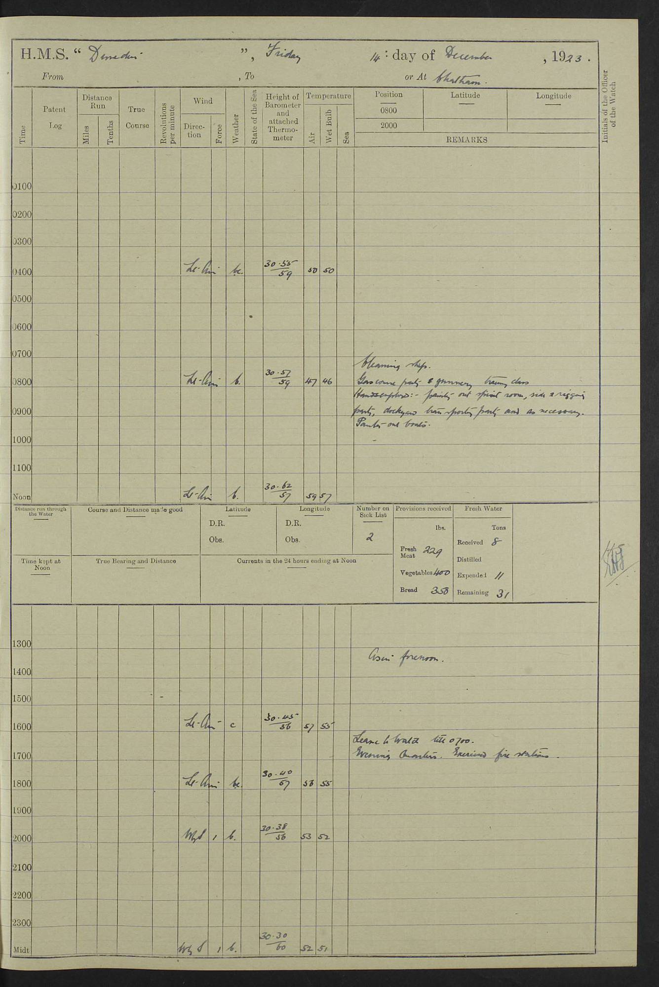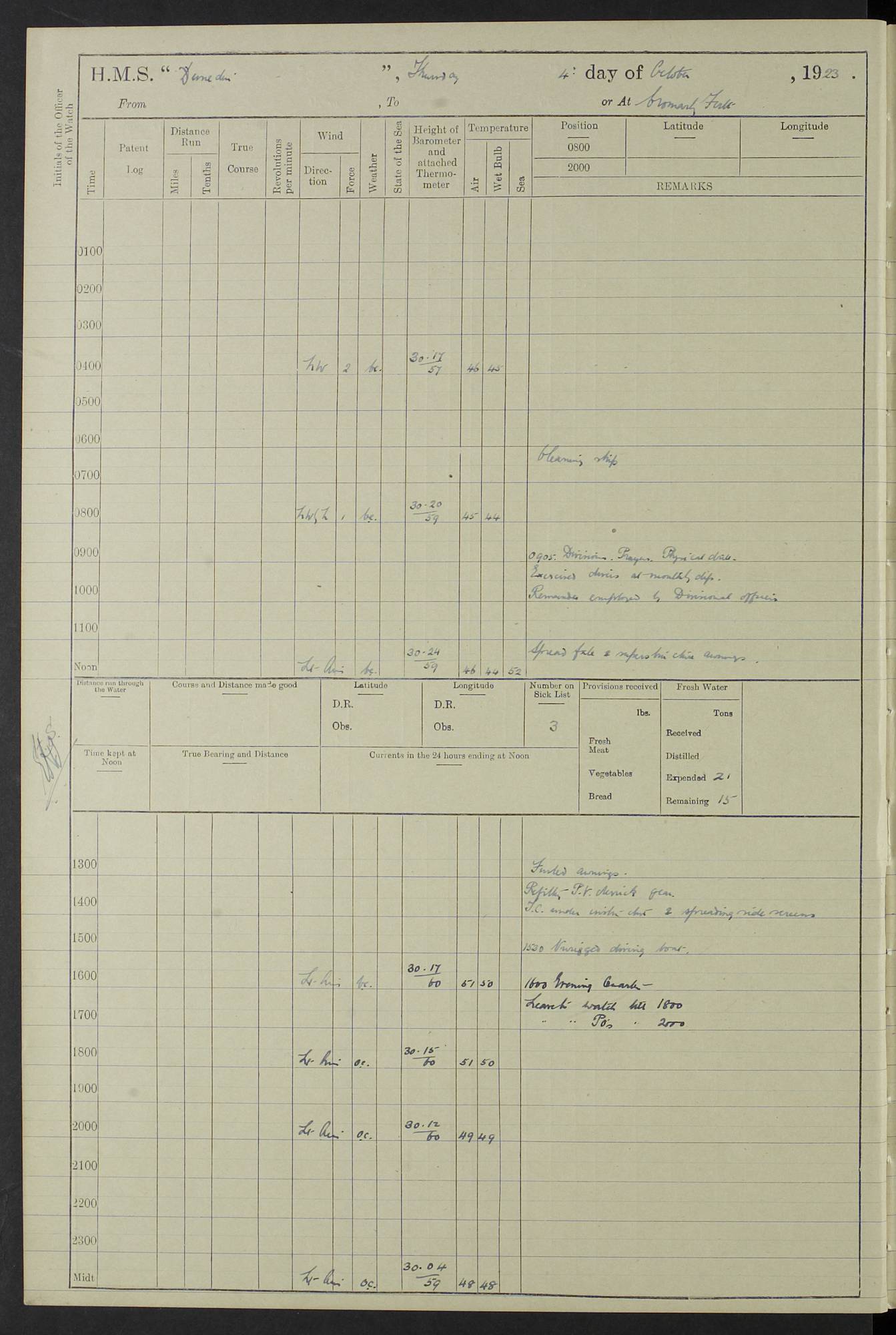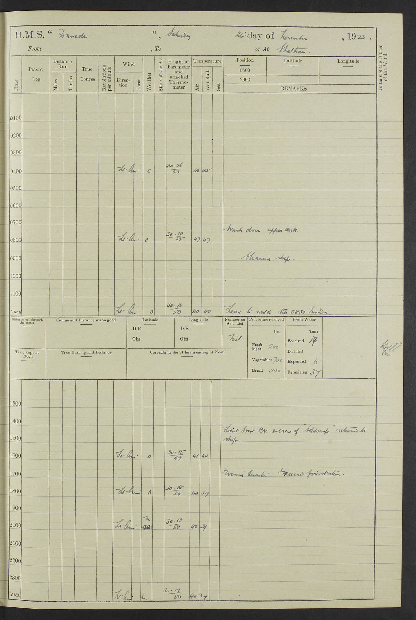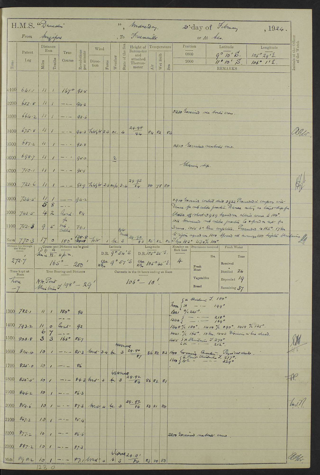 (Maps prepared using Journey Plotter, developed by Maikel. The Plots can only be approximate. They are made by joining-up positions on successive days, and sometimes positions are not given. There will therefore be occasions when the ship appears to have travelled overland) LOG BOOK – 23RD SEPTEMBER 1920 TO 13TH SEPTEMBER 1921 4caf8d9dcadfd3419703bde2: (http://oldweather.s3.amazonaws.com/ADM53-76345/ADM53-76345_0.jpg) Left front cover of Ship’s Log. 4caf8d9dcadfd3419703bde3: (http://oldweather.s3.amazonaws.com/ADM53-76345/ADM53-76345_1.jpg) Right front cover of Ship’s Log. 4caf8d97cadfd3419703bc6a: (http://oldweather.s3.amazonaws.com/ADM53-76345/ADM53-76345-002_0.jpg) 4caf8d97cadfd3419703bc6b: (http://oldweather.s3.amazonaws.com/ADM53-76345/ADM53-76345-002_1.jpg) 4caf8d97cadfd3419703bc6c: (http://oldweather.s3.amazonaws.com/ADM53-76345/ADM53-76345-003_0.jpg) 4caf8d97cadfd3419703bc6d: (http://oldweather.s3.amazonaws.com/ADM53-76345/ADM53-76345-003_1.jpg) 4caf8d97cadfd3419703bc6e: (http://oldweather.s3.amazonaws.com/ADM53-76345/ADM53-76345-004_0.jpg) Blank pages. 4caf8d97cadfd3419703bc6f: (http://oldweather.s3.amazonaws.com/ADM53-76345/ADM53-76345-004_1.jpg) S.- 321. See Articles 557, 619, 622, 924, 1025, 1026 and 1849 of the King’s Regulations, 1913. This Log is to be kept from the time the Ship is Commissioned until she is paid off; when it is to be transmitted as directed by the Admiralty Instructions. The Name and Address of the Officer to whom the acknowledgement of receipt should be sent by the Deputy Cashier in charge, Royal Victoria Yard, Deptford, is to be inserted here. Name: Commander’s Office. Address: H.M.S. Dunedin. c/o G.P.O. London. LOG of H.M.S. “Dunedin” Commanded by Captain C. Wrightson C.B.E. (till 31.3.21). Captain H.S. Monroe D.S.O. (from 31.3.21). FOR THE PERIOD Commencing: Thursday 23rd of September 1920. Ending: Tuesday 13th of September 1921. Tonnage (Displacement): 4,650 Extreme Length: 472ft 3 ins Extreme Breadth: 46 ft 0.3/8” Engines: Manufacturer: Messes R & W Hawthorn Leslie & Co Ltd. Newcastle on Tyne. I.H.P: 40.000 Forced Draught. Description: Turbine (Geared). When Fixed on Board: 1918 – 1919. Boilers: Manufacturer: Messes R & W Hawthorn Leslie & Co Ltd. Newcastle on Tyne. Description: Small tube Improved Yarrow. When made: 1918. When put in vessel: 1918. Paddle Wheels or Screw Propeller: Manufacturer: Manganese Bronze Co. Description: Solid 3 Blades Turbadium Bronze, Pitch 14 ft 3 in. General State of Repair: Satisfactory. R. Alison [?], Lieut Com (W) on paying off 30th August 1923. L. 8418/02. N.L. 15713/13. Where Built Sir W.G. Armstrong Whitworth & Co Ltd. N.L. 18227/18. Armstrong Naval Yard, High Walker, Newcastle on Tyne. Sta. 127/10. Commenced building November 1917, Launched 19 November 1918. N.L. 22782/19. Completed September 1919. 4caf8d98cadfd3419703bc70: (http://oldweather.s3.amazonaws.com/ADM53-76345/ADM53-76345-005_0.jpg) Directions (See King’s Regulations 1913, Articles 1025 and 1849). 1. King’s Regulations. 2. Figures to indicate the Force of the Wind. 3. Letters to denote the State of the Weather. 4. Scale of Fog Intensity. 5. Sea Disturbance Scale 4caf8d98cadfd3419703bc71: (http://oldweather.s3.amazonaws.com/ADM53-76345/ADM53-76345-005_1.jpg) Establishment of Ship’s Company Officers 23 Seamen 187 Boys 36 Marines 46 Engine-room Establishment 105 Other non-executive ratings 44 Total 441 ARMAMENT Position Forecastle: 6” Calibre XII on C.P. XIV mounting. Superstructure: Four 6” Calibre XII on C.P. XIV mountings. Superstructure: Two 3” QF Calibre High Angle mountings, Quarterdeck: 6” Calibre XII on C.P. XIV mountings. Torpedo Armaments Four above water 21” triple tubes. BAROMETER Mercurial or Aneroid: Mercurial. Name of Maker and number: J. Hitchins 101 A747. Height of cistern above sea: 13ft. Error of Mercurial Barometer: Nil at 30.00. Thermometers for Air Temperature. Position on Ship: On fore bridge. Whether in screen: Yes. Maker and No. Negretti & Zambra From: 7.10.19 To: Sept. 1921. Negretti & Zambra No. 10499 Negretti & Zambra No 10391 From: 7.10.19 To: Sept. 1921. Thermometer for Sea Temperature. A. Harper & Sons 7.10.19 POSITION OF STANDARD COMPASS. Manoeuvring Platform. (Fore bridge) BOATS Number of each carried: 1 x 30ft. motor boat. 2 x 32ft. cutters. 1 x 30ft gig. 2 x 27ft whalers. 2 x 16 ft dinghies. MISCELLANEOUS INFORMATION Draught of water with Bunkers full, and complete with provisions, Stores and water: Forward 16 ft 1 inch; Aft 16 ft 11 inches. Number of Tons necessary to increase draught 1 inch: 35.6. Number of Tons of Coal Carried: 16. Number of Tons of Oil Fuel carried: 1127. Quantity of Water Carried (a) For Boilers: 157 tons. (b) For Drinking: 56½ tons. LOGS FOR SEPTEMBER 1920 4caf8d98cadfd3419703bc72: (http://oldweather.s3.amazonaws.com/ADM53-76345/ADM53-76345-006_0.jpg) 23 September 1920 At Copenhagen. Lat 55.694, Long 12.603 4.00am: Signal books correct. am: Hands employed cleaning ship. 8.00am: Signal books correct. am: Sent coaling party to S.S. “Volo”. am: X & Y 6” guns crews at loader drill, remainder of hands employed as requisite. am: Coaling party returned. Noon: Signal books correct. 1.15pm: Sent coaling party to S.S. “Volo”. pm: 1 Rating joined ship from hospital. pm: Boys & training classes under instruction, remainder of hands employed as requisite. 3.00pm: U.S.S. “Gilmer” arrived. [Gilmer, U.S. Destroyer, Flush Decker, launched 18/7/19, Guns: 4 x 5”, 51 cal.,1 x 3”, 23 cal. AA, 12 x 21” TT’s in 4 triple deck mountings. Disp: 1,215 tons, SHP: 26,000 = 35 knots. Jane’s Fighting Ships 1919. Image]. 4.00pm: Signal books correct. pm: Coaling party returned. 8.00pm: Signal books correct. Midnight: Signal books correct. 4caf8d98cadfd3419703bc73: (http://oldweather.s3.amazonaws.com/ADM53-76345/ADM53-76345-006_1.jpg) 24 September 1920 At Copenhagen. Lat 55.694, Long 12.603 4.00am: Signal books correct. am: Hands employed cleaning ship. 6.15am: U.S.S. “Sh