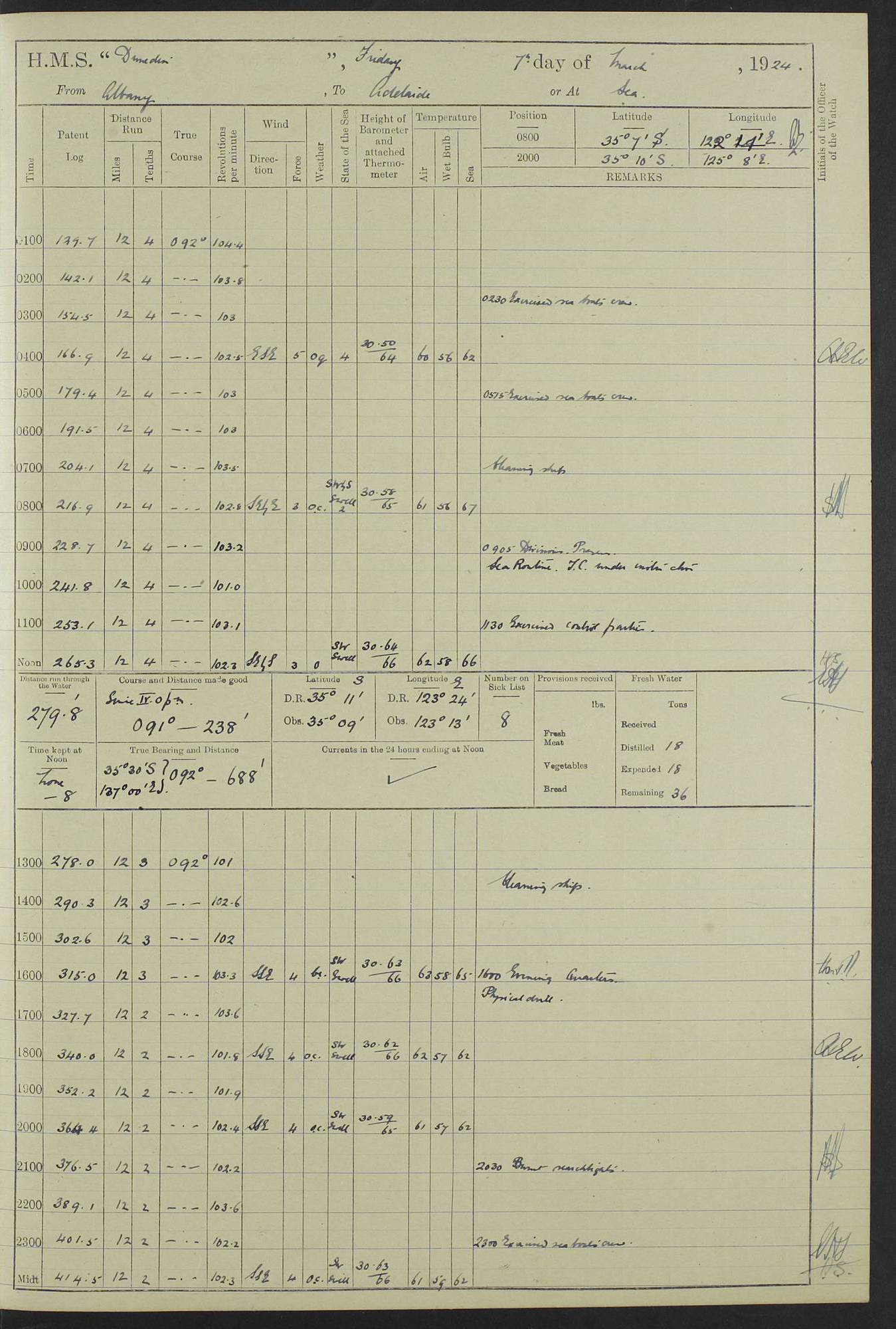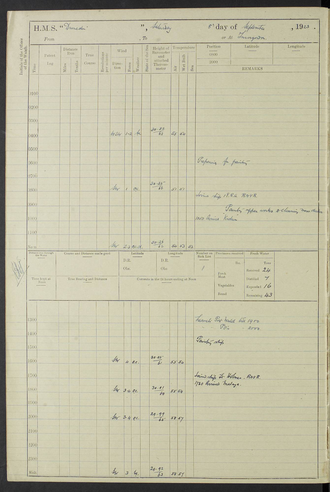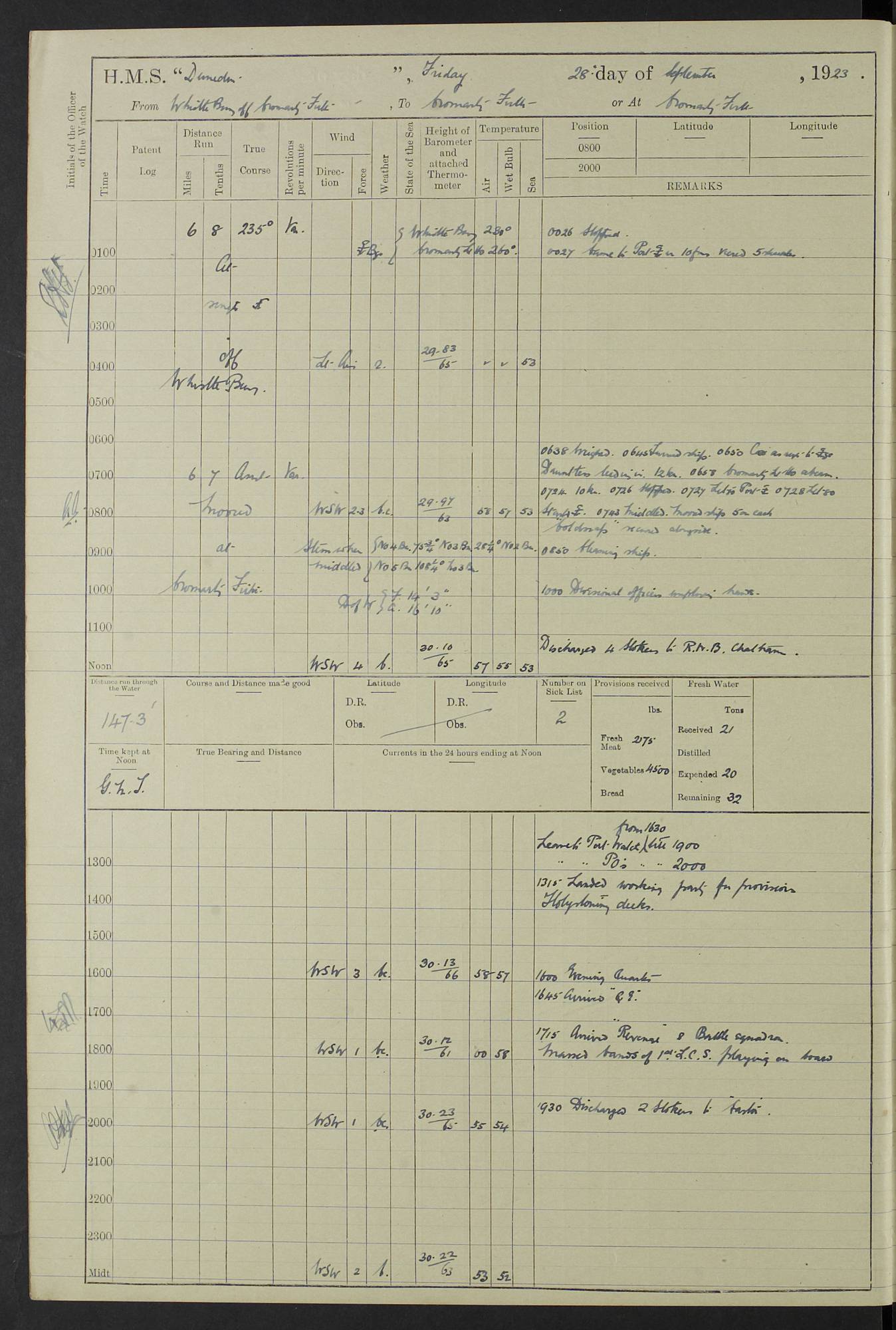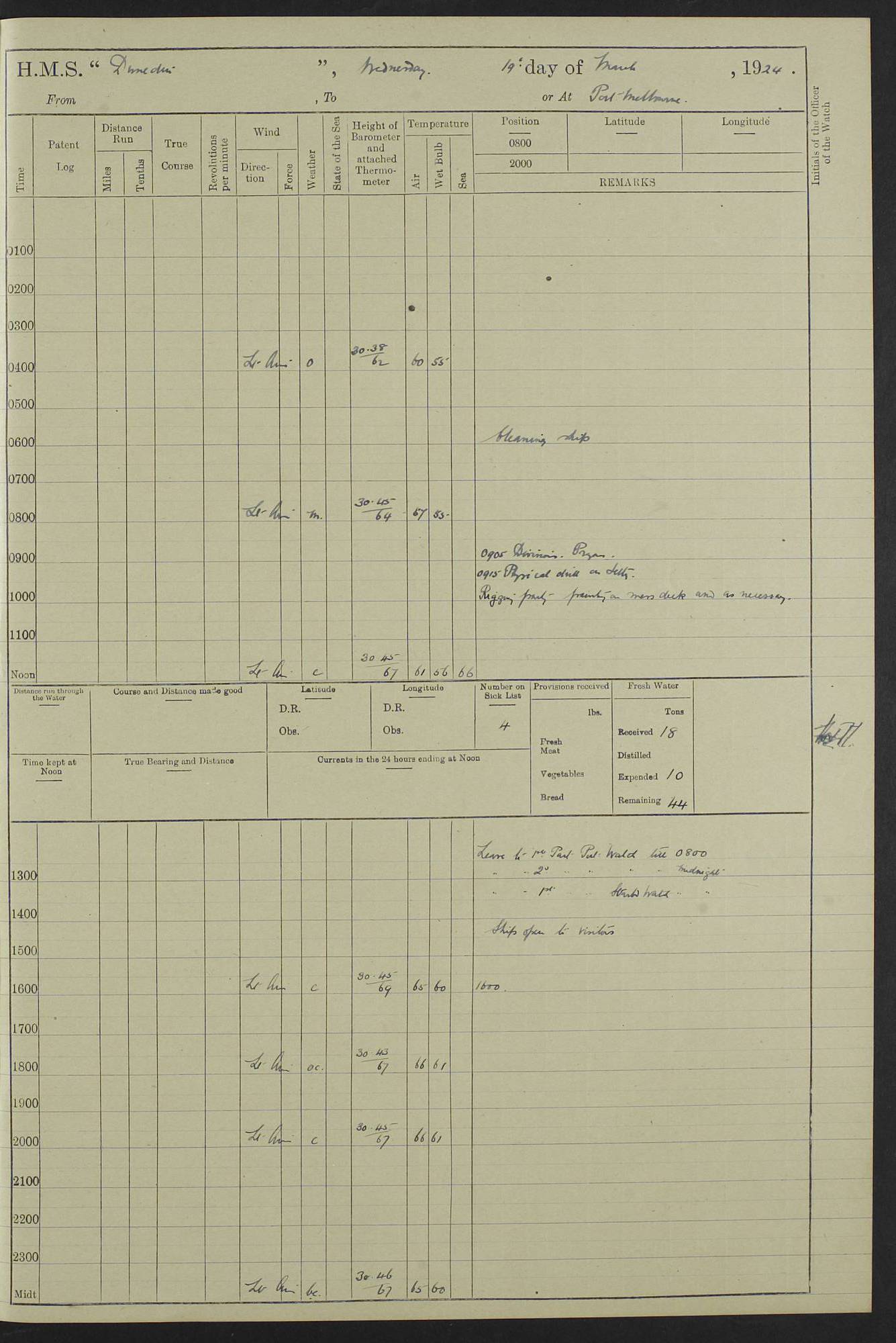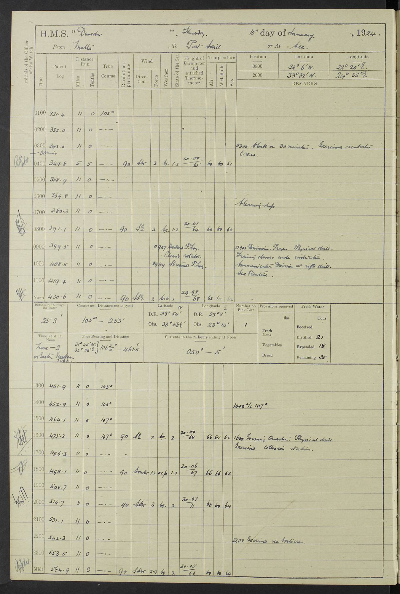 (Maps prepared using Journey Plotter, developed by Maikel. The Plots can only be approximate. They are made by joining-up positions on successive days, and sometimes positions are not given. There will therefore be occasions when the ship appears to have travelled overland) LOG BOOK – 23RD SEPTEMBER 1920 TO 13TH SEPTEMBER 1921 4caf8d9dcadfd3419703bde2: (http://oldweather.s3.amazonaws.com/ADM53-76345/ADM53-76345_0.jpg) Left front cover of Ship’s Log. 4caf8d9dcadfd3419703bde3: (http://oldweather.s3.amazonaws.com/ADM53-76345/ADM53-76345_1.jpg) Right front cover of Ship’s Log. 4caf8d97cadfd3419703bc6a: (http://oldweather.s3.amazonaws.com/ADM53-76345/ADM53-76345-002_0.jpg) 4caf8d97cadfd3419703bc6b: (http://oldweather.s3.amazonaws.com/ADM53-76345/ADM53-76345-002_1.jpg) 4caf8d97cadfd3419703bc6c: (http://oldweather.s3.amazonaws.com/ADM53-76345/ADM53-76345-003_0.jpg) 4caf8d97cadfd3419703bc6d: (http://oldweather.s3.amazonaws.com/ADM53-76345/ADM53-76345-003_1.jpg) 4caf8d97cadfd3419703bc6e: (http://oldweather.s3.amazonaws.com/ADM53-76345/ADM53-76345-004_0.jpg) Blank pages. 4caf8d97cadfd3419703bc6f: (http://oldweather.s3.amazonaws.com/ADM53-76345/ADM53-76345-004_1.jpg) S.- 321. See Articles 557, 619, 622, 924, 1025, 1026 and 1849 of the King’s Regulations, 1913. This Log is to be kept from the time the Ship is Commissioned until she is paid off; when it is to be transmitted as directed by the Admiralty Instructions. The Name and Address of the Officer to whom the acknowledgement of receipt should be sent by the Deputy Cashier in charge, Royal Victoria Yard, Deptford, is to be inserted here. Name: Commander’s Office. Address: H.M.S. Dunedin. c/o G.P.O. London. LOG of H.M.S. “Dunedin” Commanded by Captain C. Wrightson C.B.E. (till 31.3.21). Captain H.S. Monroe D.S.O. (from 31.3.21). FOR THE PERIOD Commencing: Thursday 23rd of September 1920. Ending: Tuesday 13th of September 1921. Tonnage (Displacement): 4,650 Extreme Length: 472ft 3 ins Extreme Breadth: 46 ft 0.3/8” Engines: Manufacturer: Messes R & W Hawthorn Leslie & Co Ltd. Newcastle on Tyne. I.H.P: 40.000 Forced Draught. Description: Turbine (Geared). When Fixed on Board: 1918 – 1919. Boilers: Manufacturer: Messes R & W Hawthorn Leslie & Co Ltd. Newcastle on Tyne. Description: Small tube Improved Yarrow. When made: 1918. When put in vessel: 1918. Paddle Wheels or Screw Propeller: Manufacturer: Manganese Bronze Co. Description: Solid 3 Blades Turbadium Bronze, Pitch 14 ft 3 in. General State of Repair: Satisfactory. R. Alison [?], Lieut Com (W) on paying off 30th August 1923. L. 8418/02. N.L. 15713/13. Where Built Sir W.G. Armstrong Whitworth & Co Ltd. N.L. 18227/18. Armstrong Naval Yard, High Walker, Newcastle on Tyne. Sta. 127/10. Commenced building November 1917, Launched 19 November 1918. N.L. 22782/19. Completed September 1919. 4caf8d98cadfd3419703bc70: (http://oldweather.s3.amazonaws.com/ADM53-76345/ADM53-76345-005_0.jpg) Directions (See King’s Regulations 1913, Articles 1025 and 1849). 1. King’s Regulations. 2. Figures to indicate the Force of the Wind. 3. Letters to denote the State of the Weather. 4. Scale of Fog Intensity. 5. Sea Disturbance Scale 4caf8d98cadfd3419703bc71: (http://oldweather.s3.amazonaws.com/ADM53-76345/ADM53-76345-005_1.jpg) Establishment of Ship’s Company Officers 23 Seamen 187 Boys 36 Marines 46 Engine-room Establishment 105 Other non-executive ratings 44 Total 441 ARMAMENT Position Forecastle: 6” Calibre XII on C.P. XIV mounting. Superstructure: Four 6” Calibre XII on C.P. XIV mountings. Superstructure: Two 3” QF Calibre High Angle mountings, Quarterdeck: 6” Calibre XII on C.P. XIV mountings. Torpedo Armaments Four above water 21” triple tubes. BAROMETER Mercurial or Aneroid: Mercurial. Name of Maker and number: J. Hitchins 101 A747. Height of cistern above sea: 13ft. Error of Mercurial Barometer: Nil at 30.00. Thermometers for Air Temperature. Position on Ship: On fore bridge. Whether in screen: Yes. Maker and No. Negretti & Zambra From: 7.10.19 To: Sept. 1921. Negretti & Zambra No. 10499 Negretti & Zambra No 10391 From: 7.10.19 To: Sept. 1921. Thermometer for Sea Temperature. A. Harper & Sons 7.10.19 POSITION OF STANDARD COMPASS. Manoeuvring Platform. (Fore bridge) BOATS Number of each carried: 1 x 30ft. motor boat. 2 x 32ft. cutters. 1 x 30ft gig. 2 x 27ft whalers. 2 x 16 ft dinghies. MISCELLANEOUS INFORMATION Draught of water with Bunkers full, and complete with provisions, Stores and water: Forward 16 ft 1 inch; Aft 16 ft 11 inches. Number of Tons necessary to increase draught 1 inch: 35.6. Number of Tons of Coal Carried: 16. Number of Tons of Oil Fuel carried: 1127. Quantity of Water Carried (a) For Boilers: 157 tons. (b) For Drinking: 56½ tons. LOGS FOR SEPTEMBER 1920 4caf8d98cadfd3419703bc72: (http://oldweather.s3.amazonaws.com/ADM53-76345/ADM53-76345-006_0.jpg) 23 September 1920 At Copenhagen. Lat 55.694, Long 12.603 4.00am: Signal books correct. am: Hands employed cleaning ship. 8.00am: Signal books correct. am: Sent coaling party to S.S. “Volo”. am: X & Y 6” guns crews at loader drill, remainder of hands employed as requisite. am: Coaling party returned. Noon: Signal books correct. 1.15pm: Sent coaling party to S.S. “Volo”. pm: 1 Rating joined ship from hospital. pm: Boys & training classes under instruction, remainder of hands employed as requisite. 3.00pm: U.S.S. “Gilmer” arrived. [Gilmer, U.S. Destroyer, Flush Decker, launched 18/7/19, Guns: 4 x 5”, 51 cal.,1 x 3”, 23 cal. AA, 12 x 21” TT’s in 4 triple deck mountings. Disp: 1,215 tons, SHP: 26,000 = 35 knots. Jane’s Fighting Ships 1919. Image]. 4.00pm: Signal books correct. pm: Coaling party returned. 8.00pm: Signal books correct. Midnight: Signal books correct. 4caf8d98cadfd3419703bc73: (http://oldweather.s3.amazonaws.com/ADM53-76345/ADM53-76345-006_1.jpg) 24 September 1920 At Copenhagen. Lat 55.694, Long 12.603 4.00am: Signal books correct. am: Hands employed cleaning ship. 6.15am: U.S.S. “Sh