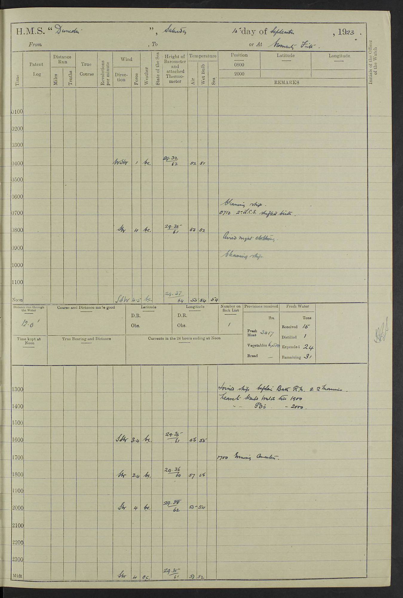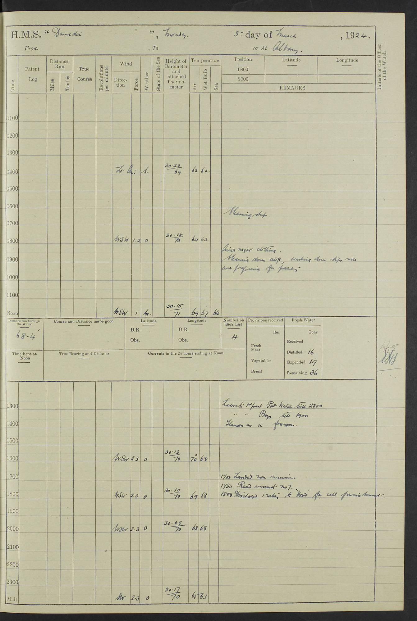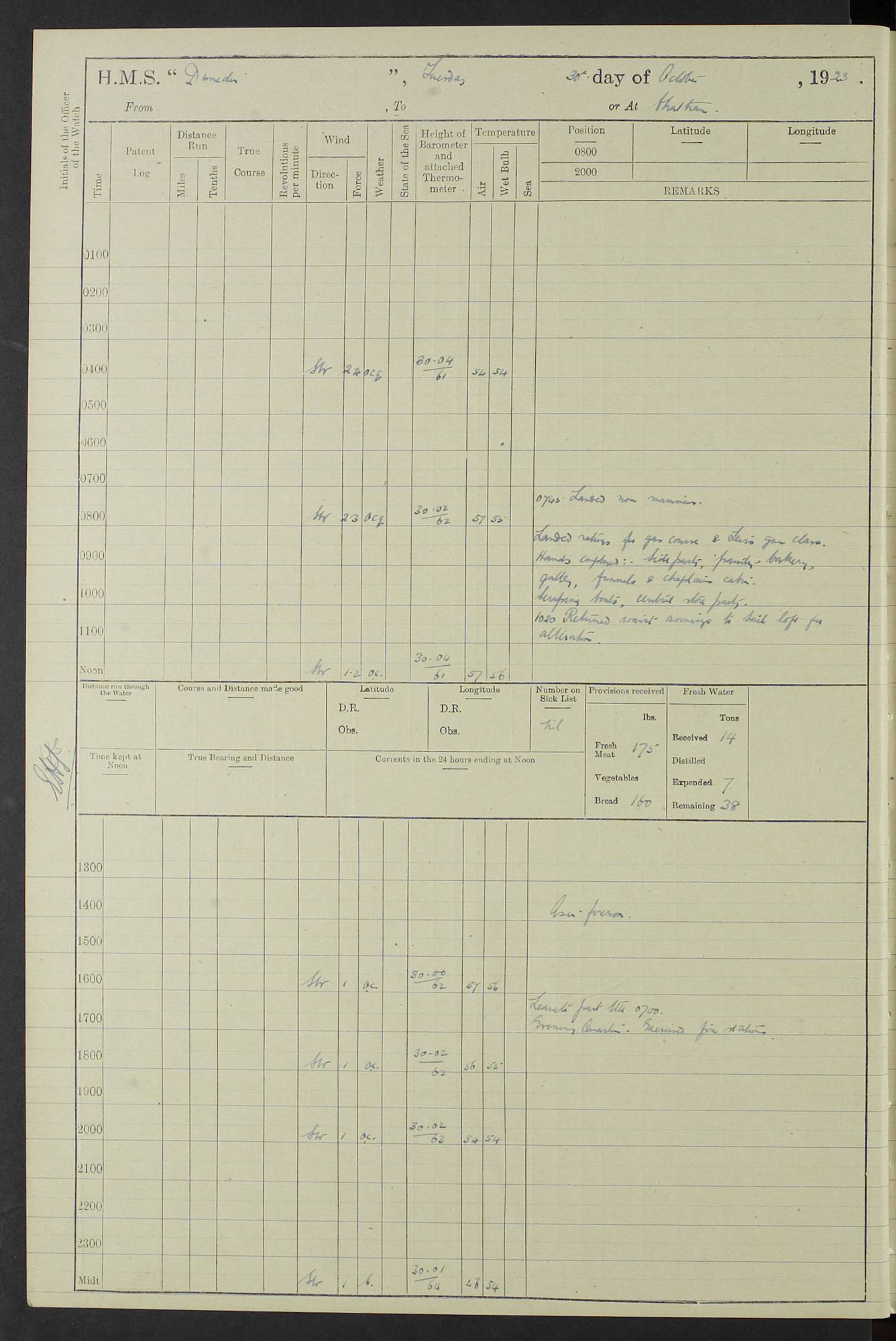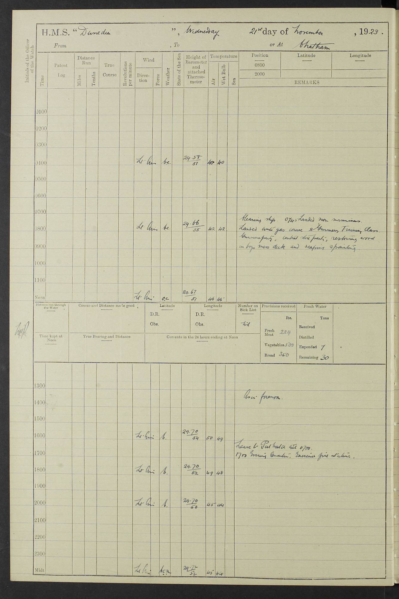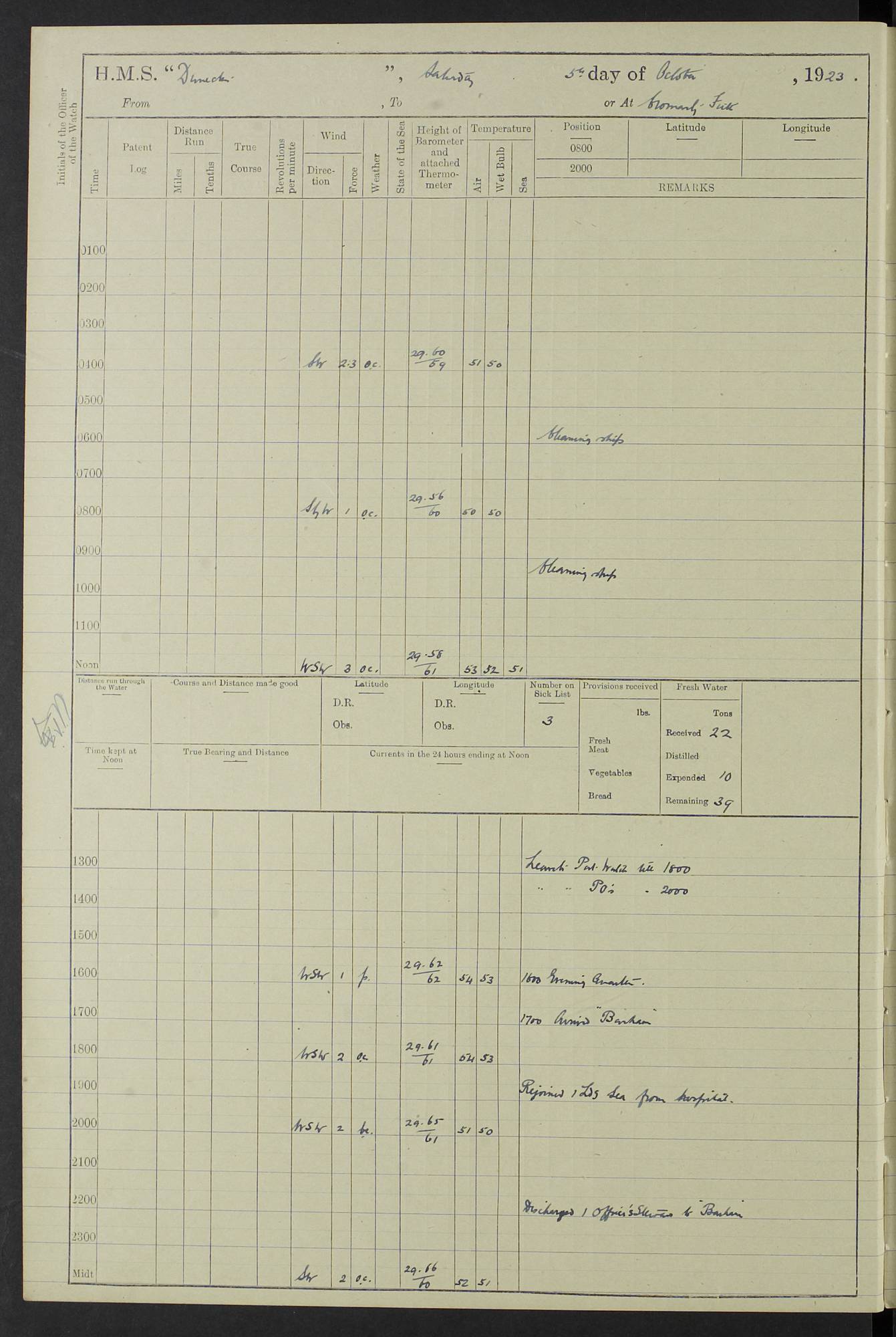 (Maps prepared using Journey Plotter, developed by Maikel. The Plots can only be approximate. They are made by joining-up positions on successive days, and sometimes positions are not given. There will therefore be occasions when the ship appears to have travelled overland) LOG BOOK – 23RD SEPTEMBER 1920 TO 13TH SEPTEMBER 1921 4caf8d9dcadfd3419703bde2: (http://oldweather.s3.amazonaws.com/ADM53-76345/ADM53-76345_0.jpg) Left front cover of Ship’s Log. 4caf8d9dcadfd3419703bde3: (http://oldweather.s3.amazonaws.com/ADM53-76345/ADM53-76345_1.jpg) Right front cover of Ship’s Log. 4caf8d97cadfd3419703bc6a: (http://oldweather.s3.amazonaws.com/ADM53-76345/ADM53-76345-002_0.jpg) 4caf8d97cadfd3419703bc6b: (http://oldweather.s3.amazonaws.com/ADM53-76345/ADM53-76345-002_1.jpg) 4caf8d97cadfd3419703bc6c: (http://oldweather.s3.amazonaws.com/ADM53-76345/ADM53-76345-003_0.jpg) 4caf8d97cadfd3419703bc6d: (http://oldweather.s3.amazonaws.com/ADM53-76345/ADM53-76345-003_1.jpg) 4caf8d97cadfd3419703bc6e: (http://oldweather.s3.amazonaws.com/ADM53-76345/ADM53-76345-004_0.jpg) Blank pages. 4caf8d97cadfd3419703bc6f: (http://oldweather.s3.amazonaws.com/ADM53-76345/ADM53-76345-004_1.jpg) S.- 321. See Articles 557, 619, 622, 924, 1025, 1026 and 1849 of the King’s Regulations, 1913. This Log is to be kept from the time the Ship is Commissioned until she is paid off; when it is to be transmitted as directed by the Admiralty Instructions. The Name and Address of the Officer to whom the acknowledgement of receipt should be sent by the Deputy Cashier in charge, Royal Victoria Yard, Deptford, is to be inserted here. Name: Commander’s Office. Address: H.M.S. Dunedin. c/o G.P.O. London. LOG of H.M.S. “Dunedin” Commanded by Captain C. Wrightson C.B.E. (till 31.3.21). Captain H.S. Monroe D.S.O. (from 31.3.21). FOR THE PERIOD Commencing: Thursday 23rd of September 1920. Ending: Tuesday 13th of September 1921. Tonnage (Displacement): 4,650 Extreme Length: 472ft 3 ins Extreme Breadth: 46 ft 0.3/8” Engines: Manufacturer: Messes R & W Hawthorn Leslie & Co Ltd. Newcastle on Tyne. I.H.P: 40.000 Forced Draught. Description: Turbine (Geared). When Fixed on Board: 1918 – 1919. Boilers: Manufacturer: Messes R & W Hawthorn Leslie & Co Ltd. Newcastle on Tyne. Description: Small tube Improved Yarrow. When made: 1918. When put in vessel: 1918. Paddle Wheels or Screw Propeller: Manufacturer: Manganese Bronze Co. Description: Solid 3 Blades Turbadium Bronze, Pitch 14 ft 3 in. General State of Repair: Satisfactory. R. Alison [?], Lieut Com (W) on paying off 30th August 1923. L. 8418/02. N.L. 15713/13. Where Built Sir W.G. Armstrong Whitworth & Co Ltd. N.L. 18227/18. Armstrong Naval Yard, High Walker, Newcastle on Tyne. Sta. 127/10. Commenced building November 1917, Launched 19 November 1918. N.L. 22782/19. Completed September 1919. 4caf8d98cadfd3419703bc70: (http://oldweather.s3.amazonaws.com/ADM53-76345/ADM53-76345-005_0.jpg) Directions (See King’s Regulations 1913, Articles 1025 and 1849). 1. King’s Regulations. 2. Figures to indicate the Force of the Wind. 3. Letters to denote the State of the Weather. 4. Scale of Fog Intensity. 5. Sea Disturbance Scale 4caf8d98cadfd3419703bc71: (http://oldweather.s3.amazonaws.com/ADM53-76345/ADM53-76345-005_1.jpg) Establishment of Ship’s Company Officers 23 Seamen 187 Boys 36 Marines 46 Engine-room Establishment 105 Other non-executive ratings 44 Total 441 ARMAMENT Position Forecastle: 6” Calibre XII on C.P. XIV mounting. Superstructure: Four 6” Calibre XII on C.P. XIV mountings. Superstructure: Two 3” QF Calibre High Angle mountings, Quarterdeck: 6” Calibre XII on C.P. XIV mountings. Torpedo Armaments Four above water 21” triple tubes. BAROMETER Mercurial or Aneroid: Mercurial. Name of Maker and number: J. Hitchins 101 A747. Height of cistern above sea: 13ft. Error of Mercurial Barometer: Nil at 30.00. Thermometers for Air Temperature. Position on Ship: On fore bridge. Whether in screen: Yes. Maker and No. Negretti & Zambra From: 7.10.19 To: Sept. 1921. Negretti & Zambra No. 10499 Negretti & Zambra No 10391 From: 7.10.19 To: Sept. 1921. Thermometer for Sea Temperature. A. Harper & Sons 7.10.19 POSITION OF STANDARD COMPASS. Manoeuvring Platform. (Fore bridge) BOATS Number of each carried: 1 x 30ft. motor boat. 2 x 32ft. cutters. 1 x 30ft gig. 2 x 27ft whalers. 2 x 16 ft dinghies. MISCELLANEOUS INFORMATION Draught of water with Bunkers full, and complete with provisions, Stores and water: Forward 16 ft 1 inch; Aft 16 ft 11 inches. Number of Tons necessary to increase draught 1 inch: 35.6. Number of Tons of Coal Carried: 16. Number of Tons of Oil Fuel carried: 1127. Quantity of Water Carried (a) For Boilers: 157 tons. (b) For Drinking: 56½ tons. LOGS FOR SEPTEMBER 1920 4caf8d98cadfd3419703bc72: (http://oldweather.s3.amazonaws.com/ADM53-76345/ADM53-76345-006_0.jpg) 23 September 1920 At Copenhagen. Lat 55.694, Long 12.603 4.00am: Signal books correct. am: Hands employed cleaning ship. 8.00am: Signal books correct. am: Sent coaling party to S.S. “Volo”. am: X & Y 6” guns crews at loader drill, remainder of hands employed as requisite. am: Coaling party returned. Noon: Signal books correct. 1.15pm: Sent coaling party to S.S. “Volo”. pm: 1 Rating joined ship from hospital. pm: Boys & training classes under instruction, remainder of hands employed as requisite. 3.00pm: U.S.S. “Gilmer” arrived. [Gilmer, U.S. Destroyer, Flush Decker, launched 18/7/19, Guns: 4 x 5”, 51 cal.,1 x 3”, 23 cal. AA, 12 x 21” TT’s in 4 triple deck mountings. Disp: 1,215 tons, SHP: 26,000 = 35 knots. Jane’s Fighting Ships 1919. Image]. 4.00pm: Signal books correct. pm: Coaling party returned. 8.00pm: Signal books correct. Midnight: Signal books correct. 4caf8d98cadfd3419703bc73: (http://oldweather.s3.amazonaws.com/ADM53-76345/ADM53-76345-006_1.jpg) 24 September 1920 At Copenhagen. Lat 55.694, Long 12.603 4.00am: Signal books correct. am: Hands employed cleaning ship. 6.15am: U.S.S. “Sh