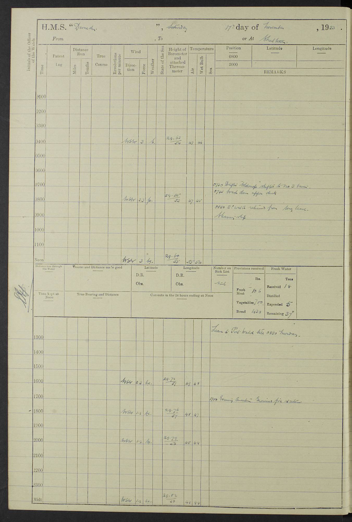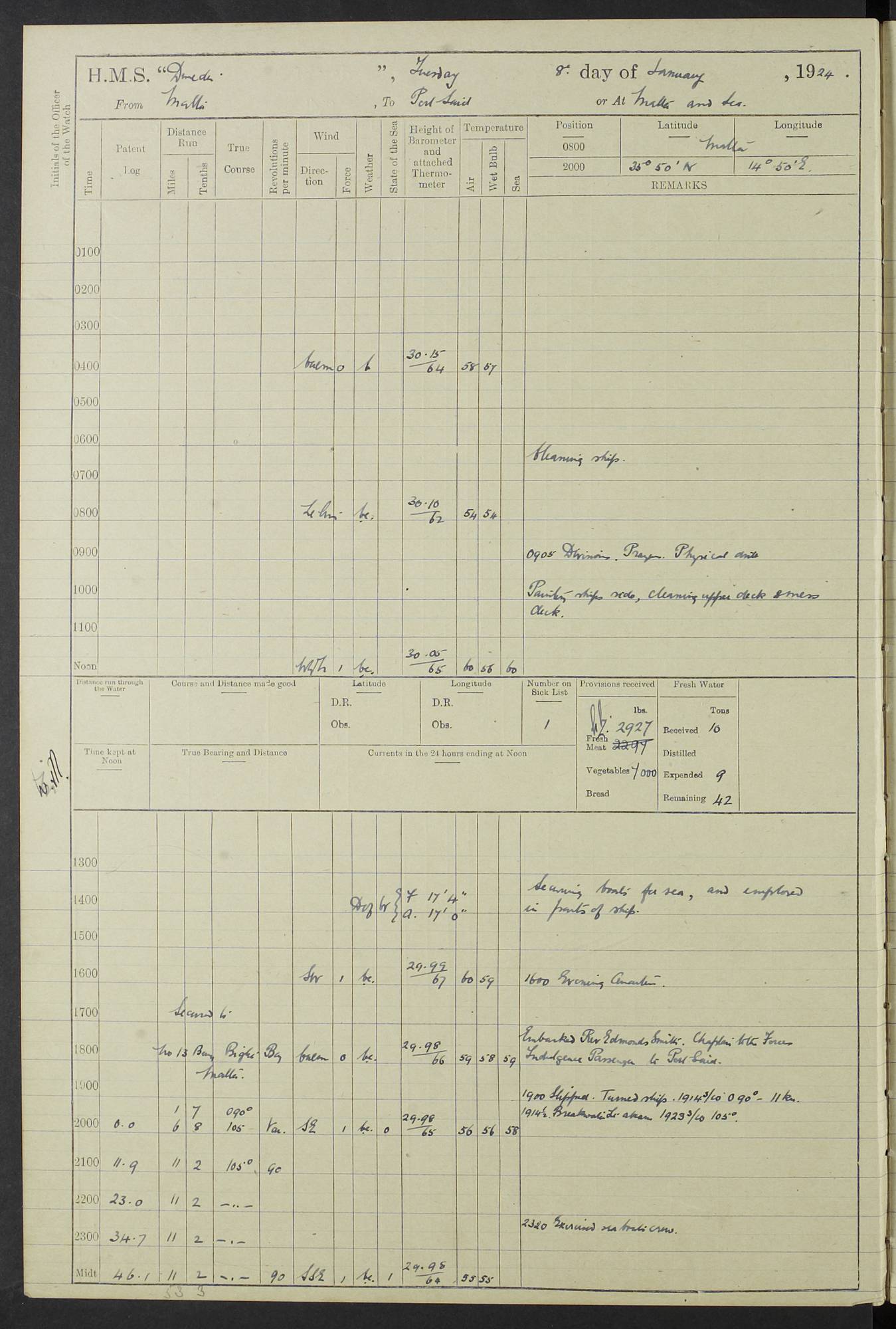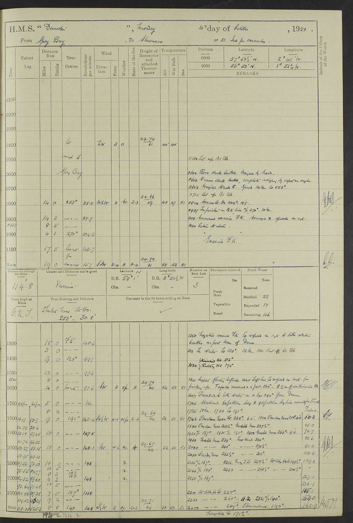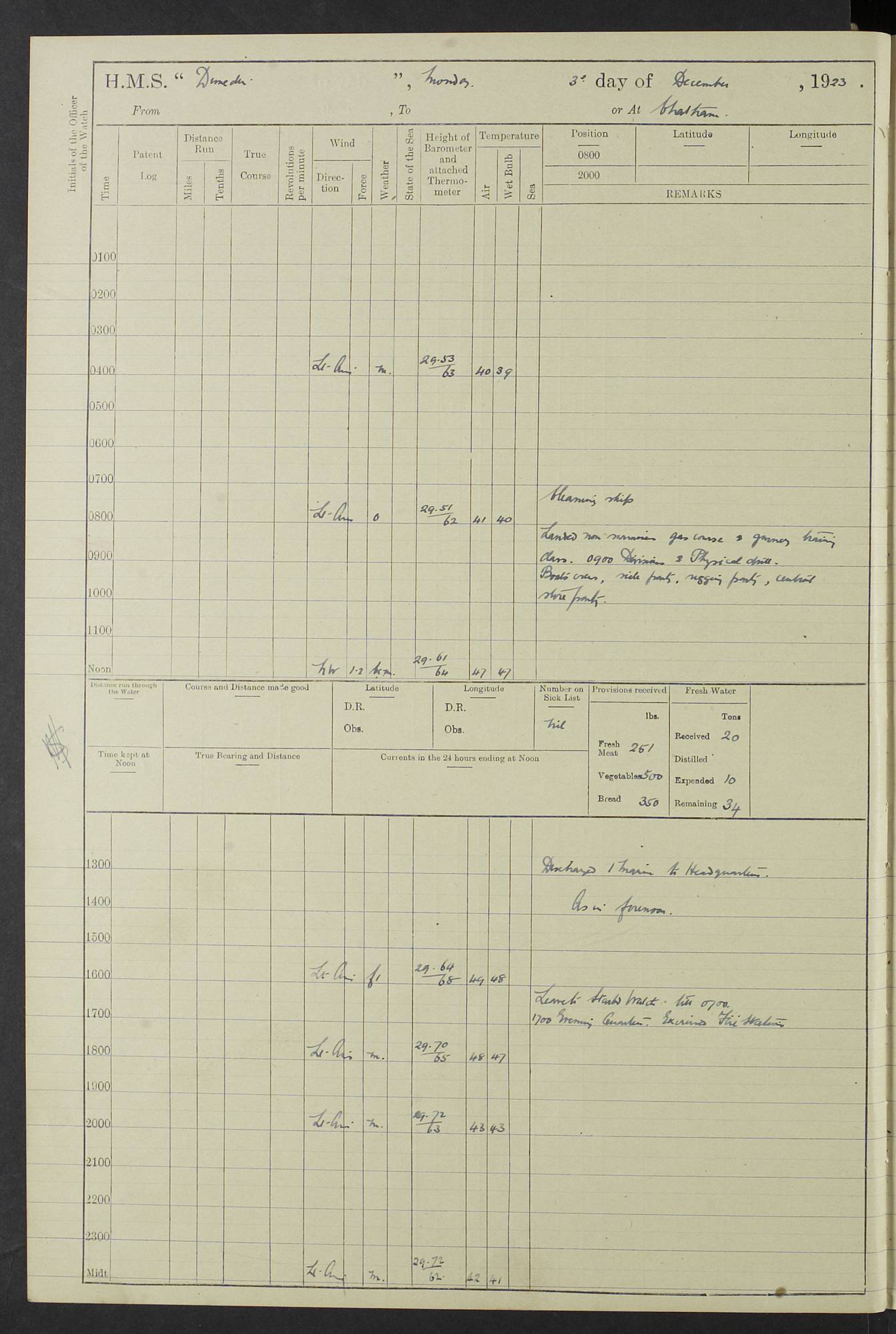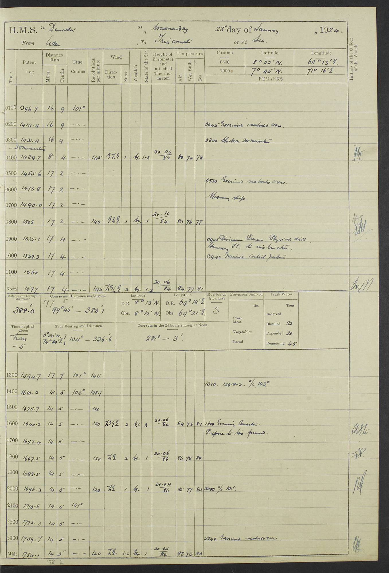 (Maps prepared using Journey Plotter, developed by Maikel. The Plots can only be approximate. They are made by joining-up positions on successive days, and sometimes positions are not given. There will therefore be occasions when the ship appears to have travelled overland) LOG BOOK – 23RD SEPTEMBER 1920 TO 13TH SEPTEMBER 1921 4caf8d9dcadfd3419703bde2: (http://oldweather.s3.amazonaws.com/ADM53-76345/ADM53-76345_0.jpg) Left front cover of Ship’s Log. 4caf8d9dcadfd3419703bde3: (http://oldweather.s3.amazonaws.com/ADM53-76345/ADM53-76345_1.jpg) Right front cover of Ship’s Log. 4caf8d97cadfd3419703bc6a: (http://oldweather.s3.amazonaws.com/ADM53-76345/ADM53-76345-002_0.jpg) 4caf8d97cadfd3419703bc6b: (http://oldweather.s3.amazonaws.com/ADM53-76345/ADM53-76345-002_1.jpg) 4caf8d97cadfd3419703bc6c: (http://oldweather.s3.amazonaws.com/ADM53-76345/ADM53-76345-003_0.jpg) 4caf8d97cadfd3419703bc6d: (http://oldweather.s3.amazonaws.com/ADM53-76345/ADM53-76345-003_1.jpg) 4caf8d97cadfd3419703bc6e: (http://oldweather.s3.amazonaws.com/ADM53-76345/ADM53-76345-004_0.jpg) Blank pages. 4caf8d97cadfd3419703bc6f: (http://oldweather.s3.amazonaws.com/ADM53-76345/ADM53-76345-004_1.jpg) S.- 321. See Articles 557, 619, 622, 924, 1025, 1026 and 1849 of the King’s Regulations, 1913. This Log is to be kept from the time the Ship is Commissioned until she is paid off; when it is to be transmitted as directed by the Admiralty Instructions. The Name and Address of the Officer to whom the acknowledgement of receipt should be sent by the Deputy Cashier in charge, Royal Victoria Yard, Deptford, is to be inserted here. Name: Commander’s Office. Address: H.M.S. Dunedin. c/o G.P.O. London. LOG of H.M.S. “Dunedin” Commanded by Captain C. Wrightson C.B.E. (till 31.3.21). Captain H.S. Monroe D.S.O. (from 31.3.21). FOR THE PERIOD Commencing: Thursday 23rd of September 1920. Ending: Tuesday 13th of September 1921. Tonnage (Displacement): 4,650 Extreme Length: 472ft 3 ins Extreme Breadth: 46 ft 0.3/8” Engines: Manufacturer: Messes R & W Hawthorn Leslie & Co Ltd. Newcastle on Tyne. I.H.P: 40.000 Forced Draught. Description: Turbine (Geared). When Fixed on Board: 1918 – 1919. Boilers: Manufacturer: Messes R & W Hawthorn Leslie & Co Ltd. Newcastle on Tyne. Description: Small tube Improved Yarrow. When made: 1918. When put in vessel: 1918. Paddle Wheels or Screw Propeller: Manufacturer: Manganese Bronze Co. Description: Solid 3 Blades Turbadium Bronze, Pitch 14 ft 3 in. General State of Repair: Satisfactory. R. Alison [?], Lieut Com (W) on paying off 30th August 1923. L. 8418/02. N.L. 15713/13. Where Built Sir W.G. Armstrong Whitworth & Co Ltd. N.L. 18227/18. Armstrong Naval Yard, High Walker, Newcastle on Tyne. Sta. 127/10. Commenced building November 1917, Launched 19 November 1918. N.L. 22782/19. Completed September 1919. 4caf8d98cadfd3419703bc70: (http://oldweather.s3.amazonaws.com/ADM53-76345/ADM53-76345-005_0.jpg) Directions (See King’s Regulations 1913, Articles 1025 and 1849). 1. King’s Regulations. 2. Figures to indicate the Force of the Wind. 3. Letters to denote the State of the Weather. 4. Scale of Fog Intensity. 5. Sea Disturbance Scale 4caf8d98cadfd3419703bc71: (http://oldweather.s3.amazonaws.com/ADM53-76345/ADM53-76345-005_1.jpg) Establishment of Ship’s Company Officers 23 Seamen 187 Boys 36 Marines 46 Engine-room Establishment 105 Other non-executive ratings 44 Total 441 ARMAMENT Position Forecastle: 6” Calibre XII on C.P. XIV mounting. Superstructure: Four 6” Calibre XII on C.P. XIV mountings. Superstructure: Two 3” QF Calibre High Angle mountings, Quarterdeck: 6” Calibre XII on C.P. XIV mountings. Torpedo Armaments Four above water 21” triple tubes. BAROMETER Mercurial or Aneroid: Mercurial. Name of Maker and number: J. Hitchins 101 A747. Height of cistern above sea: 13ft. Error of Mercurial Barometer: Nil at 30.00. Thermometers for Air Temperature. Position on Ship: On fore bridge. Whether in screen: Yes. Maker and No. Negretti & Zambra From: 7.10.19 To: Sept. 1921. Negretti & Zambra No. 10499 Negretti & Zambra No 10391 From: 7.10.19 To: Sept. 1921. Thermometer for Sea Temperature. A. Harper & Sons 7.10.19 POSITION OF STANDARD COMPASS. Manoeuvring Platform. (Fore bridge) BOATS Number of each carried: 1 x 30ft. motor boat. 2 x 32ft. cutters. 1 x 30ft gig. 2 x 27ft whalers. 2 x 16 ft dinghies. MISCELLANEOUS INFORMATION Draught of water with Bunkers full, and complete with provisions, Stores and water: Forward 16 ft 1 inch; Aft 16 ft 11 inches. Number of Tons necessary to increase draught 1 inch: 35.6. Number of Tons of Coal Carried: 16. Number of Tons of Oil Fuel carried: 1127. Quantity of Water Carried (a) For Boilers: 157 tons. (b) For Drinking: 56½ tons. LOGS FOR SEPTEMBER 1920 4caf8d98cadfd3419703bc72: (http://oldweather.s3.amazonaws.com/ADM53-76345/ADM53-76345-006_0.jpg) 23 September 1920 At Copenhagen. Lat 55.694, Long 12.603 4.00am: Signal books correct. am: Hands employed cleaning ship. 8.00am: Signal books correct. am: Sent coaling party to S.S. “Volo”. am: X & Y 6” guns crews at loader drill, remainder of hands employed as requisite. am: Coaling party returned. Noon: Signal books correct. 1.15pm: Sent coaling party to S.S. “Volo”. pm: 1 Rating joined ship from hospital. pm: Boys & training classes under instruction, remainder of hands employed as requisite. 3.00pm: U.S.S. “Gilmer” arrived. [Gilmer, U.S. Destroyer, Flush Decker, launched 18/7/19, Guns: 4 x 5”, 51 cal.,1 x 3”, 23 cal. AA, 12 x 21” TT’s in 4 triple deck mountings. Disp: 1,215 tons, SHP: 26,000 = 35 knots. Jane’s Fighting Ships 1919. Image]. 4.00pm: Signal books correct. pm: Coaling party returned. 8.00pm: Signal books correct. Midnight: Signal books correct. 4caf8d98cadfd3419703bc73: (http://oldweather.s3.amazonaws.com/ADM53-76345/ADM53-76345-006_1.jpg) 24 September 1920 At Copenhagen. Lat 55.694, Long 12.603 4.00am: Signal books correct. am: Hands employed cleaning ship. 6.15am: U.S.S. “Sh
