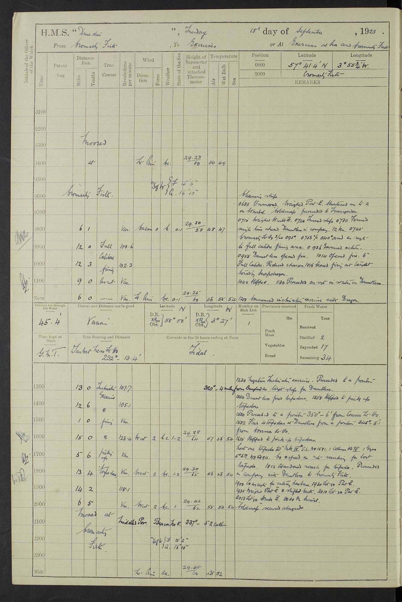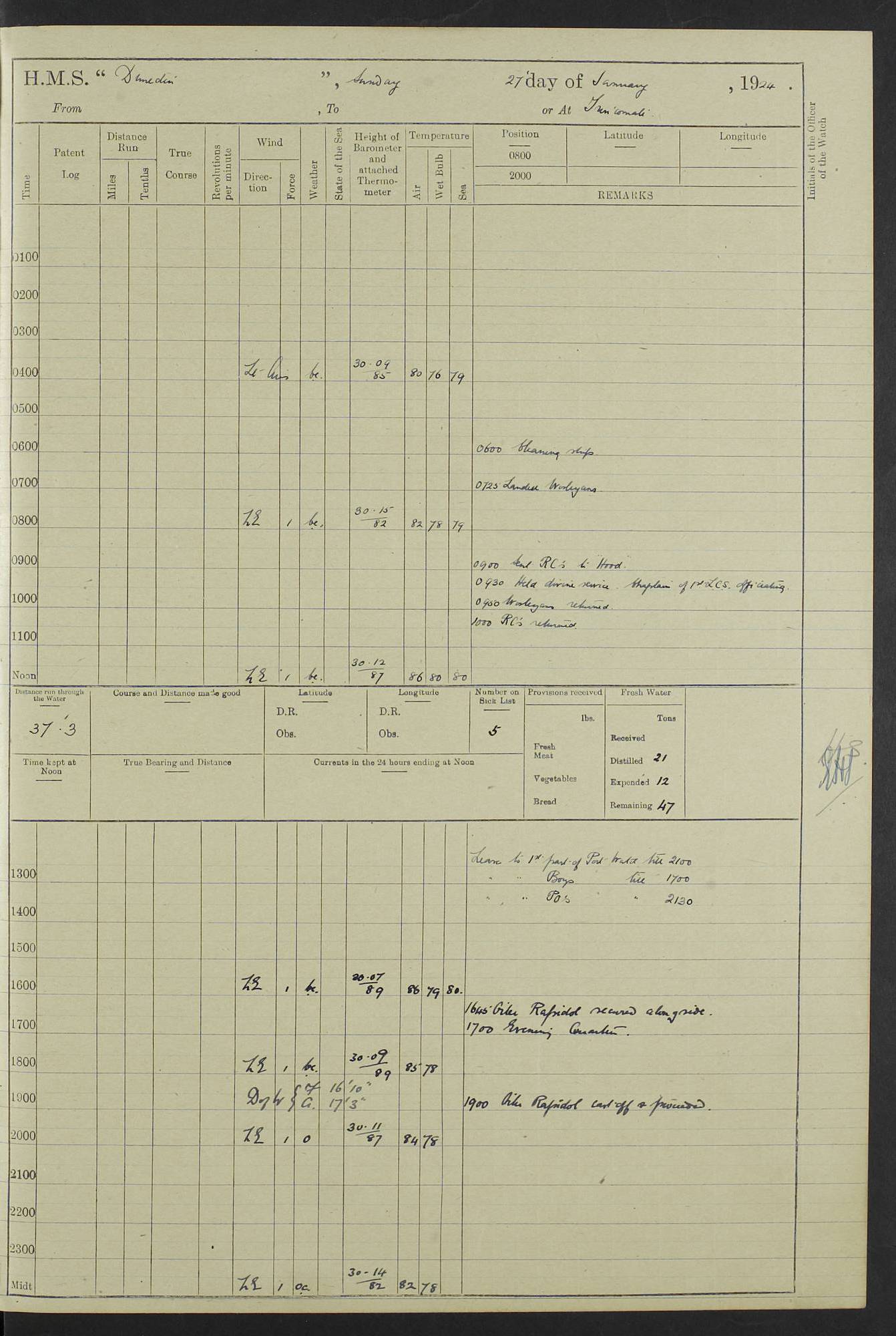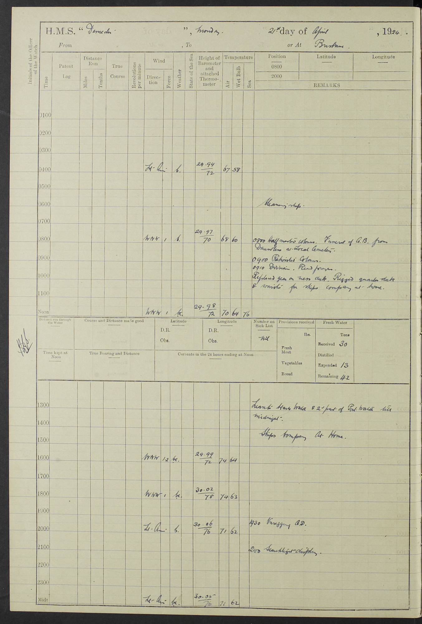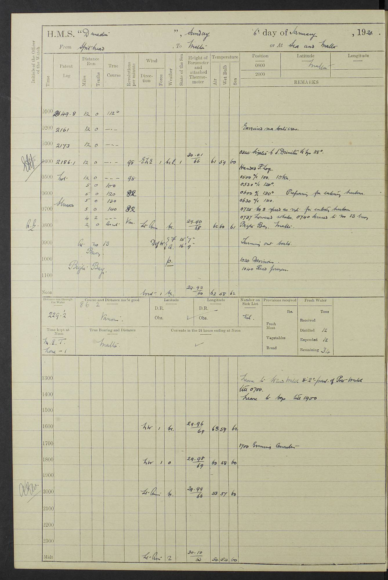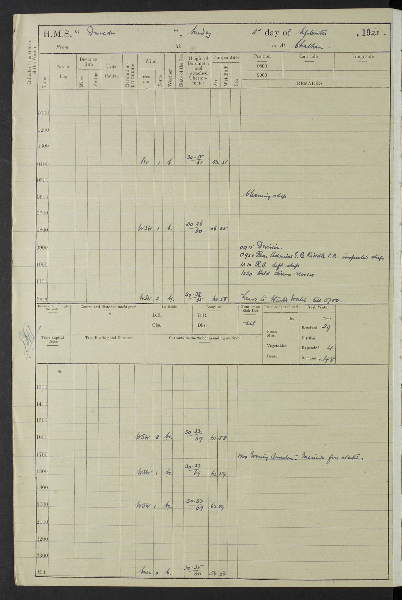 (Maps prepared using Journey Plotter, developed by Maikel. The Plots can only be approximate. They are made by joining-up positions on successive days, and sometimes positions are not given. There will therefore be occasions when the ship appears to have travelled overland) LOG BOOK – 23RD SEPTEMBER 1920 TO 13TH SEPTEMBER 1921 4caf8d9dcadfd3419703bde2: (http://oldweather.s3.amazonaws.com/ADM53-76345/ADM53-76345_0.jpg) Left front cover of Ship’s Log. 4caf8d9dcadfd3419703bde3: (http://oldweather.s3.amazonaws.com/ADM53-76345/ADM53-76345_1.jpg) Right front cover of Ship’s Log. 4caf8d97cadfd3419703bc6a: (http://oldweather.s3.amazonaws.com/ADM53-76345/ADM53-76345-002_0.jpg) 4caf8d97cadfd3419703bc6b: (http://oldweather.s3.amazonaws.com/ADM53-76345/ADM53-76345-002_1.jpg) 4caf8d97cadfd3419703bc6c: (http://oldweather.s3.amazonaws.com/ADM53-76345/ADM53-76345-003_0.jpg) 4caf8d97cadfd3419703bc6d: (http://oldweather.s3.amazonaws.com/ADM53-76345/ADM53-76345-003_1.jpg) 4caf8d97cadfd3419703bc6e: (http://oldweather.s3.amazonaws.com/ADM53-76345/ADM53-76345-004_0.jpg) Blank pages. 4caf8d97cadfd3419703bc6f: (http://oldweather.s3.amazonaws.com/ADM53-76345/ADM53-76345-004_1.jpg) S.- 321. See Articles 557, 619, 622, 924, 1025, 1026 and 1849 of the King’s Regulations, 1913. This Log is to be kept from the time the Ship is Commissioned until she is paid off; when it is to be transmitted as directed by the Admiralty Instructions. The Name and Address of the Officer to whom the acknowledgement of receipt should be sent by the Deputy Cashier in charge, Royal Victoria Yard, Deptford, is to be inserted here. Name: Commander’s Office. Address: H.M.S. Dunedin. c/o G.P.O. London. LOG of H.M.S. “Dunedin” Commanded by Captain C. Wrightson C.B.E. (till 31.3.21). Captain H.S. Monroe D.S.O. (from 31.3.21). FOR THE PERIOD Commencing: Thursday 23rd of September 1920. Ending: Tuesday 13th of September 1921. Tonnage (Displacement): 4,650 Extreme Length: 472ft 3 ins Extreme Breadth: 46 ft 0.3/8” Engines: Manufacturer: Messes R & W Hawthorn Leslie & Co Ltd. Newcastle on Tyne. I.H.P: 40.000 Forced Draught. Description: Turbine (Geared). When Fixed on Board: 1918 – 1919. Boilers: Manufacturer: Messes R & W Hawthorn Leslie & Co Ltd. Newcastle on Tyne. Description: Small tube Improved Yarrow. When made: 1918. When put in vessel: 1918. Paddle Wheels or Screw Propeller: Manufacturer: Manganese Bronze Co. Description: Solid 3 Blades Turbadium Bronze, Pitch 14 ft 3 in. General State of Repair: Satisfactory. R. Alison [?], Lieut Com (W) on paying off 30th August 1923. L. 8418/02. N.L. 15713/13. Where Built Sir W.G. Armstrong Whitworth & Co Ltd. N.L. 18227/18. Armstrong Naval Yard, High Walker, Newcastle on Tyne. Sta. 127/10. Commenced building November 1917, Launched 19 November 1918. N.L. 22782/19. Completed September 1919. 4caf8d98cadfd3419703bc70: (http://oldweather.s3.amazonaws.com/ADM53-76345/ADM53-76345-005_0.jpg) Directions (See King’s Regulations 1913, Articles 1025 and 1849). 1. King’s Regulations. 2. Figures to indicate the Force of the Wind. 3. Letters to denote the State of the Weather. 4. Scale of Fog Intensity. 5. Sea Disturbance Scale 4caf8d98cadfd3419703bc71: (http://oldweather.s3.amazonaws.com/ADM53-76345/ADM53-76345-005_1.jpg) Establishment of Ship’s Company Officers 23 Seamen 187 Boys 36 Marines 46 Engine-room Establishment 105 Other non-executive ratings 44 Total 441 ARMAMENT Position Forecastle: 6” Calibre XII on C.P. XIV mounting. Superstructure: Four 6” Calibre XII on C.P. XIV mountings. Superstructure: Two 3” QF Calibre High Angle mountings, Quarterdeck: 6” Calibre XII on C.P. XIV mountings. Torpedo Armaments Four above water 21” triple tubes. BAROMETER Mercurial or Aneroid: Mercurial. Name of Maker and number: J. Hitchins 101 A747. Height of cistern above sea: 13ft. Error of Mercurial Barometer: Nil at 30.00. Thermometers for Air Temperature. Position on Ship: On fore bridge. Whether in screen: Yes. Maker and No. Negretti & Zambra From: 7.10.19 To: Sept. 1921. Negretti & Zambra No. 10499 Negretti & Zambra No 10391 From: 7.10.19 To: Sept. 1921. Thermometer for Sea Temperature. A. Harper & Sons 7.10.19 POSITION OF STANDARD COMPASS. Manoeuvring Platform. (Fore bridge) BOATS Number of each carried: 1 x 30ft. motor boat. 2 x 32ft. cutters. 1 x 30ft gig. 2 x 27ft whalers. 2 x 16 ft dinghies. MISCELLANEOUS INFORMATION Draught of water with Bunkers full, and complete with provisions, Stores and water: Forward 16 ft 1 inch; Aft 16 ft 11 inches. Number of Tons necessary to increase draught 1 inch: 35.6. Number of Tons of Coal Carried: 16. Number of Tons of Oil Fuel carried: 1127. Quantity of Water Carried (a) For Boilers: 157 tons. (b) For Drinking: 56½ tons. LOGS FOR SEPTEMBER 1920 4caf8d98cadfd3419703bc72: (http://oldweather.s3.amazonaws.com/ADM53-76345/ADM53-76345-006_0.jpg) 23 September 1920 At Copenhagen. Lat 55.694, Long 12.603 4.00am: Signal books correct. am: Hands employed cleaning ship. 8.00am: Signal books correct. am: Sent coaling party to S.S. “Volo”. am: X & Y 6” guns crews at loader drill, remainder of hands employed as requisite. am: Coaling party returned. Noon: Signal books correct. 1.15pm: Sent coaling party to S.S. “Volo”. pm: 1 Rating joined ship from hospital. pm: Boys & training classes under instruction, remainder of hands employed as requisite. 3.00pm: U.S.S. “Gilmer” arrived. [Gilmer, U.S. Destroyer, Flush Decker, launched 18/7/19, Guns: 4 x 5”, 51 cal.,1 x 3”, 23 cal. AA, 12 x 21” TT’s in 4 triple deck mountings. Disp: 1,215 tons, SHP: 26,000 = 35 knots. Jane’s Fighting Ships 1919. Image]. 4.00pm: Signal books correct. pm: Coaling party returned. 8.00pm: Signal books correct. Midnight: Signal books correct. 4caf8d98cadfd3419703bc73: (http://oldweather.s3.amazonaws.com/ADM53-76345/ADM53-76345-006_1.jpg) 24 September 1920 At Copenhagen. Lat 55.694, Long 12.603 4.00am: Signal books correct. am: Hands employed cleaning ship. 6.15am: U.S.S. “Sh