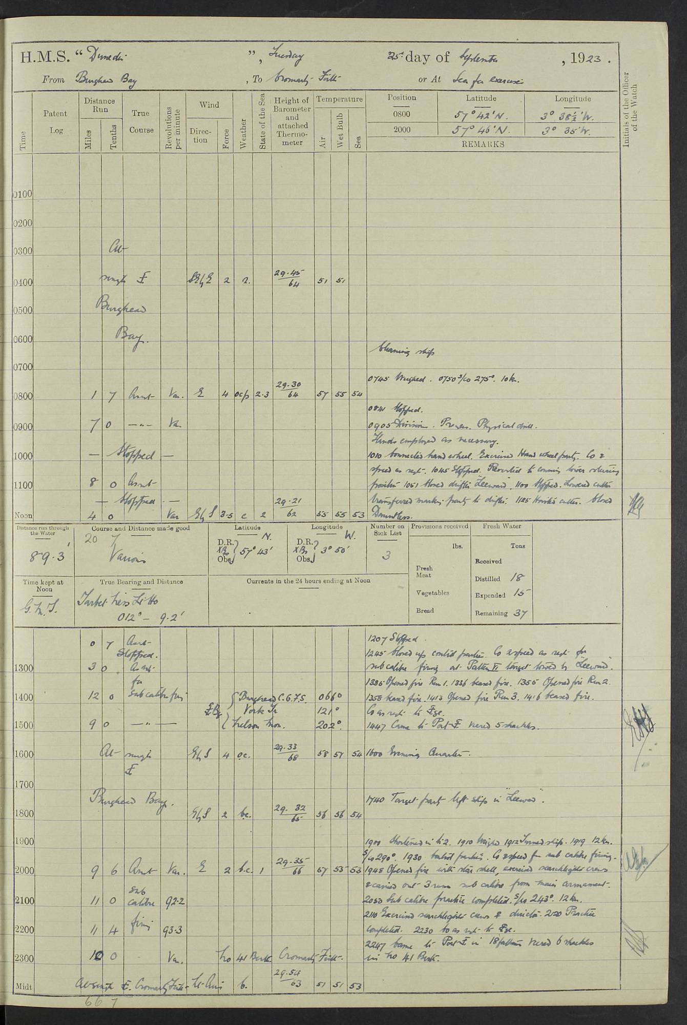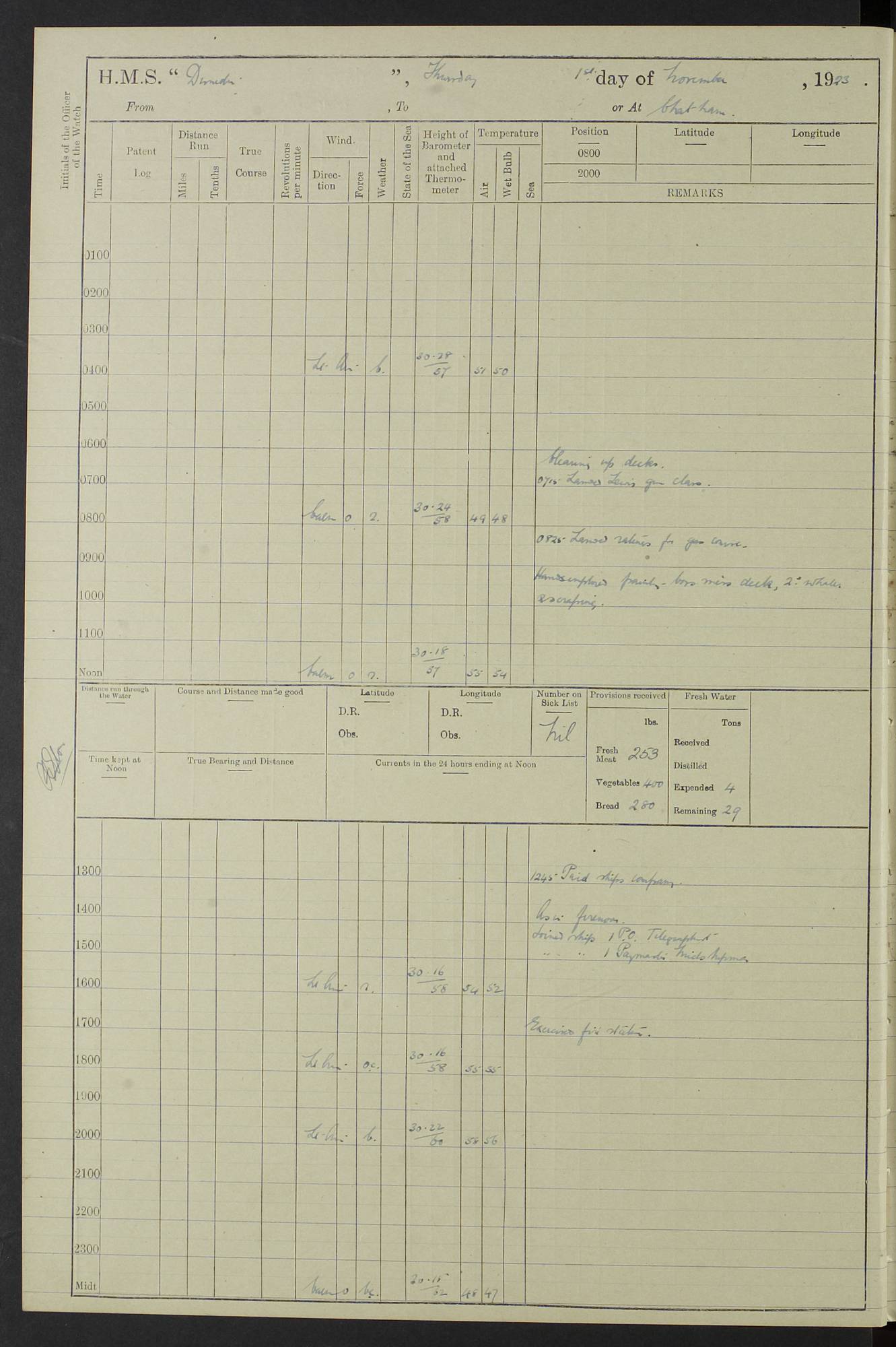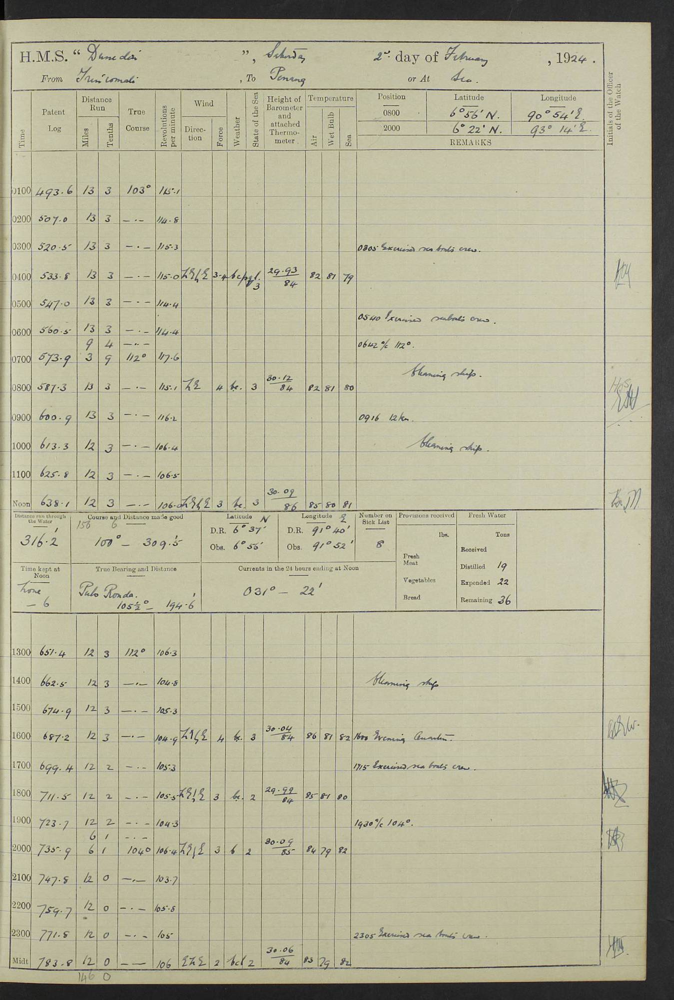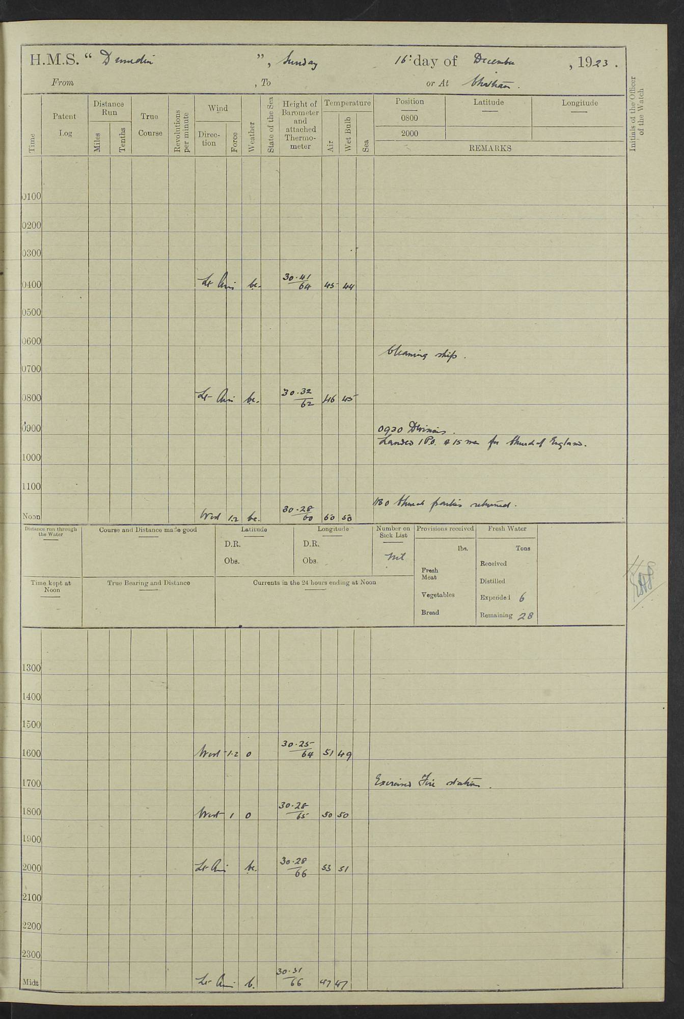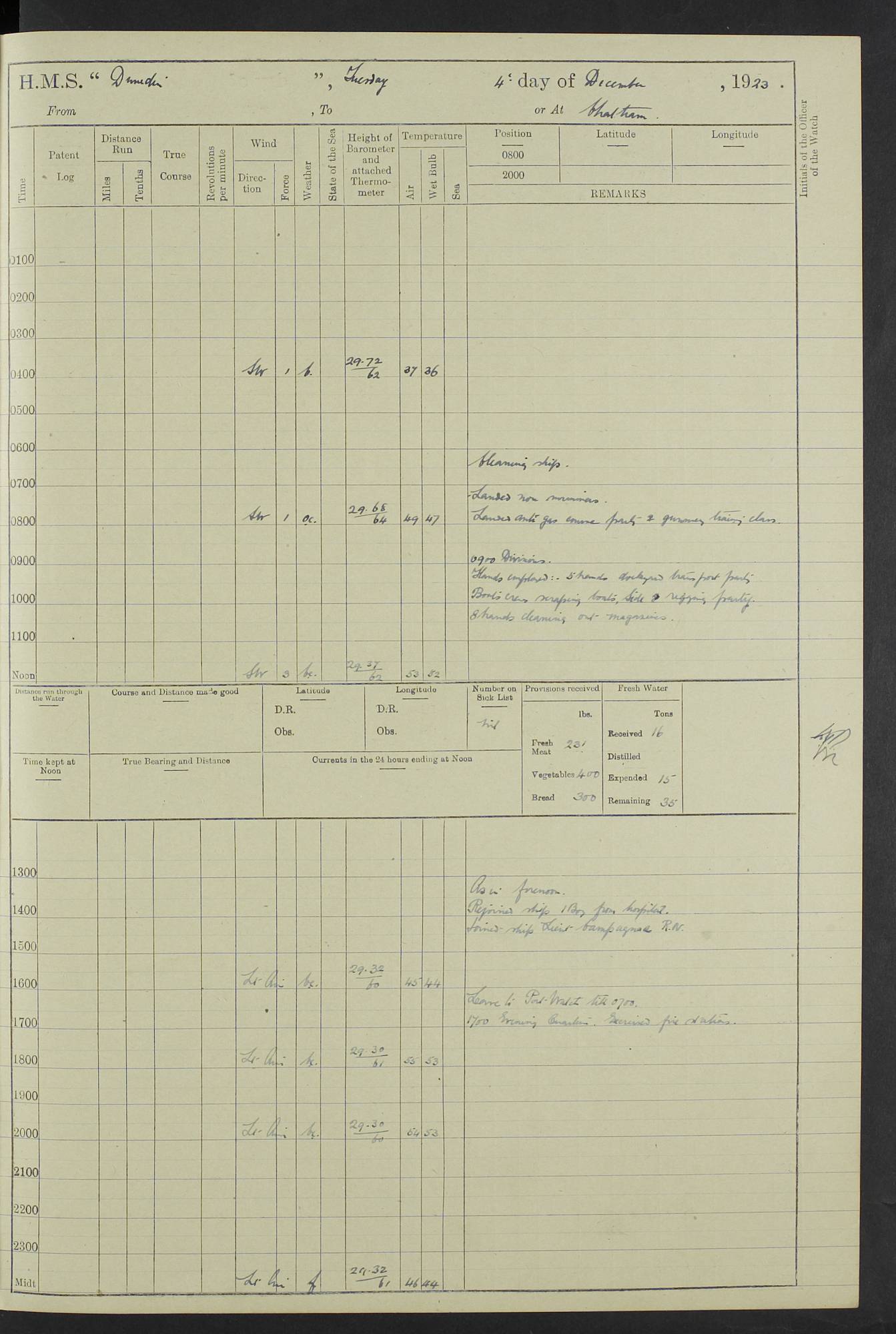 (Maps prepared using Journey Plotter, developed by Maikel. The Plots can only be approximate. They are made by joining-up positions on successive days, and sometimes positions are not given. There will therefore be occasions when the ship appears to have travelled overland) LOG BOOK – 23RD SEPTEMBER 1920 TO 13TH SEPTEMBER 1921 4caf8d9dcadfd3419703bde2: (http://oldweather.s3.amazonaws.com/ADM53-76345/ADM53-76345_0.jpg) Left front cover of Ship’s Log. 4caf8d9dcadfd3419703bde3: (http://oldweather.s3.amazonaws.com/ADM53-76345/ADM53-76345_1.jpg) Right front cover of Ship’s Log. 4caf8d97cadfd3419703bc6a: (http://oldweather.s3.amazonaws.com/ADM53-76345/ADM53-76345-002_0.jpg) 4caf8d97cadfd3419703bc6b: (http://oldweather.s3.amazonaws.com/ADM53-76345/ADM53-76345-002_1.jpg) 4caf8d97cadfd3419703bc6c: (http://oldweather.s3.amazonaws.com/ADM53-76345/ADM53-76345-003_0.jpg) 4caf8d97cadfd3419703bc6d: (http://oldweather.s3.amazonaws.com/ADM53-76345/ADM53-76345-003_1.jpg) 4caf8d97cadfd3419703bc6e: (http://oldweather.s3.amazonaws.com/ADM53-76345/ADM53-76345-004_0.jpg) Blank pages. 4caf8d97cadfd3419703bc6f: (http://oldweather.s3.amazonaws.com/ADM53-76345/ADM53-76345-004_1.jpg) S.- 321. See Articles 557, 619, 622, 924, 1025, 1026 and 1849 of the King’s Regulations, 1913. This Log is to be kept from the time the Ship is Commissioned until she is paid off; when it is to be transmitted as directed by the Admiralty Instructions. The Name and Address of the Officer to whom the acknowledgement of receipt should be sent by the Deputy Cashier in charge, Royal Victoria Yard, Deptford, is to be inserted here. Name: Commander’s Office. Address: H.M.S. Dunedin. c/o G.P.O. London. LOG of H.M.S. “Dunedin” Commanded by Captain C. Wrightson C.B.E. (till 31.3.21). Captain H.S. Monroe D.S.O. (from 31.3.21). FOR THE PERIOD Commencing: Thursday 23rd of September 1920. Ending: Tuesday 13th of September 1921. Tonnage (Displacement): 4,650 Extreme Length: 472ft 3 ins Extreme Breadth: 46 ft 0.3/8” Engines: Manufacturer: Messes R & W Hawthorn Leslie & Co Ltd. Newcastle on Tyne. I.H.P: 40.000 Forced Draught. Description: Turbine (Geared). When Fixed on Board: 1918 – 1919. Boilers: Manufacturer: Messes R & W Hawthorn Leslie & Co Ltd. Newcastle on Tyne. Description: Small tube Improved Yarrow. When made: 1918. When put in vessel: 1918. Paddle Wheels or Screw Propeller: Manufacturer: Manganese Bronze Co. Description: Solid 3 Blades Turbadium Bronze, Pitch 14 ft 3 in. General State of Repair: Satisfactory. R. Alison [?], Lieut Com (W) on paying off 30th August 1923. L. 8418/02. N.L. 15713/13. Where Built Sir W.G. Armstrong Whitworth & Co Ltd. N.L. 18227/18. Armstrong Naval Yard, High Walker, Newcastle on Tyne. Sta. 127/10. Commenced building November 1917, Launched 19 November 1918. N.L. 22782/19. Completed September 1919. 4caf8d98cadfd3419703bc70: (http://oldweather.s3.amazonaws.com/ADM53-76345/ADM53-76345-005_0.jpg) Directions (See King’s Regulations 1913, Articles 1025 and 1849). 1. King’s Regulations. 2. Figures to indicate the Force of the Wind. 3. Letters to denote the State of the Weather. 4. Scale of Fog Intensity. 5. Sea Disturbance Scale 4caf8d98cadfd3419703bc71: (http://oldweather.s3.amazonaws.com/ADM53-76345/ADM53-76345-005_1.jpg) Establishment of Ship’s Company Officers 23 Seamen 187 Boys 36 Marines 46 Engine-room Establishment 105 Other non-executive ratings 44 Total 441 ARMAMENT Position Forecastle: 6” Calibre XII on C.P. XIV mounting. Superstructure: Four 6” Calibre XII on C.P. XIV mountings. Superstructure: Two 3” QF Calibre High Angle mountings, Quarterdeck: 6” Calibre XII on C.P. XIV mountings. Torpedo Armaments Four above water 21” triple tubes. BAROMETER Mercurial or Aneroid: Mercurial. Name of Maker and number: J. Hitchins 101 A747. Height of cistern above sea: 13ft. Error of Mercurial Barometer: Nil at 30.00. Thermometers for Air Temperature. Position on Ship: On fore bridge. Whether in screen: Yes. Maker and No. Negretti & Zambra From: 7.10.19 To: Sept. 1921. Negretti & Zambra No. 10499 Negretti & Zambra No 10391 From: 7.10.19 To: Sept. 1921. Thermometer for Sea Temperature. A. Harper & Sons 7.10.19 POSITION OF STANDARD COMPASS. Manoeuvring Platform. (Fore bridge) BOATS Number of each carried: 1 x 30ft. motor boat. 2 x 32ft. cutters. 1 x 30ft gig. 2 x 27ft whalers. 2 x 16 ft dinghies. MISCELLANEOUS INFORMATION Draught of water with Bunkers full, and complete with provisions, Stores and water: Forward 16 ft 1 inch; Aft 16 ft 11 inches. Number of Tons necessary to increase draught 1 inch: 35.6. Number of Tons of Coal Carried: 16. Number of Tons of Oil Fuel carried: 1127. Quantity of Water Carried (a) For Boilers: 157 tons. (b) For Drinking: 56½ tons. LOGS FOR SEPTEMBER 1920 4caf8d98cadfd3419703bc72: (http://oldweather.s3.amazonaws.com/ADM53-76345/ADM53-76345-006_0.jpg) 23 September 1920 At Copenhagen. Lat 55.694, Long 12.603 4.00am: Signal books correct. am: Hands employed cleaning ship. 8.00am: Signal books correct. am: Sent coaling party to S.S. “Volo”. am: X & Y 6” guns crews at loader drill, remainder of hands employed as requisite. am: Coaling party returned. Noon: Signal books correct. 1.15pm: Sent coaling party to S.S. “Volo”. pm: 1 Rating joined ship from hospital. pm: Boys & training classes under instruction, remainder of hands employed as requisite. 3.00pm: U.S.S. “Gilmer” arrived. [Gilmer, U.S. Destroyer, Flush Decker, launched 18/7/19, Guns: 4 x 5”, 51 cal.,1 x 3”, 23 cal. AA, 12 x 21” TT’s in 4 triple deck mountings. Disp: 1,215 tons, SHP: 26,000 = 35 knots. Jane’s Fighting Ships 1919. Image]. 4.00pm: Signal books correct. pm: Coaling party returned. 8.00pm: Signal books correct. Midnight: Signal books correct. 4caf8d98cadfd3419703bc73: (http://oldweather.s3.amazonaws.com/ADM53-76345/ADM53-76345-006_1.jpg) 24 September 1920 At Copenhagen. Lat 55.694, Long 12.603 4.00am: Signal books correct. am: Hands employed cleaning ship. 6.15am: U.S.S. “Sh