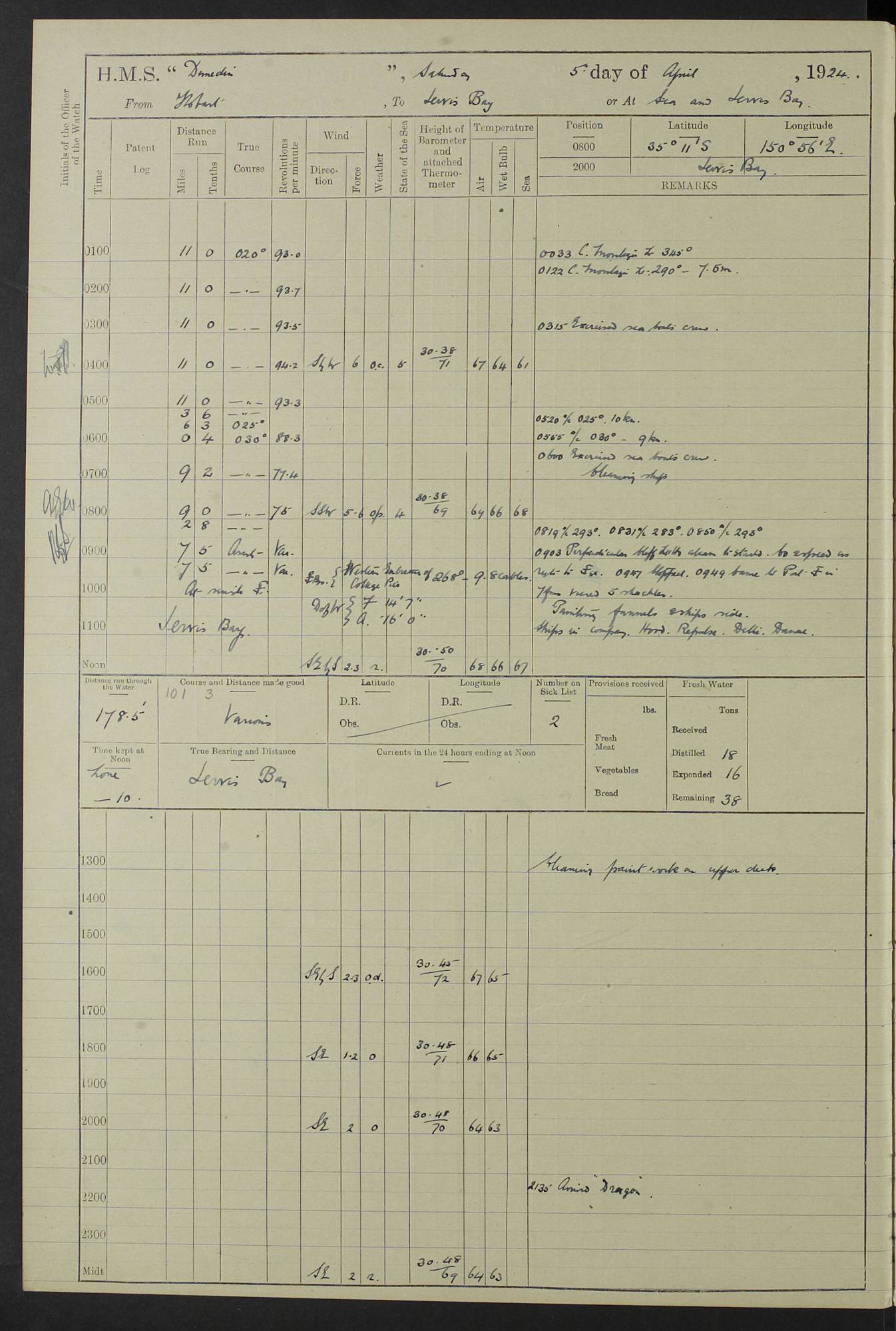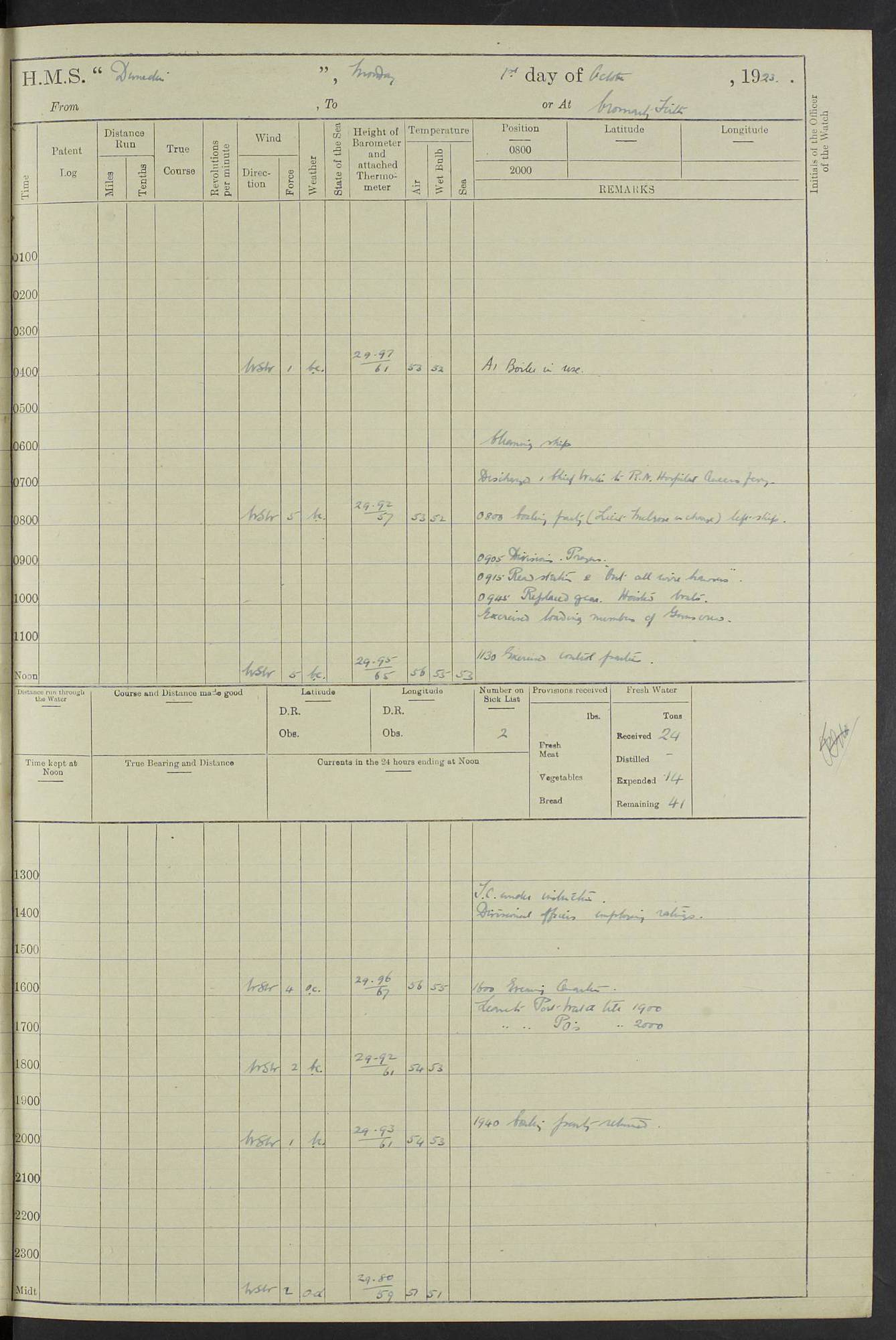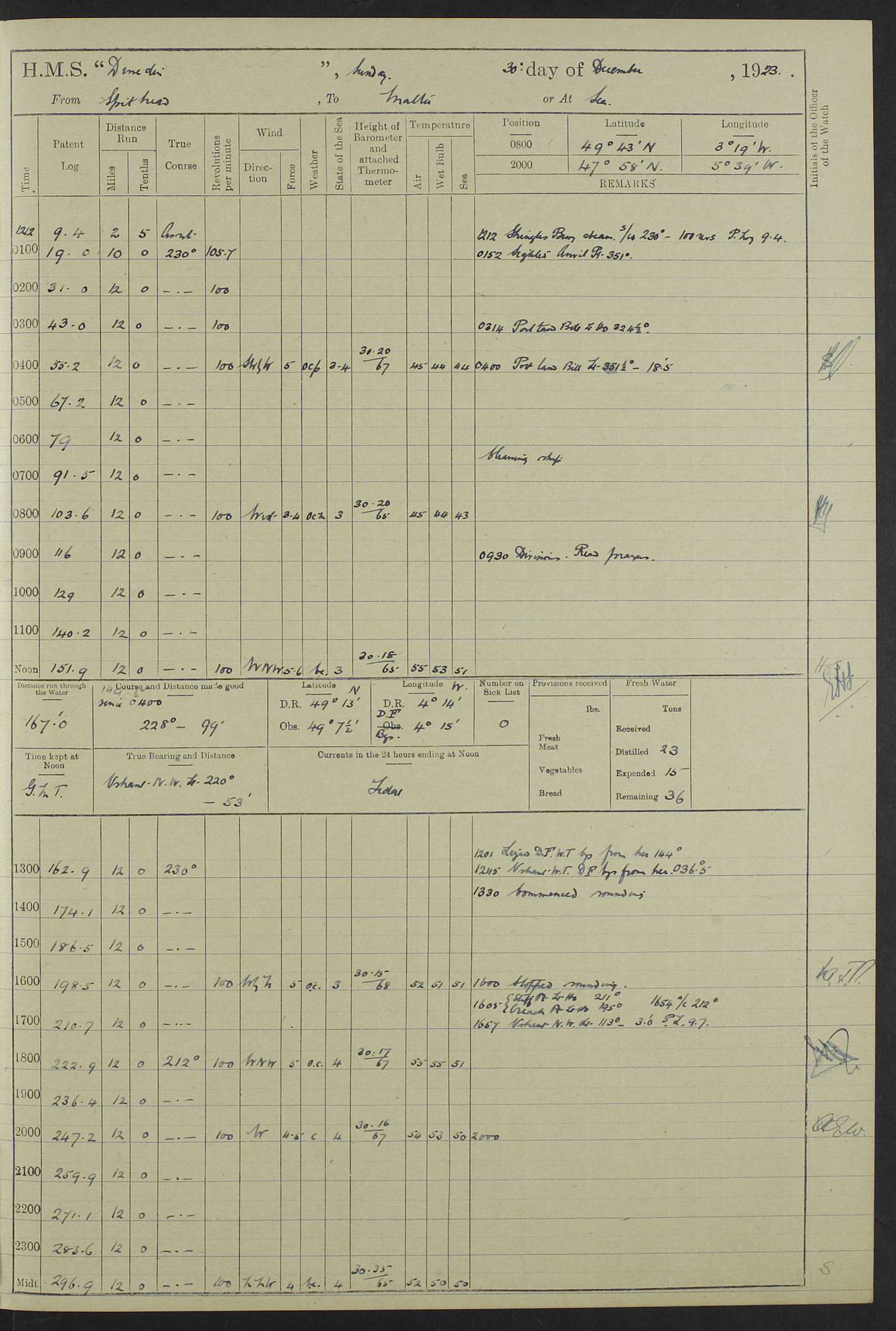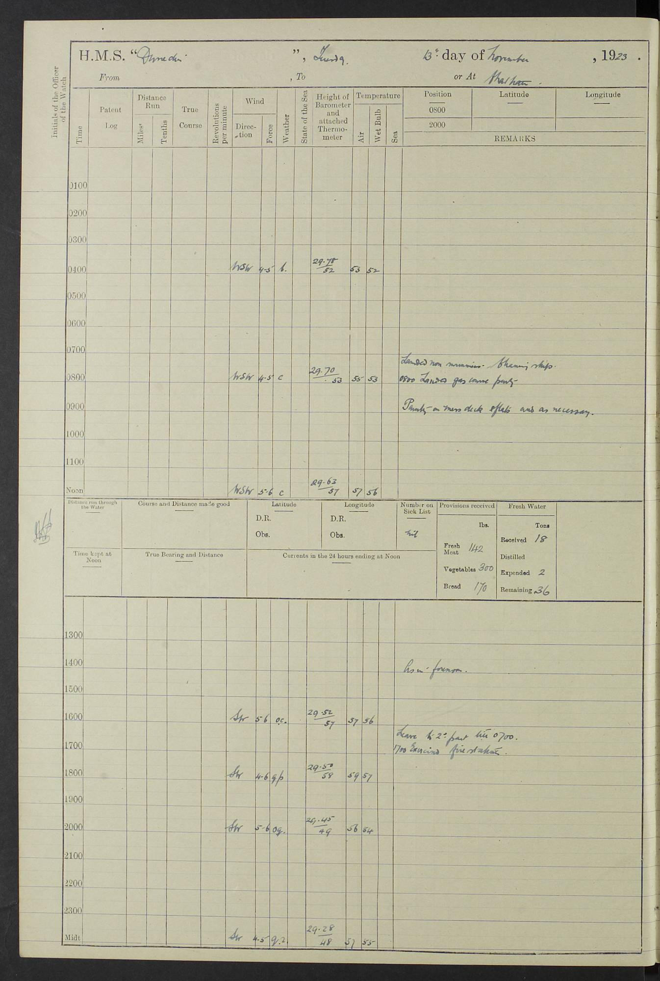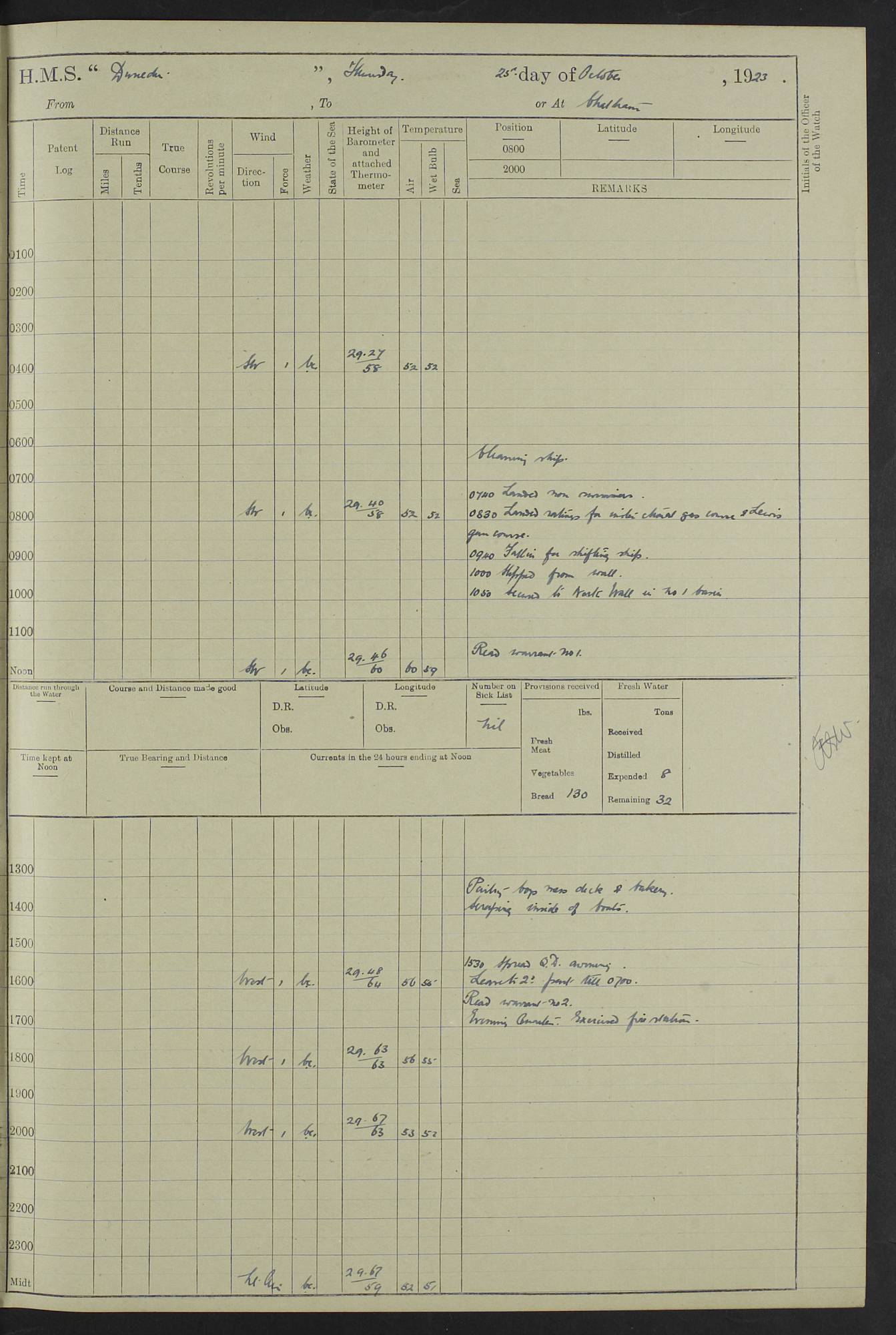 (Maps prepared using Journey Plotter, developed by Maikel. The Plots can only be approximate. They are made by joining-up positions on successive days, and sometimes positions are not given. There will therefore be occasions when the ship appears to have travelled overland) LOG BOOK – 23RD SEPTEMBER 1920 TO 13TH SEPTEMBER 1921 4caf8d9dcadfd3419703bde2: (http://oldweather.s3.amazonaws.com/ADM53-76345/ADM53-76345_0.jpg) Left front cover of Ship’s Log. 4caf8d9dcadfd3419703bde3: (http://oldweather.s3.amazonaws.com/ADM53-76345/ADM53-76345_1.jpg) Right front cover of Ship’s Log. 4caf8d97cadfd3419703bc6a: (http://oldweather.s3.amazonaws.com/ADM53-76345/ADM53-76345-002_0.jpg) 4caf8d97cadfd3419703bc6b: (http://oldweather.s3.amazonaws.com/ADM53-76345/ADM53-76345-002_1.jpg) 4caf8d97cadfd3419703bc6c: (http://oldweather.s3.amazonaws.com/ADM53-76345/ADM53-76345-003_0.jpg) 4caf8d97cadfd3419703bc6d: (http://oldweather.s3.amazonaws.com/ADM53-76345/ADM53-76345-003_1.jpg) 4caf8d97cadfd3419703bc6e: (http://oldweather.s3.amazonaws.com/ADM53-76345/ADM53-76345-004_0.jpg) Blank pages. 4caf8d97cadfd3419703bc6f: (http://oldweather.s3.amazonaws.com/ADM53-76345/ADM53-76345-004_1.jpg) S.- 321. See Articles 557, 619, 622, 924, 1025, 1026 and 1849 of the King’s Regulations, 1913. This Log is to be kept from the time the Ship is Commissioned until she is paid off; when it is to be transmitted as directed by the Admiralty Instructions. The Name and Address of the Officer to whom the acknowledgement of receipt should be sent by the Deputy Cashier in charge, Royal Victoria Yard, Deptford, is to be inserted here. Name: Commander’s Office. Address: H.M.S. Dunedin. c/o G.P.O. London. LOG of H.M.S. “Dunedin” Commanded by Captain C. Wrightson C.B.E. (till 31.3.21). Captain H.S. Monroe D.S.O. (from 31.3.21). FOR THE PERIOD Commencing: Thursday 23rd of September 1920. Ending: Tuesday 13th of September 1921. Tonnage (Displacement): 4,650 Extreme Length: 472ft 3 ins Extreme Breadth: 46 ft 0.3/8” Engines: Manufacturer: Messes R & W Hawthorn Leslie & Co Ltd. Newcastle on Tyne. I.H.P: 40.000 Forced Draught. Description: Turbine (Geared). When Fixed on Board: 1918 – 1919. Boilers: Manufacturer: Messes R & W Hawthorn Leslie & Co Ltd. Newcastle on Tyne. Description: Small tube Improved Yarrow. When made: 1918. When put in vessel: 1918. Paddle Wheels or Screw Propeller: Manufacturer: Manganese Bronze Co. Description: Solid 3 Blades Turbadium Bronze, Pitch 14 ft 3 in. General State of Repair: Satisfactory. R. Alison [?], Lieut Com (W) on paying off 30th August 1923. L. 8418/02. N.L. 15713/13. Where Built Sir W.G. Armstrong Whitworth & Co Ltd. N.L. 18227/18. Armstrong Naval Yard, High Walker, Newcastle on Tyne. Sta. 127/10. Commenced building November 1917, Launched 19 November 1918. N.L. 22782/19. Completed September 1919. 4caf8d98cadfd3419703bc70: (http://oldweather.s3.amazonaws.com/ADM53-76345/ADM53-76345-005_0.jpg) Directions (See King’s Regulations 1913, Articles 1025 and 1849). 1. King’s Regulations. 2. Figures to indicate the Force of the Wind. 3. Letters to denote the State of the Weather. 4. Scale of Fog Intensity. 5. Sea Disturbance Scale 4caf8d98cadfd3419703bc71: (http://oldweather.s3.amazonaws.com/ADM53-76345/ADM53-76345-005_1.jpg) Establishment of Ship’s Company Officers 23 Seamen 187 Boys 36 Marines 46 Engine-room Establishment 105 Other non-executive ratings 44 Total 441 ARMAMENT Position Forecastle: 6” Calibre XII on C.P. XIV mounting. Superstructure: Four 6” Calibre XII on C.P. XIV mountings. Superstructure: Two 3” QF Calibre High Angle mountings, Quarterdeck: 6” Calibre XII on C.P. XIV mountings. Torpedo Armaments Four above water 21” triple tubes. BAROMETER Mercurial or Aneroid: Mercurial. Name of Maker and number: J. Hitchins 101 A747. Height of cistern above sea: 13ft. Error of Mercurial Barometer: Nil at 30.00. Thermometers for Air Temperature. Position on Ship: On fore bridge. Whether in screen: Yes. Maker and No. Negretti & Zambra From: 7.10.19 To: Sept. 1921. Negretti & Zambra No. 10499 Negretti & Zambra No 10391 From: 7.10.19 To: Sept. 1921. Thermometer for Sea Temperature. A. Harper & Sons 7.10.19 POSITION OF STANDARD COMPASS. Manoeuvring Platform. (Fore bridge) BOATS Number of each carried: 1 x 30ft. motor boat. 2 x 32ft. cutters. 1 x 30ft gig. 2 x 27ft whalers. 2 x 16 ft dinghies. MISCELLANEOUS INFORMATION Draught of water with Bunkers full, and complete with provisions, Stores and water: Forward 16 ft 1 inch; Aft 16 ft 11 inches. Number of Tons necessary to increase draught 1 inch: 35.6. Number of Tons of Coal Carried: 16. Number of Tons of Oil Fuel carried: 1127. Quantity of Water Carried (a) For Boilers: 157 tons. (b) For Drinking: 56½ tons. LOGS FOR SEPTEMBER 1920 4caf8d98cadfd3419703bc72: (http://oldweather.s3.amazonaws.com/ADM53-76345/ADM53-76345-006_0.jpg) 23 September 1920 At Copenhagen. Lat 55.694, Long 12.603 4.00am: Signal books correct. am: Hands employed cleaning ship. 8.00am: Signal books correct. am: Sent coaling party to S.S. “Volo”. am: X & Y 6” guns crews at loader drill, remainder of hands employed as requisite. am: Coaling party returned. Noon: Signal books correct. 1.15pm: Sent coaling party to S.S. “Volo”. pm: 1 Rating joined ship from hospital. pm: Boys & training classes under instruction, remainder of hands employed as requisite. 3.00pm: U.S.S. “Gilmer” arrived. [Gilmer, U.S. Destroyer, Flush Decker, launched 18/7/19, Guns: 4 x 5”, 51 cal.,1 x 3”, 23 cal. AA, 12 x 21” TT’s in 4 triple deck mountings. Disp: 1,215 tons, SHP: 26,000 = 35 knots. Jane’s Fighting Ships 1919. Image]. 4.00pm: Signal books correct. pm: Coaling party returned. 8.00pm: Signal books correct. Midnight: Signal books correct. 4caf8d98cadfd3419703bc73: (http://oldweather.s3.amazonaws.com/ADM53-76345/ADM53-76345-006_1.jpg) 24 September 1920 At Copenhagen. Lat 55.694, Long 12.603 4.00am: Signal books correct. am: Hands employed cleaning ship. 6.15am: U.S.S. “Sh
