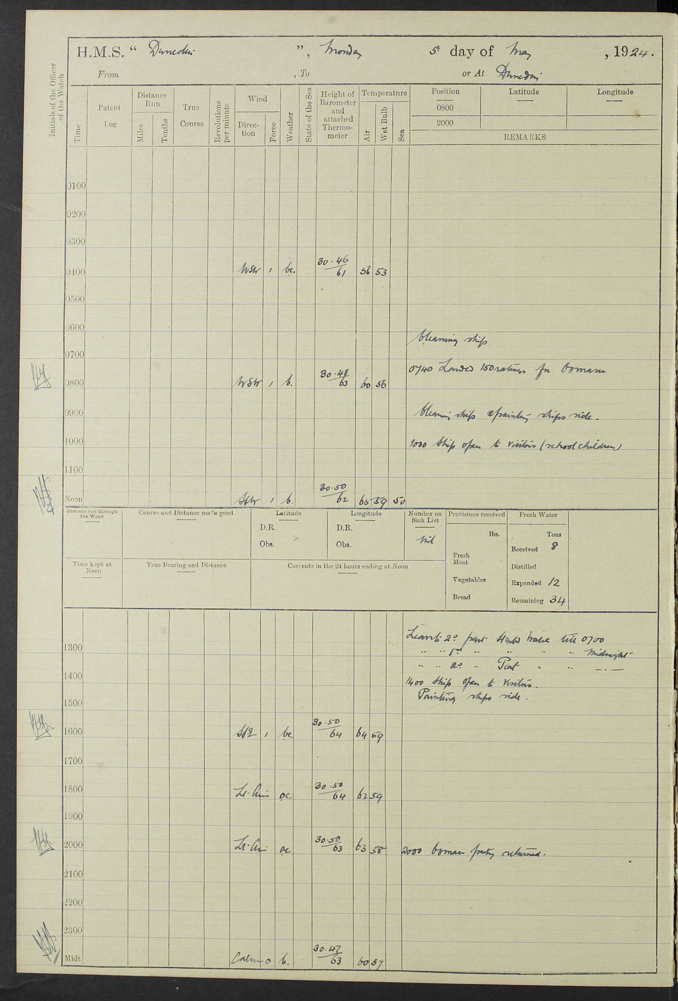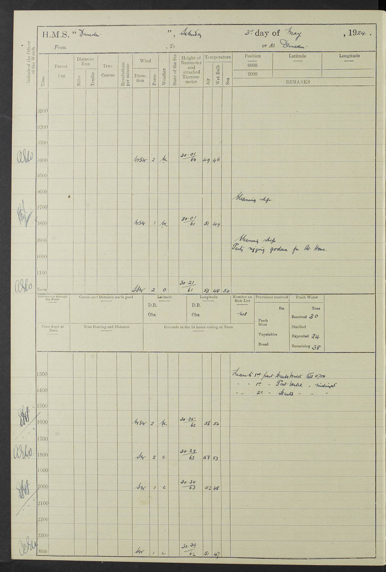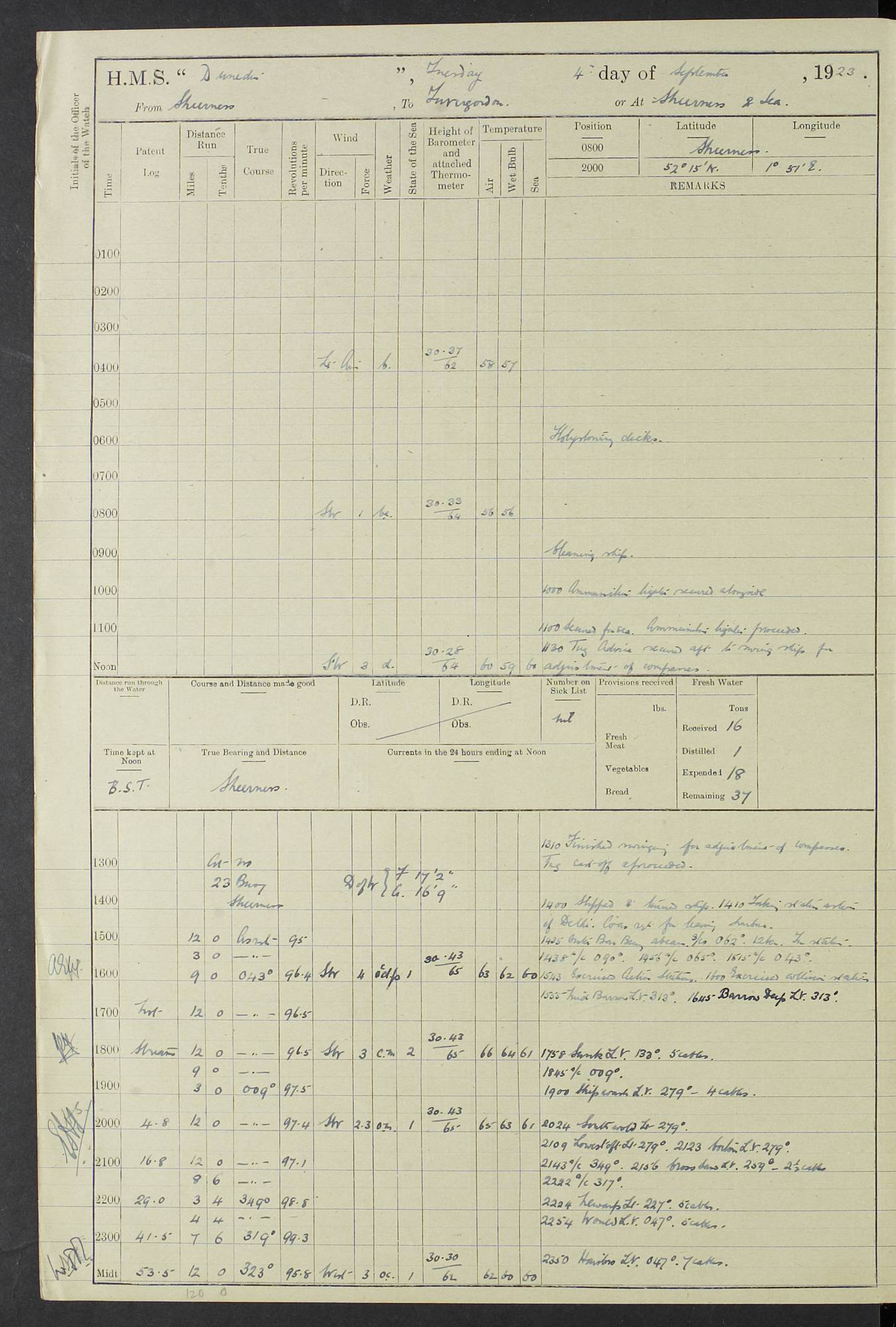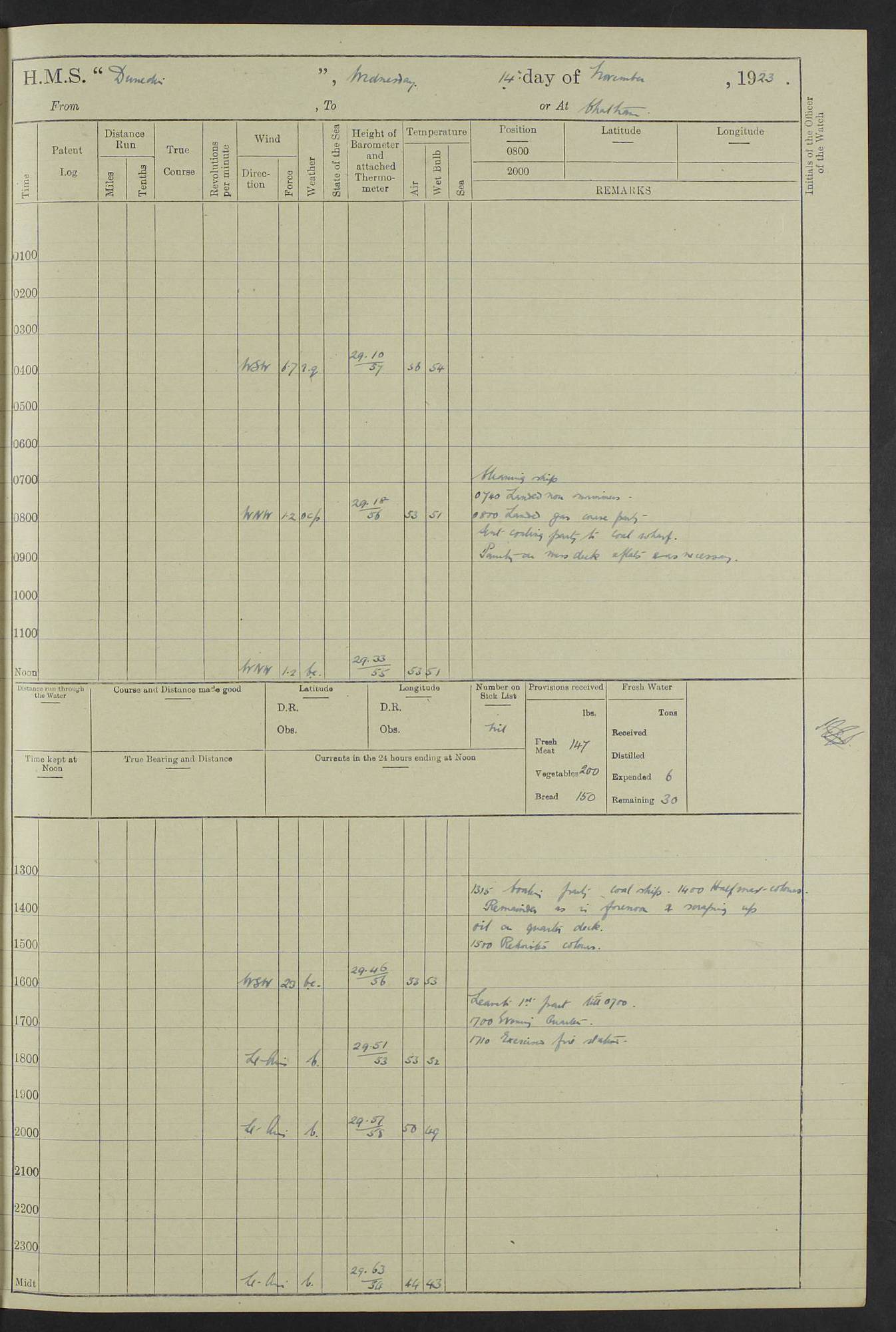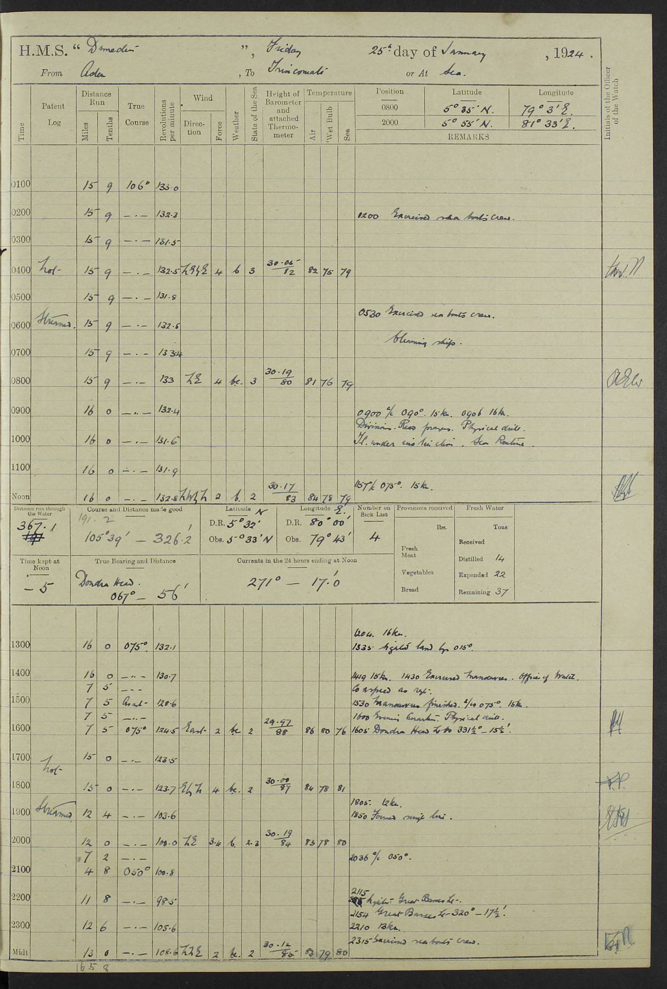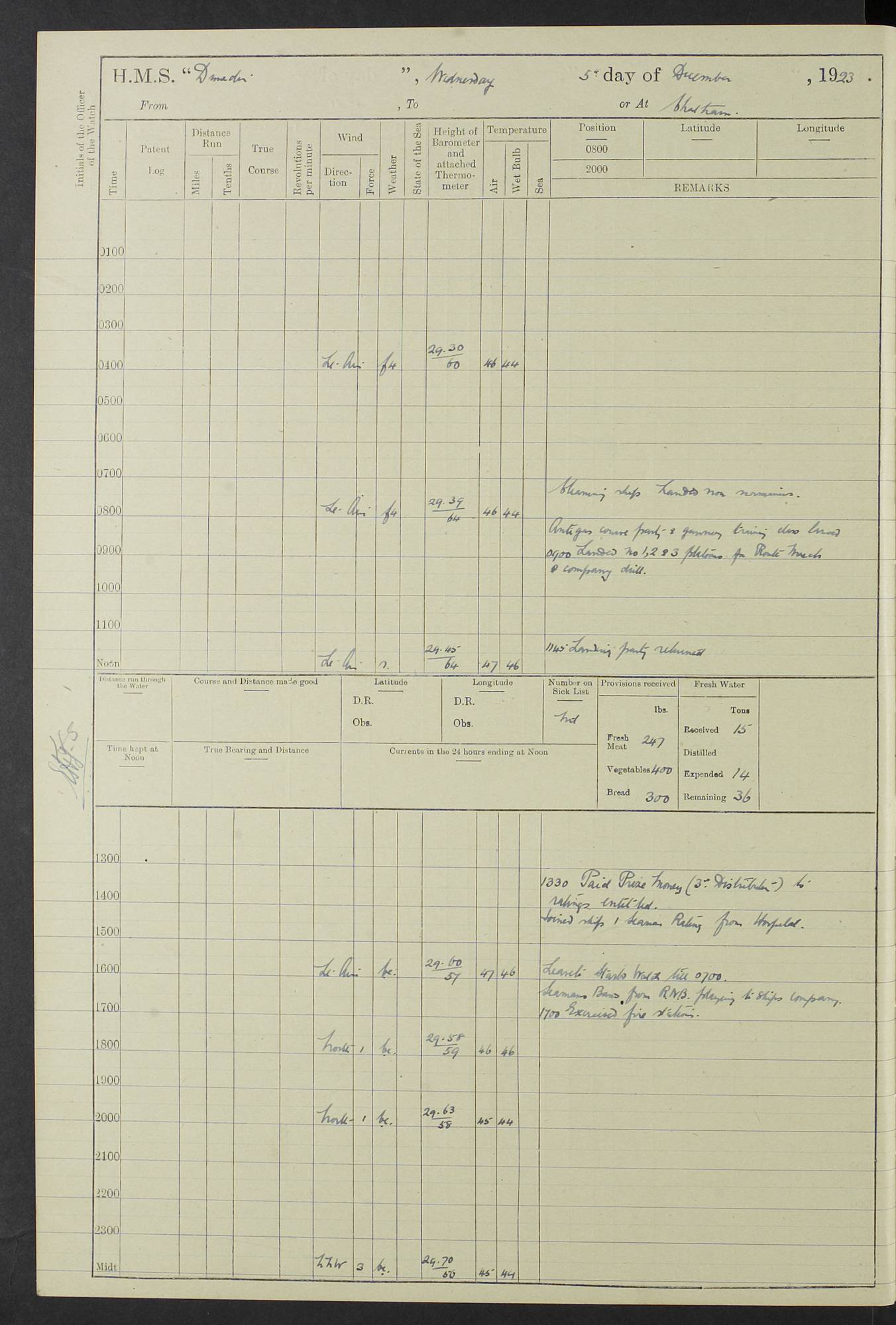 (Maps prepared using Journey Plotter, developed by Maikel. The Plots can only be approximate. They are made by joining-up positions on successive days, and sometimes positions are not given. There will therefore be occasions when the ship appears to have travelled overland) LOG BOOK – 23RD SEPTEMBER 1920 TO 13TH SEPTEMBER 1921 4caf8d9dcadfd3419703bde2: (http://oldweather.s3.amazonaws.com/ADM53-76345/ADM53-76345_0.jpg) Left front cover of Ship’s Log. 4caf8d9dcadfd3419703bde3: (http://oldweather.s3.amazonaws.com/ADM53-76345/ADM53-76345_1.jpg) Right front cover of Ship’s Log. 4caf8d97cadfd3419703bc6a: (http://oldweather.s3.amazonaws.com/ADM53-76345/ADM53-76345-002_0.jpg) 4caf8d97cadfd3419703bc6b: (http://oldweather.s3.amazonaws.com/ADM53-76345/ADM53-76345-002_1.jpg) 4caf8d97cadfd3419703bc6c: (http://oldweather.s3.amazonaws.com/ADM53-76345/ADM53-76345-003_0.jpg) 4caf8d97cadfd3419703bc6d: (http://oldweather.s3.amazonaws.com/ADM53-76345/ADM53-76345-003_1.jpg) 4caf8d97cadfd3419703bc6e: (http://oldweather.s3.amazonaws.com/ADM53-76345/ADM53-76345-004_0.jpg) Blank pages. 4caf8d97cadfd3419703bc6f: (http://oldweather.s3.amazonaws.com/ADM53-76345/ADM53-76345-004_1.jpg) S.- 321. See Articles 557, 619, 622, 924, 1025, 1026 and 1849 of the King’s Regulations, 1913. This Log is to be kept from the time the Ship is Commissioned until she is paid off; when it is to be transmitted as directed by the Admiralty Instructions. The Name and Address of the Officer to whom the acknowledgement of receipt should be sent by the Deputy Cashier in charge, Royal Victoria Yard, Deptford, is to be inserted here. Name: Commander’s Office. Address: H.M.S. Dunedin. c/o G.P.O. London. LOG of H.M.S. “Dunedin” Commanded by Captain C. Wrightson C.B.E. (till 31.3.21). Captain H.S. Monroe D.S.O. (from 31.3.21). FOR THE PERIOD Commencing: Thursday 23rd of September 1920. Ending: Tuesday 13th of September 1921. Tonnage (Displacement): 4,650 Extreme Length: 472ft 3 ins Extreme Breadth: 46 ft 0.3/8” Engines: Manufacturer: Messes R & W Hawthorn Leslie & Co Ltd. Newcastle on Tyne. I.H.P: 40.000 Forced Draught. Description: Turbine (Geared). When Fixed on Board: 1918 – 1919. Boilers: Manufacturer: Messes R & W Hawthorn Leslie & Co Ltd. Newcastle on Tyne. Description: Small tube Improved Yarrow. When made: 1918. When put in vessel: 1918. Paddle Wheels or Screw Propeller: Manufacturer: Manganese Bronze Co. Description: Solid 3 Blades Turbadium Bronze, Pitch 14 ft 3 in. General State of Repair: Satisfactory. R. Alison [?], Lieut Com (W) on paying off 30th August 1923. L. 8418/02. N.L. 15713/13. Where Built Sir W.G. Armstrong Whitworth & Co Ltd. N.L. 18227/18. Armstrong Naval Yard, High Walker, Newcastle on Tyne. Sta. 127/10. Commenced building November 1917, Launched 19 November 1918. N.L. 22782/19. Completed September 1919. 4caf8d98cadfd3419703bc70: (http://oldweather.s3.amazonaws.com/ADM53-76345/ADM53-76345-005_0.jpg) Directions (See King’s Regulations 1913, Articles 1025 and 1849). 1. King’s Regulations. 2. Figures to indicate the Force of the Wind. 3. Letters to denote the State of the Weather. 4. Scale of Fog Intensity. 5. Sea Disturbance Scale 4caf8d98cadfd3419703bc71: (http://oldweather.s3.amazonaws.com/ADM53-76345/ADM53-76345-005_1.jpg) Establishment of Ship’s Company Officers 23 Seamen 187 Boys 36 Marines 46 Engine-room Establishment 105 Other non-executive ratings 44 Total 441 ARMAMENT Position Forecastle: 6” Calibre XII on C.P. XIV mounting. Superstructure: Four 6” Calibre XII on C.P. XIV mountings. Superstructure: Two 3” QF Calibre High Angle mountings, Quarterdeck: 6” Calibre XII on C.P. XIV mountings. Torpedo Armaments Four above water 21” triple tubes. BAROMETER Mercurial or Aneroid: Mercurial. Name of Maker and number: J. Hitchins 101 A747. Height of cistern above sea: 13ft. Error of Mercurial Barometer: Nil at 30.00. Thermometers for Air Temperature. Position on Ship: On fore bridge. Whether in screen: Yes. Maker and No. Negretti & Zambra From: 7.10.19 To: Sept. 1921. Negretti & Zambra No. 10499 Negretti & Zambra No 10391 From: 7.10.19 To: Sept. 1921. Thermometer for Sea Temperature. A. Harper & Sons 7.10.19 POSITION OF STANDARD COMPASS. Manoeuvring Platform. (Fore bridge) BOATS Number of each carried: 1 x 30ft. motor boat. 2 x 32ft. cutters. 1 x 30ft gig. 2 x 27ft whalers. 2 x 16 ft dinghies. MISCELLANEOUS INFORMATION Draught of water with Bunkers full, and complete with provisions, Stores and water: Forward 16 ft 1 inch; Aft 16 ft 11 inches. Number of Tons necessary to increase draught 1 inch: 35.6. Number of Tons of Coal Carried: 16. Number of Tons of Oil Fuel carried: 1127. Quantity of Water Carried (a) For Boilers: 157 tons. (b) For Drinking: 56½ tons. LOGS FOR SEPTEMBER 1920 4caf8d98cadfd3419703bc72: (http://oldweather.s3.amazonaws.com/ADM53-76345/ADM53-76345-006_0.jpg) 23 September 1920 At Copenhagen. Lat 55.694, Long 12.603 4.00am: Signal books correct. am: Hands employed cleaning ship. 8.00am: Signal books correct. am: Sent coaling party to S.S. “Volo”. am: X & Y 6” guns crews at loader drill, remainder of hands employed as requisite. am: Coaling party returned. Noon: Signal books correct. 1.15pm: Sent coaling party to S.S. “Volo”. pm: 1 Rating joined ship from hospital. pm: Boys & training classes under instruction, remainder of hands employed as requisite. 3.00pm: U.S.S. “Gilmer” arrived. [Gilmer, U.S. Destroyer, Flush Decker, launched 18/7/19, Guns: 4 x 5”, 51 cal.,1 x 3”, 23 cal. AA, 12 x 21” TT’s in 4 triple deck mountings. Disp: 1,215 tons, SHP: 26,000 = 35 knots. Jane’s Fighting Ships 1919. Image]. 4.00pm: Signal books correct. pm: Coaling party returned. 8.00pm: Signal books correct. Midnight: Signal books correct. 4caf8d98cadfd3419703bc73: (http://oldweather.s3.amazonaws.com/ADM53-76345/ADM53-76345-006_1.jpg) 24 September 1920 At Copenhagen. Lat 55.694, Long 12.603 4.00am: Signal books correct. am: Hands employed cleaning ship. 6.15am: U.S.S. “Sh