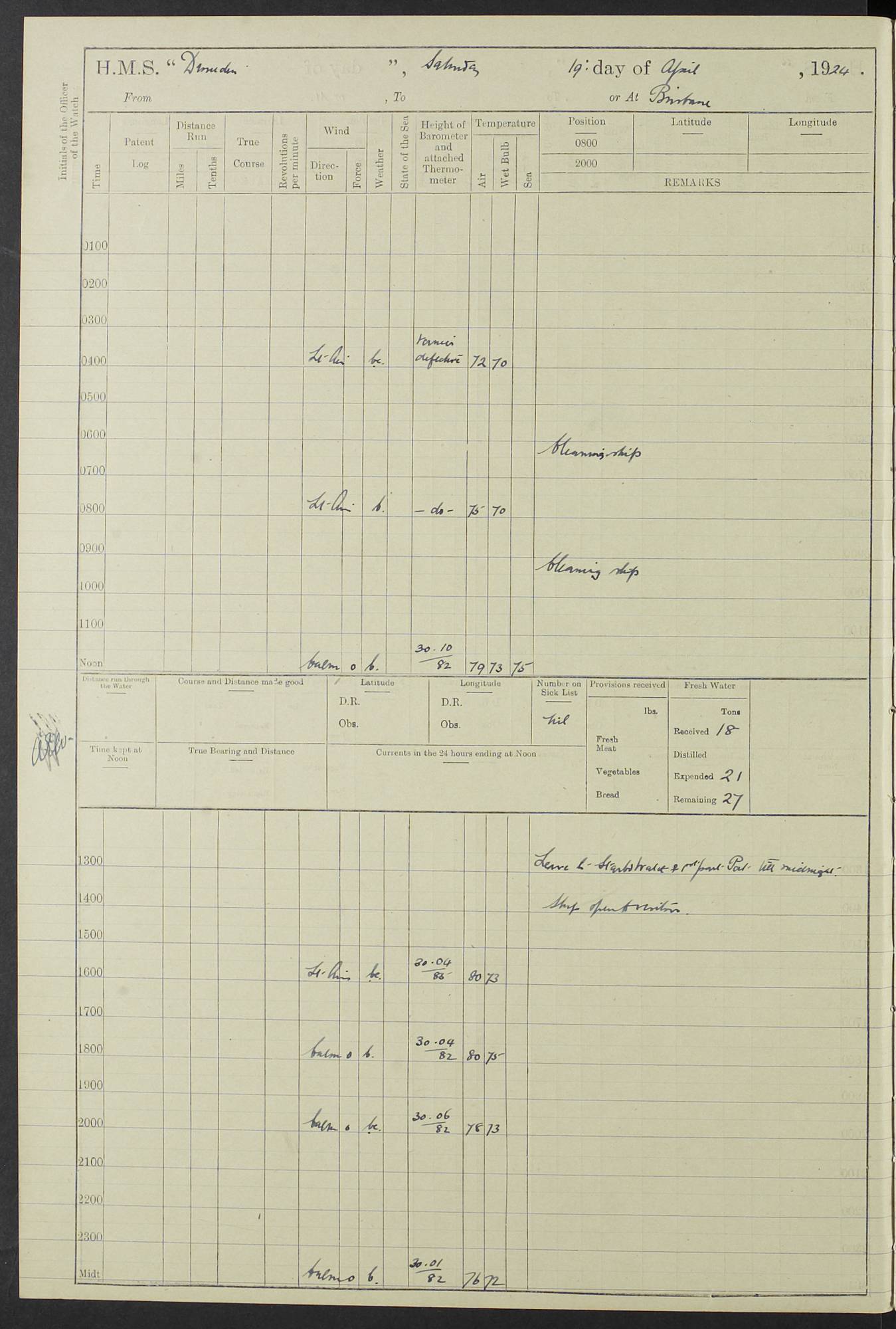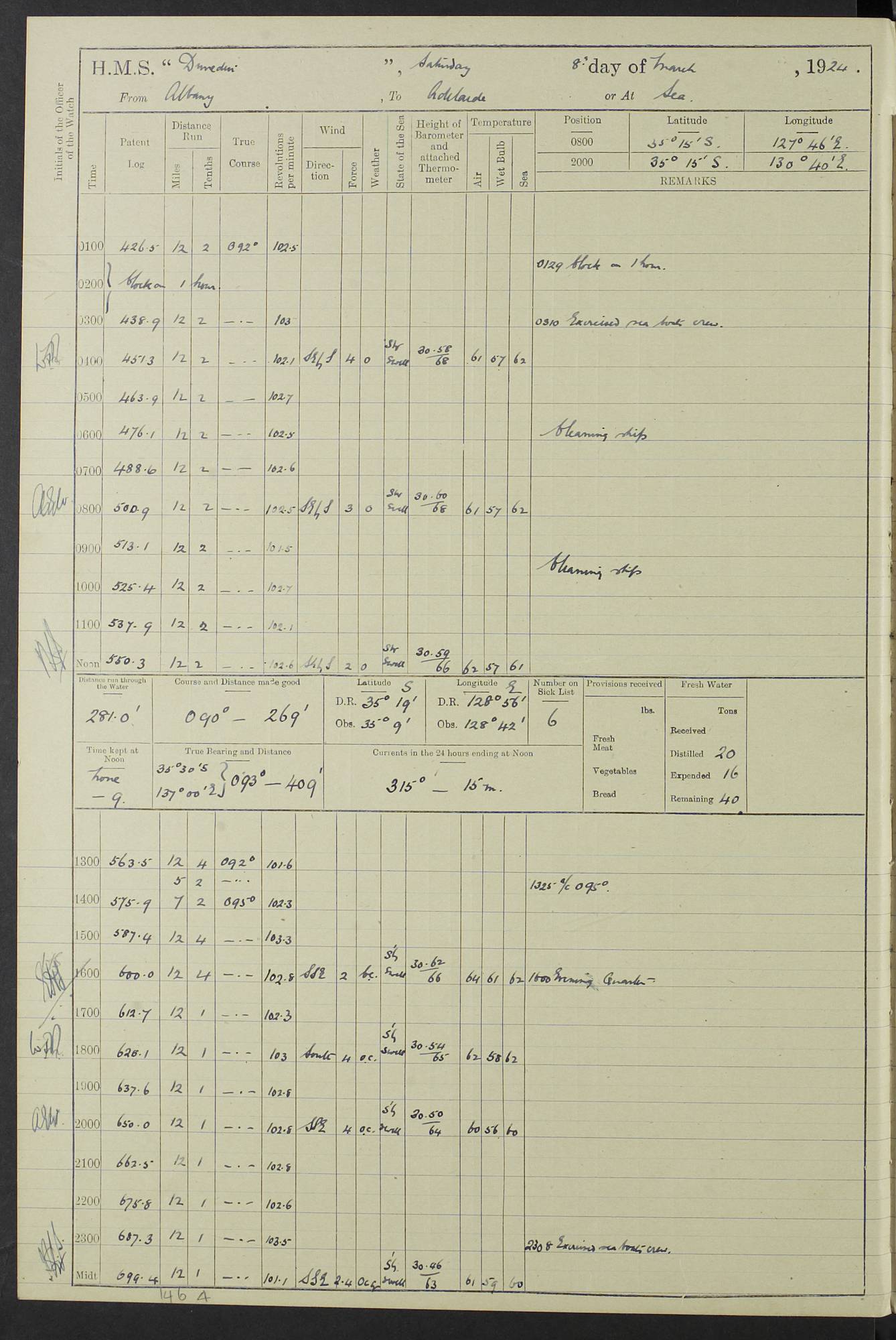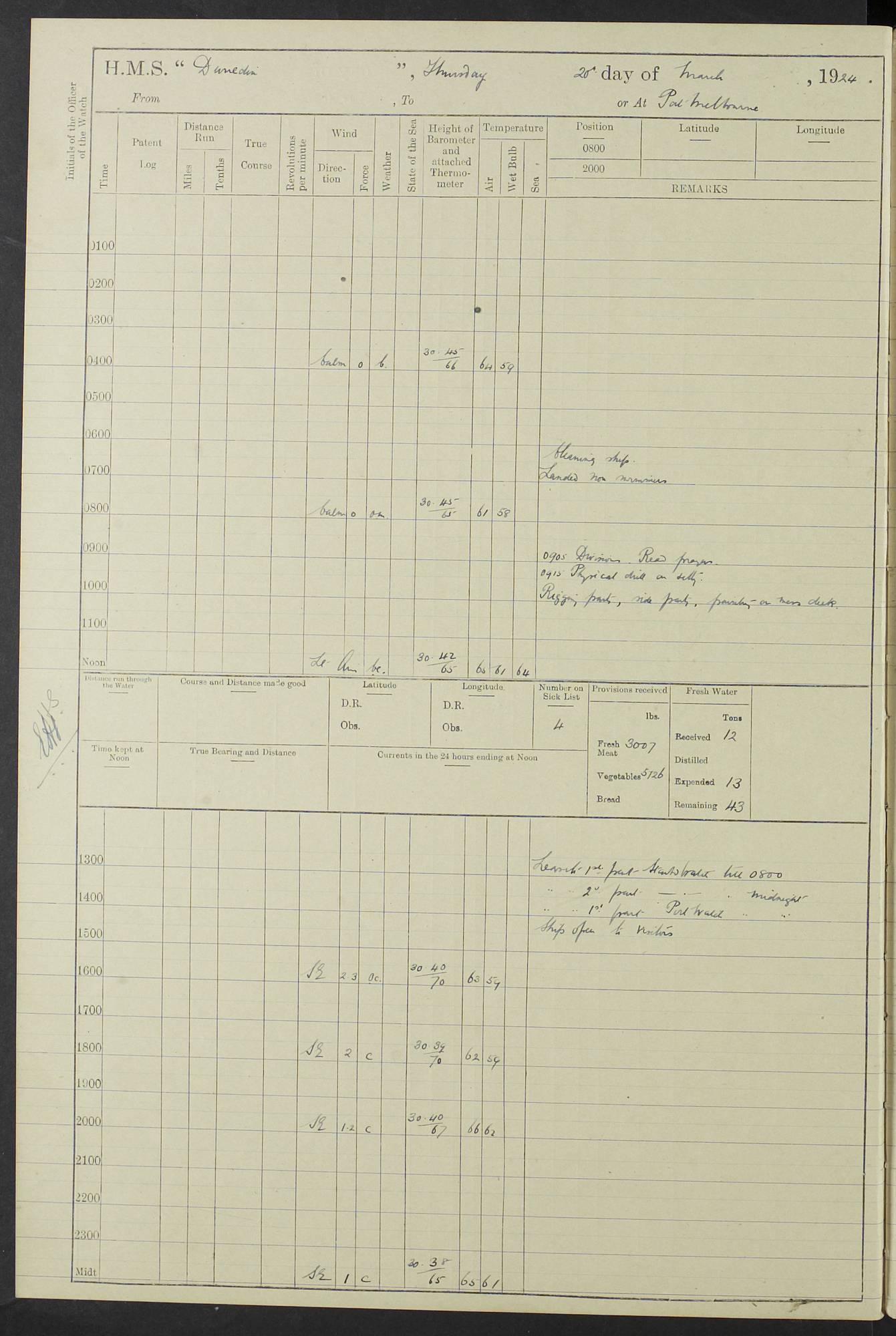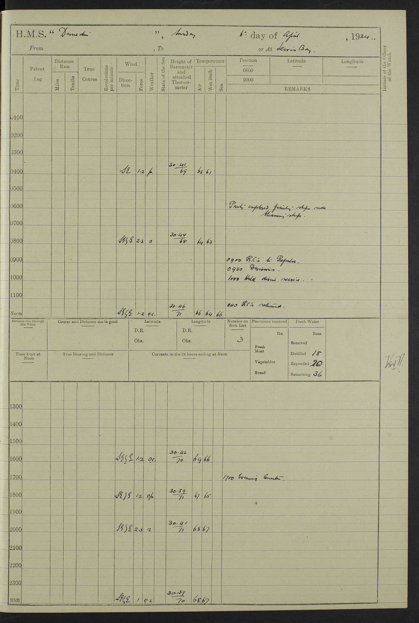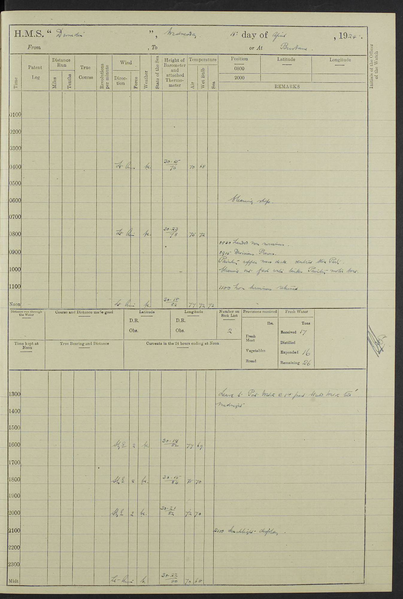 (Maps prepared using Journey Plotter, developed by Maikel. The Plots can only be approximate. They are made by joining-up positions on successive days, and sometimes positions are not given. There will therefore be occasions when the ship appears to have travelled overland) LOG BOOK – 23RD SEPTEMBER 1920 TO 13TH SEPTEMBER 1921 4caf8d9dcadfd3419703bde2: (http://oldweather.s3.amazonaws.com/ADM53-76345/ADM53-76345_0.jpg) Left front cover of Ship’s Log. 4caf8d9dcadfd3419703bde3: (http://oldweather.s3.amazonaws.com/ADM53-76345/ADM53-76345_1.jpg) Right front cover of Ship’s Log. 4caf8d97cadfd3419703bc6a: (http://oldweather.s3.amazonaws.com/ADM53-76345/ADM53-76345-002_0.jpg) 4caf8d97cadfd3419703bc6b: (http://oldweather.s3.amazonaws.com/ADM53-76345/ADM53-76345-002_1.jpg) 4caf8d97cadfd3419703bc6c: (http://oldweather.s3.amazonaws.com/ADM53-76345/ADM53-76345-003_0.jpg) 4caf8d97cadfd3419703bc6d: (http://oldweather.s3.amazonaws.com/ADM53-76345/ADM53-76345-003_1.jpg) 4caf8d97cadfd3419703bc6e: (http://oldweather.s3.amazonaws.com/ADM53-76345/ADM53-76345-004_0.jpg) Blank pages. 4caf8d97cadfd3419703bc6f: (http://oldweather.s3.amazonaws.com/ADM53-76345/ADM53-76345-004_1.jpg) S.- 321. See Articles 557, 619, 622, 924, 1025, 1026 and 1849 of the King’s Regulations, 1913. This Log is to be kept from the time the Ship is Commissioned until she is paid off; when it is to be transmitted as directed by the Admiralty Instructions. The Name and Address of the Officer to whom the acknowledgement of receipt should be sent by the Deputy Cashier in charge, Royal Victoria Yard, Deptford, is to be inserted here. Name: Commander’s Office. Address: H.M.S. Dunedin. c/o G.P.O. London. LOG of H.M.S. “Dunedin” Commanded by Captain C. Wrightson C.B.E. (till 31.3.21). Captain H.S. Monroe D.S.O. (from 31.3.21). FOR THE PERIOD Commencing: Thursday 23rd of September 1920. Ending: Tuesday 13th of September 1921. Tonnage (Displacement): 4,650 Extreme Length: 472ft 3 ins Extreme Breadth: 46 ft 0.3/8” Engines: Manufacturer: Messes R & W Hawthorn Leslie & Co Ltd. Newcastle on Tyne. I.H.P: 40.000 Forced Draught. Description: Turbine (Geared). When Fixed on Board: 1918 – 1919. Boilers: Manufacturer: Messes R & W Hawthorn Leslie & Co Ltd. Newcastle on Tyne. Description: Small tube Improved Yarrow. When made: 1918. When put in vessel: 1918. Paddle Wheels or Screw Propeller: Manufacturer: Manganese Bronze Co. Description: Solid 3 Blades Turbadium Bronze, Pitch 14 ft 3 in. General State of Repair: Satisfactory. R. Alison [?], Lieut Com (W) on paying off 30th August 1923. L. 8418/02. N.L. 15713/13. Where Built Sir W.G. Armstrong Whitworth & Co Ltd. N.L. 18227/18. Armstrong Naval Yard, High Walker, Newcastle on Tyne. Sta. 127/10. Commenced building November 1917, Launched 19 November 1918. N.L. 22782/19. Completed September 1919. 4caf8d98cadfd3419703bc70: (http://oldweather.s3.amazonaws.com/ADM53-76345/ADM53-76345-005_0.jpg) Directions (See King’s Regulations 1913, Articles 1025 and 1849). 1. King’s Regulations. 2. Figures to indicate the Force of the Wind. 3. Letters to denote the State of the Weather. 4. Scale of Fog Intensity. 5. Sea Disturbance Scale 4caf8d98cadfd3419703bc71: (http://oldweather.s3.amazonaws.com/ADM53-76345/ADM53-76345-005_1.jpg) Establishment of Ship’s Company Officers 23 Seamen 187 Boys 36 Marines 46 Engine-room Establishment 105 Other non-executive ratings 44 Total 441 ARMAMENT Position Forecastle: 6” Calibre XII on C.P. XIV mounting. Superstructure: Four 6” Calibre XII on C.P. XIV mountings. Superstructure: Two 3” QF Calibre High Angle mountings, Quarterdeck: 6” Calibre XII on C.P. XIV mountings. Torpedo Armaments Four above water 21” triple tubes. BAROMETER Mercurial or Aneroid: Mercurial. Name of Maker and number: J. Hitchins 101 A747. Height of cistern above sea: 13ft. Error of Mercurial Barometer: Nil at 30.00. Thermometers for Air Temperature. Position on Ship: On fore bridge. Whether in screen: Yes. Maker and No. Negretti & Zambra From: 7.10.19 To: Sept. 1921. Negretti & Zambra No. 10499 Negretti & Zambra No 10391 From: 7.10.19 To: Sept. 1921. Thermometer for Sea Temperature. A. Harper & Sons 7.10.19 POSITION OF STANDARD COMPASS. Manoeuvring Platform. (Fore bridge) BOATS Number of each carried: 1 x 30ft. motor boat. 2 x 32ft. cutters. 1 x 30ft gig. 2 x 27ft whalers. 2 x 16 ft dinghies. MISCELLANEOUS INFORMATION Draught of water with Bunkers full, and complete with provisions, Stores and water: Forward 16 ft 1 inch; Aft 16 ft 11 inches. Number of Tons necessary to increase draught 1 inch: 35.6. Number of Tons of Coal Carried: 16. Number of Tons of Oil Fuel carried: 1127. Quantity of Water Carried (a) For Boilers: 157 tons. (b) For Drinking: 56½ tons. LOGS FOR SEPTEMBER 1920 4caf8d98cadfd3419703bc72: (http://oldweather.s3.amazonaws.com/ADM53-76345/ADM53-76345-006_0.jpg) 23 September 1920 At Copenhagen. Lat 55.694, Long 12.603 4.00am: Signal books correct. am: Hands employed cleaning ship. 8.00am: Signal books correct. am: Sent coaling party to S.S. “Volo”. am: X & Y 6” guns crews at loader drill, remainder of hands employed as requisite. am: Coaling party returned. Noon: Signal books correct. 1.15pm: Sent coaling party to S.S. “Volo”. pm: 1 Rating joined ship from hospital. pm: Boys & training classes under instruction, remainder of hands employed as requisite. 3.00pm: U.S.S. “Gilmer” arrived. [Gilmer, U.S. Destroyer, Flush Decker, launched 18/7/19, Guns: 4 x 5”, 51 cal.,1 x 3”, 23 cal. AA, 12 x 21” TT’s in 4 triple deck mountings. Disp: 1,215 tons, SHP: 26,000 = 35 knots. Jane’s Fighting Ships 1919. Image]. 4.00pm: Signal books correct. pm: Coaling party returned. 8.00pm: Signal books correct. Midnight: Signal books correct. 4caf8d98cadfd3419703bc73: (http://oldweather.s3.amazonaws.com/ADM53-76345/ADM53-76345-006_1.jpg) 24 September 1920 At Copenhagen. Lat 55.694, Long 12.603 4.00am: Signal books correct. am: Hands employed cleaning ship. 6.15am: U.S.S. “Sh