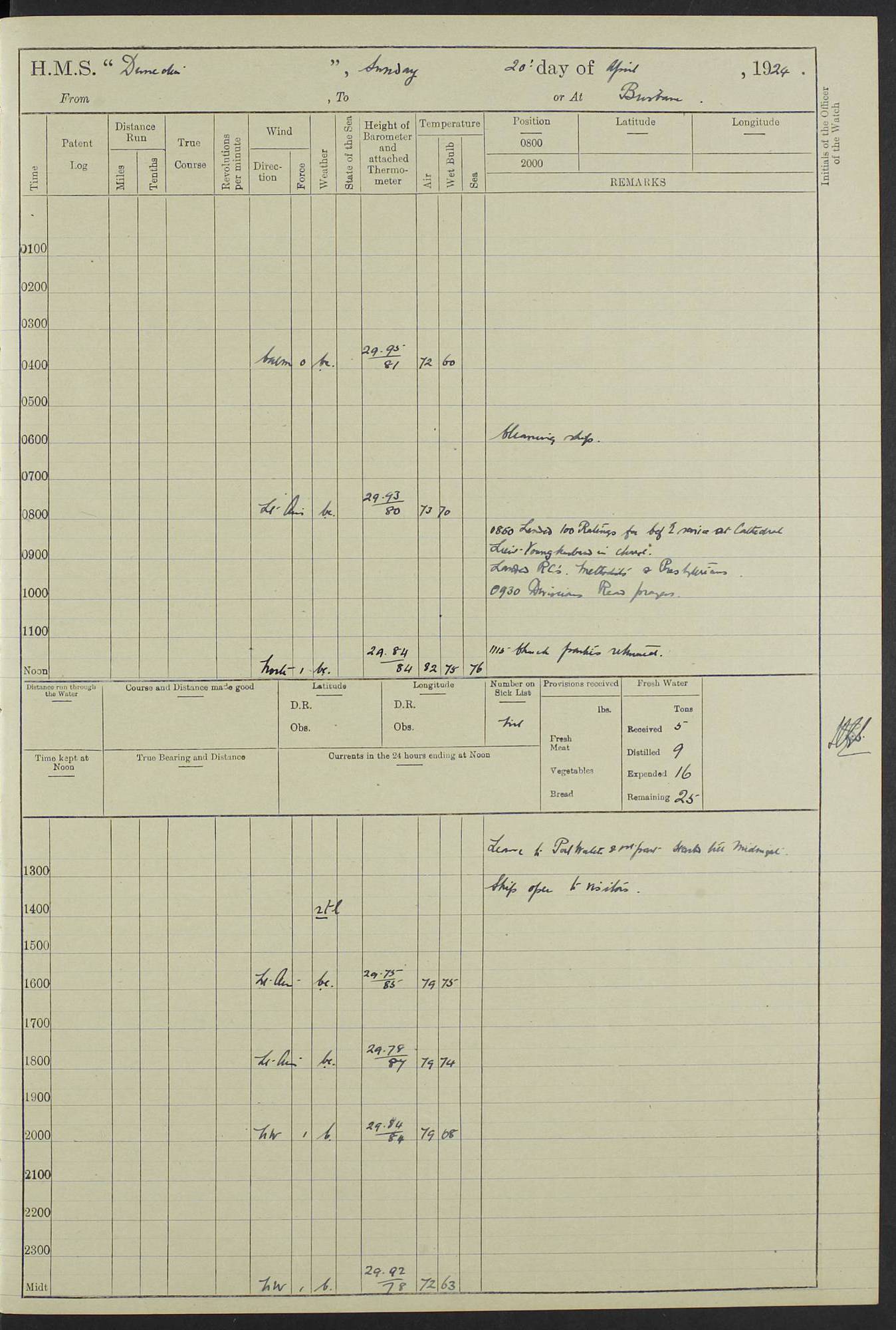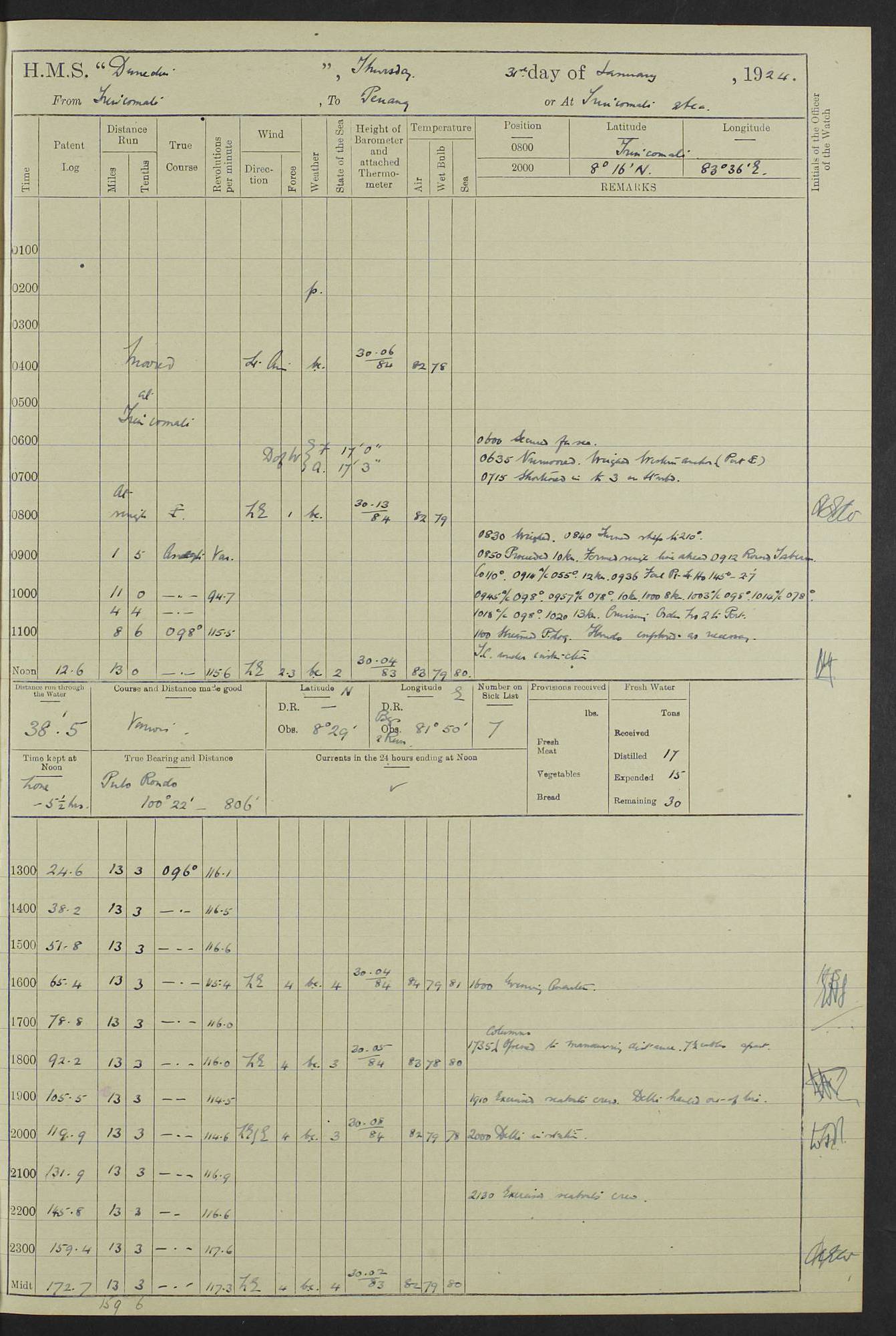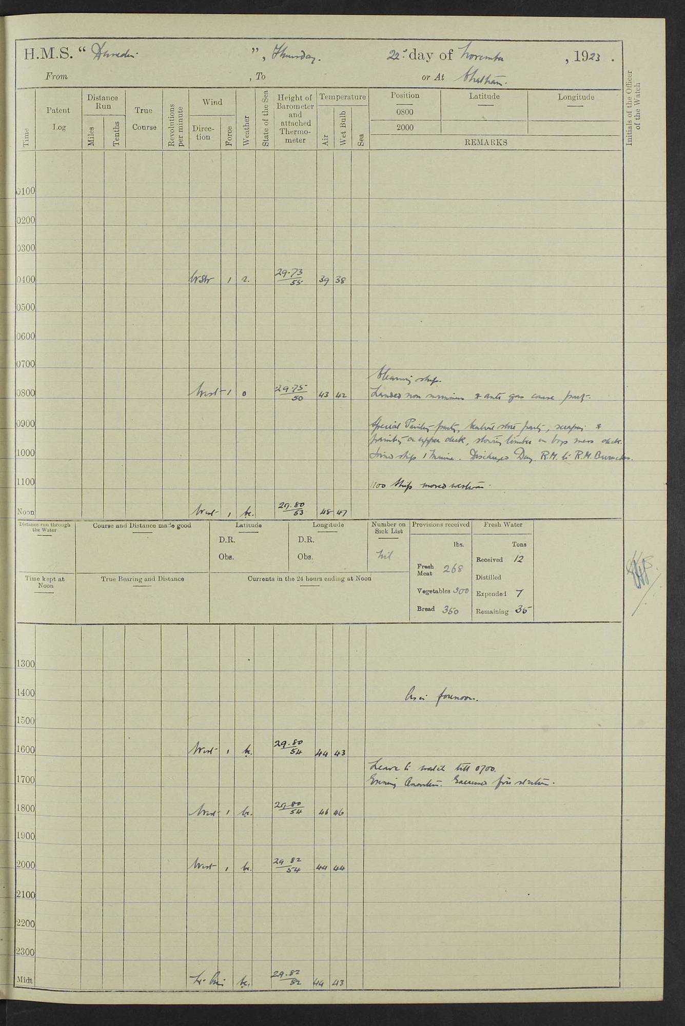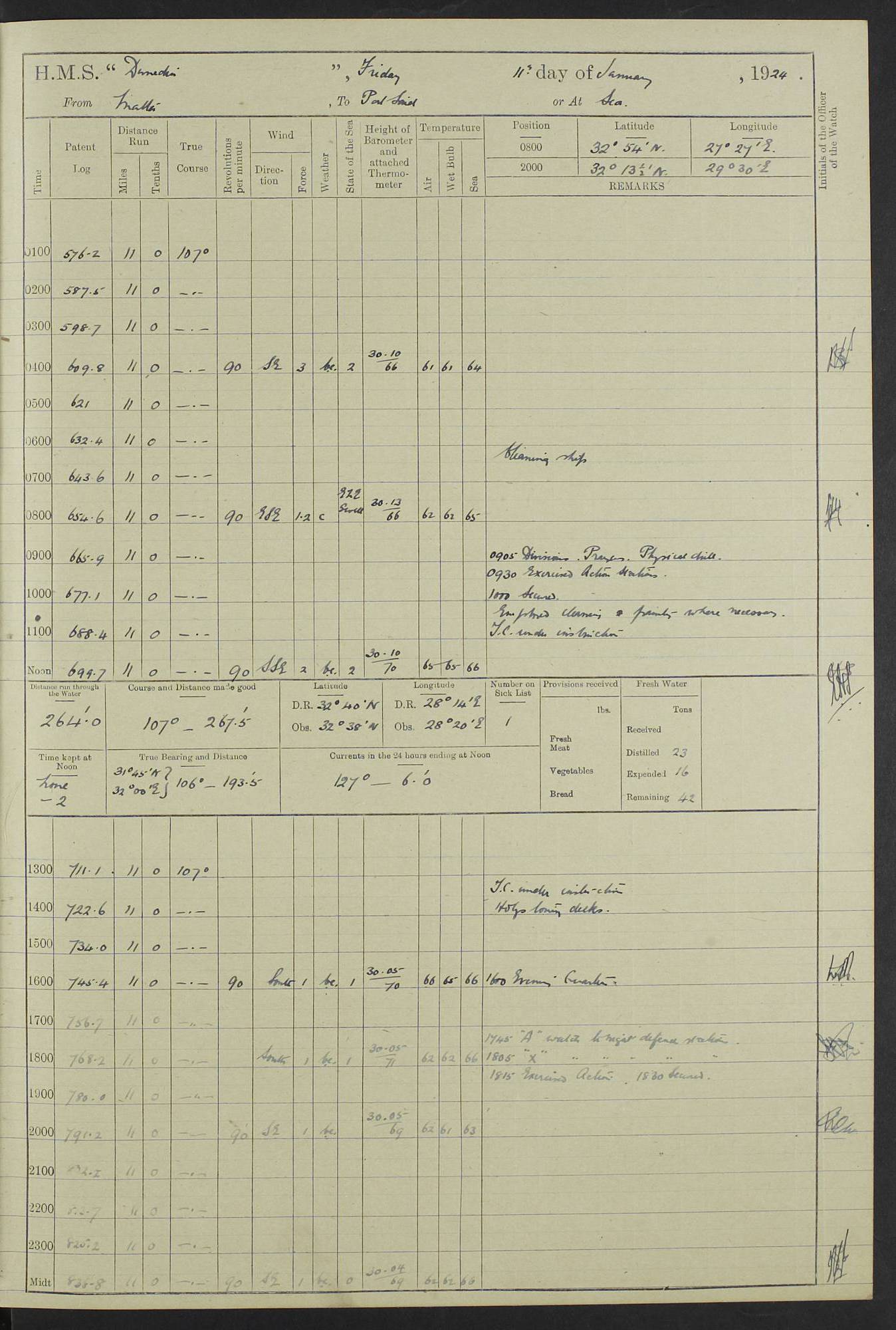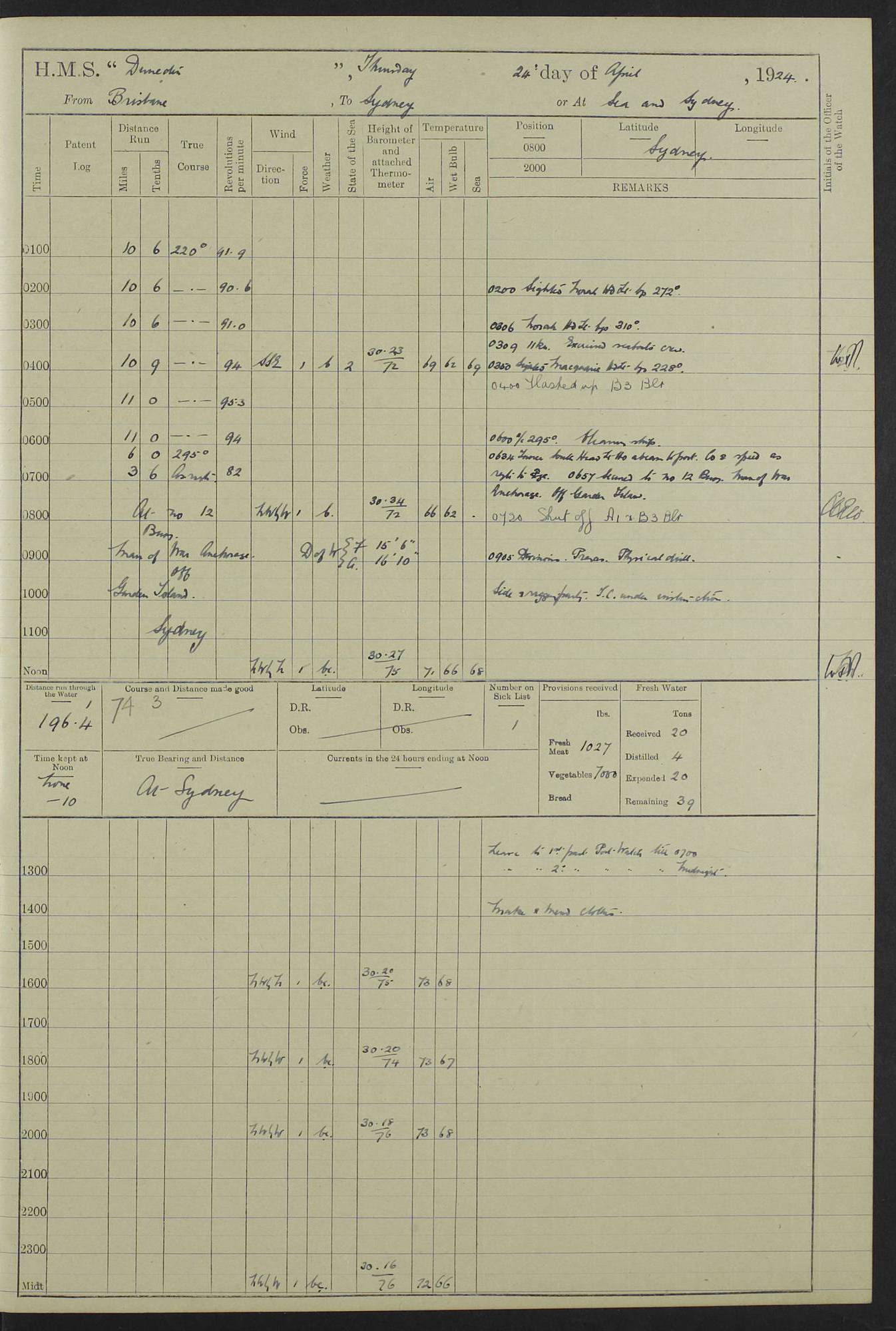 (Maps prepared using Journey Plotter, developed by Maikel. The Plots can only be approximate. They are made by joining-up positions on successive days, and sometimes positions are not given. There will therefore be occasions when the ship appears to have travelled overland) LOG BOOK – 23RD SEPTEMBER 1920 TO 13TH SEPTEMBER 1921 4caf8d9dcadfd3419703bde2: (http://oldweather.s3.amazonaws.com/ADM53-76345/ADM53-76345_0.jpg) Left front cover of Ship’s Log. 4caf8d9dcadfd3419703bde3: (http://oldweather.s3.amazonaws.com/ADM53-76345/ADM53-76345_1.jpg) Right front cover of Ship’s Log. 4caf8d97cadfd3419703bc6a: (http://oldweather.s3.amazonaws.com/ADM53-76345/ADM53-76345-002_0.jpg) 4caf8d97cadfd3419703bc6b: (http://oldweather.s3.amazonaws.com/ADM53-76345/ADM53-76345-002_1.jpg) 4caf8d97cadfd3419703bc6c: (http://oldweather.s3.amazonaws.com/ADM53-76345/ADM53-76345-003_0.jpg) 4caf8d97cadfd3419703bc6d: (http://oldweather.s3.amazonaws.com/ADM53-76345/ADM53-76345-003_1.jpg) 4caf8d97cadfd3419703bc6e: (http://oldweather.s3.amazonaws.com/ADM53-76345/ADM53-76345-004_0.jpg) Blank pages. 4caf8d97cadfd3419703bc6f: (http://oldweather.s3.amazonaws.com/ADM53-76345/ADM53-76345-004_1.jpg) S.- 321. See Articles 557, 619, 622, 924, 1025, 1026 and 1849 of the King’s Regulations, 1913. This Log is to be kept from the time the Ship is Commissioned until she is paid off; when it is to be transmitted as directed by the Admiralty Instructions. The Name and Address of the Officer to whom the acknowledgement of receipt should be sent by the Deputy Cashier in charge, Royal Victoria Yard, Deptford, is to be inserted here. Name: Commander’s Office. Address: H.M.S. Dunedin. c/o G.P.O. London. LOG of H.M.S. “Dunedin” Commanded by Captain C. Wrightson C.B.E. (till 31.3.21). Captain H.S. Monroe D.S.O. (from 31.3.21). FOR THE PERIOD Commencing: Thursday 23rd of September 1920. Ending: Tuesday 13th of September 1921. Tonnage (Displacement): 4,650 Extreme Length: 472ft 3 ins Extreme Breadth: 46 ft 0.3/8” Engines: Manufacturer: Messes R & W Hawthorn Leslie & Co Ltd. Newcastle on Tyne. I.H.P: 40.000 Forced Draught. Description: Turbine (Geared). When Fixed on Board: 1918 – 1919. Boilers: Manufacturer: Messes R & W Hawthorn Leslie & Co Ltd. Newcastle on Tyne. Description: Small tube Improved Yarrow. When made: 1918. When put in vessel: 1918. Paddle Wheels or Screw Propeller: Manufacturer: Manganese Bronze Co. Description: Solid 3 Blades Turbadium Bronze, Pitch 14 ft 3 in. General State of Repair: Satisfactory. R. Alison [?], Lieut Com (W) on paying off 30th August 1923. L. 8418/02. N.L. 15713/13. Where Built Sir W.G. Armstrong Whitworth & Co Ltd. N.L. 18227/18. Armstrong Naval Yard, High Walker, Newcastle on Tyne. Sta. 127/10. Commenced building November 1917, Launched 19 November 1918. N.L. 22782/19. Completed September 1919. 4caf8d98cadfd3419703bc70: (http://oldweather.s3.amazonaws.com/ADM53-76345/ADM53-76345-005_0.jpg) Directions (See King’s Regulations 1913, Articles 1025 and 1849). 1. King’s Regulations. 2. Figures to indicate the Force of the Wind. 3. Letters to denote the State of the Weather. 4. Scale of Fog Intensity. 5. Sea Disturbance Scale 4caf8d98cadfd3419703bc71: (http://oldweather.s3.amazonaws.com/ADM53-76345/ADM53-76345-005_1.jpg) Establishment of Ship’s Company Officers 23 Seamen 187 Boys 36 Marines 46 Engine-room Establishment 105 Other non-executive ratings 44 Total 441 ARMAMENT Position Forecastle: 6” Calibre XII on C.P. XIV mounting. Superstructure: Four 6” Calibre XII on C.P. XIV mountings. Superstructure: Two 3” QF Calibre High Angle mountings, Quarterdeck: 6” Calibre XII on C.P. XIV mountings. Torpedo Armaments Four above water 21” triple tubes. BAROMETER Mercurial or Aneroid: Mercurial. Name of Maker and number: J. Hitchins 101 A747. Height of cistern above sea: 13ft. Error of Mercurial Barometer: Nil at 30.00. Thermometers for Air Temperature. Position on Ship: On fore bridge. Whether in screen: Yes. Maker and No. Negretti & Zambra From: 7.10.19 To: Sept. 1921. Negretti & Zambra No. 10499 Negretti & Zambra No 10391 From: 7.10.19 To: Sept. 1921. Thermometer for Sea Temperature. A. Harper & Sons 7.10.19 POSITION OF STANDARD COMPASS. Manoeuvring Platform. (Fore bridge) BOATS Number of each carried: 1 x 30ft. motor boat. 2 x 32ft. cutters. 1 x 30ft gig. 2 x 27ft whalers. 2 x 16 ft dinghies. MISCELLANEOUS INFORMATION Draught of water with Bunkers full, and complete with provisions, Stores and water: Forward 16 ft 1 inch; Aft 16 ft 11 inches. Number of Tons necessary to increase draught 1 inch: 35.6. Number of Tons of Coal Carried: 16. Number of Tons of Oil Fuel carried: 1127. Quantity of Water Carried (a) For Boilers: 157 tons. (b) For Drinking: 56½ tons. LOGS FOR SEPTEMBER 1920 4caf8d98cadfd3419703bc72: (http://oldweather.s3.amazonaws.com/ADM53-76345/ADM53-76345-006_0.jpg) 23 September 1920 At Copenhagen. Lat 55.694, Long 12.603 4.00am: Signal books correct. am: Hands employed cleaning ship. 8.00am: Signal books correct. am: Sent coaling party to S.S. “Volo”. am: X & Y 6” guns crews at loader drill, remainder of hands employed as requisite. am: Coaling party returned. Noon: Signal books correct. 1.15pm: Sent coaling party to S.S. “Volo”. pm: 1 Rating joined ship from hospital. pm: Boys & training classes under instruction, remainder of hands employed as requisite. 3.00pm: U.S.S. “Gilmer” arrived. [Gilmer, U.S. Destroyer, Flush Decker, launched 18/7/19, Guns: 4 x 5”, 51 cal.,1 x 3”, 23 cal. AA, 12 x 21” TT’s in 4 triple deck mountings. Disp: 1,215 tons, SHP: 26,000 = 35 knots. Jane’s Fighting Ships 1919. Image]. 4.00pm: Signal books correct. pm: Coaling party returned. 8.00pm: Signal books correct. Midnight: Signal books correct. 4caf8d98cadfd3419703bc73: (http://oldweather.s3.amazonaws.com/ADM53-76345/ADM53-76345-006_1.jpg) 24 September 1920 At Copenhagen. Lat 55.694, Long 12.603 4.00am: Signal books correct. am: Hands employed cleaning ship. 6.15am: U.S.S. “Sh