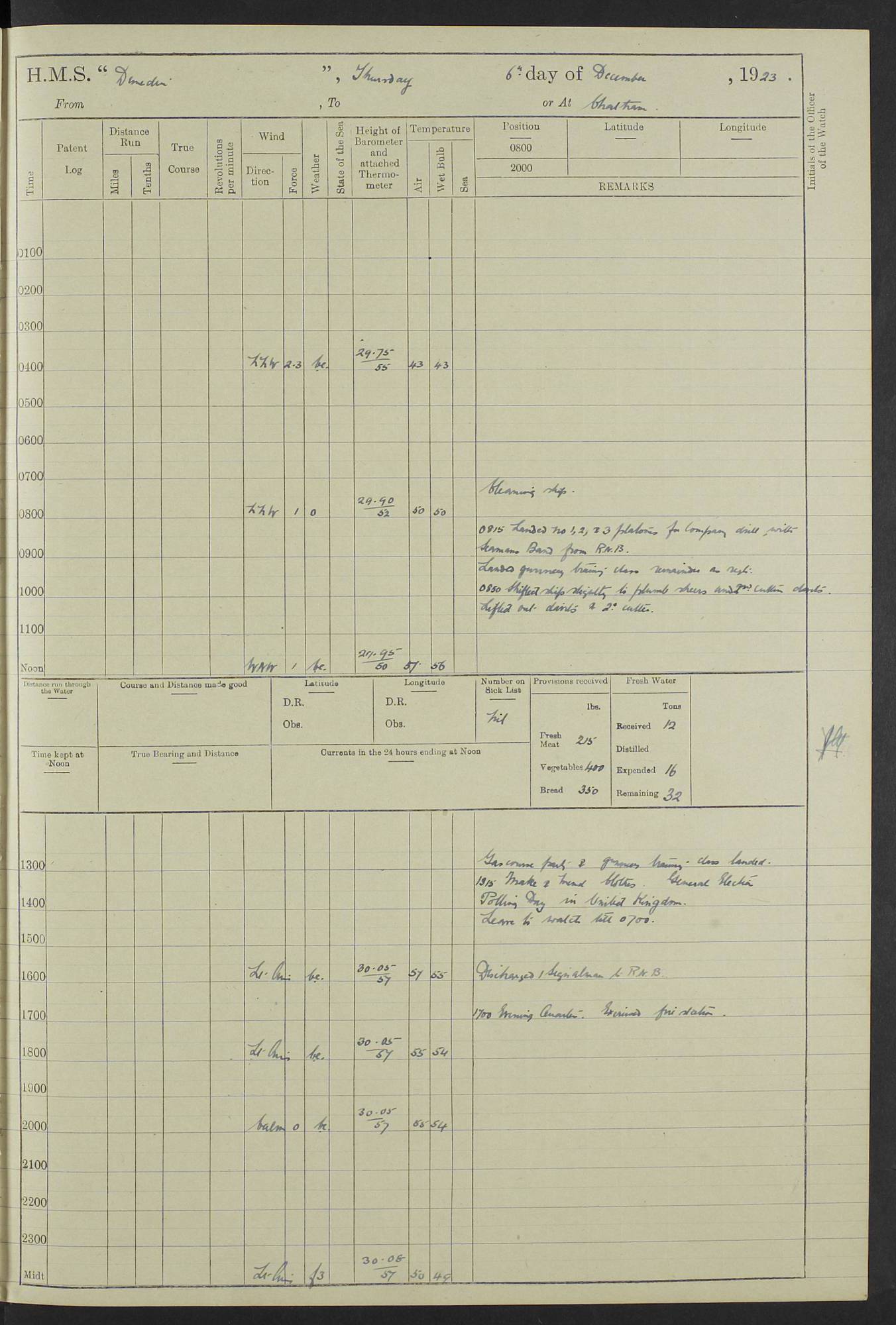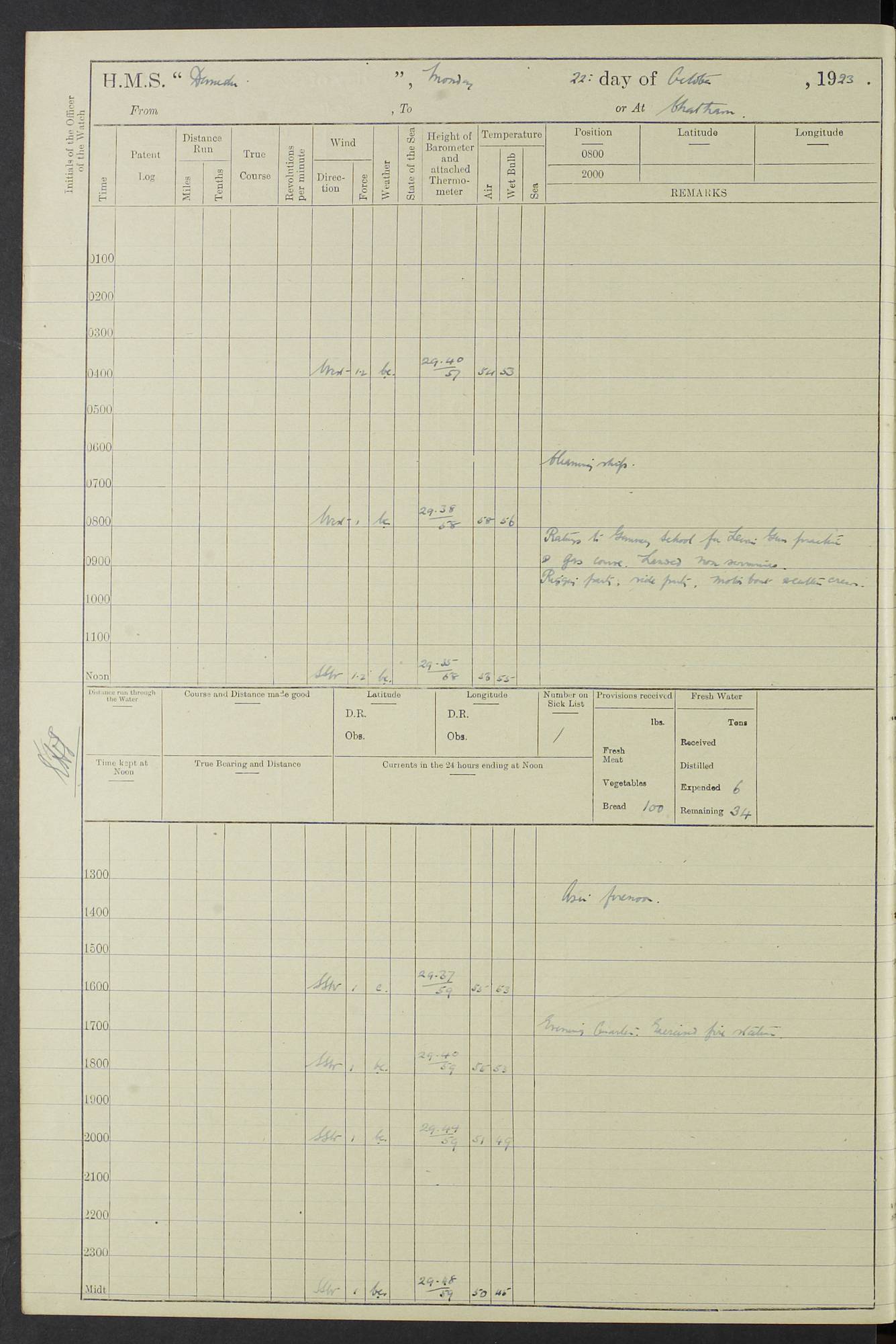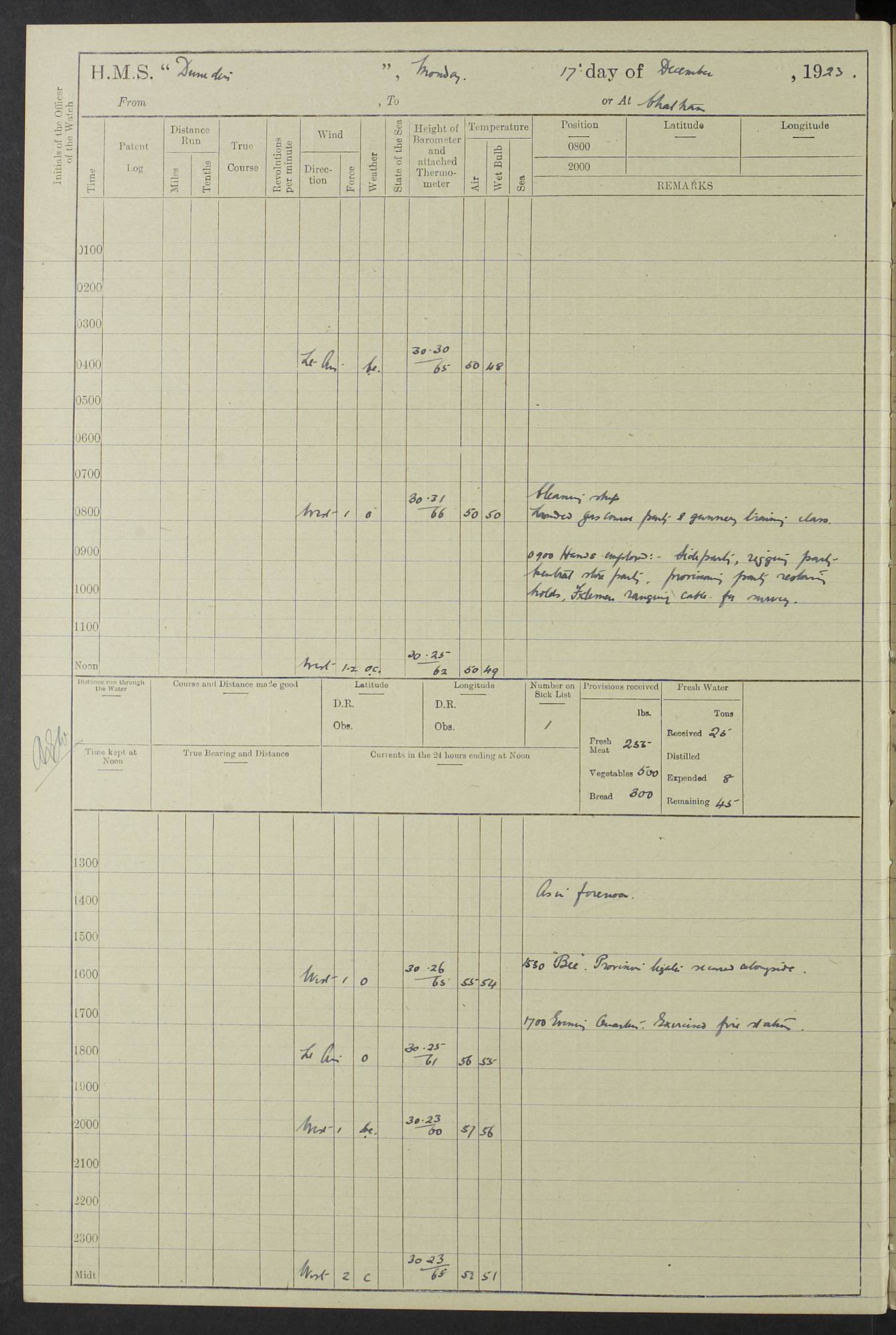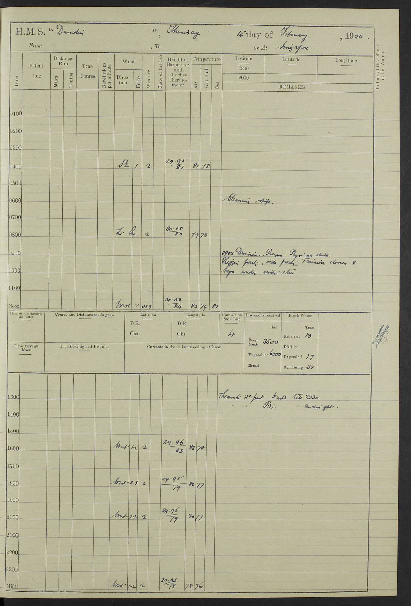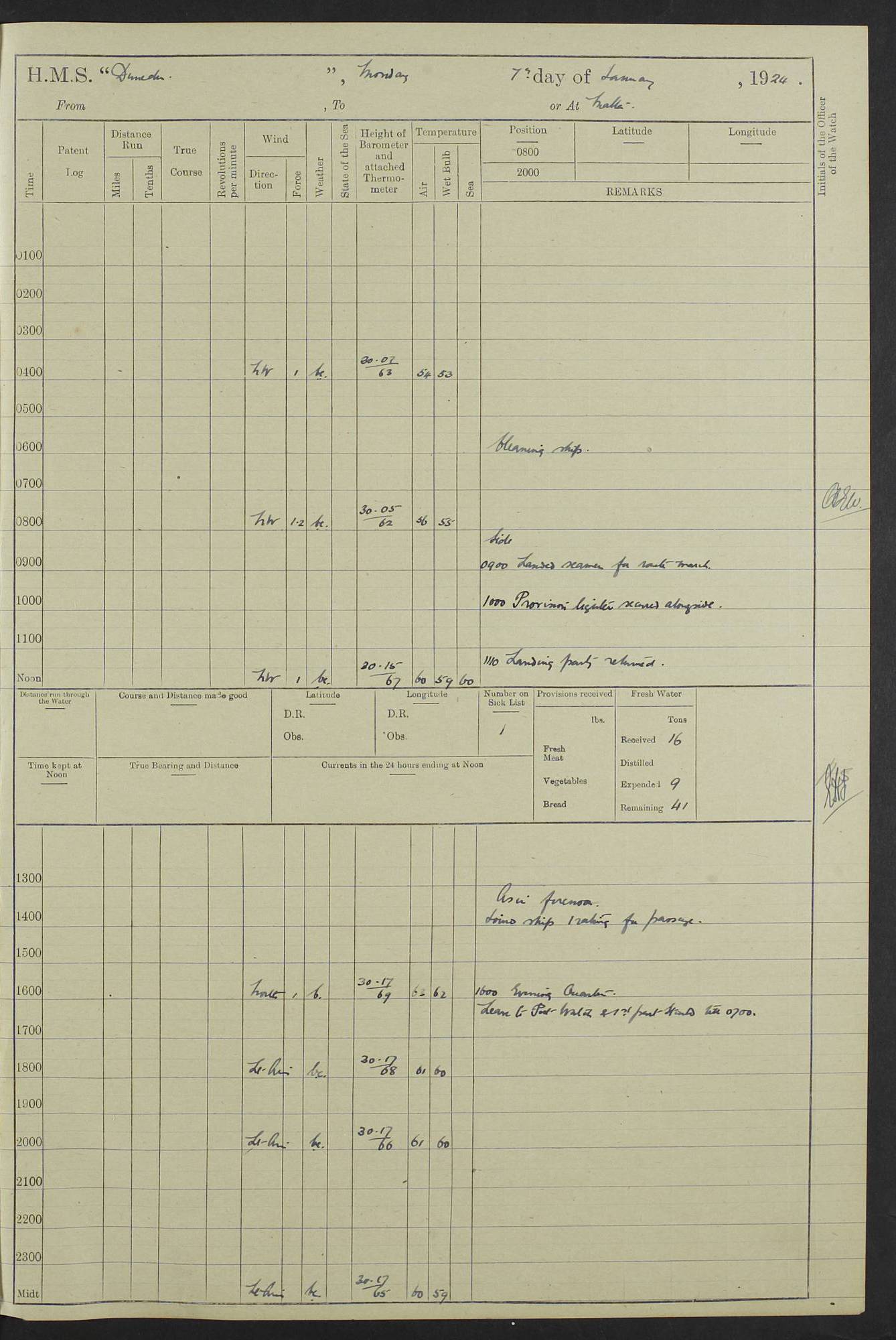 (Maps prepared using Journey Plotter, developed by Maikel. The Plots can only be approximate. They are made by joining-up positions on successive days, and sometimes positions are not given. There will therefore be occasions when the ship appears to have travelled overland) LOG BOOK – 23RD SEPTEMBER 1920 TO 13TH SEPTEMBER 1921 4caf8d9dcadfd3419703bde2: (http://oldweather.s3.amazonaws.com/ADM53-76345/ADM53-76345_0.jpg) Left front cover of Ship’s Log. 4caf8d9dcadfd3419703bde3: (http://oldweather.s3.amazonaws.com/ADM53-76345/ADM53-76345_1.jpg) Right front cover of Ship’s Log. 4caf8d97cadfd3419703bc6a: (http://oldweather.s3.amazonaws.com/ADM53-76345/ADM53-76345-002_0.jpg) 4caf8d97cadfd3419703bc6b: (http://oldweather.s3.amazonaws.com/ADM53-76345/ADM53-76345-002_1.jpg) 4caf8d97cadfd3419703bc6c: (http://oldweather.s3.amazonaws.com/ADM53-76345/ADM53-76345-003_0.jpg) 4caf8d97cadfd3419703bc6d: (http://oldweather.s3.amazonaws.com/ADM53-76345/ADM53-76345-003_1.jpg) 4caf8d97cadfd3419703bc6e: (http://oldweather.s3.amazonaws.com/ADM53-76345/ADM53-76345-004_0.jpg) Blank pages. 4caf8d97cadfd3419703bc6f: (http://oldweather.s3.amazonaws.com/ADM53-76345/ADM53-76345-004_1.jpg) S.- 321. See Articles 557, 619, 622, 924, 1025, 1026 and 1849 of the King’s Regulations, 1913. This Log is to be kept from the time the Ship is Commissioned until she is paid off; when it is to be transmitted as directed by the Admiralty Instructions. The Name and Address of the Officer to whom the acknowledgement of receipt should be sent by the Deputy Cashier in charge, Royal Victoria Yard, Deptford, is to be inserted here. Name: Commander’s Office. Address: H.M.S. Dunedin. c/o G.P.O. London. LOG of H.M.S. “Dunedin” Commanded by Captain C. Wrightson C.B.E. (till 31.3.21). Captain H.S. Monroe D.S.O. (from 31.3.21). FOR THE PERIOD Commencing: Thursday 23rd of September 1920. Ending: Tuesday 13th of September 1921. Tonnage (Displacement): 4,650 Extreme Length: 472ft 3 ins Extreme Breadth: 46 ft 0.3/8” Engines: Manufacturer: Messes R & W Hawthorn Leslie & Co Ltd. Newcastle on Tyne. I.H.P: 40.000 Forced Draught. Description: Turbine (Geared). When Fixed on Board: 1918 – 1919. Boilers: Manufacturer: Messes R & W Hawthorn Leslie & Co Ltd. Newcastle on Tyne. Description: Small tube Improved Yarrow. When made: 1918. When put in vessel: 1918. Paddle Wheels or Screw Propeller: Manufacturer: Manganese Bronze Co. Description: Solid 3 Blades Turbadium Bronze, Pitch 14 ft 3 in. General State of Repair: Satisfactory. R. Alison [?], Lieut Com (W) on paying off 30th August 1923. L. 8418/02. N.L. 15713/13. Where Built Sir W.G. Armstrong Whitworth & Co Ltd. N.L. 18227/18. Armstrong Naval Yard, High Walker, Newcastle on Tyne. Sta. 127/10. Commenced building November 1917, Launched 19 November 1918. N.L. 22782/19. Completed September 1919. 4caf8d98cadfd3419703bc70: (http://oldweather.s3.amazonaws.com/ADM53-76345/ADM53-76345-005_0.jpg) Directions (See King’s Regulations 1913, Articles 1025 and 1849). 1. King’s Regulations. 2. Figures to indicate the Force of the Wind. 3. Letters to denote the State of the Weather. 4. Scale of Fog Intensity. 5. Sea Disturbance Scale 4caf8d98cadfd3419703bc71: (http://oldweather.s3.amazonaws.com/ADM53-76345/ADM53-76345-005_1.jpg) Establishment of Ship’s Company Officers 23 Seamen 187 Boys 36 Marines 46 Engine-room Establishment 105 Other non-executive ratings 44 Total 441 ARMAMENT Position Forecastle: 6” Calibre XII on C.P. XIV mounting. Superstructure: Four 6” Calibre XII on C.P. XIV mountings. Superstructure: Two 3” QF Calibre High Angle mountings, Quarterdeck: 6” Calibre XII on C.P. XIV mountings. Torpedo Armaments Four above water 21” triple tubes. BAROMETER Mercurial or Aneroid: Mercurial. Name of Maker and number: J. Hitchins 101 A747. Height of cistern above sea: 13ft. Error of Mercurial Barometer: Nil at 30.00. Thermometers for Air Temperature. Position on Ship: On fore bridge. Whether in screen: Yes. Maker and No. Negretti & Zambra From: 7.10.19 To: Sept. 1921. Negretti & Zambra No. 10499 Negretti & Zambra No 10391 From: 7.10.19 To: Sept. 1921. Thermometer for Sea Temperature. A. Harper & Sons 7.10.19 POSITION OF STANDARD COMPASS. Manoeuvring Platform. (Fore bridge) BOATS Number of each carried: 1 x 30ft. motor boat. 2 x 32ft. cutters. 1 x 30ft gig. 2 x 27ft whalers. 2 x 16 ft dinghies. MISCELLANEOUS INFORMATION Draught of water with Bunkers full, and complete with provisions, Stores and water: Forward 16 ft 1 inch; Aft 16 ft 11 inches. Number of Tons necessary to increase draught 1 inch: 35.6. Number of Tons of Coal Carried: 16. Number of Tons of Oil Fuel carried: 1127. Quantity of Water Carried (a) For Boilers: 157 tons. (b) For Drinking: 56½ tons. LOGS FOR SEPTEMBER 1920 4caf8d98cadfd3419703bc72: (http://oldweather.s3.amazonaws.com/ADM53-76345/ADM53-76345-006_0.jpg) 23 September 1920 At Copenhagen. Lat 55.694, Long 12.603 4.00am: Signal books correct. am: Hands employed cleaning ship. 8.00am: Signal books correct. am: Sent coaling party to S.S. “Volo”. am: X & Y 6” guns crews at loader drill, remainder of hands employed as requisite. am: Coaling party returned. Noon: Signal books correct. 1.15pm: Sent coaling party to S.S. “Volo”. pm: 1 Rating joined ship from hospital. pm: Boys & training classes under instruction, remainder of hands employed as requisite. 3.00pm: U.S.S. “Gilmer” arrived. [Gilmer, U.S. Destroyer, Flush Decker, launched 18/7/19, Guns: 4 x 5”, 51 cal.,1 x 3”, 23 cal. AA, 12 x 21” TT’s in 4 triple deck mountings. Disp: 1,215 tons, SHP: 26,000 = 35 knots. Jane’s Fighting Ships 1919. Image]. 4.00pm: Signal books correct. pm: Coaling party returned. 8.00pm: Signal books correct. Midnight: Signal books correct. 4caf8d98cadfd3419703bc73: (http://oldweather.s3.amazonaws.com/ADM53-76345/ADM53-76345-006_1.jpg) 24 September 1920 At Copenhagen. Lat 55.694, Long 12.603 4.00am: Signal books correct. am: Hands employed cleaning ship. 6.15am: U.S.S. “Sh