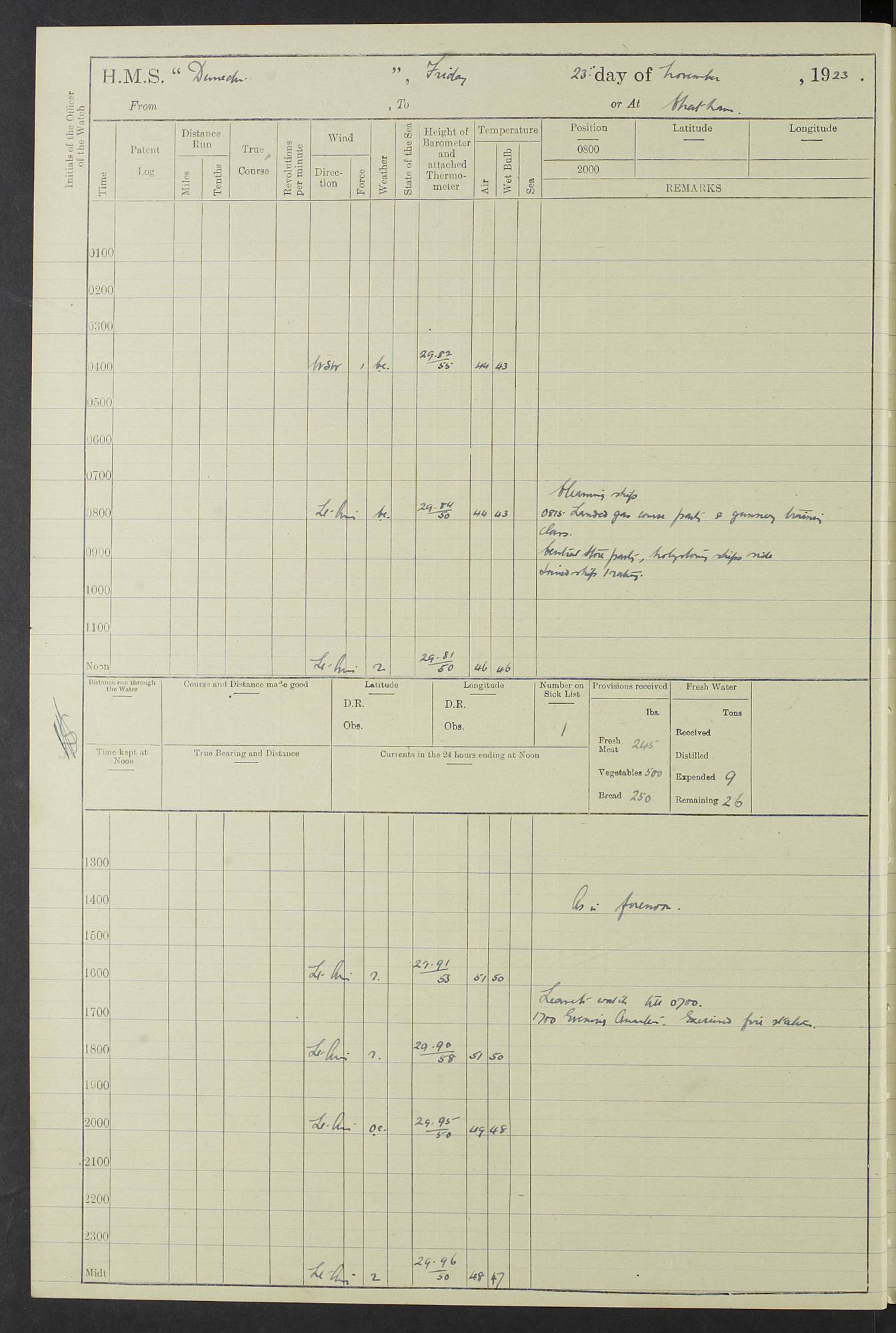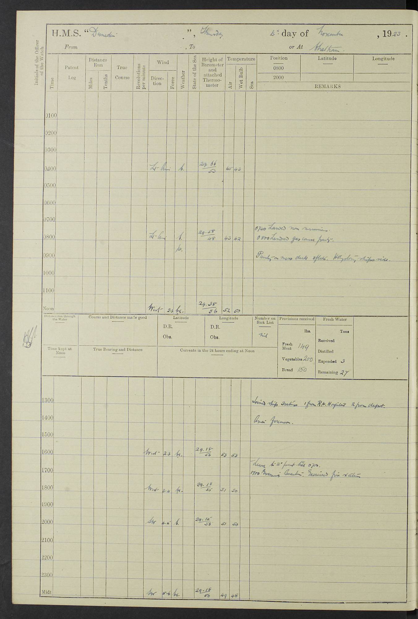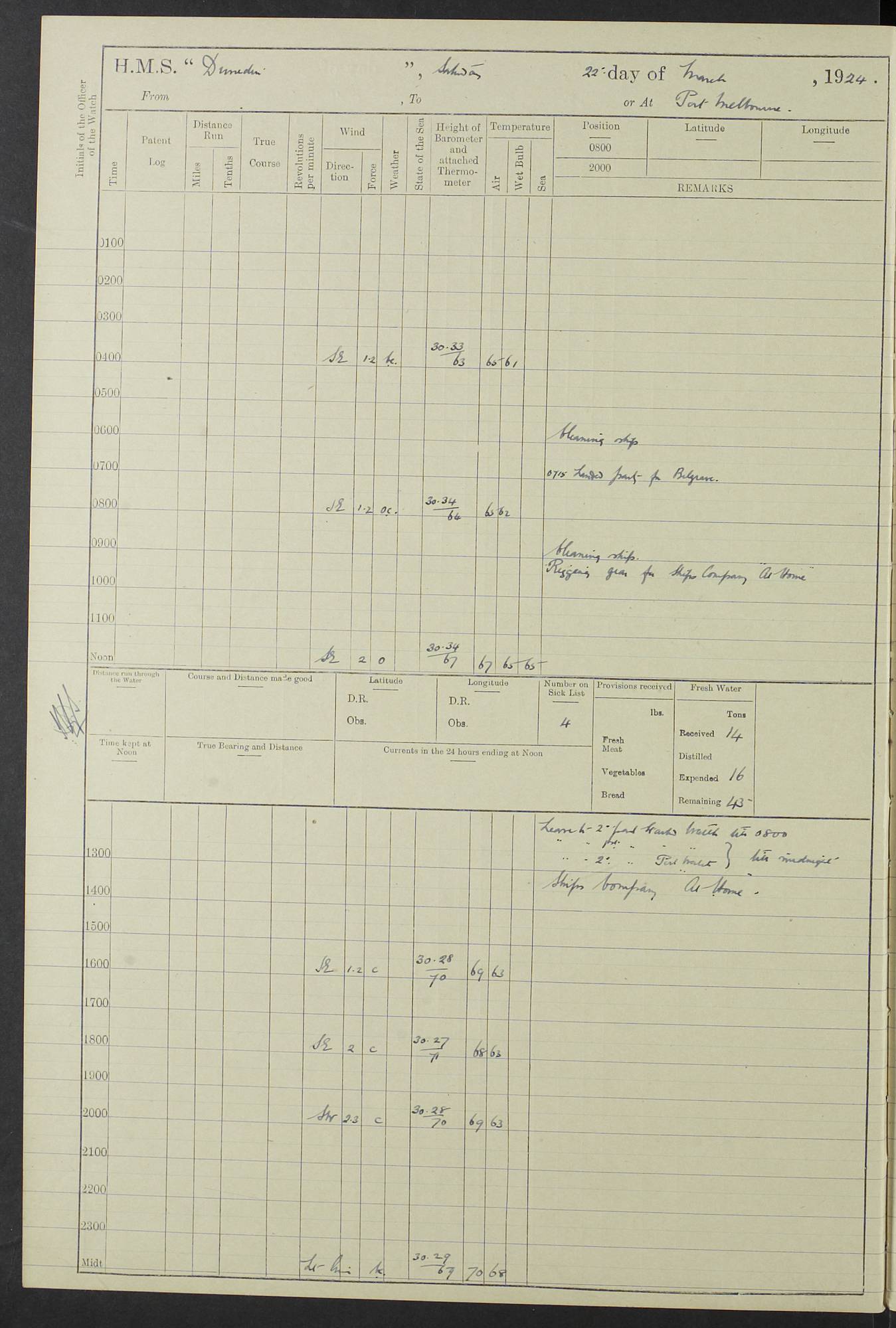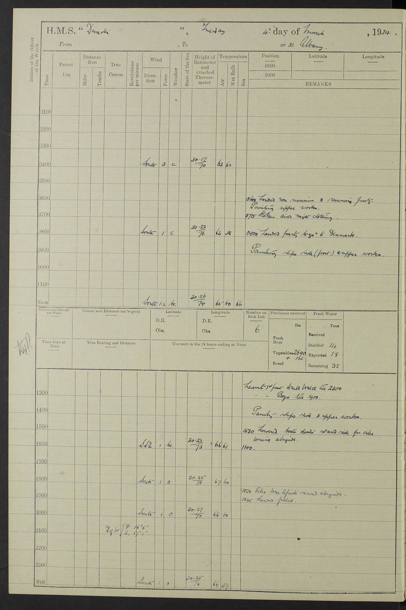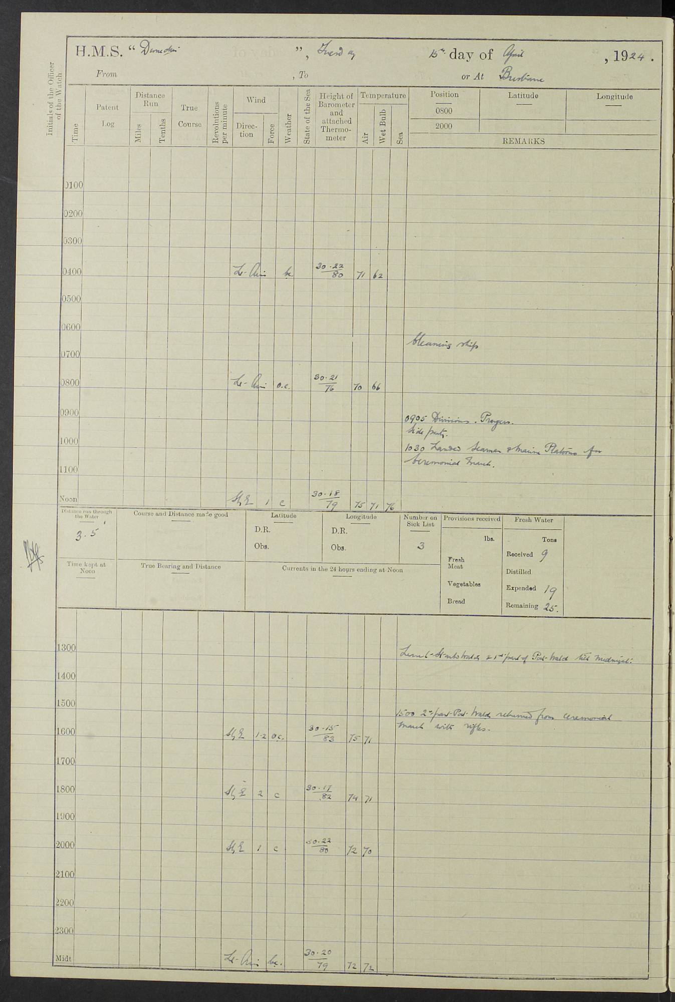 (Maps prepared using Journey Plotter, developed by Maikel. The Plots can only be approximate. They are made by joining-up positions on successive days, and sometimes positions are not given. There will therefore be occasions when the ship appears to have travelled overland) LOG BOOK – 23RD SEPTEMBER 1920 TO 13TH SEPTEMBER 1921 4caf8d9dcadfd3419703bde2: (http://oldweather.s3.amazonaws.com/ADM53-76345/ADM53-76345_0.jpg) Left front cover of Ship’s Log. 4caf8d9dcadfd3419703bde3: (http://oldweather.s3.amazonaws.com/ADM53-76345/ADM53-76345_1.jpg) Right front cover of Ship’s Log. 4caf8d97cadfd3419703bc6a: (http://oldweather.s3.amazonaws.com/ADM53-76345/ADM53-76345-002_0.jpg) 4caf8d97cadfd3419703bc6b: (http://oldweather.s3.amazonaws.com/ADM53-76345/ADM53-76345-002_1.jpg) 4caf8d97cadfd3419703bc6c: (http://oldweather.s3.amazonaws.com/ADM53-76345/ADM53-76345-003_0.jpg) 4caf8d97cadfd3419703bc6d: (http://oldweather.s3.amazonaws.com/ADM53-76345/ADM53-76345-003_1.jpg) 4caf8d97cadfd3419703bc6e: (http://oldweather.s3.amazonaws.com/ADM53-76345/ADM53-76345-004_0.jpg) Blank pages. 4caf8d97cadfd3419703bc6f: (http://oldweather.s3.amazonaws.com/ADM53-76345/ADM53-76345-004_1.jpg) S.- 321. See Articles 557, 619, 622, 924, 1025, 1026 and 1849 of the King’s Regulations, 1913. This Log is to be kept from the time the Ship is Commissioned until she is paid off; when it is to be transmitted as directed by the Admiralty Instructions. The Name and Address of the Officer to whom the acknowledgement of receipt should be sent by the Deputy Cashier in charge, Royal Victoria Yard, Deptford, is to be inserted here. Name: Commander’s Office. Address: H.M.S. Dunedin. c/o G.P.O. London. LOG of H.M.S. “Dunedin” Commanded by Captain C. Wrightson C.B.E. (till 31.3.21). Captain H.S. Monroe D.S.O. (from 31.3.21). FOR THE PERIOD Commencing: Thursday 23rd of September 1920. Ending: Tuesday 13th of September 1921. Tonnage (Displacement): 4,650 Extreme Length: 472ft 3 ins Extreme Breadth: 46 ft 0.3/8” Engines: Manufacturer: Messes R & W Hawthorn Leslie & Co Ltd. Newcastle on Tyne. I.H.P: 40.000 Forced Draught. Description: Turbine (Geared). When Fixed on Board: 1918 – 1919. Boilers: Manufacturer: Messes R & W Hawthorn Leslie & Co Ltd. Newcastle on Tyne. Description: Small tube Improved Yarrow. When made: 1918. When put in vessel: 1918. Paddle Wheels or Screw Propeller: Manufacturer: Manganese Bronze Co. Description: Solid 3 Blades Turbadium Bronze, Pitch 14 ft 3 in. General State of Repair: Satisfactory. R. Alison [?], Lieut Com (W) on paying off 30th August 1923. L. 8418/02. N.L. 15713/13. Where Built Sir W.G. Armstrong Whitworth & Co Ltd. N.L. 18227/18. Armstrong Naval Yard, High Walker, Newcastle on Tyne. Sta. 127/10. Commenced building November 1917, Launched 19 November 1918. N.L. 22782/19. Completed September 1919. 4caf8d98cadfd3419703bc70: (http://oldweather.s3.amazonaws.com/ADM53-76345/ADM53-76345-005_0.jpg) Directions (See King’s Regulations 1913, Articles 1025 and 1849). 1. King’s Regulations. 2. Figures to indicate the Force of the Wind. 3. Letters to denote the State of the Weather. 4. Scale of Fog Intensity. 5. Sea Disturbance Scale 4caf8d98cadfd3419703bc71: (http://oldweather.s3.amazonaws.com/ADM53-76345/ADM53-76345-005_1.jpg) Establishment of Ship’s Company Officers 23 Seamen 187 Boys 36 Marines 46 Engine-room Establishment 105 Other non-executive ratings 44 Total 441 ARMAMENT Position Forecastle: 6” Calibre XII on C.P. XIV mounting. Superstructure: Four 6” Calibre XII on C.P. XIV mountings. Superstructure: Two 3” QF Calibre High Angle mountings, Quarterdeck: 6” Calibre XII on C.P. XIV mountings. Torpedo Armaments Four above water 21” triple tubes. BAROMETER Mercurial or Aneroid: Mercurial. Name of Maker and number: J. Hitchins 101 A747. Height of cistern above sea: 13ft. Error of Mercurial Barometer: Nil at 30.00. Thermometers for Air Temperature. Position on Ship: On fore bridge. Whether in screen: Yes. Maker and No. Negretti & Zambra From: 7.10.19 To: Sept. 1921. Negretti & Zambra No. 10499 Negretti & Zambra No 10391 From: 7.10.19 To: Sept. 1921. Thermometer for Sea Temperature. A. Harper & Sons 7.10.19 POSITION OF STANDARD COMPASS. Manoeuvring Platform. (Fore bridge) BOATS Number of each carried: 1 x 30ft. motor boat. 2 x 32ft. cutters. 1 x 30ft gig. 2 x 27ft whalers. 2 x 16 ft dinghies. MISCELLANEOUS INFORMATION Draught of water with Bunkers full, and complete with provisions, Stores and water: Forward 16 ft 1 inch; Aft 16 ft 11 inches. Number of Tons necessary to increase draught 1 inch: 35.6. Number of Tons of Coal Carried: 16. Number of Tons of Oil Fuel carried: 1127. Quantity of Water Carried (a) For Boilers: 157 tons. (b) For Drinking: 56½ tons. LOGS FOR SEPTEMBER 1920 4caf8d98cadfd3419703bc72: (http://oldweather.s3.amazonaws.com/ADM53-76345/ADM53-76345-006_0.jpg) 23 September 1920 At Copenhagen. Lat 55.694, Long 12.603 4.00am: Signal books correct. am: Hands employed cleaning ship. 8.00am: Signal books correct. am: Sent coaling party to S.S. “Volo”. am: X & Y 6” guns crews at loader drill, remainder of hands employed as requisite. am: Coaling party returned. Noon: Signal books correct. 1.15pm: Sent coaling party to S.S. “Volo”. pm: 1 Rating joined ship from hospital. pm: Boys & training classes under instruction, remainder of hands employed as requisite. 3.00pm: U.S.S. “Gilmer” arrived. [Gilmer, U.S. Destroyer, Flush Decker, launched 18/7/19, Guns: 4 x 5”, 51 cal.,1 x 3”, 23 cal. AA, 12 x 21” TT’s in 4 triple deck mountings. Disp: 1,215 tons, SHP: 26,000 = 35 knots. Jane’s Fighting Ships 1919. Image]. 4.00pm: Signal books correct. pm: Coaling party returned. 8.00pm: Signal books correct. Midnight: Signal books correct. 4caf8d98cadfd3419703bc73: (http://oldweather.s3.amazonaws.com/ADM53-76345/ADM53-76345-006_1.jpg) 24 September 1920 At Copenhagen. Lat 55.694, Long 12.603 4.00am: Signal books correct. am: Hands employed cleaning ship. 6.15am: U.S.S. “Sh