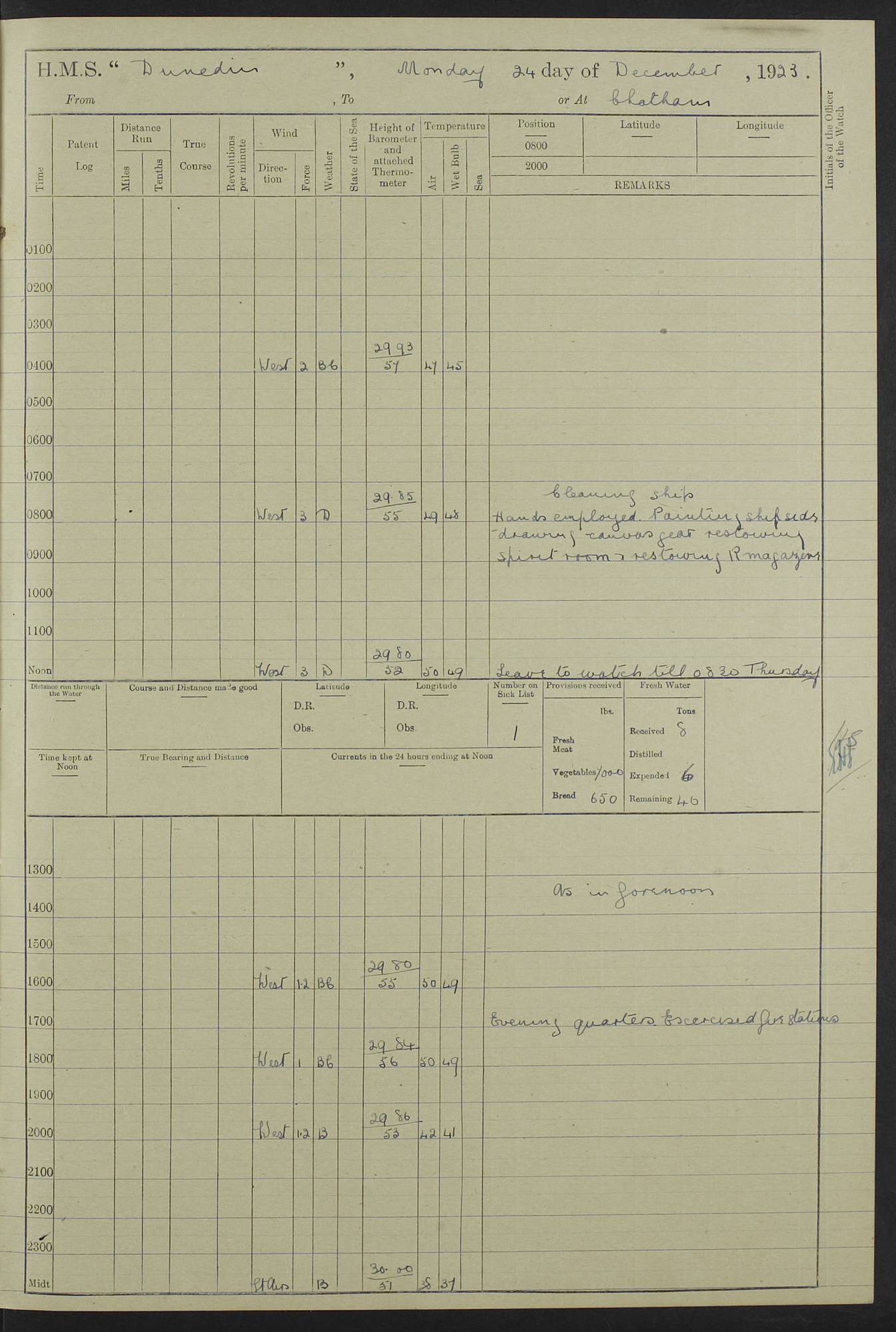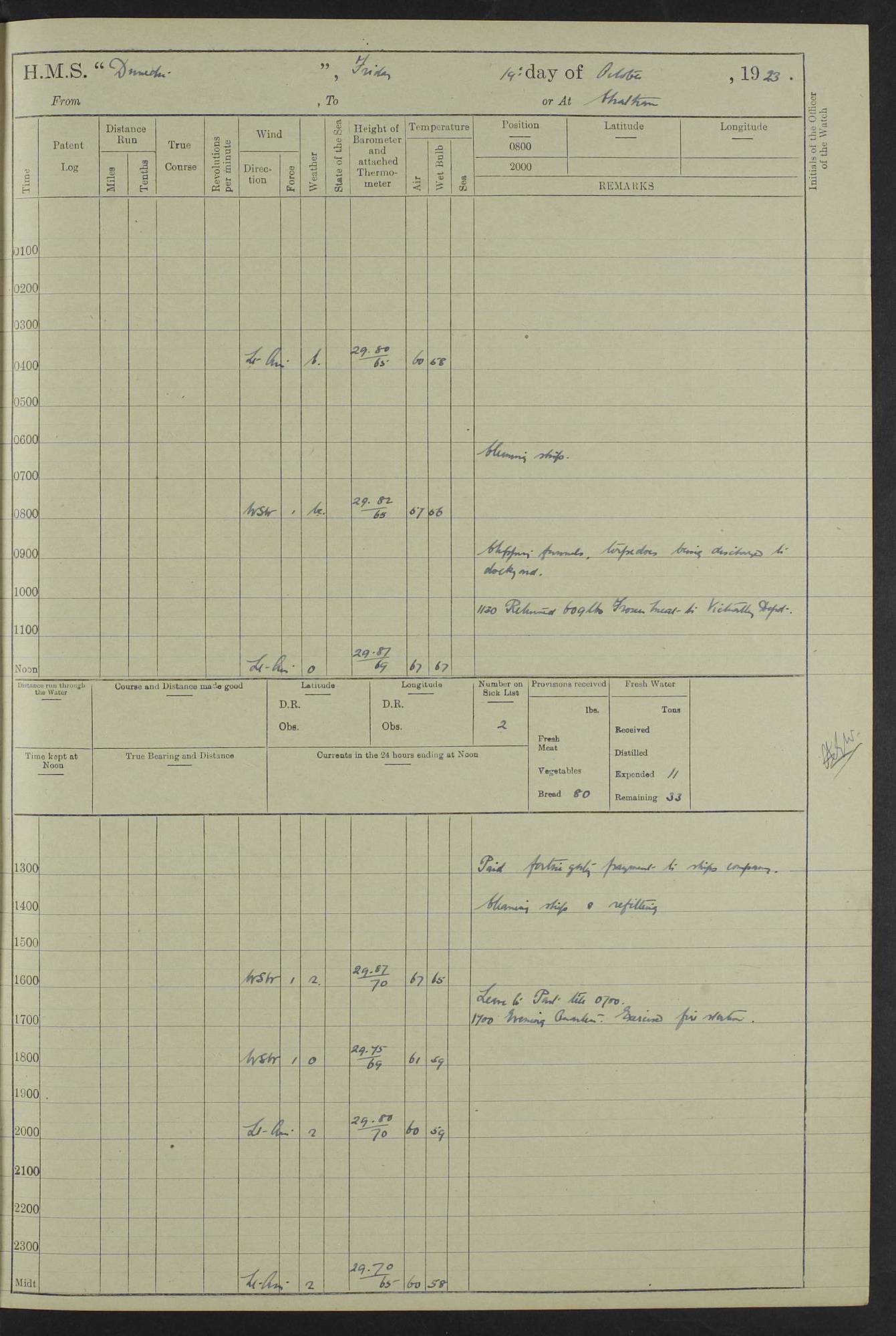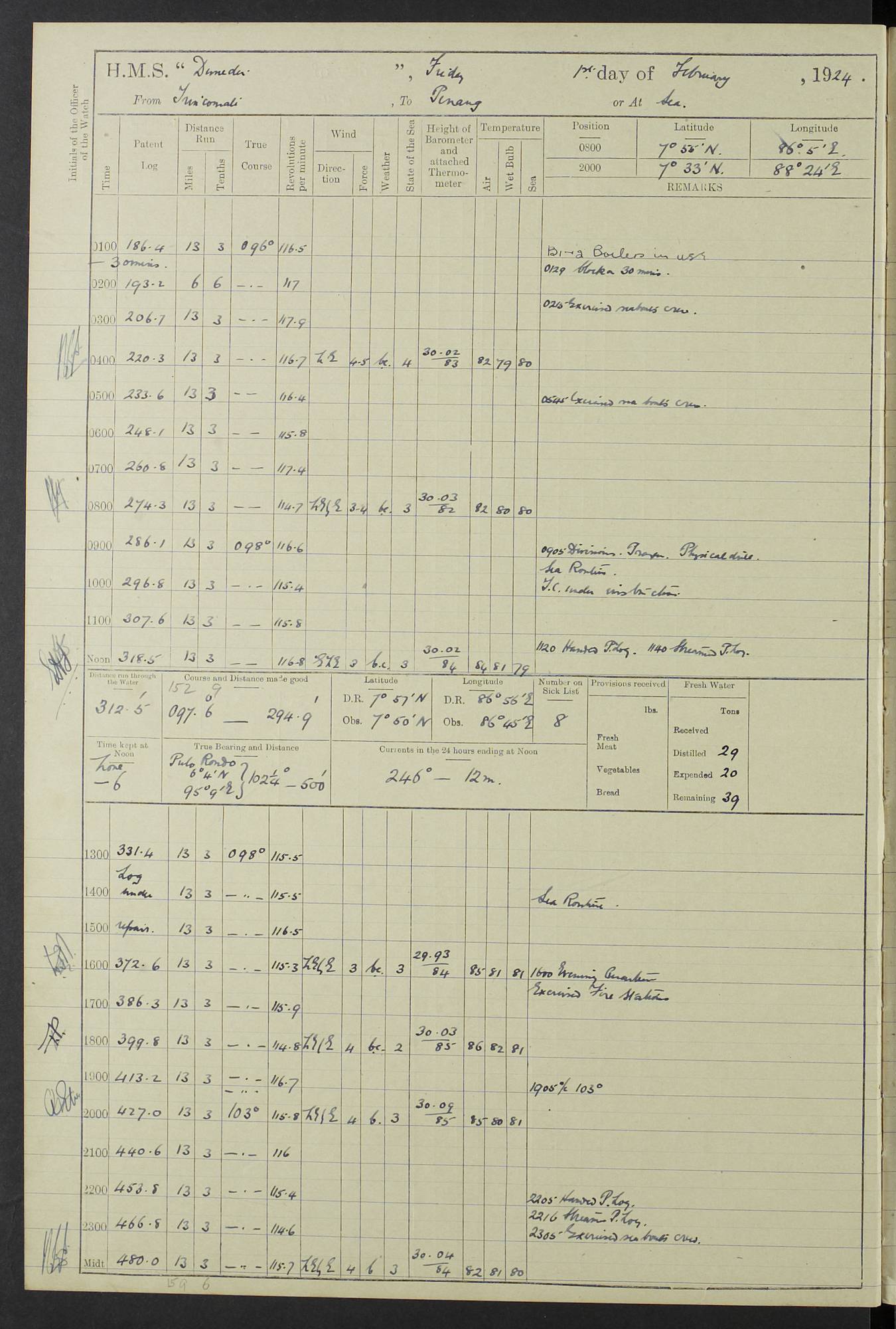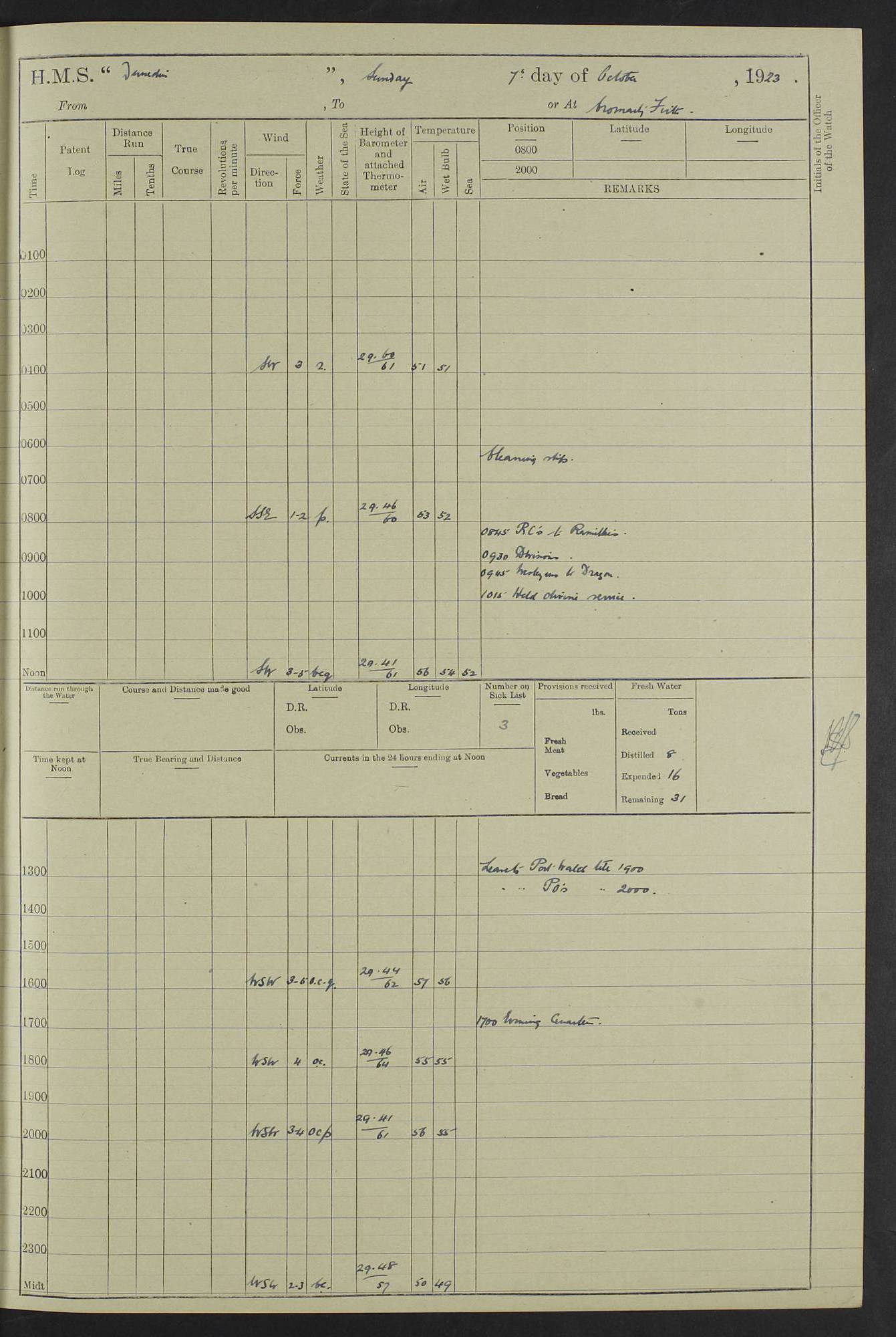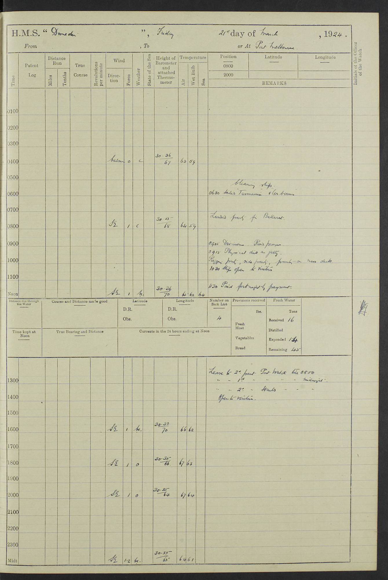 (Maps prepared using Journey Plotter, developed by Maikel. The Plots can only be approximate. They are made by joining-up positions on successive days, and sometimes positions are not given. There will therefore be occasions when the ship appears to have travelled overland) LOG BOOK – 23RD SEPTEMBER 1920 TO 13TH SEPTEMBER 1921 4caf8d9dcadfd3419703bde2: (http://oldweather.s3.amazonaws.com/ADM53-76345/ADM53-76345_0.jpg) Left front cover of Ship’s Log. 4caf8d9dcadfd3419703bde3: (http://oldweather.s3.amazonaws.com/ADM53-76345/ADM53-76345_1.jpg) Right front cover of Ship’s Log. 4caf8d97cadfd3419703bc6a: (http://oldweather.s3.amazonaws.com/ADM53-76345/ADM53-76345-002_0.jpg) 4caf8d97cadfd3419703bc6b: (http://oldweather.s3.amazonaws.com/ADM53-76345/ADM53-76345-002_1.jpg) 4caf8d97cadfd3419703bc6c: (http://oldweather.s3.amazonaws.com/ADM53-76345/ADM53-76345-003_0.jpg) 4caf8d97cadfd3419703bc6d: (http://oldweather.s3.amazonaws.com/ADM53-76345/ADM53-76345-003_1.jpg) 4caf8d97cadfd3419703bc6e: (http://oldweather.s3.amazonaws.com/ADM53-76345/ADM53-76345-004_0.jpg) Blank pages. 4caf8d97cadfd3419703bc6f: (http://oldweather.s3.amazonaws.com/ADM53-76345/ADM53-76345-004_1.jpg) S.- 321. See Articles 557, 619, 622, 924, 1025, 1026 and 1849 of the King’s Regulations, 1913. This Log is to be kept from the time the Ship is Commissioned until she is paid off; when it is to be transmitted as directed by the Admiralty Instructions. The Name and Address of the Officer to whom the acknowledgement of receipt should be sent by the Deputy Cashier in charge, Royal Victoria Yard, Deptford, is to be inserted here. Name: Commander’s Office. Address: H.M.S. Dunedin. c/o G.P.O. London. LOG of H.M.S. “Dunedin” Commanded by Captain C. Wrightson C.B.E. (till 31.3.21). Captain H.S. Monroe D.S.O. (from 31.3.21). FOR THE PERIOD Commencing: Thursday 23rd of September 1920. Ending: Tuesday 13th of September 1921. Tonnage (Displacement): 4,650 Extreme Length: 472ft 3 ins Extreme Breadth: 46 ft 0.3/8” Engines: Manufacturer: Messes R & W Hawthorn Leslie & Co Ltd. Newcastle on Tyne. I.H.P: 40.000 Forced Draught. Description: Turbine (Geared). When Fixed on Board: 1918 – 1919. Boilers: Manufacturer: Messes R & W Hawthorn Leslie & Co Ltd. Newcastle on Tyne. Description: Small tube Improved Yarrow. When made: 1918. When put in vessel: 1918. Paddle Wheels or Screw Propeller: Manufacturer: Manganese Bronze Co. Description: Solid 3 Blades Turbadium Bronze, Pitch 14 ft 3 in. General State of Repair: Satisfactory. R. Alison [?], Lieut Com (W) on paying off 30th August 1923. L. 8418/02. N.L. 15713/13. Where Built Sir W.G. Armstrong Whitworth & Co Ltd. N.L. 18227/18. Armstrong Naval Yard, High Walker, Newcastle on Tyne. Sta. 127/10. Commenced building November 1917, Launched 19 November 1918. N.L. 22782/19. Completed September 1919. 4caf8d98cadfd3419703bc70: (http://oldweather.s3.amazonaws.com/ADM53-76345/ADM53-76345-005_0.jpg) Directions (See King’s Regulations 1913, Articles 1025 and 1849). 1. King’s Regulations. 2. Figures to indicate the Force of the Wind. 3. Letters to denote the State of the Weather. 4. Scale of Fog Intensity. 5. Sea Disturbance Scale 4caf8d98cadfd3419703bc71: (http://oldweather.s3.amazonaws.com/ADM53-76345/ADM53-76345-005_1.jpg) Establishment of Ship’s Company Officers 23 Seamen 187 Boys 36 Marines 46 Engine-room Establishment 105 Other non-executive ratings 44 Total 441 ARMAMENT Position Forecastle: 6” Calibre XII on C.P. XIV mounting. Superstructure: Four 6” Calibre XII on C.P. XIV mountings. Superstructure: Two 3” QF Calibre High Angle mountings, Quarterdeck: 6” Calibre XII on C.P. XIV mountings. Torpedo Armaments Four above water 21” triple tubes. BAROMETER Mercurial or Aneroid: Mercurial. Name of Maker and number: J. Hitchins 101 A747. Height of cistern above sea: 13ft. Error of Mercurial Barometer: Nil at 30.00. Thermometers for Air Temperature. Position on Ship: On fore bridge. Whether in screen: Yes. Maker and No. Negretti & Zambra From: 7.10.19 To: Sept. 1921. Negretti & Zambra No. 10499 Negretti & Zambra No 10391 From: 7.10.19 To: Sept. 1921. Thermometer for Sea Temperature. A. Harper & Sons 7.10.19 POSITION OF STANDARD COMPASS. Manoeuvring Platform. (Fore bridge) BOATS Number of each carried: 1 x 30ft. motor boat. 2 x 32ft. cutters. 1 x 30ft gig. 2 x 27ft whalers. 2 x 16 ft dinghies. MISCELLANEOUS INFORMATION Draught of water with Bunkers full, and complete with provisions, Stores and water: Forward 16 ft 1 inch; Aft 16 ft 11 inches. Number of Tons necessary to increase draught 1 inch: 35.6. Number of Tons of Coal Carried: 16. Number of Tons of Oil Fuel carried: 1127. Quantity of Water Carried (a) For Boilers: 157 tons. (b) For Drinking: 56½ tons. LOGS FOR SEPTEMBER 1920 4caf8d98cadfd3419703bc72: (http://oldweather.s3.amazonaws.com/ADM53-76345/ADM53-76345-006_0.jpg) 23 September 1920 At Copenhagen. Lat 55.694, Long 12.603 4.00am: Signal books correct. am: Hands employed cleaning ship. 8.00am: Signal books correct. am: Sent coaling party to S.S. “Volo”. am: X & Y 6” guns crews at loader drill, remainder of hands employed as requisite. am: Coaling party returned. Noon: Signal books correct. 1.15pm: Sent coaling party to S.S. “Volo”. pm: 1 Rating joined ship from hospital. pm: Boys & training classes under instruction, remainder of hands employed as requisite. 3.00pm: U.S.S. “Gilmer” arrived. [Gilmer, U.S. Destroyer, Flush Decker, launched 18/7/19, Guns: 4 x 5”, 51 cal.,1 x 3”, 23 cal. AA, 12 x 21” TT’s in 4 triple deck mountings. Disp: 1,215 tons, SHP: 26,000 = 35 knots. Jane’s Fighting Ships 1919. Image]. 4.00pm: Signal books correct. pm: Coaling party returned. 8.00pm: Signal books correct. Midnight: Signal books correct. 4caf8d98cadfd3419703bc73: (http://oldweather.s3.amazonaws.com/ADM53-76345/ADM53-76345-006_1.jpg) 24 September 1920 At Copenhagen. Lat 55.694, Long 12.603 4.00am: Signal books correct. am: Hands employed cleaning ship. 6.15am: U.S.S. “Sh