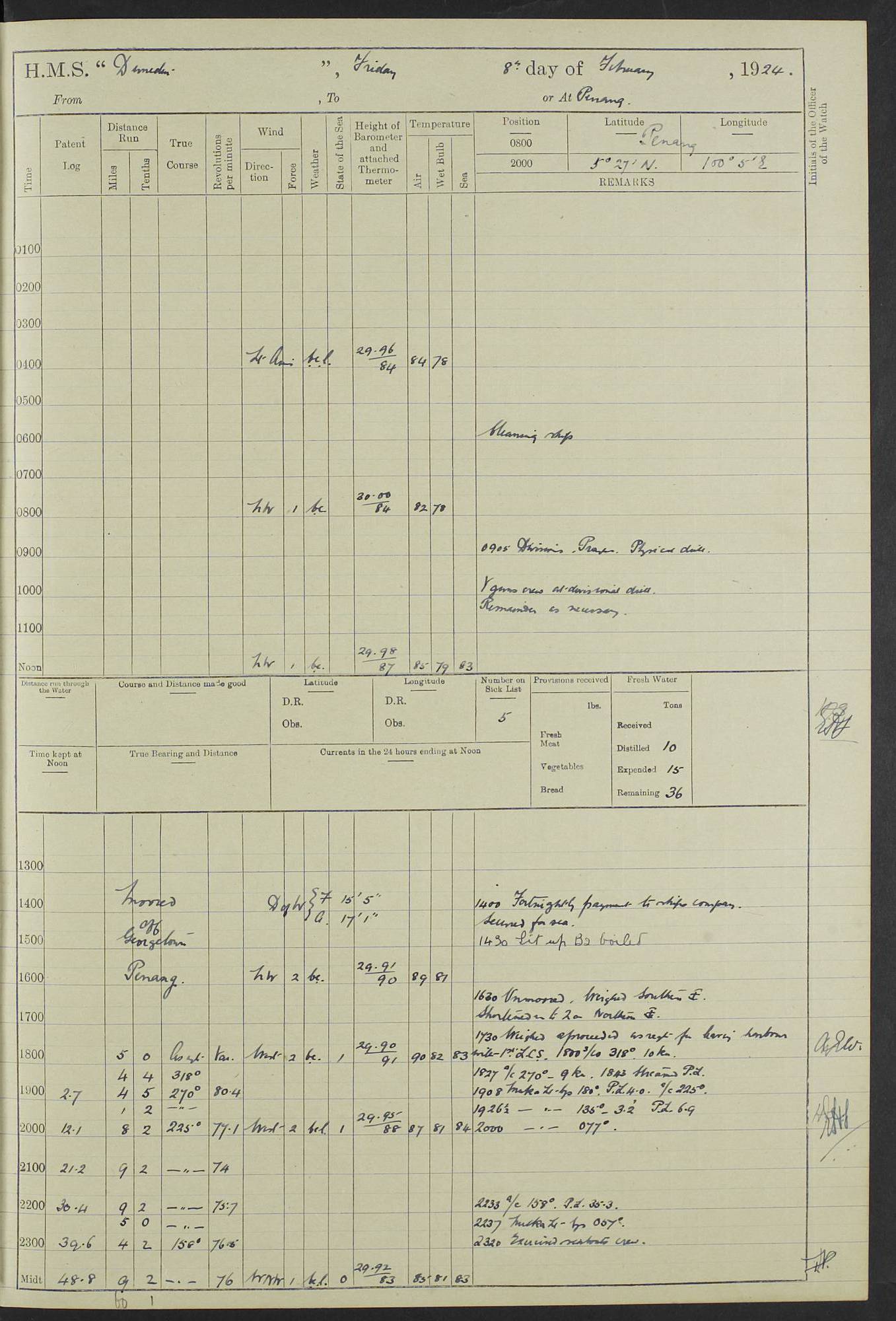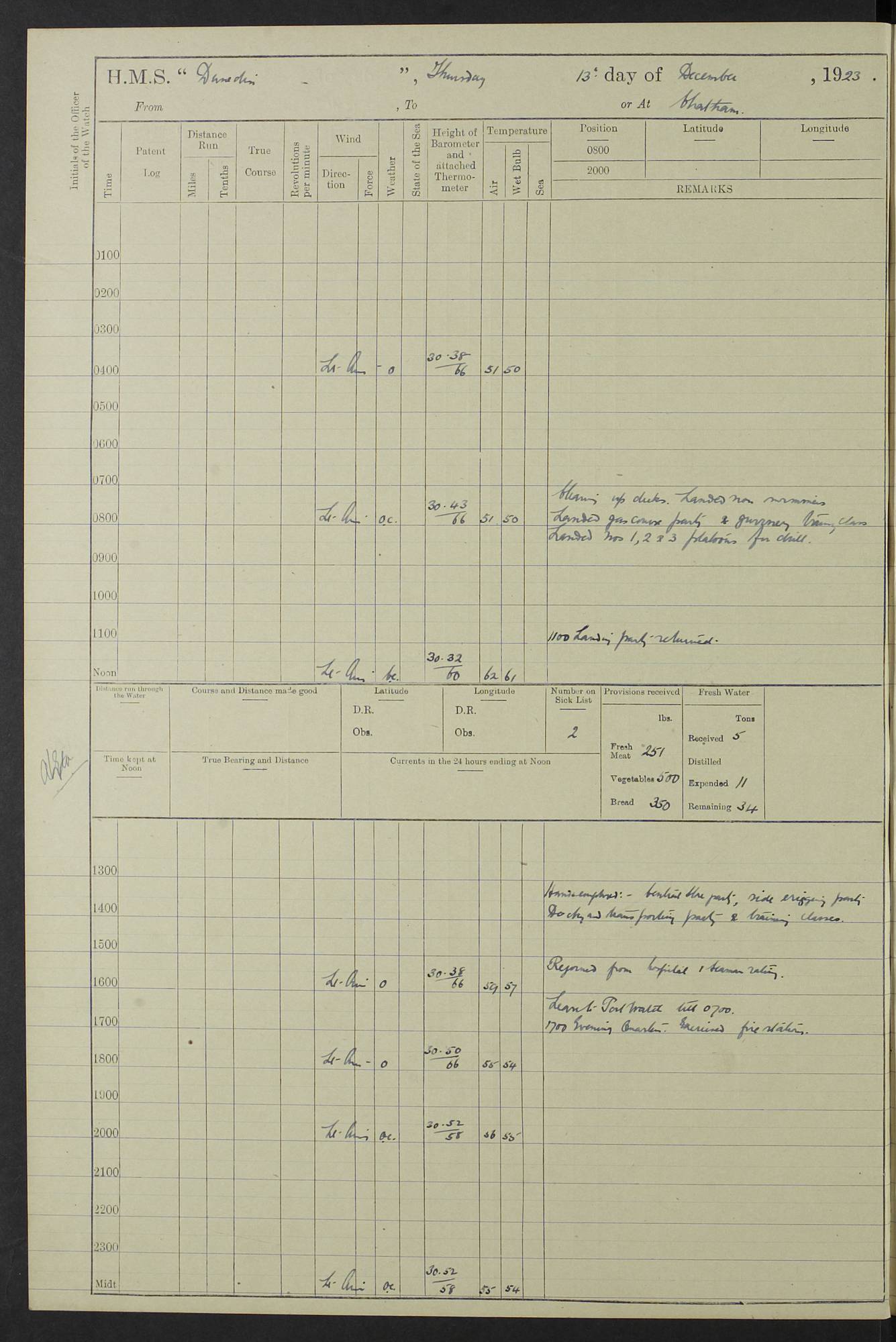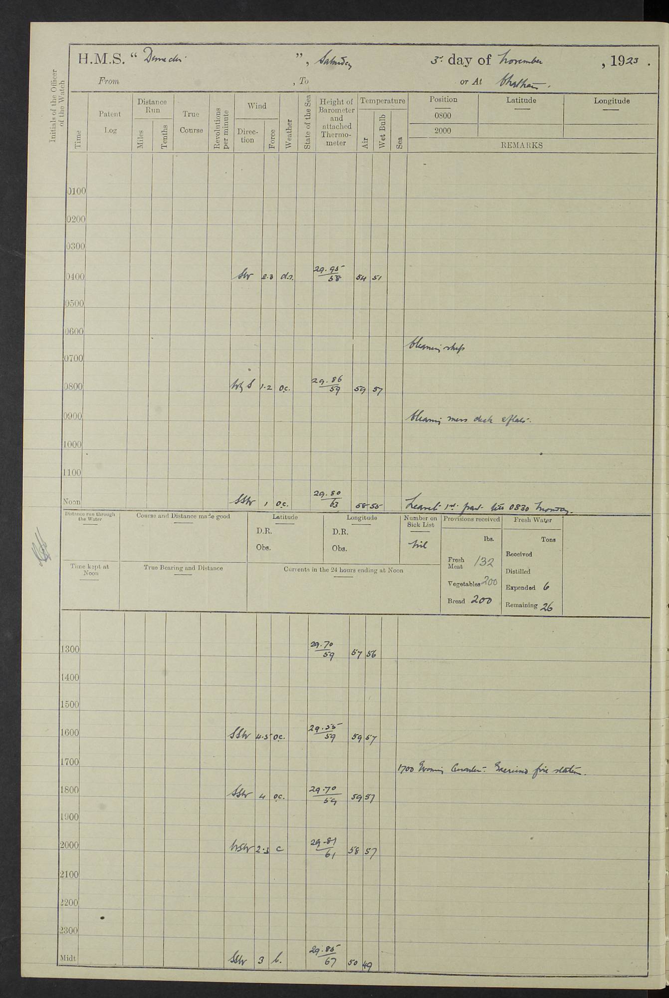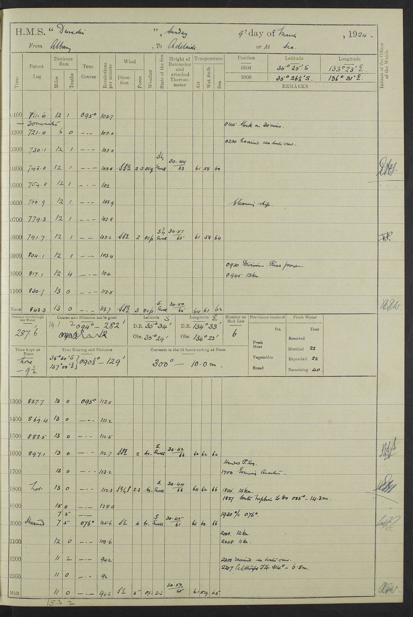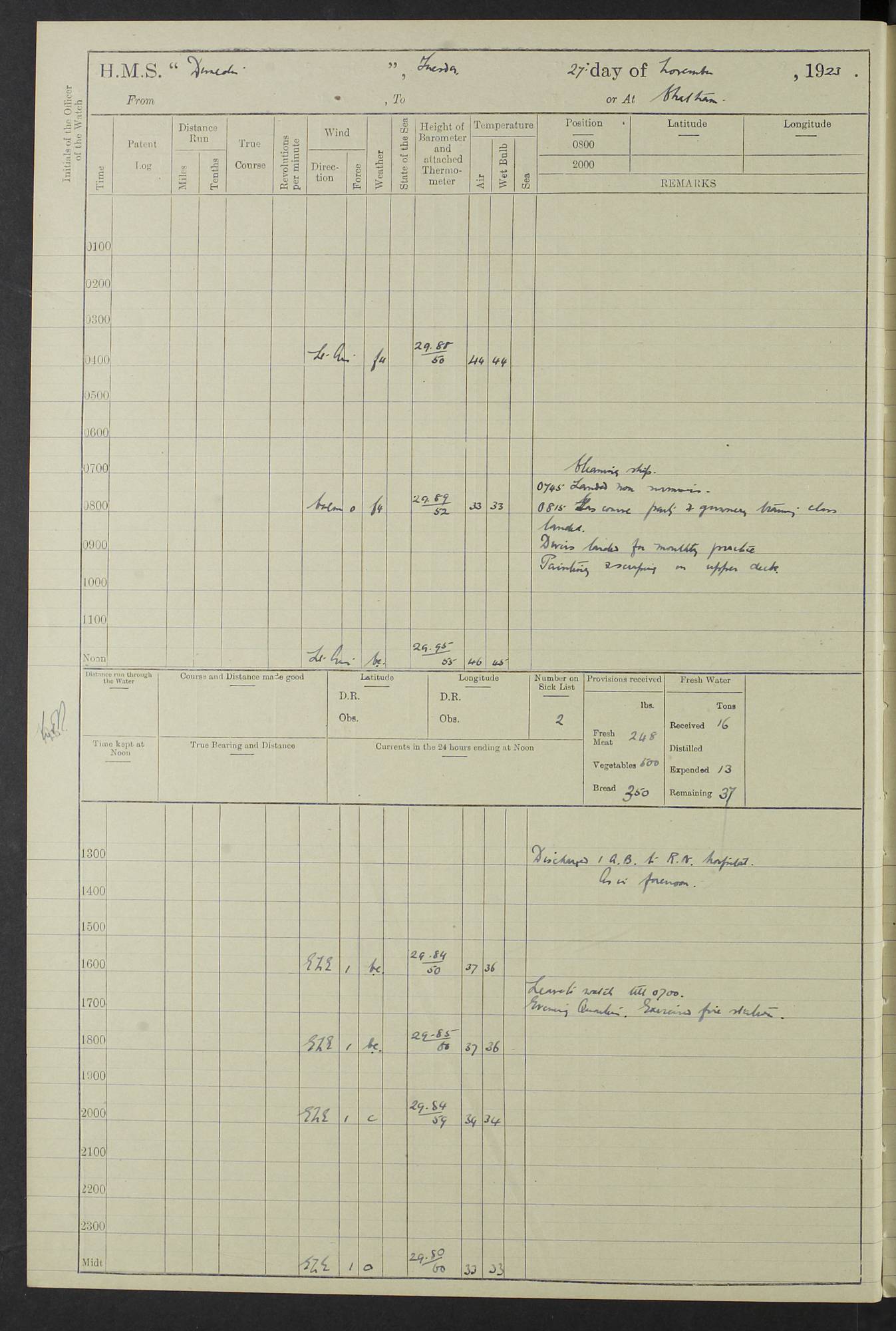 (Maps prepared using Journey Plotter, developed by Maikel. The Plots can only be approximate. They are made by joining-up positions on successive days, and sometimes positions are not given. There will therefore be occasions when the ship appears to have travelled overland) LOG BOOK – 23RD SEPTEMBER 1920 TO 13TH SEPTEMBER 1921 4caf8d9dcadfd3419703bde2: (http://oldweather.s3.amazonaws.com/ADM53-76345/ADM53-76345_0.jpg) Left front cover of Ship’s Log. 4caf8d9dcadfd3419703bde3: (http://oldweather.s3.amazonaws.com/ADM53-76345/ADM53-76345_1.jpg) Right front cover of Ship’s Log. 4caf8d97cadfd3419703bc6a: (http://oldweather.s3.amazonaws.com/ADM53-76345/ADM53-76345-002_0.jpg) 4caf8d97cadfd3419703bc6b: (http://oldweather.s3.amazonaws.com/ADM53-76345/ADM53-76345-002_1.jpg) 4caf8d97cadfd3419703bc6c: (http://oldweather.s3.amazonaws.com/ADM53-76345/ADM53-76345-003_0.jpg) 4caf8d97cadfd3419703bc6d: (http://oldweather.s3.amazonaws.com/ADM53-76345/ADM53-76345-003_1.jpg) 4caf8d97cadfd3419703bc6e: (http://oldweather.s3.amazonaws.com/ADM53-76345/ADM53-76345-004_0.jpg) Blank pages. 4caf8d97cadfd3419703bc6f: (http://oldweather.s3.amazonaws.com/ADM53-76345/ADM53-76345-004_1.jpg) S.- 321. See Articles 557, 619, 622, 924, 1025, 1026 and 1849 of the King’s Regulations, 1913. This Log is to be kept from the time the Ship is Commissioned until she is paid off; when it is to be transmitted as directed by the Admiralty Instructions. The Name and Address of the Officer to whom the acknowledgement of receipt should be sent by the Deputy Cashier in charge, Royal Victoria Yard, Deptford, is to be inserted here. Name: Commander’s Office. Address: H.M.S. Dunedin. c/o G.P.O. London. LOG of H.M.S. “Dunedin” Commanded by Captain C. Wrightson C.B.E. (till 31.3.21). Captain H.S. Monroe D.S.O. (from 31.3.21). FOR THE PERIOD Commencing: Thursday 23rd of September 1920. Ending: Tuesday 13th of September 1921. Tonnage (Displacement): 4,650 Extreme Length: 472ft 3 ins Extreme Breadth: 46 ft 0.3/8” Engines: Manufacturer: Messes R & W Hawthorn Leslie & Co Ltd. Newcastle on Tyne. I.H.P: 40.000 Forced Draught. Description: Turbine (Geared). When Fixed on Board: 1918 – 1919. Boilers: Manufacturer: Messes R & W Hawthorn Leslie & Co Ltd. Newcastle on Tyne. Description: Small tube Improved Yarrow. When made: 1918. When put in vessel: 1918. Paddle Wheels or Screw Propeller: Manufacturer: Manganese Bronze Co. Description: Solid 3 Blades Turbadium Bronze, Pitch 14 ft 3 in. General State of Repair: Satisfactory. R. Alison [?], Lieut Com (W) on paying off 30th August 1923. L. 8418/02. N.L. 15713/13. Where Built Sir W.G. Armstrong Whitworth & Co Ltd. N.L. 18227/18. Armstrong Naval Yard, High Walker, Newcastle on Tyne. Sta. 127/10. Commenced building November 1917, Launched 19 November 1918. N.L. 22782/19. Completed September 1919. 4caf8d98cadfd3419703bc70: (http://oldweather.s3.amazonaws.com/ADM53-76345/ADM53-76345-005_0.jpg) Directions (See King’s Regulations 1913, Articles 1025 and 1849). 1. King’s Regulations. 2. Figures to indicate the Force of the Wind. 3. Letters to denote the State of the Weather. 4. Scale of Fog Intensity. 5. Sea Disturbance Scale 4caf8d98cadfd3419703bc71: (http://oldweather.s3.amazonaws.com/ADM53-76345/ADM53-76345-005_1.jpg) Establishment of Ship’s Company Officers 23 Seamen 187 Boys 36 Marines 46 Engine-room Establishment 105 Other non-executive ratings 44 Total 441 ARMAMENT Position Forecastle: 6” Calibre XII on C.P. XIV mounting. Superstructure: Four 6” Calibre XII on C.P. XIV mountings. Superstructure: Two 3” QF Calibre High Angle mountings, Quarterdeck: 6” Calibre XII on C.P. XIV mountings. Torpedo Armaments Four above water 21” triple tubes. BAROMETER Mercurial or Aneroid: Mercurial. Name of Maker and number: J. Hitchins 101 A747. Height of cistern above sea: 13ft. Error of Mercurial Barometer: Nil at 30.00. Thermometers for Air Temperature. Position on Ship: On fore bridge. Whether in screen: Yes. Maker and No. Negretti & Zambra From: 7.10.19 To: Sept. 1921. Negretti & Zambra No. 10499 Negretti & Zambra No 10391 From: 7.10.19 To: Sept. 1921. Thermometer for Sea Temperature. A. Harper & Sons 7.10.19 POSITION OF STANDARD COMPASS. Manoeuvring Platform. (Fore bridge) BOATS Number of each carried: 1 x 30ft. motor boat. 2 x 32ft. cutters. 1 x 30ft gig. 2 x 27ft whalers. 2 x 16 ft dinghies. MISCELLANEOUS INFORMATION Draught of water with Bunkers full, and complete with provisions, Stores and water: Forward 16 ft 1 inch; Aft 16 ft 11 inches. Number of Tons necessary to increase draught 1 inch: 35.6. Number of Tons of Coal Carried: 16. Number of Tons of Oil Fuel carried: 1127. Quantity of Water Carried (a) For Boilers: 157 tons. (b) For Drinking: 56½ tons. LOGS FOR SEPTEMBER 1920 4caf8d98cadfd3419703bc72: (http://oldweather.s3.amazonaws.com/ADM53-76345/ADM53-76345-006_0.jpg) 23 September 1920 At Copenhagen. Lat 55.694, Long 12.603 4.00am: Signal books correct. am: Hands employed cleaning ship. 8.00am: Signal books correct. am: Sent coaling party to S.S. “Volo”. am: X & Y 6” guns crews at loader drill, remainder of hands employed as requisite. am: Coaling party returned. Noon: Signal books correct. 1.15pm: Sent coaling party to S.S. “Volo”. pm: 1 Rating joined ship from hospital. pm: Boys & training classes under instruction, remainder of hands employed as requisite. 3.00pm: U.S.S. “Gilmer” arrived. [Gilmer, U.S. Destroyer, Flush Decker, launched 18/7/19, Guns: 4 x 5”, 51 cal.,1 x 3”, 23 cal. AA, 12 x 21” TT’s in 4 triple deck mountings. Disp: 1,215 tons, SHP: 26,000 = 35 knots. Jane’s Fighting Ships 1919. Image]. 4.00pm: Signal books correct. pm: Coaling party returned. 8.00pm: Signal books correct. Midnight: Signal books correct. 4caf8d98cadfd3419703bc73: (http://oldweather.s3.amazonaws.com/ADM53-76345/ADM53-76345-006_1.jpg) 24 September 1920 At Copenhagen. Lat 55.694, Long 12.603 4.00am: Signal books correct. am: Hands employed cleaning ship. 6.15am: U.S.S. “Sh