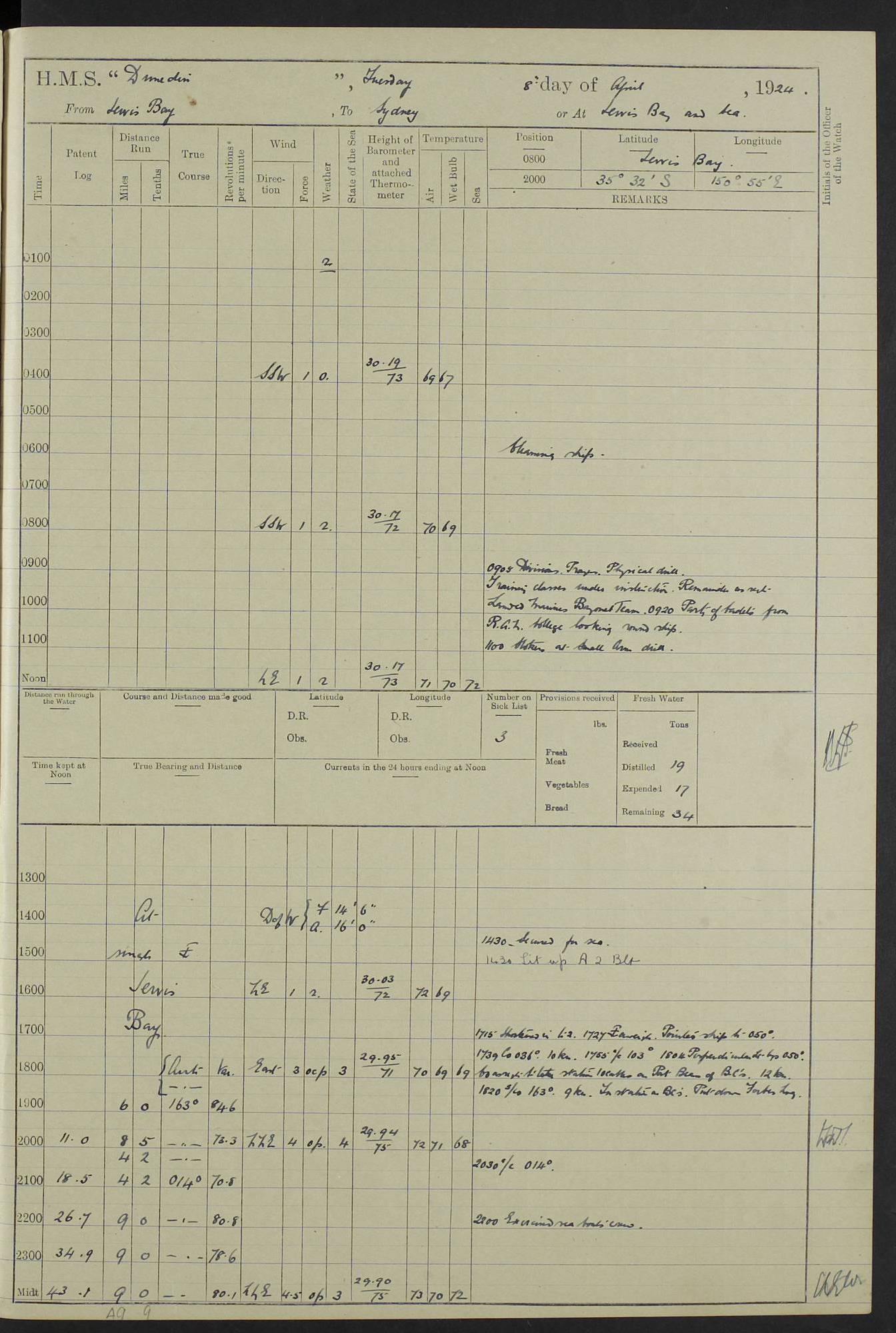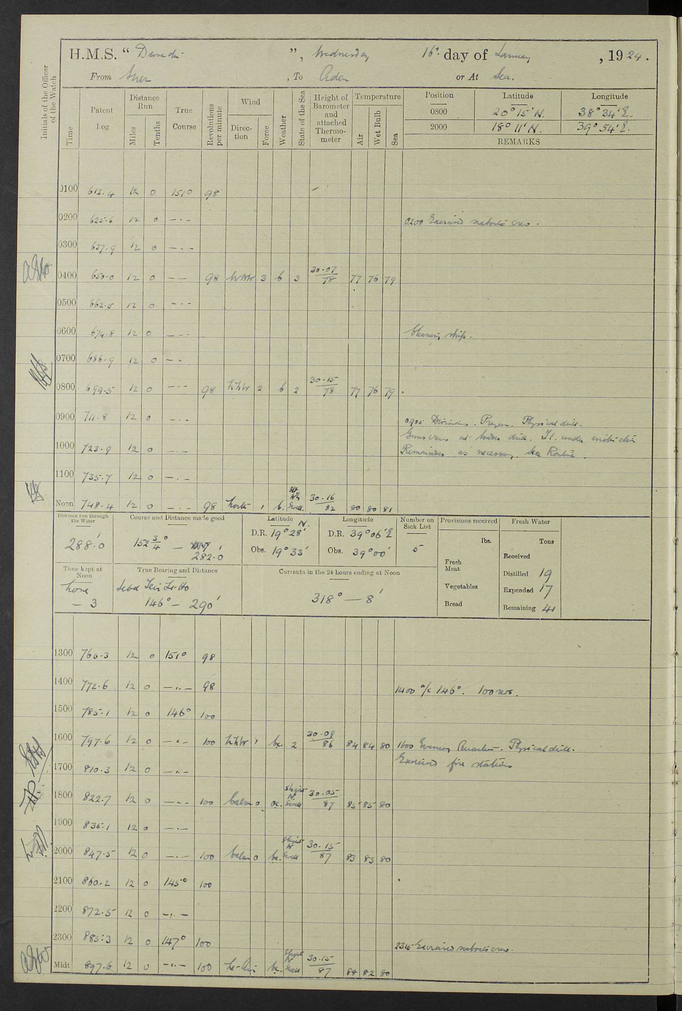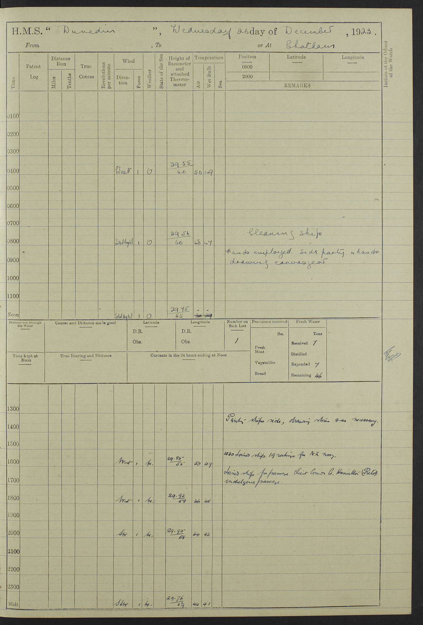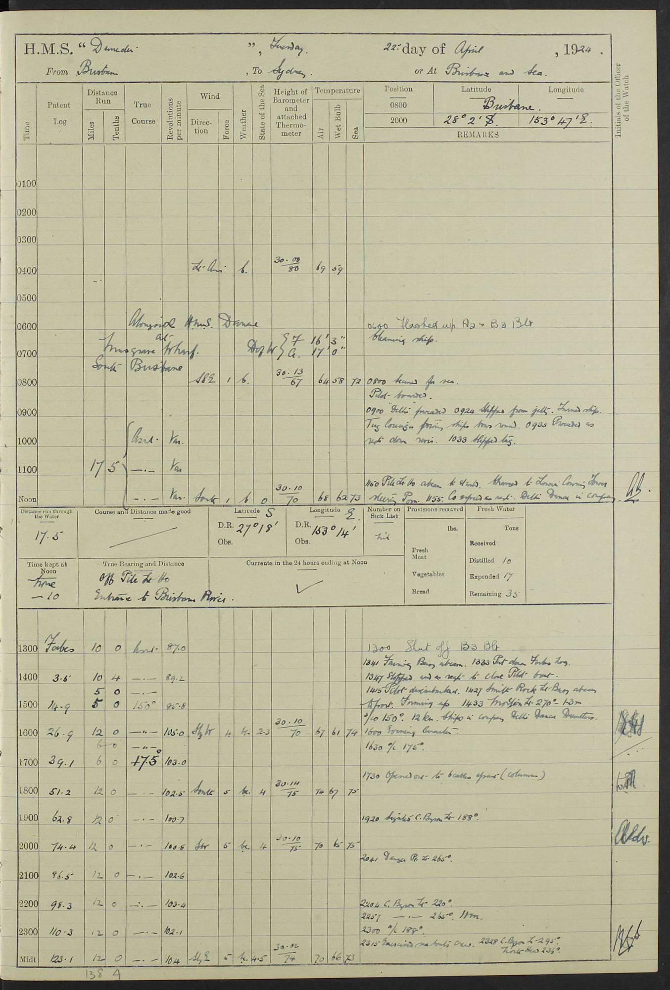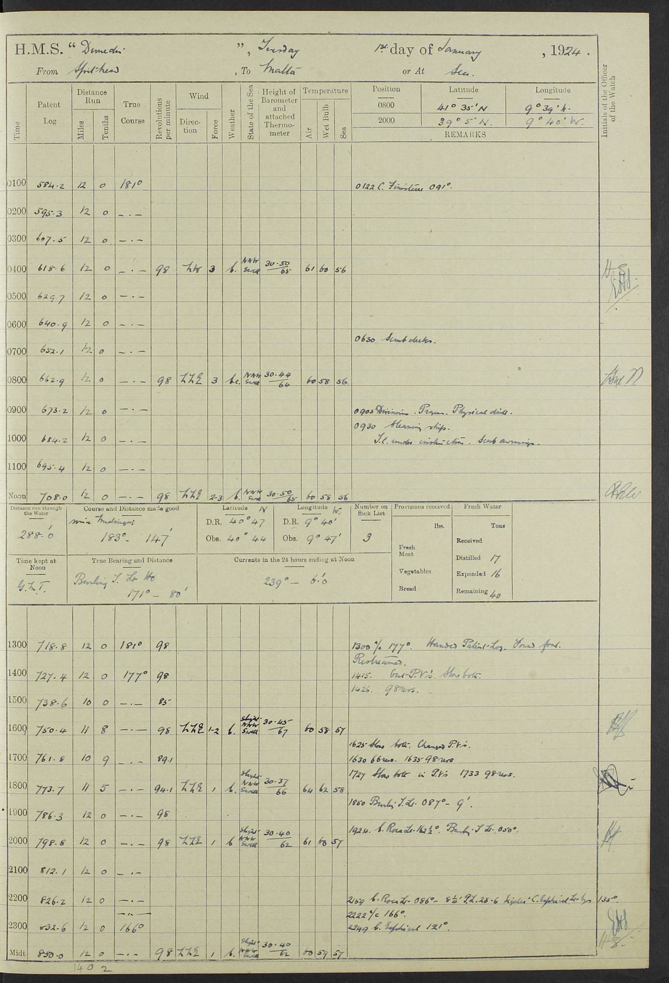 (Maps prepared using Journey Plotter, developed by Maikel. The Plots can only be approximate. They are made by joining-up positions on successive days, and sometimes positions are not given. There will therefore be occasions when the ship appears to have travelled overland) LOG BOOK – 23RD SEPTEMBER 1920 TO 13TH SEPTEMBER 1921 4caf8d9dcadfd3419703bde2: (http://oldweather.s3.amazonaws.com/ADM53-76345/ADM53-76345_0.jpg) Left front cover of Ship’s Log. 4caf8d9dcadfd3419703bde3: (http://oldweather.s3.amazonaws.com/ADM53-76345/ADM53-76345_1.jpg) Right front cover of Ship’s Log. 4caf8d97cadfd3419703bc6a: (http://oldweather.s3.amazonaws.com/ADM53-76345/ADM53-76345-002_0.jpg) 4caf8d97cadfd3419703bc6b: (http://oldweather.s3.amazonaws.com/ADM53-76345/ADM53-76345-002_1.jpg) 4caf8d97cadfd3419703bc6c: (http://oldweather.s3.amazonaws.com/ADM53-76345/ADM53-76345-003_0.jpg) 4caf8d97cadfd3419703bc6d: (http://oldweather.s3.amazonaws.com/ADM53-76345/ADM53-76345-003_1.jpg) 4caf8d97cadfd3419703bc6e: (http://oldweather.s3.amazonaws.com/ADM53-76345/ADM53-76345-004_0.jpg) Blank pages. 4caf8d97cadfd3419703bc6f: (http://oldweather.s3.amazonaws.com/ADM53-76345/ADM53-76345-004_1.jpg) S.- 321. See Articles 557, 619, 622, 924, 1025, 1026 and 1849 of the King’s Regulations, 1913. This Log is to be kept from the time the Ship is Commissioned until she is paid off; when it is to be transmitted as directed by the Admiralty Instructions. The Name and Address of the Officer to whom the acknowledgement of receipt should be sent by the Deputy Cashier in charge, Royal Victoria Yard, Deptford, is to be inserted here. Name: Commander’s Office. Address: H.M.S. Dunedin. c/o G.P.O. London. LOG of H.M.S. “Dunedin” Commanded by Captain C. Wrightson C.B.E. (till 31.3.21). Captain H.S. Monroe D.S.O. (from 31.3.21). FOR THE PERIOD Commencing: Thursday 23rd of September 1920. Ending: Tuesday 13th of September 1921. Tonnage (Displacement): 4,650 Extreme Length: 472ft 3 ins Extreme Breadth: 46 ft 0.3/8” Engines: Manufacturer: Messes R & W Hawthorn Leslie & Co Ltd. Newcastle on Tyne. I.H.P: 40.000 Forced Draught. Description: Turbine (Geared). When Fixed on Board: 1918 – 1919. Boilers: Manufacturer: Messes R & W Hawthorn Leslie & Co Ltd. Newcastle on Tyne. Description: Small tube Improved Yarrow. When made: 1918. When put in vessel: 1918. Paddle Wheels or Screw Propeller: Manufacturer: Manganese Bronze Co. Description: Solid 3 Blades Turbadium Bronze, Pitch 14 ft 3 in. General State of Repair: Satisfactory. R. Alison [?], Lieut Com (W) on paying off 30th August 1923. L. 8418/02. N.L. 15713/13. Where Built Sir W.G. Armstrong Whitworth & Co Ltd. N.L. 18227/18. Armstrong Naval Yard, High Walker, Newcastle on Tyne. Sta. 127/10. Commenced building November 1917, Launched 19 November 1918. N.L. 22782/19. Completed September 1919. 4caf8d98cadfd3419703bc70: (http://oldweather.s3.amazonaws.com/ADM53-76345/ADM53-76345-005_0.jpg) Directions (See King’s Regulations 1913, Articles 1025 and 1849). 1. King’s Regulations. 2. Figures to indicate the Force of the Wind. 3. Letters to denote the State of the Weather. 4. Scale of Fog Intensity. 5. Sea Disturbance Scale 4caf8d98cadfd3419703bc71: (http://oldweather.s3.amazonaws.com/ADM53-76345/ADM53-76345-005_1.jpg) Establishment of Ship’s Company Officers 23 Seamen 187 Boys 36 Marines 46 Engine-room Establishment 105 Other non-executive ratings 44 Total 441 ARMAMENT Position Forecastle: 6” Calibre XII on C.P. XIV mounting. Superstructure: Four 6” Calibre XII on C.P. XIV mountings. Superstructure: Two 3” QF Calibre High Angle mountings, Quarterdeck: 6” Calibre XII on C.P. XIV mountings. Torpedo Armaments Four above water 21” triple tubes. BAROMETER Mercurial or Aneroid: Mercurial. Name of Maker and number: J. Hitchins 101 A747. Height of cistern above sea: 13ft. Error of Mercurial Barometer: Nil at 30.00. Thermometers for Air Temperature. Position on Ship: On fore bridge. Whether in screen: Yes. Maker and No. Negretti & Zambra From: 7.10.19 To: Sept. 1921. Negretti & Zambra No. 10499 Negretti & Zambra No 10391 From: 7.10.19 To: Sept. 1921. Thermometer for Sea Temperature. A. Harper & Sons 7.10.19 POSITION OF STANDARD COMPASS. Manoeuvring Platform. (Fore bridge) BOATS Number of each carried: 1 x 30ft. motor boat. 2 x 32ft. cutters. 1 x 30ft gig. 2 x 27ft whalers. 2 x 16 ft dinghies. MISCELLANEOUS INFORMATION Draught of water with Bunkers full, and complete with provisions, Stores and water: Forward 16 ft 1 inch; Aft 16 ft 11 inches. Number of Tons necessary to increase draught 1 inch: 35.6. Number of Tons of Coal Carried: 16. Number of Tons of Oil Fuel carried: 1127. Quantity of Water Carried (a) For Boilers: 157 tons. (b) For Drinking: 56½ tons. LOGS FOR SEPTEMBER 1920 4caf8d98cadfd3419703bc72: (http://oldweather.s3.amazonaws.com/ADM53-76345/ADM53-76345-006_0.jpg) 23 September 1920 At Copenhagen. Lat 55.694, Long 12.603 4.00am: Signal books correct. am: Hands employed cleaning ship. 8.00am: Signal books correct. am: Sent coaling party to S.S. “Volo”. am: X & Y 6” guns crews at loader drill, remainder of hands employed as requisite. am: Coaling party returned. Noon: Signal books correct. 1.15pm: Sent coaling party to S.S. “Volo”. pm: 1 Rating joined ship from hospital. pm: Boys & training classes under instruction, remainder of hands employed as requisite. 3.00pm: U.S.S. “Gilmer” arrived. [Gilmer, U.S. Destroyer, Flush Decker, launched 18/7/19, Guns: 4 x 5”, 51 cal.,1 x 3”, 23 cal. AA, 12 x 21” TT’s in 4 triple deck mountings. Disp: 1,215 tons, SHP: 26,000 = 35 knots. Jane’s Fighting Ships 1919. Image]. 4.00pm: Signal books correct. pm: Coaling party returned. 8.00pm: Signal books correct. Midnight: Signal books correct. 4caf8d98cadfd3419703bc73: (http://oldweather.s3.amazonaws.com/ADM53-76345/ADM53-76345-006_1.jpg) 24 September 1920 At Copenhagen. Lat 55.694, Long 12.603 4.00am: Signal books correct. am: Hands employed cleaning ship. 6.15am: U.S.S. “Sh