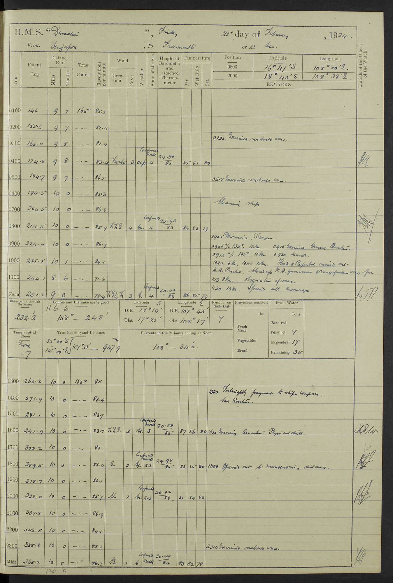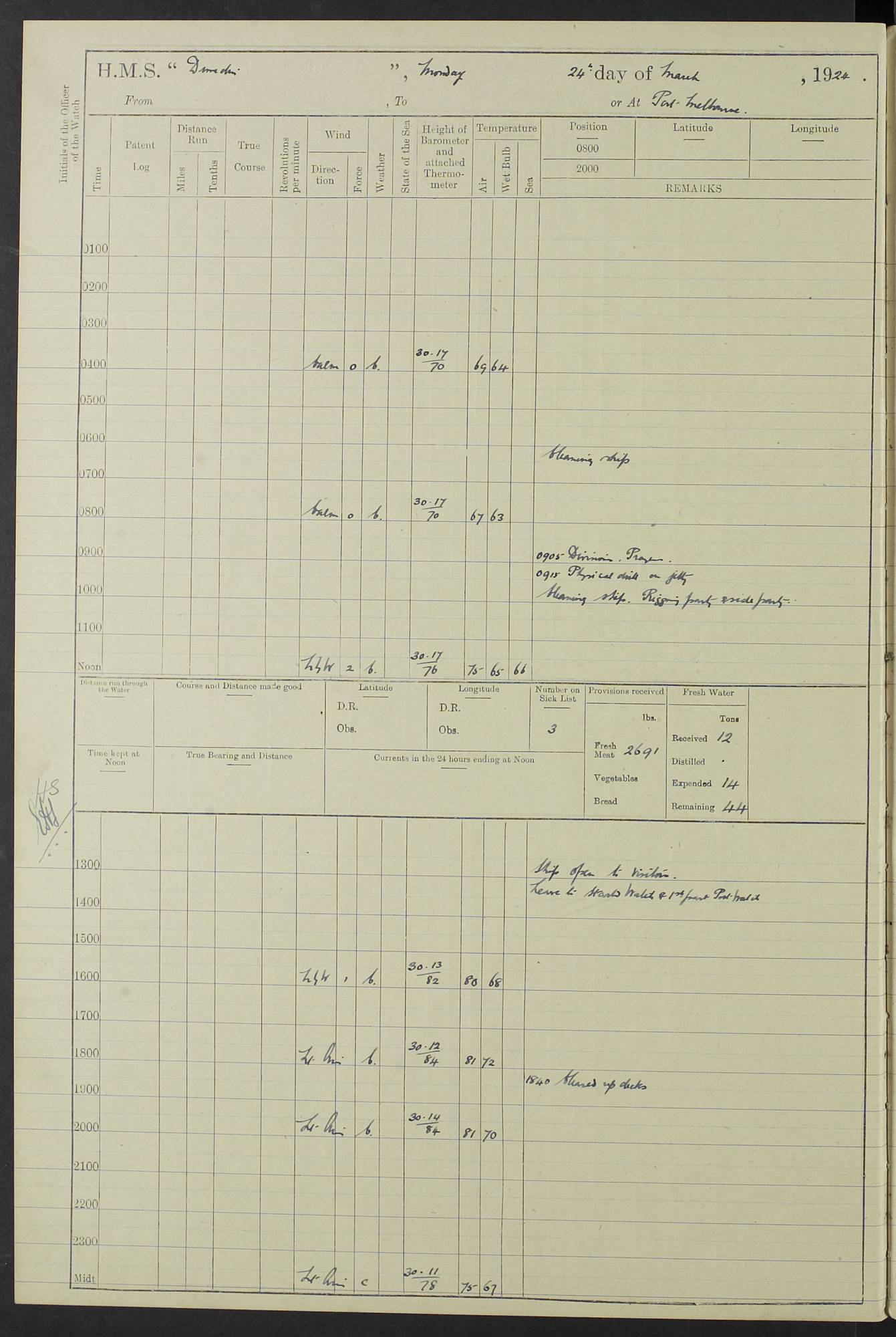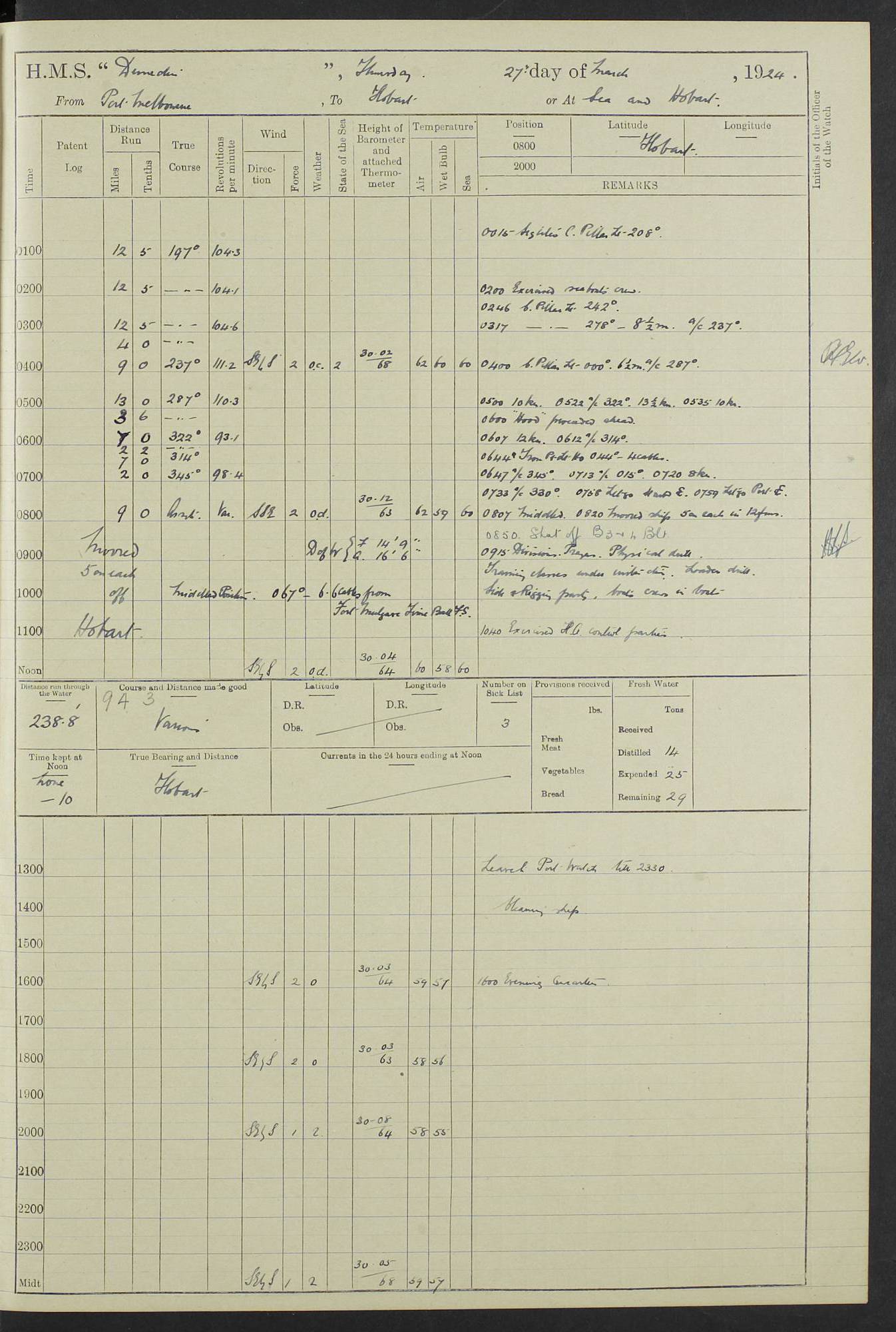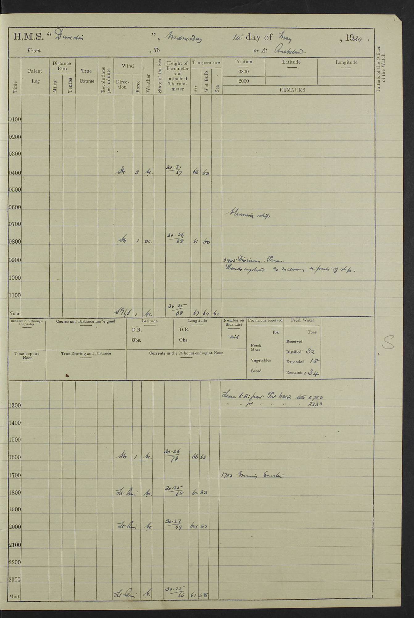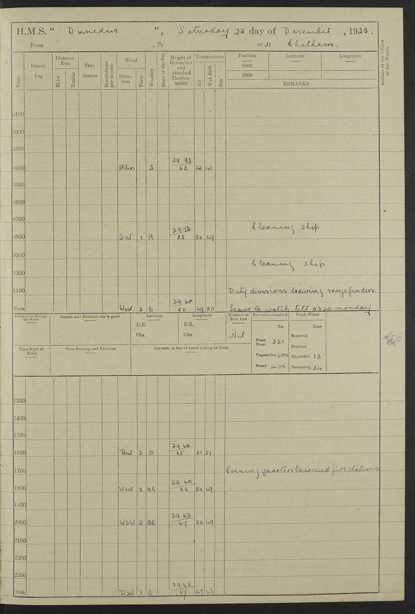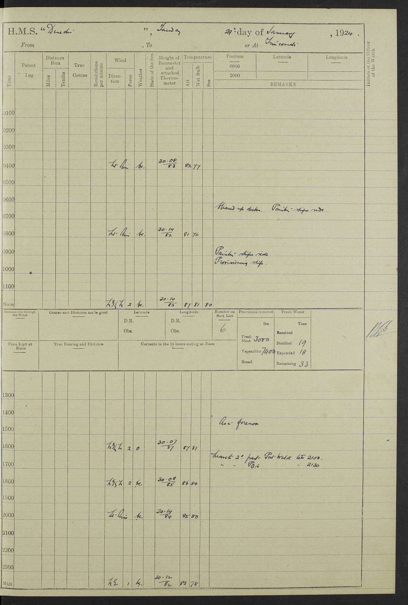 (Maps prepared using Journey Plotter, developed by Maikel. The Plots can only be approximate. They are made by joining-up positions on successive days, and sometimes positions are not given. There will therefore be occasions when the ship appears to have travelled overland) LOG BOOK – 23RD SEPTEMBER 1920 TO 13TH SEPTEMBER 1921 4caf8d9dcadfd3419703bde2: (http://oldweather.s3.amazonaws.com/ADM53-76345/ADM53-76345_0.jpg) Left front cover of Ship’s Log. 4caf8d9dcadfd3419703bde3: (http://oldweather.s3.amazonaws.com/ADM53-76345/ADM53-76345_1.jpg) Right front cover of Ship’s Log. 4caf8d97cadfd3419703bc6a: (http://oldweather.s3.amazonaws.com/ADM53-76345/ADM53-76345-002_0.jpg) 4caf8d97cadfd3419703bc6b: (http://oldweather.s3.amazonaws.com/ADM53-76345/ADM53-76345-002_1.jpg) 4caf8d97cadfd3419703bc6c: (http://oldweather.s3.amazonaws.com/ADM53-76345/ADM53-76345-003_0.jpg) 4caf8d97cadfd3419703bc6d: (http://oldweather.s3.amazonaws.com/ADM53-76345/ADM53-76345-003_1.jpg) 4caf8d97cadfd3419703bc6e: (http://oldweather.s3.amazonaws.com/ADM53-76345/ADM53-76345-004_0.jpg) Blank pages. 4caf8d97cadfd3419703bc6f: (http://oldweather.s3.amazonaws.com/ADM53-76345/ADM53-76345-004_1.jpg) S.- 321. See Articles 557, 619, 622, 924, 1025, 1026 and 1849 of the King’s Regulations, 1913. This Log is to be kept from the time the Ship is Commissioned until she is paid off; when it is to be transmitted as directed by the Admiralty Instructions. The Name and Address of the Officer to whom the acknowledgement of receipt should be sent by the Deputy Cashier in charge, Royal Victoria Yard, Deptford, is to be inserted here. Name: Commander’s Office. Address: H.M.S. Dunedin. c/o G.P.O. London. LOG of H.M.S. “Dunedin” Commanded by Captain C. Wrightson C.B.E. (till 31.3.21). Captain H.S. Monroe D.S.O. (from 31.3.21). FOR THE PERIOD Commencing: Thursday 23rd of September 1920. Ending: Tuesday 13th of September 1921. Tonnage (Displacement): 4,650 Extreme Length: 472ft 3 ins Extreme Breadth: 46 ft 0.3/8” Engines: Manufacturer: Messes R & W Hawthorn Leslie & Co Ltd. Newcastle on Tyne. I.H.P: 40.000 Forced Draught. Description: Turbine (Geared). When Fixed on Board: 1918 – 1919. Boilers: Manufacturer: Messes R & W Hawthorn Leslie & Co Ltd. Newcastle on Tyne. Description: Small tube Improved Yarrow. When made: 1918. When put in vessel: 1918. Paddle Wheels or Screw Propeller: Manufacturer: Manganese Bronze Co. Description: Solid 3 Blades Turbadium Bronze, Pitch 14 ft 3 in. General State of Repair: Satisfactory. R. Alison [?], Lieut Com (W) on paying off 30th August 1923. L. 8418/02. N.L. 15713/13. Where Built Sir W.G. Armstrong Whitworth & Co Ltd. N.L. 18227/18. Armstrong Naval Yard, High Walker, Newcastle on Tyne. Sta. 127/10. Commenced building November 1917, Launched 19 November 1918. N.L. 22782/19. Completed September 1919. 4caf8d98cadfd3419703bc70: (http://oldweather.s3.amazonaws.com/ADM53-76345/ADM53-76345-005_0.jpg) Directions (See King’s Regulations 1913, Articles 1025 and 1849). 1. King’s Regulations. 2. Figures to indicate the Force of the Wind. 3. Letters to denote the State of the Weather. 4. Scale of Fog Intensity. 5. Sea Disturbance Scale 4caf8d98cadfd3419703bc71: (http://oldweather.s3.amazonaws.com/ADM53-76345/ADM53-76345-005_1.jpg) Establishment of Ship’s Company Officers 23 Seamen 187 Boys 36 Marines 46 Engine-room Establishment 105 Other non-executive ratings 44 Total 441 ARMAMENT Position Forecastle: 6” Calibre XII on C.P. XIV mounting. Superstructure: Four 6” Calibre XII on C.P. XIV mountings. Superstructure: Two 3” QF Calibre High Angle mountings, Quarterdeck: 6” Calibre XII on C.P. XIV mountings. Torpedo Armaments Four above water 21” triple tubes. BAROMETER Mercurial or Aneroid: Mercurial. Name of Maker and number: J. Hitchins 101 A747. Height of cistern above sea: 13ft. Error of Mercurial Barometer: Nil at 30.00. Thermometers for Air Temperature. Position on Ship: On fore bridge. Whether in screen: Yes. Maker and No. Negretti & Zambra From: 7.10.19 To: Sept. 1921. Negretti & Zambra No. 10499 Negretti & Zambra No 10391 From: 7.10.19 To: Sept. 1921. Thermometer for Sea Temperature. A. Harper & Sons 7.10.19 POSITION OF STANDARD COMPASS. Manoeuvring Platform. (Fore bridge) BOATS Number of each carried: 1 x 30ft. motor boat. 2 x 32ft. cutters. 1 x 30ft gig. 2 x 27ft whalers. 2 x 16 ft dinghies. MISCELLANEOUS INFORMATION Draught of water with Bunkers full, and complete with provisions, Stores and water: Forward 16 ft 1 inch; Aft 16 ft 11 inches. Number of Tons necessary to increase draught 1 inch: 35.6. Number of Tons of Coal Carried: 16. Number of Tons of Oil Fuel carried: 1127. Quantity of Water Carried (a) For Boilers: 157 tons. (b) For Drinking: 56½ tons. LOGS FOR SEPTEMBER 1920 4caf8d98cadfd3419703bc72: (http://oldweather.s3.amazonaws.com/ADM53-76345/ADM53-76345-006_0.jpg) 23 September 1920 At Copenhagen. Lat 55.694, Long 12.603 4.00am: Signal books correct. am: Hands employed cleaning ship. 8.00am: Signal books correct. am: Sent coaling party to S.S. “Volo”. am: X & Y 6” guns crews at loader drill, remainder of hands employed as requisite. am: Coaling party returned. Noon: Signal books correct. 1.15pm: Sent coaling party to S.S. “Volo”. pm: 1 Rating joined ship from hospital. pm: Boys & training classes under instruction, remainder of hands employed as requisite. 3.00pm: U.S.S. “Gilmer” arrived. [Gilmer, U.S. Destroyer, Flush Decker, launched 18/7/19, Guns: 4 x 5”, 51 cal.,1 x 3”, 23 cal. AA, 12 x 21” TT’s in 4 triple deck mountings. Disp: 1,215 tons, SHP: 26,000 = 35 knots. Jane’s Fighting Ships 1919. Image]. 4.00pm: Signal books correct. pm: Coaling party returned. 8.00pm: Signal books correct. Midnight: Signal books correct. 4caf8d98cadfd3419703bc73: (http://oldweather.s3.amazonaws.com/ADM53-76345/ADM53-76345-006_1.jpg) 24 September 1920 At Copenhagen. Lat 55.694, Long 12.603 4.00am: Signal books correct. am: Hands employed cleaning ship. 6.15am: U.S.S. “Sh