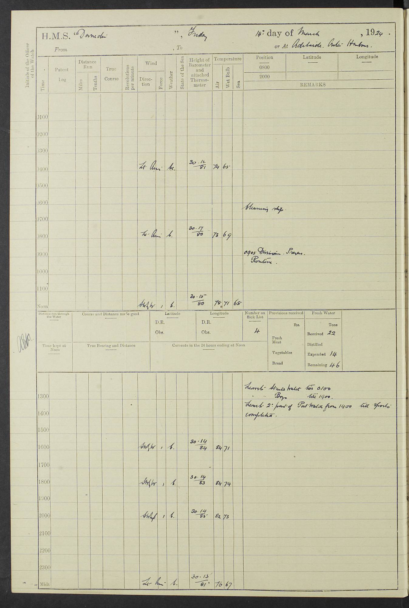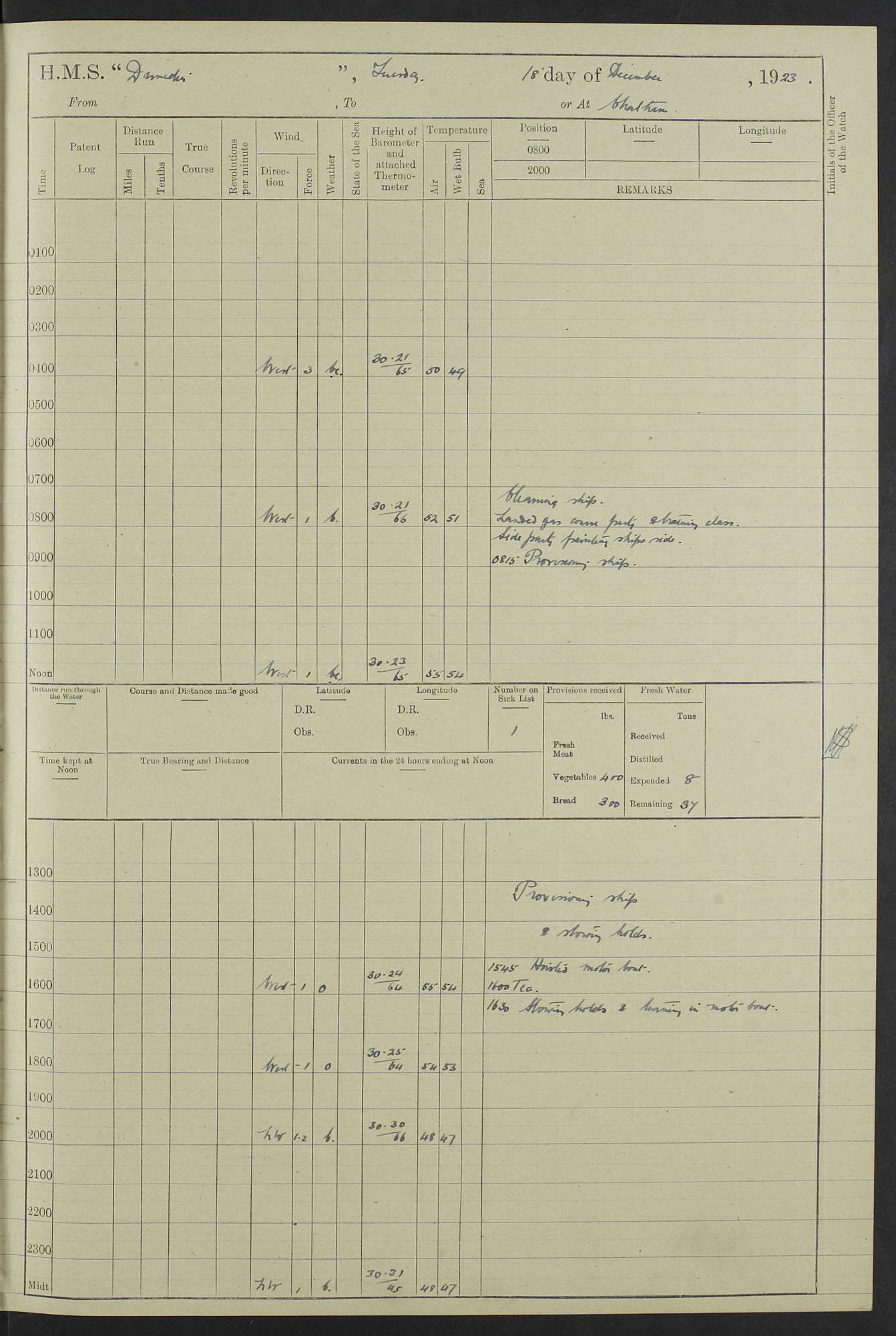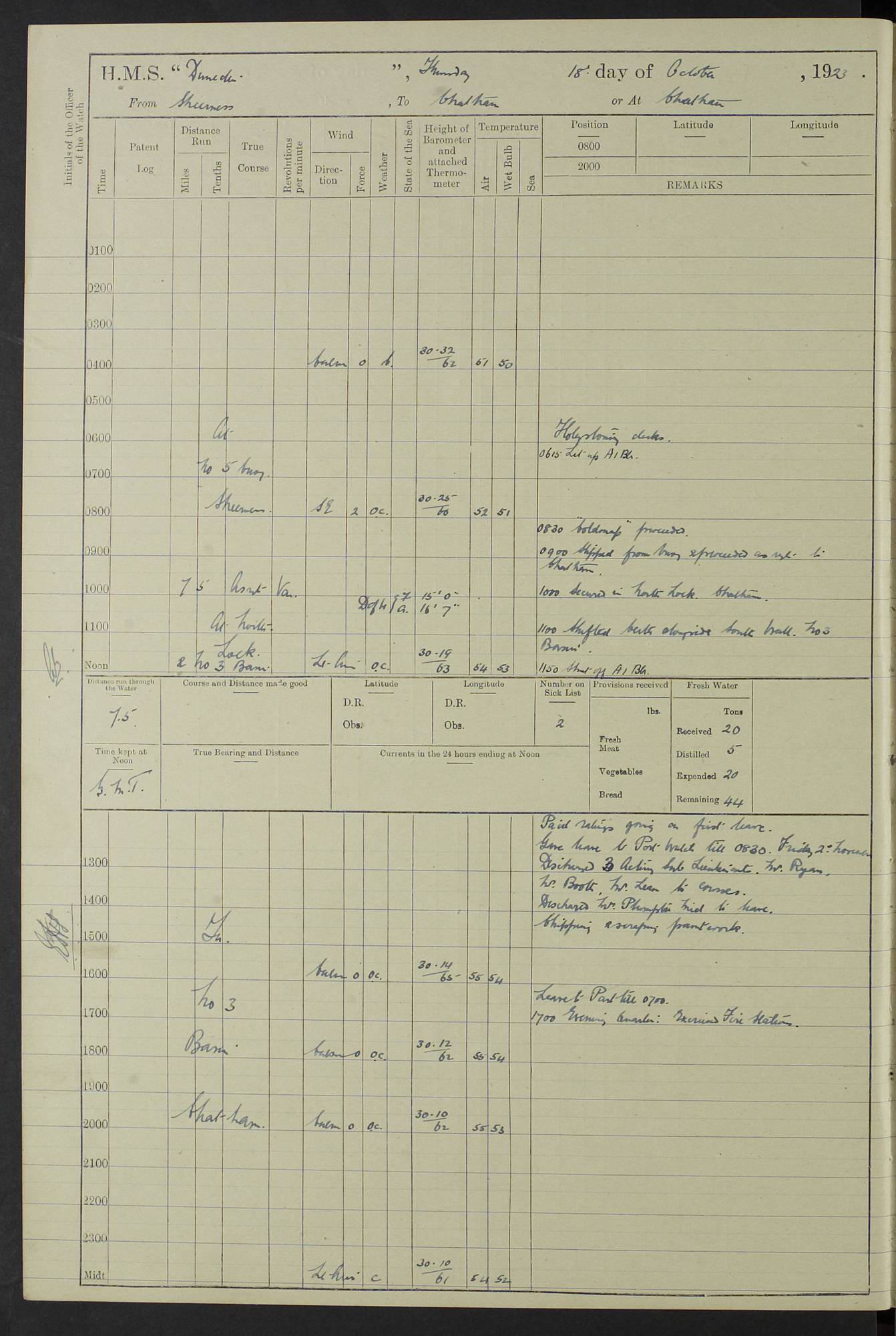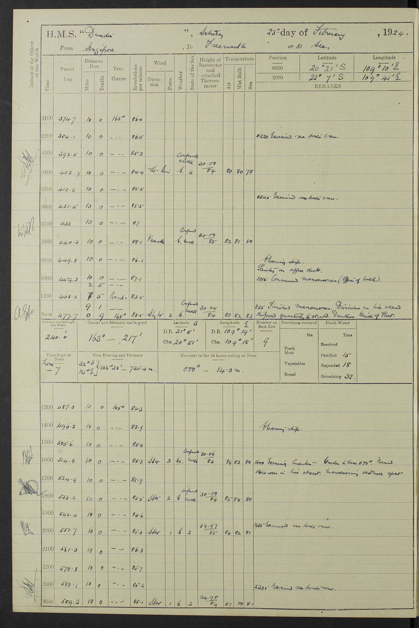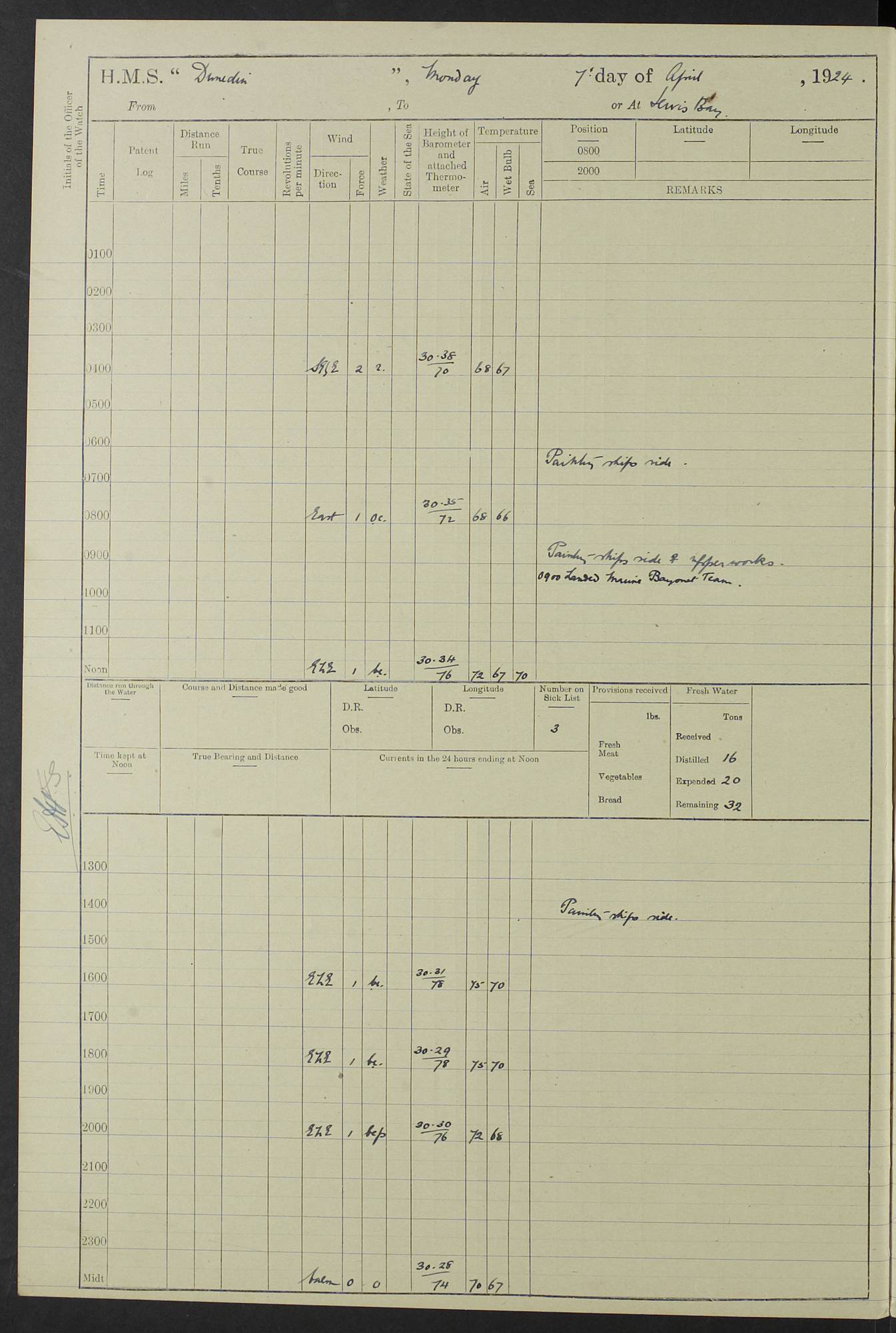 (Maps prepared using Journey Plotter, developed by Maikel. The Plots can only be approximate. They are made by joining-up positions on successive days, and sometimes positions are not given. There will therefore be occasions when the ship appears to have travelled overland) LOG BOOK – 23RD SEPTEMBER 1920 TO 13TH SEPTEMBER 1921 4caf8d9dcadfd3419703bde2: (http://oldweather.s3.amazonaws.com/ADM53-76345/ADM53-76345_0.jpg) Left front cover of Ship’s Log. 4caf8d9dcadfd3419703bde3: (http://oldweather.s3.amazonaws.com/ADM53-76345/ADM53-76345_1.jpg) Right front cover of Ship’s Log. 4caf8d97cadfd3419703bc6a: (http://oldweather.s3.amazonaws.com/ADM53-76345/ADM53-76345-002_0.jpg) 4caf8d97cadfd3419703bc6b: (http://oldweather.s3.amazonaws.com/ADM53-76345/ADM53-76345-002_1.jpg) 4caf8d97cadfd3419703bc6c: (http://oldweather.s3.amazonaws.com/ADM53-76345/ADM53-76345-003_0.jpg) 4caf8d97cadfd3419703bc6d: (http://oldweather.s3.amazonaws.com/ADM53-76345/ADM53-76345-003_1.jpg) 4caf8d97cadfd3419703bc6e: (http://oldweather.s3.amazonaws.com/ADM53-76345/ADM53-76345-004_0.jpg) Blank pages. 4caf8d97cadfd3419703bc6f: (http://oldweather.s3.amazonaws.com/ADM53-76345/ADM53-76345-004_1.jpg) S.- 321. See Articles 557, 619, 622, 924, 1025, 1026 and 1849 of the King’s Regulations, 1913. This Log is to be kept from the time the Ship is Commissioned until she is paid off; when it is to be transmitted as directed by the Admiralty Instructions. The Name and Address of the Officer to whom the acknowledgement of receipt should be sent by the Deputy Cashier in charge, Royal Victoria Yard, Deptford, is to be inserted here. Name: Commander’s Office. Address: H.M.S. Dunedin. c/o G.P.O. London. LOG of H.M.S. “Dunedin” Commanded by Captain C. Wrightson C.B.E. (till 31.3.21). Captain H.S. Monroe D.S.O. (from 31.3.21). FOR THE PERIOD Commencing: Thursday 23rd of September 1920. Ending: Tuesday 13th of September 1921. Tonnage (Displacement): 4,650 Extreme Length: 472ft 3 ins Extreme Breadth: 46 ft 0.3/8” Engines: Manufacturer: Messes R & W Hawthorn Leslie & Co Ltd. Newcastle on Tyne. I.H.P: 40.000 Forced Draught. Description: Turbine (Geared). When Fixed on Board: 1918 – 1919. Boilers: Manufacturer: Messes R & W Hawthorn Leslie & Co Ltd. Newcastle on Tyne. Description: Small tube Improved Yarrow. When made: 1918. When put in vessel: 1918. Paddle Wheels or Screw Propeller: Manufacturer: Manganese Bronze Co. Description: Solid 3 Blades Turbadium Bronze, Pitch 14 ft 3 in. General State of Repair: Satisfactory. R. Alison [?], Lieut Com (W) on paying off 30th August 1923. L. 8418/02. N.L. 15713/13. Where Built Sir W.G. Armstrong Whitworth & Co Ltd. N.L. 18227/18. Armstrong Naval Yard, High Walker, Newcastle on Tyne. Sta. 127/10. Commenced building November 1917, Launched 19 November 1918. N.L. 22782/19. Completed September 1919. 4caf8d98cadfd3419703bc70: (http://oldweather.s3.amazonaws.com/ADM53-76345/ADM53-76345-005_0.jpg) Directions (See King’s Regulations 1913, Articles 1025 and 1849). 1. King’s Regulations. 2. Figures to indicate the Force of the Wind. 3. Letters to denote the State of the Weather. 4. Scale of Fog Intensity. 5. Sea Disturbance Scale 4caf8d98cadfd3419703bc71: (http://oldweather.s3.amazonaws.com/ADM53-76345/ADM53-76345-005_1.jpg) Establishment of Ship’s Company Officers 23 Seamen 187 Boys 36 Marines 46 Engine-room Establishment 105 Other non-executive ratings 44 Total 441 ARMAMENT Position Forecastle: 6” Calibre XII on C.P. XIV mounting. Superstructure: Four 6” Calibre XII on C.P. XIV mountings. Superstructure: Two 3” QF Calibre High Angle mountings, Quarterdeck: 6” Calibre XII on C.P. XIV mountings. Torpedo Armaments Four above water 21” triple tubes. BAROMETER Mercurial or Aneroid: Mercurial. Name of Maker and number: J. Hitchins 101 A747. Height of cistern above sea: 13ft. Error of Mercurial Barometer: Nil at 30.00. Thermometers for Air Temperature. Position on Ship: On fore bridge. Whether in screen: Yes. Maker and No. Negretti & Zambra From: 7.10.19 To: Sept. 1921. Negretti & Zambra No. 10499 Negretti & Zambra No 10391 From: 7.10.19 To: Sept. 1921. Thermometer for Sea Temperature. A. Harper & Sons 7.10.19 POSITION OF STANDARD COMPASS. Manoeuvring Platform. (Fore bridge) BOATS Number of each carried: 1 x 30ft. motor boat. 2 x 32ft. cutters. 1 x 30ft gig. 2 x 27ft whalers. 2 x 16 ft dinghies. MISCELLANEOUS INFORMATION Draught of water with Bunkers full, and complete with provisions, Stores and water: Forward 16 ft 1 inch; Aft 16 ft 11 inches. Number of Tons necessary to increase draught 1 inch: 35.6. Number of Tons of Coal Carried: 16. Number of Tons of Oil Fuel carried: 1127. Quantity of Water Carried (a) For Boilers: 157 tons. (b) For Drinking: 56½ tons. LOGS FOR SEPTEMBER 1920 4caf8d98cadfd3419703bc72: (http://oldweather.s3.amazonaws.com/ADM53-76345/ADM53-76345-006_0.jpg) 23 September 1920 At Copenhagen. Lat 55.694, Long 12.603 4.00am: Signal books correct. am: Hands employed cleaning ship. 8.00am: Signal books correct. am: Sent coaling party to S.S. “Volo”. am: X & Y 6” guns crews at loader drill, remainder of hands employed as requisite. am: Coaling party returned. Noon: Signal books correct. 1.15pm: Sent coaling party to S.S. “Volo”. pm: 1 Rating joined ship from hospital. pm: Boys & training classes under instruction, remainder of hands employed as requisite. 3.00pm: U.S.S. “Gilmer” arrived. [Gilmer, U.S. Destroyer, Flush Decker, launched 18/7/19, Guns: 4 x 5”, 51 cal.,1 x 3”, 23 cal. AA, 12 x 21” TT’s in 4 triple deck mountings. Disp: 1,215 tons, SHP: 26,000 = 35 knots. Jane’s Fighting Ships 1919. Image]. 4.00pm: Signal books correct. pm: Coaling party returned. 8.00pm: Signal books correct. Midnight: Signal books correct. 4caf8d98cadfd3419703bc73: (http://oldweather.s3.amazonaws.com/ADM53-76345/ADM53-76345-006_1.jpg) 24 September 1920 At Copenhagen. Lat 55.694, Long 12.603 4.00am: Signal books correct. am: Hands employed cleaning ship. 6.15am: U.S.S. “Sh