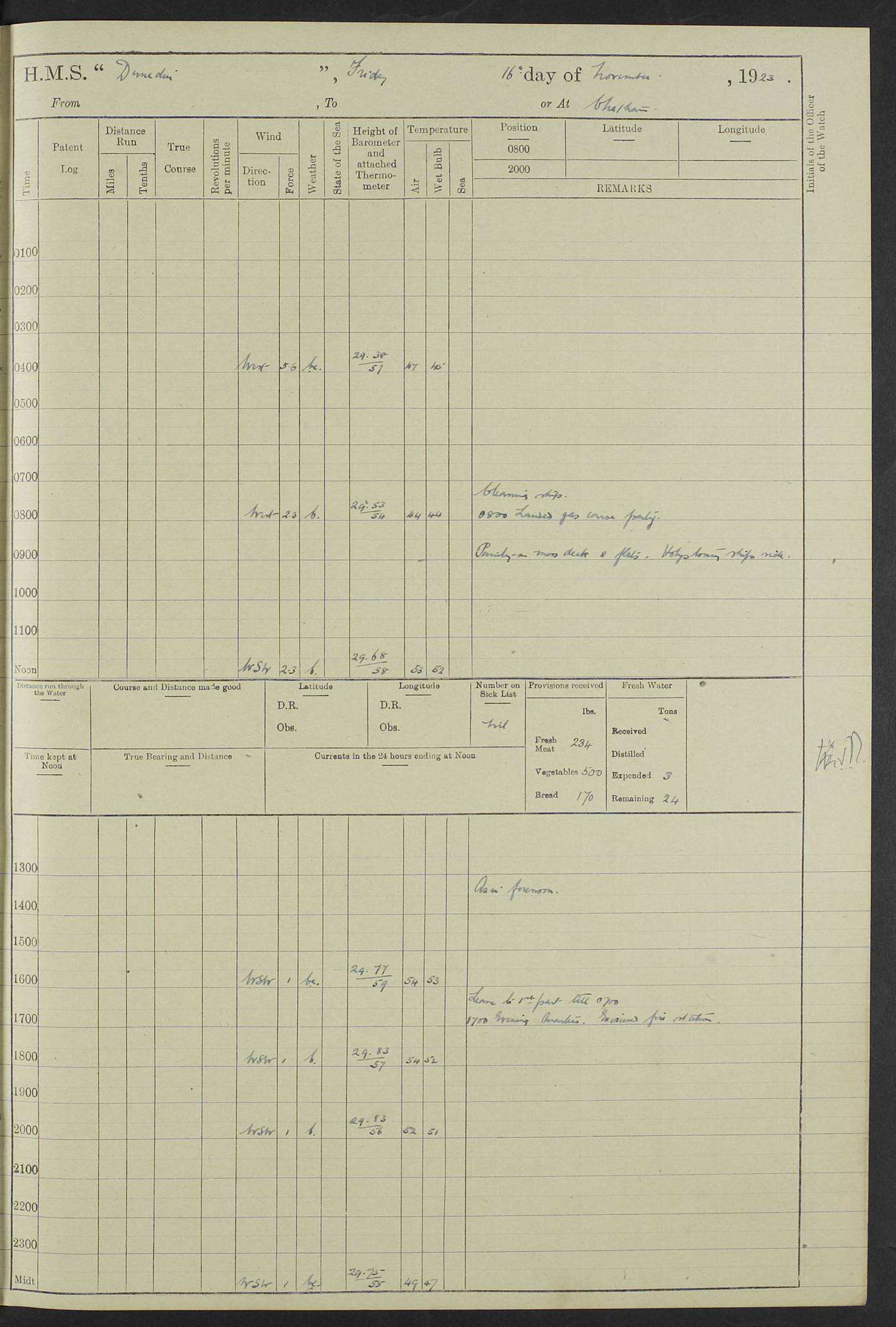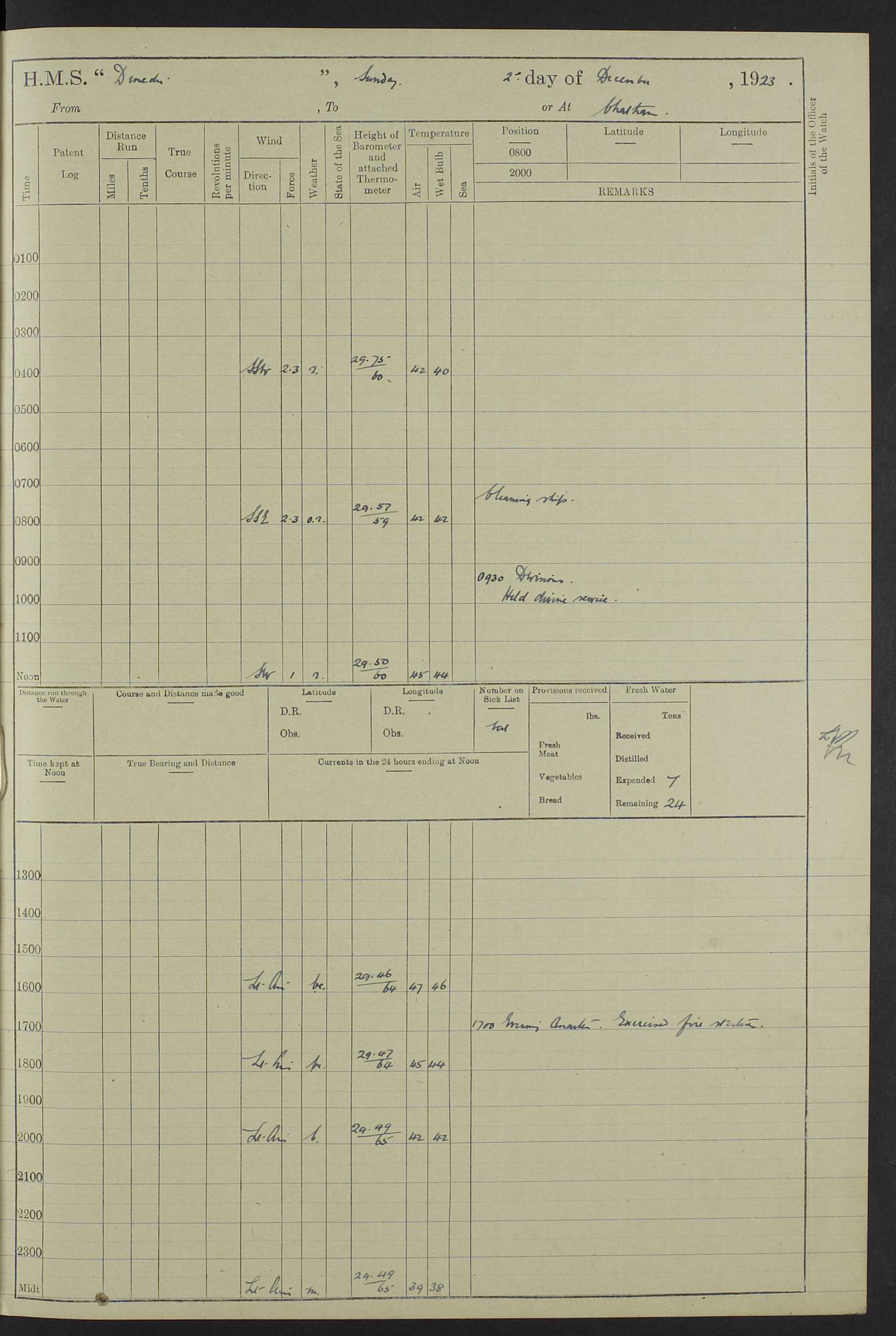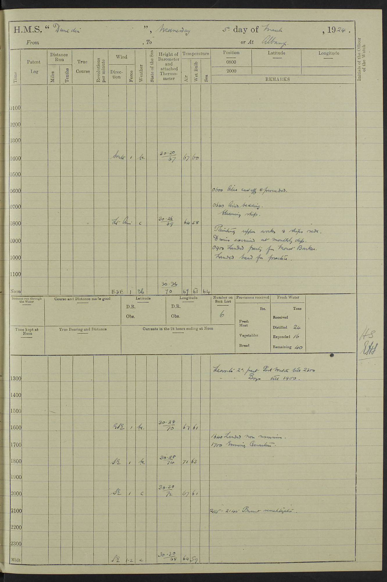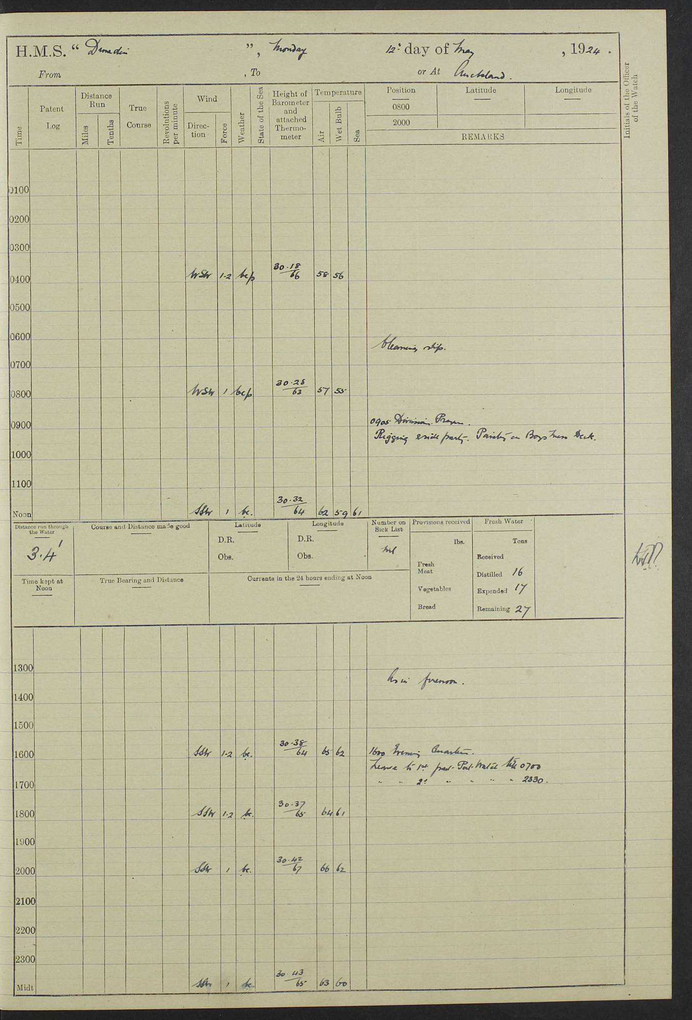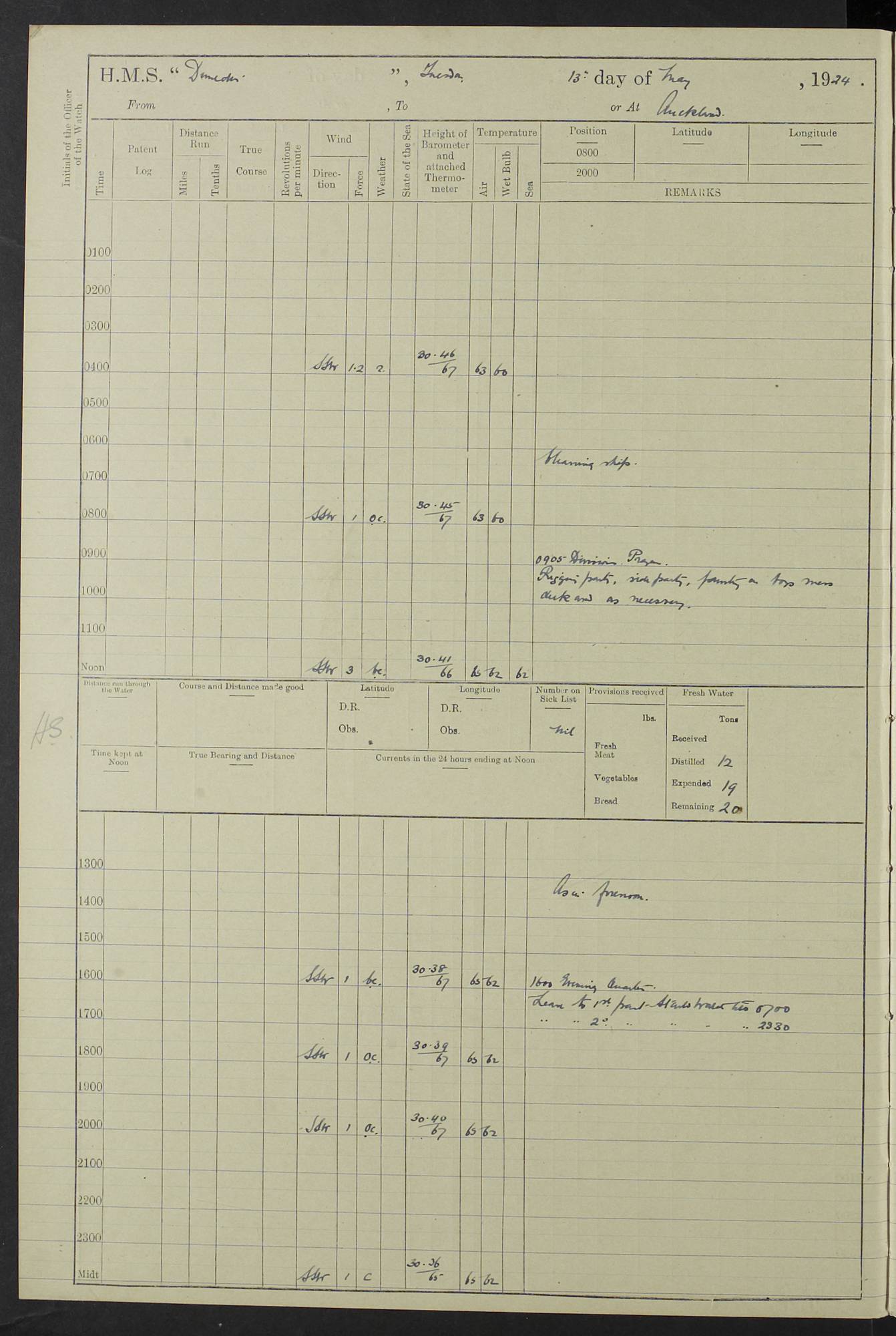 (Maps prepared using Journey Plotter, developed by Maikel. The Plots can only be approximate. They are made by joining-up positions on successive days, and sometimes positions are not given. There will therefore be occasions when the ship appears to have travelled overland) LOG BOOK – 23RD SEPTEMBER 1920 TO 13TH SEPTEMBER 1921 4caf8d9dcadfd3419703bde2: (http://oldweather.s3.amazonaws.com/ADM53-76345/ADM53-76345_0.jpg) Left front cover of Ship’s Log. 4caf8d9dcadfd3419703bde3: (http://oldweather.s3.amazonaws.com/ADM53-76345/ADM53-76345_1.jpg) Right front cover of Ship’s Log. 4caf8d97cadfd3419703bc6a: (http://oldweather.s3.amazonaws.com/ADM53-76345/ADM53-76345-002_0.jpg) 4caf8d97cadfd3419703bc6b: (http://oldweather.s3.amazonaws.com/ADM53-76345/ADM53-76345-002_1.jpg) 4caf8d97cadfd3419703bc6c: (http://oldweather.s3.amazonaws.com/ADM53-76345/ADM53-76345-003_0.jpg) 4caf8d97cadfd3419703bc6d: (http://oldweather.s3.amazonaws.com/ADM53-76345/ADM53-76345-003_1.jpg) 4caf8d97cadfd3419703bc6e: (http://oldweather.s3.amazonaws.com/ADM53-76345/ADM53-76345-004_0.jpg) Blank pages. 4caf8d97cadfd3419703bc6f: (http://oldweather.s3.amazonaws.com/ADM53-76345/ADM53-76345-004_1.jpg) S.- 321. See Articles 557, 619, 622, 924, 1025, 1026 and 1849 of the King’s Regulations, 1913. This Log is to be kept from the time the Ship is Commissioned until she is paid off; when it is to be transmitted as directed by the Admiralty Instructions. The Name and Address of the Officer to whom the acknowledgement of receipt should be sent by the Deputy Cashier in charge, Royal Victoria Yard, Deptford, is to be inserted here. Name: Commander’s Office. Address: H.M.S. Dunedin. c/o G.P.O. London. LOG of H.M.S. “Dunedin” Commanded by Captain C. Wrightson C.B.E. (till 31.3.21). Captain H.S. Monroe D.S.O. (from 31.3.21). FOR THE PERIOD Commencing: Thursday 23rd of September 1920. Ending: Tuesday 13th of September 1921. Tonnage (Displacement): 4,650 Extreme Length: 472ft 3 ins Extreme Breadth: 46 ft 0.3/8” Engines: Manufacturer: Messes R & W Hawthorn Leslie & Co Ltd. Newcastle on Tyne. I.H.P: 40.000 Forced Draught. Description: Turbine (Geared). When Fixed on Board: 1918 – 1919. Boilers: Manufacturer: Messes R & W Hawthorn Leslie & Co Ltd. Newcastle on Tyne. Description: Small tube Improved Yarrow. When made: 1918. When put in vessel: 1918. Paddle Wheels or Screw Propeller: Manufacturer: Manganese Bronze Co. Description: Solid 3 Blades Turbadium Bronze, Pitch 14 ft 3 in. General State of Repair: Satisfactory. R. Alison [?], Lieut Com (W) on paying off 30th August 1923. L. 8418/02. N.L. 15713/13. Where Built Sir W.G. Armstrong Whitworth & Co Ltd. N.L. 18227/18. Armstrong Naval Yard, High Walker, Newcastle on Tyne. Sta. 127/10. Commenced building November 1917, Launched 19 November 1918. N.L. 22782/19. Completed September 1919. 4caf8d98cadfd3419703bc70: (http://oldweather.s3.amazonaws.com/ADM53-76345/ADM53-76345-005_0.jpg) Directions (See King’s Regulations 1913, Articles 1025 and 1849). 1. King’s Regulations. 2. Figures to indicate the Force of the Wind. 3. Letters to denote the State of the Weather. 4. Scale of Fog Intensity. 5. Sea Disturbance Scale 4caf8d98cadfd3419703bc71: (http://oldweather.s3.amazonaws.com/ADM53-76345/ADM53-76345-005_1.jpg) Establishment of Ship’s Company Officers 23 Seamen 187 Boys 36 Marines 46 Engine-room Establishment 105 Other non-executive ratings 44 Total 441 ARMAMENT Position Forecastle: 6” Calibre XII on C.P. XIV mounting. Superstructure: Four 6” Calibre XII on C.P. XIV mountings. Superstructure: Two 3” QF Calibre High Angle mountings, Quarterdeck: 6” Calibre XII on C.P. XIV mountings. Torpedo Armaments Four above water 21” triple tubes. BAROMETER Mercurial or Aneroid: Mercurial. Name of Maker and number: J. Hitchins 101 A747. Height of cistern above sea: 13ft. Error of Mercurial Barometer: Nil at 30.00. Thermometers for Air Temperature. Position on Ship: On fore bridge. Whether in screen: Yes. Maker and No. Negretti & Zambra From: 7.10.19 To: Sept. 1921. Negretti & Zambra No. 10499 Negretti & Zambra No 10391 From: 7.10.19 To: Sept. 1921. Thermometer for Sea Temperature. A. Harper & Sons 7.10.19 POSITION OF STANDARD COMPASS. Manoeuvring Platform. (Fore bridge) BOATS Number of each carried: 1 x 30ft. motor boat. 2 x 32ft. cutters. 1 x 30ft gig. 2 x 27ft whalers. 2 x 16 ft dinghies. MISCELLANEOUS INFORMATION Draught of water with Bunkers full, and complete with provisions, Stores and water: Forward 16 ft 1 inch; Aft 16 ft 11 inches. Number of Tons necessary to increase draught 1 inch: 35.6. Number of Tons of Coal Carried: 16. Number of Tons of Oil Fuel carried: 1127. Quantity of Water Carried (a) For Boilers: 157 tons. (b) For Drinking: 56½ tons. LOGS FOR SEPTEMBER 1920 4caf8d98cadfd3419703bc72: (http://oldweather.s3.amazonaws.com/ADM53-76345/ADM53-76345-006_0.jpg) 23 September 1920 At Copenhagen. Lat 55.694, Long 12.603 4.00am: Signal books correct. am: Hands employed cleaning ship. 8.00am: Signal books correct. am: Sent coaling party to S.S. “Volo”. am: X & Y 6” guns crews at loader drill, remainder of hands employed as requisite. am: Coaling party returned. Noon: Signal books correct. 1.15pm: Sent coaling party to S.S. “Volo”. pm: 1 Rating joined ship from hospital. pm: Boys & training classes under instruction, remainder of hands employed as requisite. 3.00pm: U.S.S. “Gilmer” arrived. [Gilmer, U.S. Destroyer, Flush Decker, launched 18/7/19, Guns: 4 x 5”, 51 cal.,1 x 3”, 23 cal. AA, 12 x 21” TT’s in 4 triple deck mountings. Disp: 1,215 tons, SHP: 26,000 = 35 knots. Jane’s Fighting Ships 1919. Image]. 4.00pm: Signal books correct. pm: Coaling party returned. 8.00pm: Signal books correct. Midnight: Signal books correct. 4caf8d98cadfd3419703bc73: (http://oldweather.s3.amazonaws.com/ADM53-76345/ADM53-76345-006_1.jpg) 24 September 1920 At Copenhagen. Lat 55.694, Long 12.603 4.00am: Signal books correct. am: Hands employed cleaning ship. 6.15am: U.S.S. “Sh