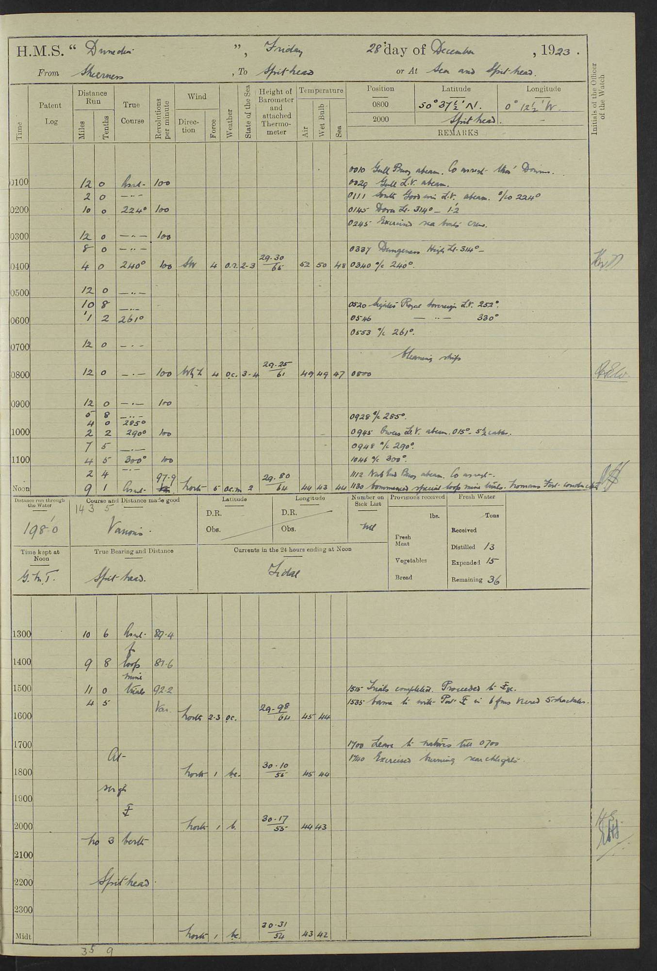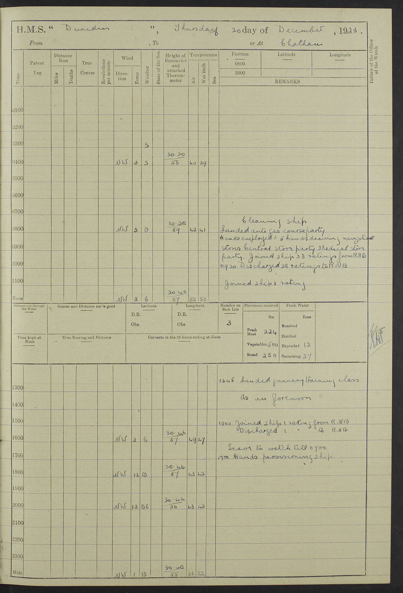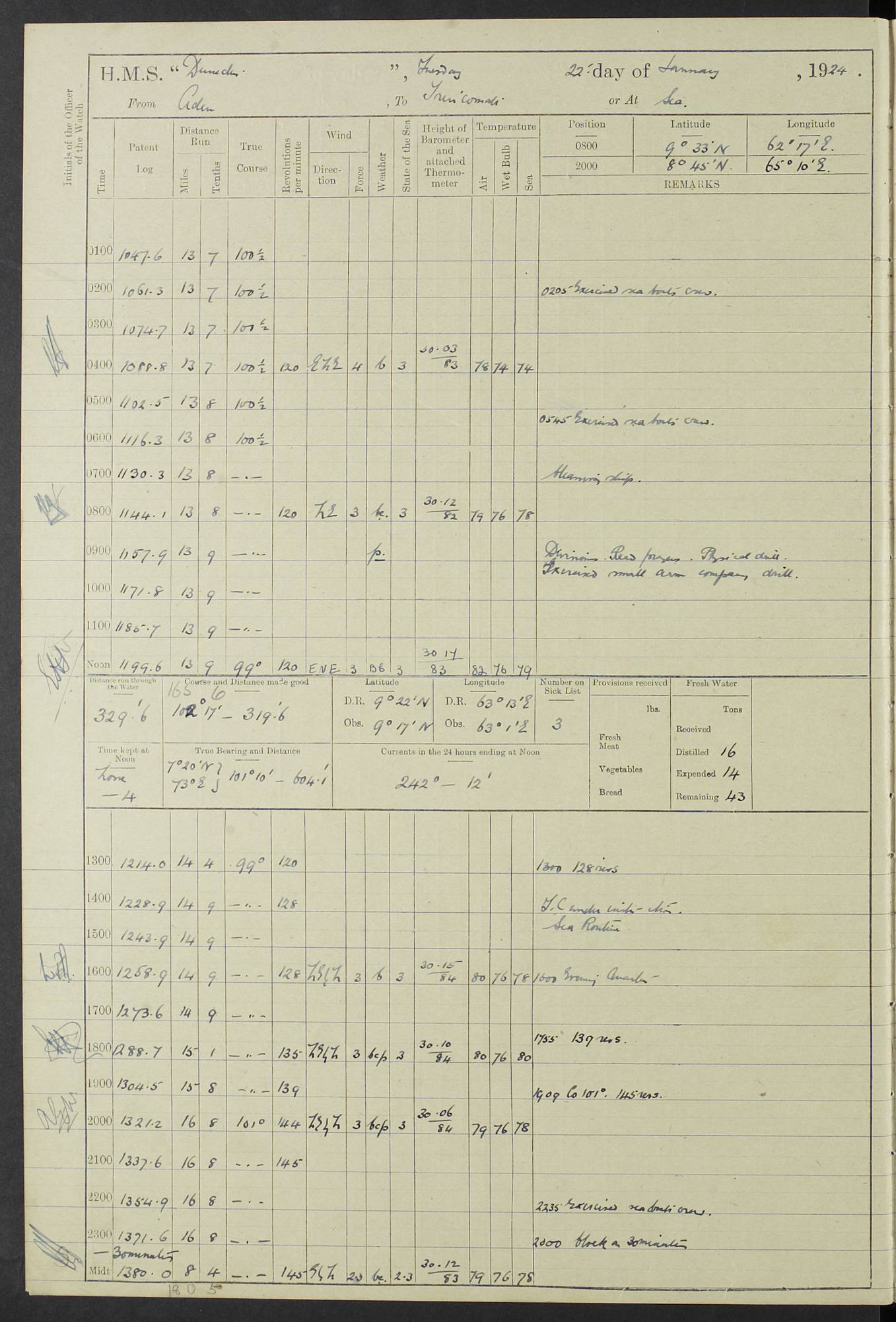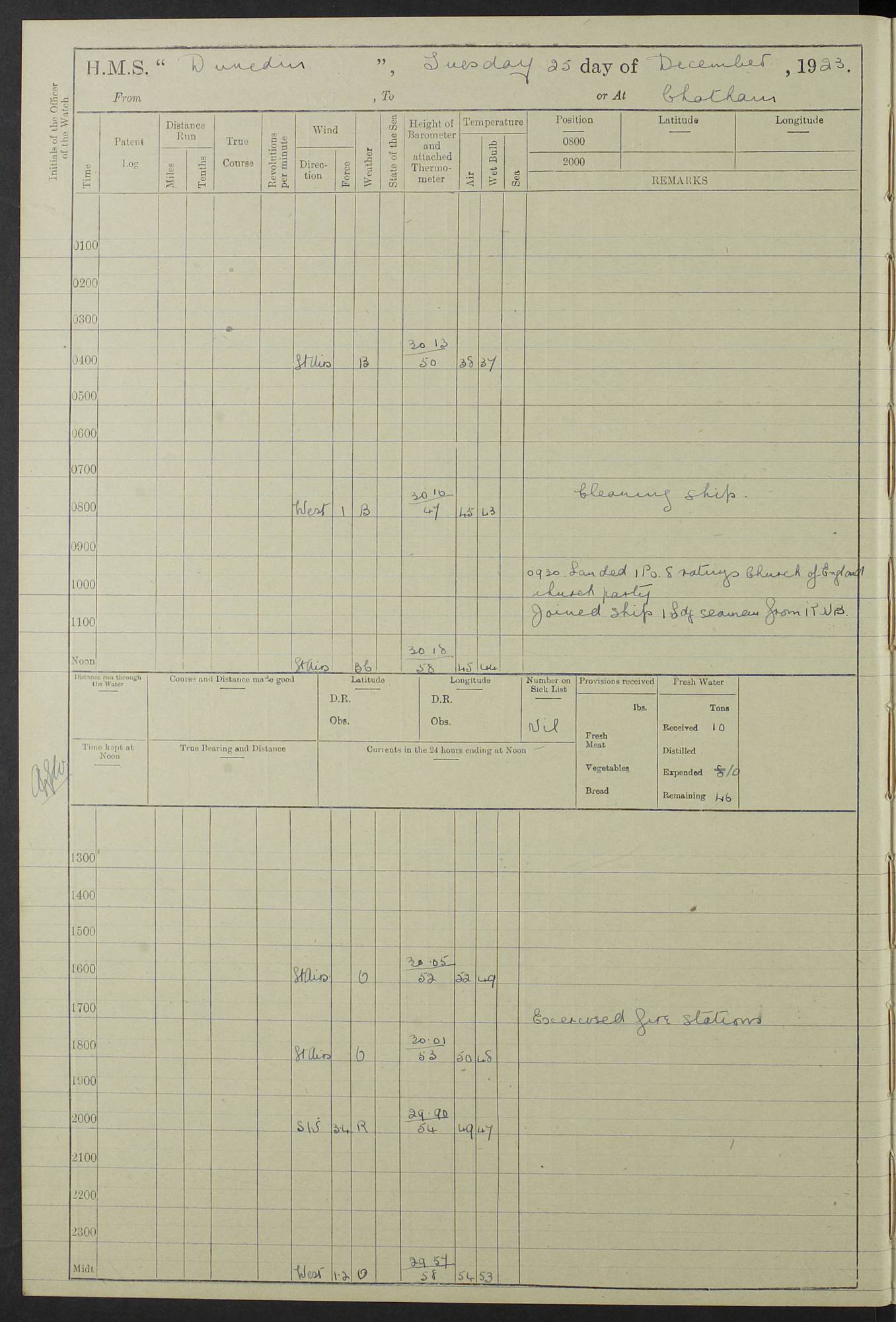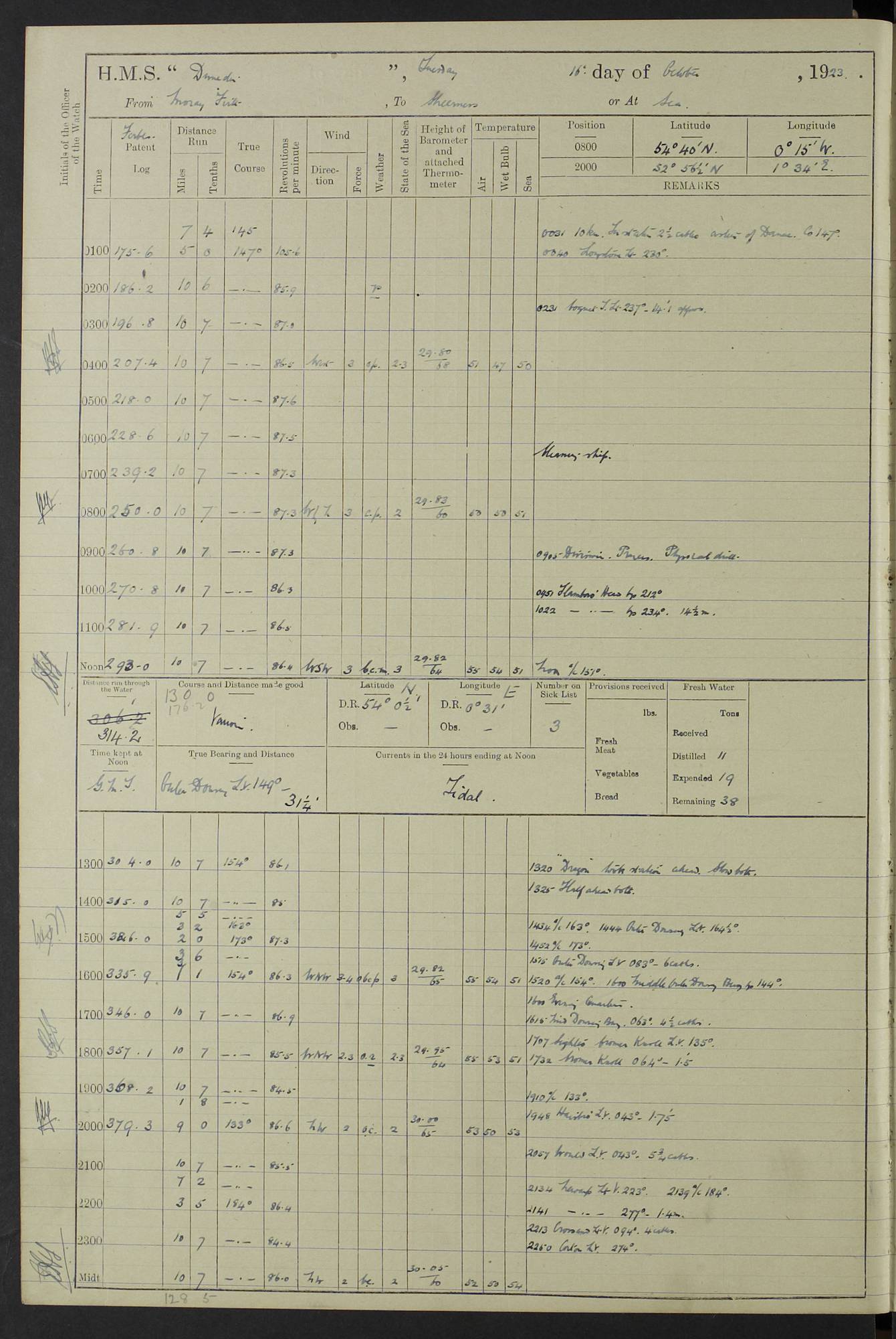 (Maps prepared using Journey Plotter, developed by Maikel. The Plots can only be approximate. They are made by joining-up positions on successive days, and sometimes positions are not given. There will therefore be occasions when the ship appears to have travelled overland) LOG BOOK – 23RD SEPTEMBER 1920 TO 13TH SEPTEMBER 1921 4caf8d9dcadfd3419703bde2: (http://oldweather.s3.amazonaws.com/ADM53-76345/ADM53-76345_0.jpg) Left front cover of Ship’s Log. 4caf8d9dcadfd3419703bde3: (http://oldweather.s3.amazonaws.com/ADM53-76345/ADM53-76345_1.jpg) Right front cover of Ship’s Log. 4caf8d97cadfd3419703bc6a: (http://oldweather.s3.amazonaws.com/ADM53-76345/ADM53-76345-002_0.jpg) 4caf8d97cadfd3419703bc6b: (http://oldweather.s3.amazonaws.com/ADM53-76345/ADM53-76345-002_1.jpg) 4caf8d97cadfd3419703bc6c: (http://oldweather.s3.amazonaws.com/ADM53-76345/ADM53-76345-003_0.jpg) 4caf8d97cadfd3419703bc6d: (http://oldweather.s3.amazonaws.com/ADM53-76345/ADM53-76345-003_1.jpg) 4caf8d97cadfd3419703bc6e: (http://oldweather.s3.amazonaws.com/ADM53-76345/ADM53-76345-004_0.jpg) Blank pages. 4caf8d97cadfd3419703bc6f: (http://oldweather.s3.amazonaws.com/ADM53-76345/ADM53-76345-004_1.jpg) S.- 321. See Articles 557, 619, 622, 924, 1025, 1026 and 1849 of the King’s Regulations, 1913. This Log is to be kept from the time the Ship is Commissioned until she is paid off; when it is to be transmitted as directed by the Admiralty Instructions. The Name and Address of the Officer to whom the acknowledgement of receipt should be sent by the Deputy Cashier in charge, Royal Victoria Yard, Deptford, is to be inserted here. Name: Commander’s Office. Address: H.M.S. Dunedin. c/o G.P.O. London. LOG of H.M.S. “Dunedin” Commanded by Captain C. Wrightson C.B.E. (till 31.3.21). Captain H.S. Monroe D.S.O. (from 31.3.21). FOR THE PERIOD Commencing: Thursday 23rd of September 1920. Ending: Tuesday 13th of September 1921. Tonnage (Displacement): 4,650 Extreme Length: 472ft 3 ins Extreme Breadth: 46 ft 0.3/8” Engines: Manufacturer: Messes R & W Hawthorn Leslie & Co Ltd. Newcastle on Tyne. I.H.P: 40.000 Forced Draught. Description: Turbine (Geared). When Fixed on Board: 1918 – 1919. Boilers: Manufacturer: Messes R & W Hawthorn Leslie & Co Ltd. Newcastle on Tyne. Description: Small tube Improved Yarrow. When made: 1918. When put in vessel: 1918. Paddle Wheels or Screw Propeller: Manufacturer: Manganese Bronze Co. Description: Solid 3 Blades Turbadium Bronze, Pitch 14 ft 3 in. General State of Repair: Satisfactory. R. Alison [?], Lieut Com (W) on paying off 30th August 1923. L. 8418/02. N.L. 15713/13. Where Built Sir W.G. Armstrong Whitworth & Co Ltd. N.L. 18227/18. Armstrong Naval Yard, High Walker, Newcastle on Tyne. Sta. 127/10. Commenced building November 1917, Launched 19 November 1918. N.L. 22782/19. Completed September 1919. 4caf8d98cadfd3419703bc70: (http://oldweather.s3.amazonaws.com/ADM53-76345/ADM53-76345-005_0.jpg) Directions (See King’s Regulations 1913, Articles 1025 and 1849). 1. King’s Regulations. 2. Figures to indicate the Force of the Wind. 3. Letters to denote the State of the Weather. 4. Scale of Fog Intensity. 5. Sea Disturbance Scale 4caf8d98cadfd3419703bc71: (http://oldweather.s3.amazonaws.com/ADM53-76345/ADM53-76345-005_1.jpg) Establishment of Ship’s Company Officers 23 Seamen 187 Boys 36 Marines 46 Engine-room Establishment 105 Other non-executive ratings 44 Total 441 ARMAMENT Position Forecastle: 6” Calibre XII on C.P. XIV mounting. Superstructure: Four 6” Calibre XII on C.P. XIV mountings. Superstructure: Two 3” QF Calibre High Angle mountings, Quarterdeck: 6” Calibre XII on C.P. XIV mountings. Torpedo Armaments Four above water 21” triple tubes. BAROMETER Mercurial or Aneroid: Mercurial. Name of Maker and number: J. Hitchins 101 A747. Height of cistern above sea: 13ft. Error of Mercurial Barometer: Nil at 30.00. Thermometers for Air Temperature. Position on Ship: On fore bridge. Whether in screen: Yes. Maker and No. Negretti & Zambra From: 7.10.19 To: Sept. 1921. Negretti & Zambra No. 10499 Negretti & Zambra No 10391 From: 7.10.19 To: Sept. 1921. Thermometer for Sea Temperature. A. Harper & Sons 7.10.19 POSITION OF STANDARD COMPASS. Manoeuvring Platform. (Fore bridge) BOATS Number of each carried: 1 x 30ft. motor boat. 2 x 32ft. cutters. 1 x 30ft gig. 2 x 27ft whalers. 2 x 16 ft dinghies. MISCELLANEOUS INFORMATION Draught of water with Bunkers full, and complete with provisions, Stores and water: Forward 16 ft 1 inch; Aft 16 ft 11 inches. Number of Tons necessary to increase draught 1 inch: 35.6. Number of Tons of Coal Carried: 16. Number of Tons of Oil Fuel carried: 1127. Quantity of Water Carried (a) For Boilers: 157 tons. (b) For Drinking: 56½ tons. LOGS FOR SEPTEMBER 1920 4caf8d98cadfd3419703bc72: (http://oldweather.s3.amazonaws.com/ADM53-76345/ADM53-76345-006_0.jpg) 23 September 1920 At Copenhagen. Lat 55.694, Long 12.603 4.00am: Signal books correct. am: Hands employed cleaning ship. 8.00am: Signal books correct. am: Sent coaling party to S.S. “Volo”. am: X & Y 6” guns crews at loader drill, remainder of hands employed as requisite. am: Coaling party returned. Noon: Signal books correct. 1.15pm: Sent coaling party to S.S. “Volo”. pm: 1 Rating joined ship from hospital. pm: Boys & training classes under instruction, remainder of hands employed as requisite. 3.00pm: U.S.S. “Gilmer” arrived. [Gilmer, U.S. Destroyer, Flush Decker, launched 18/7/19, Guns: 4 x 5”, 51 cal.,1 x 3”, 23 cal. AA, 12 x 21” TT’s in 4 triple deck mountings. Disp: 1,215 tons, SHP: 26,000 = 35 knots. Jane’s Fighting Ships 1919. Image]. 4.00pm: Signal books correct. pm: Coaling party returned. 8.00pm: Signal books correct. Midnight: Signal books correct. 4caf8d98cadfd3419703bc73: (http://oldweather.s3.amazonaws.com/ADM53-76345/ADM53-76345-006_1.jpg) 24 September 1920 At Copenhagen. Lat 55.694, Long 12.603 4.00am: Signal books correct. am: Hands employed cleaning ship. 6.15am: U.S.S. “Sh