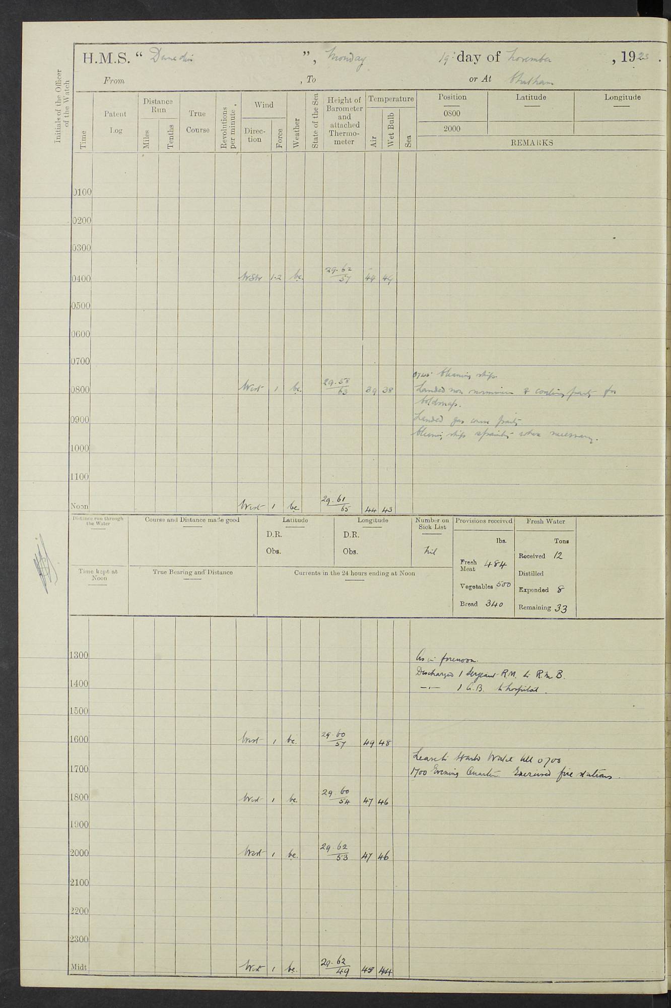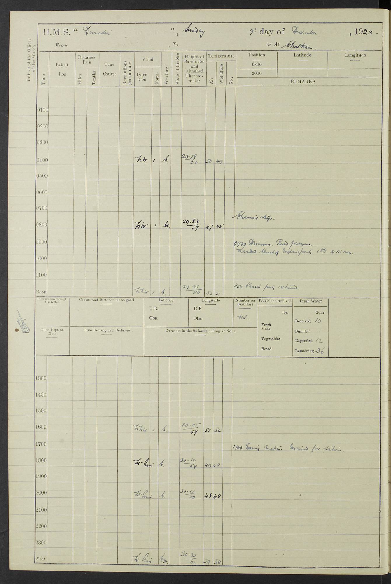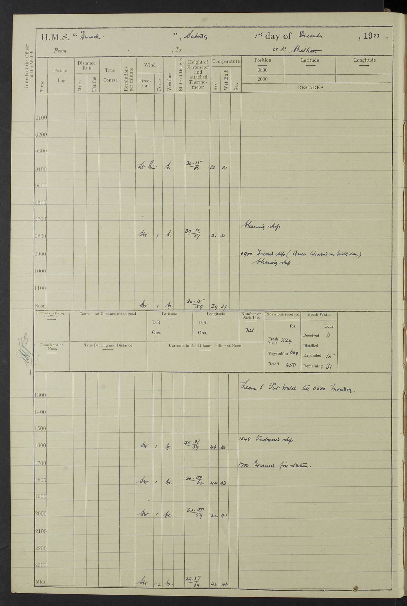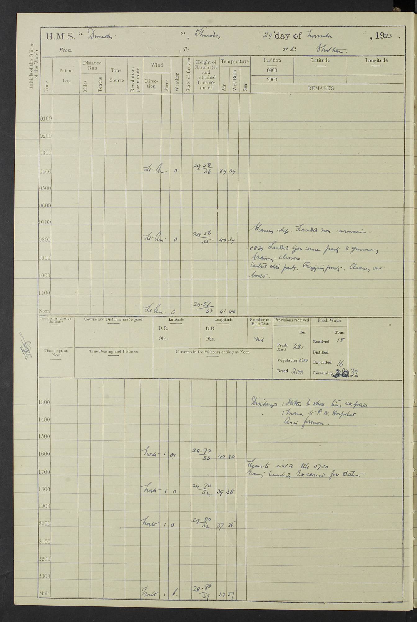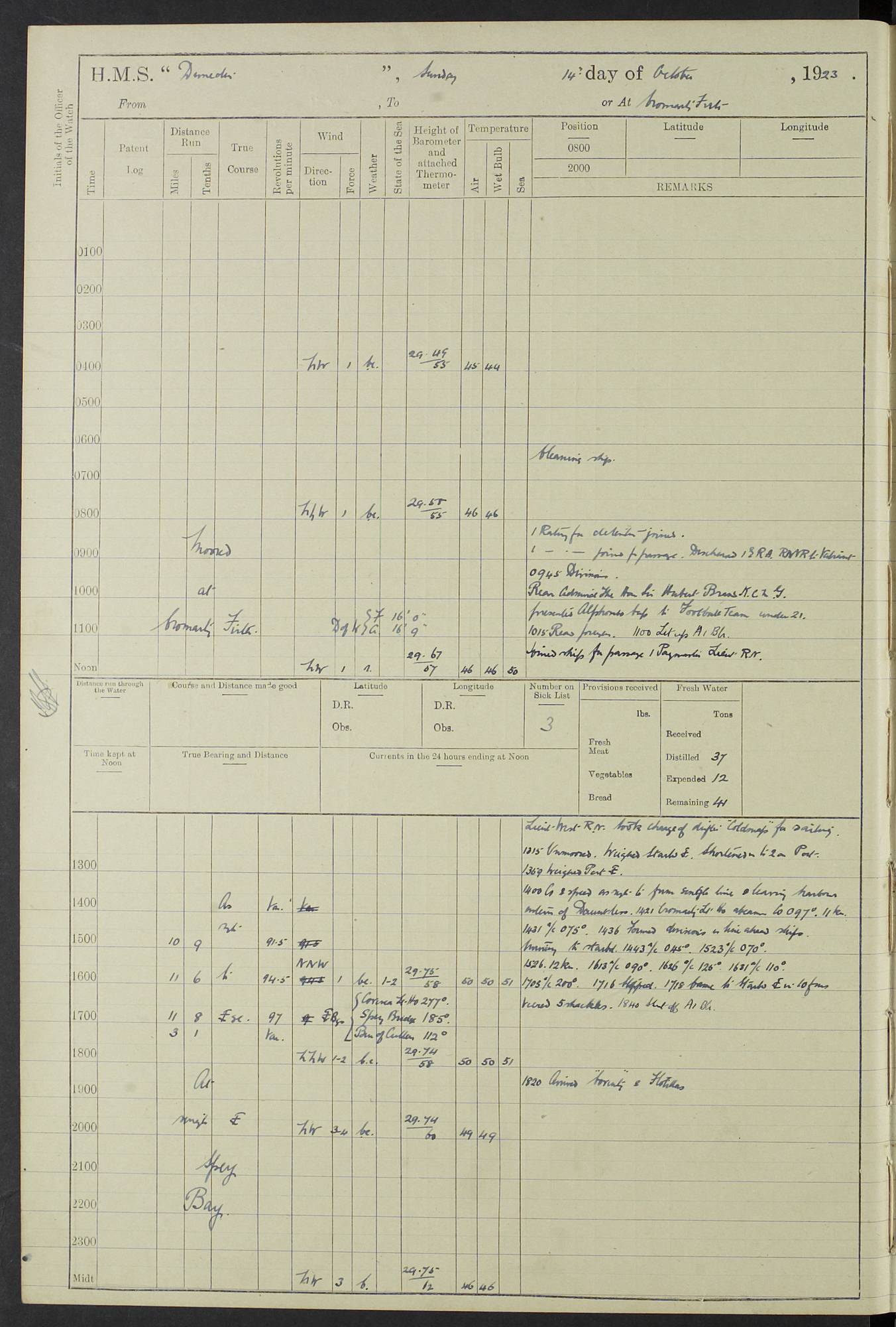 (Maps prepared using Journey Plotter, developed by Maikel. The Plots can only be approximate. They are made by joining-up positions on successive days, and sometimes positions are not given. There will therefore be occasions when the ship appears to have travelled overland) LOG BOOK – 23RD SEPTEMBER 1920 TO 13TH SEPTEMBER 1921 4caf8d9dcadfd3419703bde2: (http://oldweather.s3.amazonaws.com/ADM53-76345/ADM53-76345_0.jpg) Left front cover of Ship’s Log. 4caf8d9dcadfd3419703bde3: (http://oldweather.s3.amazonaws.com/ADM53-76345/ADM53-76345_1.jpg) Right front cover of Ship’s Log. 4caf8d97cadfd3419703bc6a: (http://oldweather.s3.amazonaws.com/ADM53-76345/ADM53-76345-002_0.jpg) 4caf8d97cadfd3419703bc6b: (http://oldweather.s3.amazonaws.com/ADM53-76345/ADM53-76345-002_1.jpg) 4caf8d97cadfd3419703bc6c: (http://oldweather.s3.amazonaws.com/ADM53-76345/ADM53-76345-003_0.jpg) 4caf8d97cadfd3419703bc6d: (http://oldweather.s3.amazonaws.com/ADM53-76345/ADM53-76345-003_1.jpg) 4caf8d97cadfd3419703bc6e: (http://oldweather.s3.amazonaws.com/ADM53-76345/ADM53-76345-004_0.jpg) Blank pages. 4caf8d97cadfd3419703bc6f: (http://oldweather.s3.amazonaws.com/ADM53-76345/ADM53-76345-004_1.jpg) S.- 321. See Articles 557, 619, 622, 924, 1025, 1026 and 1849 of the King’s Regulations, 1913. This Log is to be kept from the time the Ship is Commissioned until she is paid off; when it is to be transmitted as directed by the Admiralty Instructions. The Name and Address of the Officer to whom the acknowledgement of receipt should be sent by the Deputy Cashier in charge, Royal Victoria Yard, Deptford, is to be inserted here. Name: Commander’s Office. Address: H.M.S. Dunedin. c/o G.P.O. London. LOG of H.M.S. “Dunedin” Commanded by Captain C. Wrightson C.B.E. (till 31.3.21). Captain H.S. Monroe D.S.O. (from 31.3.21). FOR THE PERIOD Commencing: Thursday 23rd of September 1920. Ending: Tuesday 13th of September 1921. Tonnage (Displacement): 4,650 Extreme Length: 472ft 3 ins Extreme Breadth: 46 ft 0.3/8” Engines: Manufacturer: Messes R & W Hawthorn Leslie & Co Ltd. Newcastle on Tyne. I.H.P: 40.000 Forced Draught. Description: Turbine (Geared). When Fixed on Board: 1918 – 1919. Boilers: Manufacturer: Messes R & W Hawthorn Leslie & Co Ltd. Newcastle on Tyne. Description: Small tube Improved Yarrow. When made: 1918. When put in vessel: 1918. Paddle Wheels or Screw Propeller: Manufacturer: Manganese Bronze Co. Description: Solid 3 Blades Turbadium Bronze, Pitch 14 ft 3 in. General State of Repair: Satisfactory. R. Alison [?], Lieut Com (W) on paying off 30th August 1923. L. 8418/02. N.L. 15713/13. Where Built Sir W.G. Armstrong Whitworth & Co Ltd. N.L. 18227/18. Armstrong Naval Yard, High Walker, Newcastle on Tyne. Sta. 127/10. Commenced building November 1917, Launched 19 November 1918. N.L. 22782/19. Completed September 1919. 4caf8d98cadfd3419703bc70: (http://oldweather.s3.amazonaws.com/ADM53-76345/ADM53-76345-005_0.jpg) Directions (See King’s Regulations 1913, Articles 1025 and 1849). 1. King’s Regulations. 2. Figures to indicate the Force of the Wind. 3. Letters to denote the State of the Weather. 4. Scale of Fog Intensity. 5. Sea Disturbance Scale 4caf8d98cadfd3419703bc71: (http://oldweather.s3.amazonaws.com/ADM53-76345/ADM53-76345-005_1.jpg) Establishment of Ship’s Company Officers 23 Seamen 187 Boys 36 Marines 46 Engine-room Establishment 105 Other non-executive ratings 44 Total 441 ARMAMENT Position Forecastle: 6” Calibre XII on C.P. XIV mounting. Superstructure: Four 6” Calibre XII on C.P. XIV mountings. Superstructure: Two 3” QF Calibre High Angle mountings, Quarterdeck: 6” Calibre XII on C.P. XIV mountings. Torpedo Armaments Four above water 21” triple tubes. BAROMETER Mercurial or Aneroid: Mercurial. Name of Maker and number: J. Hitchins 101 A747. Height of cistern above sea: 13ft. Error of Mercurial Barometer: Nil at 30.00. Thermometers for Air Temperature. Position on Ship: On fore bridge. Whether in screen: Yes. Maker and No. Negretti & Zambra From: 7.10.19 To: Sept. 1921. Negretti & Zambra No. 10499 Negretti & Zambra No 10391 From: 7.10.19 To: Sept. 1921. Thermometer for Sea Temperature. A. Harper & Sons 7.10.19 POSITION OF STANDARD COMPASS. Manoeuvring Platform. (Fore bridge) BOATS Number of each carried: 1 x 30ft. motor boat. 2 x 32ft. cutters. 1 x 30ft gig. 2 x 27ft whalers. 2 x 16 ft dinghies. MISCELLANEOUS INFORMATION Draught of water with Bunkers full, and complete with provisions, Stores and water: Forward 16 ft 1 inch; Aft 16 ft 11 inches. Number of Tons necessary to increase draught 1 inch: 35.6. Number of Tons of Coal Carried: 16. Number of Tons of Oil Fuel carried: 1127. Quantity of Water Carried (a) For Boilers: 157 tons. (b) For Drinking: 56½ tons. LOGS FOR SEPTEMBER 1920 4caf8d98cadfd3419703bc72: (http://oldweather.s3.amazonaws.com/ADM53-76345/ADM53-76345-006_0.jpg) 23 September 1920 At Copenhagen. Lat 55.694, Long 12.603 4.00am: Signal books correct. am: Hands employed cleaning ship. 8.00am: Signal books correct. am: Sent coaling party to S.S. “Volo”. am: X & Y 6” guns crews at loader drill, remainder of hands employed as requisite. am: Coaling party returned. Noon: Signal books correct. 1.15pm: Sent coaling party to S.S. “Volo”. pm: 1 Rating joined ship from hospital. pm: Boys & training classes under instruction, remainder of hands employed as requisite. 3.00pm: U.S.S. “Gilmer” arrived. [Gilmer, U.S. Destroyer, Flush Decker, launched 18/7/19, Guns: 4 x 5”, 51 cal.,1 x 3”, 23 cal. AA, 12 x 21” TT’s in 4 triple deck mountings. Disp: 1,215 tons, SHP: 26,000 = 35 knots. Jane’s Fighting Ships 1919. Image]. 4.00pm: Signal books correct. pm: Coaling party returned. 8.00pm: Signal books correct. Midnight: Signal books correct. 4caf8d98cadfd3419703bc73: (http://oldweather.s3.amazonaws.com/ADM53-76345/ADM53-76345-006_1.jpg) 24 September 1920 At Copenhagen. Lat 55.694, Long 12.603 4.00am: Signal books correct. am: Hands employed cleaning ship. 6.15am: U.S.S. “Sh