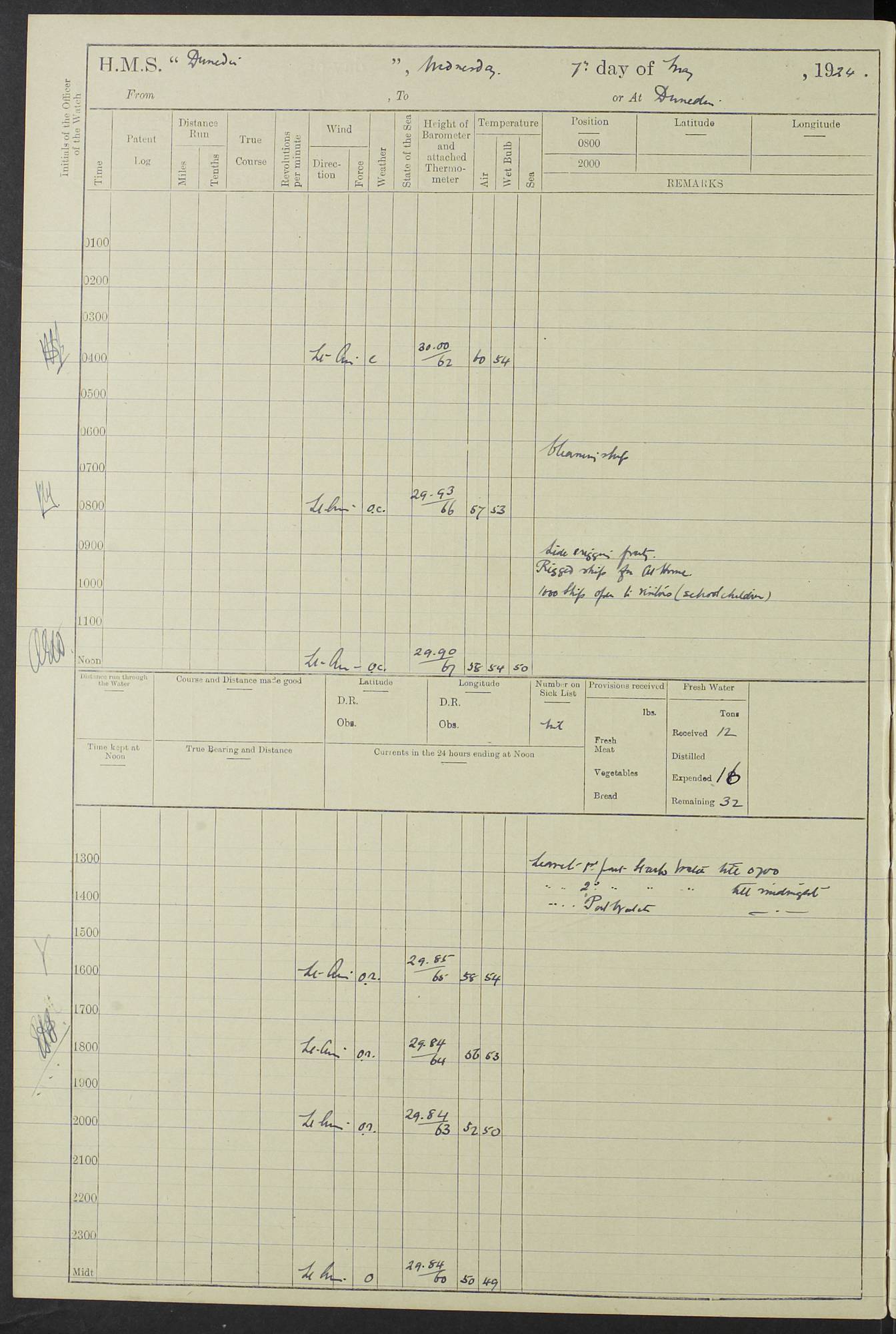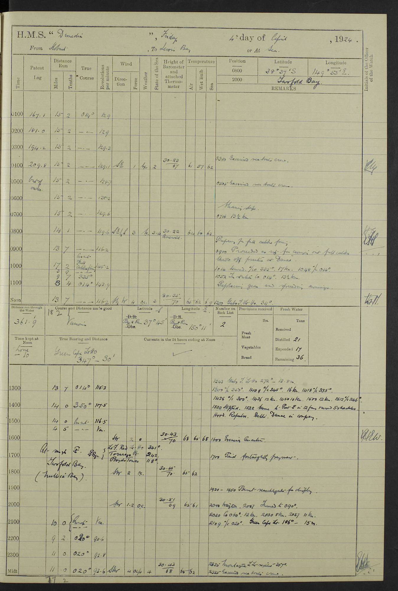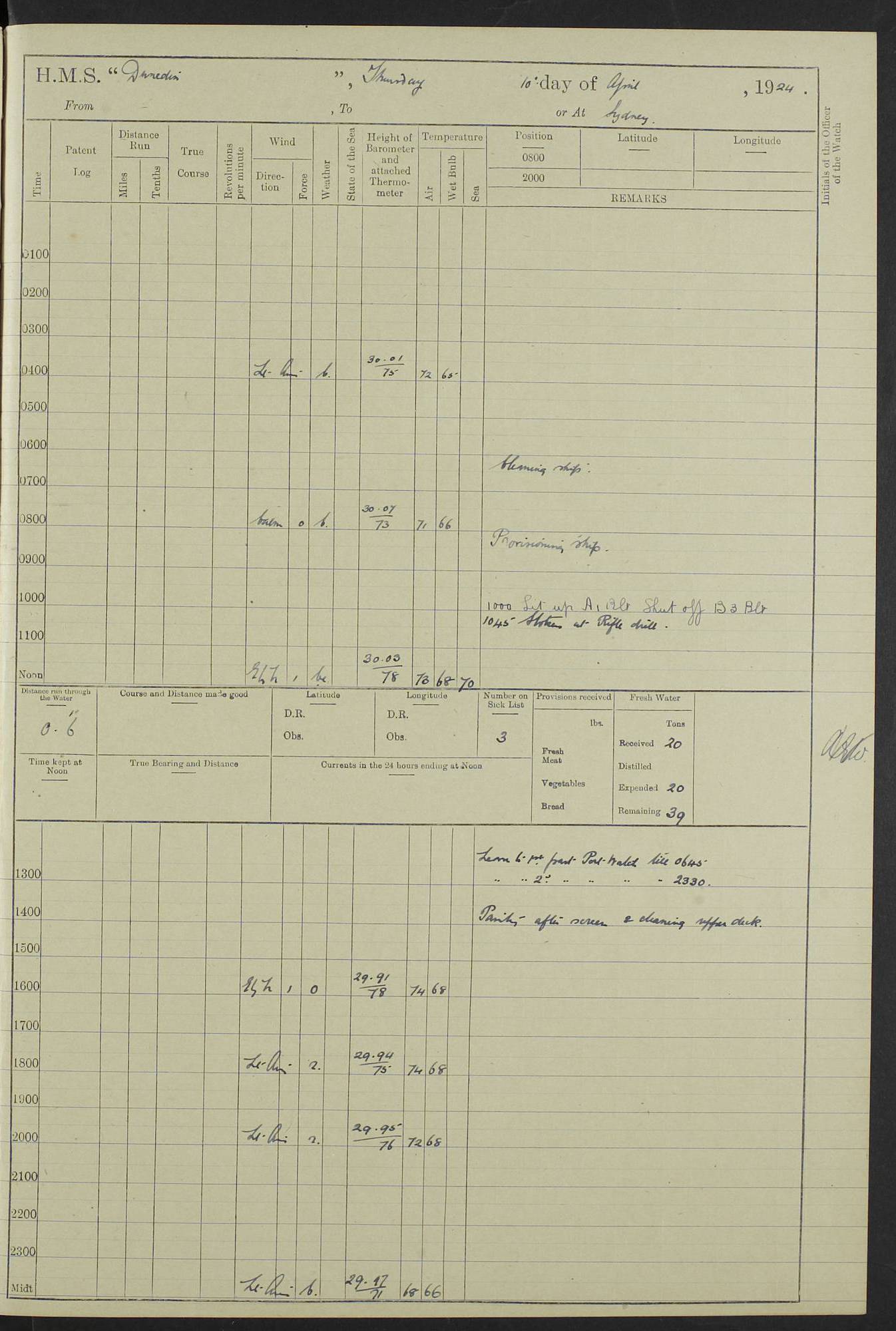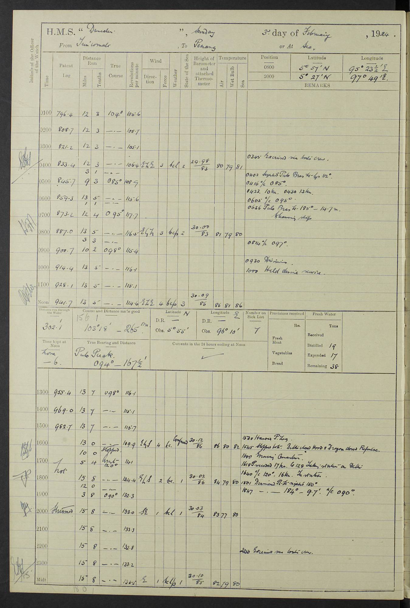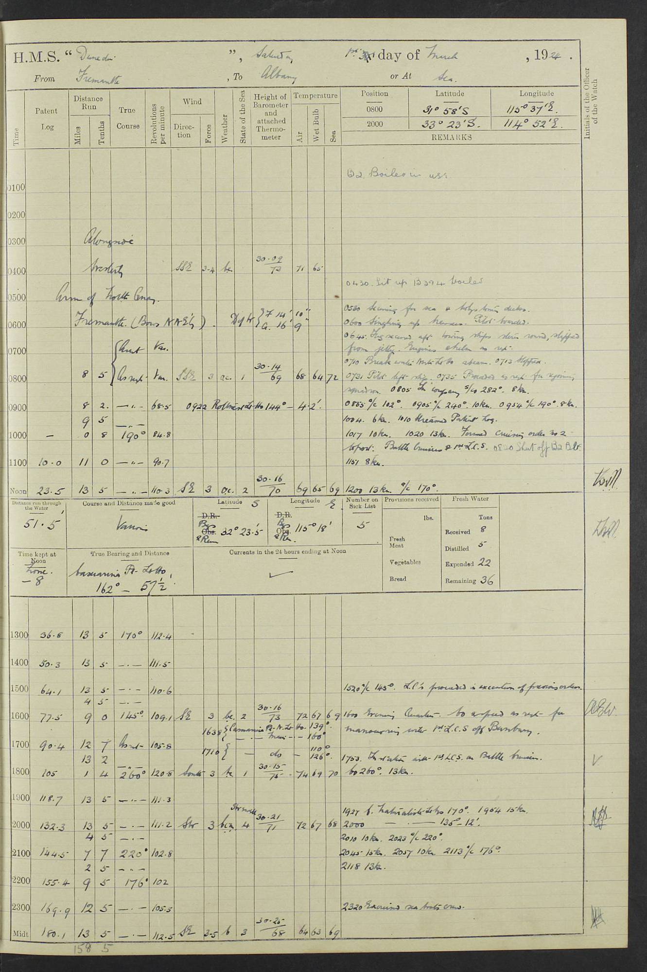 (Maps prepared using Journey Plotter, developed by Maikel. The Plots can only be approximate. They are made by joining-up positions on successive days, and sometimes positions are not given. There will therefore be occasions when the ship appears to have travelled overland) LOG BOOK – 23RD SEPTEMBER 1920 TO 13TH SEPTEMBER 1921 4caf8d9dcadfd3419703bde2: (http://oldweather.s3.amazonaws.com/ADM53-76345/ADM53-76345_0.jpg) Left front cover of Ship’s Log. 4caf8d9dcadfd3419703bde3: (http://oldweather.s3.amazonaws.com/ADM53-76345/ADM53-76345_1.jpg) Right front cover of Ship’s Log. 4caf8d97cadfd3419703bc6a: (http://oldweather.s3.amazonaws.com/ADM53-76345/ADM53-76345-002_0.jpg) 4caf8d97cadfd3419703bc6b: (http://oldweather.s3.amazonaws.com/ADM53-76345/ADM53-76345-002_1.jpg) 4caf8d97cadfd3419703bc6c: (http://oldweather.s3.amazonaws.com/ADM53-76345/ADM53-76345-003_0.jpg) 4caf8d97cadfd3419703bc6d: (http://oldweather.s3.amazonaws.com/ADM53-76345/ADM53-76345-003_1.jpg) 4caf8d97cadfd3419703bc6e: (http://oldweather.s3.amazonaws.com/ADM53-76345/ADM53-76345-004_0.jpg) Blank pages. 4caf8d97cadfd3419703bc6f: (http://oldweather.s3.amazonaws.com/ADM53-76345/ADM53-76345-004_1.jpg) S.- 321. See Articles 557, 619, 622, 924, 1025, 1026 and 1849 of the King’s Regulations, 1913. This Log is to be kept from the time the Ship is Commissioned until she is paid off; when it is to be transmitted as directed by the Admiralty Instructions. The Name and Address of the Officer to whom the acknowledgement of receipt should be sent by the Deputy Cashier in charge, Royal Victoria Yard, Deptford, is to be inserted here. Name: Commander’s Office. Address: H.M.S. Dunedin. c/o G.P.O. London. LOG of H.M.S. “Dunedin” Commanded by Captain C. Wrightson C.B.E. (till 31.3.21). Captain H.S. Monroe D.S.O. (from 31.3.21). FOR THE PERIOD Commencing: Thursday 23rd of September 1920. Ending: Tuesday 13th of September 1921. Tonnage (Displacement): 4,650 Extreme Length: 472ft 3 ins Extreme Breadth: 46 ft 0.3/8” Engines: Manufacturer: Messes R & W Hawthorn Leslie & Co Ltd. Newcastle on Tyne. I.H.P: 40.000 Forced Draught. Description: Turbine (Geared). When Fixed on Board: 1918 – 1919. Boilers: Manufacturer: Messes R & W Hawthorn Leslie & Co Ltd. Newcastle on Tyne. Description: Small tube Improved Yarrow. When made: 1918. When put in vessel: 1918. Paddle Wheels or Screw Propeller: Manufacturer: Manganese Bronze Co. Description: Solid 3 Blades Turbadium Bronze, Pitch 14 ft 3 in. General State of Repair: Satisfactory. R. Alison [?], Lieut Com (W) on paying off 30th August 1923. L. 8418/02. N.L. 15713/13. Where Built Sir W.G. Armstrong Whitworth & Co Ltd. N.L. 18227/18. Armstrong Naval Yard, High Walker, Newcastle on Tyne. Sta. 127/10. Commenced building November 1917, Launched 19 November 1918. N.L. 22782/19. Completed September 1919. 4caf8d98cadfd3419703bc70: (http://oldweather.s3.amazonaws.com/ADM53-76345/ADM53-76345-005_0.jpg) Directions (See King’s Regulations 1913, Articles 1025 and 1849). 1. King’s Regulations. 2. Figures to indicate the Force of the Wind. 3. Letters to denote the State of the Weather. 4. Scale of Fog Intensity. 5. Sea Disturbance Scale 4caf8d98cadfd3419703bc71: (http://oldweather.s3.amazonaws.com/ADM53-76345/ADM53-76345-005_1.jpg) Establishment of Ship’s Company Officers 23 Seamen 187 Boys 36 Marines 46 Engine-room Establishment 105 Other non-executive ratings 44 Total 441 ARMAMENT Position Forecastle: 6” Calibre XII on C.P. XIV mounting. Superstructure: Four 6” Calibre XII on C.P. XIV mountings. Superstructure: Two 3” QF Calibre High Angle mountings, Quarterdeck: 6” Calibre XII on C.P. XIV mountings. Torpedo Armaments Four above water 21” triple tubes. BAROMETER Mercurial or Aneroid: Mercurial. Name of Maker and number: J. Hitchins 101 A747. Height of cistern above sea: 13ft. Error of Mercurial Barometer: Nil at 30.00. Thermometers for Air Temperature. Position on Ship: On fore bridge. Whether in screen: Yes. Maker and No. Negretti & Zambra From: 7.10.19 To: Sept. 1921. Negretti & Zambra No. 10499 Negretti & Zambra No 10391 From: 7.10.19 To: Sept. 1921. Thermometer for Sea Temperature. A. Harper & Sons 7.10.19 POSITION OF STANDARD COMPASS. Manoeuvring Platform. (Fore bridge) BOATS Number of each carried: 1 x 30ft. motor boat. 2 x 32ft. cutters. 1 x 30ft gig. 2 x 27ft whalers. 2 x 16 ft dinghies. MISCELLANEOUS INFORMATION Draught of water with Bunkers full, and complete with provisions, Stores and water: Forward 16 ft 1 inch; Aft 16 ft 11 inches. Number of Tons necessary to increase draught 1 inch: 35.6. Number of Tons of Coal Carried: 16. Number of Tons of Oil Fuel carried: 1127. Quantity of Water Carried (a) For Boilers: 157 tons. (b) For Drinking: 56½ tons. LOGS FOR SEPTEMBER 1920 4caf8d98cadfd3419703bc72: (http://oldweather.s3.amazonaws.com/ADM53-76345/ADM53-76345-006_0.jpg) 23 September 1920 At Copenhagen. Lat 55.694, Long 12.603 4.00am: Signal books correct. am: Hands employed cleaning ship. 8.00am: Signal books correct. am: Sent coaling party to S.S. “Volo”. am: X & Y 6” guns crews at loader drill, remainder of hands employed as requisite. am: Coaling party returned. Noon: Signal books correct. 1.15pm: Sent coaling party to S.S. “Volo”. pm: 1 Rating joined ship from hospital. pm: Boys & training classes under instruction, remainder of hands employed as requisite. 3.00pm: U.S.S. “Gilmer” arrived. [Gilmer, U.S. Destroyer, Flush Decker, launched 18/7/19, Guns: 4 x 5”, 51 cal.,1 x 3”, 23 cal. AA, 12 x 21” TT’s in 4 triple deck mountings. Disp: 1,215 tons, SHP: 26,000 = 35 knots. Jane’s Fighting Ships 1919. Image]. 4.00pm: Signal books correct. pm: Coaling party returned. 8.00pm: Signal books correct. Midnight: Signal books correct. 4caf8d98cadfd3419703bc73: (http://oldweather.s3.amazonaws.com/ADM53-76345/ADM53-76345-006_1.jpg) 24 September 1920 At Copenhagen. Lat 55.694, Long 12.603 4.00am: Signal books correct. am: Hands employed cleaning ship. 6.15am: U.S.S. “Sh