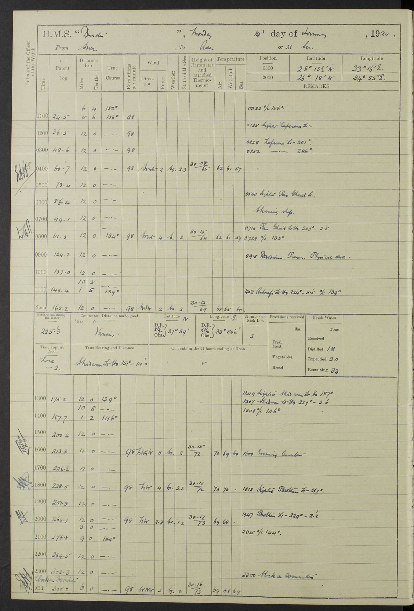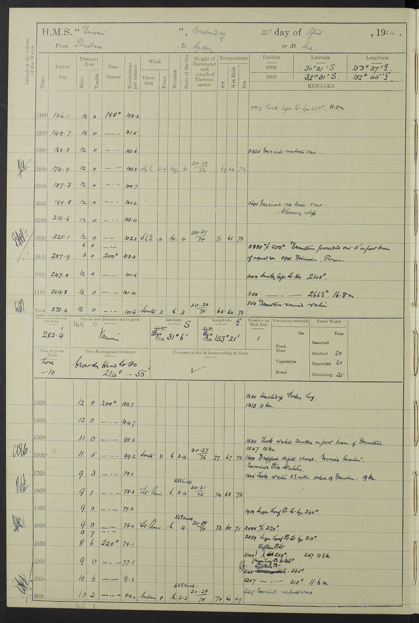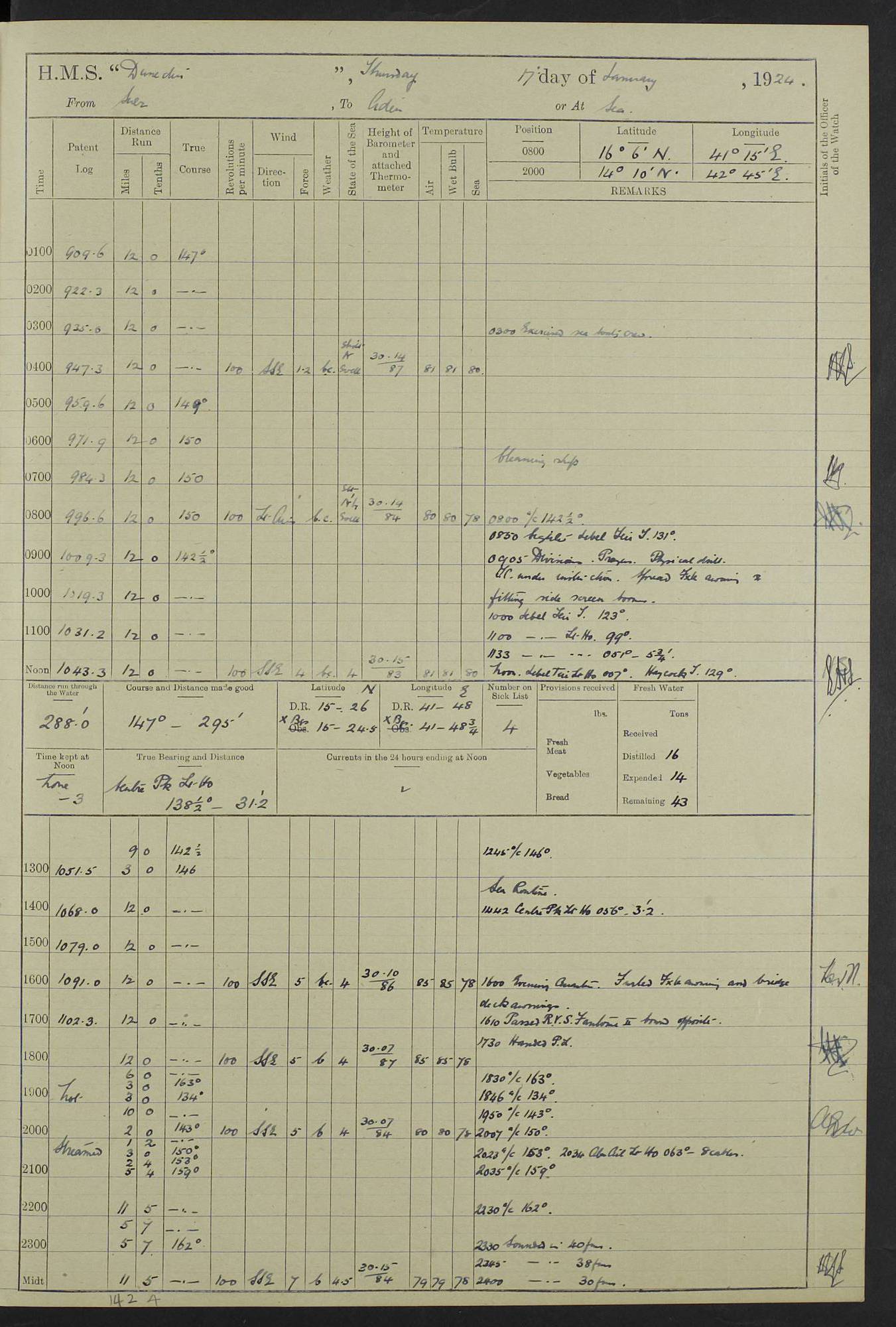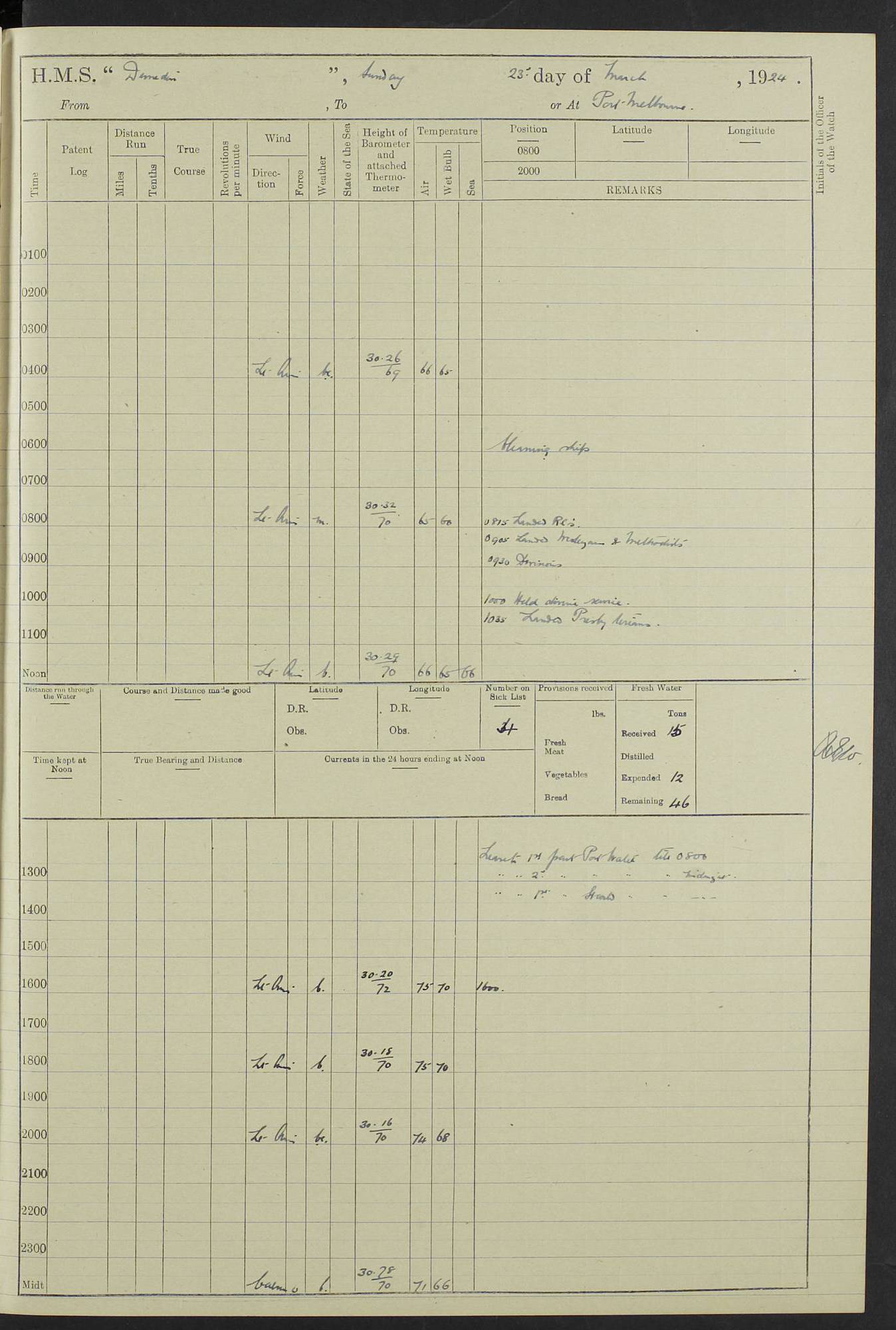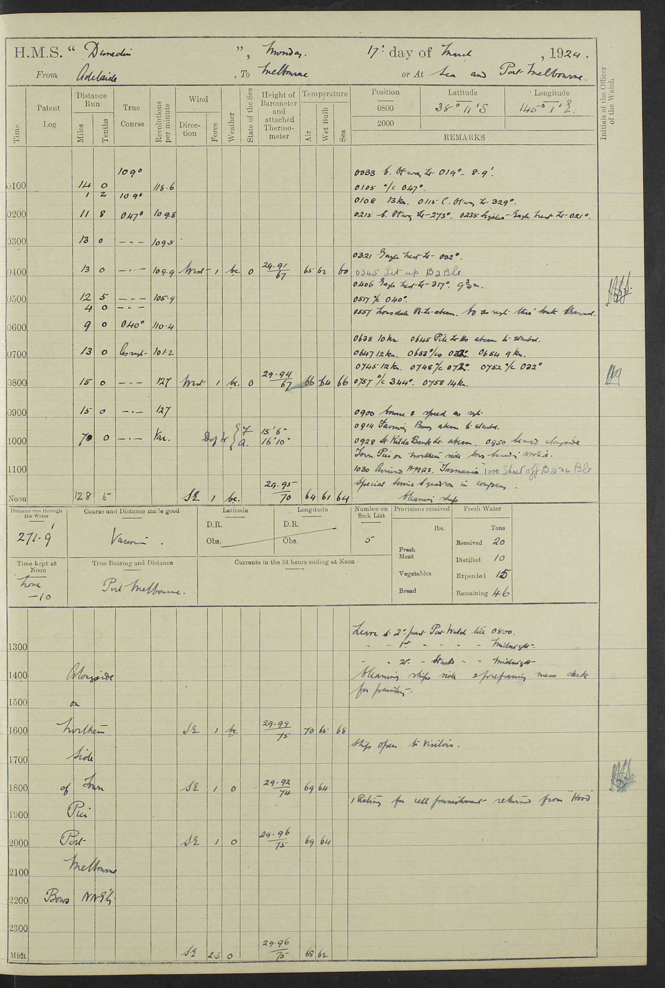 (Maps prepared using Journey Plotter, developed by Maikel. The Plots can only be approximate. They are made by joining-up positions on successive days, and sometimes positions are not given. There will therefore be occasions when the ship appears to have travelled overland) LOG BOOK – 23RD SEPTEMBER 1920 TO 13TH SEPTEMBER 1921 4caf8d9dcadfd3419703bde2: (http://oldweather.s3.amazonaws.com/ADM53-76345/ADM53-76345_0.jpg) Left front cover of Ship’s Log. 4caf8d9dcadfd3419703bde3: (http://oldweather.s3.amazonaws.com/ADM53-76345/ADM53-76345_1.jpg) Right front cover of Ship’s Log. 4caf8d97cadfd3419703bc6a: (http://oldweather.s3.amazonaws.com/ADM53-76345/ADM53-76345-002_0.jpg) 4caf8d97cadfd3419703bc6b: (http://oldweather.s3.amazonaws.com/ADM53-76345/ADM53-76345-002_1.jpg) 4caf8d97cadfd3419703bc6c: (http://oldweather.s3.amazonaws.com/ADM53-76345/ADM53-76345-003_0.jpg) 4caf8d97cadfd3419703bc6d: (http://oldweather.s3.amazonaws.com/ADM53-76345/ADM53-76345-003_1.jpg) 4caf8d97cadfd3419703bc6e: (http://oldweather.s3.amazonaws.com/ADM53-76345/ADM53-76345-004_0.jpg) Blank pages. 4caf8d97cadfd3419703bc6f: (http://oldweather.s3.amazonaws.com/ADM53-76345/ADM53-76345-004_1.jpg) S.- 321. See Articles 557, 619, 622, 924, 1025, 1026 and 1849 of the King’s Regulations, 1913. This Log is to be kept from the time the Ship is Commissioned until she is paid off; when it is to be transmitted as directed by the Admiralty Instructions. The Name and Address of the Officer to whom the acknowledgement of receipt should be sent by the Deputy Cashier in charge, Royal Victoria Yard, Deptford, is to be inserted here. Name: Commander’s Office. Address: H.M.S. Dunedin. c/o G.P.O. London. LOG of H.M.S. “Dunedin” Commanded by Captain C. Wrightson C.B.E. (till 31.3.21). Captain H.S. Monroe D.S.O. (from 31.3.21). FOR THE PERIOD Commencing: Thursday 23rd of September 1920. Ending: Tuesday 13th of September 1921. Tonnage (Displacement): 4,650 Extreme Length: 472ft 3 ins Extreme Breadth: 46 ft 0.3/8” Engines: Manufacturer: Messes R & W Hawthorn Leslie & Co Ltd. Newcastle on Tyne. I.H.P: 40.000 Forced Draught. Description: Turbine (Geared). When Fixed on Board: 1918 – 1919. Boilers: Manufacturer: Messes R & W Hawthorn Leslie & Co Ltd. Newcastle on Tyne. Description: Small tube Improved Yarrow. When made: 1918. When put in vessel: 1918. Paddle Wheels or Screw Propeller: Manufacturer: Manganese Bronze Co. Description: Solid 3 Blades Turbadium Bronze, Pitch 14 ft 3 in. General State of Repair: Satisfactory. R. Alison [?], Lieut Com (W) on paying off 30th August 1923. L. 8418/02. N.L. 15713/13. Where Built Sir W.G. Armstrong Whitworth & Co Ltd. N.L. 18227/18. Armstrong Naval Yard, High Walker, Newcastle on Tyne. Sta. 127/10. Commenced building November 1917, Launched 19 November 1918. N.L. 22782/19. Completed September 1919. 4caf8d98cadfd3419703bc70: (http://oldweather.s3.amazonaws.com/ADM53-76345/ADM53-76345-005_0.jpg) Directions (See King’s Regulations 1913, Articles 1025 and 1849). 1. King’s Regulations. 2. Figures to indicate the Force of the Wind. 3. Letters to denote the State of the Weather. 4. Scale of Fog Intensity. 5. Sea Disturbance Scale 4caf8d98cadfd3419703bc71: (http://oldweather.s3.amazonaws.com/ADM53-76345/ADM53-76345-005_1.jpg) Establishment of Ship’s Company Officers 23 Seamen 187 Boys 36 Marines 46 Engine-room Establishment 105 Other non-executive ratings 44 Total 441 ARMAMENT Position Forecastle: 6” Calibre XII on C.P. XIV mounting. Superstructure: Four 6” Calibre XII on C.P. XIV mountings. Superstructure: Two 3” QF Calibre High Angle mountings, Quarterdeck: 6” Calibre XII on C.P. XIV mountings. Torpedo Armaments Four above water 21” triple tubes. BAROMETER Mercurial or Aneroid: Mercurial. Name of Maker and number: J. Hitchins 101 A747. Height of cistern above sea: 13ft. Error of Mercurial Barometer: Nil at 30.00. Thermometers for Air Temperature. Position on Ship: On fore bridge. Whether in screen: Yes. Maker and No. Negretti & Zambra From: 7.10.19 To: Sept. 1921. Negretti & Zambra No. 10499 Negretti & Zambra No 10391 From: 7.10.19 To: Sept. 1921. Thermometer for Sea Temperature. A. Harper & Sons 7.10.19 POSITION OF STANDARD COMPASS. Manoeuvring Platform. (Fore bridge) BOATS Number of each carried: 1 x 30ft. motor boat. 2 x 32ft. cutters. 1 x 30ft gig. 2 x 27ft whalers. 2 x 16 ft dinghies. MISCELLANEOUS INFORMATION Draught of water with Bunkers full, and complete with provisions, Stores and water: Forward 16 ft 1 inch; Aft 16 ft 11 inches. Number of Tons necessary to increase draught 1 inch: 35.6. Number of Tons of Coal Carried: 16. Number of Tons of Oil Fuel carried: 1127. Quantity of Water Carried (a) For Boilers: 157 tons. (b) For Drinking: 56½ tons. LOGS FOR SEPTEMBER 1920 4caf8d98cadfd3419703bc72: (http://oldweather.s3.amazonaws.com/ADM53-76345/ADM53-76345-006_0.jpg) 23 September 1920 At Copenhagen. Lat 55.694, Long 12.603 4.00am: Signal books correct. am: Hands employed cleaning ship. 8.00am: Signal books correct. am: Sent coaling party to S.S. “Volo”. am: X & Y 6” guns crews at loader drill, remainder of hands employed as requisite. am: Coaling party returned. Noon: Signal books correct. 1.15pm: Sent coaling party to S.S. “Volo”. pm: 1 Rating joined ship from hospital. pm: Boys & training classes under instruction, remainder of hands employed as requisite. 3.00pm: U.S.S. “Gilmer” arrived. [Gilmer, U.S. Destroyer, Flush Decker, launched 18/7/19, Guns: 4 x 5”, 51 cal.,1 x 3”, 23 cal. AA, 12 x 21” TT’s in 4 triple deck mountings. Disp: 1,215 tons, SHP: 26,000 = 35 knots. Jane’s Fighting Ships 1919. Image]. 4.00pm: Signal books correct. pm: Coaling party returned. 8.00pm: Signal books correct. Midnight: Signal books correct. 4caf8d98cadfd3419703bc73: (http://oldweather.s3.amazonaws.com/ADM53-76345/ADM53-76345-006_1.jpg) 24 September 1920 At Copenhagen. Lat 55.694, Long 12.603 4.00am: Signal books correct. am: Hands employed cleaning ship. 6.15am: U.S.S. “Sh