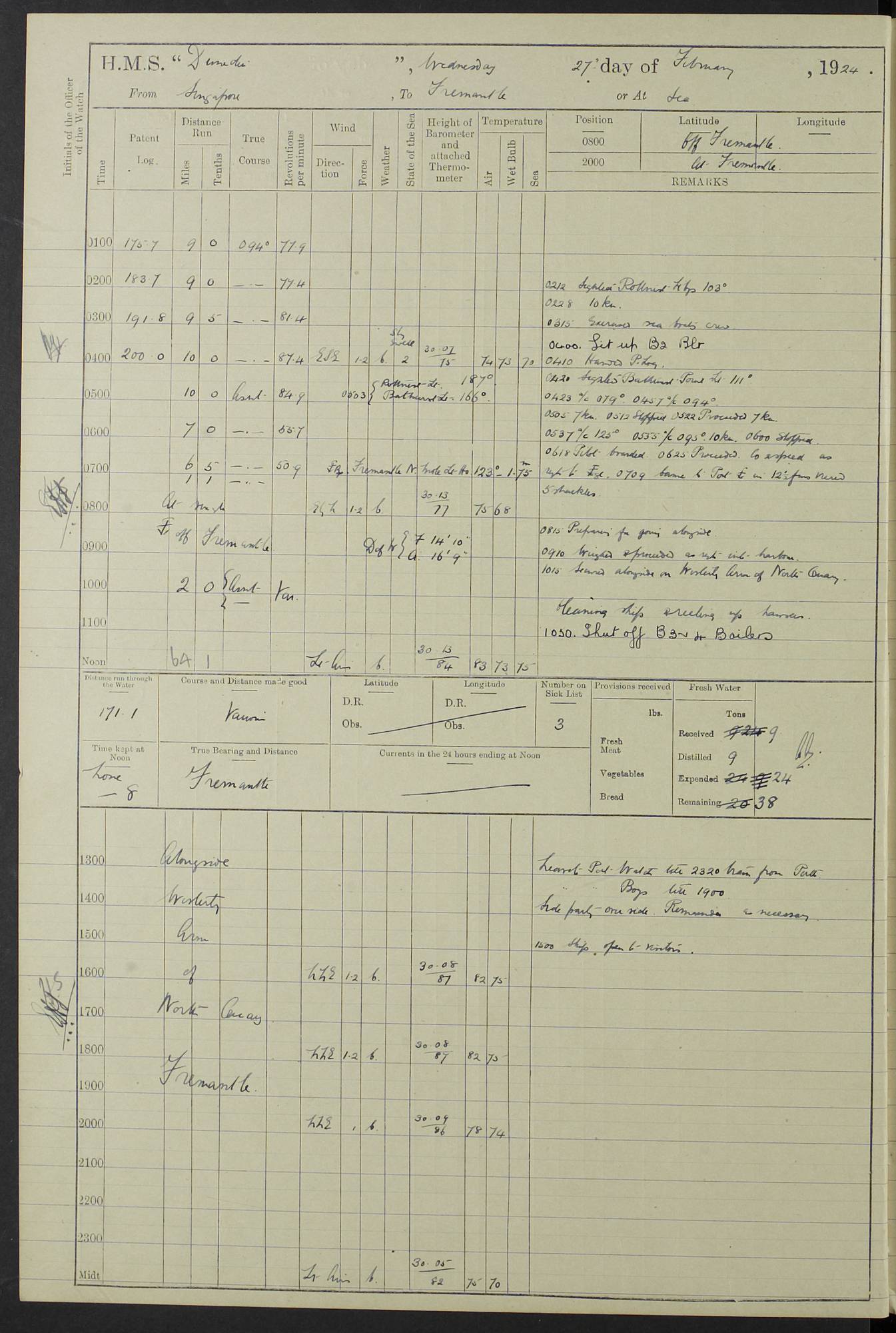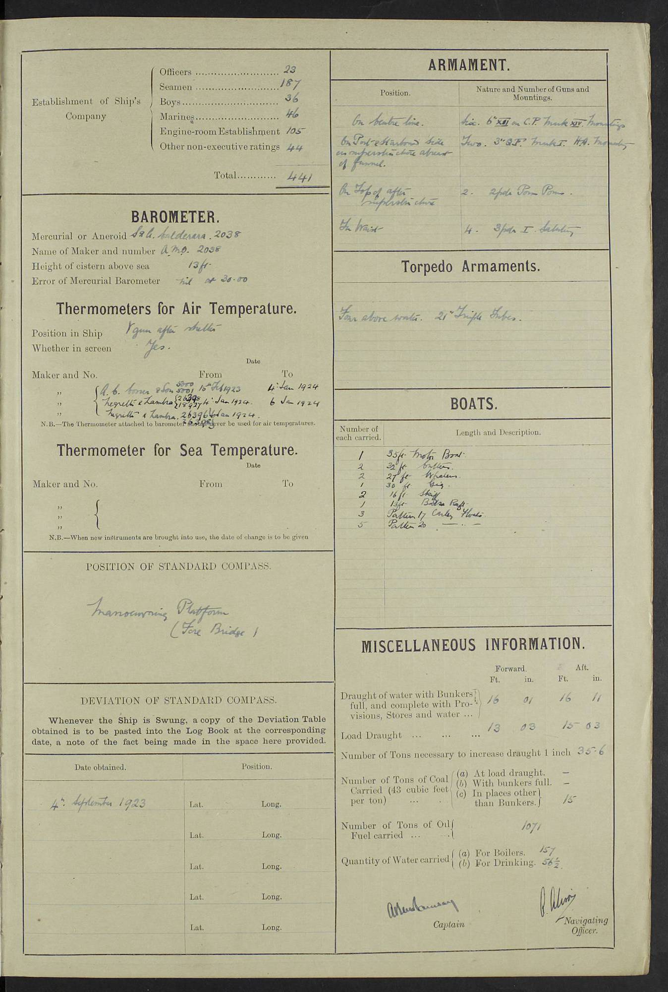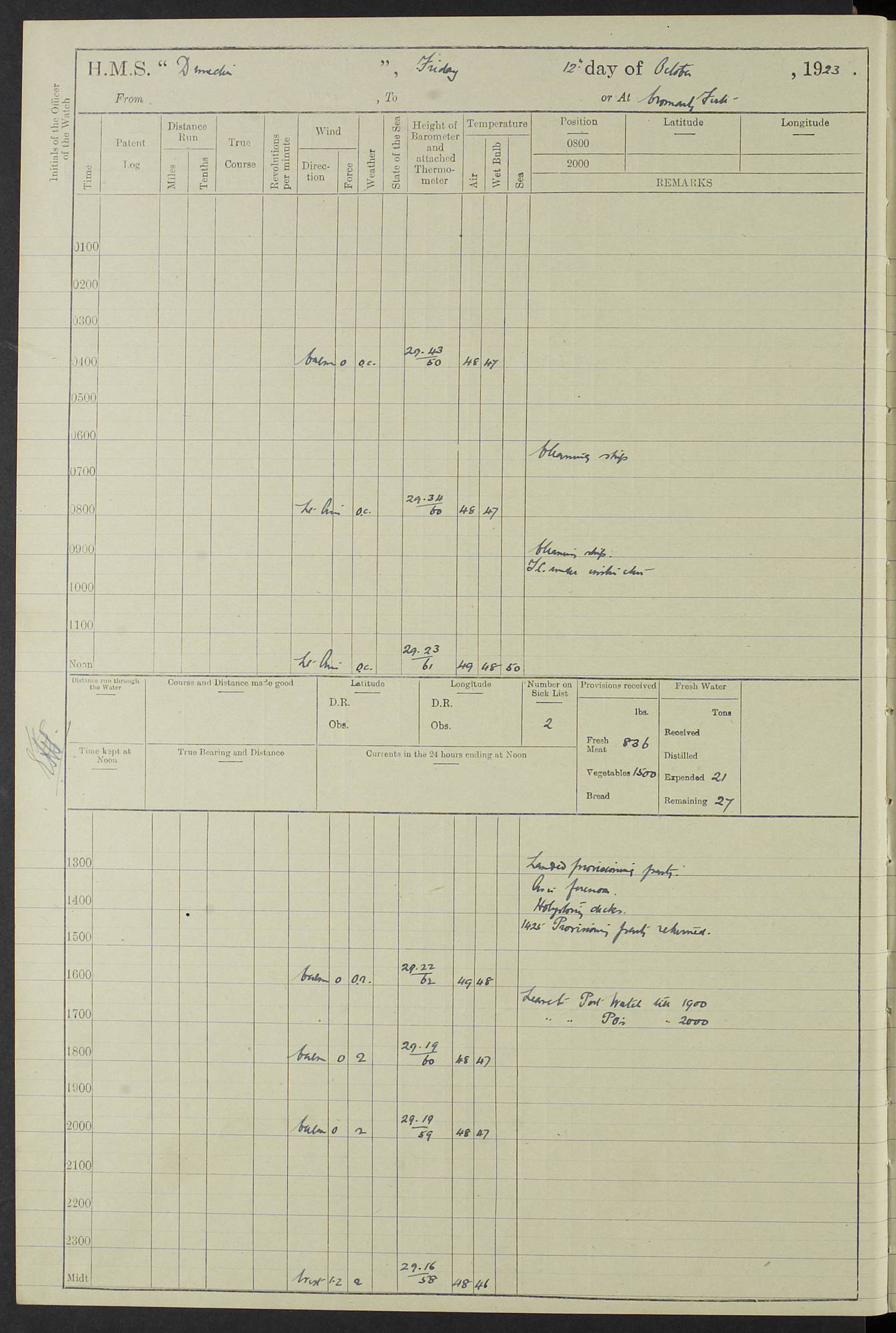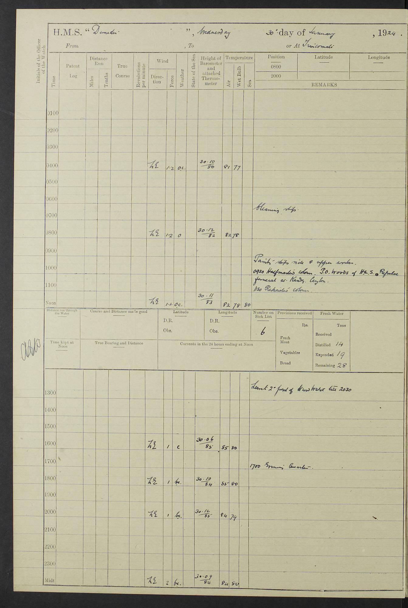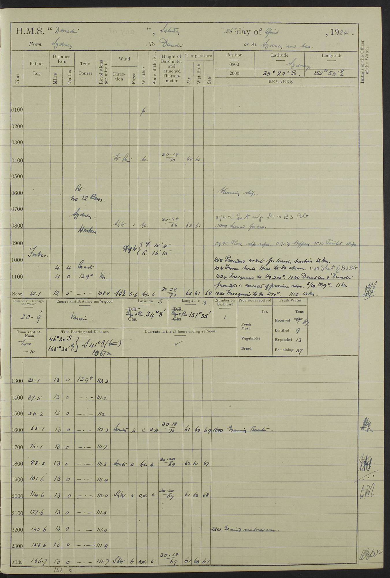 (Maps prepared using Journey Plotter, developed by Maikel. The Plots can only be approximate. They are made by joining-up positions on successive days, and sometimes positions are not given. There will therefore be occasions when the ship appears to have travelled overland) LOG BOOK – 23RD SEPTEMBER 1920 TO 13TH SEPTEMBER 1921 4caf8d9dcadfd3419703bde2: (http://oldweather.s3.amazonaws.com/ADM53-76345/ADM53-76345_0.jpg) Left front cover of Ship’s Log. 4caf8d9dcadfd3419703bde3: (http://oldweather.s3.amazonaws.com/ADM53-76345/ADM53-76345_1.jpg) Right front cover of Ship’s Log. 4caf8d97cadfd3419703bc6a: (http://oldweather.s3.amazonaws.com/ADM53-76345/ADM53-76345-002_0.jpg) 4caf8d97cadfd3419703bc6b: (http://oldweather.s3.amazonaws.com/ADM53-76345/ADM53-76345-002_1.jpg) 4caf8d97cadfd3419703bc6c: (http://oldweather.s3.amazonaws.com/ADM53-76345/ADM53-76345-003_0.jpg) 4caf8d97cadfd3419703bc6d: (http://oldweather.s3.amazonaws.com/ADM53-76345/ADM53-76345-003_1.jpg) 4caf8d97cadfd3419703bc6e: (http://oldweather.s3.amazonaws.com/ADM53-76345/ADM53-76345-004_0.jpg) Blank pages. 4caf8d97cadfd3419703bc6f: (http://oldweather.s3.amazonaws.com/ADM53-76345/ADM53-76345-004_1.jpg) S.- 321. See Articles 557, 619, 622, 924, 1025, 1026 and 1849 of the King’s Regulations, 1913. This Log is to be kept from the time the Ship is Commissioned until she is paid off; when it is to be transmitted as directed by the Admiralty Instructions. The Name and Address of the Officer to whom the acknowledgement of receipt should be sent by the Deputy Cashier in charge, Royal Victoria Yard, Deptford, is to be inserted here. Name: Commander’s Office. Address: H.M.S. Dunedin. c/o G.P.O. London. LOG of H.M.S. “Dunedin” Commanded by Captain C. Wrightson C.B.E. (till 31.3.21). Captain H.S. Monroe D.S.O. (from 31.3.21). FOR THE PERIOD Commencing: Thursday 23rd of September 1920. Ending: Tuesday 13th of September 1921. Tonnage (Displacement): 4,650 Extreme Length: 472ft 3 ins Extreme Breadth: 46 ft 0.3/8” Engines: Manufacturer: Messes R & W Hawthorn Leslie & Co Ltd. Newcastle on Tyne. I.H.P: 40.000 Forced Draught. Description: Turbine (Geared). When Fixed on Board: 1918 – 1919. Boilers: Manufacturer: Messes R & W Hawthorn Leslie & Co Ltd. Newcastle on Tyne. Description: Small tube Improved Yarrow. When made: 1918. When put in vessel: 1918. Paddle Wheels or Screw Propeller: Manufacturer: Manganese Bronze Co. Description: Solid 3 Blades Turbadium Bronze, Pitch 14 ft 3 in. General State of Repair: Satisfactory. R. Alison [?], Lieut Com (W) on paying off 30th August 1923. L. 8418/02. N.L. 15713/13. Where Built Sir W.G. Armstrong Whitworth & Co Ltd. N.L. 18227/18. Armstrong Naval Yard, High Walker, Newcastle on Tyne. Sta. 127/10. Commenced building November 1917, Launched 19 November 1918. N.L. 22782/19. Completed September 1919. 4caf8d98cadfd3419703bc70: (http://oldweather.s3.amazonaws.com/ADM53-76345/ADM53-76345-005_0.jpg) Directions (See King’s Regulations 1913, Articles 1025 and 1849). 1. King’s Regulations. 2. Figures to indicate the Force of the Wind. 3. Letters to denote the State of the Weather. 4. Scale of Fog Intensity. 5. Sea Disturbance Scale 4caf8d98cadfd3419703bc71: (http://oldweather.s3.amazonaws.com/ADM53-76345/ADM53-76345-005_1.jpg) Establishment of Ship’s Company Officers 23 Seamen 187 Boys 36 Marines 46 Engine-room Establishment 105 Other non-executive ratings 44 Total 441 ARMAMENT Position Forecastle: 6” Calibre XII on C.P. XIV mounting. Superstructure: Four 6” Calibre XII on C.P. XIV mountings. Superstructure: Two 3” QF Calibre High Angle mountings, Quarterdeck: 6” Calibre XII on C.P. XIV mountings. Torpedo Armaments Four above water 21” triple tubes. BAROMETER Mercurial or Aneroid: Mercurial. Name of Maker and number: J. Hitchins 101 A747. Height of cistern above sea: 13ft. Error of Mercurial Barometer: Nil at 30.00. Thermometers for Air Temperature. Position on Ship: On fore bridge. Whether in screen: Yes. Maker and No. Negretti & Zambra From: 7.10.19 To: Sept. 1921. Negretti & Zambra No. 10499 Negretti & Zambra No 10391 From: 7.10.19 To: Sept. 1921. Thermometer for Sea Temperature. A. Harper & Sons 7.10.19 POSITION OF STANDARD COMPASS. Manoeuvring Platform. (Fore bridge) BOATS Number of each carried: 1 x 30ft. motor boat. 2 x 32ft. cutters. 1 x 30ft gig. 2 x 27ft whalers. 2 x 16 ft dinghies. MISCELLANEOUS INFORMATION Draught of water with Bunkers full, and complete with provisions, Stores and water: Forward 16 ft 1 inch; Aft 16 ft 11 inches. Number of Tons necessary to increase draught 1 inch: 35.6. Number of Tons of Coal Carried: 16. Number of Tons of Oil Fuel carried: 1127. Quantity of Water Carried (a) For Boilers: 157 tons. (b) For Drinking: 56½ tons. LOGS FOR SEPTEMBER 1920 4caf8d98cadfd3419703bc72: (http://oldweather.s3.amazonaws.com/ADM53-76345/ADM53-76345-006_0.jpg) 23 September 1920 At Copenhagen. Lat 55.694, Long 12.603 4.00am: Signal books correct. am: Hands employed cleaning ship. 8.00am: Signal books correct. am: Sent coaling party to S.S. “Volo”. am: X & Y 6” guns crews at loader drill, remainder of hands employed as requisite. am: Coaling party returned. Noon: Signal books correct. 1.15pm: Sent coaling party to S.S. “Volo”. pm: 1 Rating joined ship from hospital. pm: Boys & training classes under instruction, remainder of hands employed as requisite. 3.00pm: U.S.S. “Gilmer” arrived. [Gilmer, U.S. Destroyer, Flush Decker, launched 18/7/19, Guns: 4 x 5”, 51 cal.,1 x 3”, 23 cal. AA, 12 x 21” TT’s in 4 triple deck mountings. Disp: 1,215 tons, SHP: 26,000 = 35 knots. Jane’s Fighting Ships 1919. Image]. 4.00pm: Signal books correct. pm: Coaling party returned. 8.00pm: Signal books correct. Midnight: Signal books correct. 4caf8d98cadfd3419703bc73: (http://oldweather.s3.amazonaws.com/ADM53-76345/ADM53-76345-006_1.jpg) 24 September 1920 At Copenhagen. Lat 55.694, Long 12.603 4.00am: Signal books correct. am: Hands employed cleaning ship. 6.15am: U.S.S. “Sh