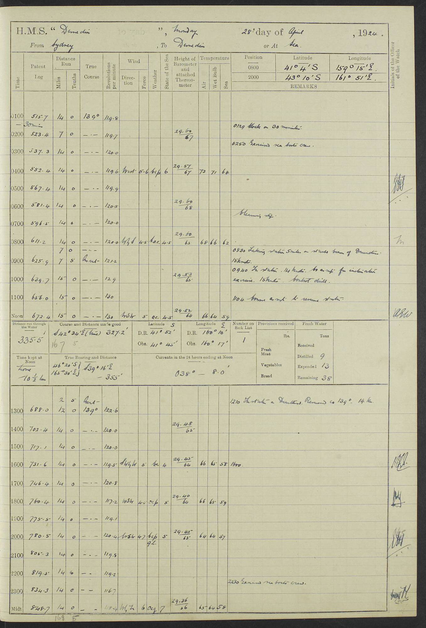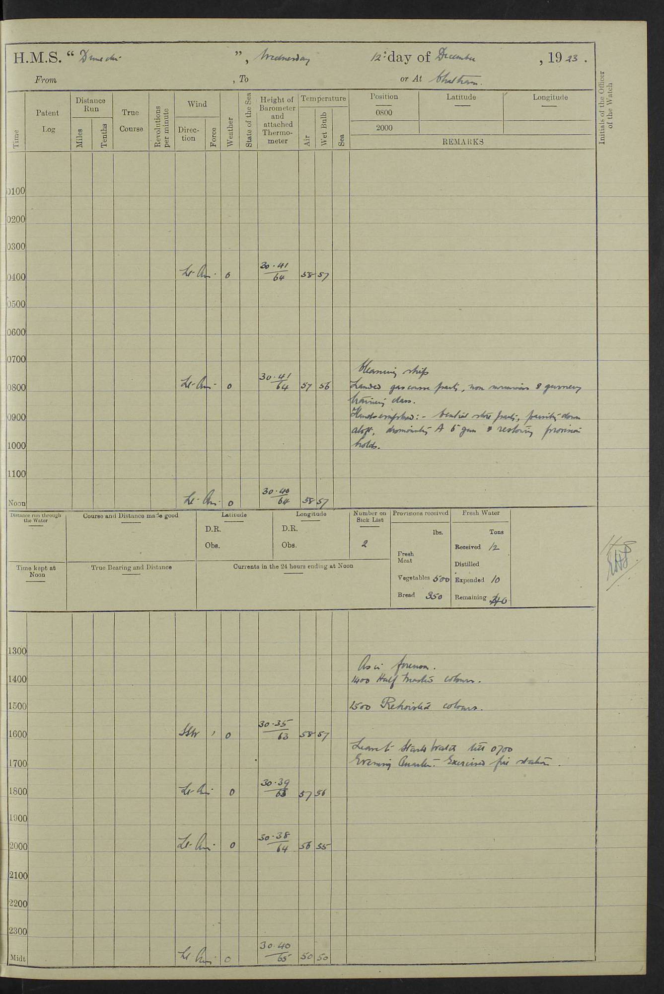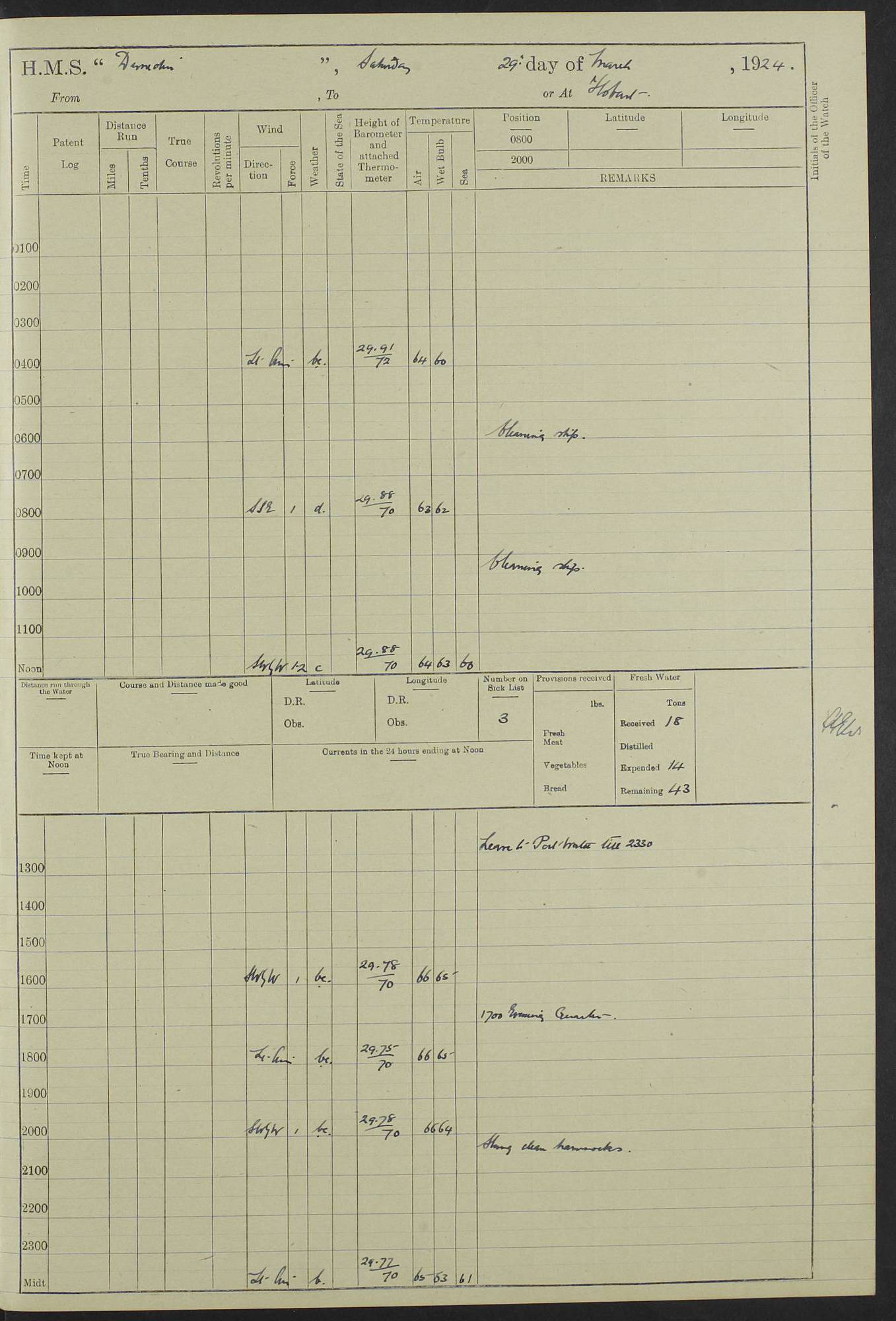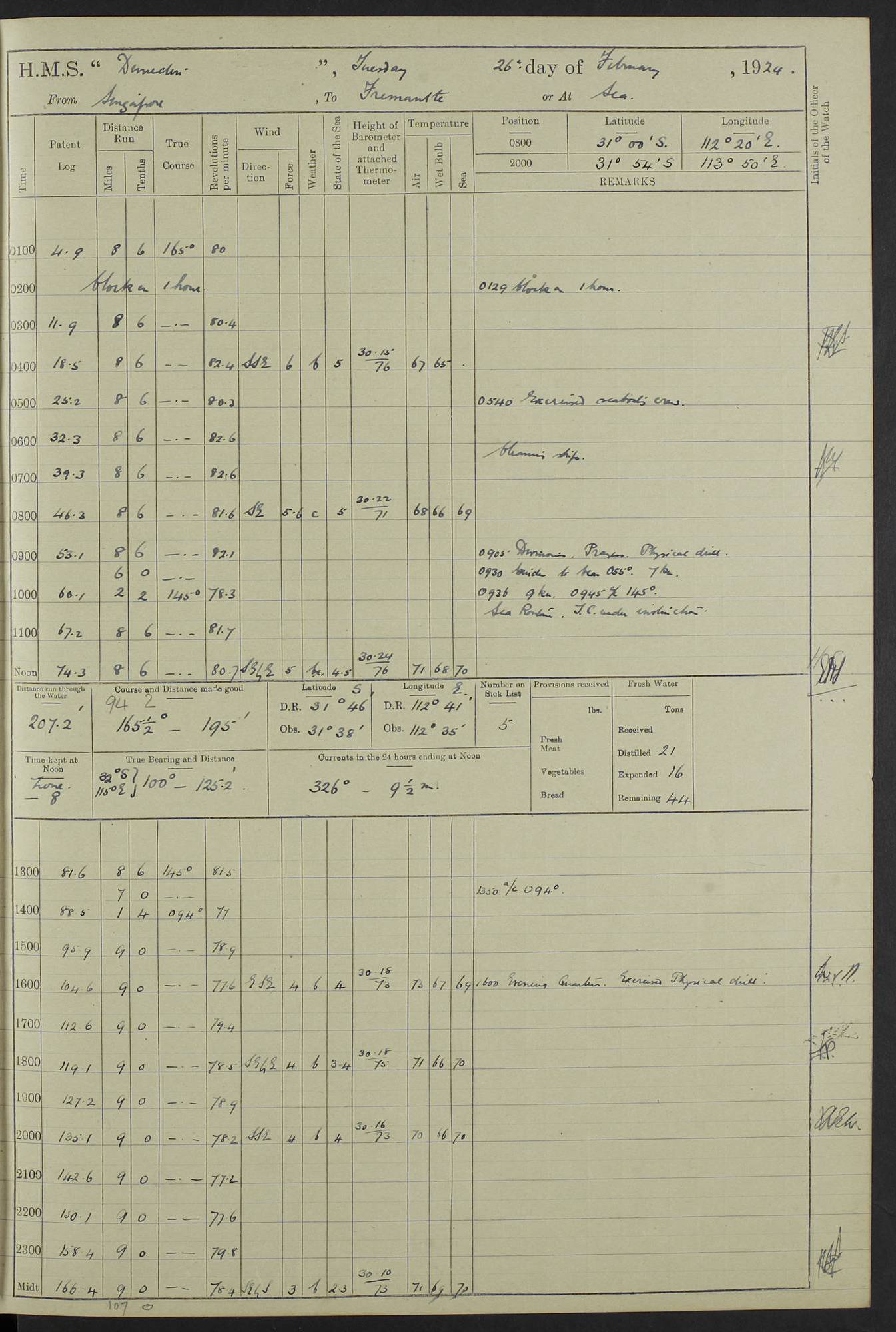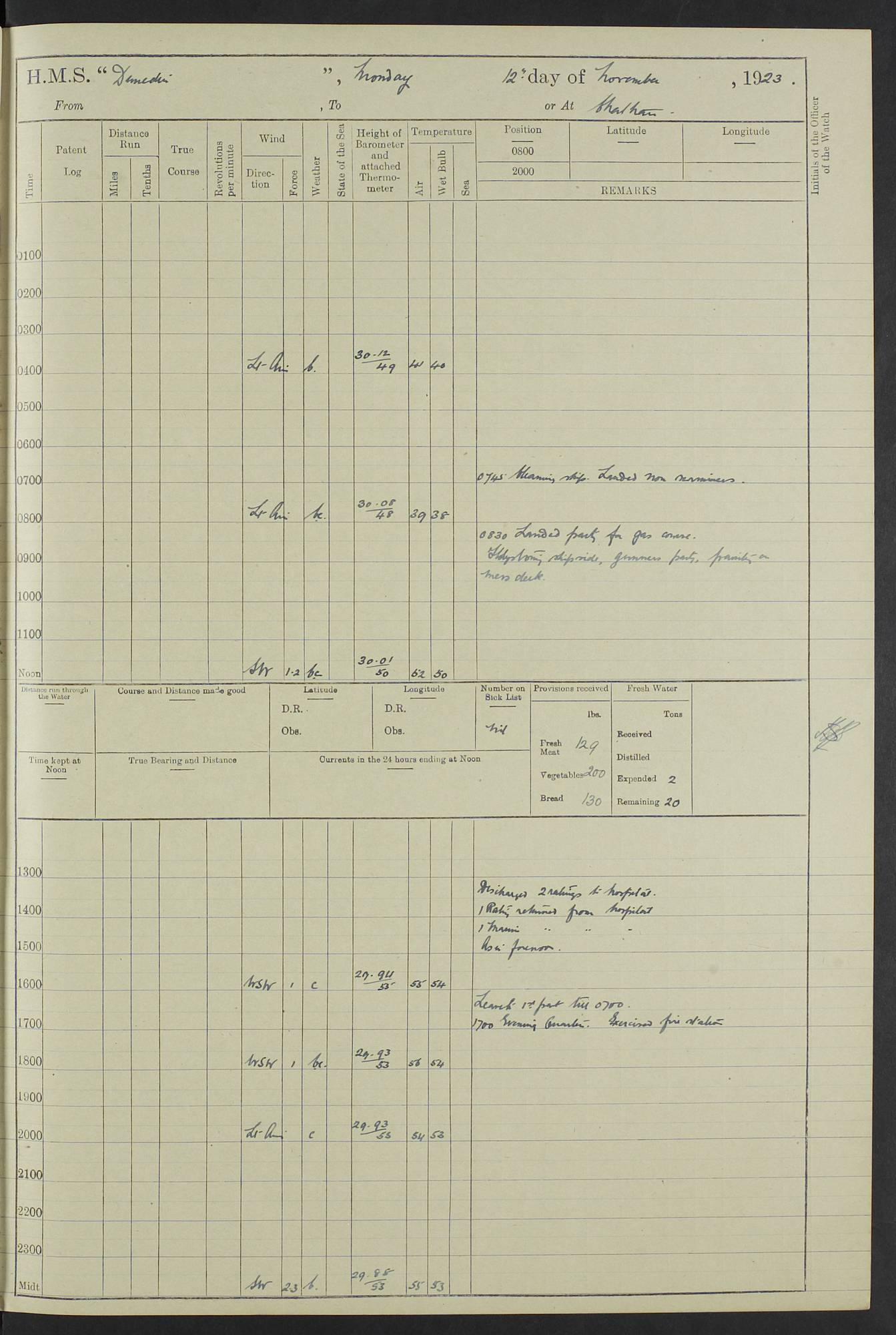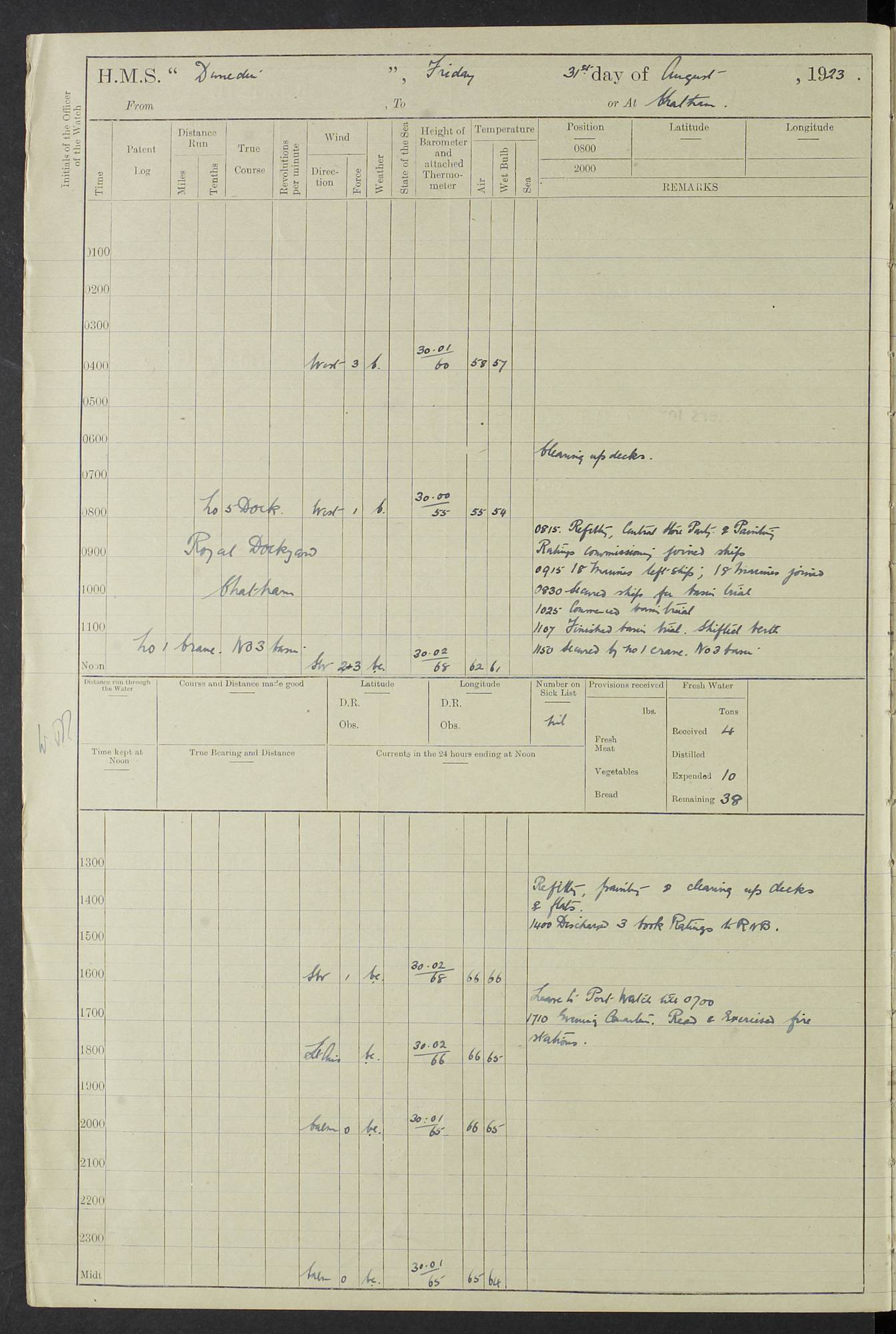 (Maps prepared using Journey Plotter, developed by Maikel. The Plots can only be approximate. They are made by joining-up positions on successive days, and sometimes positions are not given. There will therefore be occasions when the ship appears to have travelled overland) LOG BOOK – 23RD SEPTEMBER 1920 TO 13TH SEPTEMBER 1921 4caf8d9dcadfd3419703bde2: (http://oldweather.s3.amazonaws.com/ADM53-76345/ADM53-76345_0.jpg) Left front cover of Ship’s Log. 4caf8d9dcadfd3419703bde3: (http://oldweather.s3.amazonaws.com/ADM53-76345/ADM53-76345_1.jpg) Right front cover of Ship’s Log. 4caf8d97cadfd3419703bc6a: (http://oldweather.s3.amazonaws.com/ADM53-76345/ADM53-76345-002_0.jpg) 4caf8d97cadfd3419703bc6b: (http://oldweather.s3.amazonaws.com/ADM53-76345/ADM53-76345-002_1.jpg) 4caf8d97cadfd3419703bc6c: (http://oldweather.s3.amazonaws.com/ADM53-76345/ADM53-76345-003_0.jpg) 4caf8d97cadfd3419703bc6d: (http://oldweather.s3.amazonaws.com/ADM53-76345/ADM53-76345-003_1.jpg) 4caf8d97cadfd3419703bc6e: (http://oldweather.s3.amazonaws.com/ADM53-76345/ADM53-76345-004_0.jpg) Blank pages. 4caf8d97cadfd3419703bc6f: (http://oldweather.s3.amazonaws.com/ADM53-76345/ADM53-76345-004_1.jpg) S.- 321. See Articles 557, 619, 622, 924, 1025, 1026 and 1849 of the King’s Regulations, 1913. This Log is to be kept from the time the Ship is Commissioned until she is paid off; when it is to be transmitted as directed by the Admiralty Instructions. The Name and Address of the Officer to whom the acknowledgement of receipt should be sent by the Deputy Cashier in charge, Royal Victoria Yard, Deptford, is to be inserted here. Name: Commander’s Office. Address: H.M.S. Dunedin. c/o G.P.O. London. LOG of H.M.S. “Dunedin” Commanded by Captain C. Wrightson C.B.E. (till 31.3.21). Captain H.S. Monroe D.S.O. (from 31.3.21). FOR THE PERIOD Commencing: Thursday 23rd of September 1920. Ending: Tuesday 13th of September 1921. Tonnage (Displacement): 4,650 Extreme Length: 472ft 3 ins Extreme Breadth: 46 ft 0.3/8” Engines: Manufacturer: Messes R & W Hawthorn Leslie & Co Ltd. Newcastle on Tyne. I.H.P: 40.000 Forced Draught. Description: Turbine (Geared). When Fixed on Board: 1918 – 1919. Boilers: Manufacturer: Messes R & W Hawthorn Leslie & Co Ltd. Newcastle on Tyne. Description: Small tube Improved Yarrow. When made: 1918. When put in vessel: 1918. Paddle Wheels or Screw Propeller: Manufacturer: Manganese Bronze Co. Description: Solid 3 Blades Turbadium Bronze, Pitch 14 ft 3 in. General State of Repair: Satisfactory. R. Alison [?], Lieut Com (W) on paying off 30th August 1923. L. 8418/02. N.L. 15713/13. Where Built Sir W.G. Armstrong Whitworth & Co Ltd. N.L. 18227/18. Armstrong Naval Yard, High Walker, Newcastle on Tyne. Sta. 127/10. Commenced building November 1917, Launched 19 November 1918. N.L. 22782/19. Completed September 1919. 4caf8d98cadfd3419703bc70: (http://oldweather.s3.amazonaws.com/ADM53-76345/ADM53-76345-005_0.jpg) Directions (See King’s Regulations 1913, Articles 1025 and 1849). 1. King’s Regulations. 2. Figures to indicate the Force of the Wind. 3. Letters to denote the State of the Weather. 4. Scale of Fog Intensity. 5. Sea Disturbance Scale 4caf8d98cadfd3419703bc71: (http://oldweather.s3.amazonaws.com/ADM53-76345/ADM53-76345-005_1.jpg) Establishment of Ship’s Company Officers 23 Seamen 187 Boys 36 Marines 46 Engine-room Establishment 105 Other non-executive ratings 44 Total 441 ARMAMENT Position Forecastle: 6” Calibre XII on C.P. XIV mounting. Superstructure: Four 6” Calibre XII on C.P. XIV mountings. Superstructure: Two 3” QF Calibre High Angle mountings, Quarterdeck: 6” Calibre XII on C.P. XIV mountings. Torpedo Armaments Four above water 21” triple tubes. BAROMETER Mercurial or Aneroid: Mercurial. Name of Maker and number: J. Hitchins 101 A747. Height of cistern above sea: 13ft. Error of Mercurial Barometer: Nil at 30.00. Thermometers for Air Temperature. Position on Ship: On fore bridge. Whether in screen: Yes. Maker and No. Negretti & Zambra From: 7.10.19 To: Sept. 1921. Negretti & Zambra No. 10499 Negretti & Zambra No 10391 From: 7.10.19 To: Sept. 1921. Thermometer for Sea Temperature. A. Harper & Sons 7.10.19 POSITION OF STANDARD COMPASS. Manoeuvring Platform. (Fore bridge) BOATS Number of each carried: 1 x 30ft. motor boat. 2 x 32ft. cutters. 1 x 30ft gig. 2 x 27ft whalers. 2 x 16 ft dinghies. MISCELLANEOUS INFORMATION Draught of water with Bunkers full, and complete with provisions, Stores and water: Forward 16 ft 1 inch; Aft 16 ft 11 inches. Number of Tons necessary to increase draught 1 inch: 35.6. Number of Tons of Coal Carried: 16. Number of Tons of Oil Fuel carried: 1127. Quantity of Water Carried (a) For Boilers: 157 tons. (b) For Drinking: 56½ tons. LOGS FOR SEPTEMBER 1920 4caf8d98cadfd3419703bc72: (http://oldweather.s3.amazonaws.com/ADM53-76345/ADM53-76345-006_0.jpg) 23 September 1920 At Copenhagen. Lat 55.694, Long 12.603 4.00am: Signal books correct. am: Hands employed cleaning ship. 8.00am: Signal books correct. am: Sent coaling party to S.S. “Volo”. am: X & Y 6” guns crews at loader drill, remainder of hands employed as requisite. am: Coaling party returned. Noon: Signal books correct. 1.15pm: Sent coaling party to S.S. “Volo”. pm: 1 Rating joined ship from hospital. pm: Boys & training classes under instruction, remainder of hands employed as requisite. 3.00pm: U.S.S. “Gilmer” arrived. [Gilmer, U.S. Destroyer, Flush Decker, launched 18/7/19, Guns: 4 x 5”, 51 cal.,1 x 3”, 23 cal. AA, 12 x 21” TT’s in 4 triple deck mountings. Disp: 1,215 tons, SHP: 26,000 = 35 knots. Jane’s Fighting Ships 1919. Image]. 4.00pm: Signal books correct. pm: Coaling party returned. 8.00pm: Signal books correct. Midnight: Signal books correct. 4caf8d98cadfd3419703bc73: (http://oldweather.s3.amazonaws.com/ADM53-76345/ADM53-76345-006_1.jpg) 24 September 1920 At Copenhagen. Lat 55.694, Long 12.603 4.00am: Signal books correct. am: Hands employed cleaning ship. 6.15am: U.S.S. “Sh