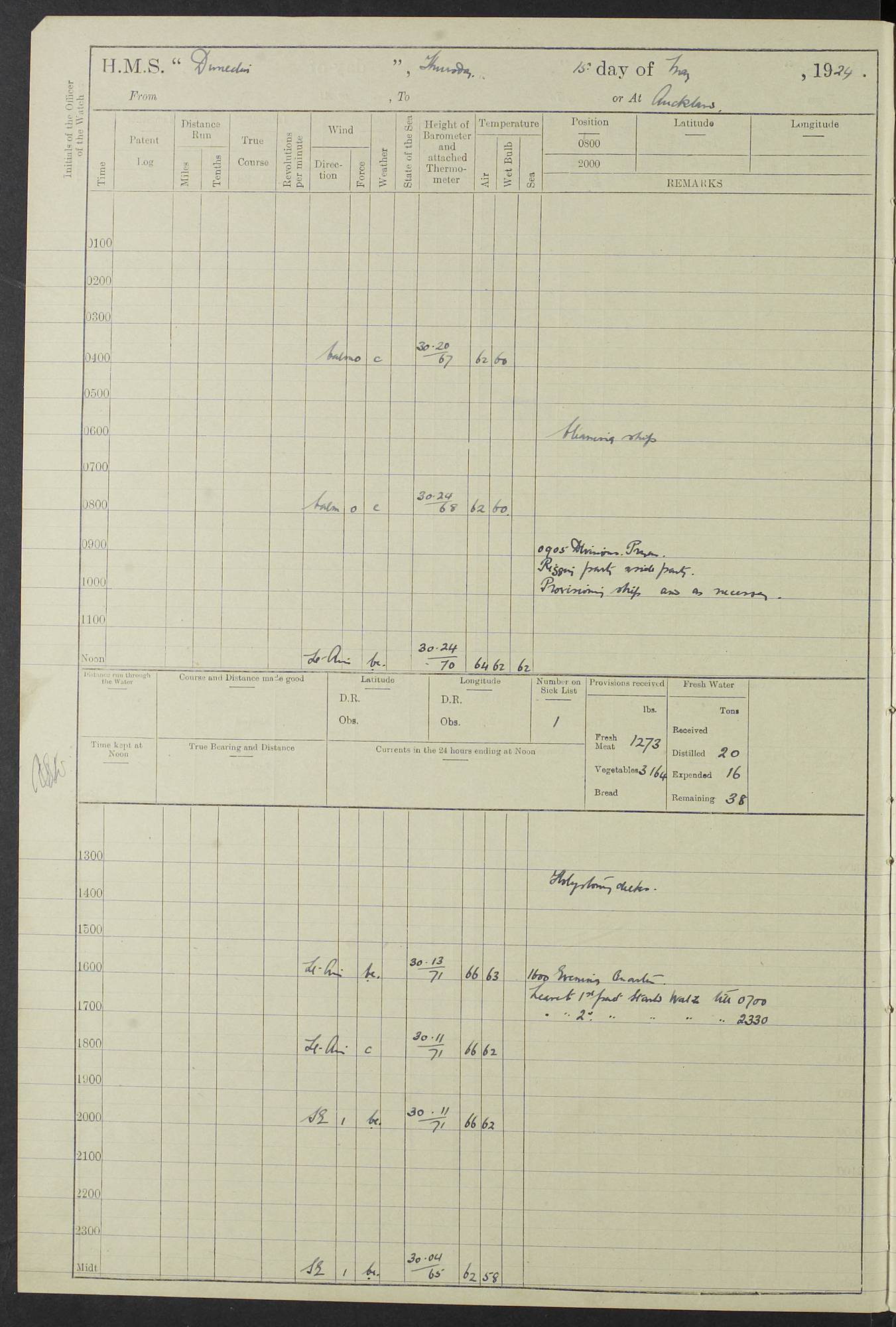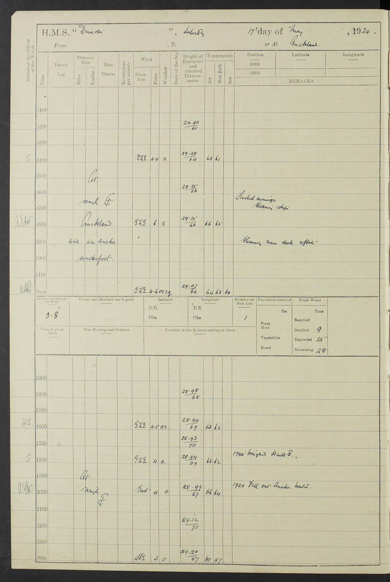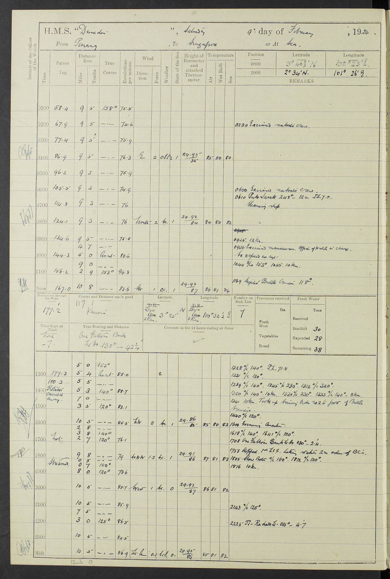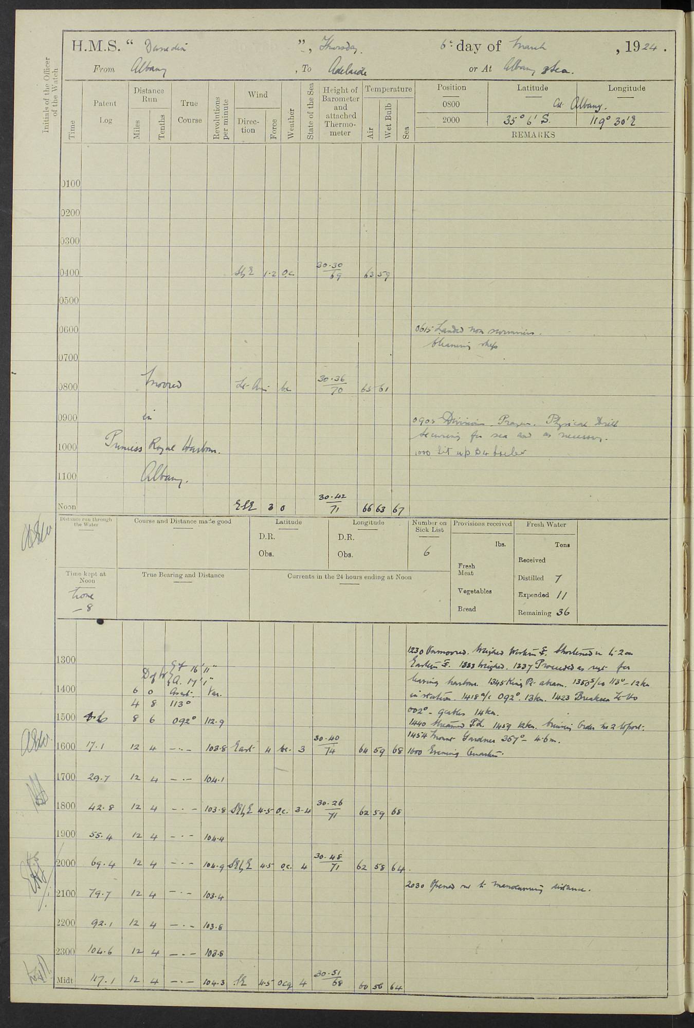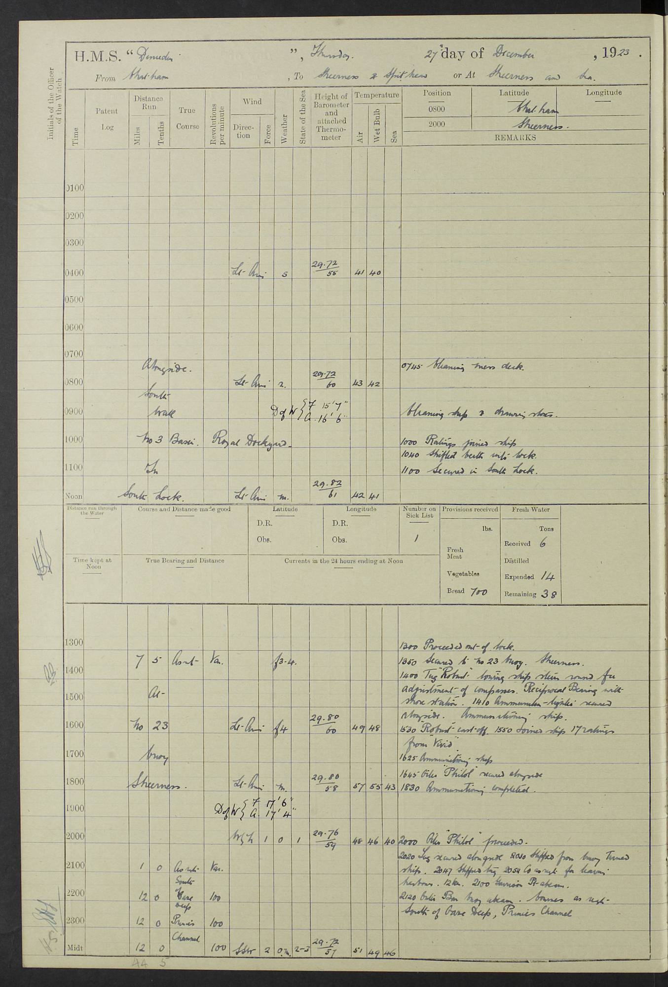 (Maps prepared using Journey Plotter, developed by Maikel. The Plots can only be approximate. They are made by joining-up positions on successive days, and sometimes positions are not given. There will therefore be occasions when the ship appears to have travelled overland) LOG BOOK – 23RD SEPTEMBER 1920 TO 13TH SEPTEMBER 1921 4caf8d9dcadfd3419703bde2: (http://oldweather.s3.amazonaws.com/ADM53-76345/ADM53-76345_0.jpg) Left front cover of Ship’s Log. 4caf8d9dcadfd3419703bde3: (http://oldweather.s3.amazonaws.com/ADM53-76345/ADM53-76345_1.jpg) Right front cover of Ship’s Log. 4caf8d97cadfd3419703bc6a: (http://oldweather.s3.amazonaws.com/ADM53-76345/ADM53-76345-002_0.jpg) 4caf8d97cadfd3419703bc6b: (http://oldweather.s3.amazonaws.com/ADM53-76345/ADM53-76345-002_1.jpg) 4caf8d97cadfd3419703bc6c: (http://oldweather.s3.amazonaws.com/ADM53-76345/ADM53-76345-003_0.jpg) 4caf8d97cadfd3419703bc6d: (http://oldweather.s3.amazonaws.com/ADM53-76345/ADM53-76345-003_1.jpg) 4caf8d97cadfd3419703bc6e: (http://oldweather.s3.amazonaws.com/ADM53-76345/ADM53-76345-004_0.jpg) Blank pages. 4caf8d97cadfd3419703bc6f: (http://oldweather.s3.amazonaws.com/ADM53-76345/ADM53-76345-004_1.jpg) S.- 321. See Articles 557, 619, 622, 924, 1025, 1026 and 1849 of the King’s Regulations, 1913. This Log is to be kept from the time the Ship is Commissioned until she is paid off; when it is to be transmitted as directed by the Admiralty Instructions. The Name and Address of the Officer to whom the acknowledgement of receipt should be sent by the Deputy Cashier in charge, Royal Victoria Yard, Deptford, is to be inserted here. Name: Commander’s Office. Address: H.M.S. Dunedin. c/o G.P.O. London. LOG of H.M.S. “Dunedin” Commanded by Captain C. Wrightson C.B.E. (till 31.3.21). Captain H.S. Monroe D.S.O. (from 31.3.21). FOR THE PERIOD Commencing: Thursday 23rd of September 1920. Ending: Tuesday 13th of September 1921. Tonnage (Displacement): 4,650 Extreme Length: 472ft 3 ins Extreme Breadth: 46 ft 0.3/8” Engines: Manufacturer: Messes R & W Hawthorn Leslie & Co Ltd. Newcastle on Tyne. I.H.P: 40.000 Forced Draught. Description: Turbine (Geared). When Fixed on Board: 1918 – 1919. Boilers: Manufacturer: Messes R & W Hawthorn Leslie & Co Ltd. Newcastle on Tyne. Description: Small tube Improved Yarrow. When made: 1918. When put in vessel: 1918. Paddle Wheels or Screw Propeller: Manufacturer: Manganese Bronze Co. Description: Solid 3 Blades Turbadium Bronze, Pitch 14 ft 3 in. General State of Repair: Satisfactory. R. Alison [?], Lieut Com (W) on paying off 30th August 1923. L. 8418/02. N.L. 15713/13. Where Built Sir W.G. Armstrong Whitworth & Co Ltd. N.L. 18227/18. Armstrong Naval Yard, High Walker, Newcastle on Tyne. Sta. 127/10. Commenced building November 1917, Launched 19 November 1918. N.L. 22782/19. Completed September 1919. 4caf8d98cadfd3419703bc70: (http://oldweather.s3.amazonaws.com/ADM53-76345/ADM53-76345-005_0.jpg) Directions (See King’s Regulations 1913, Articles 1025 and 1849). 1. King’s Regulations. 2. Figures to indicate the Force of the Wind. 3. Letters to denote the State of the Weather. 4. Scale of Fog Intensity. 5. Sea Disturbance Scale 4caf8d98cadfd3419703bc71: (http://oldweather.s3.amazonaws.com/ADM53-76345/ADM53-76345-005_1.jpg) Establishment of Ship’s Company Officers 23 Seamen 187 Boys 36 Marines 46 Engine-room Establishment 105 Other non-executive ratings 44 Total 441 ARMAMENT Position Forecastle: 6” Calibre XII on C.P. XIV mounting. Superstructure: Four 6” Calibre XII on C.P. XIV mountings. Superstructure: Two 3” QF Calibre High Angle mountings, Quarterdeck: 6” Calibre XII on C.P. XIV mountings. Torpedo Armaments Four above water 21” triple tubes. BAROMETER Mercurial or Aneroid: Mercurial. Name of Maker and number: J. Hitchins 101 A747. Height of cistern above sea: 13ft. Error of Mercurial Barometer: Nil at 30.00. Thermometers for Air Temperature. Position on Ship: On fore bridge. Whether in screen: Yes. Maker and No. Negretti & Zambra From: 7.10.19 To: Sept. 1921. Negretti & Zambra No. 10499 Negretti & Zambra No 10391 From: 7.10.19 To: Sept. 1921. Thermometer for Sea Temperature. A. Harper & Sons 7.10.19 POSITION OF STANDARD COMPASS. Manoeuvring Platform. (Fore bridge) BOATS Number of each carried: 1 x 30ft. motor boat. 2 x 32ft. cutters. 1 x 30ft gig. 2 x 27ft whalers. 2 x 16 ft dinghies. MISCELLANEOUS INFORMATION Draught of water with Bunkers full, and complete with provisions, Stores and water: Forward 16 ft 1 inch; Aft 16 ft 11 inches. Number of Tons necessary to increase draught 1 inch: 35.6. Number of Tons of Coal Carried: 16. Number of Tons of Oil Fuel carried: 1127. Quantity of Water Carried (a) For Boilers: 157 tons. (b) For Drinking: 56½ tons. LOGS FOR SEPTEMBER 1920 4caf8d98cadfd3419703bc72: (http://oldweather.s3.amazonaws.com/ADM53-76345/ADM53-76345-006_0.jpg) 23 September 1920 At Copenhagen. Lat 55.694, Long 12.603 4.00am: Signal books correct. am: Hands employed cleaning ship. 8.00am: Signal books correct. am: Sent coaling party to S.S. “Volo”. am: X & Y 6” guns crews at loader drill, remainder of hands employed as requisite. am: Coaling party returned. Noon: Signal books correct. 1.15pm: Sent coaling party to S.S. “Volo”. pm: 1 Rating joined ship from hospital. pm: Boys & training classes under instruction, remainder of hands employed as requisite. 3.00pm: U.S.S. “Gilmer” arrived. [Gilmer, U.S. Destroyer, Flush Decker, launched 18/7/19, Guns: 4 x 5”, 51 cal.,1 x 3”, 23 cal. AA, 12 x 21” TT’s in 4 triple deck mountings. Disp: 1,215 tons, SHP: 26,000 = 35 knots. Jane’s Fighting Ships 1919. Image]. 4.00pm: Signal books correct. pm: Coaling party returned. 8.00pm: Signal books correct. Midnight: Signal books correct. 4caf8d98cadfd3419703bc73: (http://oldweather.s3.amazonaws.com/ADM53-76345/ADM53-76345-006_1.jpg) 24 September 1920 At Copenhagen. Lat 55.694, Long 12.603 4.00am: Signal books correct. am: Hands employed cleaning ship. 6.15am: U.S.S. “Sh
