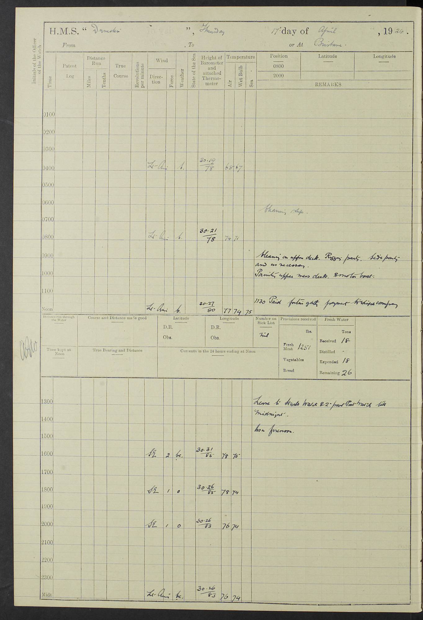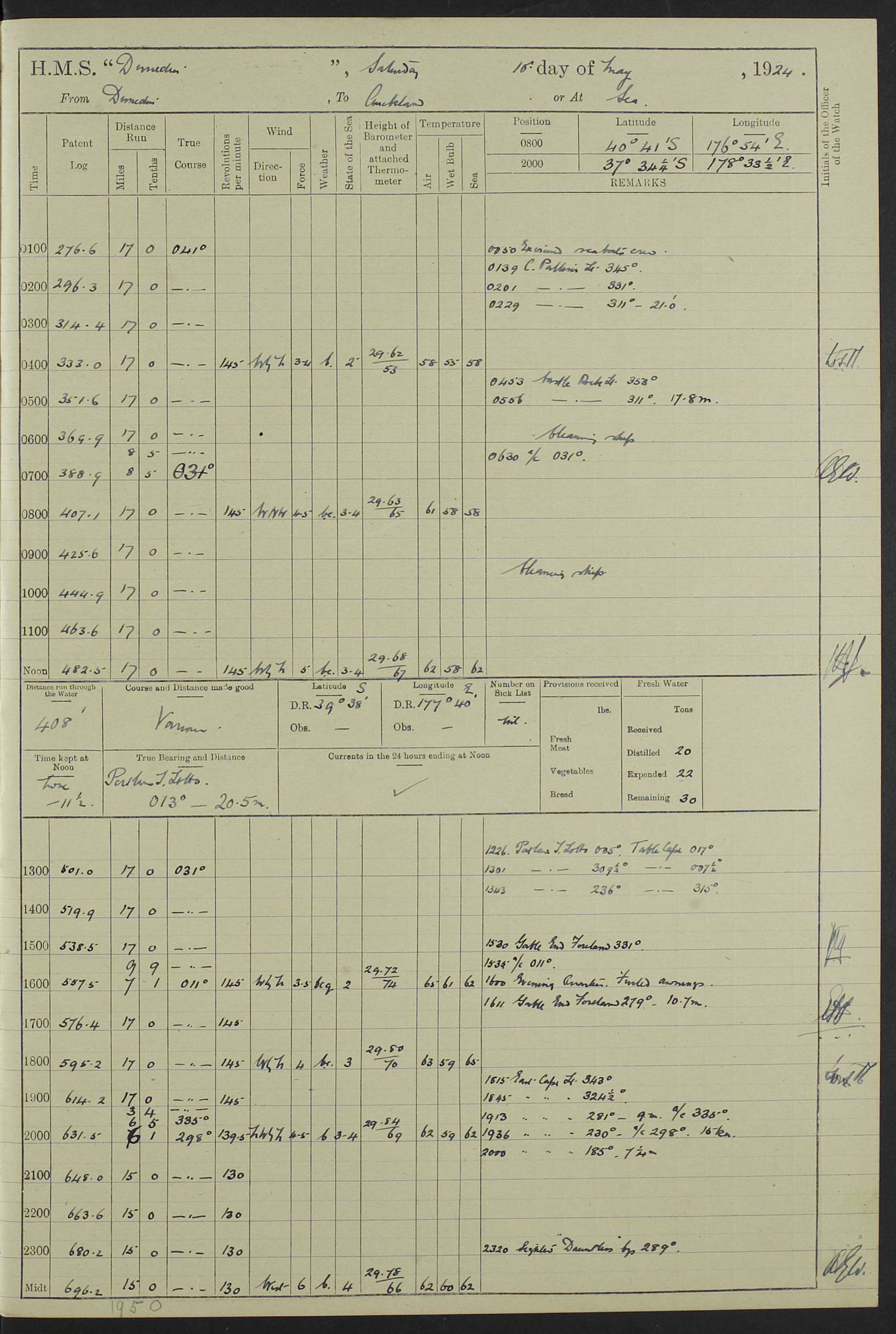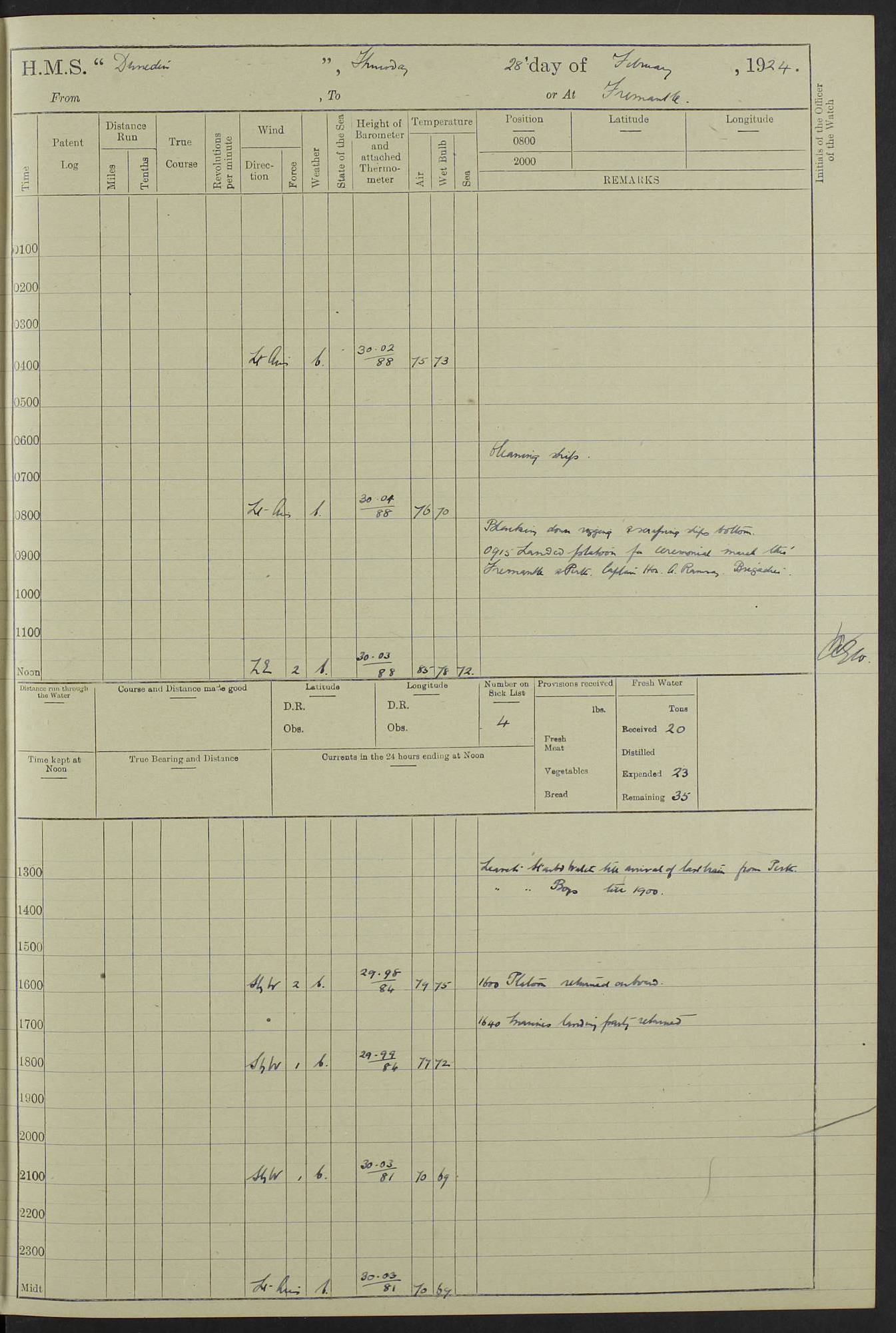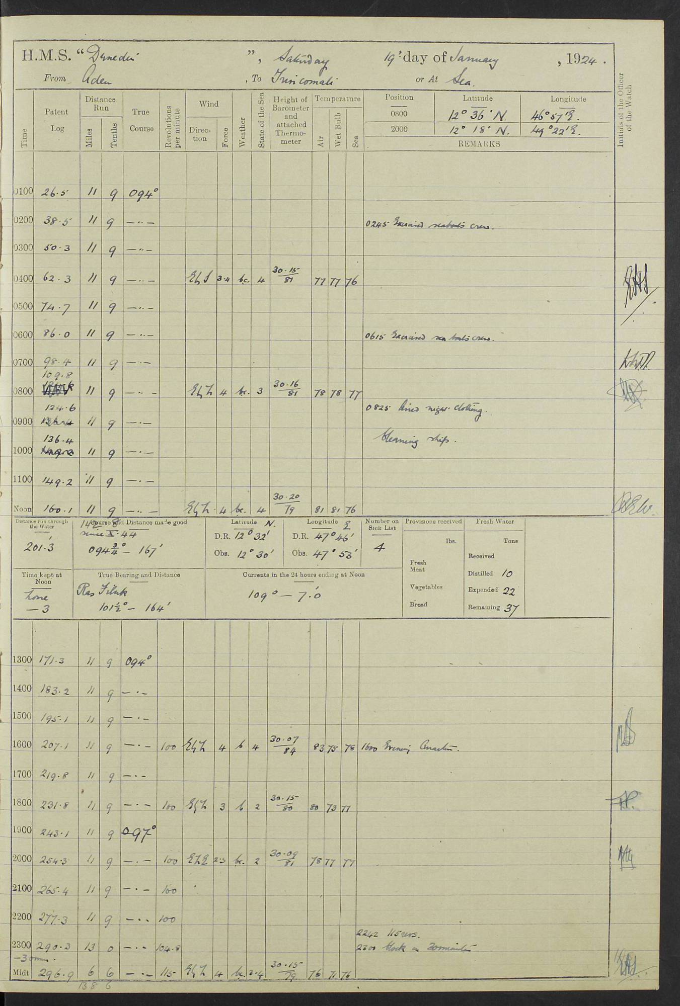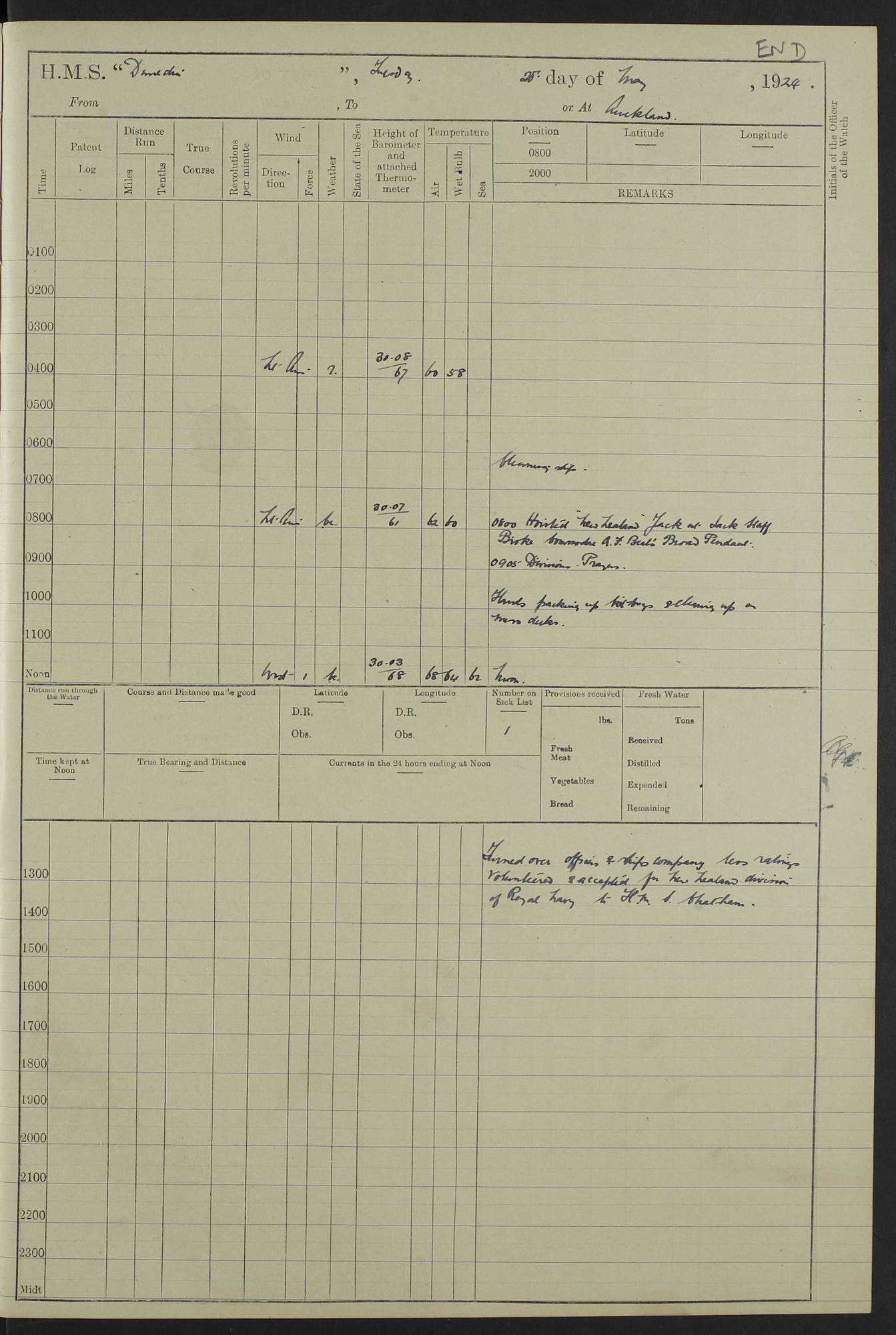 (Maps prepared using Journey Plotter, developed by Maikel. The Plots can only be approximate. They are made by joining-up positions on successive days, and sometimes positions are not given. There will therefore be occasions when the ship appears to have travelled overland) LOG BOOK – 23RD SEPTEMBER 1920 TO 13TH SEPTEMBER 1921 4caf8d9dcadfd3419703bde2: (http://oldweather.s3.amazonaws.com/ADM53-76345/ADM53-76345_0.jpg) Left front cover of Ship’s Log. 4caf8d9dcadfd3419703bde3: (http://oldweather.s3.amazonaws.com/ADM53-76345/ADM53-76345_1.jpg) Right front cover of Ship’s Log. 4caf8d97cadfd3419703bc6a: (http://oldweather.s3.amazonaws.com/ADM53-76345/ADM53-76345-002_0.jpg) 4caf8d97cadfd3419703bc6b: (http://oldweather.s3.amazonaws.com/ADM53-76345/ADM53-76345-002_1.jpg) 4caf8d97cadfd3419703bc6c: (http://oldweather.s3.amazonaws.com/ADM53-76345/ADM53-76345-003_0.jpg) 4caf8d97cadfd3419703bc6d: (http://oldweather.s3.amazonaws.com/ADM53-76345/ADM53-76345-003_1.jpg) 4caf8d97cadfd3419703bc6e: (http://oldweather.s3.amazonaws.com/ADM53-76345/ADM53-76345-004_0.jpg) Blank pages. 4caf8d97cadfd3419703bc6f: (http://oldweather.s3.amazonaws.com/ADM53-76345/ADM53-76345-004_1.jpg) S.- 321. See Articles 557, 619, 622, 924, 1025, 1026 and 1849 of the King’s Regulations, 1913. This Log is to be kept from the time the Ship is Commissioned until she is paid off; when it is to be transmitted as directed by the Admiralty Instructions. The Name and Address of the Officer to whom the acknowledgement of receipt should be sent by the Deputy Cashier in charge, Royal Victoria Yard, Deptford, is to be inserted here. Name: Commander’s Office. Address: H.M.S. Dunedin. c/o G.P.O. London. LOG of H.M.S. “Dunedin” Commanded by Captain C. Wrightson C.B.E. (till 31.3.21). Captain H.S. Monroe D.S.O. (from 31.3.21). FOR THE PERIOD Commencing: Thursday 23rd of September 1920. Ending: Tuesday 13th of September 1921. Tonnage (Displacement): 4,650 Extreme Length: 472ft 3 ins Extreme Breadth: 46 ft 0.3/8” Engines: Manufacturer: Messes R & W Hawthorn Leslie & Co Ltd. Newcastle on Tyne. I.H.P: 40.000 Forced Draught. Description: Turbine (Geared). When Fixed on Board: 1918 – 1919. Boilers: Manufacturer: Messes R & W Hawthorn Leslie & Co Ltd. Newcastle on Tyne. Description: Small tube Improved Yarrow. When made: 1918. When put in vessel: 1918. Paddle Wheels or Screw Propeller: Manufacturer: Manganese Bronze Co. Description: Solid 3 Blades Turbadium Bronze, Pitch 14 ft 3 in. General State of Repair: Satisfactory. R. Alison [?], Lieut Com (W) on paying off 30th August 1923. L. 8418/02. N.L. 15713/13. Where Built Sir W.G. Armstrong Whitworth & Co Ltd. N.L. 18227/18. Armstrong Naval Yard, High Walker, Newcastle on Tyne. Sta. 127/10. Commenced building November 1917, Launched 19 November 1918. N.L. 22782/19. Completed September 1919. 4caf8d98cadfd3419703bc70: (http://oldweather.s3.amazonaws.com/ADM53-76345/ADM53-76345-005_0.jpg) Directions (See King’s Regulations 1913, Articles 1025 and 1849). 1. King’s Regulations. 2. Figures to indicate the Force of the Wind. 3. Letters to denote the State of the Weather. 4. Scale of Fog Intensity. 5. Sea Disturbance Scale 4caf8d98cadfd3419703bc71: (http://oldweather.s3.amazonaws.com/ADM53-76345/ADM53-76345-005_1.jpg) Establishment of Ship’s Company Officers 23 Seamen 187 Boys 36 Marines 46 Engine-room Establishment 105 Other non-executive ratings 44 Total 441 ARMAMENT Position Forecastle: 6” Calibre XII on C.P. XIV mounting. Superstructure: Four 6” Calibre XII on C.P. XIV mountings. Superstructure: Two 3” QF Calibre High Angle mountings, Quarterdeck: 6” Calibre XII on C.P. XIV mountings. Torpedo Armaments Four above water 21” triple tubes. BAROMETER Mercurial or Aneroid: Mercurial. Name of Maker and number: J. Hitchins 101 A747. Height of cistern above sea: 13ft. Error of Mercurial Barometer: Nil at 30.00. Thermometers for Air Temperature. Position on Ship: On fore bridge. Whether in screen: Yes. Maker and No. Negretti & Zambra From: 7.10.19 To: Sept. 1921. Negretti & Zambra No. 10499 Negretti & Zambra No 10391 From: 7.10.19 To: Sept. 1921. Thermometer for Sea Temperature. A. Harper & Sons 7.10.19 POSITION OF STANDARD COMPASS. Manoeuvring Platform. (Fore bridge) BOATS Number of each carried: 1 x 30ft. motor boat. 2 x 32ft. cutters. 1 x 30ft gig. 2 x 27ft whalers. 2 x 16 ft dinghies. MISCELLANEOUS INFORMATION Draught of water with Bunkers full, and complete with provisions, Stores and water: Forward 16 ft 1 inch; Aft 16 ft 11 inches. Number of Tons necessary to increase draught 1 inch: 35.6. Number of Tons of Coal Carried: 16. Number of Tons of Oil Fuel carried: 1127. Quantity of Water Carried (a) For Boilers: 157 tons. (b) For Drinking: 56½ tons. LOGS FOR SEPTEMBER 1920 4caf8d98cadfd3419703bc72: (http://oldweather.s3.amazonaws.com/ADM53-76345/ADM53-76345-006_0.jpg) 23 September 1920 At Copenhagen. Lat 55.694, Long 12.603 4.00am: Signal books correct. am: Hands employed cleaning ship. 8.00am: Signal books correct. am: Sent coaling party to S.S. “Volo”. am: X & Y 6” guns crews at loader drill, remainder of hands employed as requisite. am: Coaling party returned. Noon: Signal books correct. 1.15pm: Sent coaling party to S.S. “Volo”. pm: 1 Rating joined ship from hospital. pm: Boys & training classes under instruction, remainder of hands employed as requisite. 3.00pm: U.S.S. “Gilmer” arrived. [Gilmer, U.S. Destroyer, Flush Decker, launched 18/7/19, Guns: 4 x 5”, 51 cal.,1 x 3”, 23 cal. AA, 12 x 21” TT’s in 4 triple deck mountings. Disp: 1,215 tons, SHP: 26,000 = 35 knots. Jane’s Fighting Ships 1919. Image]. 4.00pm: Signal books correct. pm: Coaling party returned. 8.00pm: Signal books correct. Midnight: Signal books correct. 4caf8d98cadfd3419703bc73: (http://oldweather.s3.amazonaws.com/ADM53-76345/ADM53-76345-006_1.jpg) 24 September 1920 At Copenhagen. Lat 55.694, Long 12.603 4.00am: Signal books correct. am: Hands employed cleaning ship. 6.15am: U.S.S. “Sh