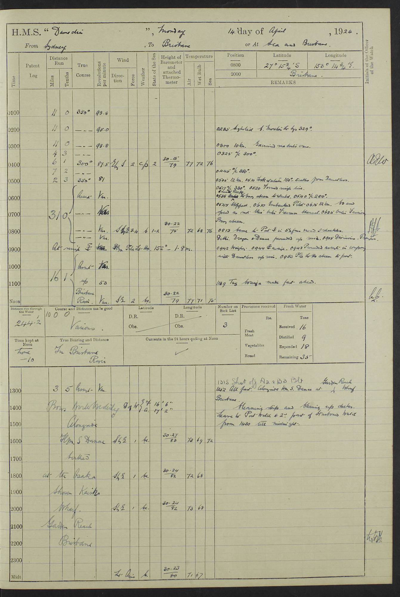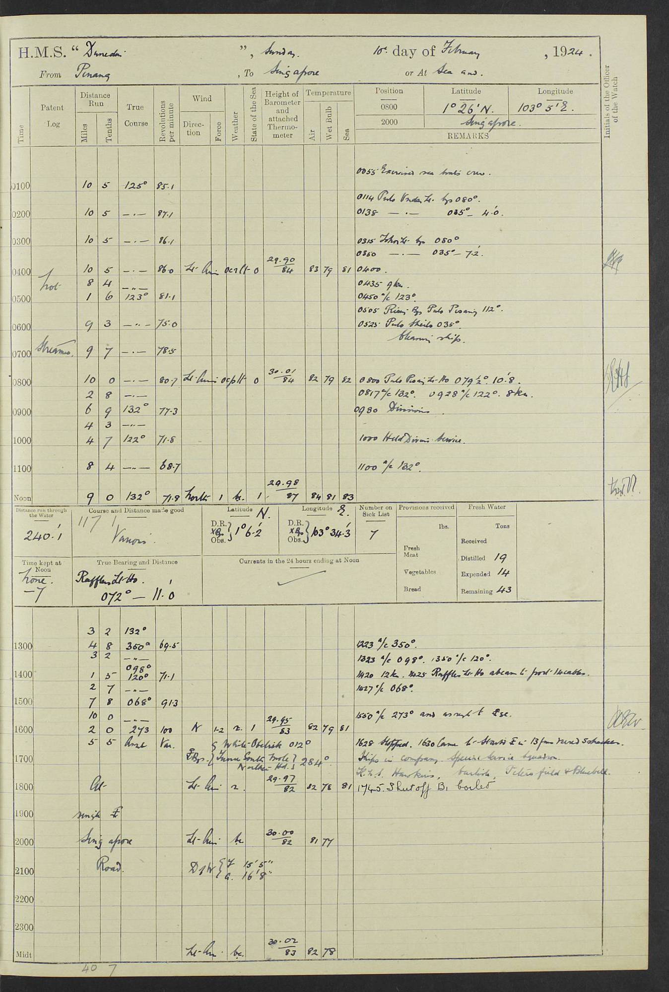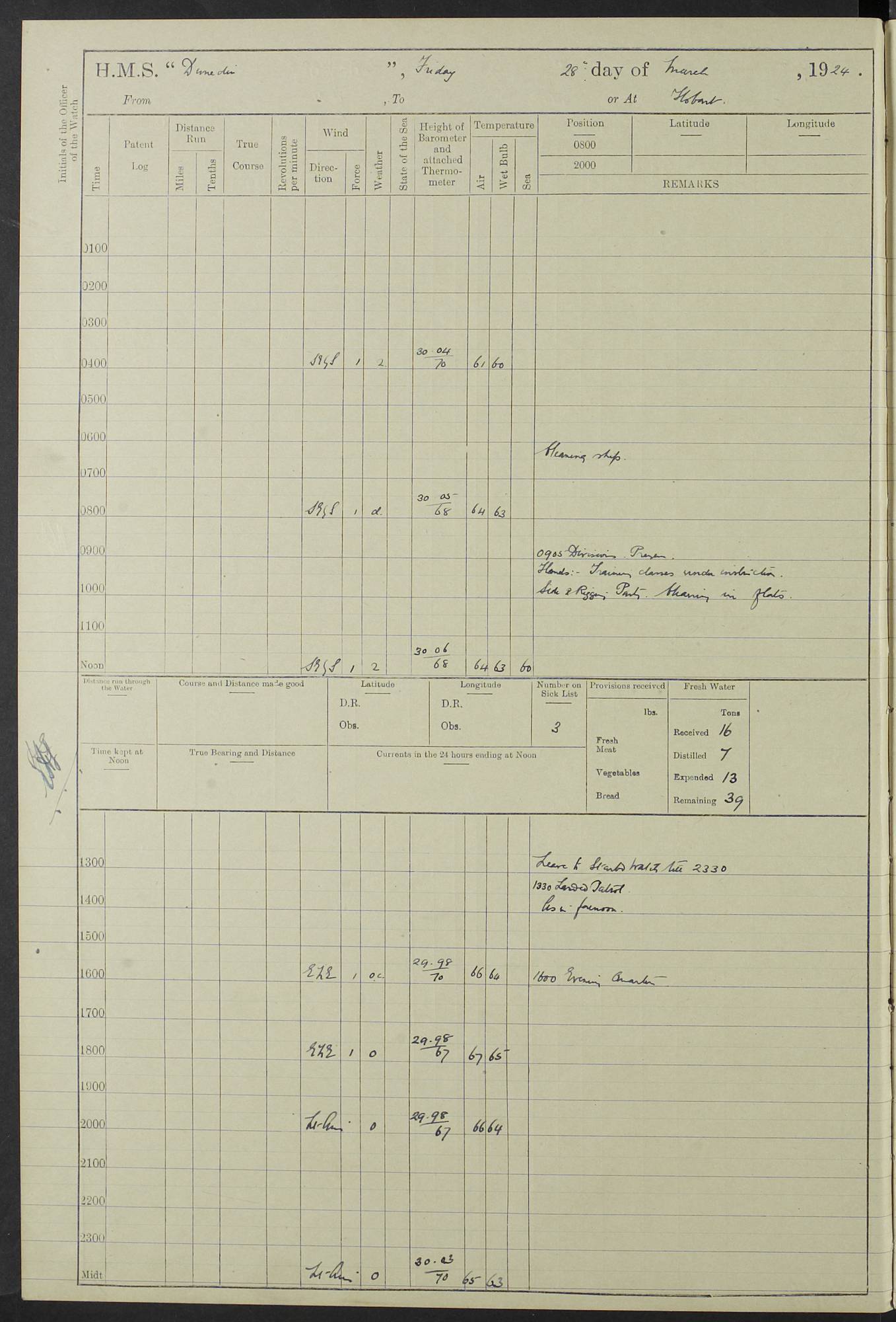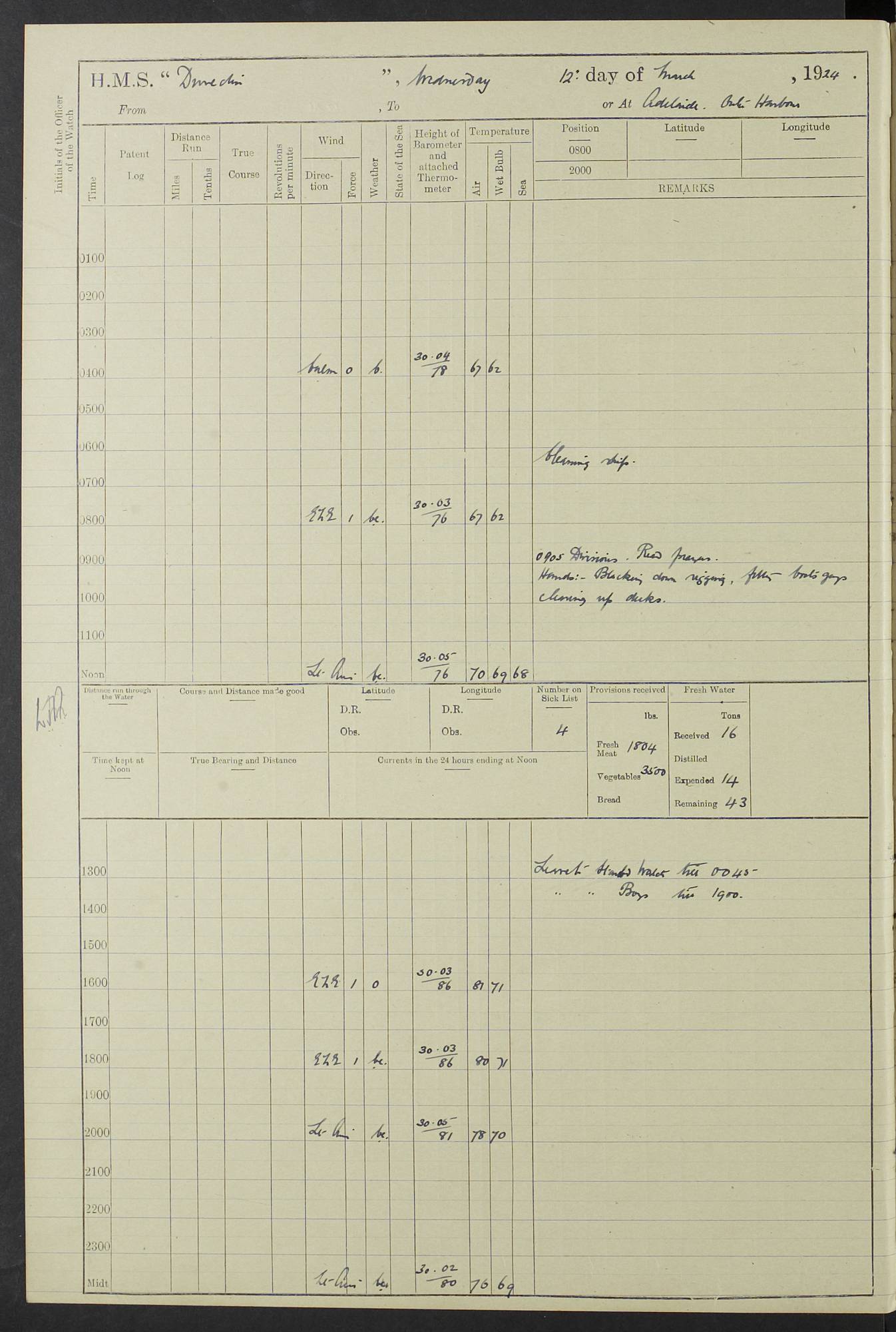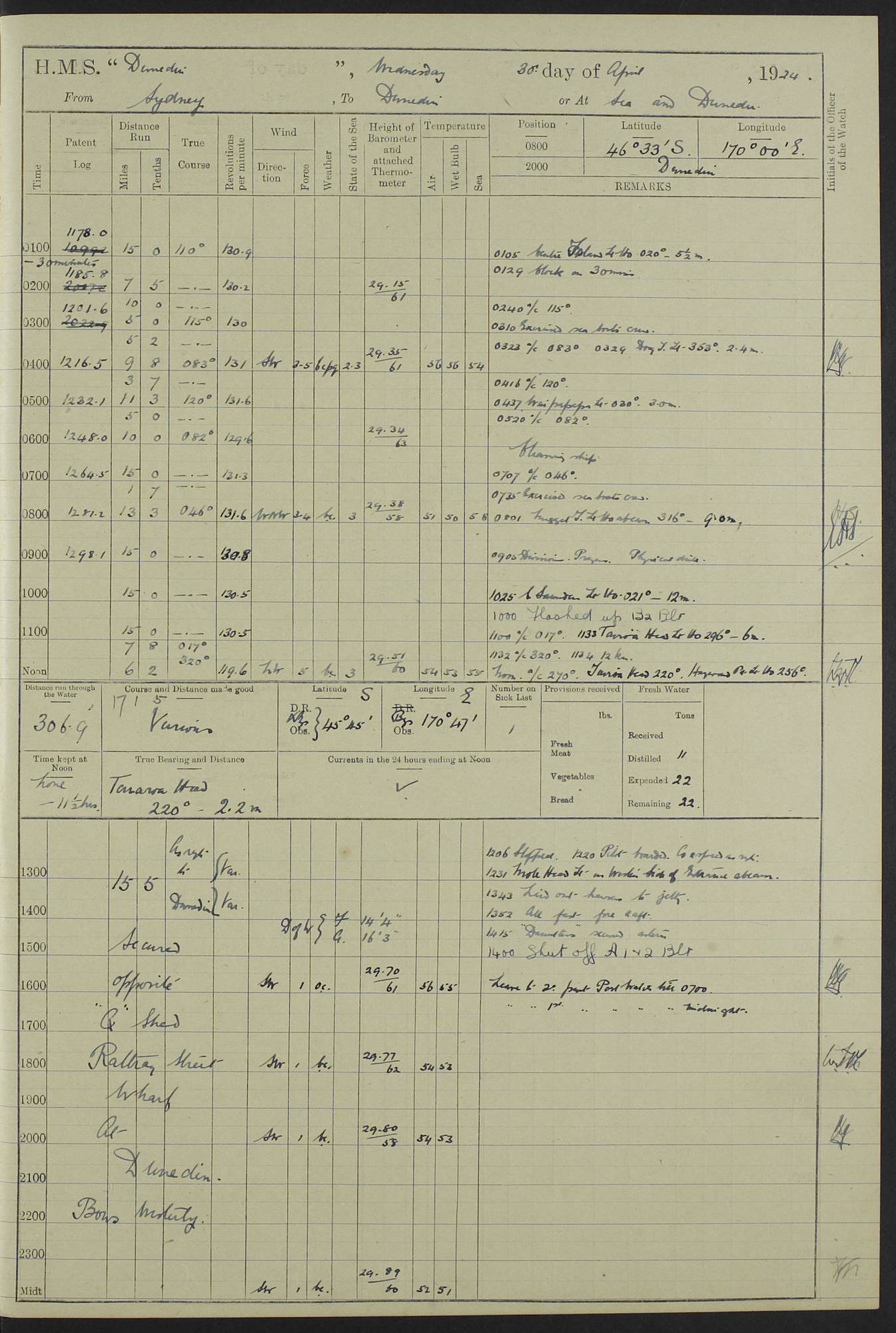 (Maps prepared using Journey Plotter, developed by Maikel. The Plots can only be approximate. They are made by joining-up positions on successive days, and sometimes positions are not given. There will therefore be occasions when the ship appears to have travelled overland) LOG BOOK – 23RD SEPTEMBER 1920 TO 13TH SEPTEMBER 1921 4caf8d9dcadfd3419703bde2: (http://oldweather.s3.amazonaws.com/ADM53-76345/ADM53-76345_0.jpg) Left front cover of Ship’s Log. 4caf8d9dcadfd3419703bde3: (http://oldweather.s3.amazonaws.com/ADM53-76345/ADM53-76345_1.jpg) Right front cover of Ship’s Log. 4caf8d97cadfd3419703bc6a: (http://oldweather.s3.amazonaws.com/ADM53-76345/ADM53-76345-002_0.jpg) 4caf8d97cadfd3419703bc6b: (http://oldweather.s3.amazonaws.com/ADM53-76345/ADM53-76345-002_1.jpg) 4caf8d97cadfd3419703bc6c: (http://oldweather.s3.amazonaws.com/ADM53-76345/ADM53-76345-003_0.jpg) 4caf8d97cadfd3419703bc6d: (http://oldweather.s3.amazonaws.com/ADM53-76345/ADM53-76345-003_1.jpg) 4caf8d97cadfd3419703bc6e: (http://oldweather.s3.amazonaws.com/ADM53-76345/ADM53-76345-004_0.jpg) Blank pages. 4caf8d97cadfd3419703bc6f: (http://oldweather.s3.amazonaws.com/ADM53-76345/ADM53-76345-004_1.jpg) S.- 321. See Articles 557, 619, 622, 924, 1025, 1026 and 1849 of the King’s Regulations, 1913. This Log is to be kept from the time the Ship is Commissioned until she is paid off; when it is to be transmitted as directed by the Admiralty Instructions. The Name and Address of the Officer to whom the acknowledgement of receipt should be sent by the Deputy Cashier in charge, Royal Victoria Yard, Deptford, is to be inserted here. Name: Commander’s Office. Address: H.M.S. Dunedin. c/o G.P.O. London. LOG of H.M.S. “Dunedin” Commanded by Captain C. Wrightson C.B.E. (till 31.3.21). Captain H.S. Monroe D.S.O. (from 31.3.21). FOR THE PERIOD Commencing: Thursday 23rd of September 1920. Ending: Tuesday 13th of September 1921. Tonnage (Displacement): 4,650 Extreme Length: 472ft 3 ins Extreme Breadth: 46 ft 0.3/8” Engines: Manufacturer: Messes R & W Hawthorn Leslie & Co Ltd. Newcastle on Tyne. I.H.P: 40.000 Forced Draught. Description: Turbine (Geared). When Fixed on Board: 1918 – 1919. Boilers: Manufacturer: Messes R & W Hawthorn Leslie & Co Ltd. Newcastle on Tyne. Description: Small tube Improved Yarrow. When made: 1918. When put in vessel: 1918. Paddle Wheels or Screw Propeller: Manufacturer: Manganese Bronze Co. Description: Solid 3 Blades Turbadium Bronze, Pitch 14 ft 3 in. General State of Repair: Satisfactory. R. Alison [?], Lieut Com (W) on paying off 30th August 1923. L. 8418/02. N.L. 15713/13. Where Built Sir W.G. Armstrong Whitworth & Co Ltd. N.L. 18227/18. Armstrong Naval Yard, High Walker, Newcastle on Tyne. Sta. 127/10. Commenced building November 1917, Launched 19 November 1918. N.L. 22782/19. Completed September 1919. 4caf8d98cadfd3419703bc70: (http://oldweather.s3.amazonaws.com/ADM53-76345/ADM53-76345-005_0.jpg) Directions (See King’s Regulations 1913, Articles 1025 and 1849). 1. King’s Regulations. 2. Figures to indicate the Force of the Wind. 3. Letters to denote the State of the Weather. 4. Scale of Fog Intensity. 5. Sea Disturbance Scale 4caf8d98cadfd3419703bc71: (http://oldweather.s3.amazonaws.com/ADM53-76345/ADM53-76345-005_1.jpg) Establishment of Ship’s Company Officers 23 Seamen 187 Boys 36 Marines 46 Engine-room Establishment 105 Other non-executive ratings 44 Total 441 ARMAMENT Position Forecastle: 6” Calibre XII on C.P. XIV mounting. Superstructure: Four 6” Calibre XII on C.P. XIV mountings. Superstructure: Two 3” QF Calibre High Angle mountings, Quarterdeck: 6” Calibre XII on C.P. XIV mountings. Torpedo Armaments Four above water 21” triple tubes. BAROMETER Mercurial or Aneroid: Mercurial. Name of Maker and number: J. Hitchins 101 A747. Height of cistern above sea: 13ft. Error of Mercurial Barometer: Nil at 30.00. Thermometers for Air Temperature. Position on Ship: On fore bridge. Whether in screen: Yes. Maker and No. Negretti & Zambra From: 7.10.19 To: Sept. 1921. Negretti & Zambra No. 10499 Negretti & Zambra No 10391 From: 7.10.19 To: Sept. 1921. Thermometer for Sea Temperature. A. Harper & Sons 7.10.19 POSITION OF STANDARD COMPASS. Manoeuvring Platform. (Fore bridge) BOATS Number of each carried: 1 x 30ft. motor boat. 2 x 32ft. cutters. 1 x 30ft gig. 2 x 27ft whalers. 2 x 16 ft dinghies. MISCELLANEOUS INFORMATION Draught of water with Bunkers full, and complete with provisions, Stores and water: Forward 16 ft 1 inch; Aft 16 ft 11 inches. Number of Tons necessary to increase draught 1 inch: 35.6. Number of Tons of Coal Carried: 16. Number of Tons of Oil Fuel carried: 1127. Quantity of Water Carried (a) For Boilers: 157 tons. (b) For Drinking: 56½ tons. LOGS FOR SEPTEMBER 1920 4caf8d98cadfd3419703bc72: (http://oldweather.s3.amazonaws.com/ADM53-76345/ADM53-76345-006_0.jpg) 23 September 1920 At Copenhagen. Lat 55.694, Long 12.603 4.00am: Signal books correct. am: Hands employed cleaning ship. 8.00am: Signal books correct. am: Sent coaling party to S.S. “Volo”. am: X & Y 6” guns crews at loader drill, remainder of hands employed as requisite. am: Coaling party returned. Noon: Signal books correct. 1.15pm: Sent coaling party to S.S. “Volo”. pm: 1 Rating joined ship from hospital. pm: Boys & training classes under instruction, remainder of hands employed as requisite. 3.00pm: U.S.S. “Gilmer” arrived. [Gilmer, U.S. Destroyer, Flush Decker, launched 18/7/19, Guns: 4 x 5”, 51 cal.,1 x 3”, 23 cal. AA, 12 x 21” TT’s in 4 triple deck mountings. Disp: 1,215 tons, SHP: 26,000 = 35 knots. Jane’s Fighting Ships 1919. Image]. 4.00pm: Signal books correct. pm: Coaling party returned. 8.00pm: Signal books correct. Midnight: Signal books correct. 4caf8d98cadfd3419703bc73: (http://oldweather.s3.amazonaws.com/ADM53-76345/ADM53-76345-006_1.jpg) 24 September 1920 At Copenhagen. Lat 55.694, Long 12.603 4.00am: Signal books correct. am: Hands employed cleaning ship. 6.15am: U.S.S. “Sh