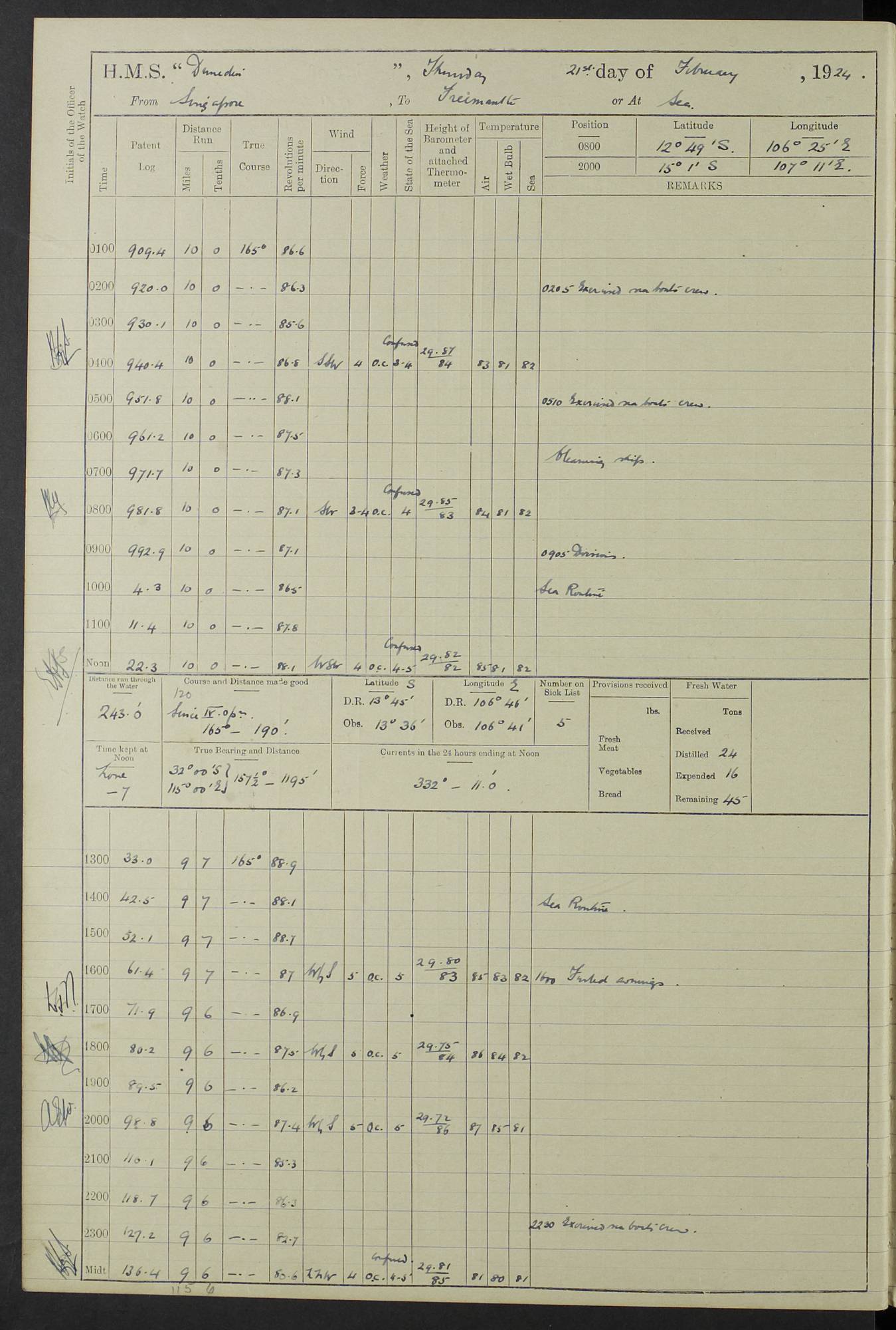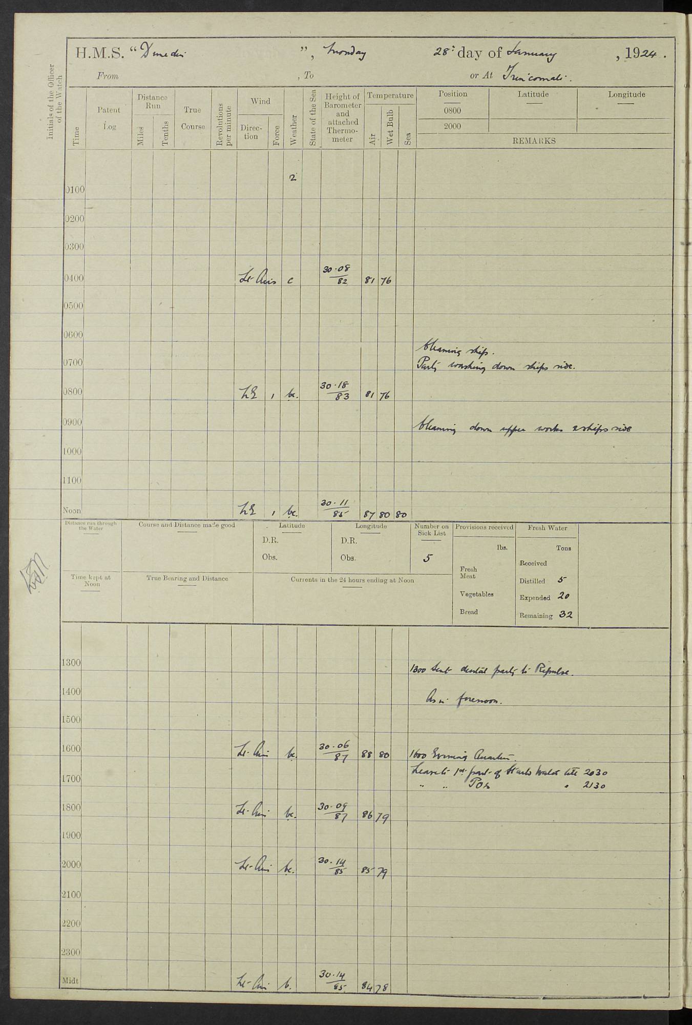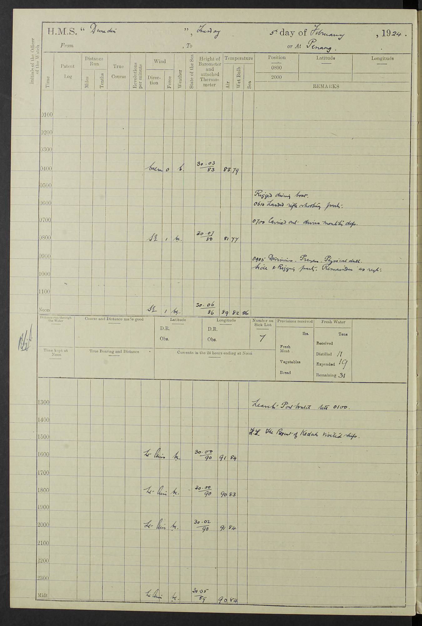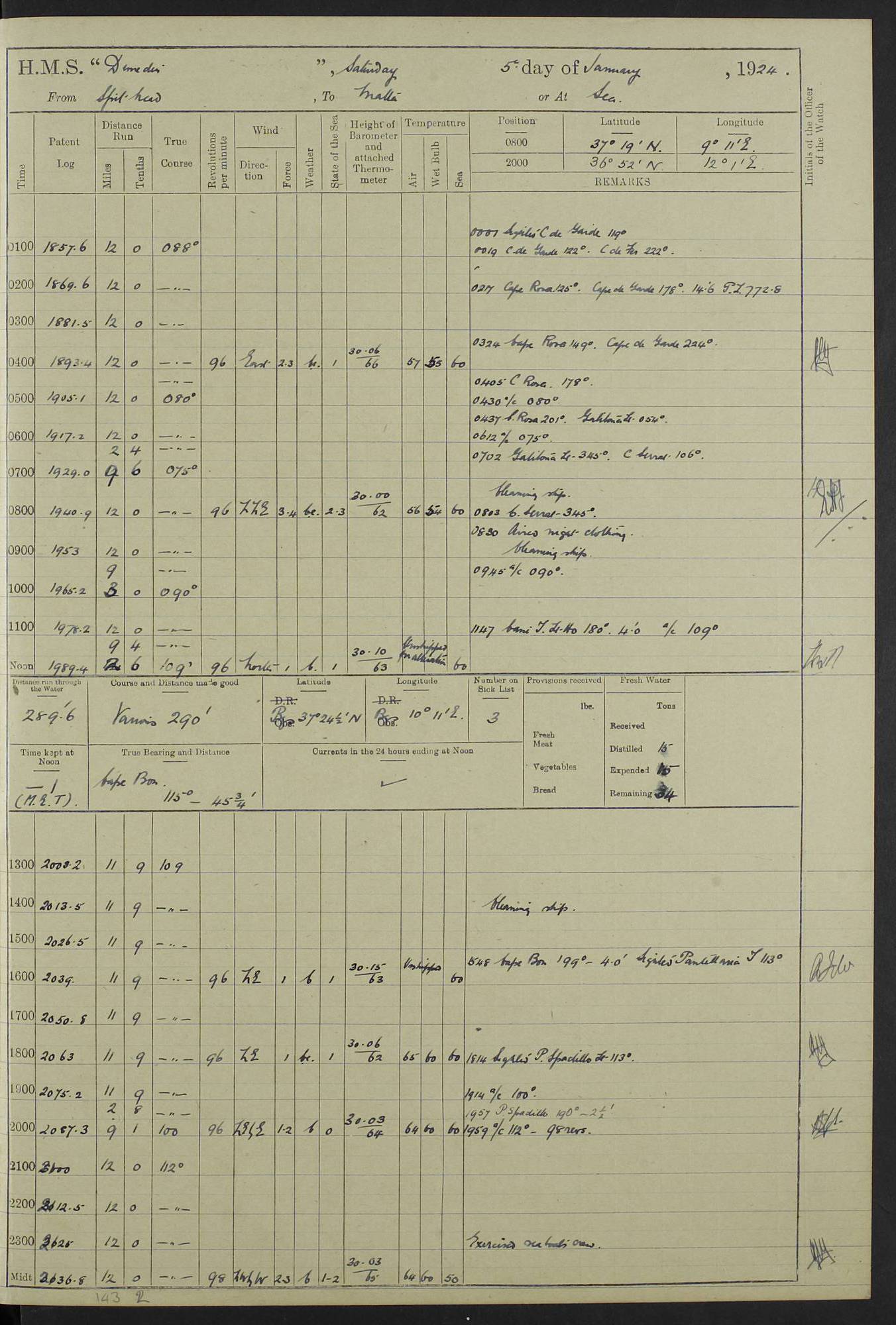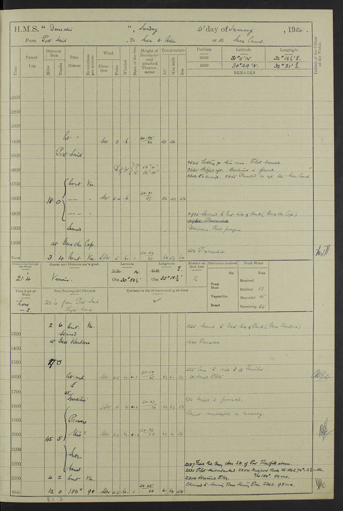 (Maps prepared using Journey Plotter, developed by Maikel. The Plots can only be approximate. They are made by joining-up positions on successive days, and sometimes positions are not given. There will therefore be occasions when the ship appears to have travelled overland) LOG BOOK – 23RD SEPTEMBER 1920 TO 13TH SEPTEMBER 1921 4caf8d9dcadfd3419703bde2: (http://oldweather.s3.amazonaws.com/ADM53-76345/ADM53-76345_0.jpg) Left front cover of Ship’s Log. 4caf8d9dcadfd3419703bde3: (http://oldweather.s3.amazonaws.com/ADM53-76345/ADM53-76345_1.jpg) Right front cover of Ship’s Log. 4caf8d97cadfd3419703bc6a: (http://oldweather.s3.amazonaws.com/ADM53-76345/ADM53-76345-002_0.jpg) 4caf8d97cadfd3419703bc6b: (http://oldweather.s3.amazonaws.com/ADM53-76345/ADM53-76345-002_1.jpg) 4caf8d97cadfd3419703bc6c: (http://oldweather.s3.amazonaws.com/ADM53-76345/ADM53-76345-003_0.jpg) 4caf8d97cadfd3419703bc6d: (http://oldweather.s3.amazonaws.com/ADM53-76345/ADM53-76345-003_1.jpg) 4caf8d97cadfd3419703bc6e: (http://oldweather.s3.amazonaws.com/ADM53-76345/ADM53-76345-004_0.jpg) Blank pages. 4caf8d97cadfd3419703bc6f: (http://oldweather.s3.amazonaws.com/ADM53-76345/ADM53-76345-004_1.jpg) S.- 321. See Articles 557, 619, 622, 924, 1025, 1026 and 1849 of the King’s Regulations, 1913. This Log is to be kept from the time the Ship is Commissioned until she is paid off; when it is to be transmitted as directed by the Admiralty Instructions. The Name and Address of the Officer to whom the acknowledgement of receipt should be sent by the Deputy Cashier in charge, Royal Victoria Yard, Deptford, is to be inserted here. Name: Commander’s Office. Address: H.M.S. Dunedin. c/o G.P.O. London. LOG of H.M.S. “Dunedin” Commanded by Captain C. Wrightson C.B.E. (till 31.3.21). Captain H.S. Monroe D.S.O. (from 31.3.21). FOR THE PERIOD Commencing: Thursday 23rd of September 1920. Ending: Tuesday 13th of September 1921. Tonnage (Displacement): 4,650 Extreme Length: 472ft 3 ins Extreme Breadth: 46 ft 0.3/8” Engines: Manufacturer: Messes R & W Hawthorn Leslie & Co Ltd. Newcastle on Tyne. I.H.P: 40.000 Forced Draught. Description: Turbine (Geared). When Fixed on Board: 1918 – 1919. Boilers: Manufacturer: Messes R & W Hawthorn Leslie & Co Ltd. Newcastle on Tyne. Description: Small tube Improved Yarrow. When made: 1918. When put in vessel: 1918. Paddle Wheels or Screw Propeller: Manufacturer: Manganese Bronze Co. Description: Solid 3 Blades Turbadium Bronze, Pitch 14 ft 3 in. General State of Repair: Satisfactory. R. Alison [?], Lieut Com (W) on paying off 30th August 1923. L. 8418/02. N.L. 15713/13. Where Built Sir W.G. Armstrong Whitworth & Co Ltd. N.L. 18227/18. Armstrong Naval Yard, High Walker, Newcastle on Tyne. Sta. 127/10. Commenced building November 1917, Launched 19 November 1918. N.L. 22782/19. Completed September 1919. 4caf8d98cadfd3419703bc70: (http://oldweather.s3.amazonaws.com/ADM53-76345/ADM53-76345-005_0.jpg) Directions (See King’s Regulations 1913, Articles 1025 and 1849). 1. King’s Regulations. 2. Figures to indicate the Force of the Wind. 3. Letters to denote the State of the Weather. 4. Scale of Fog Intensity. 5. Sea Disturbance Scale 4caf8d98cadfd3419703bc71: (http://oldweather.s3.amazonaws.com/ADM53-76345/ADM53-76345-005_1.jpg) Establishment of Ship’s Company Officers 23 Seamen 187 Boys 36 Marines 46 Engine-room Establishment 105 Other non-executive ratings 44 Total 441 ARMAMENT Position Forecastle: 6” Calibre XII on C.P. XIV mounting. Superstructure: Four 6” Calibre XII on C.P. XIV mountings. Superstructure: Two 3” QF Calibre High Angle mountings, Quarterdeck: 6” Calibre XII on C.P. XIV mountings. Torpedo Armaments Four above water 21” triple tubes. BAROMETER Mercurial or Aneroid: Mercurial. Name of Maker and number: J. Hitchins 101 A747. Height of cistern above sea: 13ft. Error of Mercurial Barometer: Nil at 30.00. Thermometers for Air Temperature. Position on Ship: On fore bridge. Whether in screen: Yes. Maker and No. Negretti & Zambra From: 7.10.19 To: Sept. 1921. Negretti & Zambra No. 10499 Negretti & Zambra No 10391 From: 7.10.19 To: Sept. 1921. Thermometer for Sea Temperature. A. Harper & Sons 7.10.19 POSITION OF STANDARD COMPASS. Manoeuvring Platform. (Fore bridge) BOATS Number of each carried: 1 x 30ft. motor boat. 2 x 32ft. cutters. 1 x 30ft gig. 2 x 27ft whalers. 2 x 16 ft dinghies. MISCELLANEOUS INFORMATION Draught of water with Bunkers full, and complete with provisions, Stores and water: Forward 16 ft 1 inch; Aft 16 ft 11 inches. Number of Tons necessary to increase draught 1 inch: 35.6. Number of Tons of Coal Carried: 16. Number of Tons of Oil Fuel carried: 1127. Quantity of Water Carried (a) For Boilers: 157 tons. (b) For Drinking: 56½ tons. LOGS FOR SEPTEMBER 1920 4caf8d98cadfd3419703bc72: (http://oldweather.s3.amazonaws.com/ADM53-76345/ADM53-76345-006_0.jpg) 23 September 1920 At Copenhagen. Lat 55.694, Long 12.603 4.00am: Signal books correct. am: Hands employed cleaning ship. 8.00am: Signal books correct. am: Sent coaling party to S.S. “Volo”. am: X & Y 6” guns crews at loader drill, remainder of hands employed as requisite. am: Coaling party returned. Noon: Signal books correct. 1.15pm: Sent coaling party to S.S. “Volo”. pm: 1 Rating joined ship from hospital. pm: Boys & training classes under instruction, remainder of hands employed as requisite. 3.00pm: U.S.S. “Gilmer” arrived. [Gilmer, U.S. Destroyer, Flush Decker, launched 18/7/19, Guns: 4 x 5”, 51 cal.,1 x 3”, 23 cal. AA, 12 x 21” TT’s in 4 triple deck mountings. Disp: 1,215 tons, SHP: 26,000 = 35 knots. Jane’s Fighting Ships 1919. Image]. 4.00pm: Signal books correct. pm: Coaling party returned. 8.00pm: Signal books correct. Midnight: Signal books correct. 4caf8d98cadfd3419703bc73: (http://oldweather.s3.amazonaws.com/ADM53-76345/ADM53-76345-006_1.jpg) 24 September 1920 At Copenhagen. Lat 55.694, Long 12.603 4.00am: Signal books correct. am: Hands employed cleaning ship. 6.15am: U.S.S. “Sh