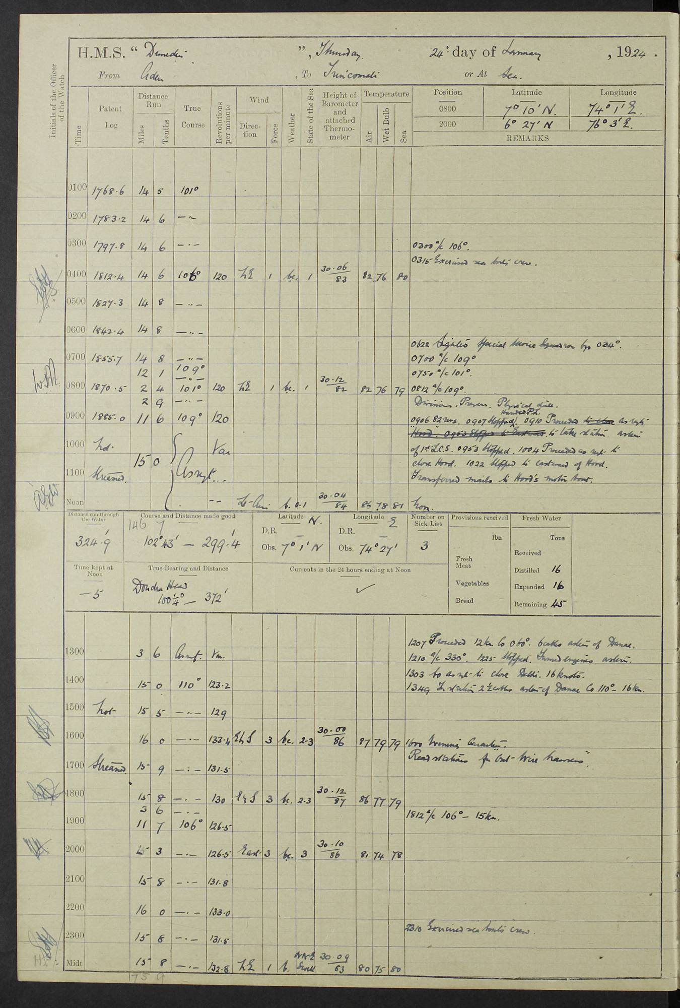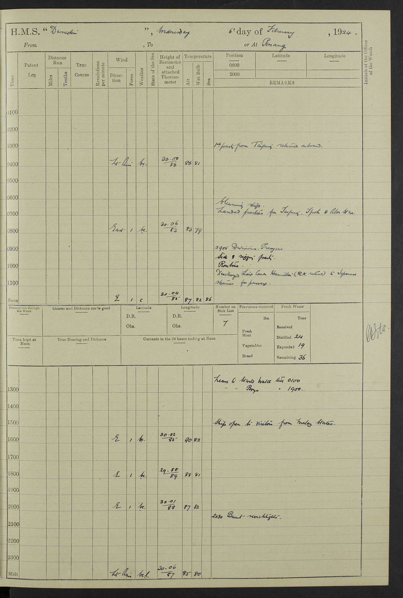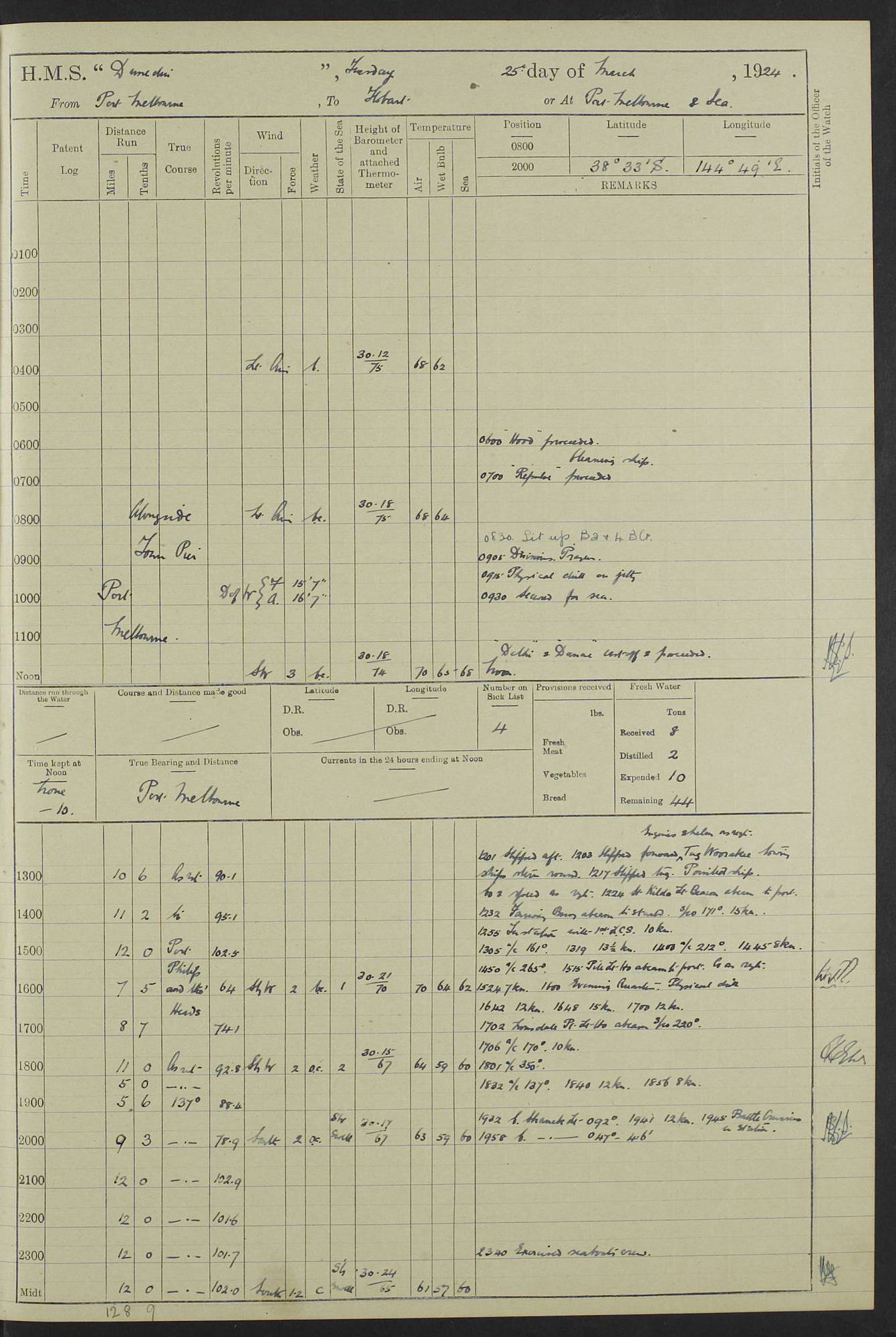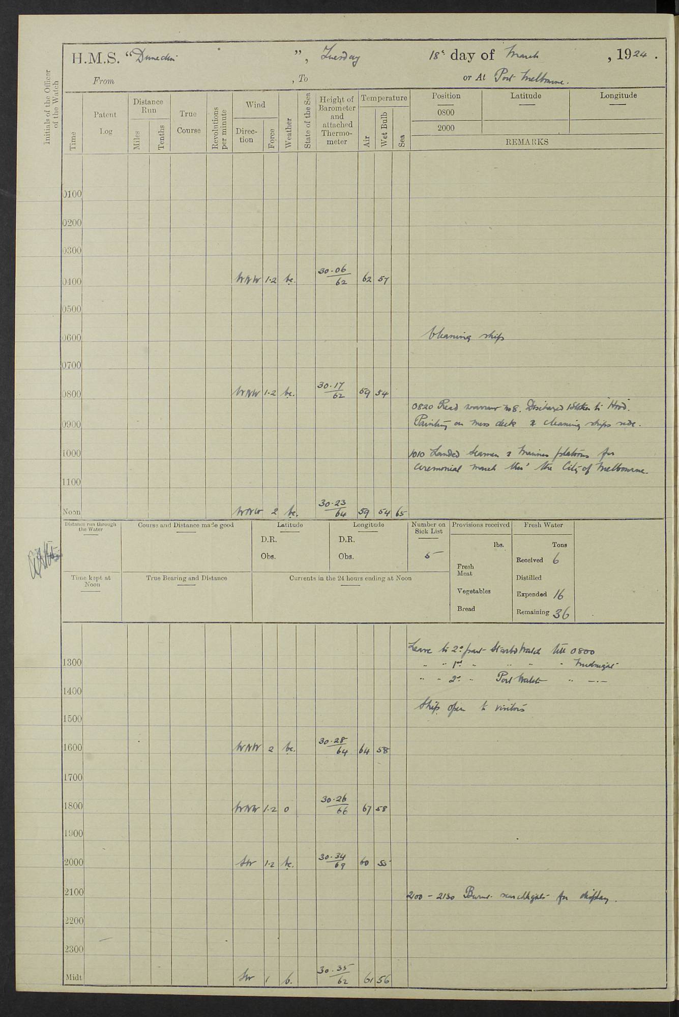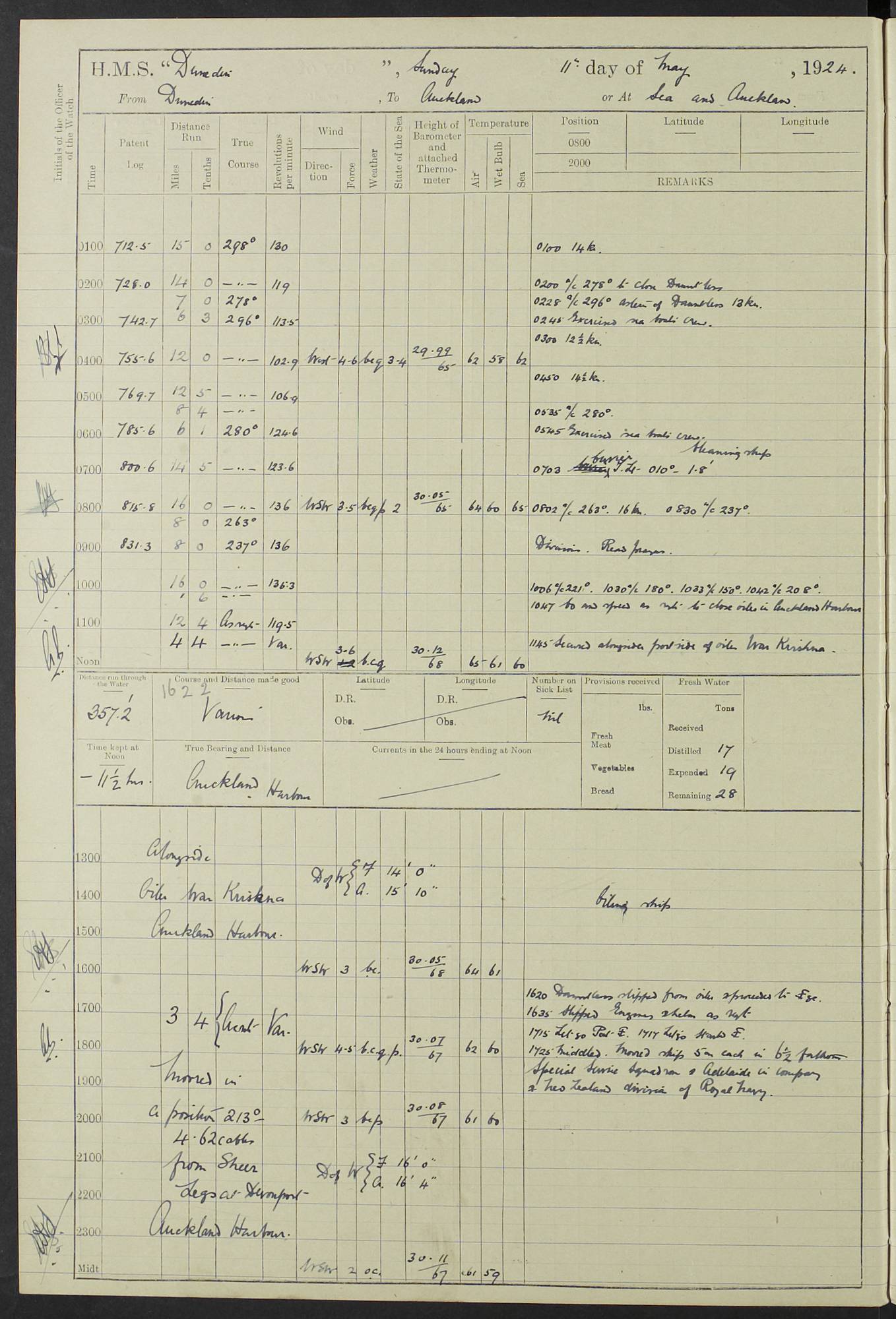 (Maps prepared using Journey Plotter, developed by Maikel. The Plots can only be approximate. They are made by joining-up positions on successive days, and sometimes positions are not given. There will therefore be occasions when the ship appears to have travelled overland) LOG BOOK – 23RD SEPTEMBER 1920 TO 13TH SEPTEMBER 1921 4caf8d9dcadfd3419703bde2: (http://oldweather.s3.amazonaws.com/ADM53-76345/ADM53-76345_0.jpg) Left front cover of Ship’s Log. 4caf8d9dcadfd3419703bde3: (http://oldweather.s3.amazonaws.com/ADM53-76345/ADM53-76345_1.jpg) Right front cover of Ship’s Log. 4caf8d97cadfd3419703bc6a: (http://oldweather.s3.amazonaws.com/ADM53-76345/ADM53-76345-002_0.jpg) 4caf8d97cadfd3419703bc6b: (http://oldweather.s3.amazonaws.com/ADM53-76345/ADM53-76345-002_1.jpg) 4caf8d97cadfd3419703bc6c: (http://oldweather.s3.amazonaws.com/ADM53-76345/ADM53-76345-003_0.jpg) 4caf8d97cadfd3419703bc6d: (http://oldweather.s3.amazonaws.com/ADM53-76345/ADM53-76345-003_1.jpg) 4caf8d97cadfd3419703bc6e: (http://oldweather.s3.amazonaws.com/ADM53-76345/ADM53-76345-004_0.jpg) Blank pages. 4caf8d97cadfd3419703bc6f: (http://oldweather.s3.amazonaws.com/ADM53-76345/ADM53-76345-004_1.jpg) S.- 321. See Articles 557, 619, 622, 924, 1025, 1026 and 1849 of the King’s Regulations, 1913. This Log is to be kept from the time the Ship is Commissioned until she is paid off; when it is to be transmitted as directed by the Admiralty Instructions. The Name and Address of the Officer to whom the acknowledgement of receipt should be sent by the Deputy Cashier in charge, Royal Victoria Yard, Deptford, is to be inserted here. Name: Commander’s Office. Address: H.M.S. Dunedin. c/o G.P.O. London. LOG of H.M.S. “Dunedin” Commanded by Captain C. Wrightson C.B.E. (till 31.3.21). Captain H.S. Monroe D.S.O. (from 31.3.21). FOR THE PERIOD Commencing: Thursday 23rd of September 1920. Ending: Tuesday 13th of September 1921. Tonnage (Displacement): 4,650 Extreme Length: 472ft 3 ins Extreme Breadth: 46 ft 0.3/8” Engines: Manufacturer: Messes R & W Hawthorn Leslie & Co Ltd. Newcastle on Tyne. I.H.P: 40.000 Forced Draught. Description: Turbine (Geared). When Fixed on Board: 1918 – 1919. Boilers: Manufacturer: Messes R & W Hawthorn Leslie & Co Ltd. Newcastle on Tyne. Description: Small tube Improved Yarrow. When made: 1918. When put in vessel: 1918. Paddle Wheels or Screw Propeller: Manufacturer: Manganese Bronze Co. Description: Solid 3 Blades Turbadium Bronze, Pitch 14 ft 3 in. General State of Repair: Satisfactory. R. Alison [?], Lieut Com (W) on paying off 30th August 1923. L. 8418/02. N.L. 15713/13. Where Built Sir W.G. Armstrong Whitworth & Co Ltd. N.L. 18227/18. Armstrong Naval Yard, High Walker, Newcastle on Tyne. Sta. 127/10. Commenced building November 1917, Launched 19 November 1918. N.L. 22782/19. Completed September 1919. 4caf8d98cadfd3419703bc70: (http://oldweather.s3.amazonaws.com/ADM53-76345/ADM53-76345-005_0.jpg) Directions (See King’s Regulations 1913, Articles 1025 and 1849). 1. King’s Regulations. 2. Figures to indicate the Force of the Wind. 3. Letters to denote the State of the Weather. 4. Scale of Fog Intensity. 5. Sea Disturbance Scale 4caf8d98cadfd3419703bc71: (http://oldweather.s3.amazonaws.com/ADM53-76345/ADM53-76345-005_1.jpg) Establishment of Ship’s Company Officers 23 Seamen 187 Boys 36 Marines 46 Engine-room Establishment 105 Other non-executive ratings 44 Total 441 ARMAMENT Position Forecastle: 6” Calibre XII on C.P. XIV mounting. Superstructure: Four 6” Calibre XII on C.P. XIV mountings. Superstructure: Two 3” QF Calibre High Angle mountings, Quarterdeck: 6” Calibre XII on C.P. XIV mountings. Torpedo Armaments Four above water 21” triple tubes. BAROMETER Mercurial or Aneroid: Mercurial. Name of Maker and number: J. Hitchins 101 A747. Height of cistern above sea: 13ft. Error of Mercurial Barometer: Nil at 30.00. Thermometers for Air Temperature. Position on Ship: On fore bridge. Whether in screen: Yes. Maker and No. Negretti & Zambra From: 7.10.19 To: Sept. 1921. Negretti & Zambra No. 10499 Negretti & Zambra No 10391 From: 7.10.19 To: Sept. 1921. Thermometer for Sea Temperature. A. Harper & Sons 7.10.19 POSITION OF STANDARD COMPASS. Manoeuvring Platform. (Fore bridge) BOATS Number of each carried: 1 x 30ft. motor boat. 2 x 32ft. cutters. 1 x 30ft gig. 2 x 27ft whalers. 2 x 16 ft dinghies. MISCELLANEOUS INFORMATION Draught of water with Bunkers full, and complete with provisions, Stores and water: Forward 16 ft 1 inch; Aft 16 ft 11 inches. Number of Tons necessary to increase draught 1 inch: 35.6. Number of Tons of Coal Carried: 16. Number of Tons of Oil Fuel carried: 1127. Quantity of Water Carried (a) For Boilers: 157 tons. (b) For Drinking: 56½ tons. LOGS FOR SEPTEMBER 1920 4caf8d98cadfd3419703bc72: (http://oldweather.s3.amazonaws.com/ADM53-76345/ADM53-76345-006_0.jpg) 23 September 1920 At Copenhagen. Lat 55.694, Long 12.603 4.00am: Signal books correct. am: Hands employed cleaning ship. 8.00am: Signal books correct. am: Sent coaling party to S.S. “Volo”. am: X & Y 6” guns crews at loader drill, remainder of hands employed as requisite. am: Coaling party returned. Noon: Signal books correct. 1.15pm: Sent coaling party to S.S. “Volo”. pm: 1 Rating joined ship from hospital. pm: Boys & training classes under instruction, remainder of hands employed as requisite. 3.00pm: U.S.S. “Gilmer” arrived. [Gilmer, U.S. Destroyer, Flush Decker, launched 18/7/19, Guns: 4 x 5”, 51 cal.,1 x 3”, 23 cal. AA, 12 x 21” TT’s in 4 triple deck mountings. Disp: 1,215 tons, SHP: 26,000 = 35 knots. Jane’s Fighting Ships 1919. Image]. 4.00pm: Signal books correct. pm: Coaling party returned. 8.00pm: Signal books correct. Midnight: Signal books correct. 4caf8d98cadfd3419703bc73: (http://oldweather.s3.amazonaws.com/ADM53-76345/ADM53-76345-006_1.jpg) 24 September 1920 At Copenhagen. Lat 55.694, Long 12.603 4.00am: Signal books correct. am: Hands employed cleaning ship. 6.15am: U.S.S. “Sh