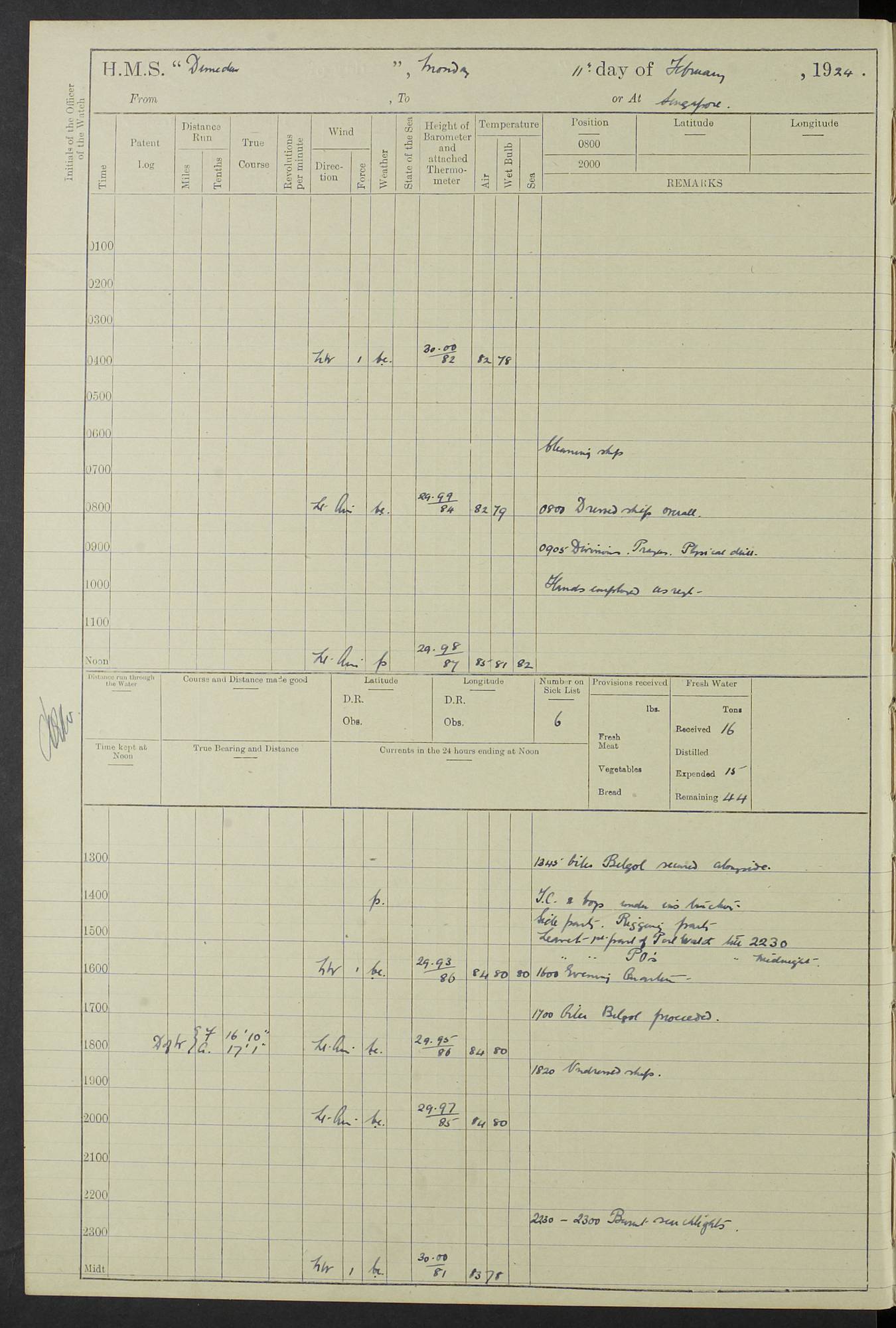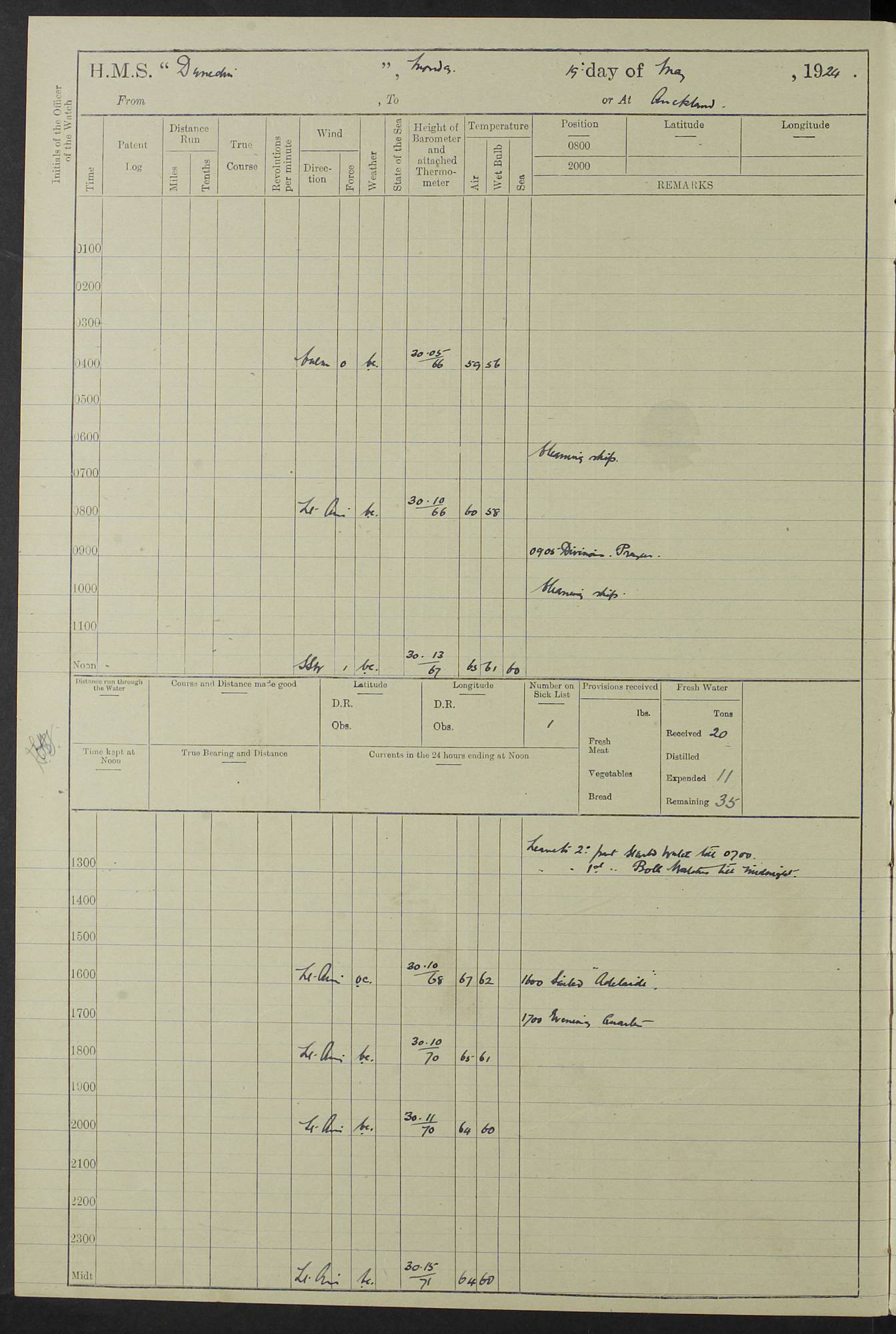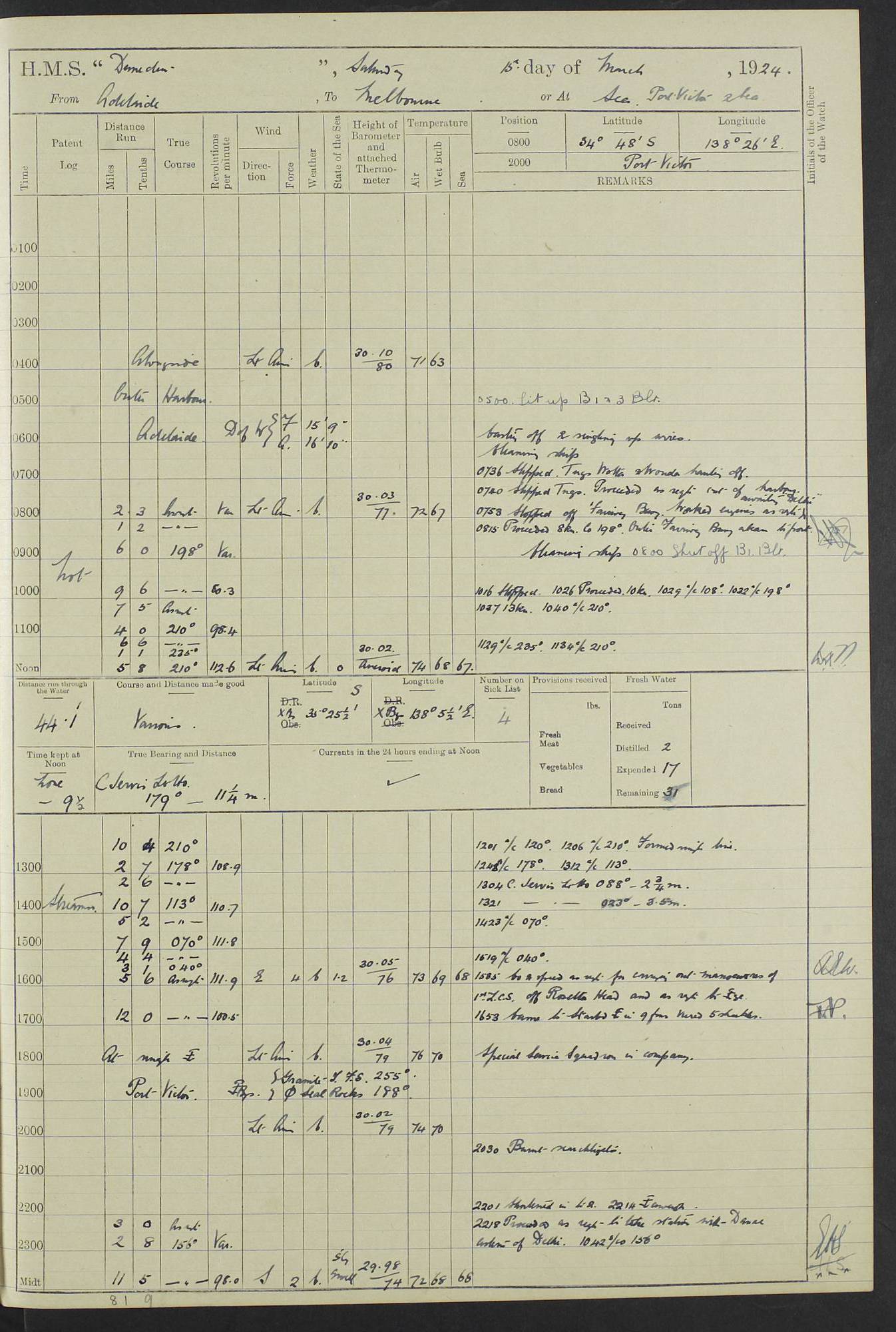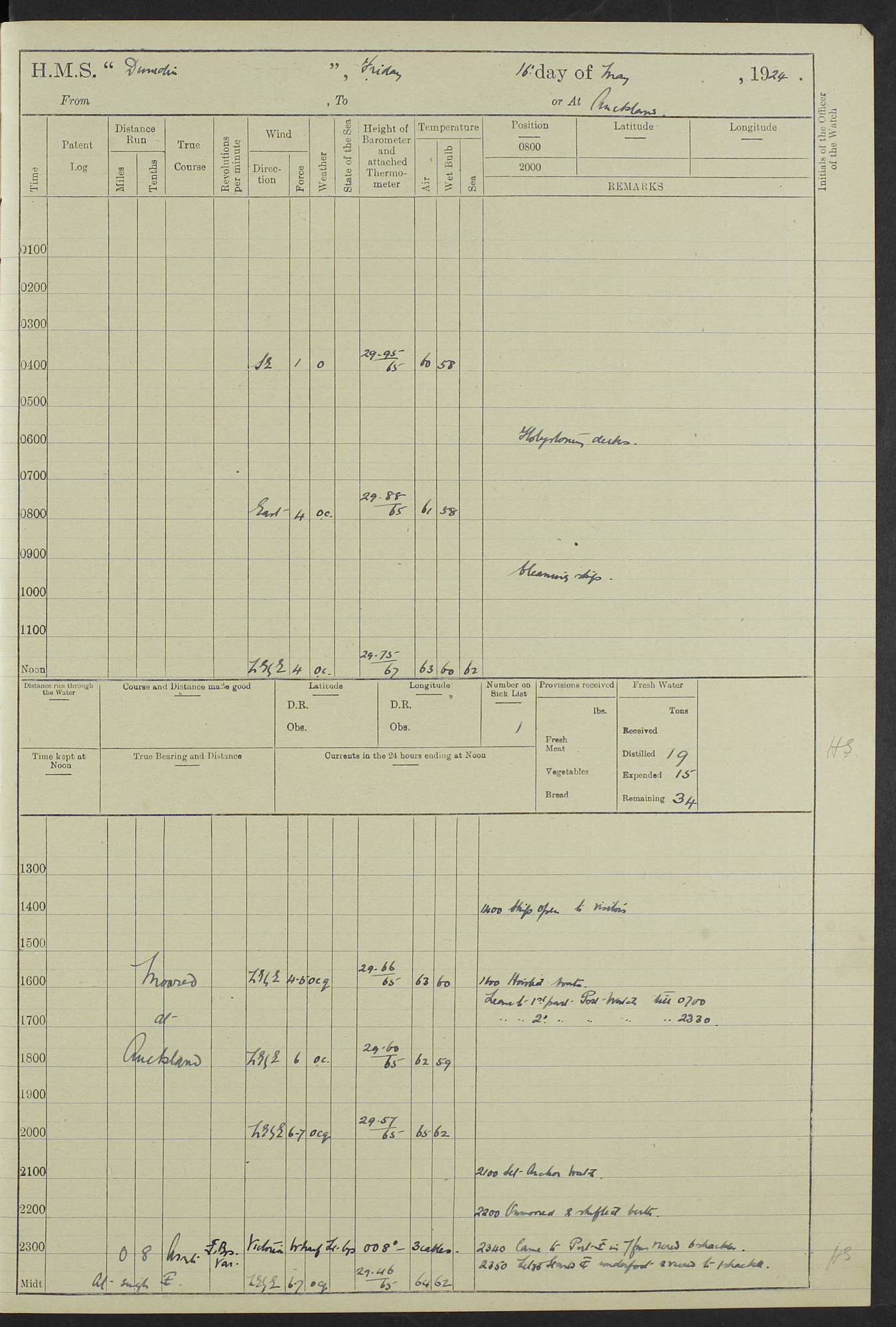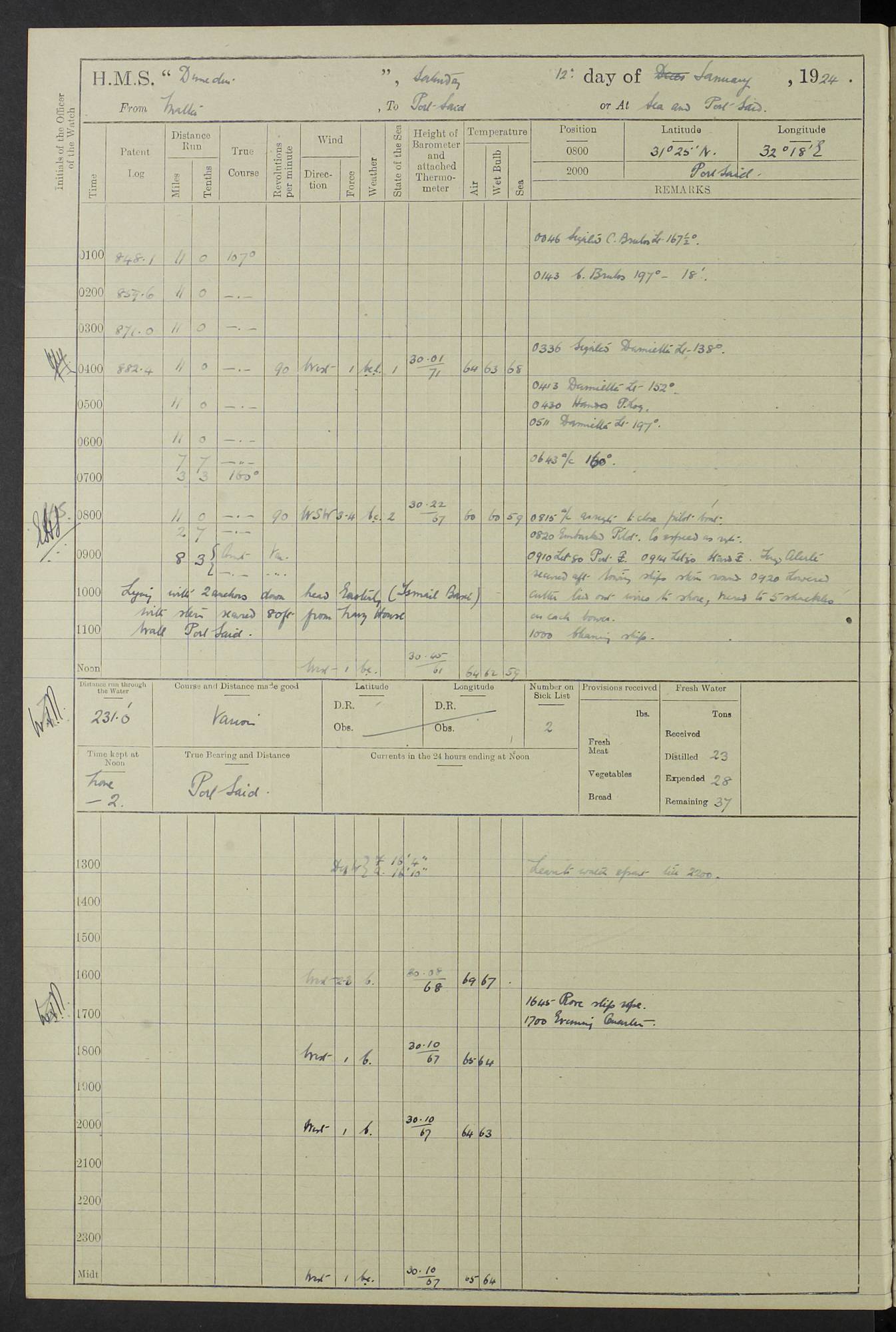 (Maps prepared using Journey Plotter, developed by Maikel. The Plots can only be approximate. They are made by joining-up positions on successive days, and sometimes positions are not given. There will therefore be occasions when the ship appears to have travelled overland) LOG BOOK – 23RD SEPTEMBER 1920 TO 13TH SEPTEMBER 1921 4caf8d9dcadfd3419703bde2: (http://oldweather.s3.amazonaws.com/ADM53-76345/ADM53-76345_0.jpg) Left front cover of Ship’s Log. 4caf8d9dcadfd3419703bde3: (http://oldweather.s3.amazonaws.com/ADM53-76345/ADM53-76345_1.jpg) Right front cover of Ship’s Log. 4caf8d97cadfd3419703bc6a: (http://oldweather.s3.amazonaws.com/ADM53-76345/ADM53-76345-002_0.jpg) 4caf8d97cadfd3419703bc6b: (http://oldweather.s3.amazonaws.com/ADM53-76345/ADM53-76345-002_1.jpg) 4caf8d97cadfd3419703bc6c: (http://oldweather.s3.amazonaws.com/ADM53-76345/ADM53-76345-003_0.jpg) 4caf8d97cadfd3419703bc6d: (http://oldweather.s3.amazonaws.com/ADM53-76345/ADM53-76345-003_1.jpg) 4caf8d97cadfd3419703bc6e: (http://oldweather.s3.amazonaws.com/ADM53-76345/ADM53-76345-004_0.jpg) Blank pages. 4caf8d97cadfd3419703bc6f: (http://oldweather.s3.amazonaws.com/ADM53-76345/ADM53-76345-004_1.jpg) S.- 321. See Articles 557, 619, 622, 924, 1025, 1026 and 1849 of the King’s Regulations, 1913. This Log is to be kept from the time the Ship is Commissioned until she is paid off; when it is to be transmitted as directed by the Admiralty Instructions. The Name and Address of the Officer to whom the acknowledgement of receipt should be sent by the Deputy Cashier in charge, Royal Victoria Yard, Deptford, is to be inserted here. Name: Commander’s Office. Address: H.M.S. Dunedin. c/o G.P.O. London. LOG of H.M.S. “Dunedin” Commanded by Captain C. Wrightson C.B.E. (till 31.3.21). Captain H.S. Monroe D.S.O. (from 31.3.21). FOR THE PERIOD Commencing: Thursday 23rd of September 1920. Ending: Tuesday 13th of September 1921. Tonnage (Displacement): 4,650 Extreme Length: 472ft 3 ins Extreme Breadth: 46 ft 0.3/8” Engines: Manufacturer: Messes R & W Hawthorn Leslie & Co Ltd. Newcastle on Tyne. I.H.P: 40.000 Forced Draught. Description: Turbine (Geared). When Fixed on Board: 1918 – 1919. Boilers: Manufacturer: Messes R & W Hawthorn Leslie & Co Ltd. Newcastle on Tyne. Description: Small tube Improved Yarrow. When made: 1918. When put in vessel: 1918. Paddle Wheels or Screw Propeller: Manufacturer: Manganese Bronze Co. Description: Solid 3 Blades Turbadium Bronze, Pitch 14 ft 3 in. General State of Repair: Satisfactory. R. Alison [?], Lieut Com (W) on paying off 30th August 1923. L. 8418/02. N.L. 15713/13. Where Built Sir W.G. Armstrong Whitworth & Co Ltd. N.L. 18227/18. Armstrong Naval Yard, High Walker, Newcastle on Tyne. Sta. 127/10. Commenced building November 1917, Launched 19 November 1918. N.L. 22782/19. Completed September 1919. 4caf8d98cadfd3419703bc70: (http://oldweather.s3.amazonaws.com/ADM53-76345/ADM53-76345-005_0.jpg) Directions (See King’s Regulations 1913, Articles 1025 and 1849). 1. King’s Regulations. 2. Figures to indicate the Force of the Wind. 3. Letters to denote the State of the Weather. 4. Scale of Fog Intensity. 5. Sea Disturbance Scale 4caf8d98cadfd3419703bc71: (http://oldweather.s3.amazonaws.com/ADM53-76345/ADM53-76345-005_1.jpg) Establishment of Ship’s Company Officers 23 Seamen 187 Boys 36 Marines 46 Engine-room Establishment 105 Other non-executive ratings 44 Total 441 ARMAMENT Position Forecastle: 6” Calibre XII on C.P. XIV mounting. Superstructure: Four 6” Calibre XII on C.P. XIV mountings. Superstructure: Two 3” QF Calibre High Angle mountings, Quarterdeck: 6” Calibre XII on C.P. XIV mountings. Torpedo Armaments Four above water 21” triple tubes. BAROMETER Mercurial or Aneroid: Mercurial. Name of Maker and number: J. Hitchins 101 A747. Height of cistern above sea: 13ft. Error of Mercurial Barometer: Nil at 30.00. Thermometers for Air Temperature. Position on Ship: On fore bridge. Whether in screen: Yes. Maker and No. Negretti & Zambra From: 7.10.19 To: Sept. 1921. Negretti & Zambra No. 10499 Negretti & Zambra No 10391 From: 7.10.19 To: Sept. 1921. Thermometer for Sea Temperature. A. Harper & Sons 7.10.19 POSITION OF STANDARD COMPASS. Manoeuvring Platform. (Fore bridge) BOATS Number of each carried: 1 x 30ft. motor boat. 2 x 32ft. cutters. 1 x 30ft gig. 2 x 27ft whalers. 2 x 16 ft dinghies. MISCELLANEOUS INFORMATION Draught of water with Bunkers full, and complete with provisions, Stores and water: Forward 16 ft 1 inch; Aft 16 ft 11 inches. Number of Tons necessary to increase draught 1 inch: 35.6. Number of Tons of Coal Carried: 16. Number of Tons of Oil Fuel carried: 1127. Quantity of Water Carried (a) For Boilers: 157 tons. (b) For Drinking: 56½ tons. LOGS FOR SEPTEMBER 1920 4caf8d98cadfd3419703bc72: (http://oldweather.s3.amazonaws.com/ADM53-76345/ADM53-76345-006_0.jpg) 23 September 1920 At Copenhagen. Lat 55.694, Long 12.603 4.00am: Signal books correct. am: Hands employed cleaning ship. 8.00am: Signal books correct. am: Sent coaling party to S.S. “Volo”. am: X & Y 6” guns crews at loader drill, remainder of hands employed as requisite. am: Coaling party returned. Noon: Signal books correct. 1.15pm: Sent coaling party to S.S. “Volo”. pm: 1 Rating joined ship from hospital. pm: Boys & training classes under instruction, remainder of hands employed as requisite. 3.00pm: U.S.S. “Gilmer” arrived. [Gilmer, U.S. Destroyer, Flush Decker, launched 18/7/19, Guns: 4 x 5”, 51 cal.,1 x 3”, 23 cal. AA, 12 x 21” TT’s in 4 triple deck mountings. Disp: 1,215 tons, SHP: 26,000 = 35 knots. Jane’s Fighting Ships 1919. Image]. 4.00pm: Signal books correct. pm: Coaling party returned. 8.00pm: Signal books correct. Midnight: Signal books correct. 4caf8d98cadfd3419703bc73: (http://oldweather.s3.amazonaws.com/ADM53-76345/ADM53-76345-006_1.jpg) 24 September 1920 At Copenhagen. Lat 55.694, Long 12.603 4.00am: Signal books correct. am: Hands employed cleaning ship. 6.15am: U.S.S. “Sh