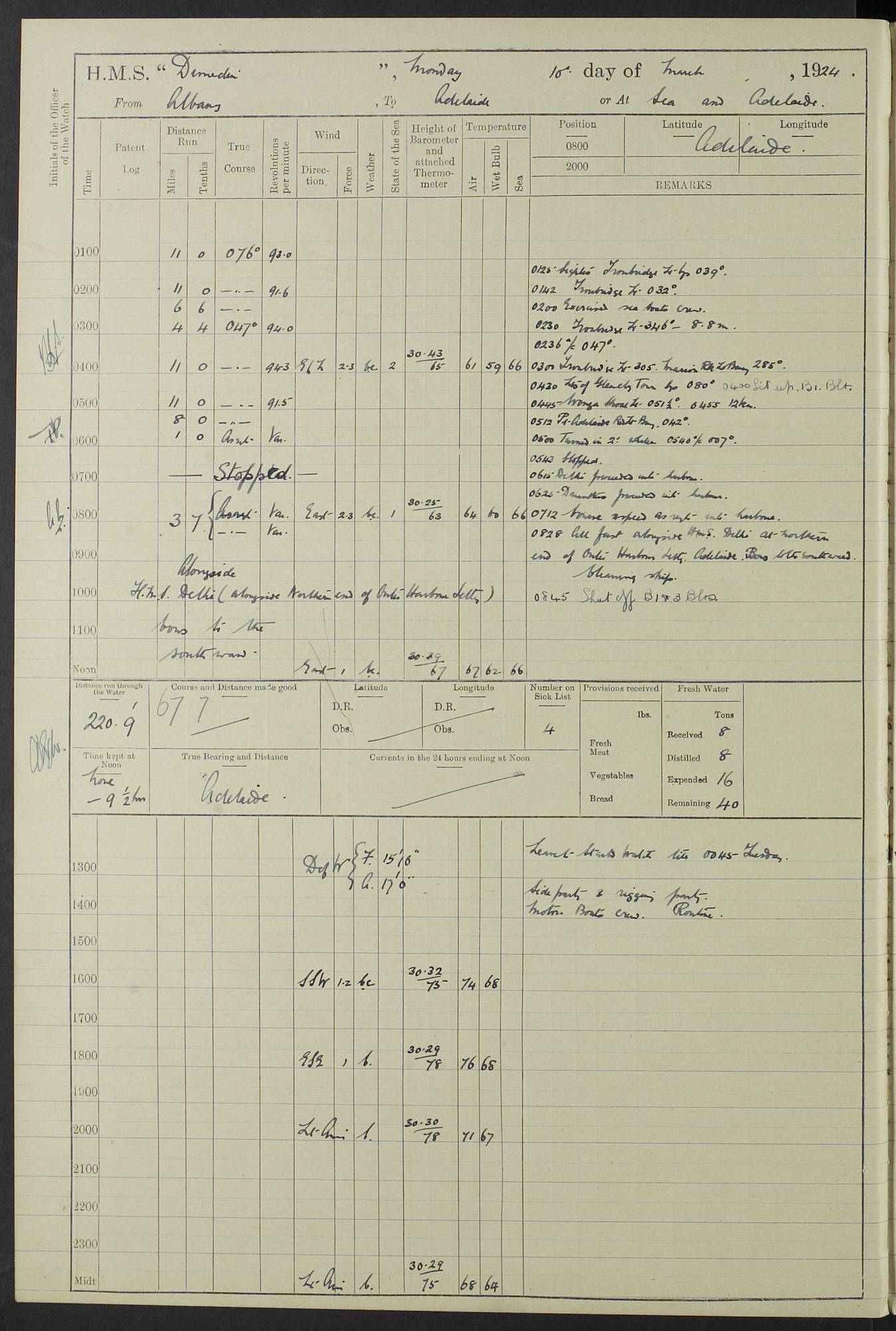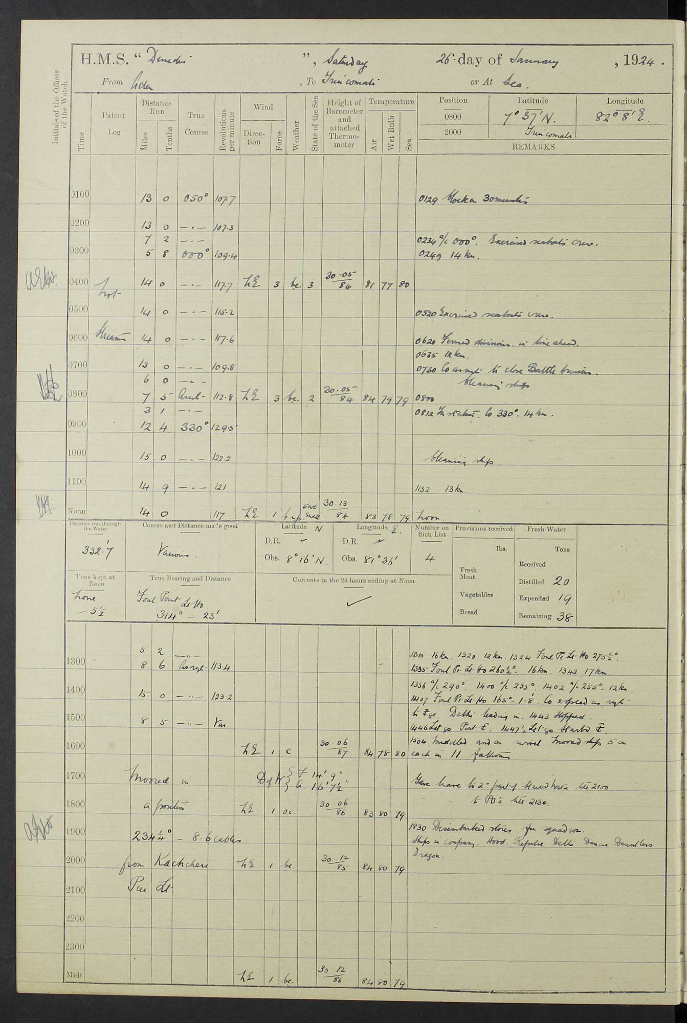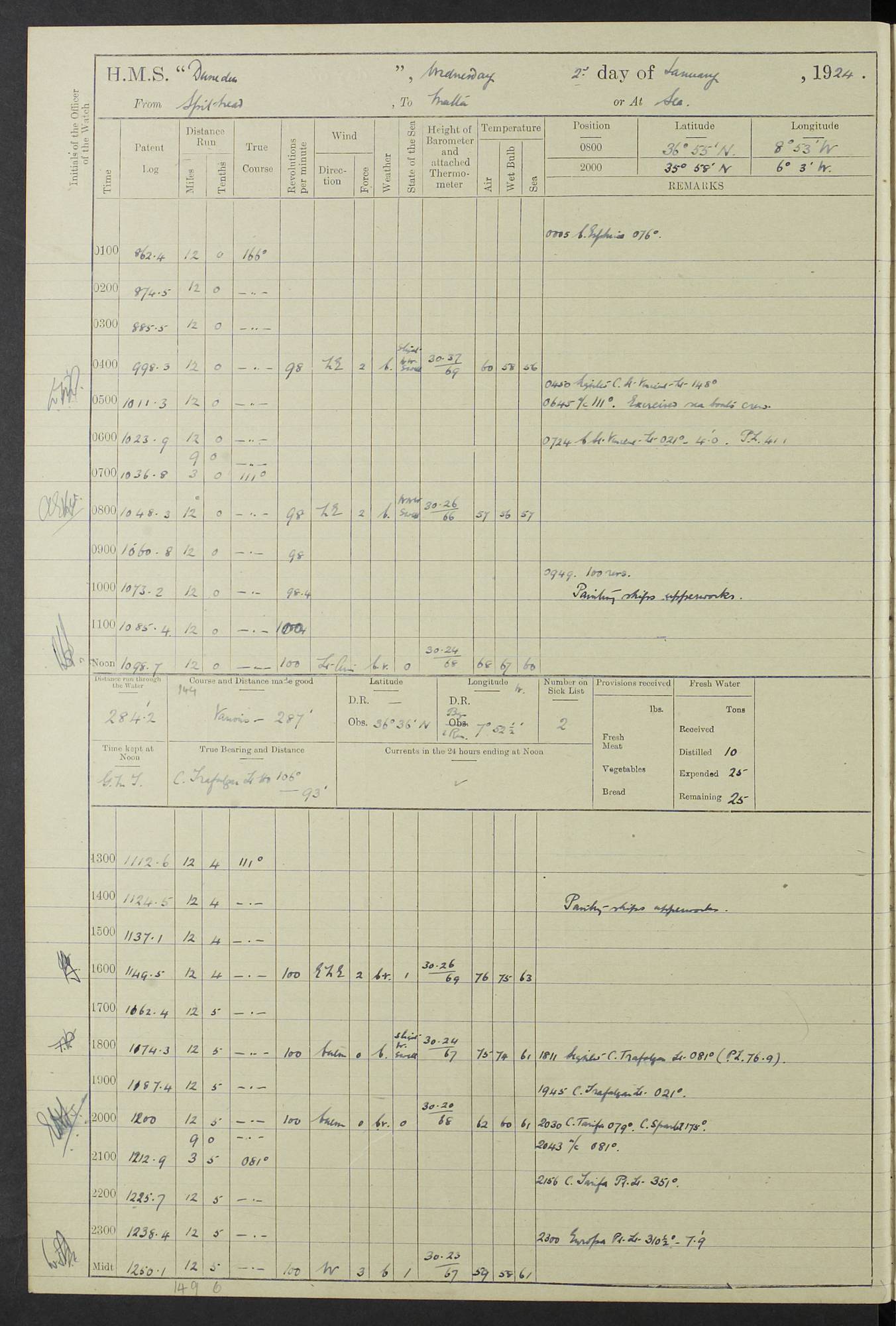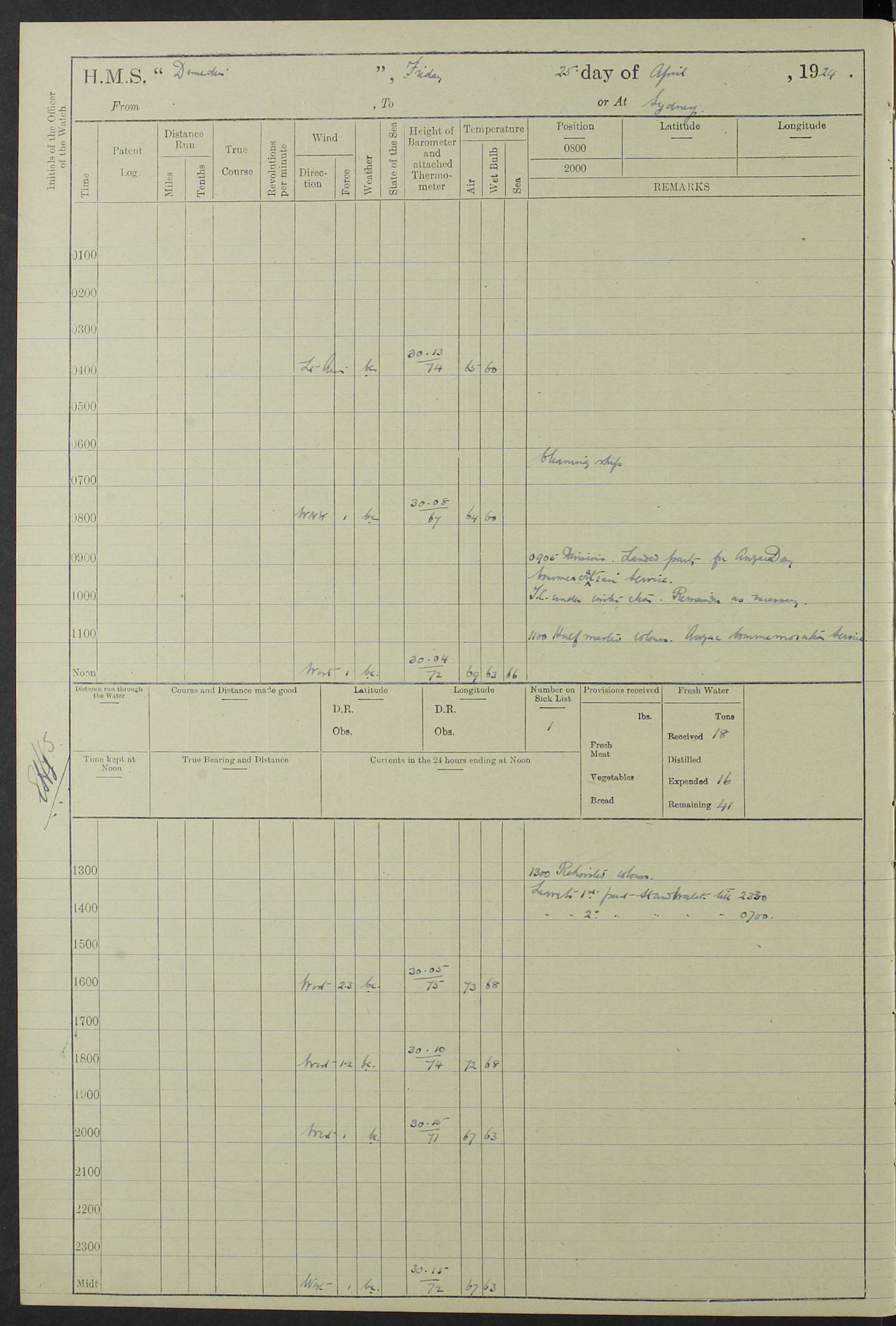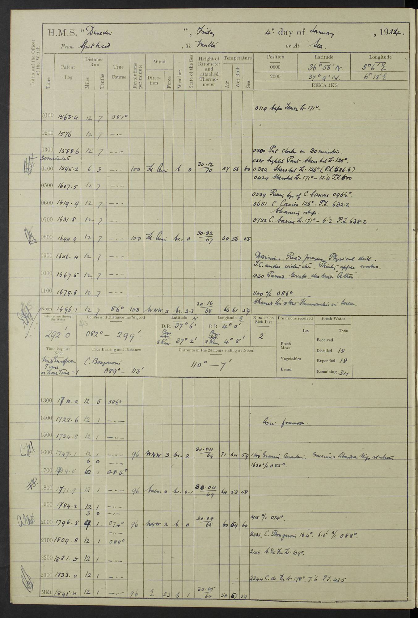 (Maps prepared using Journey Plotter, developed by Maikel. The Plots can only be approximate. They are made by joining-up positions on successive days, and sometimes positions are not given. There will therefore be occasions when the ship appears to have travelled overland) LOG BOOK – 23RD SEPTEMBER 1920 TO 13TH SEPTEMBER 1921 4caf8d9dcadfd3419703bde2: (http://oldweather.s3.amazonaws.com/ADM53-76345/ADM53-76345_0.jpg) Left front cover of Ship’s Log. 4caf8d9dcadfd3419703bde3: (http://oldweather.s3.amazonaws.com/ADM53-76345/ADM53-76345_1.jpg) Right front cover of Ship’s Log. 4caf8d97cadfd3419703bc6a: (http://oldweather.s3.amazonaws.com/ADM53-76345/ADM53-76345-002_0.jpg) 4caf8d97cadfd3419703bc6b: (http://oldweather.s3.amazonaws.com/ADM53-76345/ADM53-76345-002_1.jpg) 4caf8d97cadfd3419703bc6c: (http://oldweather.s3.amazonaws.com/ADM53-76345/ADM53-76345-003_0.jpg) 4caf8d97cadfd3419703bc6d: (http://oldweather.s3.amazonaws.com/ADM53-76345/ADM53-76345-003_1.jpg) 4caf8d97cadfd3419703bc6e: (http://oldweather.s3.amazonaws.com/ADM53-76345/ADM53-76345-004_0.jpg) Blank pages. 4caf8d97cadfd3419703bc6f: (http://oldweather.s3.amazonaws.com/ADM53-76345/ADM53-76345-004_1.jpg) S.- 321. See Articles 557, 619, 622, 924, 1025, 1026 and 1849 of the King’s Regulations, 1913. This Log is to be kept from the time the Ship is Commissioned until she is paid off; when it is to be transmitted as directed by the Admiralty Instructions. The Name and Address of the Officer to whom the acknowledgement of receipt should be sent by the Deputy Cashier in charge, Royal Victoria Yard, Deptford, is to be inserted here. Name: Commander’s Office. Address: H.M.S. Dunedin. c/o G.P.O. London. LOG of H.M.S. “Dunedin” Commanded by Captain C. Wrightson C.B.E. (till 31.3.21). Captain H.S. Monroe D.S.O. (from 31.3.21). FOR THE PERIOD Commencing: Thursday 23rd of September 1920. Ending: Tuesday 13th of September 1921. Tonnage (Displacement): 4,650 Extreme Length: 472ft 3 ins Extreme Breadth: 46 ft 0.3/8” Engines: Manufacturer: Messes R & W Hawthorn Leslie & Co Ltd. Newcastle on Tyne. I.H.P: 40.000 Forced Draught. Description: Turbine (Geared). When Fixed on Board: 1918 – 1919. Boilers: Manufacturer: Messes R & W Hawthorn Leslie & Co Ltd. Newcastle on Tyne. Description: Small tube Improved Yarrow. When made: 1918. When put in vessel: 1918. Paddle Wheels or Screw Propeller: Manufacturer: Manganese Bronze Co. Description: Solid 3 Blades Turbadium Bronze, Pitch 14 ft 3 in. General State of Repair: Satisfactory. R. Alison [?], Lieut Com (W) on paying off 30th August 1923. L. 8418/02. N.L. 15713/13. Where Built Sir W.G. Armstrong Whitworth & Co Ltd. N.L. 18227/18. Armstrong Naval Yard, High Walker, Newcastle on Tyne. Sta. 127/10. Commenced building November 1917, Launched 19 November 1918. N.L. 22782/19. Completed September 1919. 4caf8d98cadfd3419703bc70: (http://oldweather.s3.amazonaws.com/ADM53-76345/ADM53-76345-005_0.jpg) Directions (See King’s Regulations 1913, Articles 1025 and 1849). 1. King’s Regulations. 2. Figures to indicate the Force of the Wind. 3. Letters to denote the State of the Weather. 4. Scale of Fog Intensity. 5. Sea Disturbance Scale 4caf8d98cadfd3419703bc71: (http://oldweather.s3.amazonaws.com/ADM53-76345/ADM53-76345-005_1.jpg) Establishment of Ship’s Company Officers 23 Seamen 187 Boys 36 Marines 46 Engine-room Establishment 105 Other non-executive ratings 44 Total 441 ARMAMENT Position Forecastle: 6” Calibre XII on C.P. XIV mounting. Superstructure: Four 6” Calibre XII on C.P. XIV mountings. Superstructure: Two 3” QF Calibre High Angle mountings, Quarterdeck: 6” Calibre XII on C.P. XIV mountings. Torpedo Armaments Four above water 21” triple tubes. BAROMETER Mercurial or Aneroid: Mercurial. Name of Maker and number: J. Hitchins 101 A747. Height of cistern above sea: 13ft. Error of Mercurial Barometer: Nil at 30.00. Thermometers for Air Temperature. Position on Ship: On fore bridge. Whether in screen: Yes. Maker and No. Negretti & Zambra From: 7.10.19 To: Sept. 1921. Negretti & Zambra No. 10499 Negretti & Zambra No 10391 From: 7.10.19 To: Sept. 1921. Thermometer for Sea Temperature. A. Harper & Sons 7.10.19 POSITION OF STANDARD COMPASS. Manoeuvring Platform. (Fore bridge) BOATS Number of each carried: 1 x 30ft. motor boat. 2 x 32ft. cutters. 1 x 30ft gig. 2 x 27ft whalers. 2 x 16 ft dinghies. MISCELLANEOUS INFORMATION Draught of water with Bunkers full, and complete with provisions, Stores and water: Forward 16 ft 1 inch; Aft 16 ft 11 inches. Number of Tons necessary to increase draught 1 inch: 35.6. Number of Tons of Coal Carried: 16. Number of Tons of Oil Fuel carried: 1127. Quantity of Water Carried (a) For Boilers: 157 tons. (b) For Drinking: 56½ tons. LOGS FOR SEPTEMBER 1920 4caf8d98cadfd3419703bc72: (http://oldweather.s3.amazonaws.com/ADM53-76345/ADM53-76345-006_0.jpg) 23 September 1920 At Copenhagen. Lat 55.694, Long 12.603 4.00am: Signal books correct. am: Hands employed cleaning ship. 8.00am: Signal books correct. am: Sent coaling party to S.S. “Volo”. am: X & Y 6” guns crews at loader drill, remainder of hands employed as requisite. am: Coaling party returned. Noon: Signal books correct. 1.15pm: Sent coaling party to S.S. “Volo”. pm: 1 Rating joined ship from hospital. pm: Boys & training classes under instruction, remainder of hands employed as requisite. 3.00pm: U.S.S. “Gilmer” arrived. [Gilmer, U.S. Destroyer, Flush Decker, launched 18/7/19, Guns: 4 x 5”, 51 cal.,1 x 3”, 23 cal. AA, 12 x 21” TT’s in 4 triple deck mountings. Disp: 1,215 tons, SHP: 26,000 = 35 knots. Jane’s Fighting Ships 1919. Image]. 4.00pm: Signal books correct. pm: Coaling party returned. 8.00pm: Signal books correct. Midnight: Signal books correct. 4caf8d98cadfd3419703bc73: (http://oldweather.s3.amazonaws.com/ADM53-76345/ADM53-76345-006_1.jpg) 24 September 1920 At Copenhagen. Lat 55.694, Long 12.603 4.00am: Signal books correct. am: Hands employed cleaning ship. 6.15am: U.S.S. “Sh