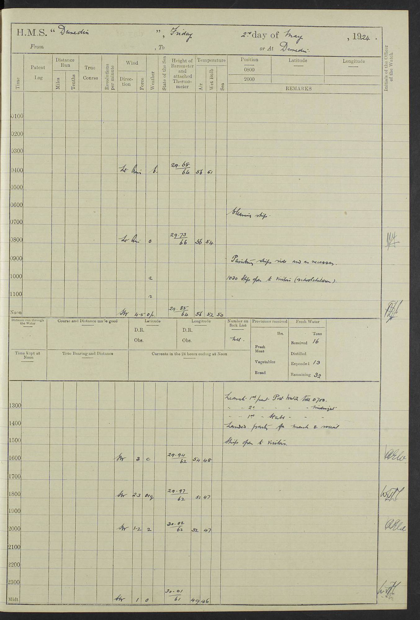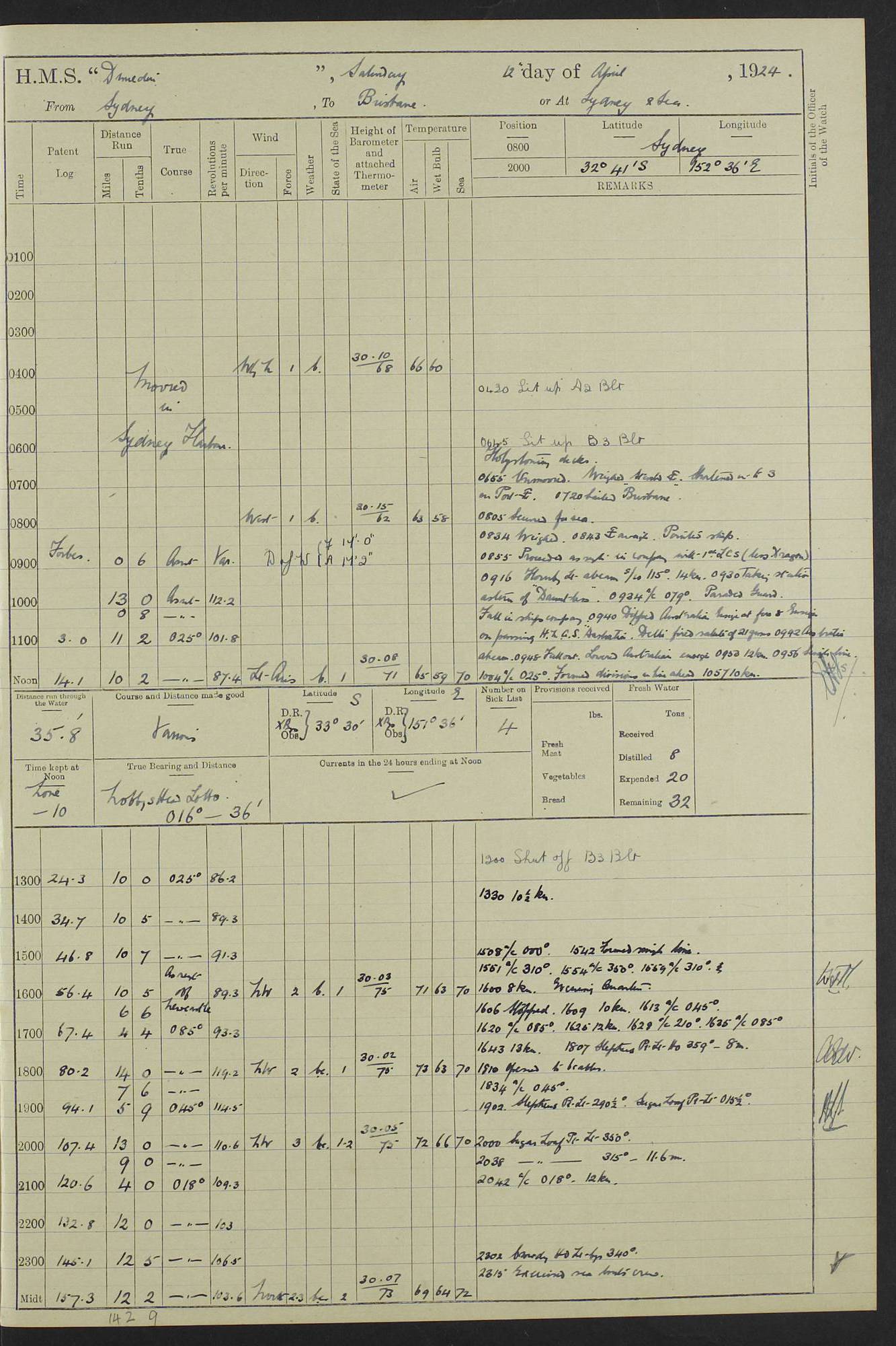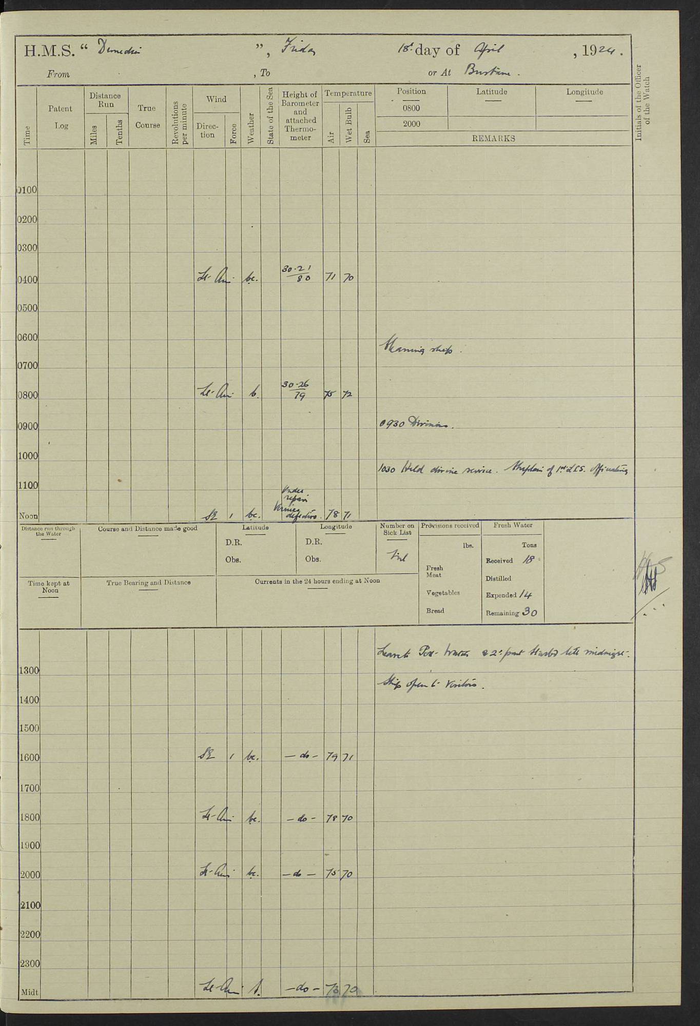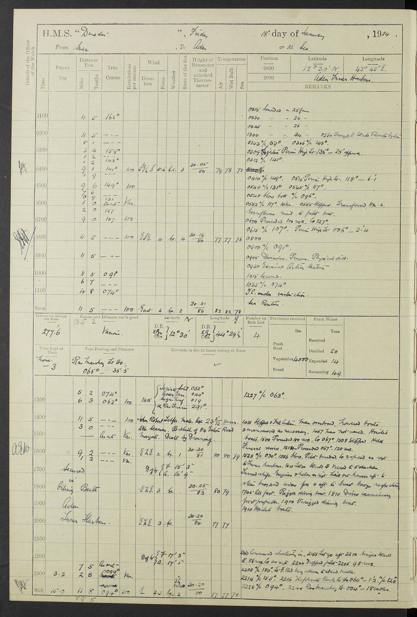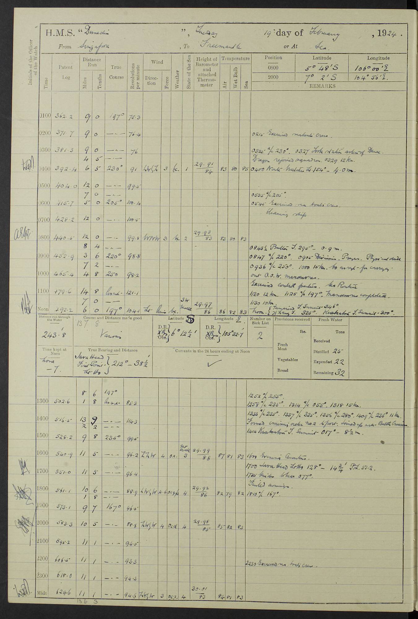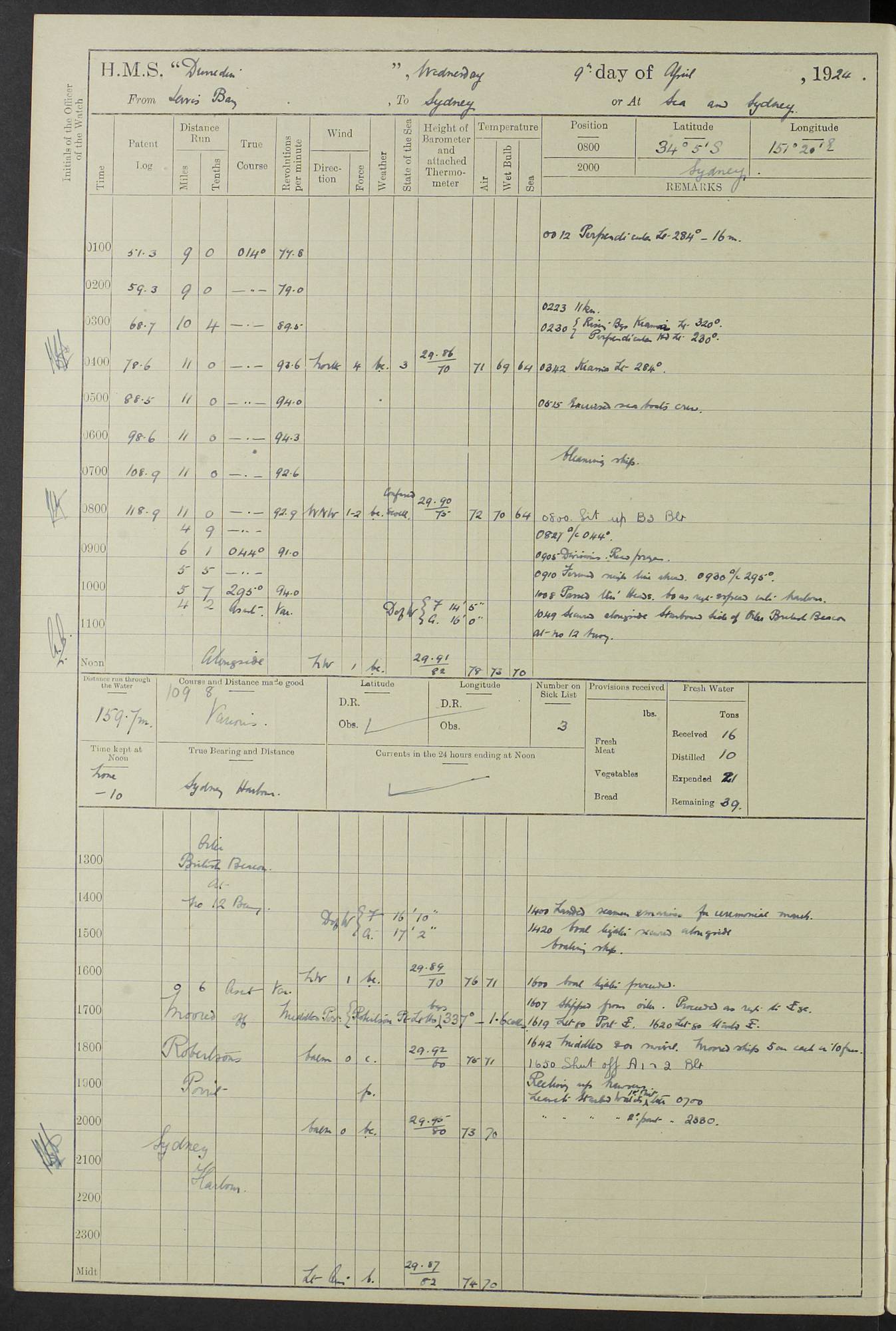 (Maps prepared using Journey Plotter, developed by Maikel. The Plots can only be approximate. They are made by joining-up positions on successive days, and sometimes positions are not given. There will therefore be occasions when the ship appears to have travelled overland) LOG BOOK – 23RD SEPTEMBER 1920 TO 13TH SEPTEMBER 1921 4caf8d9dcadfd3419703bde2: (http://oldweather.s3.amazonaws.com/ADM53-76345/ADM53-76345_0.jpg) Left front cover of Ship’s Log. 4caf8d9dcadfd3419703bde3: (http://oldweather.s3.amazonaws.com/ADM53-76345/ADM53-76345_1.jpg) Right front cover of Ship’s Log. 4caf8d97cadfd3419703bc6a: (http://oldweather.s3.amazonaws.com/ADM53-76345/ADM53-76345-002_0.jpg) 4caf8d97cadfd3419703bc6b: (http://oldweather.s3.amazonaws.com/ADM53-76345/ADM53-76345-002_1.jpg) 4caf8d97cadfd3419703bc6c: (http://oldweather.s3.amazonaws.com/ADM53-76345/ADM53-76345-003_0.jpg) 4caf8d97cadfd3419703bc6d: (http://oldweather.s3.amazonaws.com/ADM53-76345/ADM53-76345-003_1.jpg) 4caf8d97cadfd3419703bc6e: (http://oldweather.s3.amazonaws.com/ADM53-76345/ADM53-76345-004_0.jpg) Blank pages. 4caf8d97cadfd3419703bc6f: (http://oldweather.s3.amazonaws.com/ADM53-76345/ADM53-76345-004_1.jpg) S.- 321. See Articles 557, 619, 622, 924, 1025, 1026 and 1849 of the King’s Regulations, 1913. This Log is to be kept from the time the Ship is Commissioned until she is paid off; when it is to be transmitted as directed by the Admiralty Instructions. The Name and Address of the Officer to whom the acknowledgement of receipt should be sent by the Deputy Cashier in charge, Royal Victoria Yard, Deptford, is to be inserted here. Name: Commander’s Office. Address: H.M.S. Dunedin. c/o G.P.O. London. LOG of H.M.S. “Dunedin” Commanded by Captain C. Wrightson C.B.E. (till 31.3.21). Captain H.S. Monroe D.S.O. (from 31.3.21). FOR THE PERIOD Commencing: Thursday 23rd of September 1920. Ending: Tuesday 13th of September 1921. Tonnage (Displacement): 4,650 Extreme Length: 472ft 3 ins Extreme Breadth: 46 ft 0.3/8” Engines: Manufacturer: Messes R & W Hawthorn Leslie & Co Ltd. Newcastle on Tyne. I.H.P: 40.000 Forced Draught. Description: Turbine (Geared). When Fixed on Board: 1918 – 1919. Boilers: Manufacturer: Messes R & W Hawthorn Leslie & Co Ltd. Newcastle on Tyne. Description: Small tube Improved Yarrow. When made: 1918. When put in vessel: 1918. Paddle Wheels or Screw Propeller: Manufacturer: Manganese Bronze Co. Description: Solid 3 Blades Turbadium Bronze, Pitch 14 ft 3 in. General State of Repair: Satisfactory. R. Alison [?], Lieut Com (W) on paying off 30th August 1923. L. 8418/02. N.L. 15713/13. Where Built Sir W.G. Armstrong Whitworth & Co Ltd. N.L. 18227/18. Armstrong Naval Yard, High Walker, Newcastle on Tyne. Sta. 127/10. Commenced building November 1917, Launched 19 November 1918. N.L. 22782/19. Completed September 1919. 4caf8d98cadfd3419703bc70: (http://oldweather.s3.amazonaws.com/ADM53-76345/ADM53-76345-005_0.jpg) Directions (See King’s Regulations 1913, Articles 1025 and 1849). 1. King’s Regulations. 2. Figures to indicate the Force of the Wind. 3. Letters to denote the State of the Weather. 4. Scale of Fog Intensity. 5. Sea Disturbance Scale 4caf8d98cadfd3419703bc71: (http://oldweather.s3.amazonaws.com/ADM53-76345/ADM53-76345-005_1.jpg) Establishment of Ship’s Company Officers 23 Seamen 187 Boys 36 Marines 46 Engine-room Establishment 105 Other non-executive ratings 44 Total 441 ARMAMENT Position Forecastle: 6” Calibre XII on C.P. XIV mounting. Superstructure: Four 6” Calibre XII on C.P. XIV mountings. Superstructure: Two 3” QF Calibre High Angle mountings, Quarterdeck: 6” Calibre XII on C.P. XIV mountings. Torpedo Armaments Four above water 21” triple tubes. BAROMETER Mercurial or Aneroid: Mercurial. Name of Maker and number: J. Hitchins 101 A747. Height of cistern above sea: 13ft. Error of Mercurial Barometer: Nil at 30.00. Thermometers for Air Temperature. Position on Ship: On fore bridge. Whether in screen: Yes. Maker and No. Negretti & Zambra From: 7.10.19 To: Sept. 1921. Negretti & Zambra No. 10499 Negretti & Zambra No 10391 From: 7.10.19 To: Sept. 1921. Thermometer for Sea Temperature. A. Harper & Sons 7.10.19 POSITION OF STANDARD COMPASS. Manoeuvring Platform. (Fore bridge) BOATS Number of each carried: 1 x 30ft. motor boat. 2 x 32ft. cutters. 1 x 30ft gig. 2 x 27ft whalers. 2 x 16 ft dinghies. MISCELLANEOUS INFORMATION Draught of water with Bunkers full, and complete with provisions, Stores and water: Forward 16 ft 1 inch; Aft 16 ft 11 inches. Number of Tons necessary to increase draught 1 inch: 35.6. Number of Tons of Coal Carried: 16. Number of Tons of Oil Fuel carried: 1127. Quantity of Water Carried (a) For Boilers: 157 tons. (b) For Drinking: 56½ tons. LOGS FOR SEPTEMBER 1920 4caf8d98cadfd3419703bc72: (http://oldweather.s3.amazonaws.com/ADM53-76345/ADM53-76345-006_0.jpg) 23 September 1920 At Copenhagen. Lat 55.694, Long 12.603 4.00am: Signal books correct. am: Hands employed cleaning ship. 8.00am: Signal books correct. am: Sent coaling party to S.S. “Volo”. am: X & Y 6” guns crews at loader drill, remainder of hands employed as requisite. am: Coaling party returned. Noon: Signal books correct. 1.15pm: Sent coaling party to S.S. “Volo”. pm: 1 Rating joined ship from hospital. pm: Boys & training classes under instruction, remainder of hands employed as requisite. 3.00pm: U.S.S. “Gilmer” arrived. [Gilmer, U.S. Destroyer, Flush Decker, launched 18/7/19, Guns: 4 x 5”, 51 cal.,1 x 3”, 23 cal. AA, 12 x 21” TT’s in 4 triple deck mountings. Disp: 1,215 tons, SHP: 26,000 = 35 knots. Jane’s Fighting Ships 1919. Image]. 4.00pm: Signal books correct. pm: Coaling party returned. 8.00pm: Signal books correct. Midnight: Signal books correct. 4caf8d98cadfd3419703bc73: (http://oldweather.s3.amazonaws.com/ADM53-76345/ADM53-76345-006_1.jpg) 24 September 1920 At Copenhagen. Lat 55.694, Long 12.603 4.00am: Signal books correct. am: Hands employed cleaning ship. 6.15am: U.S.S. “Sh