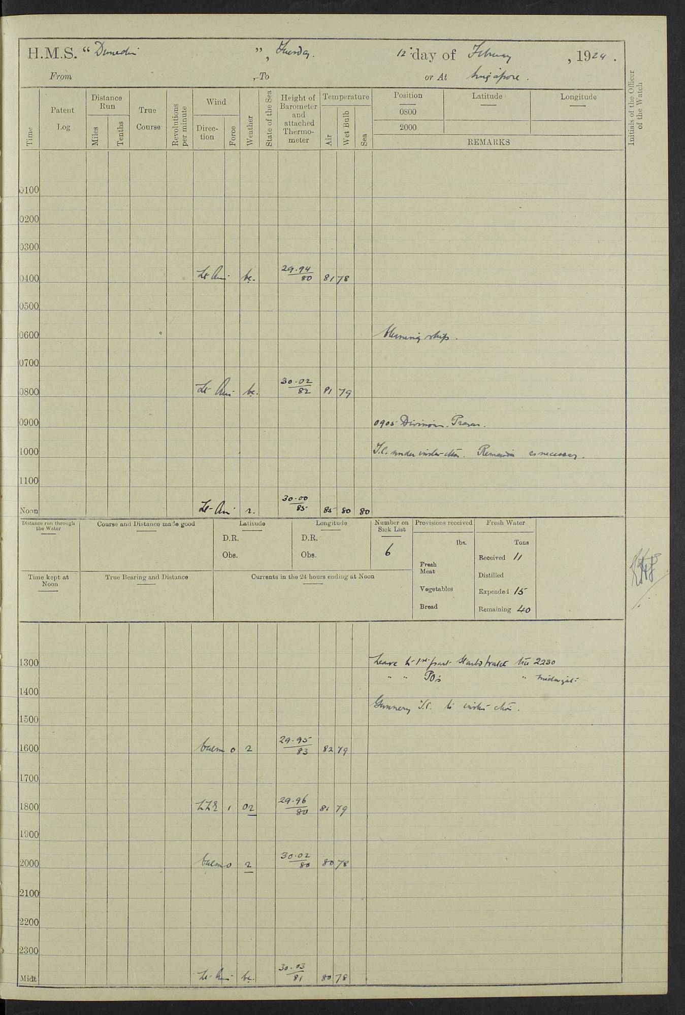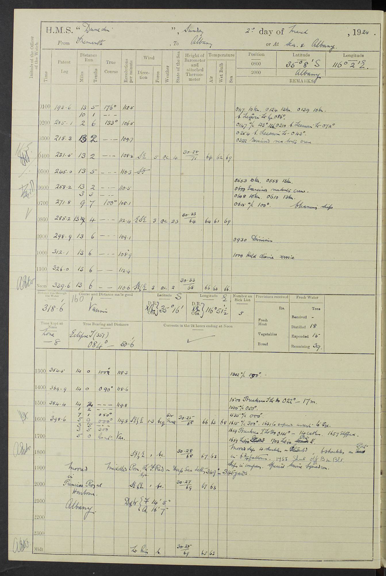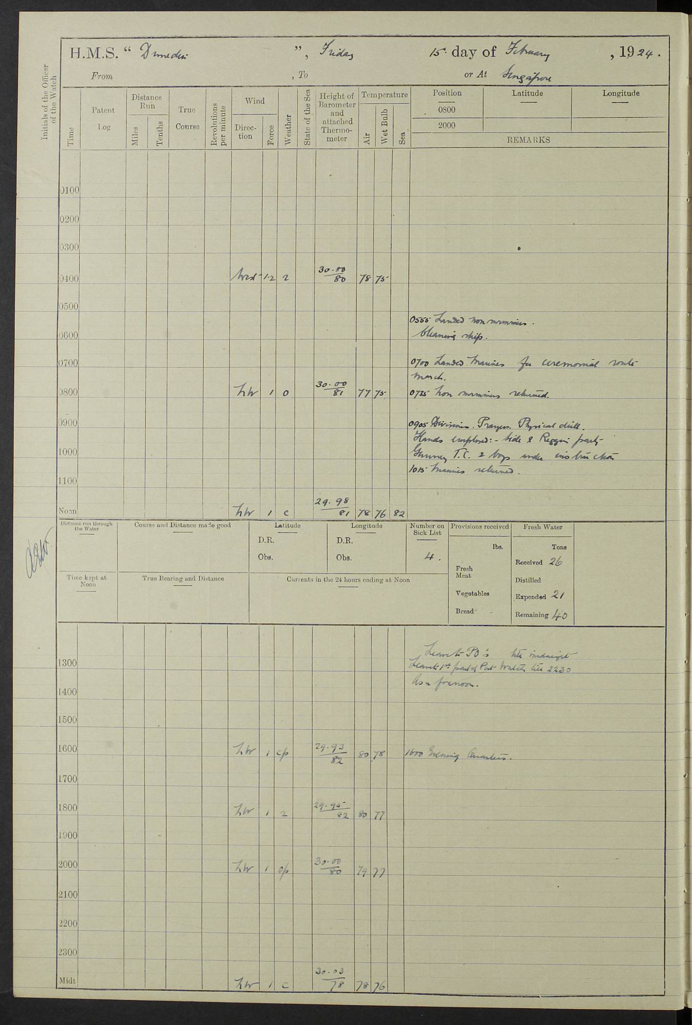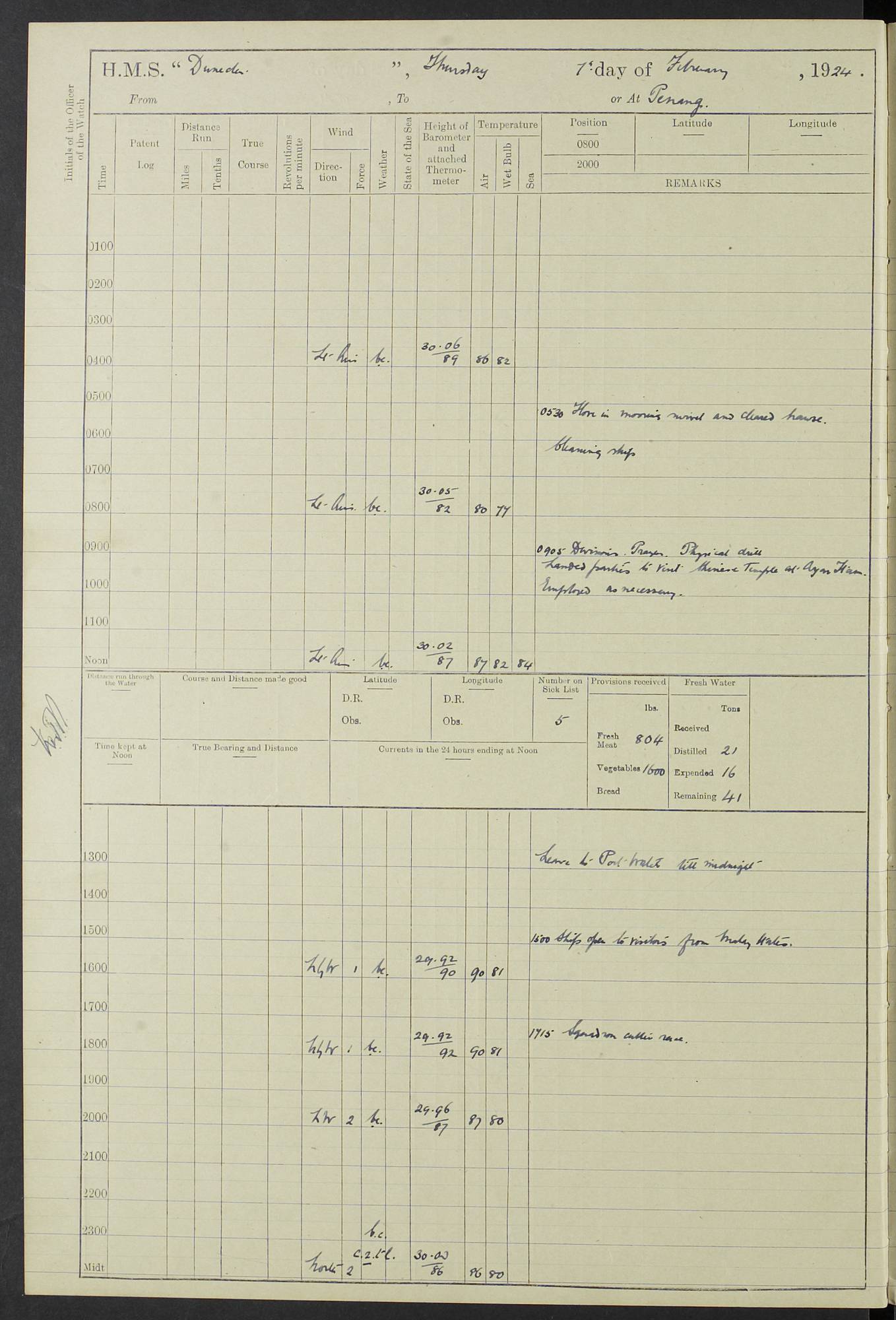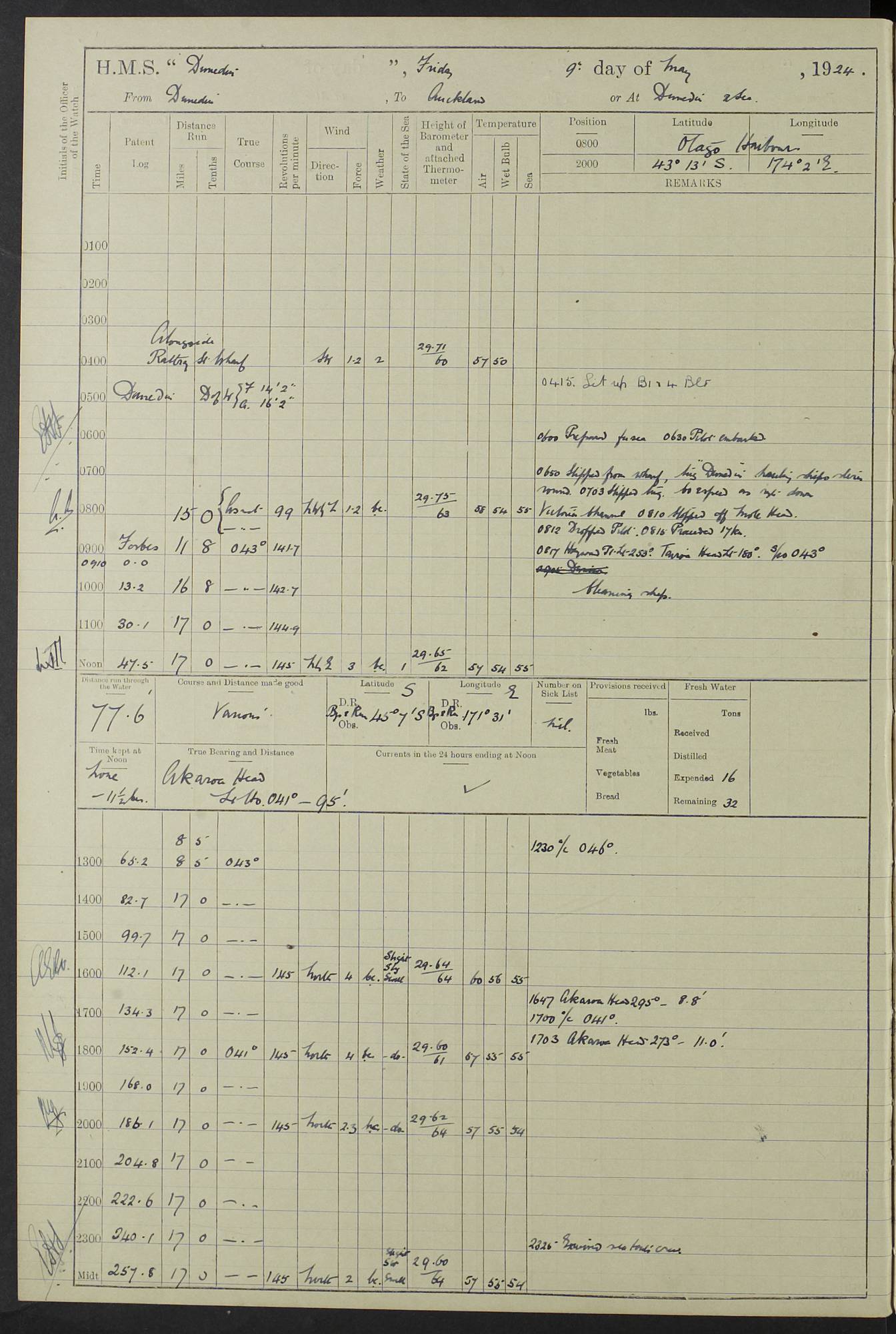 (Maps prepared using Journey Plotter, developed by Maikel. The Plots can only be approximate. They are made by joining-up positions on successive days, and sometimes positions are not given. There will therefore be occasions when the ship appears to have travelled overland) LOG BOOK – 23RD SEPTEMBER 1920 TO 13TH SEPTEMBER 1921 4caf8d9dcadfd3419703bde2: (http://oldweather.s3.amazonaws.com/ADM53-76345/ADM53-76345_0.jpg) Left front cover of Ship’s Log. 4caf8d9dcadfd3419703bde3: (http://oldweather.s3.amazonaws.com/ADM53-76345/ADM53-76345_1.jpg) Right front cover of Ship’s Log. 4caf8d97cadfd3419703bc6a: (http://oldweather.s3.amazonaws.com/ADM53-76345/ADM53-76345-002_0.jpg) 4caf8d97cadfd3419703bc6b: (http://oldweather.s3.amazonaws.com/ADM53-76345/ADM53-76345-002_1.jpg) 4caf8d97cadfd3419703bc6c: (http://oldweather.s3.amazonaws.com/ADM53-76345/ADM53-76345-003_0.jpg) 4caf8d97cadfd3419703bc6d: (http://oldweather.s3.amazonaws.com/ADM53-76345/ADM53-76345-003_1.jpg) 4caf8d97cadfd3419703bc6e: (http://oldweather.s3.amazonaws.com/ADM53-76345/ADM53-76345-004_0.jpg) Blank pages. 4caf8d97cadfd3419703bc6f: (http://oldweather.s3.amazonaws.com/ADM53-76345/ADM53-76345-004_1.jpg) S.- 321. See Articles 557, 619, 622, 924, 1025, 1026 and 1849 of the King’s Regulations, 1913. This Log is to be kept from the time the Ship is Commissioned until she is paid off; when it is to be transmitted as directed by the Admiralty Instructions. The Name and Address of the Officer to whom the acknowledgement of receipt should be sent by the Deputy Cashier in charge, Royal Victoria Yard, Deptford, is to be inserted here. Name: Commander’s Office. Address: H.M.S. Dunedin. c/o G.P.O. London. LOG of H.M.S. “Dunedin” Commanded by Captain C. Wrightson C.B.E. (till 31.3.21). Captain H.S. Monroe D.S.O. (from 31.3.21). FOR THE PERIOD Commencing: Thursday 23rd of September 1920. Ending: Tuesday 13th of September 1921. Tonnage (Displacement): 4,650 Extreme Length: 472ft 3 ins Extreme Breadth: 46 ft 0.3/8” Engines: Manufacturer: Messes R & W Hawthorn Leslie & Co Ltd. Newcastle on Tyne. I.H.P: 40.000 Forced Draught. Description: Turbine (Geared). When Fixed on Board: 1918 – 1919. Boilers: Manufacturer: Messes R & W Hawthorn Leslie & Co Ltd. Newcastle on Tyne. Description: Small tube Improved Yarrow. When made: 1918. When put in vessel: 1918. Paddle Wheels or Screw Propeller: Manufacturer: Manganese Bronze Co. Description: Solid 3 Blades Turbadium Bronze, Pitch 14 ft 3 in. General State of Repair: Satisfactory. R. Alison [?], Lieut Com (W) on paying off 30th August 1923. L. 8418/02. N.L. 15713/13. Where Built Sir W.G. Armstrong Whitworth & Co Ltd. N.L. 18227/18. Armstrong Naval Yard, High Walker, Newcastle on Tyne. Sta. 127/10. Commenced building November 1917, Launched 19 November 1918. N.L. 22782/19. Completed September 1919. 4caf8d98cadfd3419703bc70: (http://oldweather.s3.amazonaws.com/ADM53-76345/ADM53-76345-005_0.jpg) Directions (See King’s Regulations 1913, Articles 1025 and 1849). 1. King’s Regulations. 2. Figures to indicate the Force of the Wind. 3. Letters to denote the State of the Weather. 4. Scale of Fog Intensity. 5. Sea Disturbance Scale 4caf8d98cadfd3419703bc71: (http://oldweather.s3.amazonaws.com/ADM53-76345/ADM53-76345-005_1.jpg) Establishment of Ship’s Company Officers 23 Seamen 187 Boys 36 Marines 46 Engine-room Establishment 105 Other non-executive ratings 44 Total 441 ARMAMENT Position Forecastle: 6” Calibre XII on C.P. XIV mounting. Superstructure: Four 6” Calibre XII on C.P. XIV mountings. Superstructure: Two 3” QF Calibre High Angle mountings, Quarterdeck: 6” Calibre XII on C.P. XIV mountings. Torpedo Armaments Four above water 21” triple tubes. BAROMETER Mercurial or Aneroid: Mercurial. Name of Maker and number: J. Hitchins 101 A747. Height of cistern above sea: 13ft. Error of Mercurial Barometer: Nil at 30.00. Thermometers for Air Temperature. Position on Ship: On fore bridge. Whether in screen: Yes. Maker and No. Negretti & Zambra From: 7.10.19 To: Sept. 1921. Negretti & Zambra No. 10499 Negretti & Zambra No 10391 From: 7.10.19 To: Sept. 1921. Thermometer for Sea Temperature. A. Harper & Sons 7.10.19 POSITION OF STANDARD COMPASS. Manoeuvring Platform. (Fore bridge) BOATS Number of each carried: 1 x 30ft. motor boat. 2 x 32ft. cutters. 1 x 30ft gig. 2 x 27ft whalers. 2 x 16 ft dinghies. MISCELLANEOUS INFORMATION Draught of water with Bunkers full, and complete with provisions, Stores and water: Forward 16 ft 1 inch; Aft 16 ft 11 inches. Number of Tons necessary to increase draught 1 inch: 35.6. Number of Tons of Coal Carried: 16. Number of Tons of Oil Fuel carried: 1127. Quantity of Water Carried (a) For Boilers: 157 tons. (b) For Drinking: 56½ tons. LOGS FOR SEPTEMBER 1920 4caf8d98cadfd3419703bc72: (http://oldweather.s3.amazonaws.com/ADM53-76345/ADM53-76345-006_0.jpg) 23 September 1920 At Copenhagen. Lat 55.694, Long 12.603 4.00am: Signal books correct. am: Hands employed cleaning ship. 8.00am: Signal books correct. am: Sent coaling party to S.S. “Volo”. am: X & Y 6” guns crews at loader drill, remainder of hands employed as requisite. am: Coaling party returned. Noon: Signal books correct. 1.15pm: Sent coaling party to S.S. “Volo”. pm: 1 Rating joined ship from hospital. pm: Boys & training classes under instruction, remainder of hands employed as requisite. 3.00pm: U.S.S. “Gilmer” arrived. [Gilmer, U.S. Destroyer, Flush Decker, launched 18/7/19, Guns: 4 x 5”, 51 cal.,1 x 3”, 23 cal. AA, 12 x 21” TT’s in 4 triple deck mountings. Disp: 1,215 tons, SHP: 26,000 = 35 knots. Jane’s Fighting Ships 1919. Image]. 4.00pm: Signal books correct. pm: Coaling party returned. 8.00pm: Signal books correct. Midnight: Signal books correct. 4caf8d98cadfd3419703bc73: (http://oldweather.s3.amazonaws.com/ADM53-76345/ADM53-76345-006_1.jpg) 24 September 1920 At Copenhagen. Lat 55.694, Long 12.603 4.00am: Signal books correct. am: Hands employed cleaning ship. 6.15am: U.S.S. “Sh
