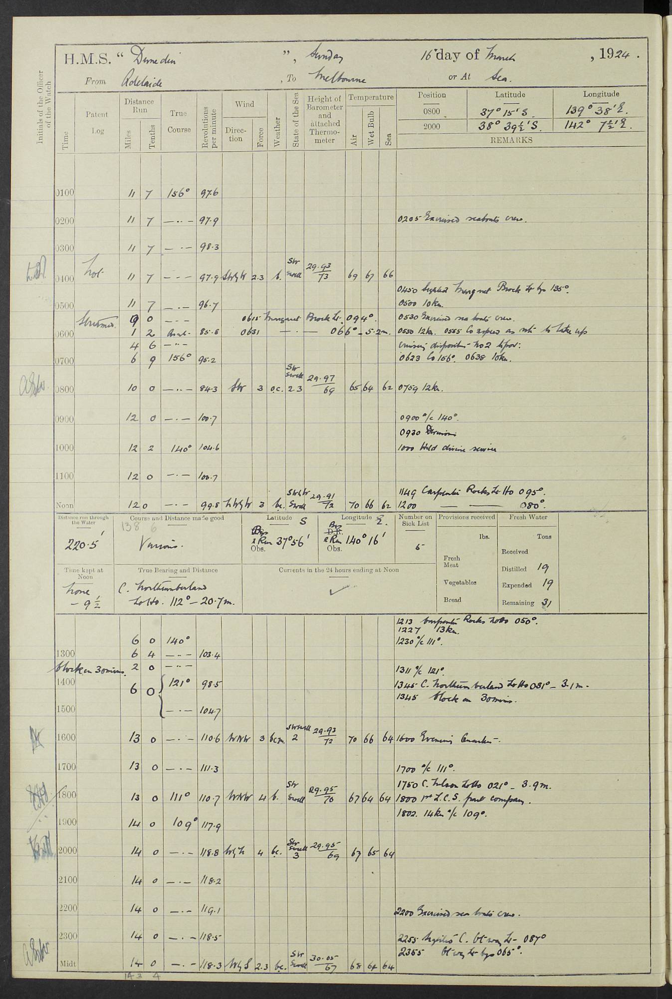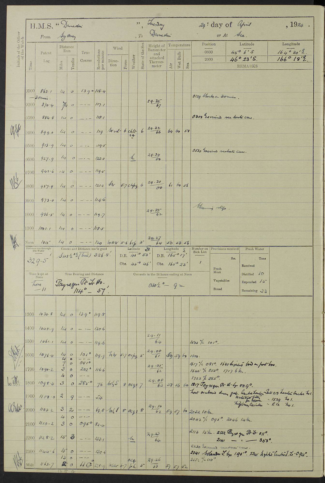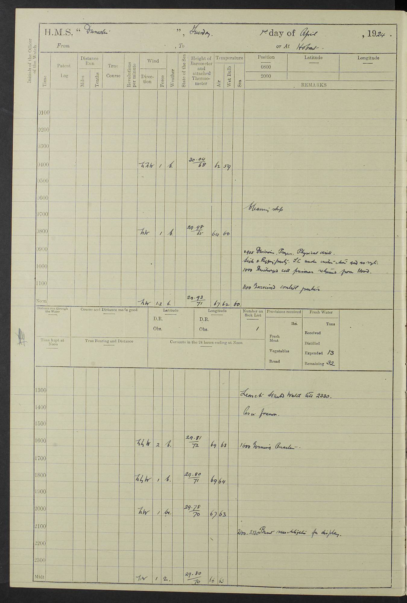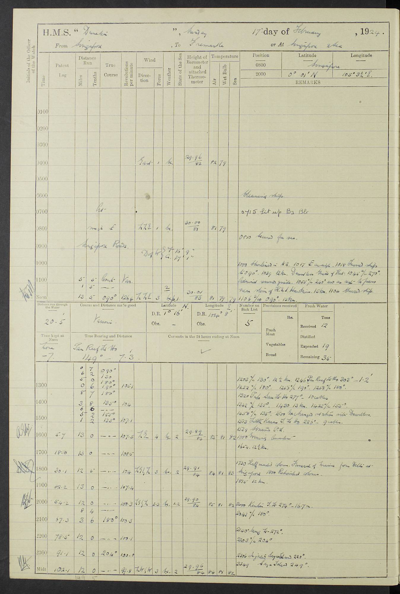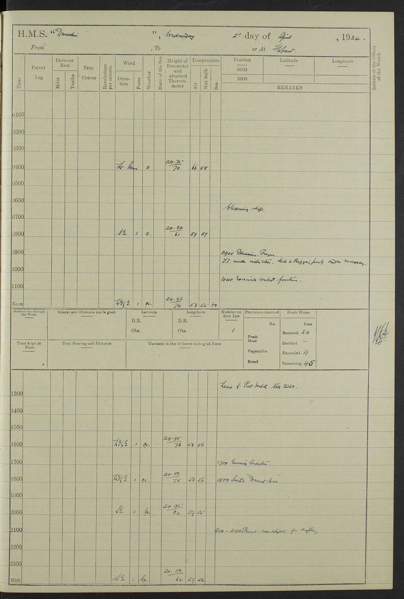 (Maps prepared using Journey Plotter, developed by Maikel. The Plots can only be approximate. They are made by joining-up positions on successive days, and sometimes positions are not given. There will therefore be occasions when the ship appears to have travelled overland) LOG BOOK – 23RD SEPTEMBER 1920 TO 13TH SEPTEMBER 1921 4caf8d9dcadfd3419703bde2: (http://oldweather.s3.amazonaws.com/ADM53-76345/ADM53-76345_0.jpg) Left front cover of Ship’s Log. 4caf8d9dcadfd3419703bde3: (http://oldweather.s3.amazonaws.com/ADM53-76345/ADM53-76345_1.jpg) Right front cover of Ship’s Log. 4caf8d97cadfd3419703bc6a: (http://oldweather.s3.amazonaws.com/ADM53-76345/ADM53-76345-002_0.jpg) 4caf8d97cadfd3419703bc6b: (http://oldweather.s3.amazonaws.com/ADM53-76345/ADM53-76345-002_1.jpg) 4caf8d97cadfd3419703bc6c: (http://oldweather.s3.amazonaws.com/ADM53-76345/ADM53-76345-003_0.jpg) 4caf8d97cadfd3419703bc6d: (http://oldweather.s3.amazonaws.com/ADM53-76345/ADM53-76345-003_1.jpg) 4caf8d97cadfd3419703bc6e: (http://oldweather.s3.amazonaws.com/ADM53-76345/ADM53-76345-004_0.jpg) Blank pages. 4caf8d97cadfd3419703bc6f: (http://oldweather.s3.amazonaws.com/ADM53-76345/ADM53-76345-004_1.jpg) S.- 321. See Articles 557, 619, 622, 924, 1025, 1026 and 1849 of the King’s Regulations, 1913. This Log is to be kept from the time the Ship is Commissioned until she is paid off; when it is to be transmitted as directed by the Admiralty Instructions. The Name and Address of the Officer to whom the acknowledgement of receipt should be sent by the Deputy Cashier in charge, Royal Victoria Yard, Deptford, is to be inserted here. Name: Commander’s Office. Address: H.M.S. Dunedin. c/o G.P.O. London. LOG of H.M.S. “Dunedin” Commanded by Captain C. Wrightson C.B.E. (till 31.3.21). Captain H.S. Monroe D.S.O. (from 31.3.21). FOR THE PERIOD Commencing: Thursday 23rd of September 1920. Ending: Tuesday 13th of September 1921. Tonnage (Displacement): 4,650 Extreme Length: 472ft 3 ins Extreme Breadth: 46 ft 0.3/8” Engines: Manufacturer: Messes R & W Hawthorn Leslie & Co Ltd. Newcastle on Tyne. I.H.P: 40.000 Forced Draught. Description: Turbine (Geared). When Fixed on Board: 1918 – 1919. Boilers: Manufacturer: Messes R & W Hawthorn Leslie & Co Ltd. Newcastle on Tyne. Description: Small tube Improved Yarrow. When made: 1918. When put in vessel: 1918. Paddle Wheels or Screw Propeller: Manufacturer: Manganese Bronze Co. Description: Solid 3 Blades Turbadium Bronze, Pitch 14 ft 3 in. General State of Repair: Satisfactory. R. Alison [?], Lieut Com (W) on paying off 30th August 1923. L. 8418/02. N.L. 15713/13. Where Built Sir W.G. Armstrong Whitworth & Co Ltd. N.L. 18227/18. Armstrong Naval Yard, High Walker, Newcastle on Tyne. Sta. 127/10. Commenced building November 1917, Launched 19 November 1918. N.L. 22782/19. Completed September 1919. 4caf8d98cadfd3419703bc70: (http://oldweather.s3.amazonaws.com/ADM53-76345/ADM53-76345-005_0.jpg) Directions (See King’s Regulations 1913, Articles 1025 and 1849). 1. King’s Regulations. 2. Figures to indicate the Force of the Wind. 3. Letters to denote the State of the Weather. 4. Scale of Fog Intensity. 5. Sea Disturbance Scale 4caf8d98cadfd3419703bc71: (http://oldweather.s3.amazonaws.com/ADM53-76345/ADM53-76345-005_1.jpg) Establishment of Ship’s Company Officers 23 Seamen 187 Boys 36 Marines 46 Engine-room Establishment 105 Other non-executive ratings 44 Total 441 ARMAMENT Position Forecastle: 6” Calibre XII on C.P. XIV mounting. Superstructure: Four 6” Calibre XII on C.P. XIV mountings. Superstructure: Two 3” QF Calibre High Angle mountings, Quarterdeck: 6” Calibre XII on C.P. XIV mountings. Torpedo Armaments Four above water 21” triple tubes. BAROMETER Mercurial or Aneroid: Mercurial. Name of Maker and number: J. Hitchins 101 A747. Height of cistern above sea: 13ft. Error of Mercurial Barometer: Nil at 30.00. Thermometers for Air Temperature. Position on Ship: On fore bridge. Whether in screen: Yes. Maker and No. Negretti & Zambra From: 7.10.19 To: Sept. 1921. Negretti & Zambra No. 10499 Negretti & Zambra No 10391 From: 7.10.19 To: Sept. 1921. Thermometer for Sea Temperature. A. Harper & Sons 7.10.19 POSITION OF STANDARD COMPASS. Manoeuvring Platform. (Fore bridge) BOATS Number of each carried: 1 x 30ft. motor boat. 2 x 32ft. cutters. 1 x 30ft gig. 2 x 27ft whalers. 2 x 16 ft dinghies. MISCELLANEOUS INFORMATION Draught of water with Bunkers full, and complete with provisions, Stores and water: Forward 16 ft 1 inch; Aft 16 ft 11 inches. Number of Tons necessary to increase draught 1 inch: 35.6. Number of Tons of Coal Carried: 16. Number of Tons of Oil Fuel carried: 1127. Quantity of Water Carried (a) For Boilers: 157 tons. (b) For Drinking: 56½ tons. LOGS FOR SEPTEMBER 1920 4caf8d98cadfd3419703bc72: (http://oldweather.s3.amazonaws.com/ADM53-76345/ADM53-76345-006_0.jpg) 23 September 1920 At Copenhagen. Lat 55.694, Long 12.603 4.00am: Signal books correct. am: Hands employed cleaning ship. 8.00am: Signal books correct. am: Sent coaling party to S.S. “Volo”. am: X & Y 6” guns crews at loader drill, remainder of hands employed as requisite. am: Coaling party returned. Noon: Signal books correct. 1.15pm: Sent coaling party to S.S. “Volo”. pm: 1 Rating joined ship from hospital. pm: Boys & training classes under instruction, remainder of hands employed as requisite. 3.00pm: U.S.S. “Gilmer” arrived. [Gilmer, U.S. Destroyer, Flush Decker, launched 18/7/19, Guns: 4 x 5”, 51 cal.,1 x 3”, 23 cal. AA, 12 x 21” TT’s in 4 triple deck mountings. Disp: 1,215 tons, SHP: 26,000 = 35 knots. Jane’s Fighting Ships 1919. Image]. 4.00pm: Signal books correct. pm: Coaling party returned. 8.00pm: Signal books correct. Midnight: Signal books correct. 4caf8d98cadfd3419703bc73: (http://oldweather.s3.amazonaws.com/ADM53-76345/ADM53-76345-006_1.jpg) 24 September 1920 At Copenhagen. Lat 55.694, Long 12.603 4.00am: Signal books correct. am: Hands employed cleaning ship. 6.15am: U.S.S. “Sh
