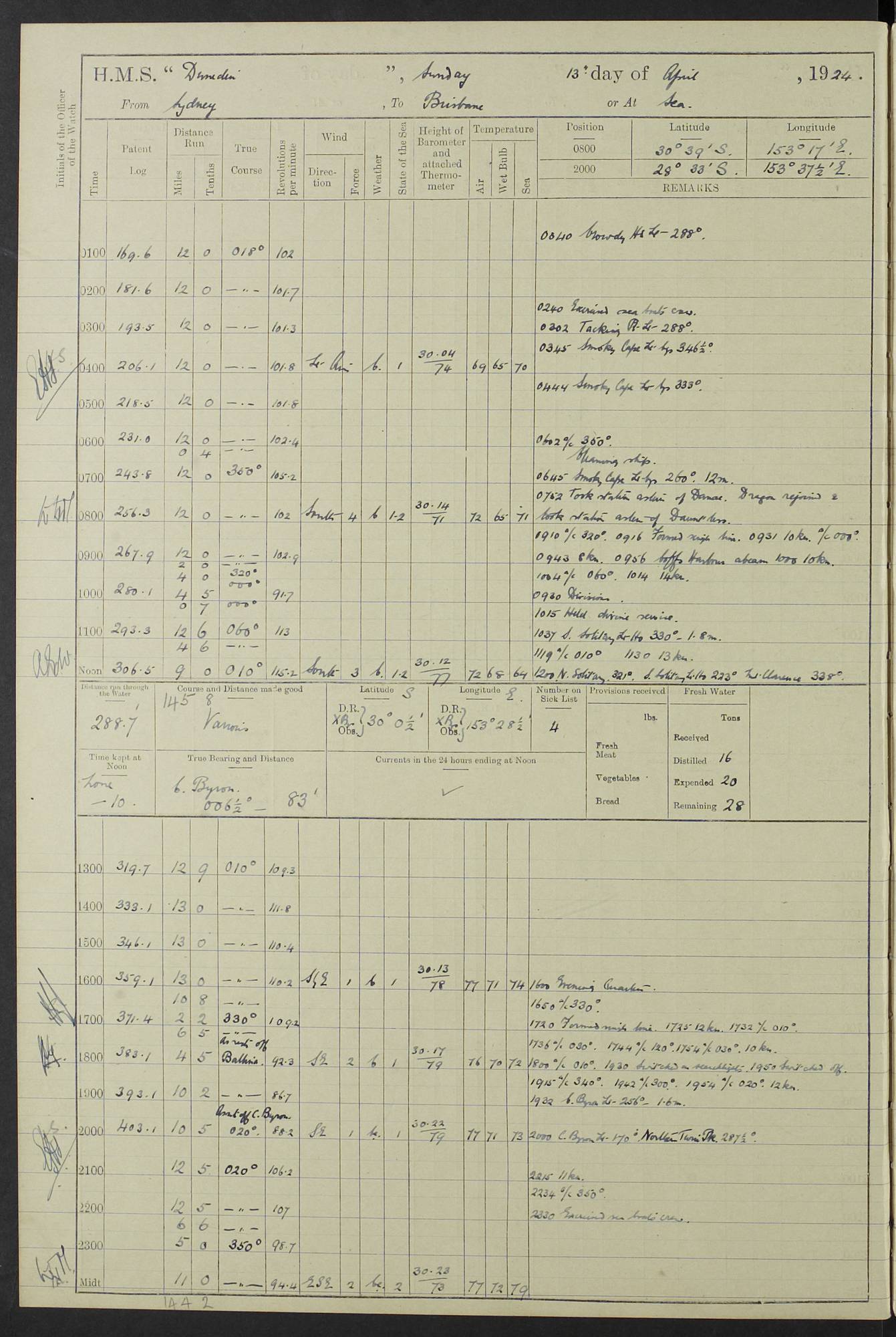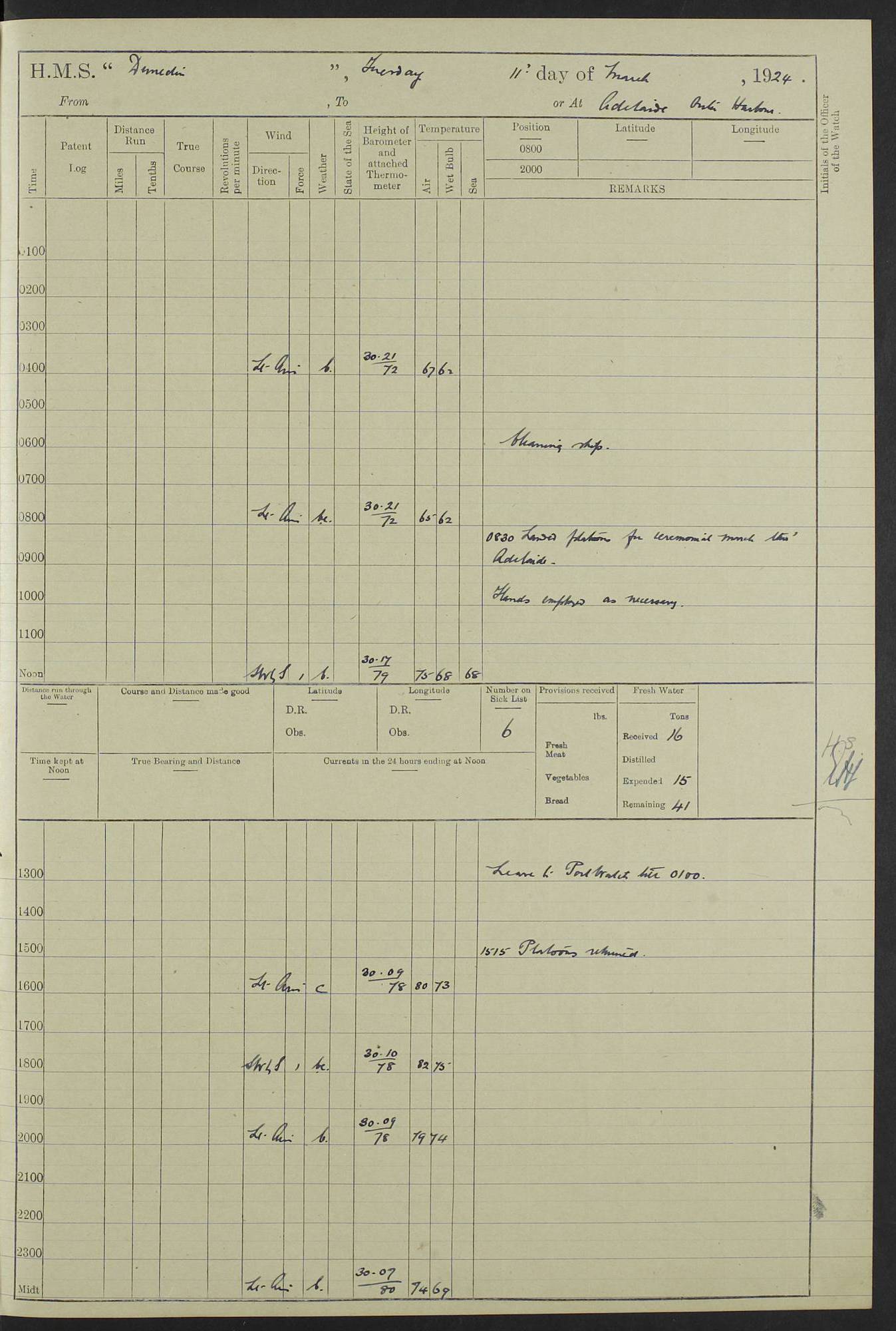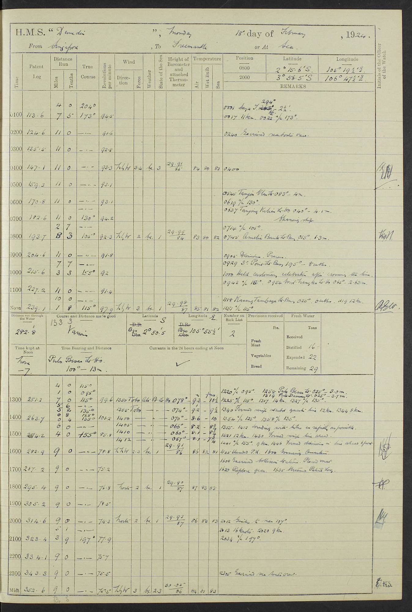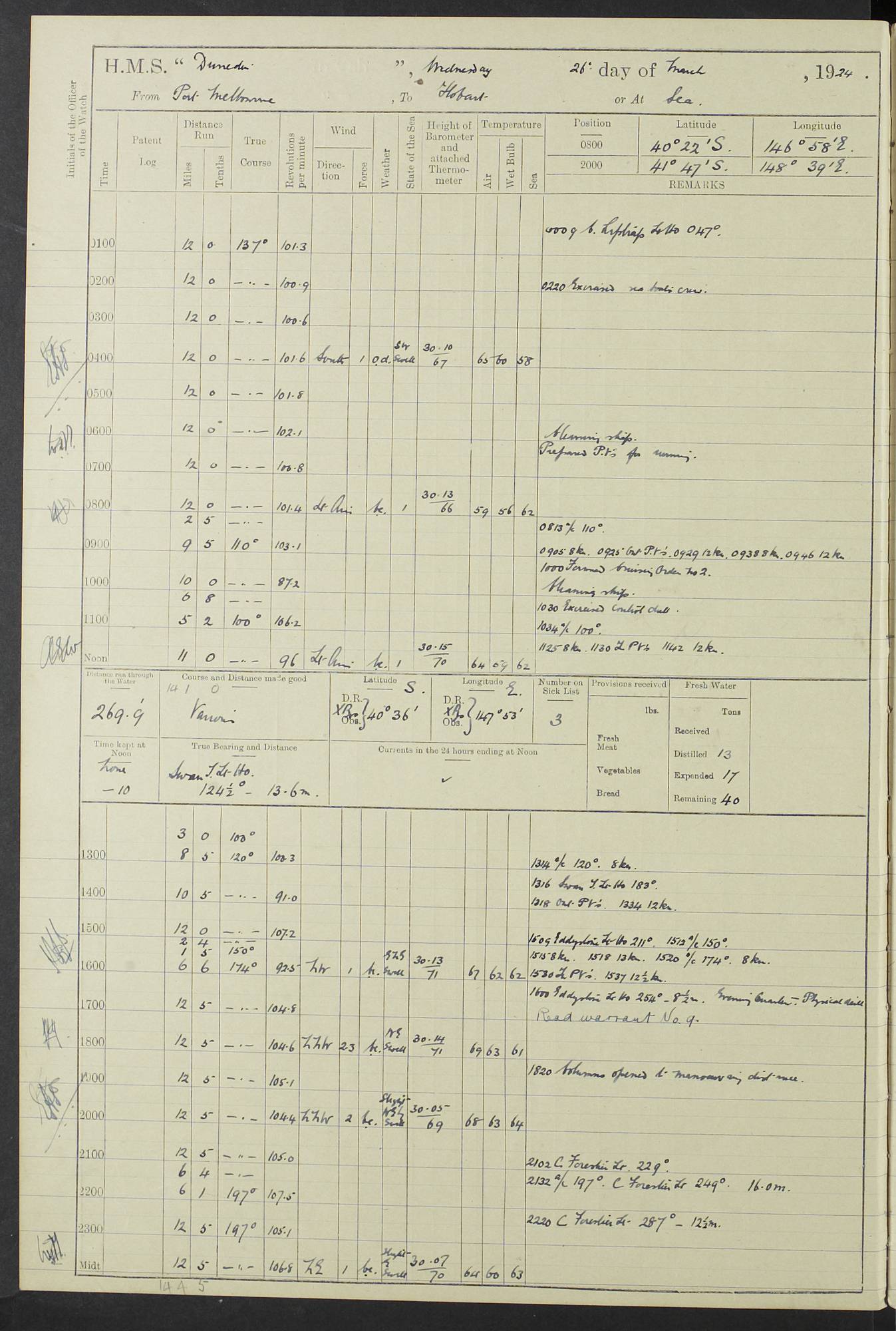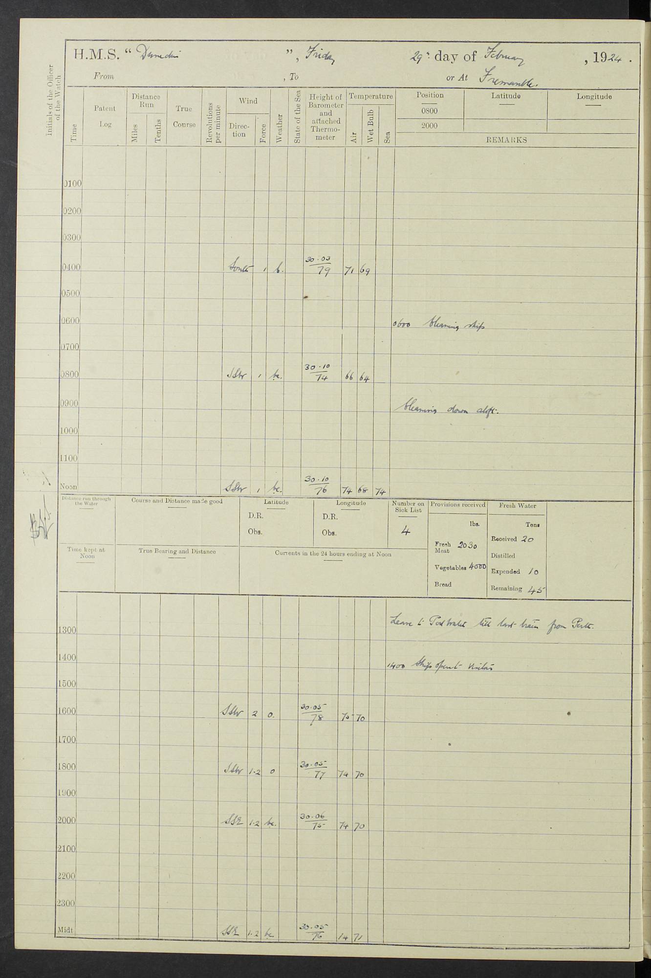 (Maps prepared using Journey Plotter, developed by Maikel. The Plots can only be approximate. They are made by joining-up positions on successive days, and sometimes positions are not given. There will therefore be occasions when the ship appears to have travelled overland) LOG BOOK – 23RD SEPTEMBER 1920 TO 13TH SEPTEMBER 1921 4caf8d9dcadfd3419703bde2: (http://oldweather.s3.amazonaws.com/ADM53-76345/ADM53-76345_0.jpg) Left front cover of Ship’s Log. 4caf8d9dcadfd3419703bde3: (http://oldweather.s3.amazonaws.com/ADM53-76345/ADM53-76345_1.jpg) Right front cover of Ship’s Log. 4caf8d97cadfd3419703bc6a: (http://oldweather.s3.amazonaws.com/ADM53-76345/ADM53-76345-002_0.jpg) 4caf8d97cadfd3419703bc6b: (http://oldweather.s3.amazonaws.com/ADM53-76345/ADM53-76345-002_1.jpg) 4caf8d97cadfd3419703bc6c: (http://oldweather.s3.amazonaws.com/ADM53-76345/ADM53-76345-003_0.jpg) 4caf8d97cadfd3419703bc6d: (http://oldweather.s3.amazonaws.com/ADM53-76345/ADM53-76345-003_1.jpg) 4caf8d97cadfd3419703bc6e: (http://oldweather.s3.amazonaws.com/ADM53-76345/ADM53-76345-004_0.jpg) Blank pages. 4caf8d97cadfd3419703bc6f: (http://oldweather.s3.amazonaws.com/ADM53-76345/ADM53-76345-004_1.jpg) S.- 321. See Articles 557, 619, 622, 924, 1025, 1026 and 1849 of the King’s Regulations, 1913. This Log is to be kept from the time the Ship is Commissioned until she is paid off; when it is to be transmitted as directed by the Admiralty Instructions. The Name and Address of the Officer to whom the acknowledgement of receipt should be sent by the Deputy Cashier in charge, Royal Victoria Yard, Deptford, is to be inserted here. Name: Commander’s Office. Address: H.M.S. Dunedin. c/o G.P.O. London. LOG of H.M.S. “Dunedin” Commanded by Captain C. Wrightson C.B.E. (till 31.3.21). Captain H.S. Monroe D.S.O. (from 31.3.21). FOR THE PERIOD Commencing: Thursday 23rd of September 1920. Ending: Tuesday 13th of September 1921. Tonnage (Displacement): 4,650 Extreme Length: 472ft 3 ins Extreme Breadth: 46 ft 0.3/8” Engines: Manufacturer: Messes R & W Hawthorn Leslie & Co Ltd. Newcastle on Tyne. I.H.P: 40.000 Forced Draught. Description: Turbine (Geared). When Fixed on Board: 1918 – 1919. Boilers: Manufacturer: Messes R & W Hawthorn Leslie & Co Ltd. Newcastle on Tyne. Description: Small tube Improved Yarrow. When made: 1918. When put in vessel: 1918. Paddle Wheels or Screw Propeller: Manufacturer: Manganese Bronze Co. Description: Solid 3 Blades Turbadium Bronze, Pitch 14 ft 3 in. General State of Repair: Satisfactory. R. Alison [?], Lieut Com (W) on paying off 30th August 1923. L. 8418/02. N.L. 15713/13. Where Built Sir W.G. Armstrong Whitworth & Co Ltd. N.L. 18227/18. Armstrong Naval Yard, High Walker, Newcastle on Tyne. Sta. 127/10. Commenced building November 1917, Launched 19 November 1918. N.L. 22782/19. Completed September 1919. 4caf8d98cadfd3419703bc70: (http://oldweather.s3.amazonaws.com/ADM53-76345/ADM53-76345-005_0.jpg) Directions (See King’s Regulations 1913, Articles 1025 and 1849). 1. King’s Regulations. 2. Figures to indicate the Force of the Wind. 3. Letters to denote the State of the Weather. 4. Scale of Fog Intensity. 5. Sea Disturbance Scale 4caf8d98cadfd3419703bc71: (http://oldweather.s3.amazonaws.com/ADM53-76345/ADM53-76345-005_1.jpg) Establishment of Ship’s Company Officers 23 Seamen 187 Boys 36 Marines 46 Engine-room Establishment 105 Other non-executive ratings 44 Total 441 ARMAMENT Position Forecastle: 6” Calibre XII on C.P. XIV mounting. Superstructure: Four 6” Calibre XII on C.P. XIV mountings. Superstructure: Two 3” QF Calibre High Angle mountings, Quarterdeck: 6” Calibre XII on C.P. XIV mountings. Torpedo Armaments Four above water 21” triple tubes. BAROMETER Mercurial or Aneroid: Mercurial. Name of Maker and number: J. Hitchins 101 A747. Height of cistern above sea: 13ft. Error of Mercurial Barometer: Nil at 30.00. Thermometers for Air Temperature. Position on Ship: On fore bridge. Whether in screen: Yes. Maker and No. Negretti & Zambra From: 7.10.19 To: Sept. 1921. Negretti & Zambra No. 10499 Negretti & Zambra No 10391 From: 7.10.19 To: Sept. 1921. Thermometer for Sea Temperature. A. Harper & Sons 7.10.19 POSITION OF STANDARD COMPASS. Manoeuvring Platform. (Fore bridge) BOATS Number of each carried: 1 x 30ft. motor boat. 2 x 32ft. cutters. 1 x 30ft gig. 2 x 27ft whalers. 2 x 16 ft dinghies. MISCELLANEOUS INFORMATION Draught of water with Bunkers full, and complete with provisions, Stores and water: Forward 16 ft 1 inch; Aft 16 ft 11 inches. Number of Tons necessary to increase draught 1 inch: 35.6. Number of Tons of Coal Carried: 16. Number of Tons of Oil Fuel carried: 1127. Quantity of Water Carried (a) For Boilers: 157 tons. (b) For Drinking: 56½ tons. LOGS FOR SEPTEMBER 1920 4caf8d98cadfd3419703bc72: (http://oldweather.s3.amazonaws.com/ADM53-76345/ADM53-76345-006_0.jpg) 23 September 1920 At Copenhagen. Lat 55.694, Long 12.603 4.00am: Signal books correct. am: Hands employed cleaning ship. 8.00am: Signal books correct. am: Sent coaling party to S.S. “Volo”. am: X & Y 6” guns crews at loader drill, remainder of hands employed as requisite. am: Coaling party returned. Noon: Signal books correct. 1.15pm: Sent coaling party to S.S. “Volo”. pm: 1 Rating joined ship from hospital. pm: Boys & training classes under instruction, remainder of hands employed as requisite. 3.00pm: U.S.S. “Gilmer” arrived. [Gilmer, U.S. Destroyer, Flush Decker, launched 18/7/19, Guns: 4 x 5”, 51 cal.,1 x 3”, 23 cal. AA, 12 x 21” TT’s in 4 triple deck mountings. Disp: 1,215 tons, SHP: 26,000 = 35 knots. Jane’s Fighting Ships 1919. Image]. 4.00pm: Signal books correct. pm: Coaling party returned. 8.00pm: Signal books correct. Midnight: Signal books correct. 4caf8d98cadfd3419703bc73: (http://oldweather.s3.amazonaws.com/ADM53-76345/ADM53-76345-006_1.jpg) 24 September 1920 At Copenhagen. Lat 55.694, Long 12.603 4.00am: Signal books correct. am: Hands employed cleaning ship. 6.15am: U.S.S. “Sh