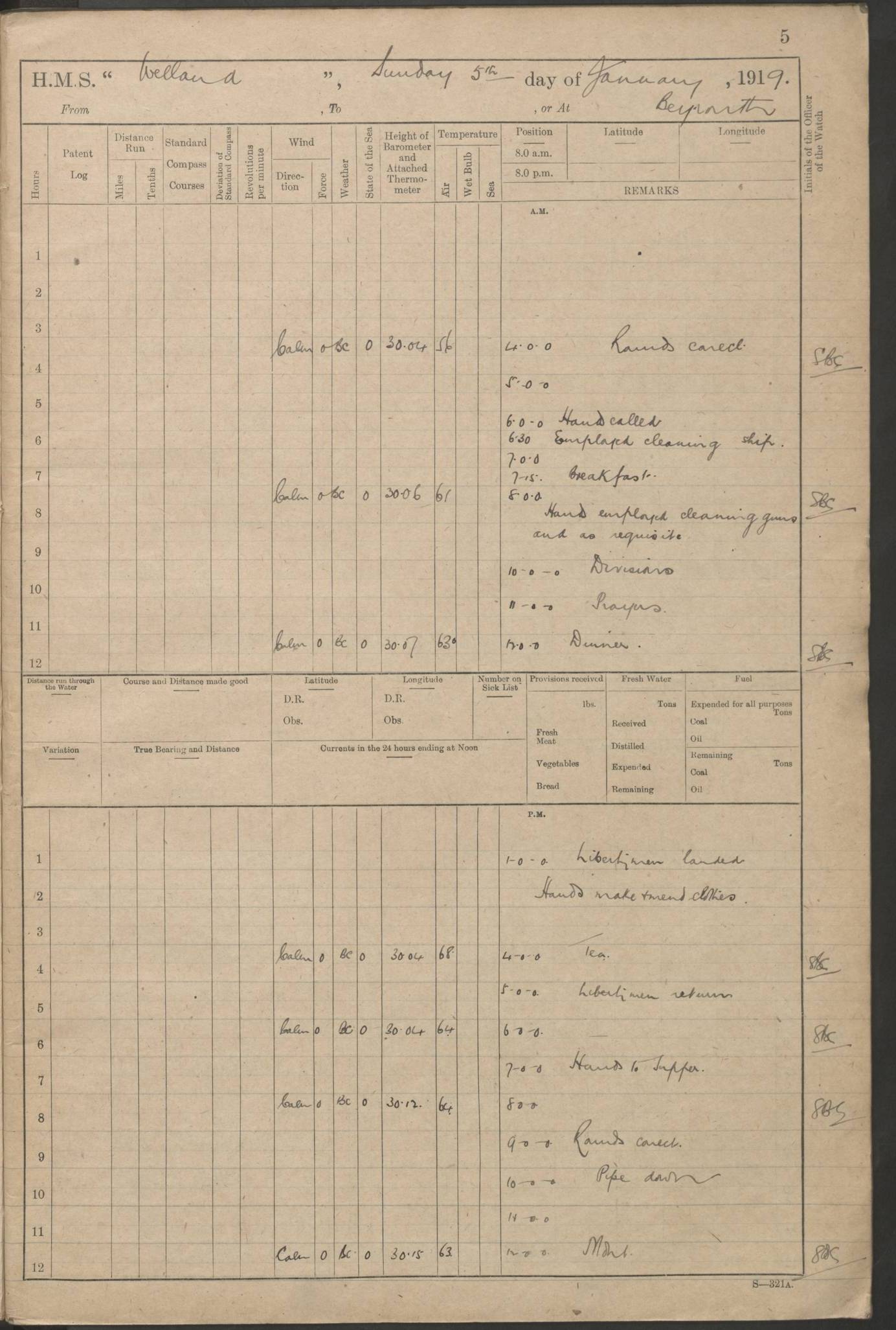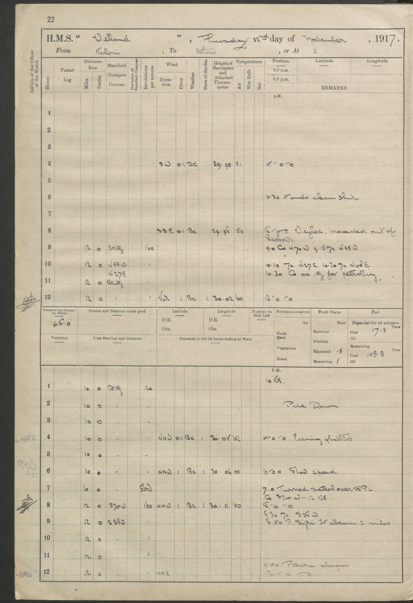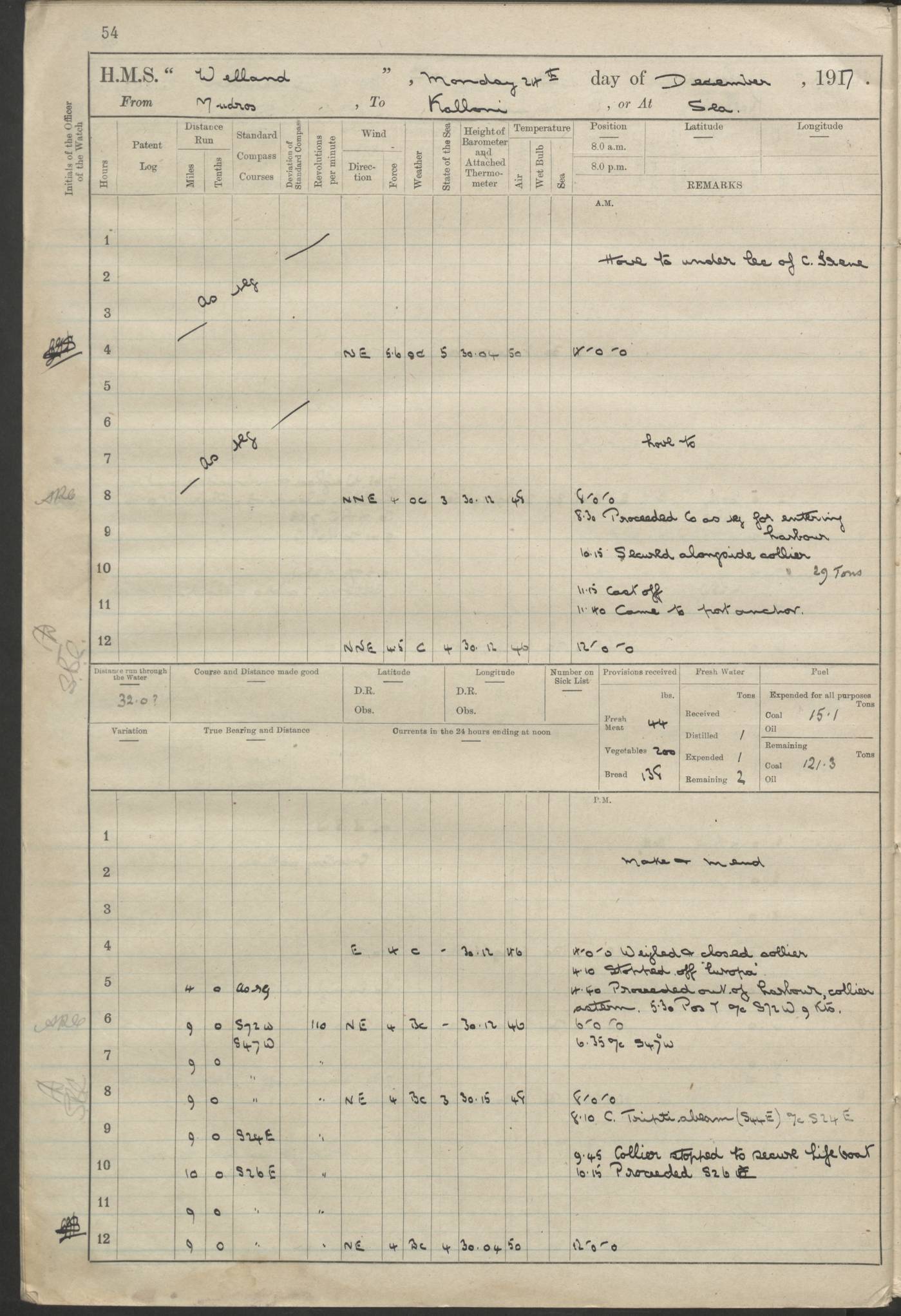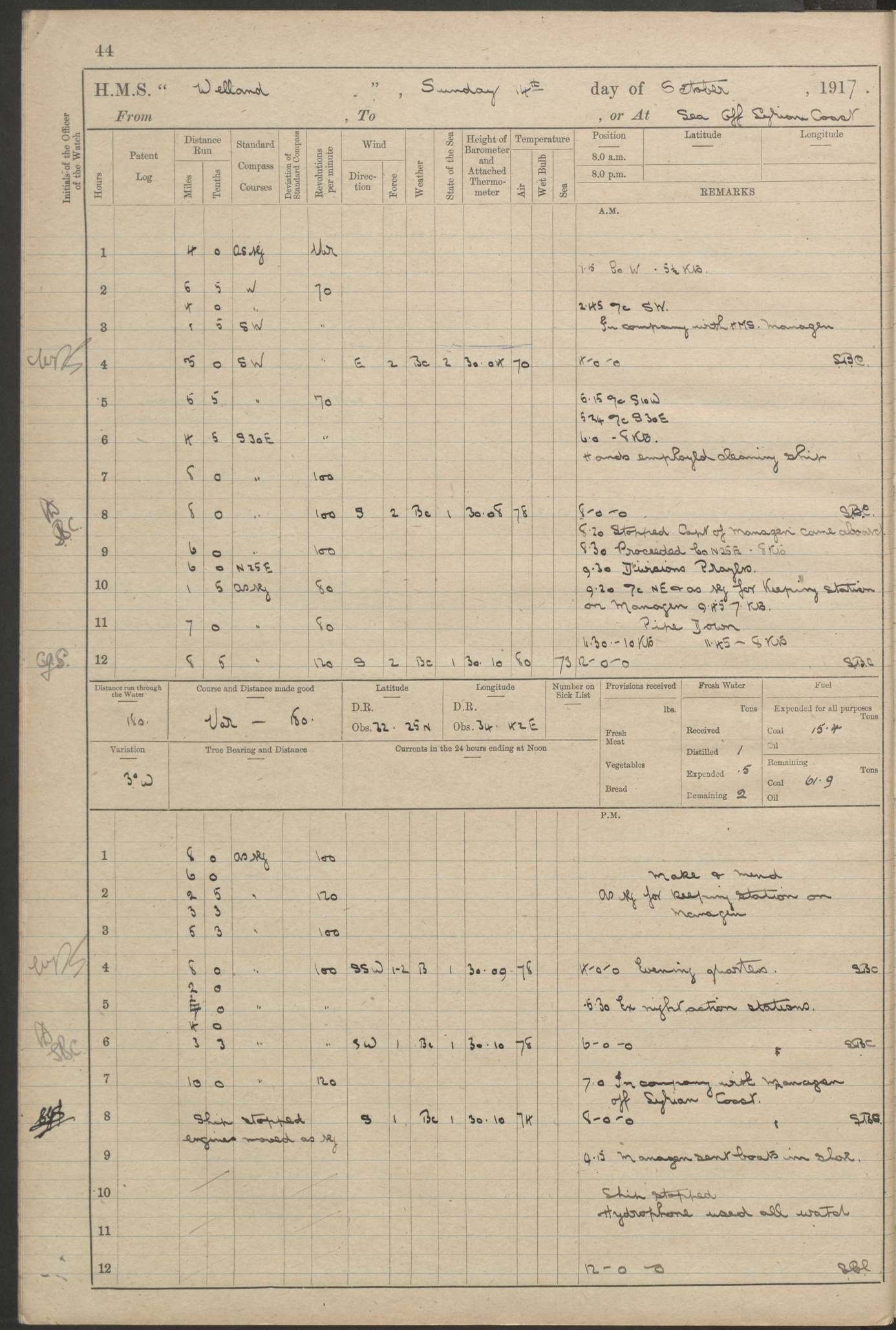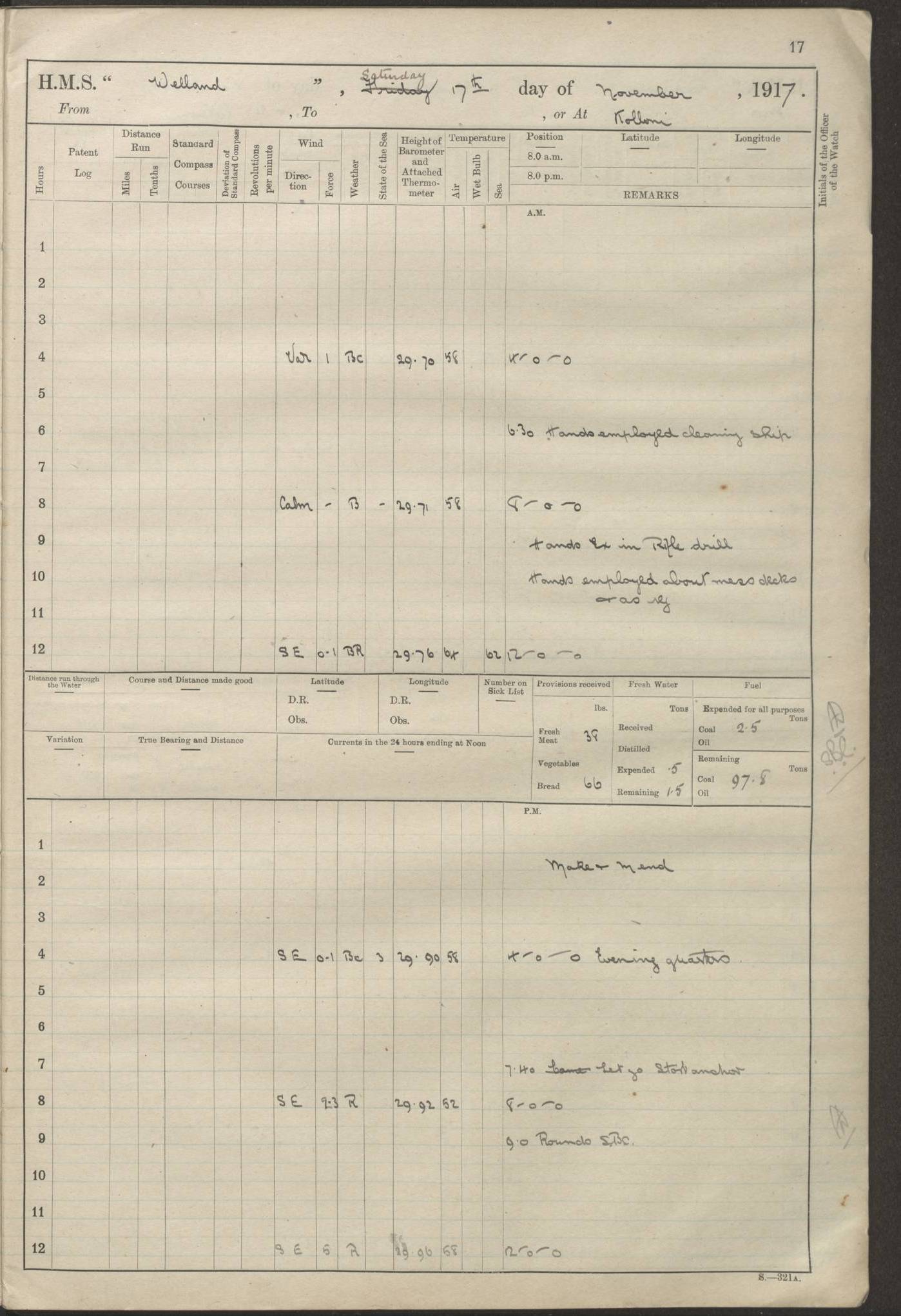 LOGS FOR JANUARY 1917 [Port Iero including Gulf of Smyrna patrol, Mudros including Dardanelles patrol, Suda Bay and Mudros] 4caf8cb8cadfd341970379f0: (http://oldweather.s3.amazonaws.com/ADM 53-68380/ADM 53-68380-001_0.jpg) 4caf8cb8cadfd341970379f1: (http://oldweather.s3.amazonaws.com/ADM 53-68380/ADM 53-68380-001_1.jpg) Blue front cover of Logbook January/February 1917. 4caf8cb8cadfd341970379f2: (http://oldweather.s3.amazonaws.com/ADM 53-68380/ADM 53-68380-002_0.jpg) “This is to certify that this is a true copy of the original log of HMS Welland from 1st January 1917 to 28th February 1917, signed FE Ayers, Lieutenant-in-Command.” 4caf8cb8cadfd341970379f3: (http://oldweather.s3.amazonaws.com/ADM 53-68380/ADM 53-68380-002_1.jpg) Blank except for signatures of FE Ayers (2nd March 1917) and HL Hammond (stamped 1st April 1917) 4caf8cb8cadfd341970379f4: (http://oldweather.s3.amazonaws.com/ADM 53-68380/ADM 53-68380-003_0.jpg) Instruments. Aneroid barometer Negretti & Zambra 978, 8’ asl. Air thermometers (on fore bridge, screened) SA Calderara Sea thermometer SA Calderara 4caf8cb8cadfd341970379f5: (http://oldweather.s3.amazonaws.com/ADM 53-68380/ADM 53-68380-003_1.jpg) 1 January 1917 [1916 in log] Port Iero Lat 39.1, Long 26.47 6.30am: Clean ship and scrub quarterdeck. 8.45am: Quarters. Clean guns. 9.00am: Prayers. 9.30am: Clean out dinghy and whaler. 1.10pm: Landed football party. 1.15pm: Landed liberty men. 2.45pm: Clear up decks. 4.20pm: HMS Gazelle arrived. 5.10pm: Liberty men and footballers returned. 9.00pm: Rounds correct. Sick list: 2. Weather: Northerly winds up to f 4, rain at times, temperatures in the 50ºs F. 4caf8cb8cadfd341970379f6: (http://oldweather.s3.amazonaws.com/ADM 53-68380/ADM 53-68380-004_0.jpg) 2 January 1917 Port Iero Lat 39.1, Long 26.47 8.50am: Trawler 1179 [Loch Naver] secured alongside. Took in provisions and stores. 10.00am: Trawler 1179 cast off. Hands stow stores etc. In pm: Landed footballers and liberty men. 4caf8cb8cadfd341970379f7: (http://oldweather.s3.amazonaws.com/ADM 53-68380/ADM 53-68380-004_1.jpg) 3 January 1917 Port Iero, Chios, Vathi Lat 38.37, Long 26.14 8.00am: SNO Port Iero [probably the Captain of HMS Doris, Frank Larken] came onboard. 8.05am: Left harbour. 11.00am: Anchored in Chios Harbour. 12.40pm: Weighed and proceeded for Vathi [Samos]. Course S49E. 3.55pm: Anchored in Vathi harbour. 4caf8cb8cadfd341970379f8: (http://oldweather.s3.amazonaws.com/ADM 53-68380/ADM 53-68380-005_0.jpg) 4 January 1917 Port Iero Lat 38.1, Long 26.5 [approx] 9.40am: HMS Whitby Abbey arrived. 10.00am: PL 196 sailed. 10.30am: Weighed and proceeded. 10.50am: Course N59W. 1.00pm: Courses for Khios Strait. 4.30pm: Disembarked SNO, Port Iero. 5.05pm: Anchored off collier Holmpark [Holmepark in log]. 4caf8cb8cadfd341970379f9: (http://oldweather.s3.amazonaws.com/ADM 53-68380/ADM 53-68380-005_1.jpg) 5 January 1917 Port Iero Lat 39.1, Long 26.47 7.00am: Secured alongside Holmpark [or Holmesbank, both named in log] 8.45am: Finished coaling, 70 tons, cast off to anchor. 9.10am: Anchored off HMS Lowestoft. 5.20pm: HMS Anenome left collier and anchored. 8.15pm: Anenome weighed and proceeded out of harbour. 4caf8cb8cadfd341970379fa: (http://oldweather.s3.amazonaws.com/ADM 53-68380/ADM 53-68380-006_0.jpg) 6 January 1917 Port Iero Lat 39.1, Long 26.47 8.10am: RFA Kharki [Khaki in log] arrived. 11.25am: HMS M.16 arrived. 4caf8cb8cadfd341970379fb: (http://oldweather.s3.amazonaws.com/ADM 53-68380/ADM 53-68380-006_1.jpg) 7 January 1917 Port Iero and Gulf of Smyrna patrol Lat 38.67, Long 26.6 [approx] 7.15am: Left harbour for patrol 9.30am: Patrolling across entrance NE by E and SW by W. 8.00pm: Courses NW by N, SE by S. 11.59pm: Proceeded for Syra. 4caf8cb8cadfd341970379fc: (http://oldweather.s3.amazonaws.com/ADM 53-68380/ADM 53-68380-007_0.jpg) 8 January 1917 At sea to Syra [Siros] for escort duty Lat 37.44, Long 24.95 2.30am: Pasha Lt bg WNW 2 miles. 4.50am: Course S49W. 4.53am: Venetiko I. bg NW, 1.5 miles. 6.30am: Passed large transport (2 funnels, 2 masts) steering Southerly course. 7.30am: Passed River class destroyer on opposite course. 9.30am: Courses for Mykoni channel and approaching Syra. 10.40am: Anchored in Syra harbour. 4.40pm: Weighed and proceeded out of harbour, courses as requisite escorting Greek steamer from Syra to Mytilene. 9.00pm: Course N57E, 12 knots. 4caf8cb8cadfd341970379fd: (http://oldweather.s3.amazonaws.com/ADM 53-68380/ADM 53-68380-007_1.jpg) 9 January 1917 At sea to Port Iero and Mudros Lat 39.1, Long 26.47 1.00am: Psara Lt bg NE by E. 2.11am: Same abeam to starboard, 2 miles. 6.25am: Pasha Light abeam. 11.20am: Anchored, Port Iero, near HMS Lowestoft. 12.30pm: Weighed and proceeded out of harbour for Mudros. 1.30pm: Signalled HMS Colne on opposite course. 3.20pm: Sigri Lt abeam to starboard, 2 miles. 6.30pm: Secured alongside SS Hollington in Mudros harbour. 4caf8cb8cadfd341970379fe: (http://oldweather.s3.amazonaws.com/ADM 53-68380/ADM 53-68380-008_0.jpg) 10 January 1917 Mudros Lat 39.88, Long 25.25 8.35am: Hands coal ship. 10.07am: Received 85 tons, cast off to anchor off HMS Blenheim. 11.45am: Weighed and proceeded alongside HMS Comet. 2.30pm: Mid. Hall RNR left ship for HMS Agamemnon. 6.00pm: Mr Somerfield, Gunner RN, joined ship from Blenheim. 4caf8cb8cadfd341970379ff: (http://oldweather.s3.amazonaws.com/ADM 53-68380/ADM 53-68380-008_1.jpg) 11 January 1917 Mudros Lat 40.2, Long 26.1 [approx] 7.30am: Weighed and proceeded to sea with HMS Wear, course N10E for Dardanelles patrol. 11.00am: Commenced Northern half of main patrol, patrolling from N point of South patrol to windward. 8.00pm: Patrolling i/c with Wear on Southern half of main patrol. 4caf8cb8cadfd34197037a00: (http://oldweather.s3.amazonaws.com/ADM 53-68380/ADM 53-68380-009_0.jpg) 12 January 1917 Dardanelles patrol Lat 40.0, Long 26.1 [approx] Southern half of main patrol, in station astern of HMS Wear. 4caf8cb8cadfd34197037a01: (http://oldweather.s3.amazonaws.com/ADM 53-68380/ADM 53-68