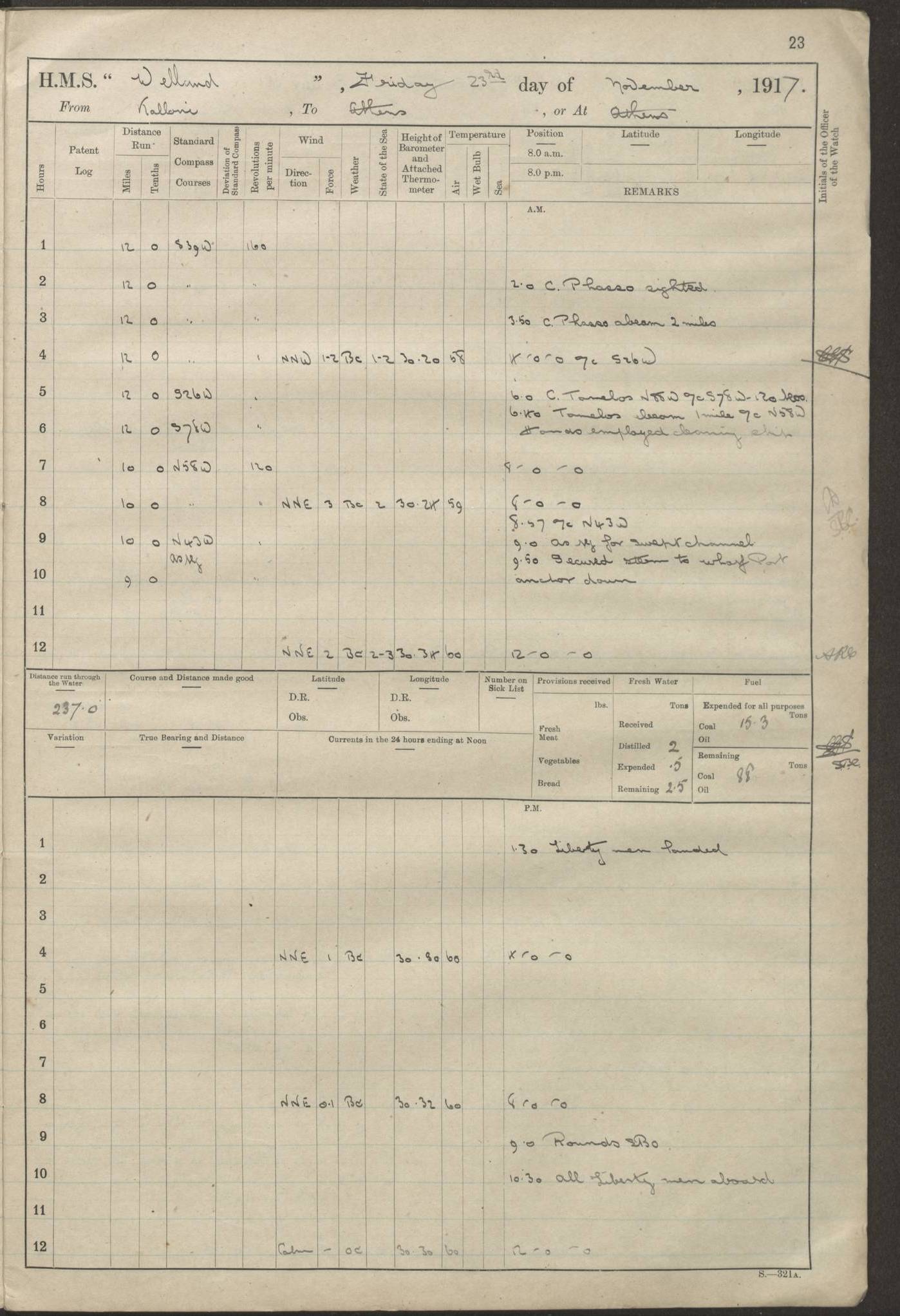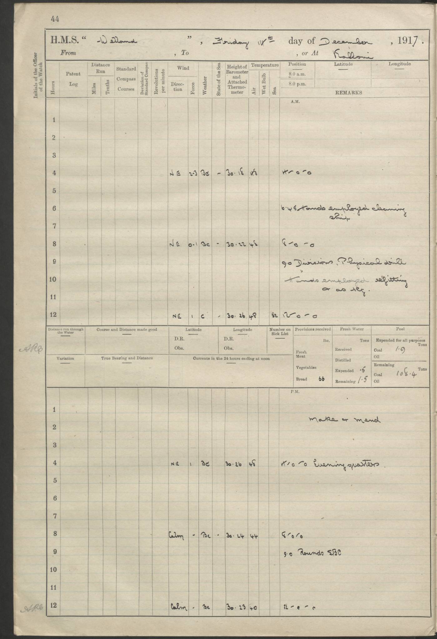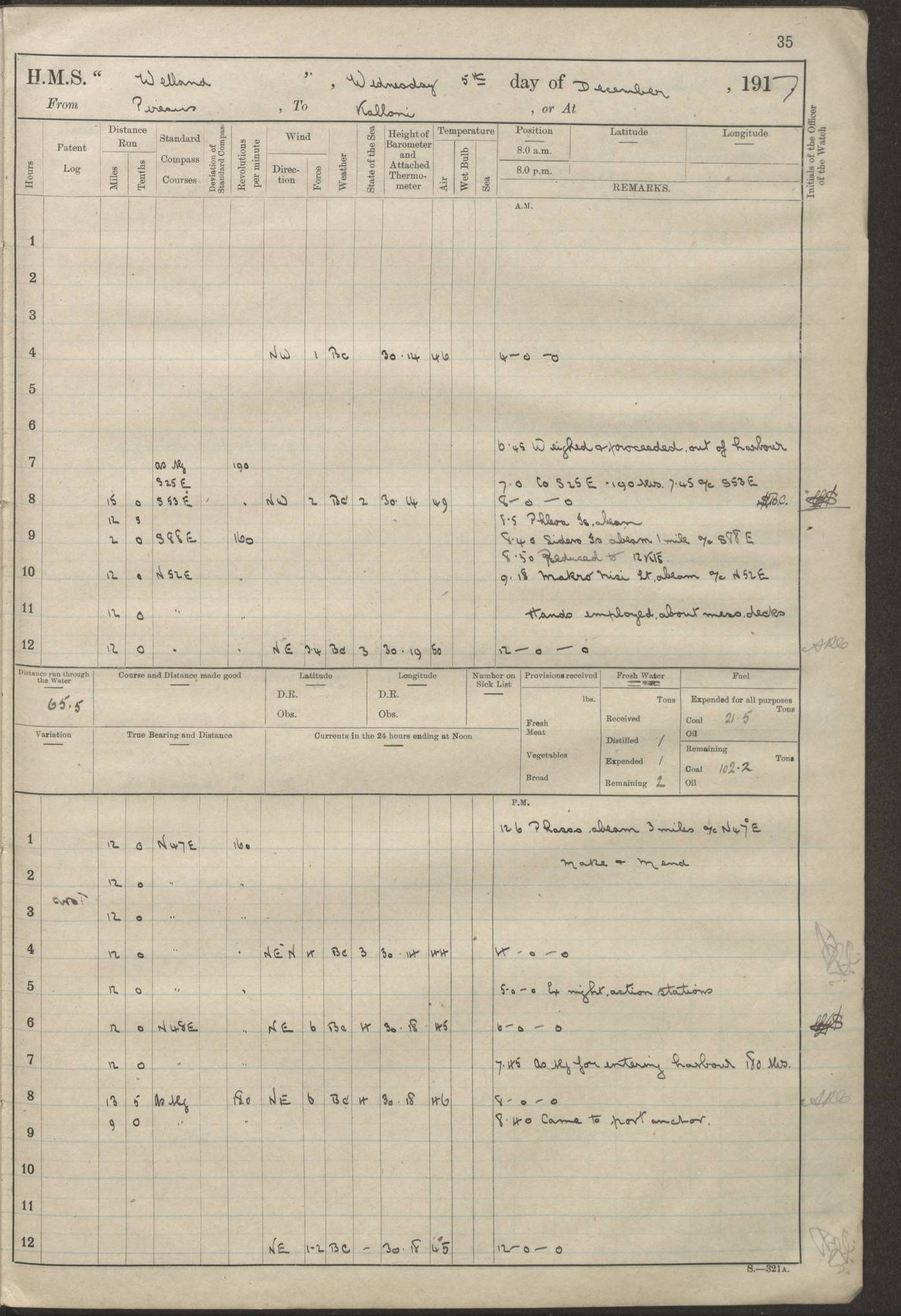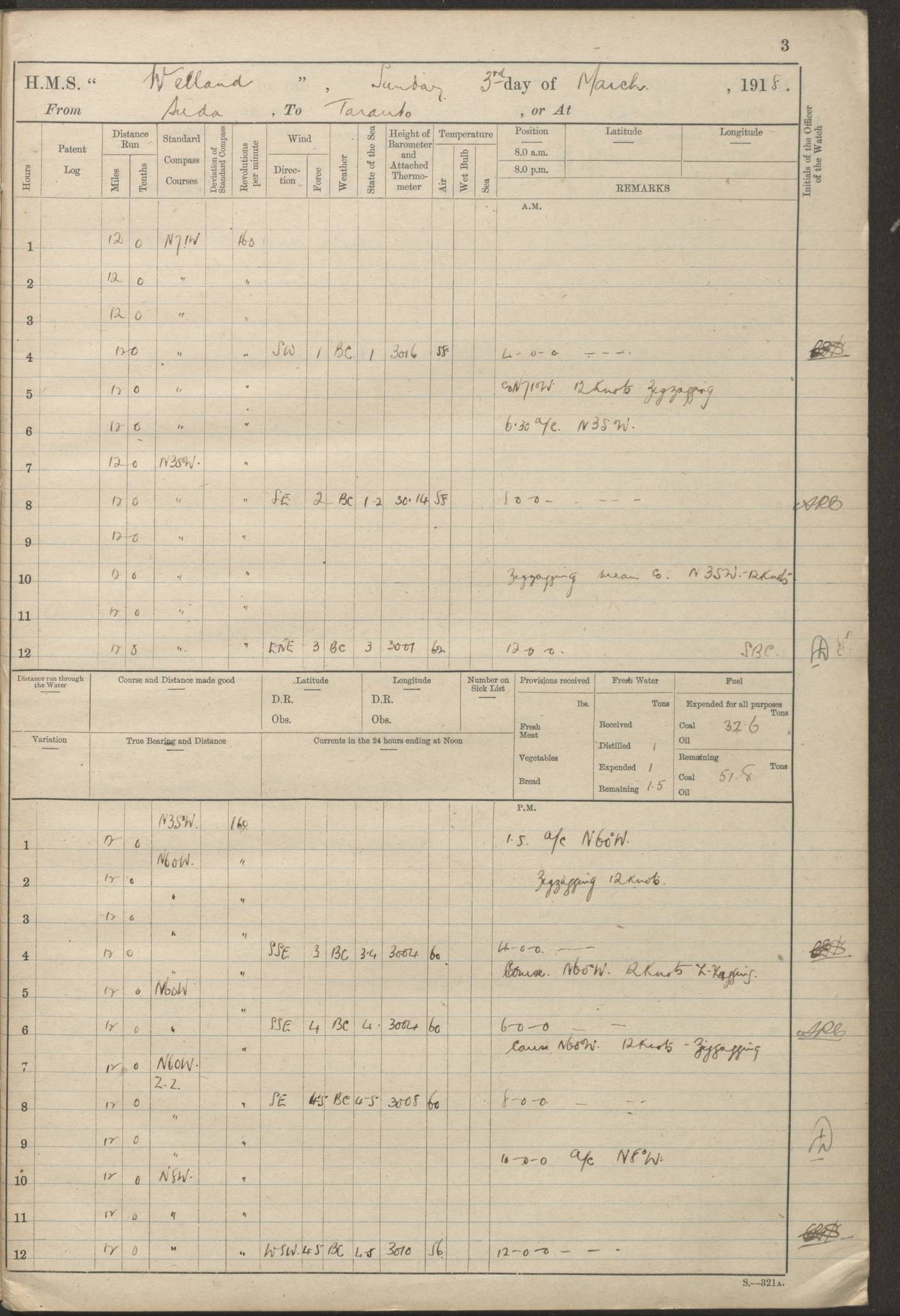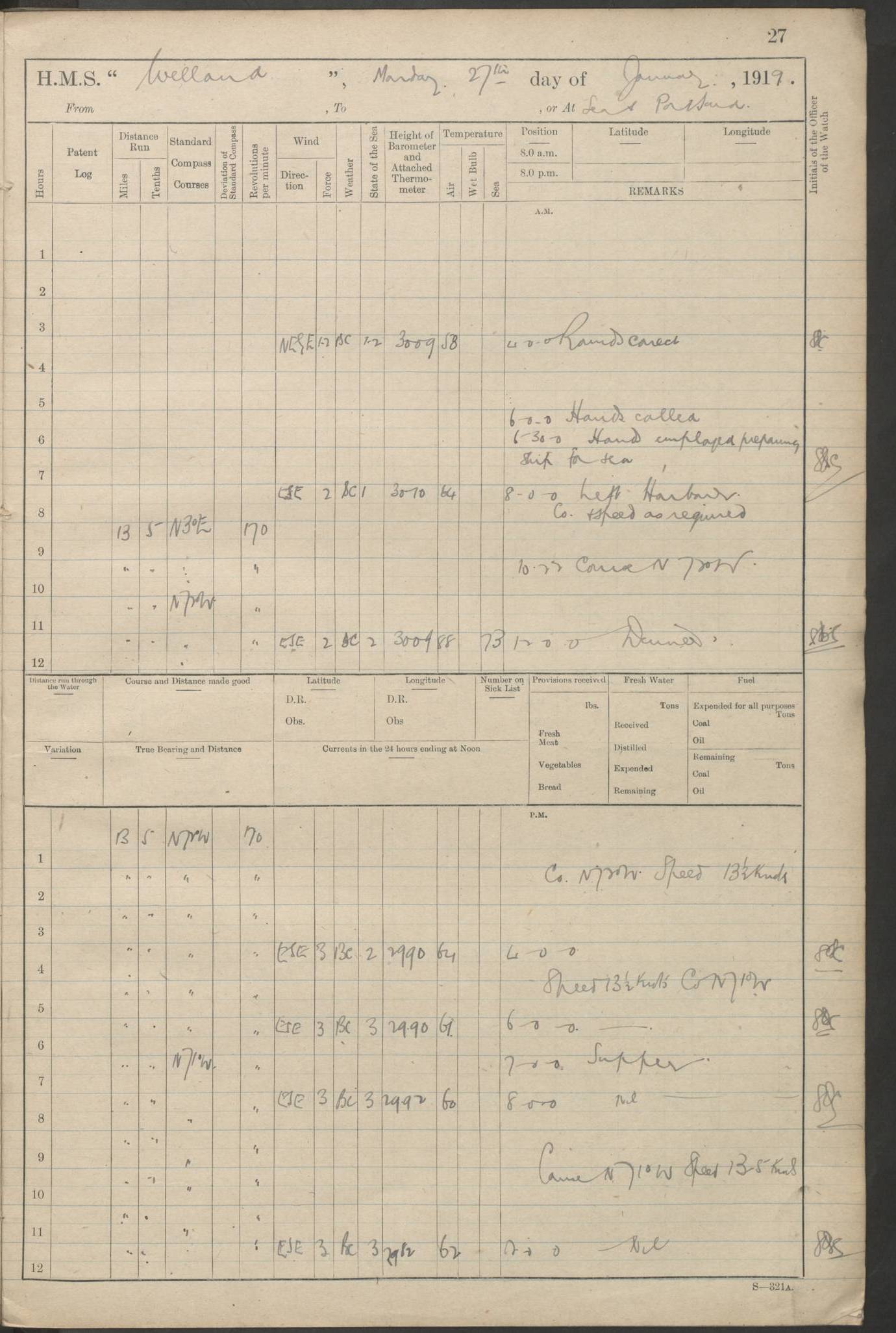 LOGS FOR JANUARY 1917 [Port Iero including Gulf of Smyrna patrol, Mudros including Dardanelles patrol, Suda Bay and Mudros] 4caf8cb8cadfd341970379f0: (http://oldweather.s3.amazonaws.com/ADM 53-68380/ADM 53-68380-001_0.jpg) 4caf8cb8cadfd341970379f1: (http://oldweather.s3.amazonaws.com/ADM 53-68380/ADM 53-68380-001_1.jpg) Blue front cover of Logbook January/February 1917. 4caf8cb8cadfd341970379f2: (http://oldweather.s3.amazonaws.com/ADM 53-68380/ADM 53-68380-002_0.jpg) “This is to certify that this is a true copy of the original log of HMS Welland from 1st January 1917 to 28th February 1917, signed FE Ayers, Lieutenant-in-Command.” 4caf8cb8cadfd341970379f3: (http://oldweather.s3.amazonaws.com/ADM 53-68380/ADM 53-68380-002_1.jpg) Blank except for signatures of FE Ayers (2nd March 1917) and HL Hammond (stamped 1st April 1917) 4caf8cb8cadfd341970379f4: (http://oldweather.s3.amazonaws.com/ADM 53-68380/ADM 53-68380-003_0.jpg) Instruments. Aneroid barometer Negretti & Zambra 978, 8’ asl. Air thermometers (on fore bridge, screened) SA Calderara Sea thermometer SA Calderara 4caf8cb8cadfd341970379f5: (http://oldweather.s3.amazonaws.com/ADM 53-68380/ADM 53-68380-003_1.jpg) 1 January 1917 [1916 in log] Port Iero Lat 39.1, Long 26.47 6.30am: Clean ship and scrub quarterdeck. 8.45am: Quarters. Clean guns. 9.00am: Prayers. 9.30am: Clean out dinghy and whaler. 1.10pm: Landed football party. 1.15pm: Landed liberty men. 2.45pm: Clear up decks. 4.20pm: HMS Gazelle arrived. 5.10pm: Liberty men and footballers returned. 9.00pm: Rounds correct. Sick list: 2. Weather: Northerly winds up to f 4, rain at times, temperatures in the 50ºs F. 4caf8cb8cadfd341970379f6: (http://oldweather.s3.amazonaws.com/ADM 53-68380/ADM 53-68380-004_0.jpg) 2 January 1917 Port Iero Lat 39.1, Long 26.47 8.50am: Trawler 1179 [Loch Naver] secured alongside. Took in provisions and stores. 10.00am: Trawler 1179 cast off. Hands stow stores etc. In pm: Landed footballers and liberty men. 4caf8cb8cadfd341970379f7: (http://oldweather.s3.amazonaws.com/ADM 53-68380/ADM 53-68380-004_1.jpg) 3 January 1917 Port Iero, Chios, Vathi Lat 38.37, Long 26.14 8.00am: SNO Port Iero [probably the Captain of HMS Doris, Frank Larken] came onboard. 8.05am: Left harbour. 11.00am: Anchored in Chios Harbour. 12.40pm: Weighed and proceeded for Vathi [Samos]. Course S49E. 3.55pm: Anchored in Vathi harbour. 4caf8cb8cadfd341970379f8: (http://oldweather.s3.amazonaws.com/ADM 53-68380/ADM 53-68380-005_0.jpg) 4 January 1917 Port Iero Lat 38.1, Long 26.5 [approx] 9.40am: HMS Whitby Abbey arrived. 10.00am: PL 196 sailed. 10.30am: Weighed and proceeded. 10.50am: Course N59W. 1.00pm: Courses for Khios Strait. 4.30pm: Disembarked SNO, Port Iero. 5.05pm: Anchored off collier Holmpark [Holmepark in log]. 4caf8cb8cadfd341970379f9: (http://oldweather.s3.amazonaws.com/ADM 53-68380/ADM 53-68380-005_1.jpg) 5 January 1917 Port Iero Lat 39.1, Long 26.47 7.00am: Secured alongside Holmpark [or Holmesbank, both named in log] 8.45am: Finished coaling, 70 tons, cast off to anchor. 9.10am: Anchored off HMS Lowestoft. 5.20pm: HMS Anenome left collier and anchored. 8.15pm: Anenome weighed and proceeded out of harbour. 4caf8cb8cadfd341970379fa: (http://oldweather.s3.amazonaws.com/ADM 53-68380/ADM 53-68380-006_0.jpg) 6 January 1917 Port Iero Lat 39.1, Long 26.47 8.10am: RFA Kharki [Khaki in log] arrived. 11.25am: HMS M.16 arrived. 4caf8cb8cadfd341970379fb: (http://oldweather.s3.amazonaws.com/ADM 53-68380/ADM 53-68380-006_1.jpg) 7 January 1917 Port Iero and Gulf of Smyrna patrol Lat 38.67, Long 26.6 [approx] 7.15am: Left harbour for patrol 9.30am: Patrolling across entrance NE by E and SW by W. 8.00pm: Courses NW by N, SE by S. 11.59pm: Proceeded for Syra. 4caf8cb8cadfd341970379fc: (http://oldweather.s3.amazonaws.com/ADM 53-68380/ADM 53-68380-007_0.jpg) 8 January 1917 At sea to Syra [Siros] for escort duty Lat 37.44, Long 24.95 2.30am: Pasha Lt bg WNW 2 miles. 4.50am: Course S49W. 4.53am: Venetiko I. bg NW, 1.5 miles. 6.30am: Passed large transport (2 funnels, 2 masts) steering Southerly course. 7.30am: Passed River class destroyer on opposite course. 9.30am: Courses for Mykoni channel and approaching Syra. 10.40am: Anchored in Syra harbour. 4.40pm: Weighed and proceeded out of harbour, courses as requisite escorting Greek steamer from Syra to Mytilene. 9.00pm: Course N57E, 12 knots. 4caf8cb8cadfd341970379fd: (http://oldweather.s3.amazonaws.com/ADM 53-68380/ADM 53-68380-007_1.jpg) 9 January 1917 At sea to Port Iero and Mudros Lat 39.1, Long 26.47 1.00am: Psara Lt bg NE by E. 2.11am: Same abeam to starboard, 2 miles. 6.25am: Pasha Light abeam. 11.20am: Anchored, Port Iero, near HMS Lowestoft. 12.30pm: Weighed and proceeded out of harbour for Mudros. 1.30pm: Signalled HMS Colne on opposite course. 3.20pm: Sigri Lt abeam to starboard, 2 miles. 6.30pm: Secured alongside SS Hollington in Mudros harbour. 4caf8cb8cadfd341970379fe: (http://oldweather.s3.amazonaws.com/ADM 53-68380/ADM 53-68380-008_0.jpg) 10 January 1917 Mudros Lat 39.88, Long 25.25 8.35am: Hands coal ship. 10.07am: Received 85 tons, cast off to anchor off HMS Blenheim. 11.45am: Weighed and proceeded alongside HMS Comet. 2.30pm: Mid. Hall RNR left ship for HMS Agamemnon. 6.00pm: Mr Somerfield, Gunner RN, joined ship from Blenheim. 4caf8cb8cadfd341970379ff: (http://oldweather.s3.amazonaws.com/ADM 53-68380/ADM 53-68380-008_1.jpg) 11 January 1917 Mudros Lat 40.2, Long 26.1 [approx] 7.30am: Weighed and proceeded to sea with HMS Wear, course N10E for Dardanelles patrol. 11.00am: Commenced Northern half of main patrol, patrolling from N point of South patrol to windward. 8.00pm: Patrolling i/c with Wear on Southern half of main patrol. 4caf8cb8cadfd34197037a00: (http://oldweather.s3.amazonaws.com/ADM 53-68380/ADM 53-68380-009_0.jpg) 12 January 1917 Dardanelles patrol Lat 40.0, Long 26.1 [approx] Southern half of main patrol, in station astern of HMS Wear. 4caf8cb8cadfd34197037a01: (http://oldweather.s3.amazonaws.com/ADM 53-68380/ADM 53-68