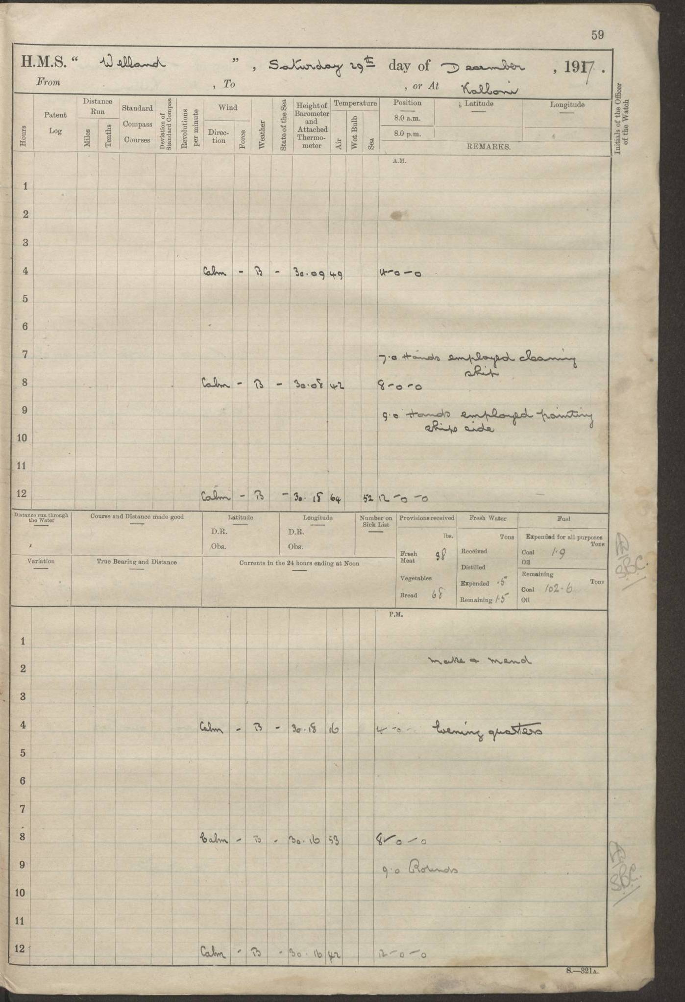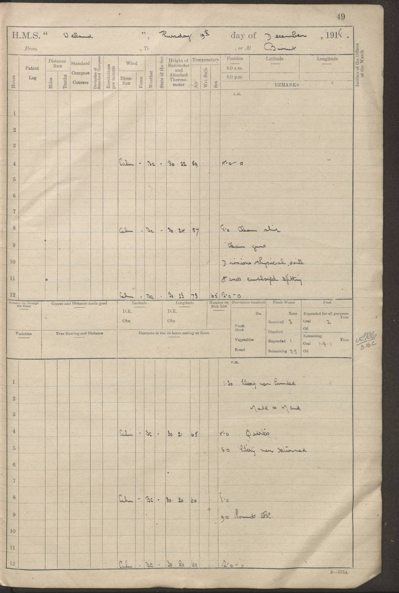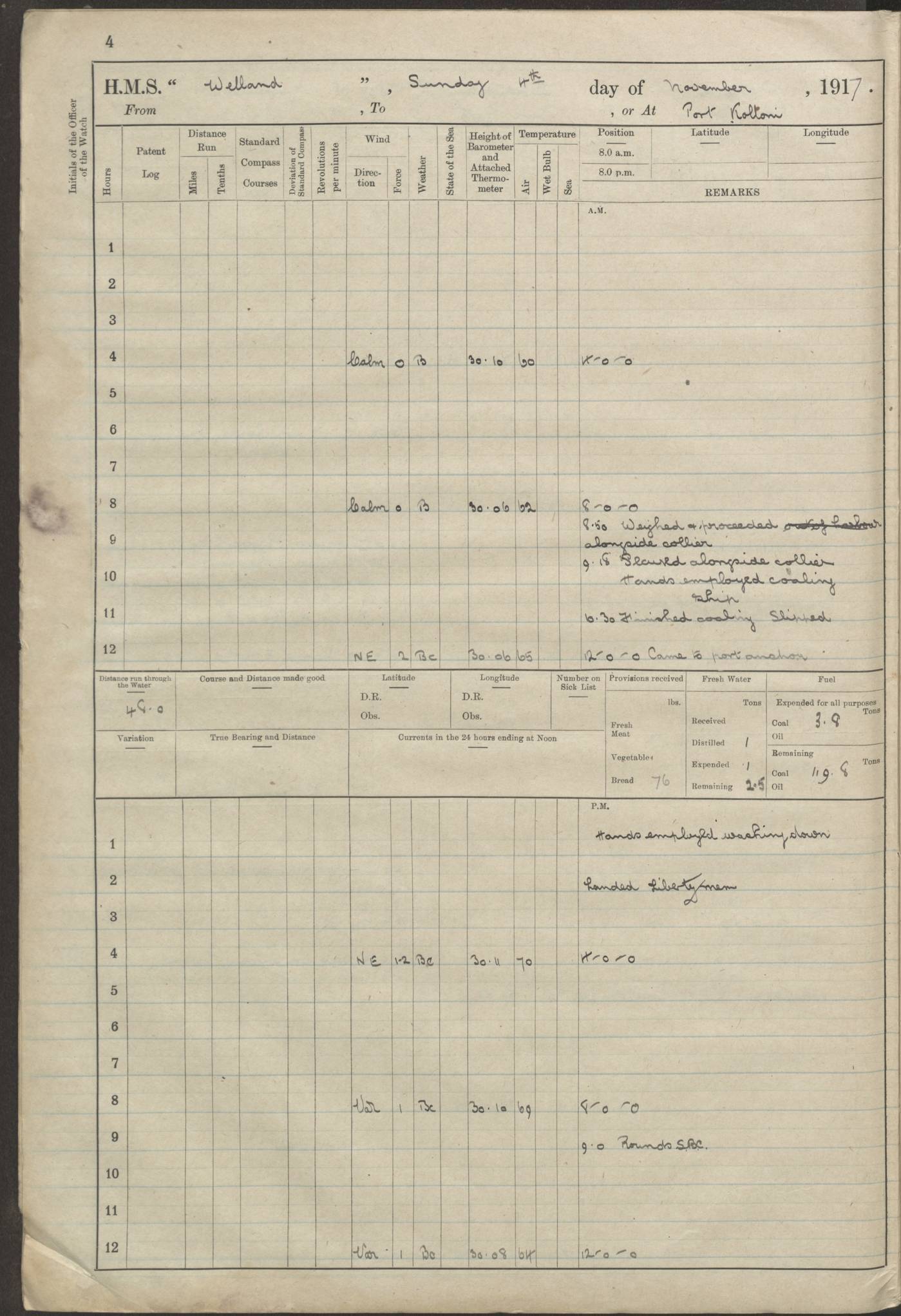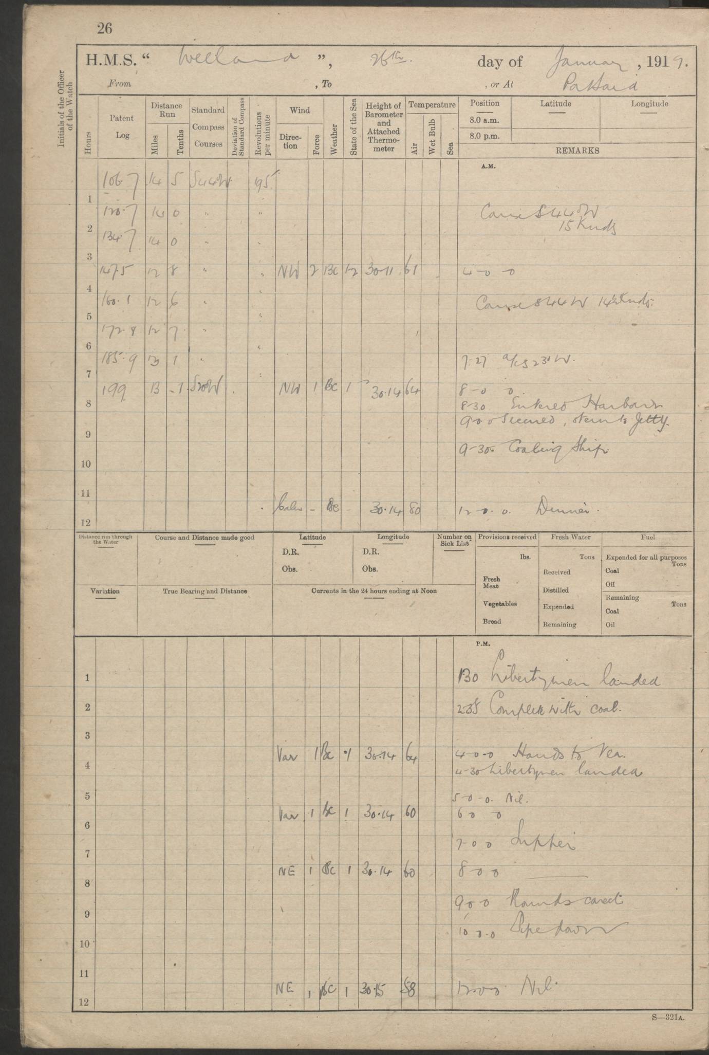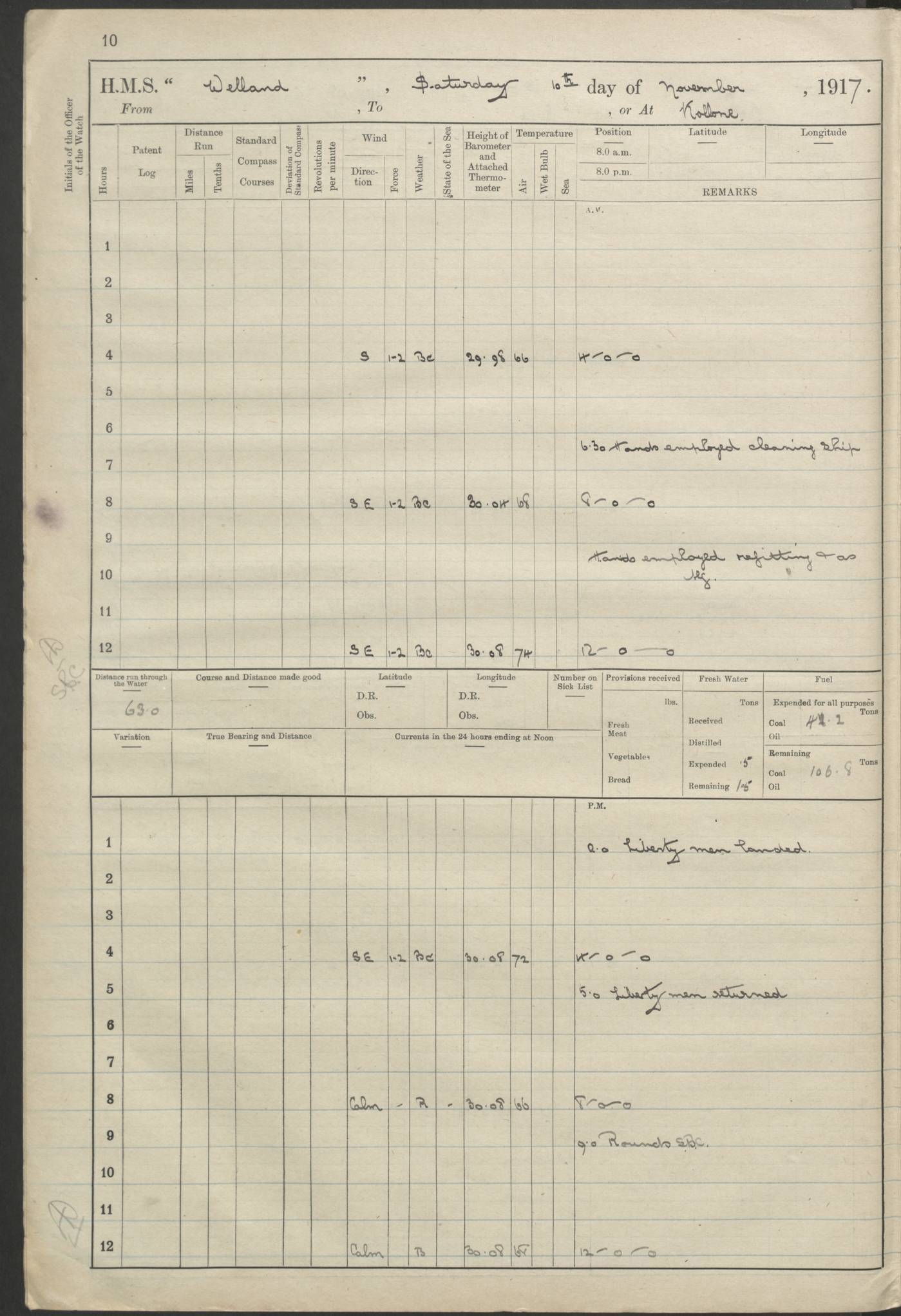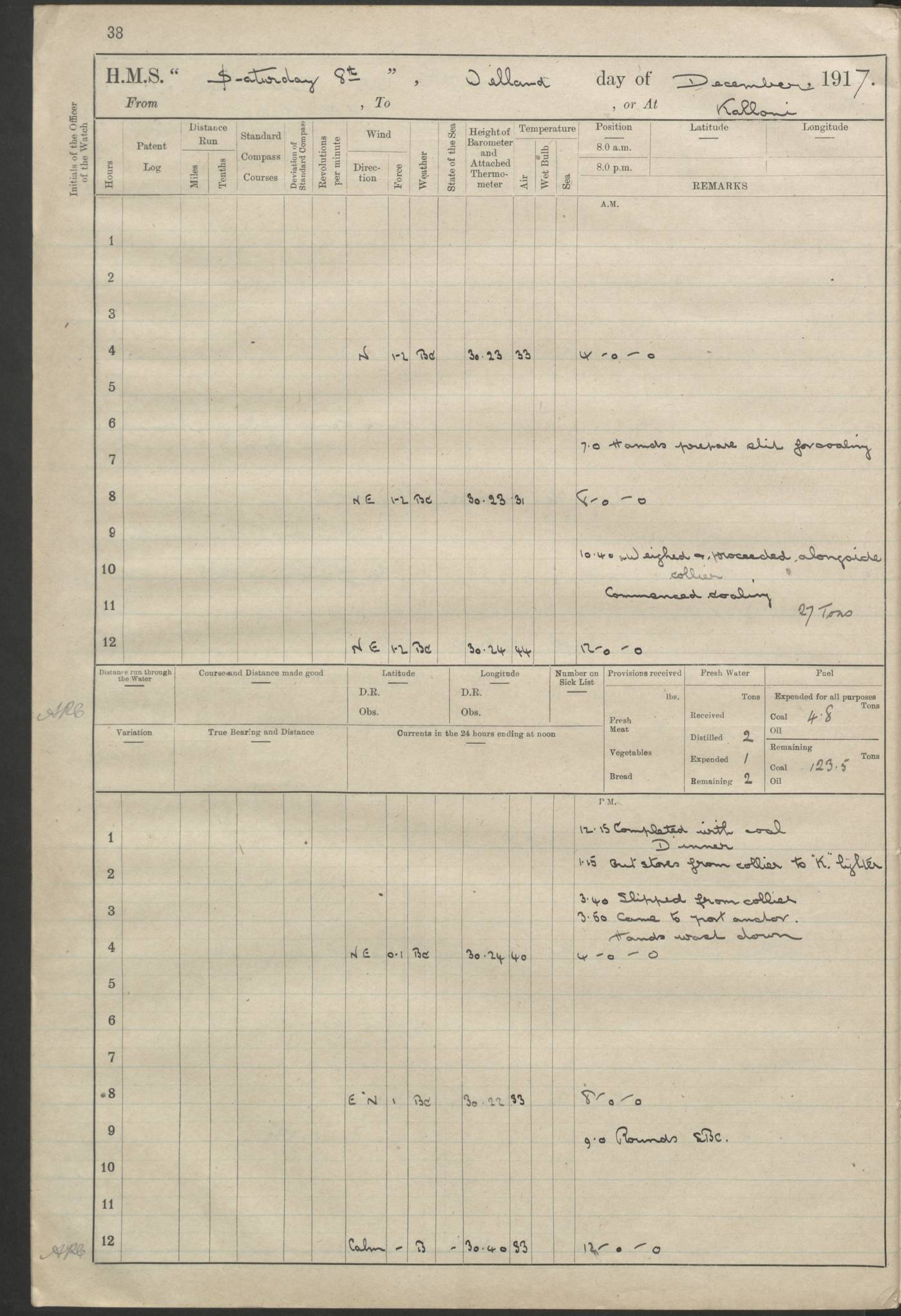 LOGS FOR JANUARY 1917 [Port Iero including Gulf of Smyrna patrol, Mudros including Dardanelles patrol, Suda Bay and Mudros] 4caf8cb8cadfd341970379f0: (http://oldweather.s3.amazonaws.com/ADM 53-68380/ADM 53-68380-001_0.jpg) 4caf8cb8cadfd341970379f1: (http://oldweather.s3.amazonaws.com/ADM 53-68380/ADM 53-68380-001_1.jpg) Blue front cover of Logbook January/February 1917. 4caf8cb8cadfd341970379f2: (http://oldweather.s3.amazonaws.com/ADM 53-68380/ADM 53-68380-002_0.jpg) “This is to certify that this is a true copy of the original log of HMS Welland from 1st January 1917 to 28th February 1917, signed FE Ayers, Lieutenant-in-Command.” 4caf8cb8cadfd341970379f3: (http://oldweather.s3.amazonaws.com/ADM 53-68380/ADM 53-68380-002_1.jpg) Blank except for signatures of FE Ayers (2nd March 1917) and HL Hammond (stamped 1st April 1917) 4caf8cb8cadfd341970379f4: (http://oldweather.s3.amazonaws.com/ADM 53-68380/ADM 53-68380-003_0.jpg) Instruments. Aneroid barometer Negretti & Zambra 978, 8’ asl. Air thermometers (on fore bridge, screened) SA Calderara Sea thermometer SA Calderara 4caf8cb8cadfd341970379f5: (http://oldweather.s3.amazonaws.com/ADM 53-68380/ADM 53-68380-003_1.jpg) 1 January 1917 [1916 in log] Port Iero Lat 39.1, Long 26.47 6.30am: Clean ship and scrub quarterdeck. 8.45am: Quarters. Clean guns. 9.00am: Prayers. 9.30am: Clean out dinghy and whaler. 1.10pm: Landed football party. 1.15pm: Landed liberty men. 2.45pm: Clear up decks. 4.20pm: HMS Gazelle arrived. 5.10pm: Liberty men and footballers returned. 9.00pm: Rounds correct. Sick list: 2. Weather: Northerly winds up to f 4, rain at times, temperatures in the 50ºs F. 4caf8cb8cadfd341970379f6: (http://oldweather.s3.amazonaws.com/ADM 53-68380/ADM 53-68380-004_0.jpg) 2 January 1917 Port Iero Lat 39.1, Long 26.47 8.50am: Trawler 1179 [Loch Naver] secured alongside. Took in provisions and stores. 10.00am: Trawler 1179 cast off. Hands stow stores etc. In pm: Landed footballers and liberty men. 4caf8cb8cadfd341970379f7: (http://oldweather.s3.amazonaws.com/ADM 53-68380/ADM 53-68380-004_1.jpg) 3 January 1917 Port Iero, Chios, Vathi Lat 38.37, Long 26.14 8.00am: SNO Port Iero [probably the Captain of HMS Doris, Frank Larken] came onboard. 8.05am: Left harbour. 11.00am: Anchored in Chios Harbour. 12.40pm: Weighed and proceeded for Vathi [Samos]. Course S49E. 3.55pm: Anchored in Vathi harbour. 4caf8cb8cadfd341970379f8: (http://oldweather.s3.amazonaws.com/ADM 53-68380/ADM 53-68380-005_0.jpg) 4 January 1917 Port Iero Lat 38.1, Long 26.5 [approx] 9.40am: HMS Whitby Abbey arrived. 10.00am: PL 196 sailed. 10.30am: Weighed and proceeded. 10.50am: Course N59W. 1.00pm: Courses for Khios Strait. 4.30pm: Disembarked SNO, Port Iero. 5.05pm: Anchored off collier Holmpark [Holmepark in log]. 4caf8cb8cadfd341970379f9: (http://oldweather.s3.amazonaws.com/ADM 53-68380/ADM 53-68380-005_1.jpg) 5 January 1917 Port Iero Lat 39.1, Long 26.47 7.00am: Secured alongside Holmpark [or Holmesbank, both named in log] 8.45am: Finished coaling, 70 tons, cast off to anchor. 9.10am: Anchored off HMS Lowestoft. 5.20pm: HMS Anenome left collier and anchored. 8.15pm: Anenome weighed and proceeded out of harbour. 4caf8cb8cadfd341970379fa: (http://oldweather.s3.amazonaws.com/ADM 53-68380/ADM 53-68380-006_0.jpg) 6 January 1917 Port Iero Lat 39.1, Long 26.47 8.10am: RFA Kharki [Khaki in log] arrived. 11.25am: HMS M.16 arrived. 4caf8cb8cadfd341970379fb: (http://oldweather.s3.amazonaws.com/ADM 53-68380/ADM 53-68380-006_1.jpg) 7 January 1917 Port Iero and Gulf of Smyrna patrol Lat 38.67, Long 26.6 [approx] 7.15am: Left harbour for patrol 9.30am: Patrolling across entrance NE by E and SW by W. 8.00pm: Courses NW by N, SE by S. 11.59pm: Proceeded for Syra. 4caf8cb8cadfd341970379fc: (http://oldweather.s3.amazonaws.com/ADM 53-68380/ADM 53-68380-007_0.jpg) 8 January 1917 At sea to Syra [Siros] for escort duty Lat 37.44, Long 24.95 2.30am: Pasha Lt bg WNW 2 miles. 4.50am: Course S49W. 4.53am: Venetiko I. bg NW, 1.5 miles. 6.30am: Passed large transport (2 funnels, 2 masts) steering Southerly course. 7.30am: Passed River class destroyer on opposite course. 9.30am: Courses for Mykoni channel and approaching Syra. 10.40am: Anchored in Syra harbour. 4.40pm: Weighed and proceeded out of harbour, courses as requisite escorting Greek steamer from Syra to Mytilene. 9.00pm: Course N57E, 12 knots. 4caf8cb8cadfd341970379fd: (http://oldweather.s3.amazonaws.com/ADM 53-68380/ADM 53-68380-007_1.jpg) 9 January 1917 At sea to Port Iero and Mudros Lat 39.1, Long 26.47 1.00am: Psara Lt bg NE by E. 2.11am: Same abeam to starboard, 2 miles. 6.25am: Pasha Light abeam. 11.20am: Anchored, Port Iero, near HMS Lowestoft. 12.30pm: Weighed and proceeded out of harbour for Mudros. 1.30pm: Signalled HMS Colne on opposite course. 3.20pm: Sigri Lt abeam to starboard, 2 miles. 6.30pm: Secured alongside SS Hollington in Mudros harbour. 4caf8cb8cadfd341970379fe: (http://oldweather.s3.amazonaws.com/ADM 53-68380/ADM 53-68380-008_0.jpg) 10 January 1917 Mudros Lat 39.88, Long 25.25 8.35am: Hands coal ship. 10.07am: Received 85 tons, cast off to anchor off HMS Blenheim. 11.45am: Weighed and proceeded alongside HMS Comet. 2.30pm: Mid. Hall RNR left ship for HMS Agamemnon. 6.00pm: Mr Somerfield, Gunner RN, joined ship from Blenheim. 4caf8cb8cadfd341970379ff: (http://oldweather.s3.amazonaws.com/ADM 53-68380/ADM 53-68380-008_1.jpg) 11 January 1917 Mudros Lat 40.2, Long 26.1 [approx] 7.30am: Weighed and proceeded to sea with HMS Wear, course N10E for Dardanelles patrol. 11.00am: Commenced Northern half of main patrol, patrolling from N point of South patrol to windward. 8.00pm: Patrolling i/c with Wear on Southern half of main patrol. 4caf8cb8cadfd34197037a00: (http://oldweather.s3.amazonaws.com/ADM 53-68380/ADM 53-68380-009_0.jpg) 12 January 1917 Dardanelles patrol Lat 40.0, Long 26.1 [approx] Southern half of main patrol, in station astern of HMS Wear. 4caf8cb8cadfd34197037a01: (http://oldweather.s3.amazonaws.com/ADM 53-68380/ADM 53-68