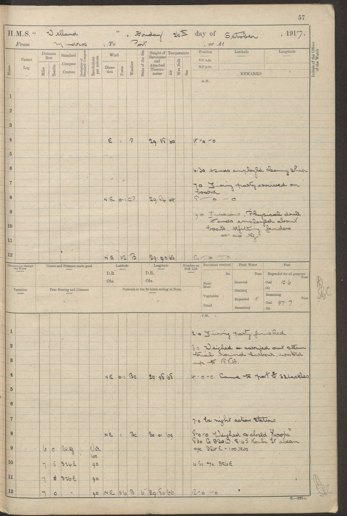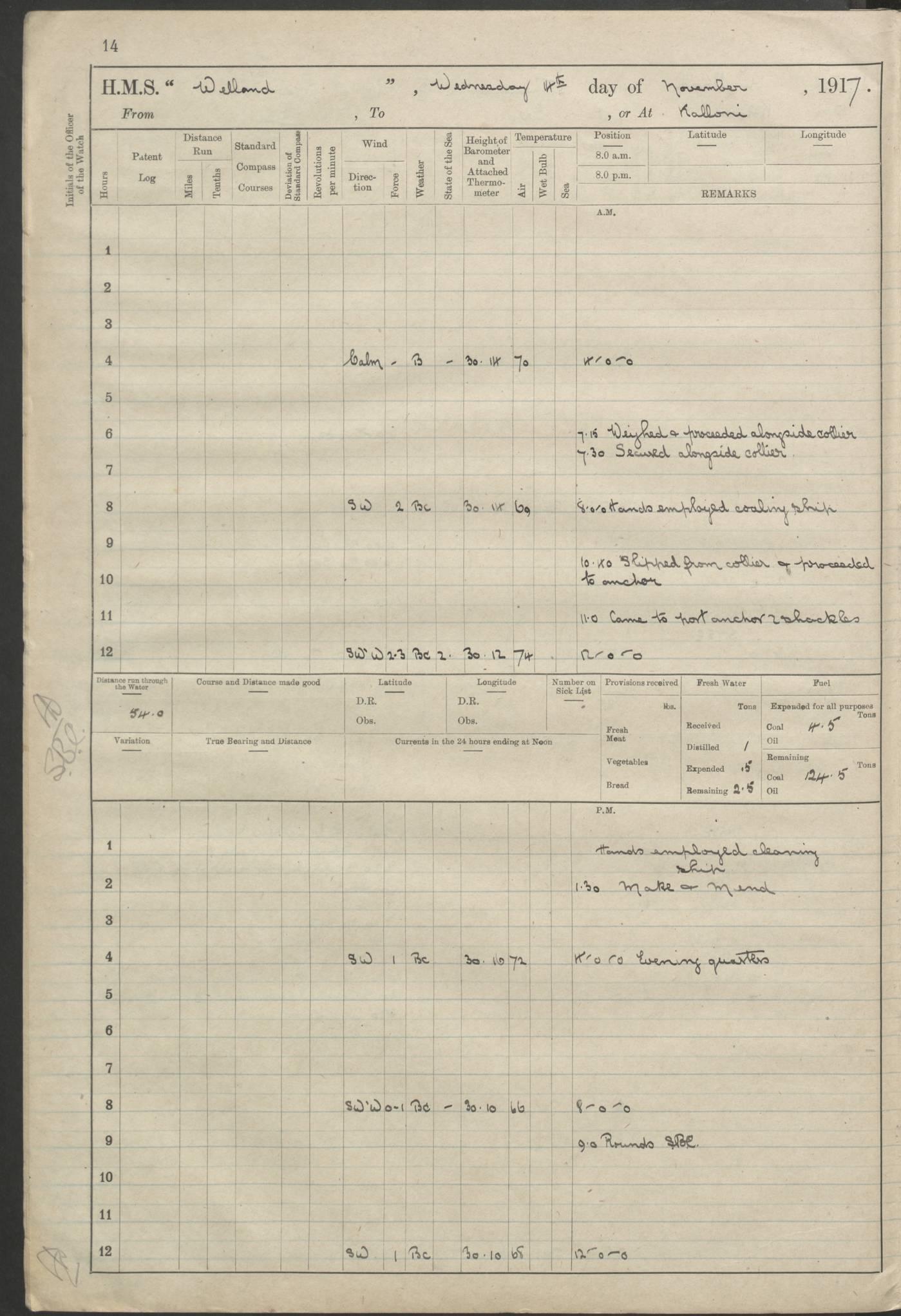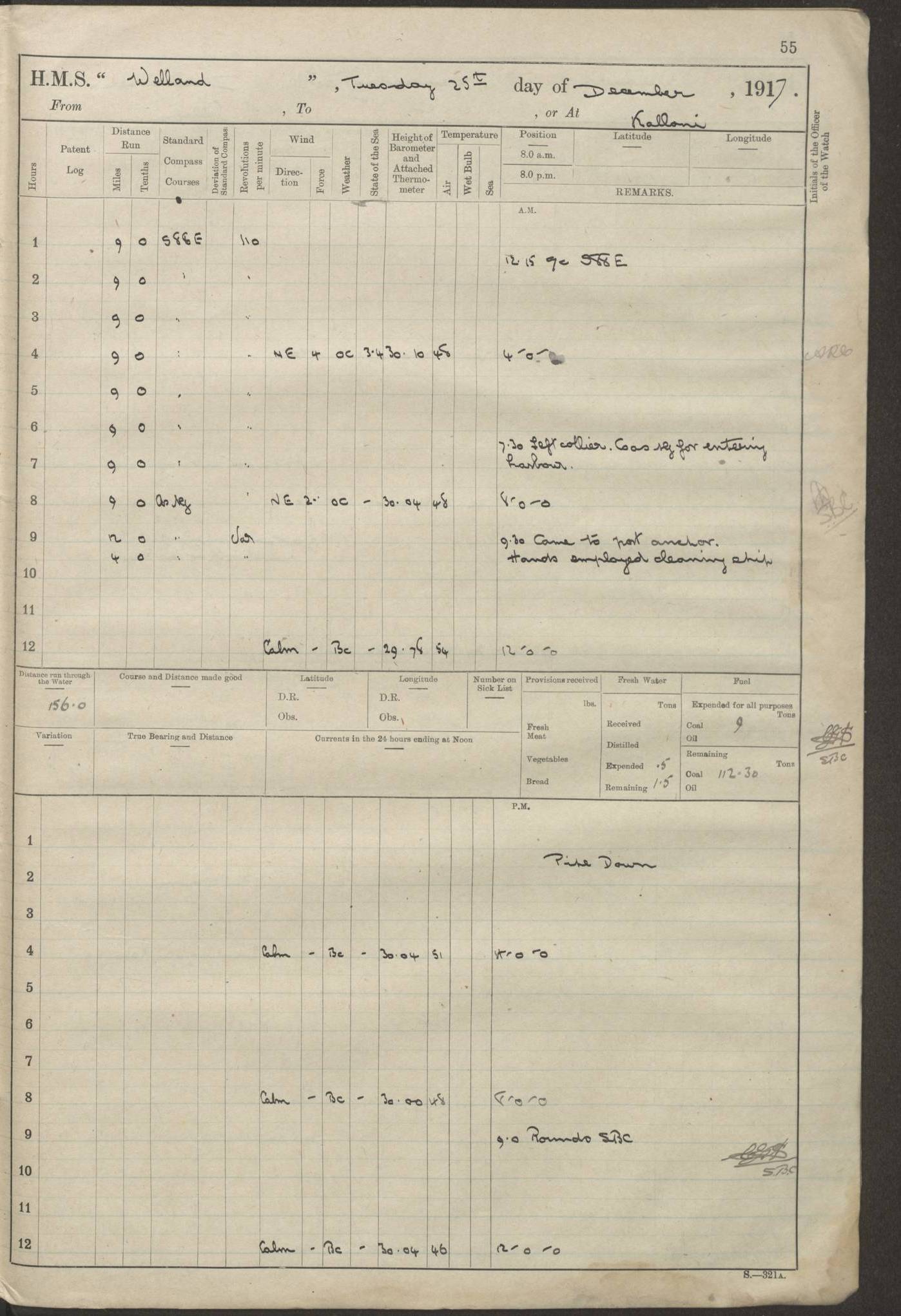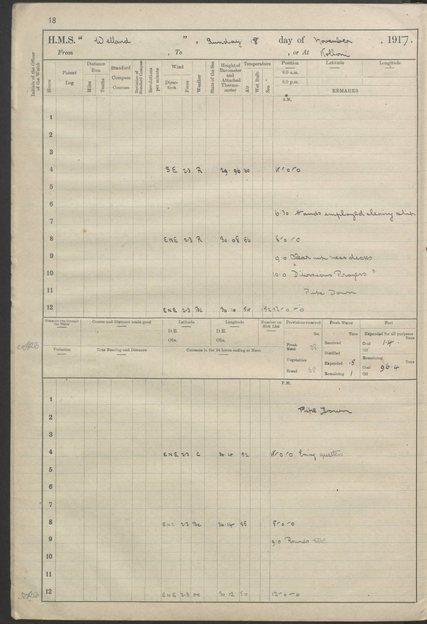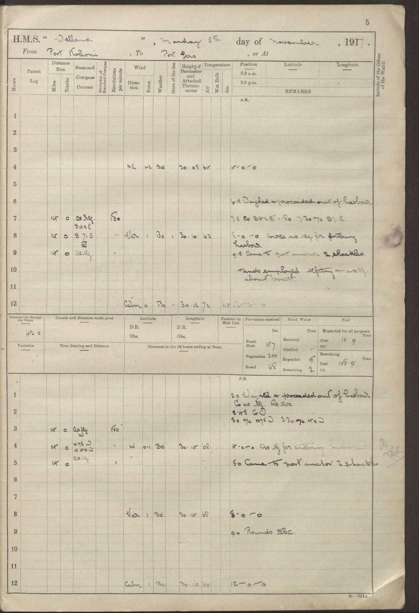 LOGS FOR JANUARY 1917 [Port Iero including Gulf of Smyrna patrol, Mudros including Dardanelles patrol, Suda Bay and Mudros] 4caf8cb8cadfd341970379f0: (http://oldweather.s3.amazonaws.com/ADM 53-68380/ADM 53-68380-001_0.jpg) 4caf8cb8cadfd341970379f1: (http://oldweather.s3.amazonaws.com/ADM 53-68380/ADM 53-68380-001_1.jpg) Blue front cover of Logbook January/February 1917. 4caf8cb8cadfd341970379f2: (http://oldweather.s3.amazonaws.com/ADM 53-68380/ADM 53-68380-002_0.jpg) “This is to certify that this is a true copy of the original log of HMS Welland from 1st January 1917 to 28th February 1917, signed FE Ayers, Lieutenant-in-Command.” 4caf8cb8cadfd341970379f3: (http://oldweather.s3.amazonaws.com/ADM 53-68380/ADM 53-68380-002_1.jpg) Blank except for signatures of FE Ayers (2nd March 1917) and HL Hammond (stamped 1st April 1917) 4caf8cb8cadfd341970379f4: (http://oldweather.s3.amazonaws.com/ADM 53-68380/ADM 53-68380-003_0.jpg) Instruments. Aneroid barometer Negretti & Zambra 978, 8’ asl. Air thermometers (on fore bridge, screened) SA Calderara Sea thermometer SA Calderara 4caf8cb8cadfd341970379f5: (http://oldweather.s3.amazonaws.com/ADM 53-68380/ADM 53-68380-003_1.jpg) 1 January 1917 [1916 in log] Port Iero Lat 39.1, Long 26.47 6.30am: Clean ship and scrub quarterdeck. 8.45am: Quarters. Clean guns. 9.00am: Prayers. 9.30am: Clean out dinghy and whaler. 1.10pm: Landed football party. 1.15pm: Landed liberty men. 2.45pm: Clear up decks. 4.20pm: HMS Gazelle arrived. 5.10pm: Liberty men and footballers returned. 9.00pm: Rounds correct. Sick list: 2. Weather: Northerly winds up to f 4, rain at times, temperatures in the 50ºs F. 4caf8cb8cadfd341970379f6: (http://oldweather.s3.amazonaws.com/ADM 53-68380/ADM 53-68380-004_0.jpg) 2 January 1917 Port Iero Lat 39.1, Long 26.47 8.50am: Trawler 1179 [Loch Naver] secured alongside. Took in provisions and stores. 10.00am: Trawler 1179 cast off. Hands stow stores etc. In pm: Landed footballers and liberty men. 4caf8cb8cadfd341970379f7: (http://oldweather.s3.amazonaws.com/ADM 53-68380/ADM 53-68380-004_1.jpg) 3 January 1917 Port Iero, Chios, Vathi Lat 38.37, Long 26.14 8.00am: SNO Port Iero [probably the Captain of HMS Doris, Frank Larken] came onboard. 8.05am: Left harbour. 11.00am: Anchored in Chios Harbour. 12.40pm: Weighed and proceeded for Vathi [Samos]. Course S49E. 3.55pm: Anchored in Vathi harbour. 4caf8cb8cadfd341970379f8: (http://oldweather.s3.amazonaws.com/ADM 53-68380/ADM 53-68380-005_0.jpg) 4 January 1917 Port Iero Lat 38.1, Long 26.5 [approx] 9.40am: HMS Whitby Abbey arrived. 10.00am: PL 196 sailed. 10.30am: Weighed and proceeded. 10.50am: Course N59W. 1.00pm: Courses for Khios Strait. 4.30pm: Disembarked SNO, Port Iero. 5.05pm: Anchored off collier Holmpark [Holmepark in log]. 4caf8cb8cadfd341970379f9: (http://oldweather.s3.amazonaws.com/ADM 53-68380/ADM 53-68380-005_1.jpg) 5 January 1917 Port Iero Lat 39.1, Long 26.47 7.00am: Secured alongside Holmpark [or Holmesbank, both named in log] 8.45am: Finished coaling, 70 tons, cast off to anchor. 9.10am: Anchored off HMS Lowestoft. 5.20pm: HMS Anenome left collier and anchored. 8.15pm: Anenome weighed and proceeded out of harbour. 4caf8cb8cadfd341970379fa: (http://oldweather.s3.amazonaws.com/ADM 53-68380/ADM 53-68380-006_0.jpg) 6 January 1917 Port Iero Lat 39.1, Long 26.47 8.10am: RFA Kharki [Khaki in log] arrived. 11.25am: HMS M.16 arrived. 4caf8cb8cadfd341970379fb: (http://oldweather.s3.amazonaws.com/ADM 53-68380/ADM 53-68380-006_1.jpg) 7 January 1917 Port Iero and Gulf of Smyrna patrol Lat 38.67, Long 26.6 [approx] 7.15am: Left harbour for patrol 9.30am: Patrolling across entrance NE by E and SW by W. 8.00pm: Courses NW by N, SE by S. 11.59pm: Proceeded for Syra. 4caf8cb8cadfd341970379fc: (http://oldweather.s3.amazonaws.com/ADM 53-68380/ADM 53-68380-007_0.jpg) 8 January 1917 At sea to Syra [Siros] for escort duty Lat 37.44, Long 24.95 2.30am: Pasha Lt bg WNW 2 miles. 4.50am: Course S49W. 4.53am: Venetiko I. bg NW, 1.5 miles. 6.30am: Passed large transport (2 funnels, 2 masts) steering Southerly course. 7.30am: Passed River class destroyer on opposite course. 9.30am: Courses for Mykoni channel and approaching Syra. 10.40am: Anchored in Syra harbour. 4.40pm: Weighed and proceeded out of harbour, courses as requisite escorting Greek steamer from Syra to Mytilene. 9.00pm: Course N57E, 12 knots. 4caf8cb8cadfd341970379fd: (http://oldweather.s3.amazonaws.com/ADM 53-68380/ADM 53-68380-007_1.jpg) 9 January 1917 At sea to Port Iero and Mudros Lat 39.1, Long 26.47 1.00am: Psara Lt bg NE by E. 2.11am: Same abeam to starboard, 2 miles. 6.25am: Pasha Light abeam. 11.20am: Anchored, Port Iero, near HMS Lowestoft. 12.30pm: Weighed and proceeded out of harbour for Mudros. 1.30pm: Signalled HMS Colne on opposite course. 3.20pm: Sigri Lt abeam to starboard, 2 miles. 6.30pm: Secured alongside SS Hollington in Mudros harbour. 4caf8cb8cadfd341970379fe: (http://oldweather.s3.amazonaws.com/ADM 53-68380/ADM 53-68380-008_0.jpg) 10 January 1917 Mudros Lat 39.88, Long 25.25 8.35am: Hands coal ship. 10.07am: Received 85 tons, cast off to anchor off HMS Blenheim. 11.45am: Weighed and proceeded alongside HMS Comet. 2.30pm: Mid. Hall RNR left ship for HMS Agamemnon. 6.00pm: Mr Somerfield, Gunner RN, joined ship from Blenheim. 4caf8cb8cadfd341970379ff: (http://oldweather.s3.amazonaws.com/ADM 53-68380/ADM 53-68380-008_1.jpg) 11 January 1917 Mudros Lat 40.2, Long 26.1 [approx] 7.30am: Weighed and proceeded to sea with HMS Wear, course N10E for Dardanelles patrol. 11.00am: Commenced Northern half of main patrol, patrolling from N point of South patrol to windward. 8.00pm: Patrolling i/c with Wear on Southern half of main patrol. 4caf8cb8cadfd34197037a00: (http://oldweather.s3.amazonaws.com/ADM 53-68380/ADM 53-68380-009_0.jpg) 12 January 1917 Dardanelles patrol Lat 40.0, Long 26.1 [approx] Southern half of main patrol, in station astern of HMS Wear. 4caf8cb8cadfd34197037a01: (http://oldweather.s3.amazonaws.com/ADM 53-68380/ADM 53-68
