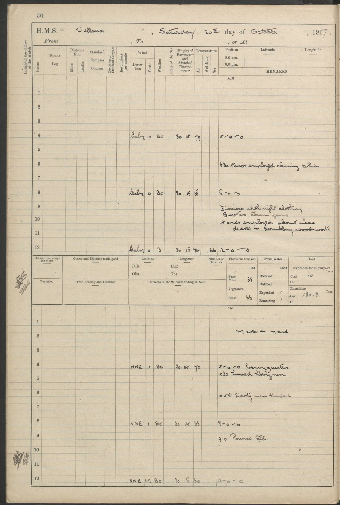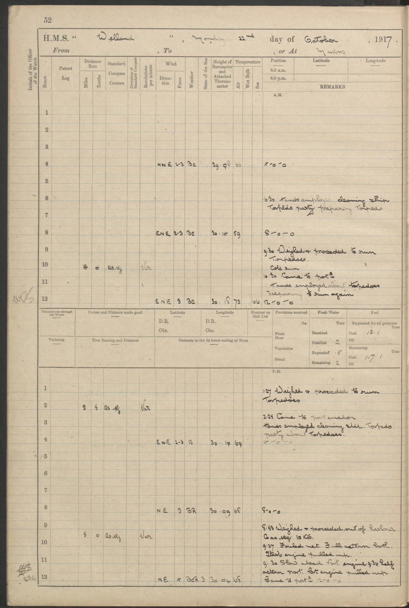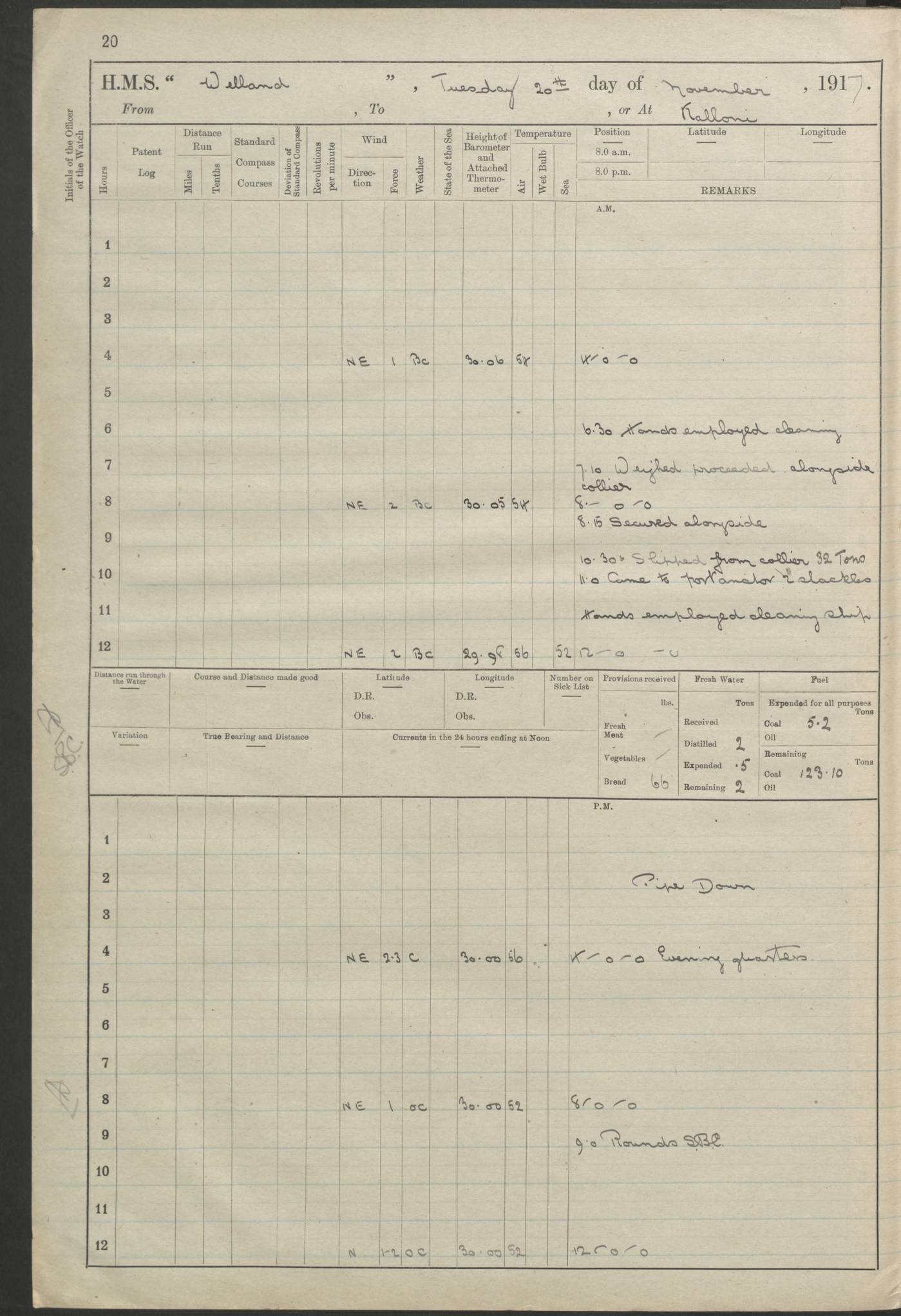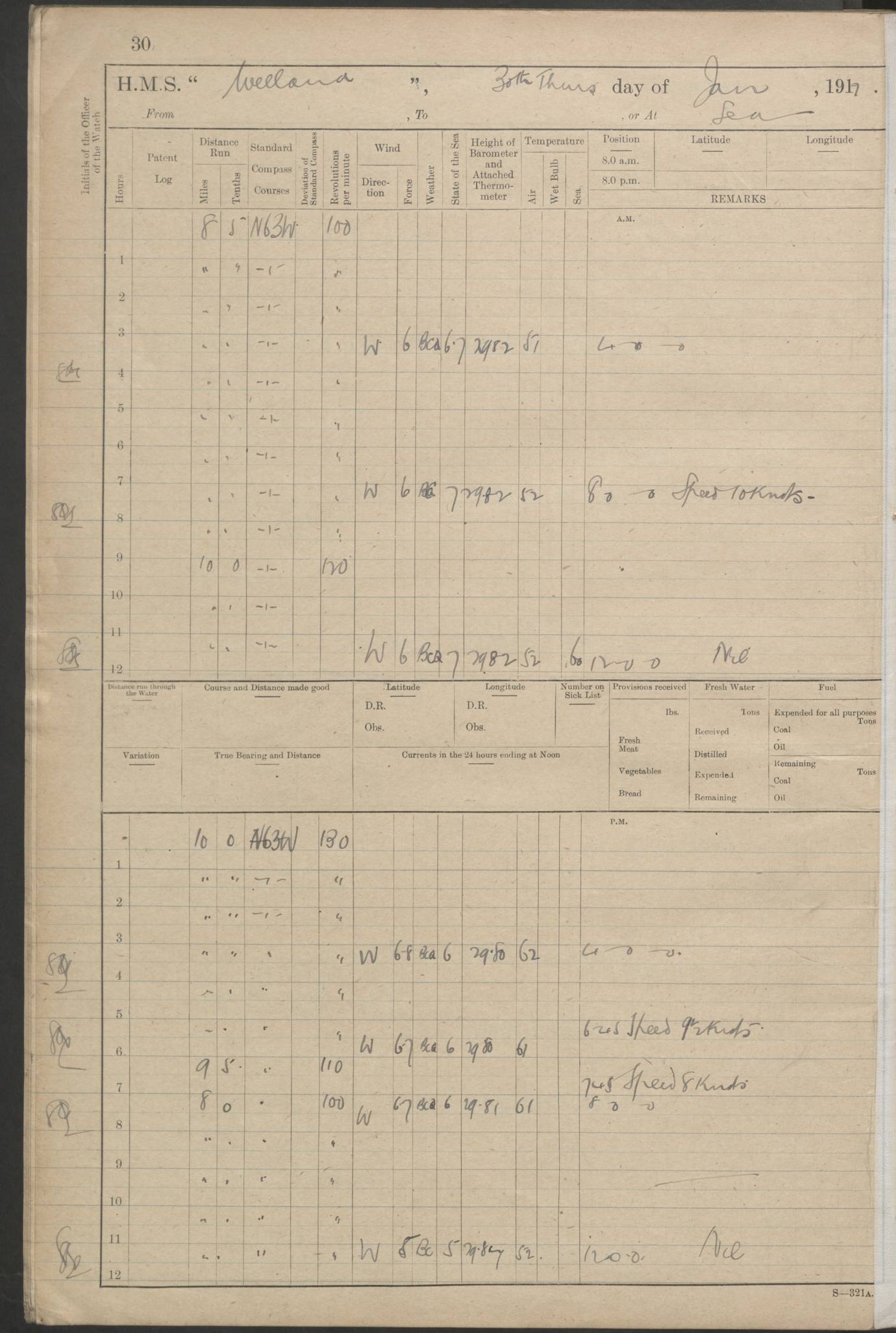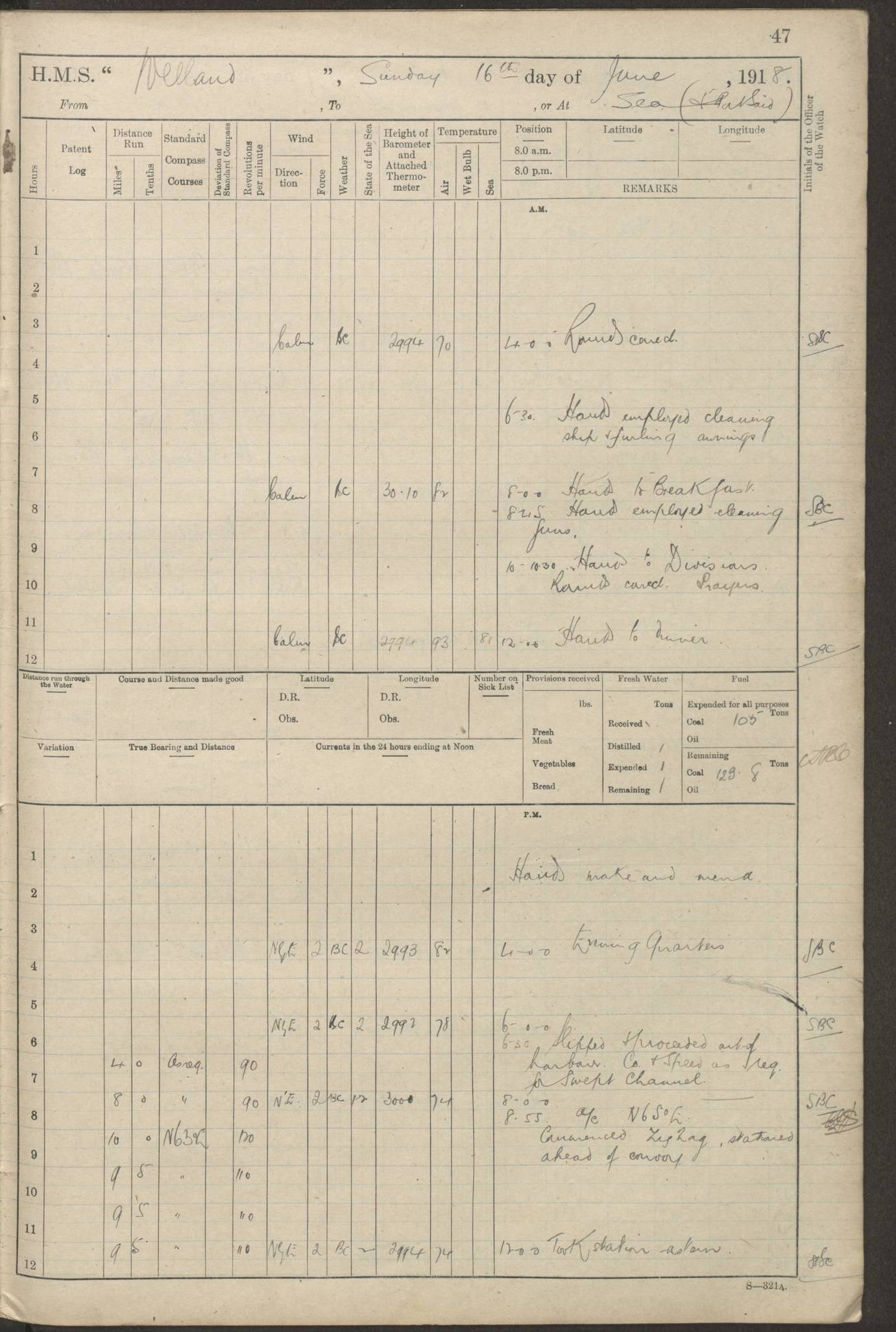 LOGS FOR JANUARY 1917 [Port Iero including Gulf of Smyrna patrol, Mudros including Dardanelles patrol, Suda Bay and Mudros] 4caf8cb8cadfd341970379f0: (http://oldweather.s3.amazonaws.com/ADM 53-68380/ADM 53-68380-001_0.jpg) 4caf8cb8cadfd341970379f1: (http://oldweather.s3.amazonaws.com/ADM 53-68380/ADM 53-68380-001_1.jpg) Blue front cover of Logbook January/February 1917. 4caf8cb8cadfd341970379f2: (http://oldweather.s3.amazonaws.com/ADM 53-68380/ADM 53-68380-002_0.jpg) “This is to certify that this is a true copy of the original log of HMS Welland from 1st January 1917 to 28th February 1917, signed FE Ayers, Lieutenant-in-Command.” 4caf8cb8cadfd341970379f3: (http://oldweather.s3.amazonaws.com/ADM 53-68380/ADM 53-68380-002_1.jpg) Blank except for signatures of FE Ayers (2nd March 1917) and HL Hammond (stamped 1st April 1917) 4caf8cb8cadfd341970379f4: (http://oldweather.s3.amazonaws.com/ADM 53-68380/ADM 53-68380-003_0.jpg) Instruments. Aneroid barometer Negretti & Zambra 978, 8’ asl. Air thermometers (on fore bridge, screened) SA Calderara Sea thermometer SA Calderara 4caf8cb8cadfd341970379f5: (http://oldweather.s3.amazonaws.com/ADM 53-68380/ADM 53-68380-003_1.jpg) 1 January 1917 [1916 in log] Port Iero Lat 39.1, Long 26.47 6.30am: Clean ship and scrub quarterdeck. 8.45am: Quarters. Clean guns. 9.00am: Prayers. 9.30am: Clean out dinghy and whaler. 1.10pm: Landed football party. 1.15pm: Landed liberty men. 2.45pm: Clear up decks. 4.20pm: HMS Gazelle arrived. 5.10pm: Liberty men and footballers returned. 9.00pm: Rounds correct. Sick list: 2. Weather: Northerly winds up to f 4, rain at times, temperatures in the 50ºs F. 4caf8cb8cadfd341970379f6: (http://oldweather.s3.amazonaws.com/ADM 53-68380/ADM 53-68380-004_0.jpg) 2 January 1917 Port Iero Lat 39.1, Long 26.47 8.50am: Trawler 1179 [Loch Naver] secured alongside. Took in provisions and stores. 10.00am: Trawler 1179 cast off. Hands stow stores etc. In pm: Landed footballers and liberty men. 4caf8cb8cadfd341970379f7: (http://oldweather.s3.amazonaws.com/ADM 53-68380/ADM 53-68380-004_1.jpg) 3 January 1917 Port Iero, Chios, Vathi Lat 38.37, Long 26.14 8.00am: SNO Port Iero [probably the Captain of HMS Doris, Frank Larken] came onboard. 8.05am: Left harbour. 11.00am: Anchored in Chios Harbour. 12.40pm: Weighed and proceeded for Vathi [Samos]. Course S49E. 3.55pm: Anchored in Vathi harbour. 4caf8cb8cadfd341970379f8: (http://oldweather.s3.amazonaws.com/ADM 53-68380/ADM 53-68380-005_0.jpg) 4 January 1917 Port Iero Lat 38.1, Long 26.5 [approx] 9.40am: HMS Whitby Abbey arrived. 10.00am: PL 196 sailed. 10.30am: Weighed and proceeded. 10.50am: Course N59W. 1.00pm: Courses for Khios Strait. 4.30pm: Disembarked SNO, Port Iero. 5.05pm: Anchored off collier Holmpark [Holmepark in log]. 4caf8cb8cadfd341970379f9: (http://oldweather.s3.amazonaws.com/ADM 53-68380/ADM 53-68380-005_1.jpg) 5 January 1917 Port Iero Lat 39.1, Long 26.47 7.00am: Secured alongside Holmpark [or Holmesbank, both named in log] 8.45am: Finished coaling, 70 tons, cast off to anchor. 9.10am: Anchored off HMS Lowestoft. 5.20pm: HMS Anenome left collier and anchored. 8.15pm: Anenome weighed and proceeded out of harbour. 4caf8cb8cadfd341970379fa: (http://oldweather.s3.amazonaws.com/ADM 53-68380/ADM 53-68380-006_0.jpg) 6 January 1917 Port Iero Lat 39.1, Long 26.47 8.10am: RFA Kharki [Khaki in log] arrived. 11.25am: HMS M.16 arrived. 4caf8cb8cadfd341970379fb: (http://oldweather.s3.amazonaws.com/ADM 53-68380/ADM 53-68380-006_1.jpg) 7 January 1917 Port Iero and Gulf of Smyrna patrol Lat 38.67, Long 26.6 [approx] 7.15am: Left harbour for patrol 9.30am: Patrolling across entrance NE by E and SW by W. 8.00pm: Courses NW by N, SE by S. 11.59pm: Proceeded for Syra. 4caf8cb8cadfd341970379fc: (http://oldweather.s3.amazonaws.com/ADM 53-68380/ADM 53-68380-007_0.jpg) 8 January 1917 At sea to Syra [Siros] for escort duty Lat 37.44, Long 24.95 2.30am: Pasha Lt bg WNW 2 miles. 4.50am: Course S49W. 4.53am: Venetiko I. bg NW, 1.5 miles. 6.30am: Passed large transport (2 funnels, 2 masts) steering Southerly course. 7.30am: Passed River class destroyer on opposite course. 9.30am: Courses for Mykoni channel and approaching Syra. 10.40am: Anchored in Syra harbour. 4.40pm: Weighed and proceeded out of harbour, courses as requisite escorting Greek steamer from Syra to Mytilene. 9.00pm: Course N57E, 12 knots. 4caf8cb8cadfd341970379fd: (http://oldweather.s3.amazonaws.com/ADM 53-68380/ADM 53-68380-007_1.jpg) 9 January 1917 At sea to Port Iero and Mudros Lat 39.1, Long 26.47 1.00am: Psara Lt bg NE by E. 2.11am: Same abeam to starboard, 2 miles. 6.25am: Pasha Light abeam. 11.20am: Anchored, Port Iero, near HMS Lowestoft. 12.30pm: Weighed and proceeded out of harbour for Mudros. 1.30pm: Signalled HMS Colne on opposite course. 3.20pm: Sigri Lt abeam to starboard, 2 miles. 6.30pm: Secured alongside SS Hollington in Mudros harbour. 4caf8cb8cadfd341970379fe: (http://oldweather.s3.amazonaws.com/ADM 53-68380/ADM 53-68380-008_0.jpg) 10 January 1917 Mudros Lat 39.88, Long 25.25 8.35am: Hands coal ship. 10.07am: Received 85 tons, cast off to anchor off HMS Blenheim. 11.45am: Weighed and proceeded alongside HMS Comet. 2.30pm: Mid. Hall RNR left ship for HMS Agamemnon. 6.00pm: Mr Somerfield, Gunner RN, joined ship from Blenheim. 4caf8cb8cadfd341970379ff: (http://oldweather.s3.amazonaws.com/ADM 53-68380/ADM 53-68380-008_1.jpg) 11 January 1917 Mudros Lat 40.2, Long 26.1 [approx] 7.30am: Weighed and proceeded to sea with HMS Wear, course N10E for Dardanelles patrol. 11.00am: Commenced Northern half of main patrol, patrolling from N point of South patrol to windward. 8.00pm: Patrolling i/c with Wear on Southern half of main patrol. 4caf8cb8cadfd34197037a00: (http://oldweather.s3.amazonaws.com/ADM 53-68380/ADM 53-68380-009_0.jpg) 12 January 1917 Dardanelles patrol Lat 40.0, Long 26.1 [approx] Southern half of main patrol, in station astern of HMS Wear. 4caf8cb8cadfd34197037a01: (http://oldweather.s3.amazonaws.com/ADM 53-68380/ADM 53-68