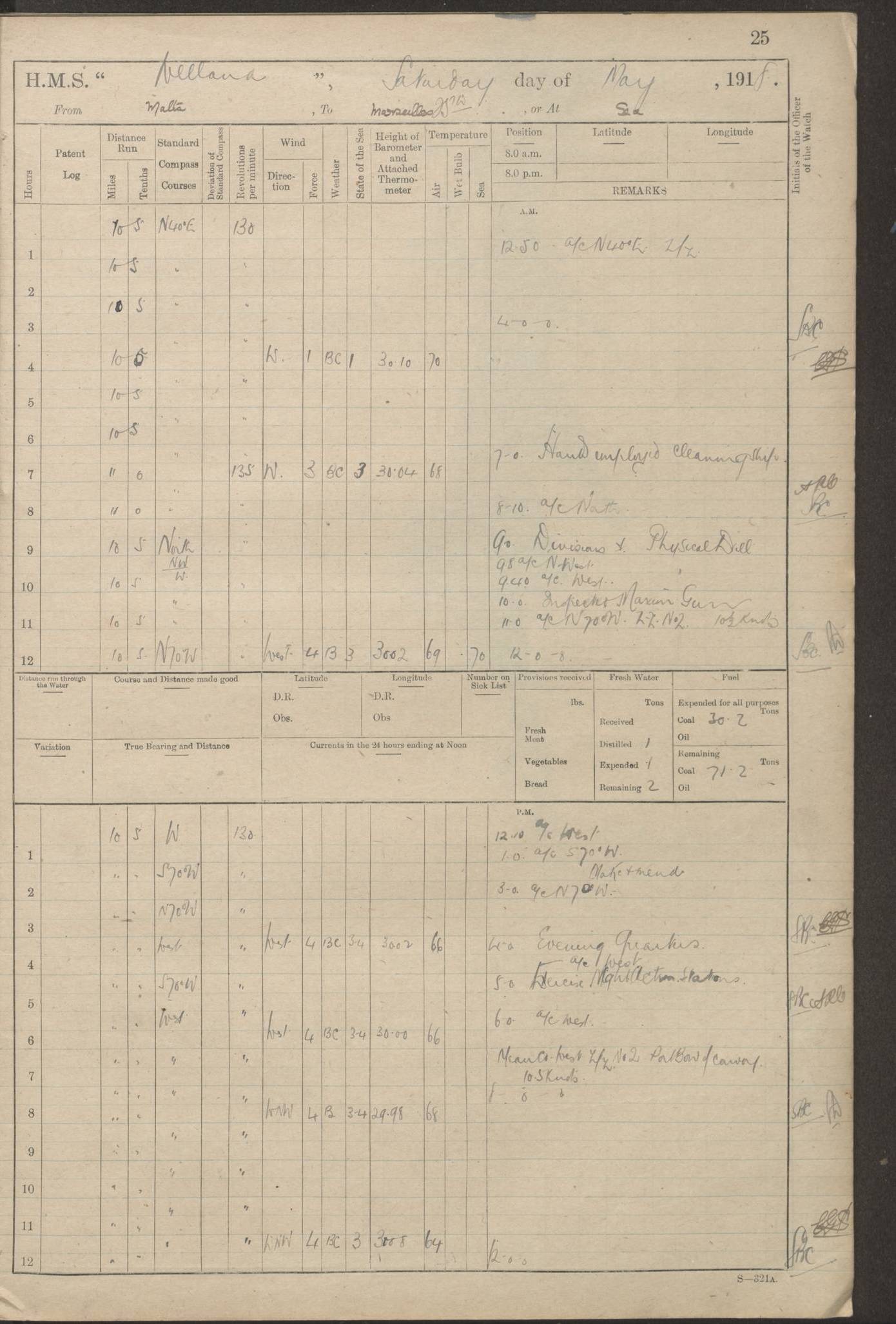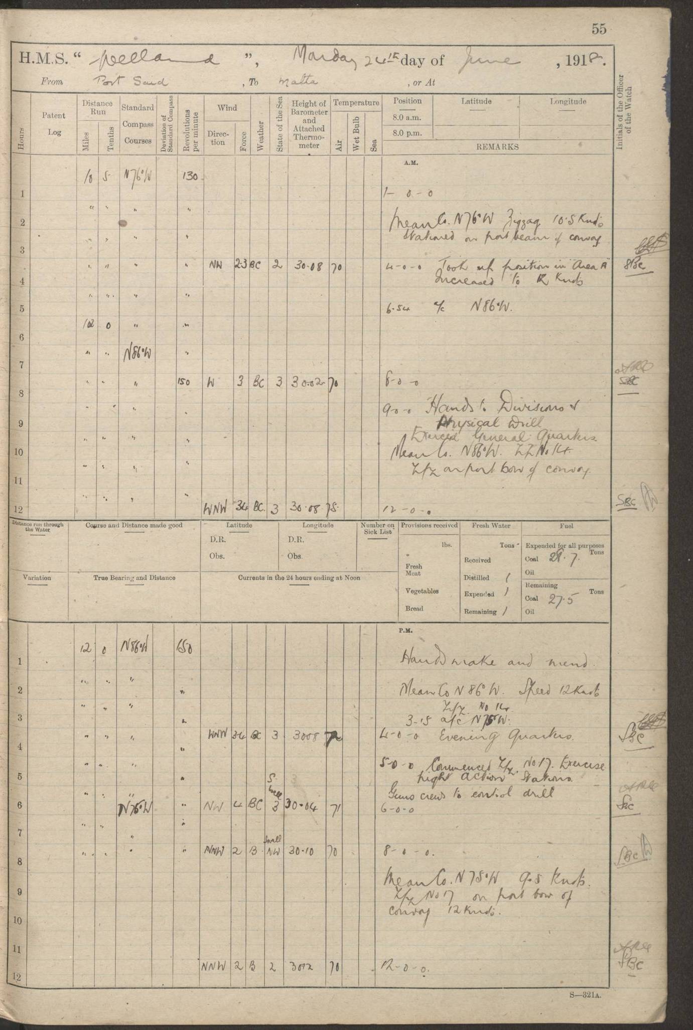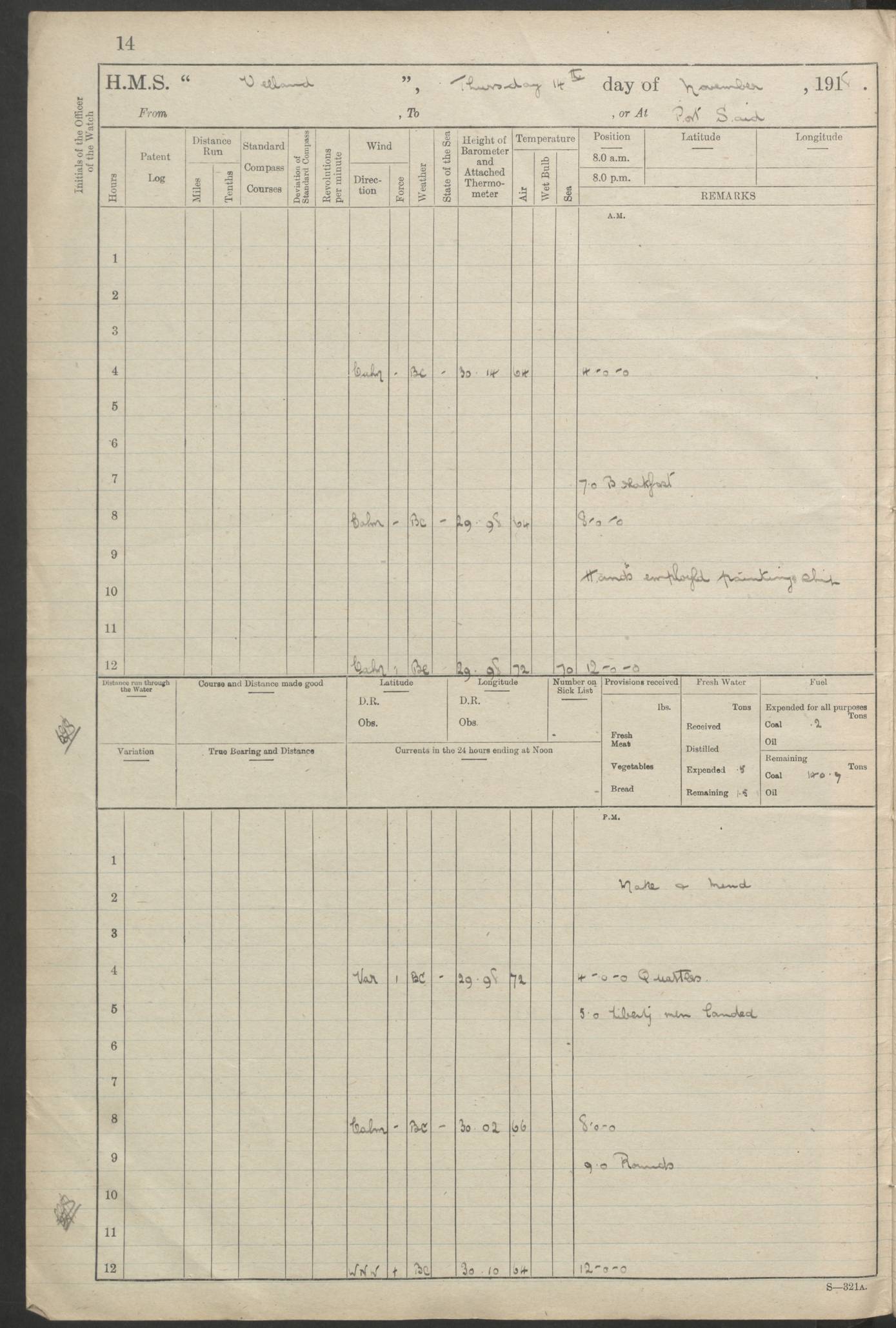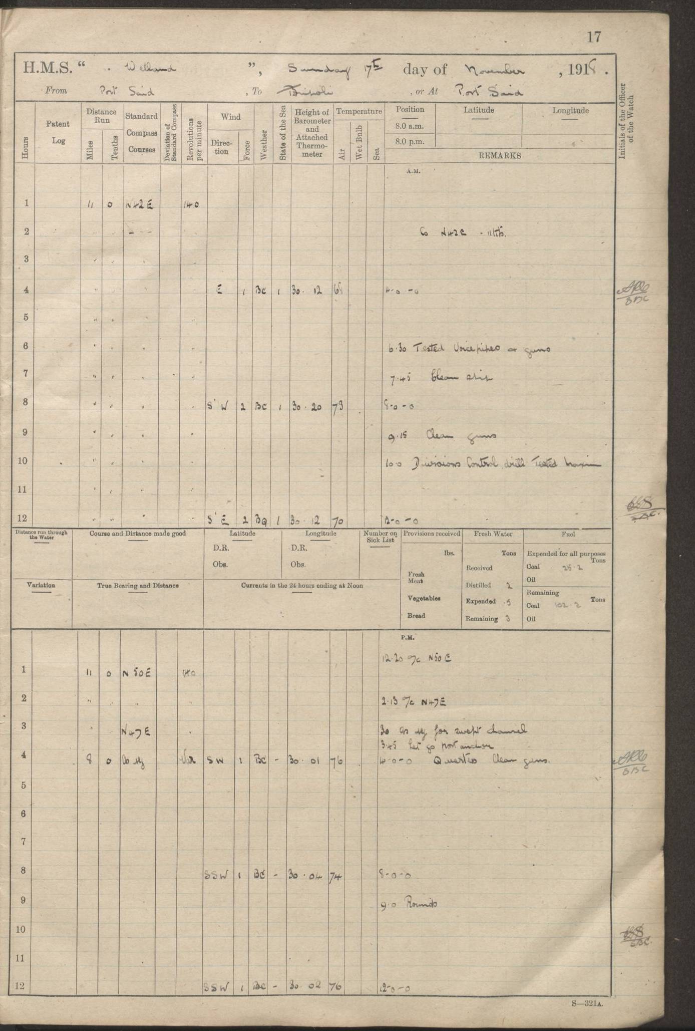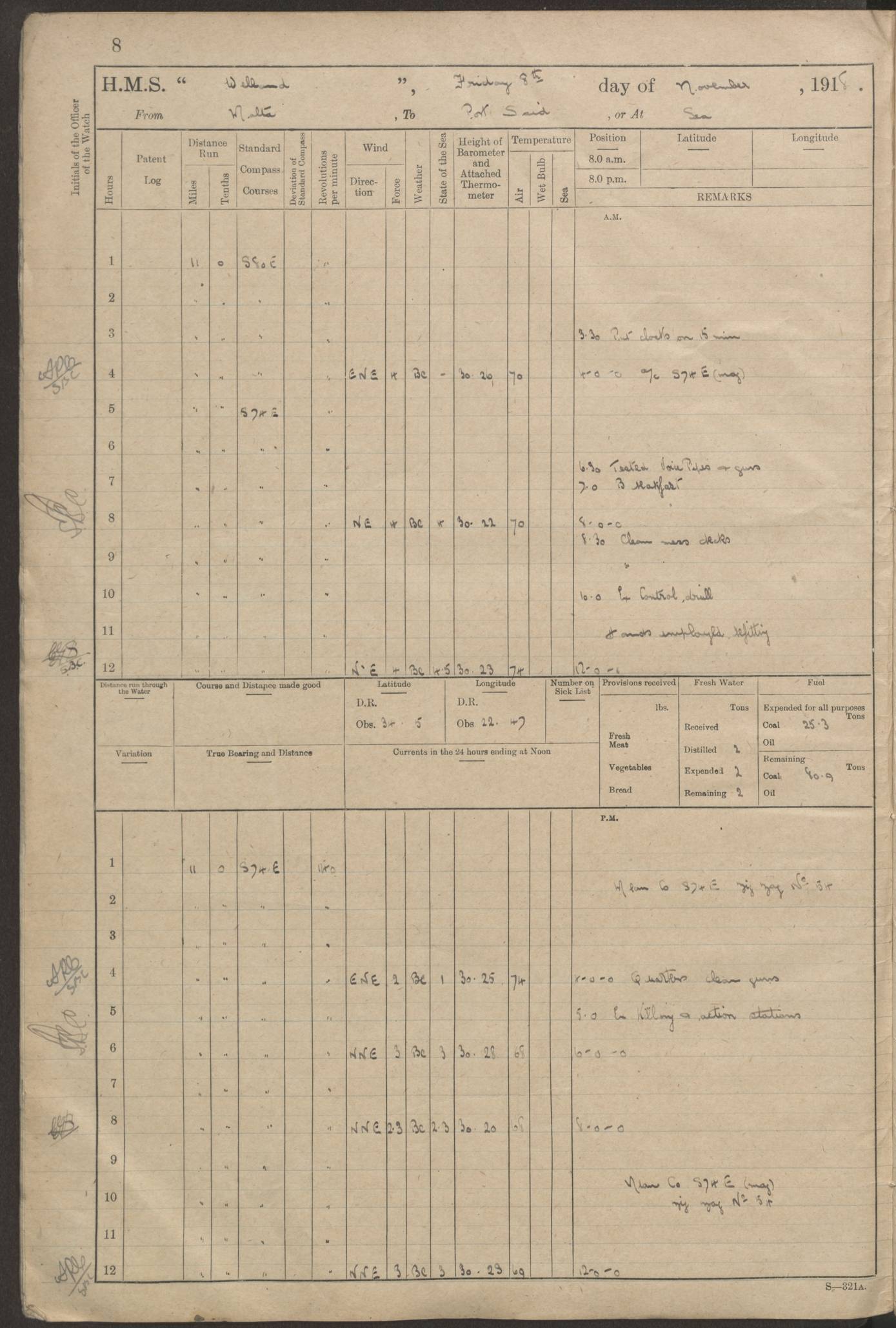4caf8cadcadfd34197037692: (http://oldweather.s3.amazonaws.com/ADM 53-68366/ADM 53-68366-017_0.jpg) 28 December 1914 Port Said Lat 31.3, Long 32.3 3.15am: Sighted Suez bearing North. 3.55am: Reduced to 7 knots as requisite for Suez. 5.45am: Came to with Starboard anchor off Suez. 6.00am: Hands preparing ship for passage up Canal. 10.30am: Hands employed cleaning guns & small arms. Weighed and proceeded as requisite for passing the Suez Canal. 1.30pm: Hands piped down. 7.05pm: Arrived Port Said. Secured by Starboard anchor & stern to Jetty. 9.00pm: Rounds. 4caf8cadcadfd34197037693: (http://oldweather.s3.amazonaws.com/ADM 53-68366/ADM 53-68366-017_1.jpg) 29 December 1914 Port Said Lat 31.3, Long 32.3 6.00am: Hands employed scrubbing decks & cleaning guns. 8.45am: Hands painting ship. 11.25am: Coal lighters came alongside. Commenced coaling. 1.00pm: Leave to Watch 4.30pm till 6.30pm. 2.00pm: Hands painting ship. 2.10pm: Finished coaling. Received 120 tons. 9.00pm: Rounds. 9.55pm: Russian Cruiser ASKOLD sailed. 4caf8cadcadfd34197037694: (http://oldweather.s3.amazonaws.com/ADM 53-68366/ADM 53-68366-018_0.jpg) 30 December 1914 Port Said to Malta Lat 31.7, Long 31.7 2.30am: Lit up No. 2 & 3 Boilers. 5.15am: Hands employed securing ship for Sea. 6.00am: Pilot came on board. Weighed & proceeded as requisite. 7.15am: Dropped Pilot. Course N 40º W. 9 knots. 9.55am: Damietta Light House bearing S 63º W. 10.00am: Altered course N 74º W. 11.00am: Hands employed cleaning ship & securing gear. 1.00pm: Hands piped down. 5.00pm: Night Defence Stations. Provided ammunition. 4caf8cadcadfd34197037695: (http://oldweather.s3.amazonaws.com/ADM 53-68366/ADM 53-68366-018_1.jpg) 31 December 1914 Port Said to Malta Lat 33.0, Long 27.3 6.15am: Fell out Special Lookouts. Returned ammunition. 7.30am: Formed Divisions Line Ahead to Starboard. Course N 67º W. 9.00am: Hands employed lashing & rigging Splinters Guard & unshipping & clearing away stanchions. 10.10am: Put clocks back 11 minutes. 1.30pm: Hands piped down. 5.5pm: Formed single Line Ahead. Provided ammunition. LOGS FOR JANUARY 1915 4caf8cadcadfd34197037696: (http://oldweather.s3.amazonaws.com/ADM 53-68366/ADM 53-68366-019_0.jpg) 1 January 1915 Port Said to Malta Lat 34.1, Long 22.8 8.30am: Stopped 8.45am: Proceeded. Single line ahead 9.30am: Hands employed making bridge screens 10.18am: Put clocks back 18 minutes 1.30pm: Hands piped down 5.30pm: Formed single line ahead. Provided ammunition. Fresh water: Distilled 1 ton; expended 1 ton; remaining 1.5 tons Fuel: expended for all purposes – coal 22.2 tons; remaining 77.1 tons [A sample complete day’s log] 4caf8cadcadfd34197037697: (http://oldweather.s3.amazonaws.com/ADM 53-68366/ADM 53-68366-019_1.jpg) 2 January 1915 Port Said to Malta Lat 35.2, Long 18.4 7.15am: Hands employed fitting life lines round upper deck 4caf8cadcadfd34197037698: (http://oldweather.s3.amazonaws.com/ADM 53-68366/ADM 53-68366-020_0.jpg) 3 January 1915 Malta Lat 35.9, Long 14.52 6.40am: Fell out special lookouts 10.45am: Secured head and stern at destroyers’ trot Lazaretto Creek 1.00pm: Chelmer shifted billet 4caf8cadcadfd34197037699: (http://oldweather.s3.amazonaws.com/ADM 53-68366/ADM 53-68366-020_1.jpg) 4 January 1915 Malta Lat 35.9, Long 14.52 8.00am: Gave general leave to port watch from 8am to 8am 6th. Coal lighter came alongside. 4caf8cadcadfd3419703769a: (http://oldweather.s3.amazonaws.com/ADM 53-68366/ADM 53-68366-021_0.jpg) 5 January 1915 [6 January in log] Malta Lat 35.9, Long 14.52 4caf8cadcadfd3419703769b: (http://oldweather.s3.amazonaws.com/ADM 53-68366/ADM 53-68366-021_1.jpg) 6 January 1915 Malta Lat 35.9, Long 14.52 12.30pm: Leave to watch from 8am to 8am Friday 4caf8cadcadfd3419703769c: (http://oldweather.s3.amazonaws.com/ADM 53-68366/ADM 53-68366-022_0.jpg) 7 January 1915 Malta Lat 35.9, Long 14.52 4caf8cadcadfd3419703769d: (http://oldweather.s3.amazonaws.com/ADM 53-68366/ADM 53-68366-022_1.jpg) 8 January 1915 Malta Lat 35.9, Long 14.52 6.45am: Hands employed preparing ship for sea 8.30am: Slipped buoy and left Lazaretto Creek. Proceeded as requisite for Grand Harbour. 9.00am: Secured alongside Chelmer at Burmola Wharf, French Creek 4caf8cadcadfd3419703769e: (http://oldweather.s3.amazonaws.com/ADM 53-68366/ADM 53-68366-023_0.jpg) 9 January 1915 Malta Lat 35.9, Long 14.52 8.25am: Hands employed in dockyard and refitting canvas gear 1.15pm: Hands employed returning stores to dockyard 4caf8cadcadfd3419703769f: (http://oldweather.s3.amazonaws.com/ADM 53-68366/ADM 53-68366-023_1.jpg) 10 January 1915 Malta Lat 35.9, Long 14.52 9.30am: Landed church parties 11.30am: Church parties returned 12.25pm: Colne left harbour 4caf8cadcadfd341970376a0: (http://oldweather.s3.amazonaws.com/ADM 53-68366/ADM 53-68366-024_0.jpg) 11 January 1915 Malta Lat 35.9, Long 14.52 8.30am: Sent 2 ratings to hospital 1.30pm: Hands employed refitting fenders Number on sick list: 2 4caf8cadcadfd341970376a1: (http://oldweather.s3.amazonaws.com/ADM 53-68366/ADM 53-68366-024_1.jpg) 12 January 1915 Malta Lat 35.9, Long 14.52 11.00am: Sent 1 rating (sick) to Egmont Number on sick list: 1 4caf8cadcadfd341970376a2: (http://oldweather.s3.amazonaws.com/ADM 53-68366/ADM 53-68366-025_0.jpg) 13 January 1915 Malta Lat 35.9, Long 14.52 10.00am: French battleship Danton docked 4caf8cadcadfd341970376a3: (http://oldweather.s3.amazonaws.com/ADM 53-68366/ADM 53-68366-025_1.jpg) 14 January 1915 Malta Lat 35.9, Long 14.52 6.30am: Hands employed preparing ship for sea 7.30am: Tug came alongside 7.45am: Ship shifted to buoy 8.35am: Commenced swinging for adjustment of compasses 9.30am: Finished swinging 11.30am: One rating rejoined from Egmont 12.10pm: Slipped and proceeded as requisite for leaving Malta, Chelmer and Kennet in company 12.25pm: Set course S87E speed 10 knots 12.35pm: Increased to 12 knots. Hands piped down. 4.00pm: Increased to 13 knots 4.50pm: Night Defence Stations provided ammunition 6.00pm: Placed look-outs 12 midnight: Altered course S88E 4caf8cadcad