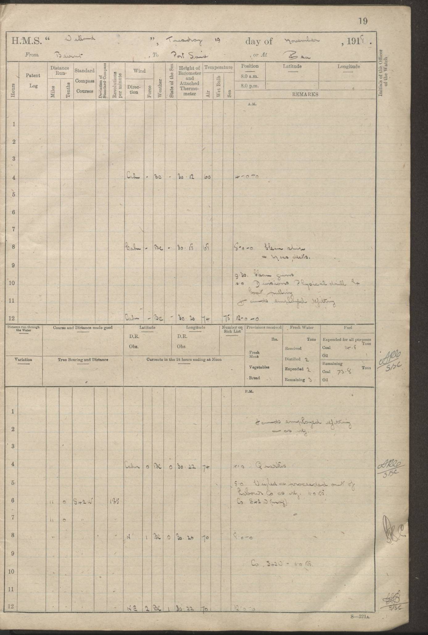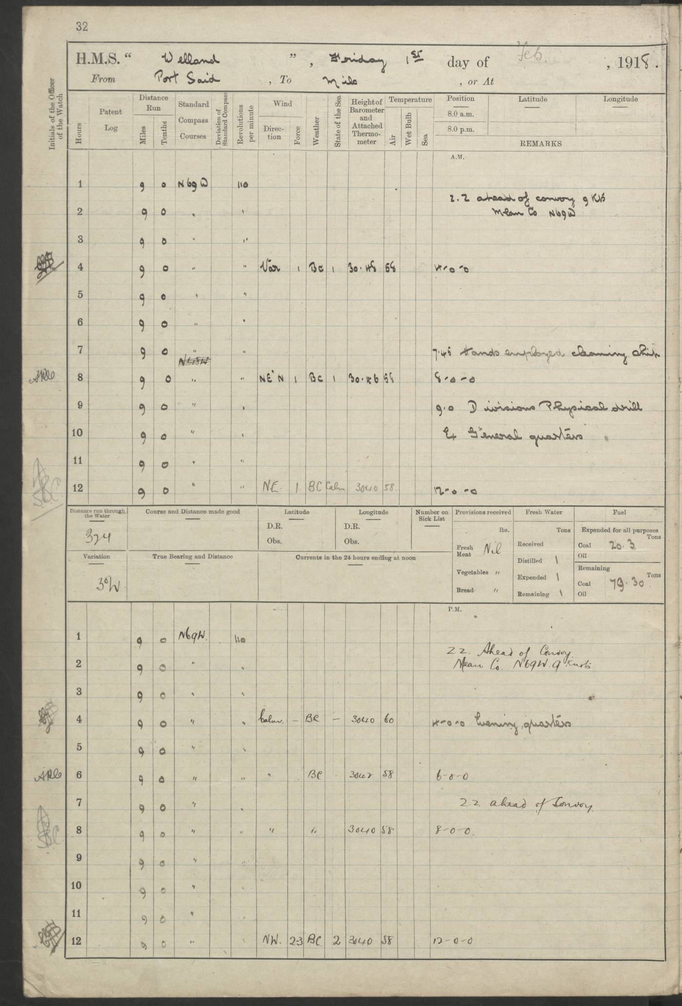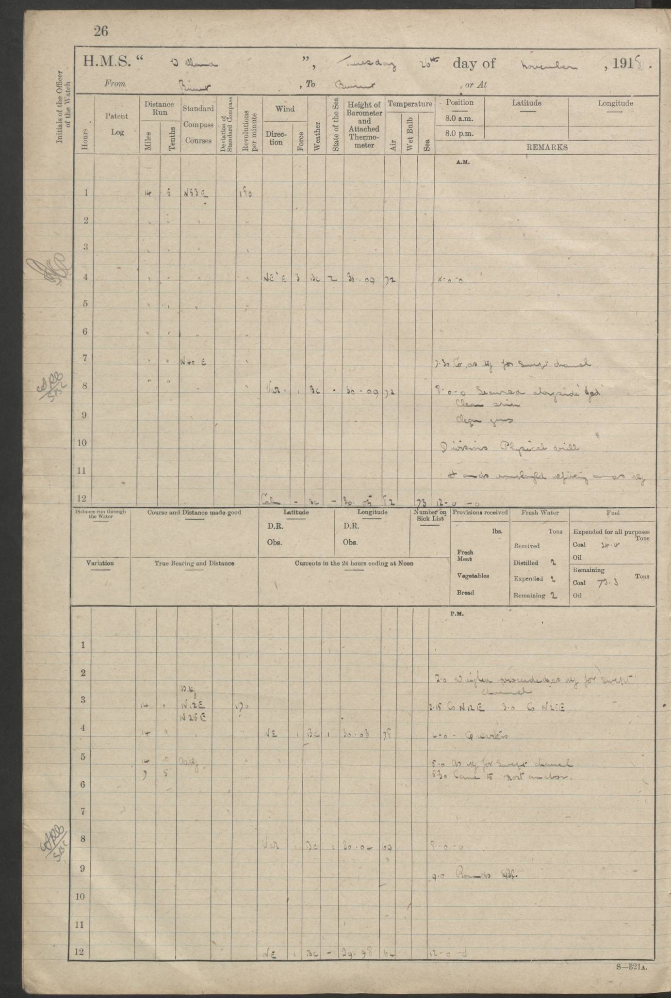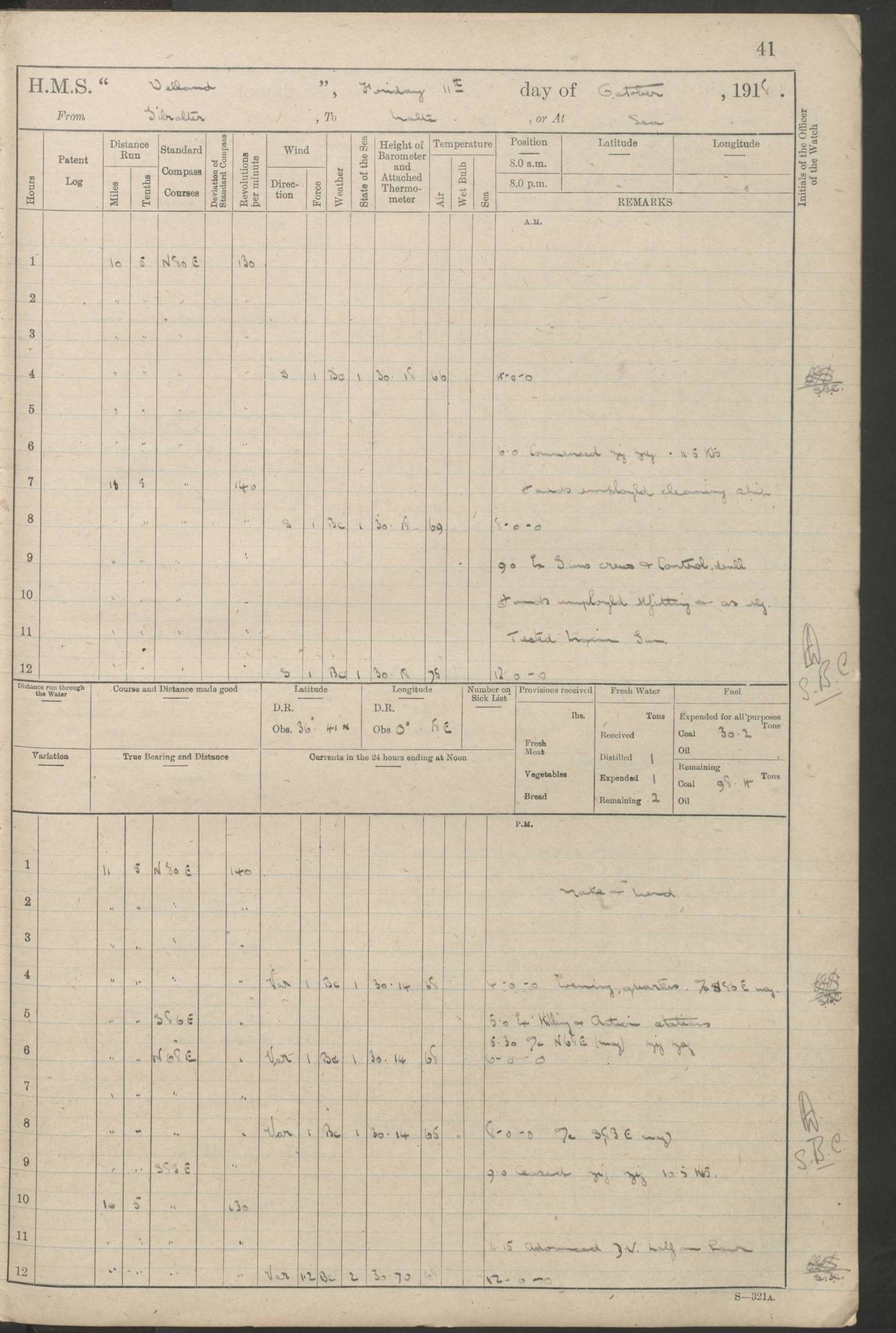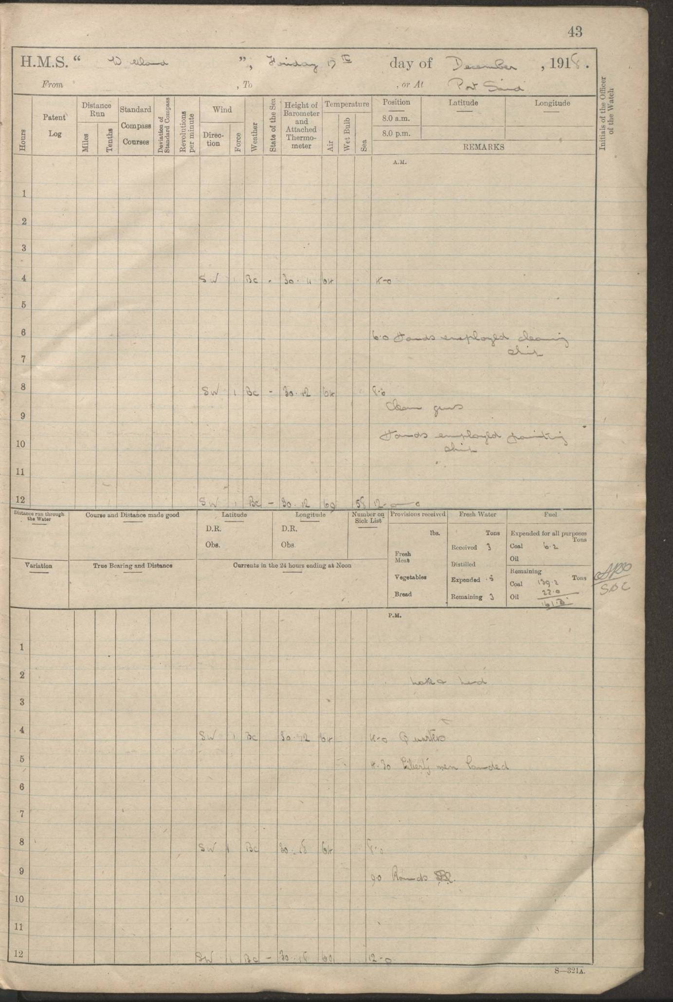 4caf8cadcadfd34197037692: (http://oldweather.s3.amazonaws.com/ADM 53-68366/ADM 53-68366-017_0.jpg) 28 December 1914 Port Said Lat 31.3, Long 32.3 3.15am: Sighted Suez bearing North. 3.55am: Reduced to 7 knots as requisite for Suez. 5.45am: Came to with Starboard anchor off Suez. 6.00am: Hands preparing ship for passage up Canal. 10.30am: Hands employed cleaning guns & small arms. Weighed and proceeded as requisite for passing the Suez Canal. 1.30pm: Hands piped down. 7.05pm: Arrived Port Said. Secured by Starboard anchor & stern to Jetty. 9.00pm: Rounds. 4caf8cadcadfd34197037693: (http://oldweather.s3.amazonaws.com/ADM 53-68366/ADM 53-68366-017_1.jpg) 29 December 1914 Port Said Lat 31.3, Long 32.3 6.00am: Hands employed scrubbing decks & cleaning guns. 8.45am: Hands painting ship. 11.25am: Coal lighters came alongside. Commenced coaling. 1.00pm: Leave to Watch 4.30pm till 6.30pm. 2.00pm: Hands painting ship. 2.10pm: Finished coaling. Received 120 tons. 9.00pm: Rounds. 9.55pm: Russian Cruiser ASKOLD sailed. 4caf8cadcadfd34197037694: (http://oldweather.s3.amazonaws.com/ADM 53-68366/ADM 53-68366-018_0.jpg) 30 December 1914 Port Said to Malta Lat 31.7, Long 31.7 2.30am: Lit up No. 2 & 3 Boilers. 5.15am: Hands employed securing ship for Sea. 6.00am: Pilot came on board. Weighed & proceeded as requisite. 7.15am: Dropped Pilot. Course N 40º W. 9 knots. 9.55am: Damietta Light House bearing S 63º W. 10.00am: Altered course N 74º W. 11.00am: Hands employed cleaning ship & securing gear. 1.00pm: Hands piped down. 5.00pm: Night Defence Stations. Provided ammunition. 4caf8cadcadfd34197037695: (http://oldweather.s3.amazonaws.com/ADM 53-68366/ADM 53-68366-018_1.jpg) 31 December 1914 Port Said to Malta Lat 33.0, Long 27.3 6.15am: Fell out Special Lookouts. Returned ammunition. 7.30am: Formed Divisions Line Ahead to Starboard. Course N 67º W. 9.00am: Hands employed lashing & rigging Splinters Guard & unshipping & clearing away stanchions. 10.10am: Put clocks back 11 minutes. 1.30pm: Hands piped down. 5.5pm: Formed single Line Ahead. Provided ammunition. LOGS FOR JANUARY 1915 4caf8cadcadfd34197037696: (http://oldweather.s3.amazonaws.com/ADM 53-68366/ADM 53-68366-019_0.jpg) 1 January 1915 Port Said to Malta Lat 34.1, Long 22.8 8.30am: Stopped 8.45am: Proceeded. Single line ahead 9.30am: Hands employed making bridge screens 10.18am: Put clocks back 18 minutes 1.30pm: Hands piped down 5.30pm: Formed single line ahead. Provided ammunition. Fresh water: Distilled 1 ton; expended 1 ton; remaining 1.5 tons Fuel: expended for all purposes – coal 22.2 tons; remaining 77.1 tons [A sample complete day’s log] 4caf8cadcadfd34197037697: (http://oldweather.s3.amazonaws.com/ADM 53-68366/ADM 53-68366-019_1.jpg) 2 January 1915 Port Said to Malta Lat 35.2, Long 18.4 7.15am: Hands employed fitting life lines round upper deck 4caf8cadcadfd34197037698: (http://oldweather.s3.amazonaws.com/ADM 53-68366/ADM 53-68366-020_0.jpg) 3 January 1915 Malta Lat 35.9, Long 14.52 6.40am: Fell out special lookouts 10.45am: Secured head and stern at destroyers’ trot Lazaretto Creek 1.00pm: Chelmer shifted billet 4caf8cadcadfd34197037699: (http://oldweather.s3.amazonaws.com/ADM 53-68366/ADM 53-68366-020_1.jpg) 4 January 1915 Malta Lat 35.9, Long 14.52 8.00am: Gave general leave to port watch from 8am to 8am 6th. Coal lighter came alongside. 4caf8cadcadfd3419703769a: (http://oldweather.s3.amazonaws.com/ADM 53-68366/ADM 53-68366-021_0.jpg) 5 January 1915 [6 January in log] Malta Lat 35.9, Long 14.52 4caf8cadcadfd3419703769b: (http://oldweather.s3.amazonaws.com/ADM 53-68366/ADM 53-68366-021_1.jpg) 6 January 1915 Malta Lat 35.9, Long 14.52 12.30pm: Leave to watch from 8am to 8am Friday 4caf8cadcadfd3419703769c: (http://oldweather.s3.amazonaws.com/ADM 53-68366/ADM 53-68366-022_0.jpg) 7 January 1915 Malta Lat 35.9, Long 14.52 4caf8cadcadfd3419703769d: (http://oldweather.s3.amazonaws.com/ADM 53-68366/ADM 53-68366-022_1.jpg) 8 January 1915 Malta Lat 35.9, Long 14.52 6.45am: Hands employed preparing ship for sea 8.30am: Slipped buoy and left Lazaretto Creek. Proceeded as requisite for Grand Harbour. 9.00am: Secured alongside Chelmer at Burmola Wharf, French Creek 4caf8cadcadfd3419703769e: (http://oldweather.s3.amazonaws.com/ADM 53-68366/ADM 53-68366-023_0.jpg) 9 January 1915 Malta Lat 35.9, Long 14.52 8.25am: Hands employed in dockyard and refitting canvas gear 1.15pm: Hands employed returning stores to dockyard 4caf8cadcadfd3419703769f: (http://oldweather.s3.amazonaws.com/ADM 53-68366/ADM 53-68366-023_1.jpg) 10 January 1915 Malta Lat 35.9, Long 14.52 9.30am: Landed church parties 11.30am: Church parties returned 12.25pm: Colne left harbour 4caf8cadcadfd341970376a0: (http://oldweather.s3.amazonaws.com/ADM 53-68366/ADM 53-68366-024_0.jpg) 11 January 1915 Malta Lat 35.9, Long 14.52 8.30am: Sent 2 ratings to hospital 1.30pm: Hands employed refitting fenders Number on sick list: 2 4caf8cadcadfd341970376a1: (http://oldweather.s3.amazonaws.com/ADM 53-68366/ADM 53-68366-024_1.jpg) 12 January 1915 Malta Lat 35.9, Long 14.52 11.00am: Sent 1 rating (sick) to Egmont Number on sick list: 1 4caf8cadcadfd341970376a2: (http://oldweather.s3.amazonaws.com/ADM 53-68366/ADM 53-68366-025_0.jpg) 13 January 1915 Malta Lat 35.9, Long 14.52 10.00am: French battleship Danton docked 4caf8cadcadfd341970376a3: (http://oldweather.s3.amazonaws.com/ADM 53-68366/ADM 53-68366-025_1.jpg) 14 January 1915 Malta Lat 35.9, Long 14.52 6.30am: Hands employed preparing ship for sea 7.30am: Tug came alongside 7.45am: Ship shifted to buoy 8.35am: Commenced swinging for adjustment of compasses 9.30am: Finished swinging 11.30am: One rating rejoined from Egmont 12.10pm: Slipped and proceeded as requisite for leaving Malta, Chelmer and Kennet in company 12.25pm: Set course S87E speed 10 knots 12.35pm: Increased to 12 knots. Hands piped down. 4.00pm: Increased to 13 knots 4.50pm: Night Defence Stations provided ammunition 6.00pm: Placed look-outs 12 midnight: Altered course S88E 4caf8cadcad