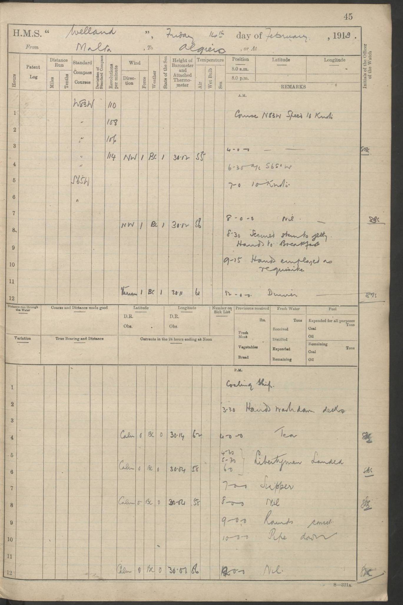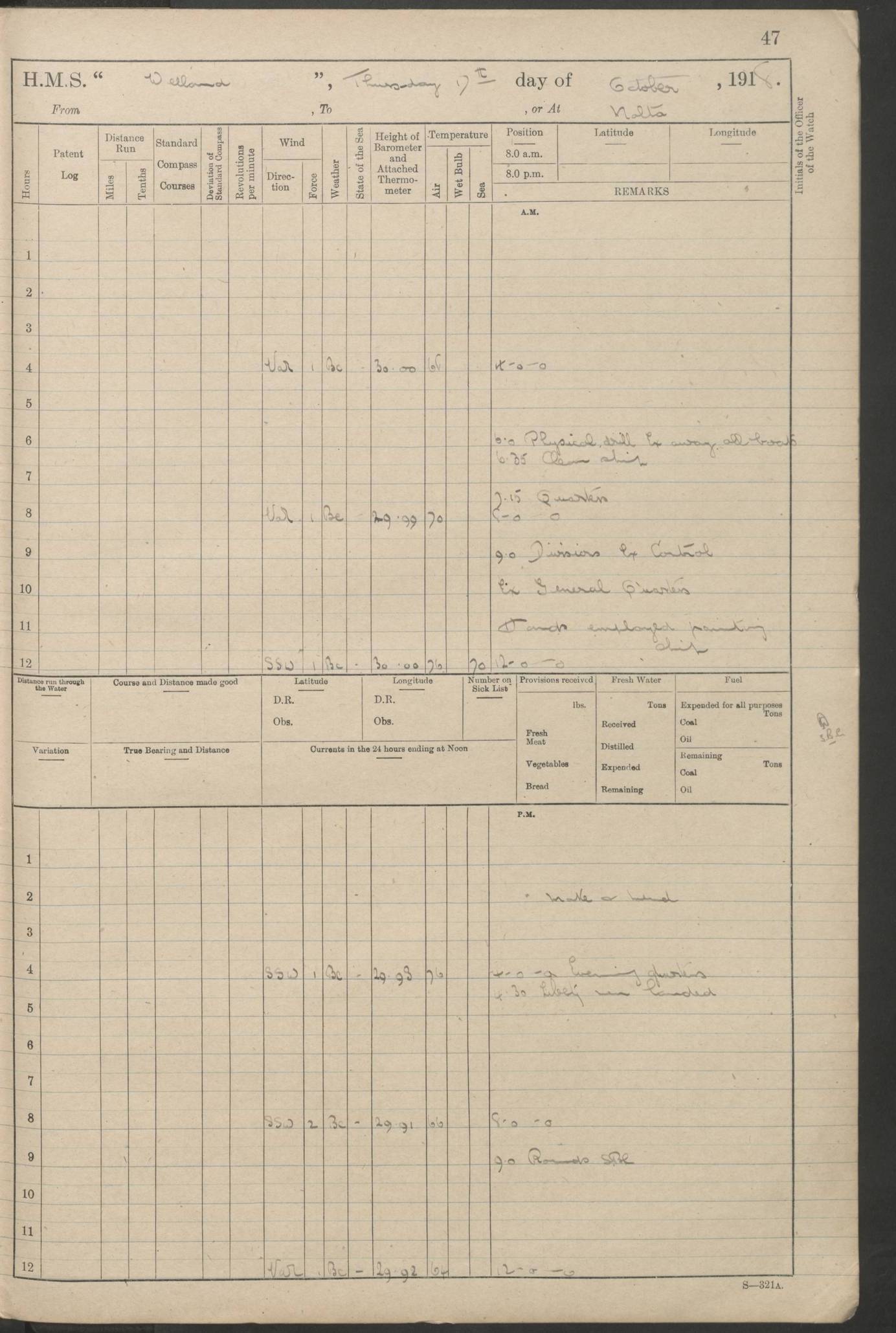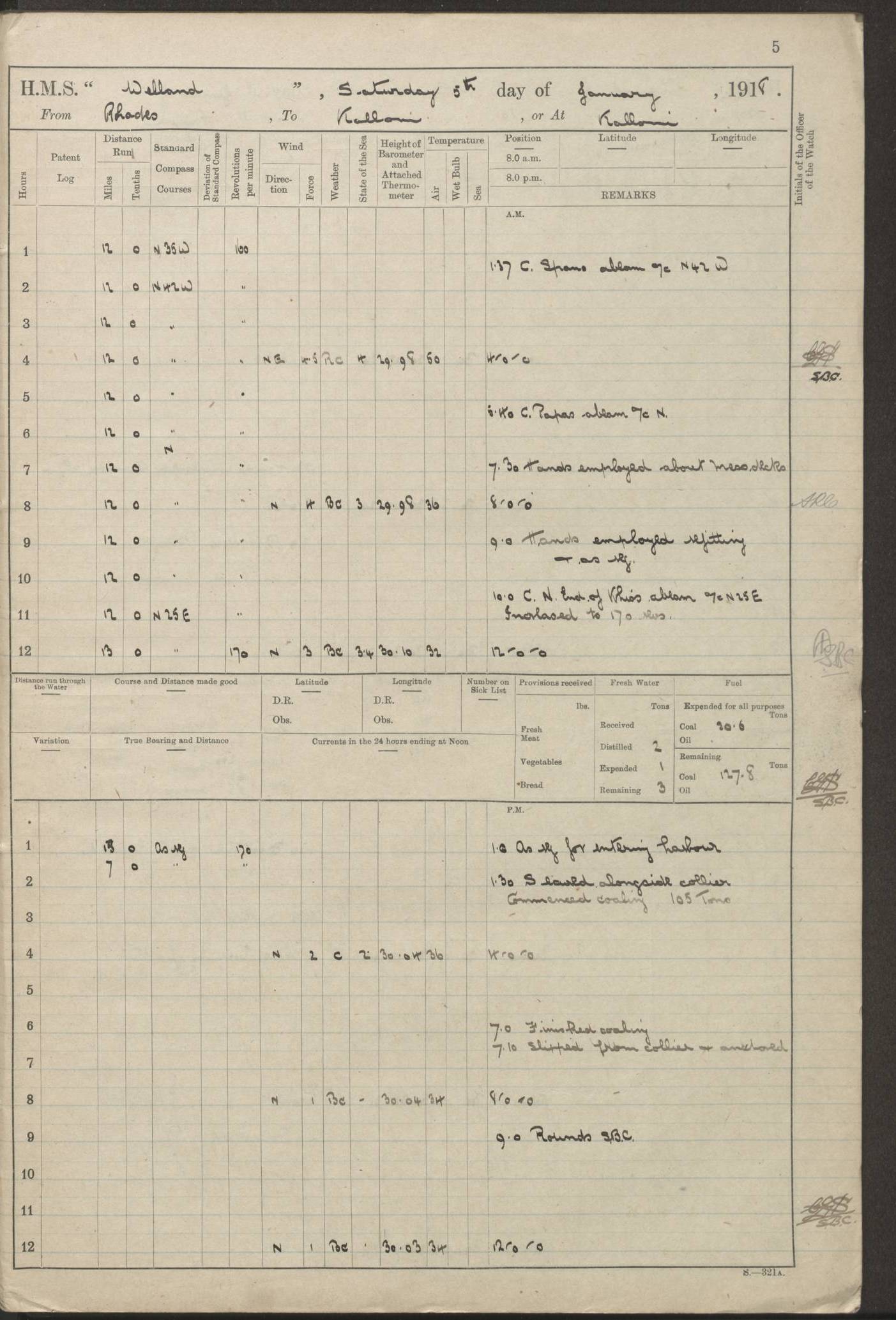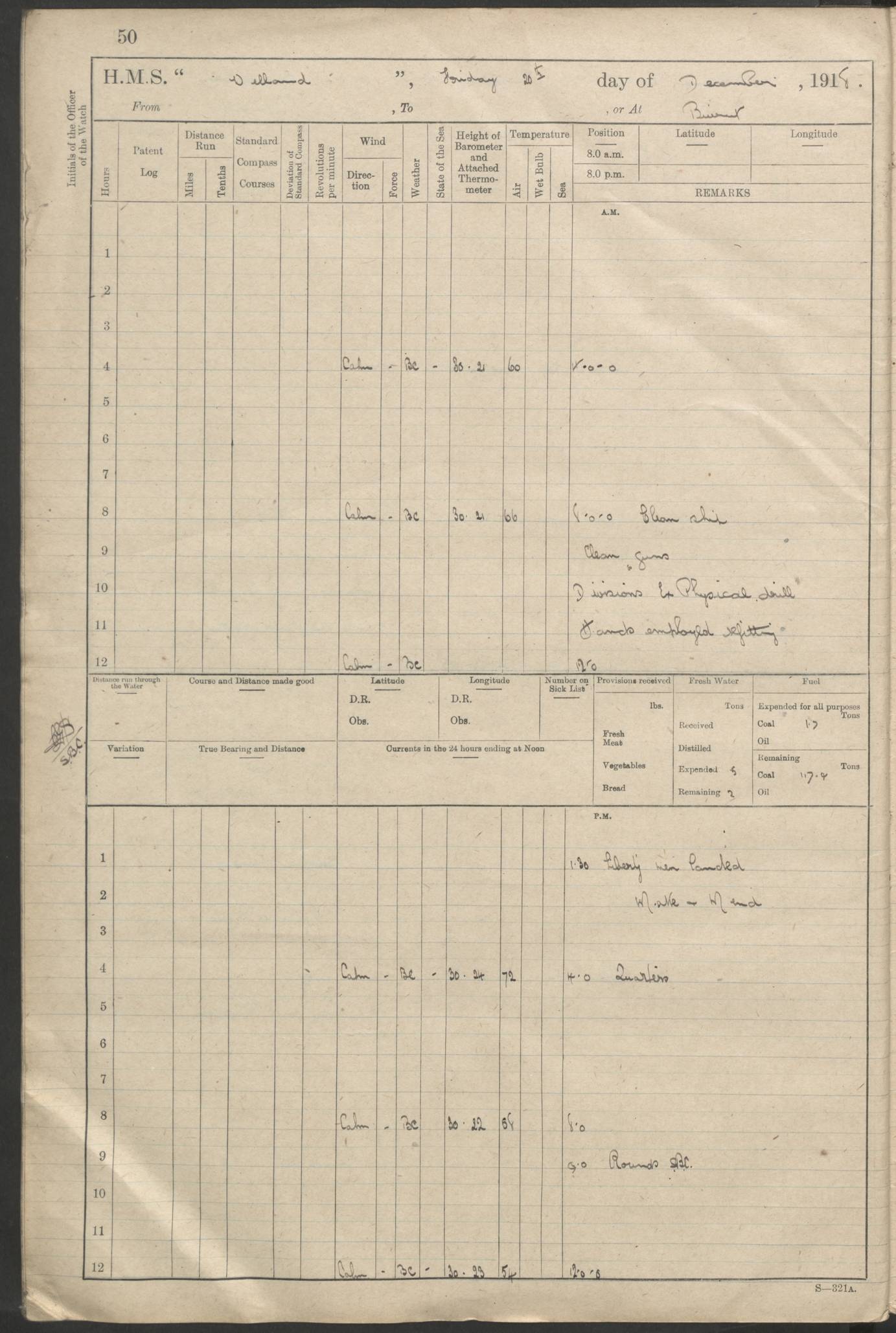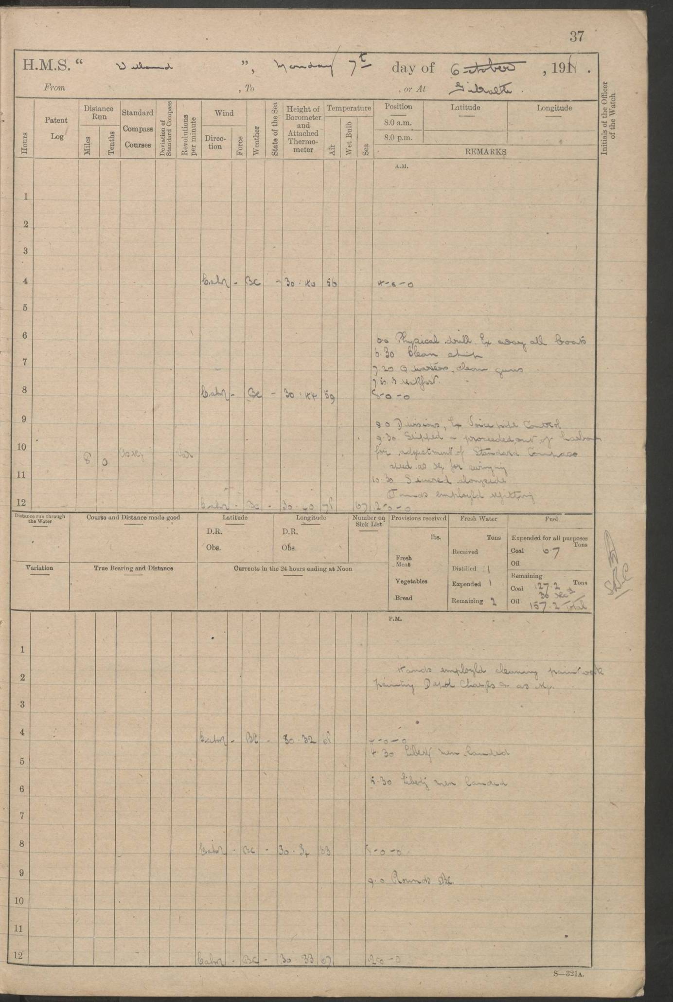 4caf8cadcadfd34197037692: (http://oldweather.s3.amazonaws.com/ADM 53-68366/ADM 53-68366-017_0.jpg) 28 December 1914 Port Said Lat 31.3, Long 32.3 3.15am: Sighted Suez bearing North. 3.55am: Reduced to 7 knots as requisite for Suez. 5.45am: Came to with Starboard anchor off Suez. 6.00am: Hands preparing ship for passage up Canal. 10.30am: Hands employed cleaning guns & small arms. Weighed and proceeded as requisite for passing the Suez Canal. 1.30pm: Hands piped down. 7.05pm: Arrived Port Said. Secured by Starboard anchor & stern to Jetty. 9.00pm: Rounds. 4caf8cadcadfd34197037693: (http://oldweather.s3.amazonaws.com/ADM 53-68366/ADM 53-68366-017_1.jpg) 29 December 1914 Port Said Lat 31.3, Long 32.3 6.00am: Hands employed scrubbing decks & cleaning guns. 8.45am: Hands painting ship. 11.25am: Coal lighters came alongside. Commenced coaling. 1.00pm: Leave to Watch 4.30pm till 6.30pm. 2.00pm: Hands painting ship. 2.10pm: Finished coaling. Received 120 tons. 9.00pm: Rounds. 9.55pm: Russian Cruiser ASKOLD sailed. 4caf8cadcadfd34197037694: (http://oldweather.s3.amazonaws.com/ADM 53-68366/ADM 53-68366-018_0.jpg) 30 December 1914 Port Said to Malta Lat 31.7, Long 31.7 2.30am: Lit up No. 2 & 3 Boilers. 5.15am: Hands employed securing ship for Sea. 6.00am: Pilot came on board. Weighed & proceeded as requisite. 7.15am: Dropped Pilot. Course N 40º W. 9 knots. 9.55am: Damietta Light House bearing S 63º W. 10.00am: Altered course N 74º W. 11.00am: Hands employed cleaning ship & securing gear. 1.00pm: Hands piped down. 5.00pm: Night Defence Stations. Provided ammunition. 4caf8cadcadfd34197037695: (http://oldweather.s3.amazonaws.com/ADM 53-68366/ADM 53-68366-018_1.jpg) 31 December 1914 Port Said to Malta Lat 33.0, Long 27.3 6.15am: Fell out Special Lookouts. Returned ammunition. 7.30am: Formed Divisions Line Ahead to Starboard. Course N 67º W. 9.00am: Hands employed lashing & rigging Splinters Guard & unshipping & clearing away stanchions. 10.10am: Put clocks back 11 minutes. 1.30pm: Hands piped down. 5.5pm: Formed single Line Ahead. Provided ammunition. LOGS FOR JANUARY 1915 4caf8cadcadfd34197037696: (http://oldweather.s3.amazonaws.com/ADM 53-68366/ADM 53-68366-019_0.jpg) 1 January 1915 Port Said to Malta Lat 34.1, Long 22.8 8.30am: Stopped 8.45am: Proceeded. Single line ahead 9.30am: Hands employed making bridge screens 10.18am: Put clocks back 18 minutes 1.30pm: Hands piped down 5.30pm: Formed single line ahead. Provided ammunition. Fresh water: Distilled 1 ton; expended 1 ton; remaining 1.5 tons Fuel: expended for all purposes – coal 22.2 tons; remaining 77.1 tons [A sample complete day’s log] 4caf8cadcadfd34197037697: (http://oldweather.s3.amazonaws.com/ADM 53-68366/ADM 53-68366-019_1.jpg) 2 January 1915 Port Said to Malta Lat 35.2, Long 18.4 7.15am: Hands employed fitting life lines round upper deck 4caf8cadcadfd34197037698: (http://oldweather.s3.amazonaws.com/ADM 53-68366/ADM 53-68366-020_0.jpg) 3 January 1915 Malta Lat 35.9, Long 14.52 6.40am: Fell out special lookouts 10.45am: Secured head and stern at destroyers’ trot Lazaretto Creek 1.00pm: Chelmer shifted billet 4caf8cadcadfd34197037699: (http://oldweather.s3.amazonaws.com/ADM 53-68366/ADM 53-68366-020_1.jpg) 4 January 1915 Malta Lat 35.9, Long 14.52 8.00am: Gave general leave to port watch from 8am to 8am 6th. Coal lighter came alongside. 4caf8cadcadfd3419703769a: (http://oldweather.s3.amazonaws.com/ADM 53-68366/ADM 53-68366-021_0.jpg) 5 January 1915 [6 January in log] Malta Lat 35.9, Long 14.52 4caf8cadcadfd3419703769b: (http://oldweather.s3.amazonaws.com/ADM 53-68366/ADM 53-68366-021_1.jpg) 6 January 1915 Malta Lat 35.9, Long 14.52 12.30pm: Leave to watch from 8am to 8am Friday 4caf8cadcadfd3419703769c: (http://oldweather.s3.amazonaws.com/ADM 53-68366/ADM 53-68366-022_0.jpg) 7 January 1915 Malta Lat 35.9, Long 14.52 4caf8cadcadfd3419703769d: (http://oldweather.s3.amazonaws.com/ADM 53-68366/ADM 53-68366-022_1.jpg) 8 January 1915 Malta Lat 35.9, Long 14.52 6.45am: Hands employed preparing ship for sea 8.30am: Slipped buoy and left Lazaretto Creek. Proceeded as requisite for Grand Harbour. 9.00am: Secured alongside Chelmer at Burmola Wharf, French Creek 4caf8cadcadfd3419703769e: (http://oldweather.s3.amazonaws.com/ADM 53-68366/ADM 53-68366-023_0.jpg) 9 January 1915 Malta Lat 35.9, Long 14.52 8.25am: Hands employed in dockyard and refitting canvas gear 1.15pm: Hands employed returning stores to dockyard 4caf8cadcadfd3419703769f: (http://oldweather.s3.amazonaws.com/ADM 53-68366/ADM 53-68366-023_1.jpg) 10 January 1915 Malta Lat 35.9, Long 14.52 9.30am: Landed church parties 11.30am: Church parties returned 12.25pm: Colne left harbour 4caf8cadcadfd341970376a0: (http://oldweather.s3.amazonaws.com/ADM 53-68366/ADM 53-68366-024_0.jpg) 11 January 1915 Malta Lat 35.9, Long 14.52 8.30am: Sent 2 ratings to hospital 1.30pm: Hands employed refitting fenders Number on sick list: 2 4caf8cadcadfd341970376a1: (http://oldweather.s3.amazonaws.com/ADM 53-68366/ADM 53-68366-024_1.jpg) 12 January 1915 Malta Lat 35.9, Long 14.52 11.00am: Sent 1 rating (sick) to Egmont Number on sick list: 1 4caf8cadcadfd341970376a2: (http://oldweather.s3.amazonaws.com/ADM 53-68366/ADM 53-68366-025_0.jpg) 13 January 1915 Malta Lat 35.9, Long 14.52 10.00am: French battleship Danton docked 4caf8cadcadfd341970376a3: (http://oldweather.s3.amazonaws.com/ADM 53-68366/ADM 53-68366-025_1.jpg) 14 January 1915 Malta Lat 35.9, Long 14.52 6.30am: Hands employed preparing ship for sea 7.30am: Tug came alongside 7.45am: Ship shifted to buoy 8.35am: Commenced swinging for adjustment of compasses 9.30am: Finished swinging 11.30am: One rating rejoined from Egmont 12.10pm: Slipped and proceeded as requisite for leaving Malta, Chelmer and Kennet in company 12.25pm: Set course S87E speed 10 knots 12.35pm: Increased to 12 knots. Hands piped down. 4.00pm: Increased to 13 knots 4.50pm: Night Defence Stations provided ammunition 6.00pm: Placed look-outs 12 midnight: Altered course S88E 4caf8cadcad