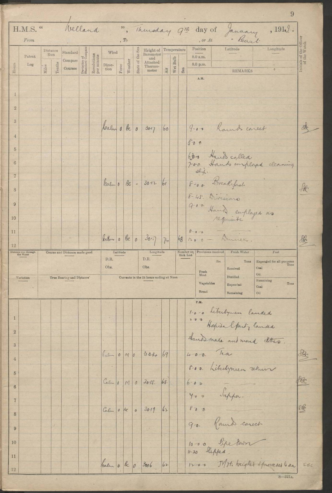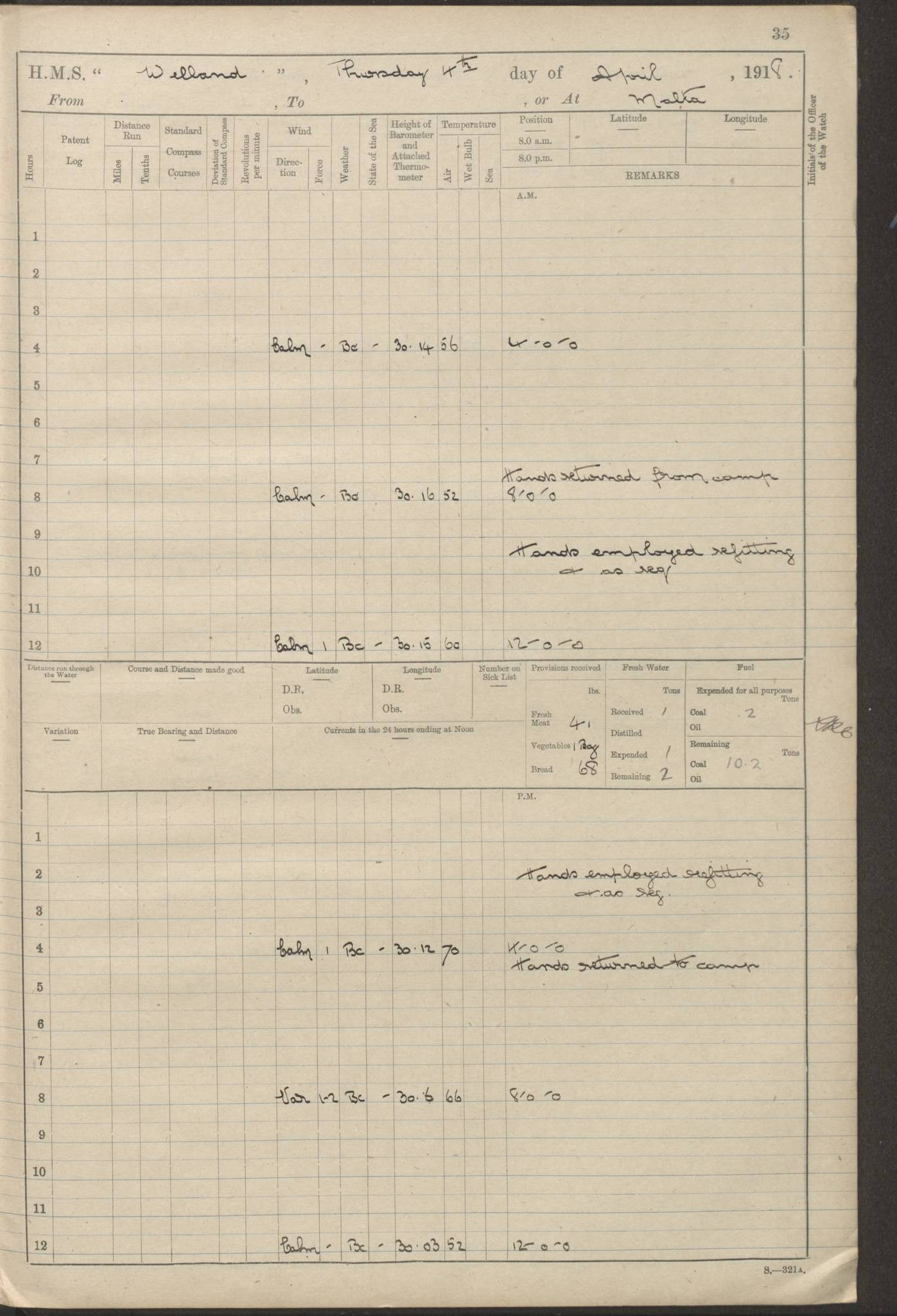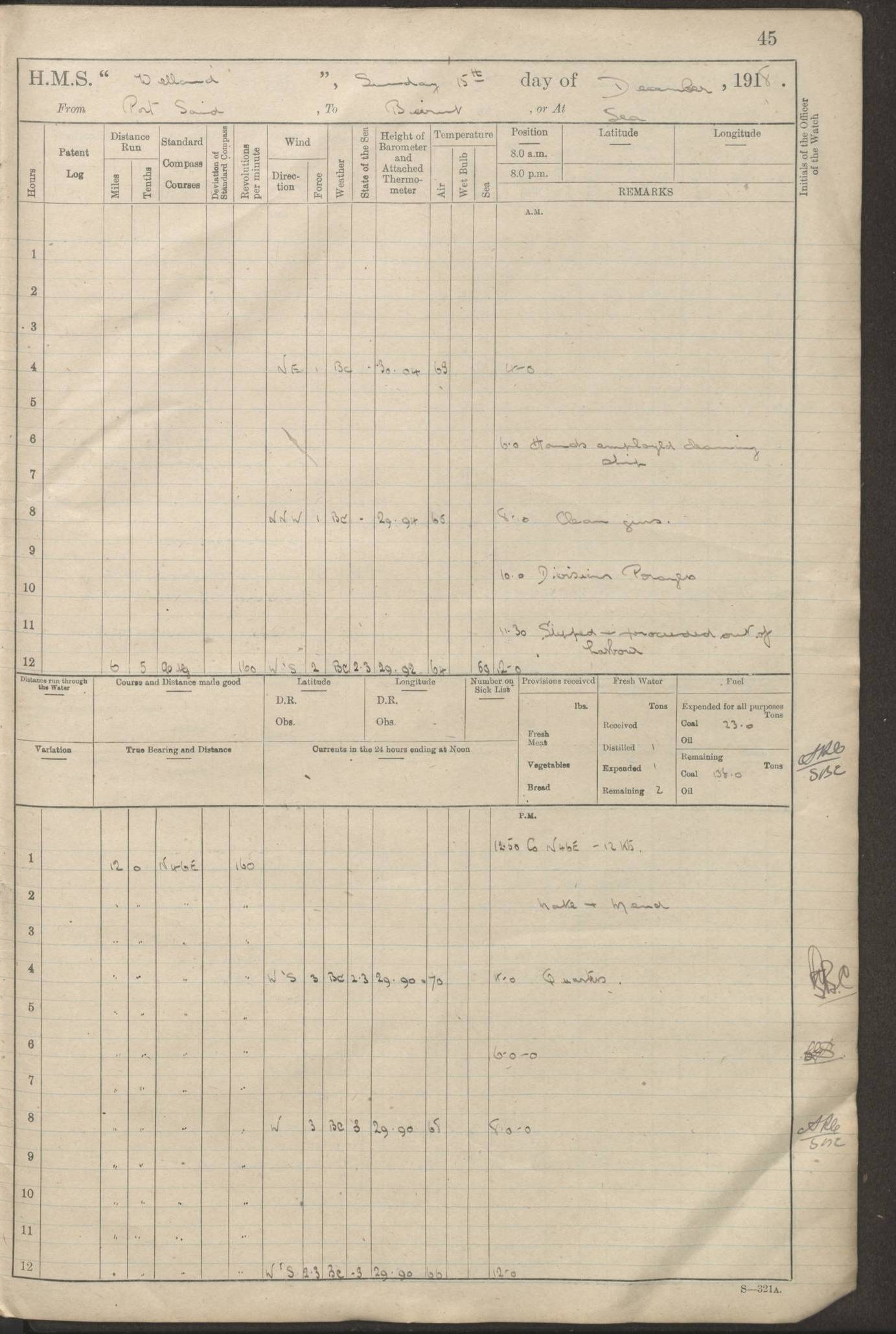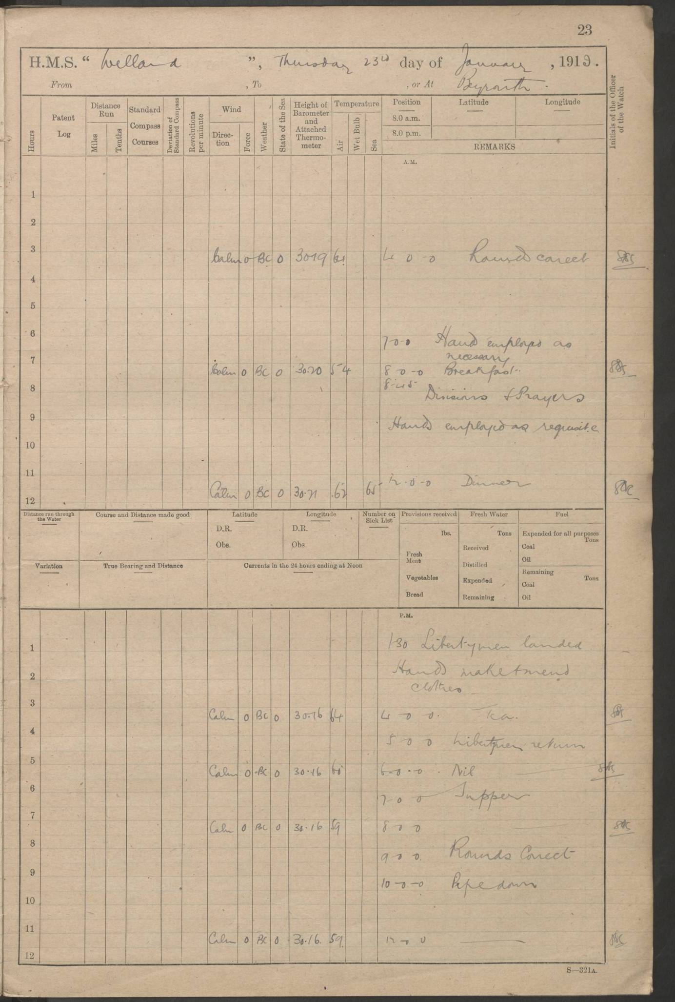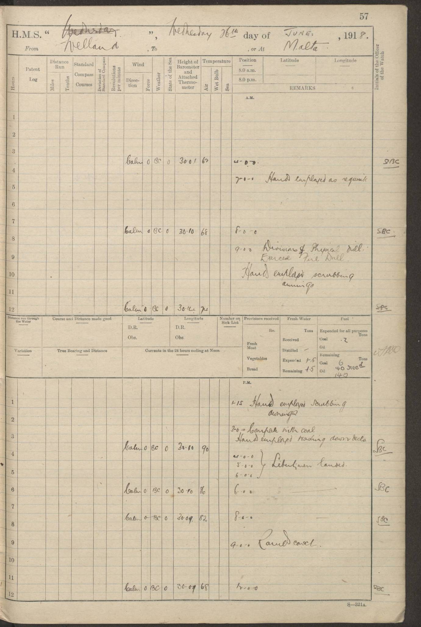 4caf8cadcadfd34197037692: (http://oldweather.s3.amazonaws.com/ADM 53-68366/ADM 53-68366-017_0.jpg) 28 December 1914 Port Said Lat 31.3, Long 32.3 3.15am: Sighted Suez bearing North. 3.55am: Reduced to 7 knots as requisite for Suez. 5.45am: Came to with Starboard anchor off Suez. 6.00am: Hands preparing ship for passage up Canal. 10.30am: Hands employed cleaning guns & small arms. Weighed and proceeded as requisite for passing the Suez Canal. 1.30pm: Hands piped down. 7.05pm: Arrived Port Said. Secured by Starboard anchor & stern to Jetty. 9.00pm: Rounds. 4caf8cadcadfd34197037693: (http://oldweather.s3.amazonaws.com/ADM 53-68366/ADM 53-68366-017_1.jpg) 29 December 1914 Port Said Lat 31.3, Long 32.3 6.00am: Hands employed scrubbing decks & cleaning guns. 8.45am: Hands painting ship. 11.25am: Coal lighters came alongside. Commenced coaling. 1.00pm: Leave to Watch 4.30pm till 6.30pm. 2.00pm: Hands painting ship. 2.10pm: Finished coaling. Received 120 tons. 9.00pm: Rounds. 9.55pm: Russian Cruiser ASKOLD sailed. 4caf8cadcadfd34197037694: (http://oldweather.s3.amazonaws.com/ADM 53-68366/ADM 53-68366-018_0.jpg) 30 December 1914 Port Said to Malta Lat 31.7, Long 31.7 2.30am: Lit up No. 2 & 3 Boilers. 5.15am: Hands employed securing ship for Sea. 6.00am: Pilot came on board. Weighed & proceeded as requisite. 7.15am: Dropped Pilot. Course N 40º W. 9 knots. 9.55am: Damietta Light House bearing S 63º W. 10.00am: Altered course N 74º W. 11.00am: Hands employed cleaning ship & securing gear. 1.00pm: Hands piped down. 5.00pm: Night Defence Stations. Provided ammunition. 4caf8cadcadfd34197037695: (http://oldweather.s3.amazonaws.com/ADM 53-68366/ADM 53-68366-018_1.jpg) 31 December 1914 Port Said to Malta Lat 33.0, Long 27.3 6.15am: Fell out Special Lookouts. Returned ammunition. 7.30am: Formed Divisions Line Ahead to Starboard. Course N 67º W. 9.00am: Hands employed lashing & rigging Splinters Guard & unshipping & clearing away stanchions. 10.10am: Put clocks back 11 minutes. 1.30pm: Hands piped down. 5.5pm: Formed single Line Ahead. Provided ammunition. LOGS FOR JANUARY 1915 4caf8cadcadfd34197037696: (http://oldweather.s3.amazonaws.com/ADM 53-68366/ADM 53-68366-019_0.jpg) 1 January 1915 Port Said to Malta Lat 34.1, Long 22.8 8.30am: Stopped 8.45am: Proceeded. Single line ahead 9.30am: Hands employed making bridge screens 10.18am: Put clocks back 18 minutes 1.30pm: Hands piped down 5.30pm: Formed single line ahead. Provided ammunition. Fresh water: Distilled 1 ton; expended 1 ton; remaining 1.5 tons Fuel: expended for all purposes – coal 22.2 tons; remaining 77.1 tons [A sample complete day’s log] 4caf8cadcadfd34197037697: (http://oldweather.s3.amazonaws.com/ADM 53-68366/ADM 53-68366-019_1.jpg) 2 January 1915 Port Said to Malta Lat 35.2, Long 18.4 7.15am: Hands employed fitting life lines round upper deck 4caf8cadcadfd34197037698: (http://oldweather.s3.amazonaws.com/ADM 53-68366/ADM 53-68366-020_0.jpg) 3 January 1915 Malta Lat 35.9, Long 14.52 6.40am: Fell out special lookouts 10.45am: Secured head and stern at destroyers’ trot Lazaretto Creek 1.00pm: Chelmer shifted billet 4caf8cadcadfd34197037699: (http://oldweather.s3.amazonaws.com/ADM 53-68366/ADM 53-68366-020_1.jpg) 4 January 1915 Malta Lat 35.9, Long 14.52 8.00am: Gave general leave to port watch from 8am to 8am 6th. Coal lighter came alongside. 4caf8cadcadfd3419703769a: (http://oldweather.s3.amazonaws.com/ADM 53-68366/ADM 53-68366-021_0.jpg) 5 January 1915 [6 January in log] Malta Lat 35.9, Long 14.52 4caf8cadcadfd3419703769b: (http://oldweather.s3.amazonaws.com/ADM 53-68366/ADM 53-68366-021_1.jpg) 6 January 1915 Malta Lat 35.9, Long 14.52 12.30pm: Leave to watch from 8am to 8am Friday 4caf8cadcadfd3419703769c: (http://oldweather.s3.amazonaws.com/ADM 53-68366/ADM 53-68366-022_0.jpg) 7 January 1915 Malta Lat 35.9, Long 14.52 4caf8cadcadfd3419703769d: (http://oldweather.s3.amazonaws.com/ADM 53-68366/ADM 53-68366-022_1.jpg) 8 January 1915 Malta Lat 35.9, Long 14.52 6.45am: Hands employed preparing ship for sea 8.30am: Slipped buoy and left Lazaretto Creek. Proceeded as requisite for Grand Harbour. 9.00am: Secured alongside Chelmer at Burmola Wharf, French Creek 4caf8cadcadfd3419703769e: (http://oldweather.s3.amazonaws.com/ADM 53-68366/ADM 53-68366-023_0.jpg) 9 January 1915 Malta Lat 35.9, Long 14.52 8.25am: Hands employed in dockyard and refitting canvas gear 1.15pm: Hands employed returning stores to dockyard 4caf8cadcadfd3419703769f: (http://oldweather.s3.amazonaws.com/ADM 53-68366/ADM 53-68366-023_1.jpg) 10 January 1915 Malta Lat 35.9, Long 14.52 9.30am: Landed church parties 11.30am: Church parties returned 12.25pm: Colne left harbour 4caf8cadcadfd341970376a0: (http://oldweather.s3.amazonaws.com/ADM 53-68366/ADM 53-68366-024_0.jpg) 11 January 1915 Malta Lat 35.9, Long 14.52 8.30am: Sent 2 ratings to hospital 1.30pm: Hands employed refitting fenders Number on sick list: 2 4caf8cadcadfd341970376a1: (http://oldweather.s3.amazonaws.com/ADM 53-68366/ADM 53-68366-024_1.jpg) 12 January 1915 Malta Lat 35.9, Long 14.52 11.00am: Sent 1 rating (sick) to Egmont Number on sick list: 1 4caf8cadcadfd341970376a2: (http://oldweather.s3.amazonaws.com/ADM 53-68366/ADM 53-68366-025_0.jpg) 13 January 1915 Malta Lat 35.9, Long 14.52 10.00am: French battleship Danton docked 4caf8cadcadfd341970376a3: (http://oldweather.s3.amazonaws.com/ADM 53-68366/ADM 53-68366-025_1.jpg) 14 January 1915 Malta Lat 35.9, Long 14.52 6.30am: Hands employed preparing ship for sea 7.30am: Tug came alongside 7.45am: Ship shifted to buoy 8.35am: Commenced swinging for adjustment of compasses 9.30am: Finished swinging 11.30am: One rating rejoined from Egmont 12.10pm: Slipped and proceeded as requisite for leaving Malta, Chelmer and Kennet in company 12.25pm: Set course S87E speed 10 knots 12.35pm: Increased to 12 knots. Hands piped down. 4.00pm: Increased to 13 knots 4.50pm: Night Defence Stations provided ammunition 6.00pm: Placed look-outs 12 midnight: Altered course S88E 4caf8cadcad