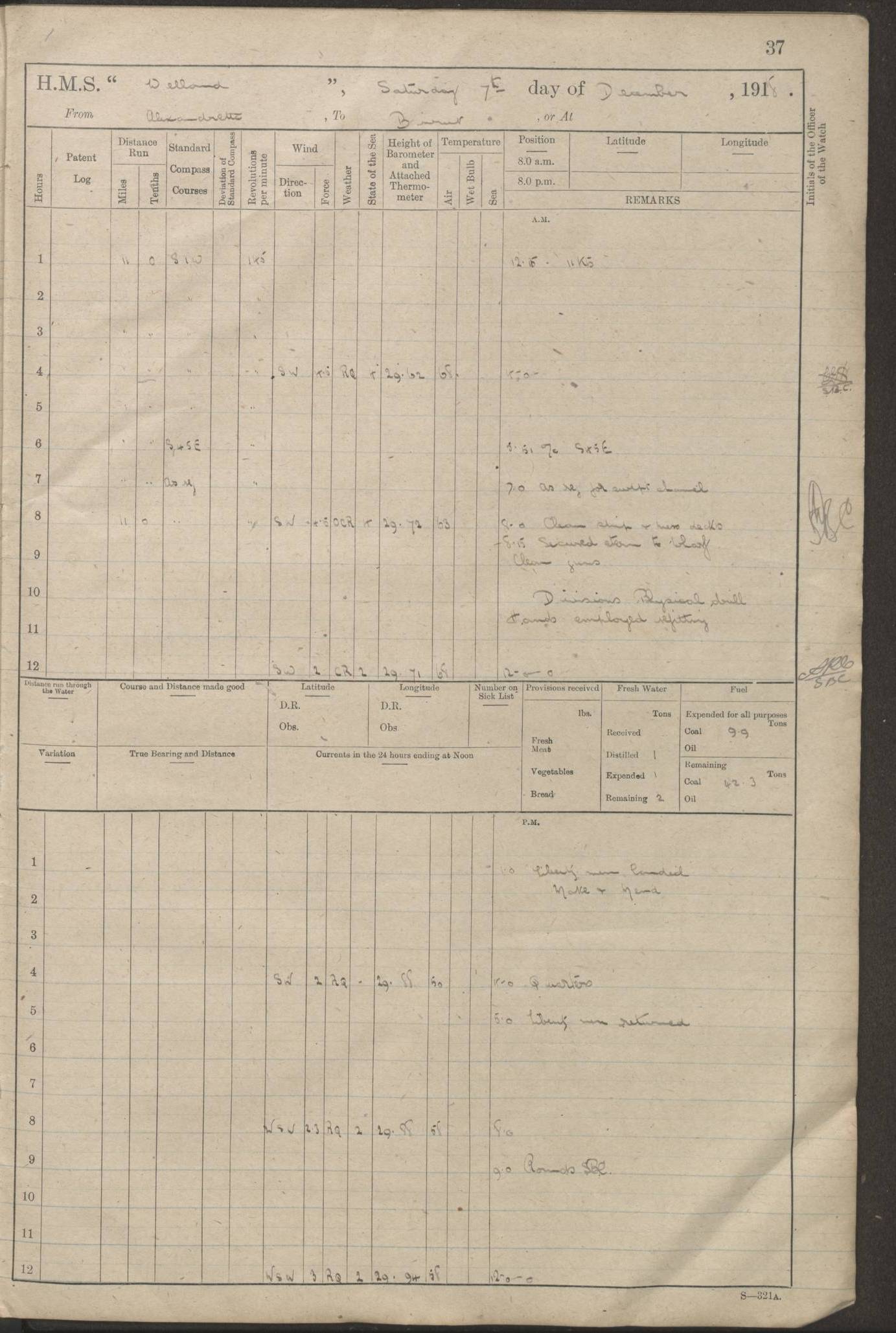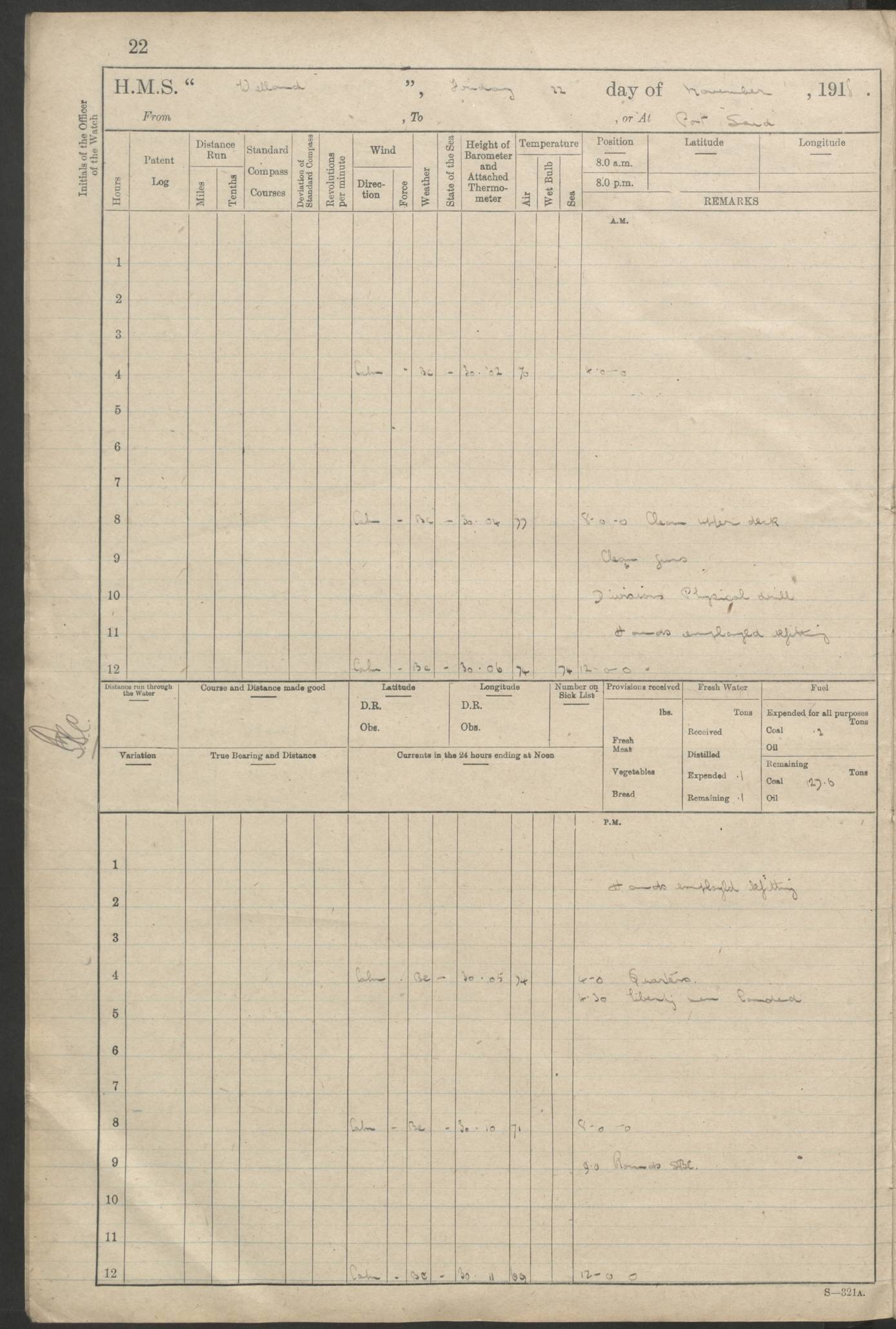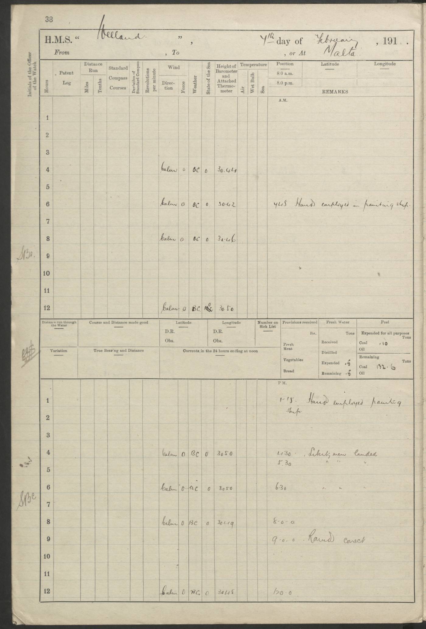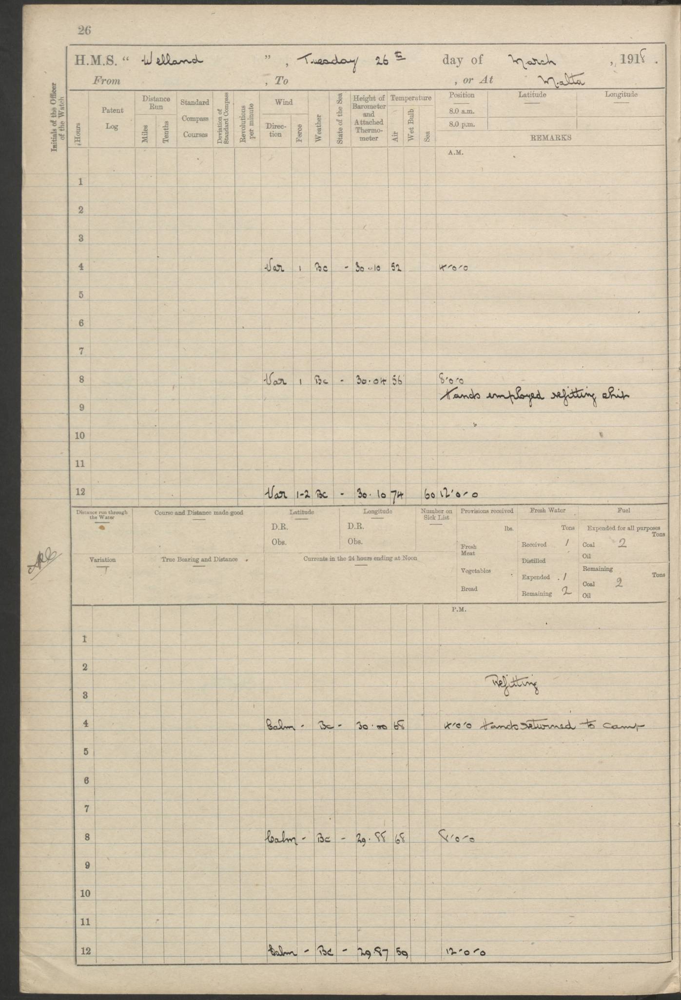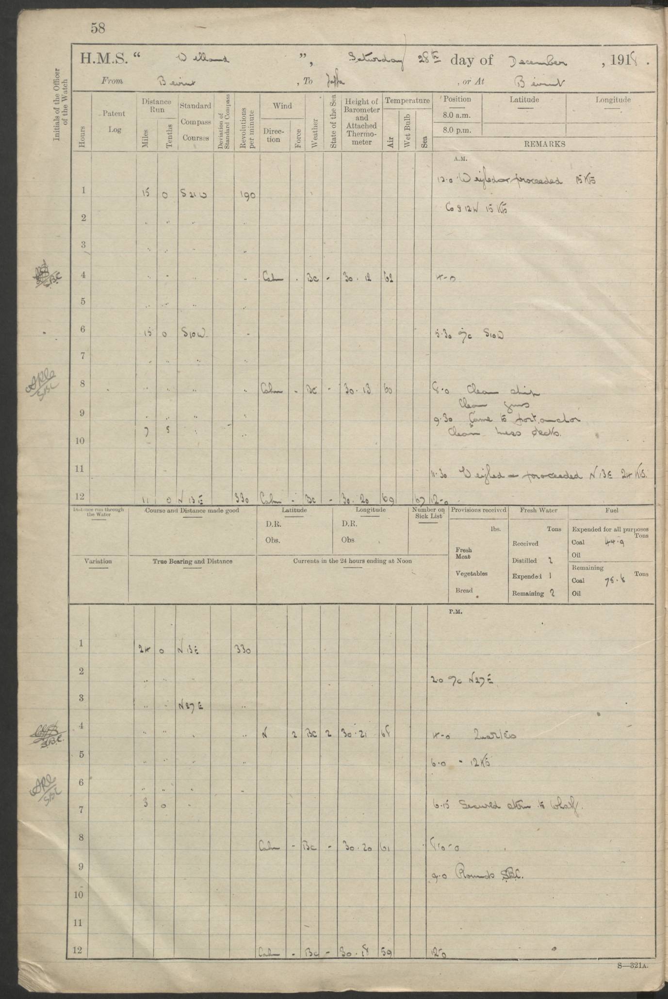 4caf8cadcadfd34197037692: (http://oldweather.s3.amazonaws.com/ADM 53-68366/ADM 53-68366-017_0.jpg) 28 December 1914 Port Said Lat 31.3, Long 32.3 3.15am: Sighted Suez bearing North. 3.55am: Reduced to 7 knots as requisite for Suez. 5.45am: Came to with Starboard anchor off Suez. 6.00am: Hands preparing ship for passage up Canal. 10.30am: Hands employed cleaning guns & small arms. Weighed and proceeded as requisite for passing the Suez Canal. 1.30pm: Hands piped down. 7.05pm: Arrived Port Said. Secured by Starboard anchor & stern to Jetty. 9.00pm: Rounds. 4caf8cadcadfd34197037693: (http://oldweather.s3.amazonaws.com/ADM 53-68366/ADM 53-68366-017_1.jpg) 29 December 1914 Port Said Lat 31.3, Long 32.3 6.00am: Hands employed scrubbing decks & cleaning guns. 8.45am: Hands painting ship. 11.25am: Coal lighters came alongside. Commenced coaling. 1.00pm: Leave to Watch 4.30pm till 6.30pm. 2.00pm: Hands painting ship. 2.10pm: Finished coaling. Received 120 tons. 9.00pm: Rounds. 9.55pm: Russian Cruiser ASKOLD sailed. 4caf8cadcadfd34197037694: (http://oldweather.s3.amazonaws.com/ADM 53-68366/ADM 53-68366-018_0.jpg) 30 December 1914 Port Said to Malta Lat 31.7, Long 31.7 2.30am: Lit up No. 2 & 3 Boilers. 5.15am: Hands employed securing ship for Sea. 6.00am: Pilot came on board. Weighed & proceeded as requisite. 7.15am: Dropped Pilot. Course N 40º W. 9 knots. 9.55am: Damietta Light House bearing S 63º W. 10.00am: Altered course N 74º W. 11.00am: Hands employed cleaning ship & securing gear. 1.00pm: Hands piped down. 5.00pm: Night Defence Stations. Provided ammunition. 4caf8cadcadfd34197037695: (http://oldweather.s3.amazonaws.com/ADM 53-68366/ADM 53-68366-018_1.jpg) 31 December 1914 Port Said to Malta Lat 33.0, Long 27.3 6.15am: Fell out Special Lookouts. Returned ammunition. 7.30am: Formed Divisions Line Ahead to Starboard. Course N 67º W. 9.00am: Hands employed lashing & rigging Splinters Guard & unshipping & clearing away stanchions. 10.10am: Put clocks back 11 minutes. 1.30pm: Hands piped down. 5.5pm: Formed single Line Ahead. Provided ammunition. LOGS FOR JANUARY 1915 4caf8cadcadfd34197037696: (http://oldweather.s3.amazonaws.com/ADM 53-68366/ADM 53-68366-019_0.jpg) 1 January 1915 Port Said to Malta Lat 34.1, Long 22.8 8.30am: Stopped 8.45am: Proceeded. Single line ahead 9.30am: Hands employed making bridge screens 10.18am: Put clocks back 18 minutes 1.30pm: Hands piped down 5.30pm: Formed single line ahead. Provided ammunition. Fresh water: Distilled 1 ton; expended 1 ton; remaining 1.5 tons Fuel: expended for all purposes – coal 22.2 tons; remaining 77.1 tons [A sample complete day’s log] 4caf8cadcadfd34197037697: (http://oldweather.s3.amazonaws.com/ADM 53-68366/ADM 53-68366-019_1.jpg) 2 January 1915 Port Said to Malta Lat 35.2, Long 18.4 7.15am: Hands employed fitting life lines round upper deck 4caf8cadcadfd34197037698: (http://oldweather.s3.amazonaws.com/ADM 53-68366/ADM 53-68366-020_0.jpg) 3 January 1915 Malta Lat 35.9, Long 14.52 6.40am: Fell out special lookouts 10.45am: Secured head and stern at destroyers’ trot Lazaretto Creek 1.00pm: Chelmer shifted billet 4caf8cadcadfd34197037699: (http://oldweather.s3.amazonaws.com/ADM 53-68366/ADM 53-68366-020_1.jpg) 4 January 1915 Malta Lat 35.9, Long 14.52 8.00am: Gave general leave to port watch from 8am to 8am 6th. Coal lighter came alongside. 4caf8cadcadfd3419703769a: (http://oldweather.s3.amazonaws.com/ADM 53-68366/ADM 53-68366-021_0.jpg) 5 January 1915 [6 January in log] Malta Lat 35.9, Long 14.52 4caf8cadcadfd3419703769b: (http://oldweather.s3.amazonaws.com/ADM 53-68366/ADM 53-68366-021_1.jpg) 6 January 1915 Malta Lat 35.9, Long 14.52 12.30pm: Leave to watch from 8am to 8am Friday 4caf8cadcadfd3419703769c: (http://oldweather.s3.amazonaws.com/ADM 53-68366/ADM 53-68366-022_0.jpg) 7 January 1915 Malta Lat 35.9, Long 14.52 4caf8cadcadfd3419703769d: (http://oldweather.s3.amazonaws.com/ADM 53-68366/ADM 53-68366-022_1.jpg) 8 January 1915 Malta Lat 35.9, Long 14.52 6.45am: Hands employed preparing ship for sea 8.30am: Slipped buoy and left Lazaretto Creek. Proceeded as requisite for Grand Harbour. 9.00am: Secured alongside Chelmer at Burmola Wharf, French Creek 4caf8cadcadfd3419703769e: (http://oldweather.s3.amazonaws.com/ADM 53-68366/ADM 53-68366-023_0.jpg) 9 January 1915 Malta Lat 35.9, Long 14.52 8.25am: Hands employed in dockyard and refitting canvas gear 1.15pm: Hands employed returning stores to dockyard 4caf8cadcadfd3419703769f: (http://oldweather.s3.amazonaws.com/ADM 53-68366/ADM 53-68366-023_1.jpg) 10 January 1915 Malta Lat 35.9, Long 14.52 9.30am: Landed church parties 11.30am: Church parties returned 12.25pm: Colne left harbour 4caf8cadcadfd341970376a0: (http://oldweather.s3.amazonaws.com/ADM 53-68366/ADM 53-68366-024_0.jpg) 11 January 1915 Malta Lat 35.9, Long 14.52 8.30am: Sent 2 ratings to hospital 1.30pm: Hands employed refitting fenders Number on sick list: 2 4caf8cadcadfd341970376a1: (http://oldweather.s3.amazonaws.com/ADM 53-68366/ADM 53-68366-024_1.jpg) 12 January 1915 Malta Lat 35.9, Long 14.52 11.00am: Sent 1 rating (sick) to Egmont Number on sick list: 1 4caf8cadcadfd341970376a2: (http://oldweather.s3.amazonaws.com/ADM 53-68366/ADM 53-68366-025_0.jpg) 13 January 1915 Malta Lat 35.9, Long 14.52 10.00am: French battleship Danton docked 4caf8cadcadfd341970376a3: (http://oldweather.s3.amazonaws.com/ADM 53-68366/ADM 53-68366-025_1.jpg) 14 January 1915 Malta Lat 35.9, Long 14.52 6.30am: Hands employed preparing ship for sea 7.30am: Tug came alongside 7.45am: Ship shifted to buoy 8.35am: Commenced swinging for adjustment of compasses 9.30am: Finished swinging 11.30am: One rating rejoined from Egmont 12.10pm: Slipped and proceeded as requisite for leaving Malta, Chelmer and Kennet in company 12.25pm: Set course S87E speed 10 knots 12.35pm: Increased to 12 knots. Hands piped down. 4.00pm: Increased to 13 knots 4.50pm: Night Defence Stations provided ammunition 6.00pm: Placed look-outs 12 midnight: Altered course S88E 4caf8cadcad