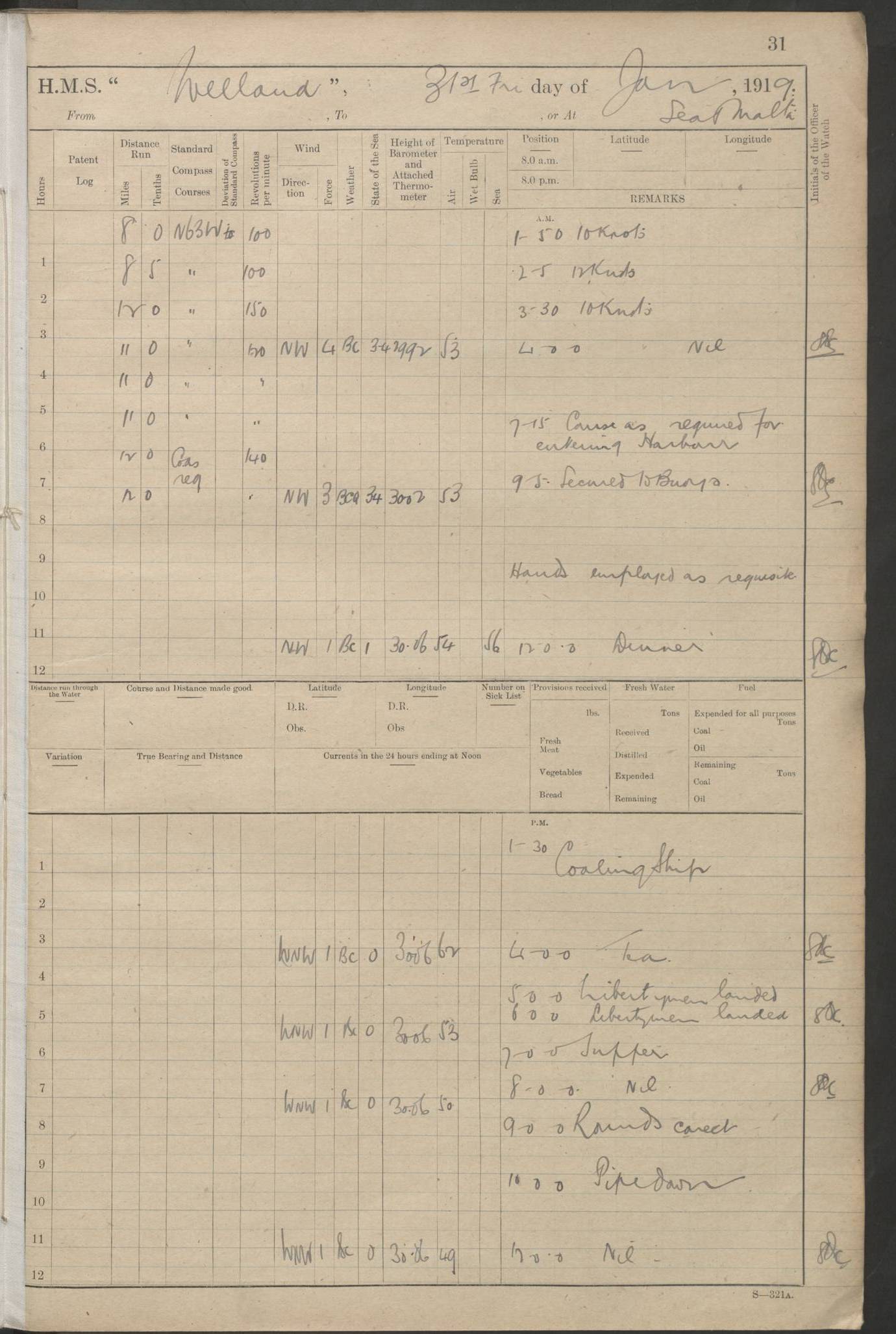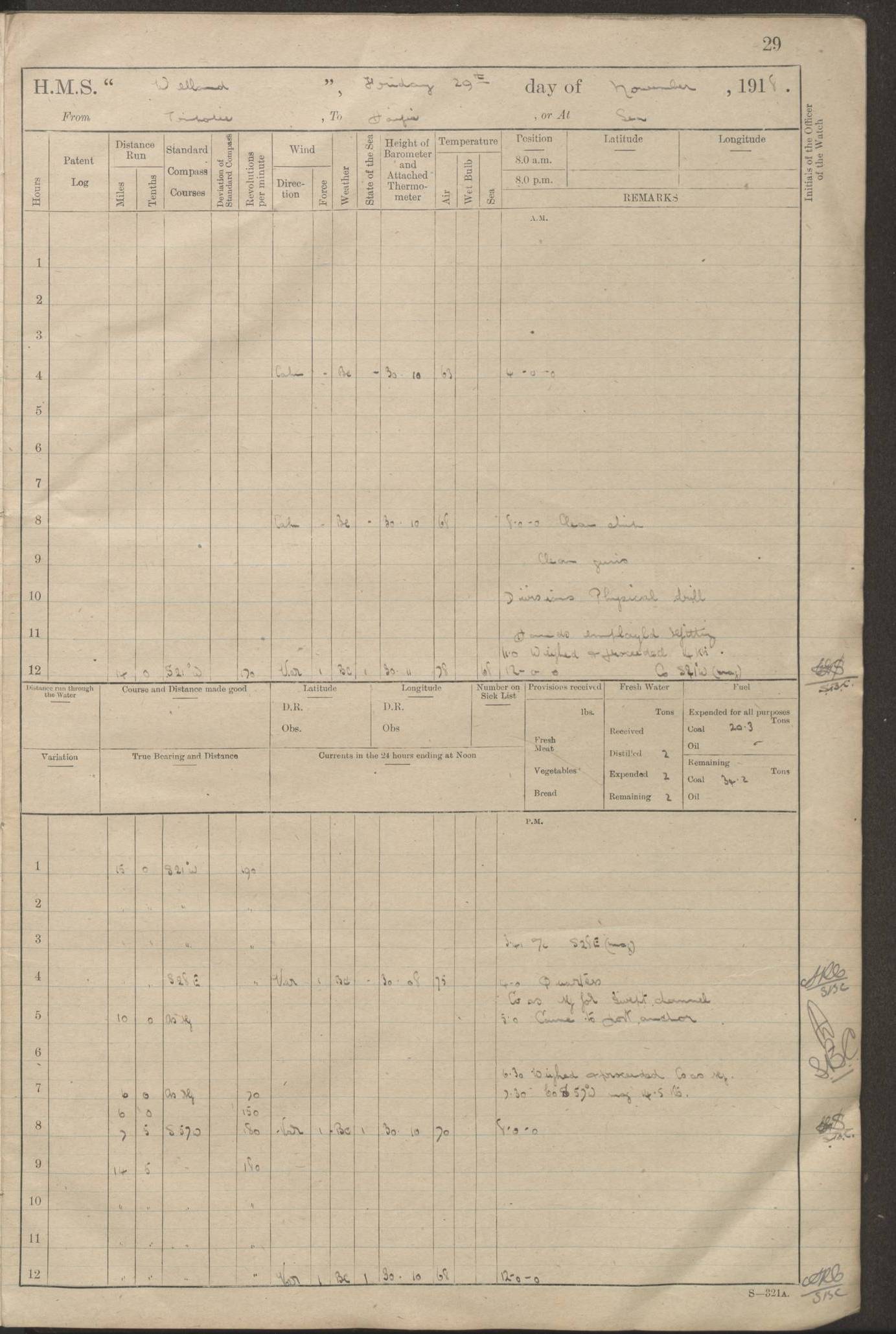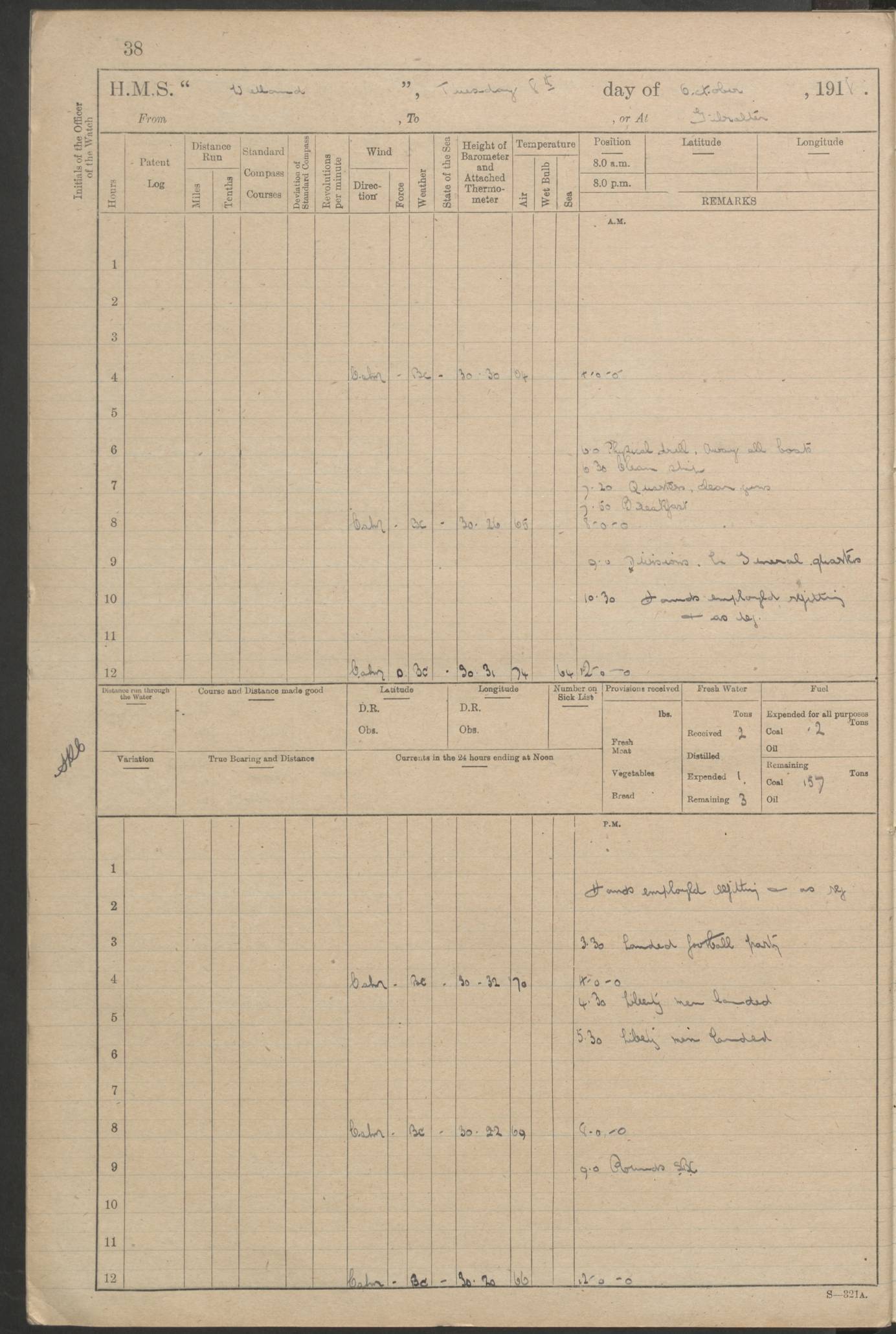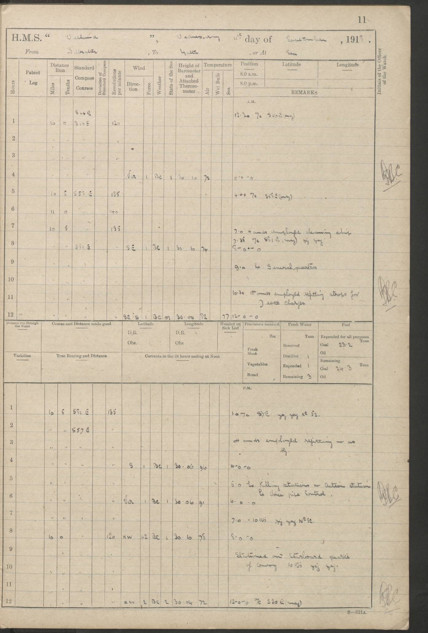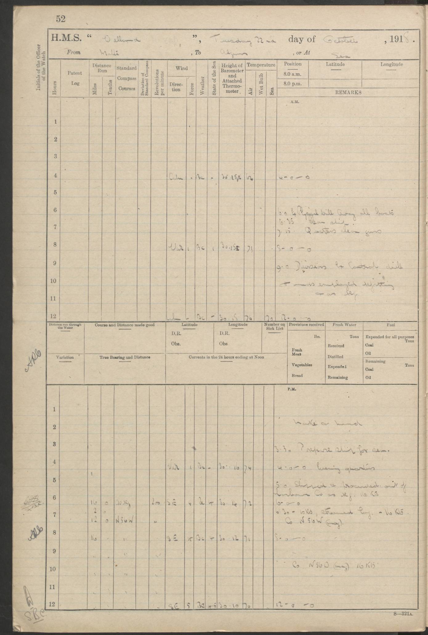 4caf8cadcadfd34197037692: (http://oldweather.s3.amazonaws.com/ADM 53-68366/ADM 53-68366-017_0.jpg) 28 December 1914 Port Said Lat 31.3, Long 32.3 3.15am: Sighted Suez bearing North. 3.55am: Reduced to 7 knots as requisite for Suez. 5.45am: Came to with Starboard anchor off Suez. 6.00am: Hands preparing ship for passage up Canal. 10.30am: Hands employed cleaning guns & small arms. Weighed and proceeded as requisite for passing the Suez Canal. 1.30pm: Hands piped down. 7.05pm: Arrived Port Said. Secured by Starboard anchor & stern to Jetty. 9.00pm: Rounds. 4caf8cadcadfd34197037693: (http://oldweather.s3.amazonaws.com/ADM 53-68366/ADM 53-68366-017_1.jpg) 29 December 1914 Port Said Lat 31.3, Long 32.3 6.00am: Hands employed scrubbing decks & cleaning guns. 8.45am: Hands painting ship. 11.25am: Coal lighters came alongside. Commenced coaling. 1.00pm: Leave to Watch 4.30pm till 6.30pm. 2.00pm: Hands painting ship. 2.10pm: Finished coaling. Received 120 tons. 9.00pm: Rounds. 9.55pm: Russian Cruiser ASKOLD sailed. 4caf8cadcadfd34197037694: (http://oldweather.s3.amazonaws.com/ADM 53-68366/ADM 53-68366-018_0.jpg) 30 December 1914 Port Said to Malta Lat 31.7, Long 31.7 2.30am: Lit up No. 2 & 3 Boilers. 5.15am: Hands employed securing ship for Sea. 6.00am: Pilot came on board. Weighed & proceeded as requisite. 7.15am: Dropped Pilot. Course N 40º W. 9 knots. 9.55am: Damietta Light House bearing S 63º W. 10.00am: Altered course N 74º W. 11.00am: Hands employed cleaning ship & securing gear. 1.00pm: Hands piped down. 5.00pm: Night Defence Stations. Provided ammunition. 4caf8cadcadfd34197037695: (http://oldweather.s3.amazonaws.com/ADM 53-68366/ADM 53-68366-018_1.jpg) 31 December 1914 Port Said to Malta Lat 33.0, Long 27.3 6.15am: Fell out Special Lookouts. Returned ammunition. 7.30am: Formed Divisions Line Ahead to Starboard. Course N 67º W. 9.00am: Hands employed lashing & rigging Splinters Guard & unshipping & clearing away stanchions. 10.10am: Put clocks back 11 minutes. 1.30pm: Hands piped down. 5.5pm: Formed single Line Ahead. Provided ammunition. LOGS FOR JANUARY 1915 4caf8cadcadfd34197037696: (http://oldweather.s3.amazonaws.com/ADM 53-68366/ADM 53-68366-019_0.jpg) 1 January 1915 Port Said to Malta Lat 34.1, Long 22.8 8.30am: Stopped 8.45am: Proceeded. Single line ahead 9.30am: Hands employed making bridge screens 10.18am: Put clocks back 18 minutes 1.30pm: Hands piped down 5.30pm: Formed single line ahead. Provided ammunition. Fresh water: Distilled 1 ton; expended 1 ton; remaining 1.5 tons Fuel: expended for all purposes – coal 22.2 tons; remaining 77.1 tons [A sample complete day’s log] 4caf8cadcadfd34197037697: (http://oldweather.s3.amazonaws.com/ADM 53-68366/ADM 53-68366-019_1.jpg) 2 January 1915 Port Said to Malta Lat 35.2, Long 18.4 7.15am: Hands employed fitting life lines round upper deck 4caf8cadcadfd34197037698: (http://oldweather.s3.amazonaws.com/ADM 53-68366/ADM 53-68366-020_0.jpg) 3 January 1915 Malta Lat 35.9, Long 14.52 6.40am: Fell out special lookouts 10.45am: Secured head and stern at destroyers’ trot Lazaretto Creek 1.00pm: Chelmer shifted billet 4caf8cadcadfd34197037699: (http://oldweather.s3.amazonaws.com/ADM 53-68366/ADM 53-68366-020_1.jpg) 4 January 1915 Malta Lat 35.9, Long 14.52 8.00am: Gave general leave to port watch from 8am to 8am 6th. Coal lighter came alongside. 4caf8cadcadfd3419703769a: (http://oldweather.s3.amazonaws.com/ADM 53-68366/ADM 53-68366-021_0.jpg) 5 January 1915 [6 January in log] Malta Lat 35.9, Long 14.52 4caf8cadcadfd3419703769b: (http://oldweather.s3.amazonaws.com/ADM 53-68366/ADM 53-68366-021_1.jpg) 6 January 1915 Malta Lat 35.9, Long 14.52 12.30pm: Leave to watch from 8am to 8am Friday 4caf8cadcadfd3419703769c: (http://oldweather.s3.amazonaws.com/ADM 53-68366/ADM 53-68366-022_0.jpg) 7 January 1915 Malta Lat 35.9, Long 14.52 4caf8cadcadfd3419703769d: (http://oldweather.s3.amazonaws.com/ADM 53-68366/ADM 53-68366-022_1.jpg) 8 January 1915 Malta Lat 35.9, Long 14.52 6.45am: Hands employed preparing ship for sea 8.30am: Slipped buoy and left Lazaretto Creek. Proceeded as requisite for Grand Harbour. 9.00am: Secured alongside Chelmer at Burmola Wharf, French Creek 4caf8cadcadfd3419703769e: (http://oldweather.s3.amazonaws.com/ADM 53-68366/ADM 53-68366-023_0.jpg) 9 January 1915 Malta Lat 35.9, Long 14.52 8.25am: Hands employed in dockyard and refitting canvas gear 1.15pm: Hands employed returning stores to dockyard 4caf8cadcadfd3419703769f: (http://oldweather.s3.amazonaws.com/ADM 53-68366/ADM 53-68366-023_1.jpg) 10 January 1915 Malta Lat 35.9, Long 14.52 9.30am: Landed church parties 11.30am: Church parties returned 12.25pm: Colne left harbour 4caf8cadcadfd341970376a0: (http://oldweather.s3.amazonaws.com/ADM 53-68366/ADM 53-68366-024_0.jpg) 11 January 1915 Malta Lat 35.9, Long 14.52 8.30am: Sent 2 ratings to hospital 1.30pm: Hands employed refitting fenders Number on sick list: 2 4caf8cadcadfd341970376a1: (http://oldweather.s3.amazonaws.com/ADM 53-68366/ADM 53-68366-024_1.jpg) 12 January 1915 Malta Lat 35.9, Long 14.52 11.00am: Sent 1 rating (sick) to Egmont Number on sick list: 1 4caf8cadcadfd341970376a2: (http://oldweather.s3.amazonaws.com/ADM 53-68366/ADM 53-68366-025_0.jpg) 13 January 1915 Malta Lat 35.9, Long 14.52 10.00am: French battleship Danton docked 4caf8cadcadfd341970376a3: (http://oldweather.s3.amazonaws.com/ADM 53-68366/ADM 53-68366-025_1.jpg) 14 January 1915 Malta Lat 35.9, Long 14.52 6.30am: Hands employed preparing ship for sea 7.30am: Tug came alongside 7.45am: Ship shifted to buoy 8.35am: Commenced swinging for adjustment of compasses 9.30am: Finished swinging 11.30am: One rating rejoined from Egmont 12.10pm: Slipped and proceeded as requisite for leaving Malta, Chelmer and Kennet in company 12.25pm: Set course S87E speed 10 knots 12.35pm: Increased to 12 knots. Hands piped down. 4.00pm: Increased to 13 knots 4.50pm: Night Defence Stations provided ammunition 6.00pm: Placed look-outs 12 midnight: Altered course S88E 4caf8cadcad