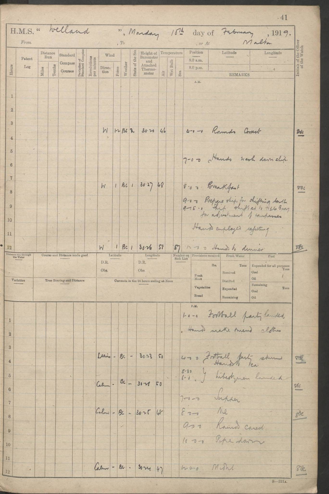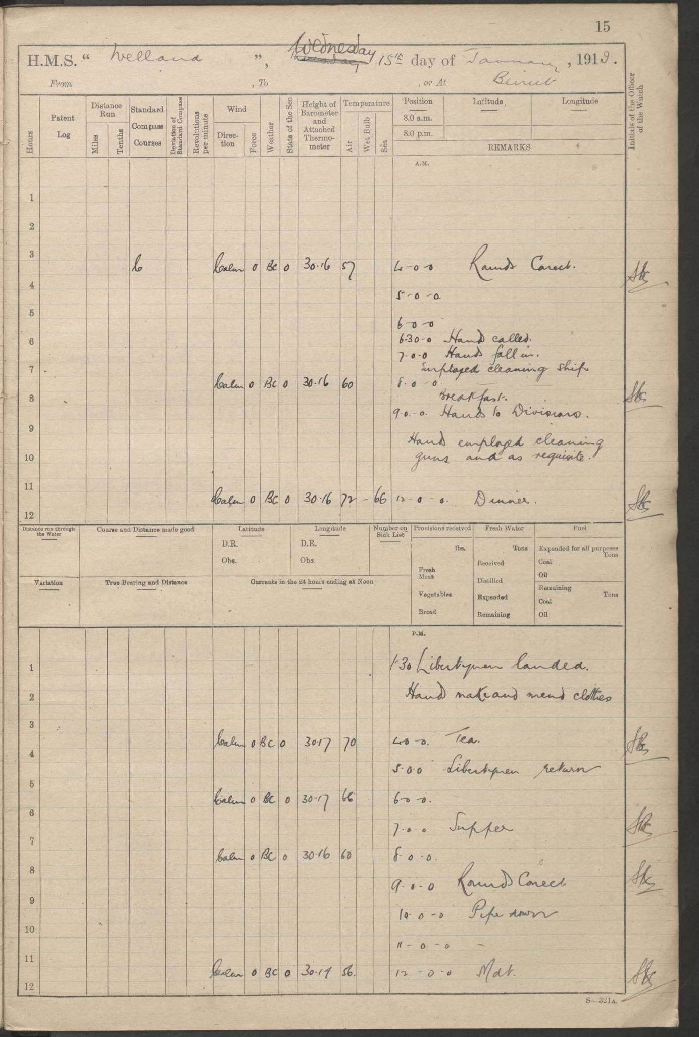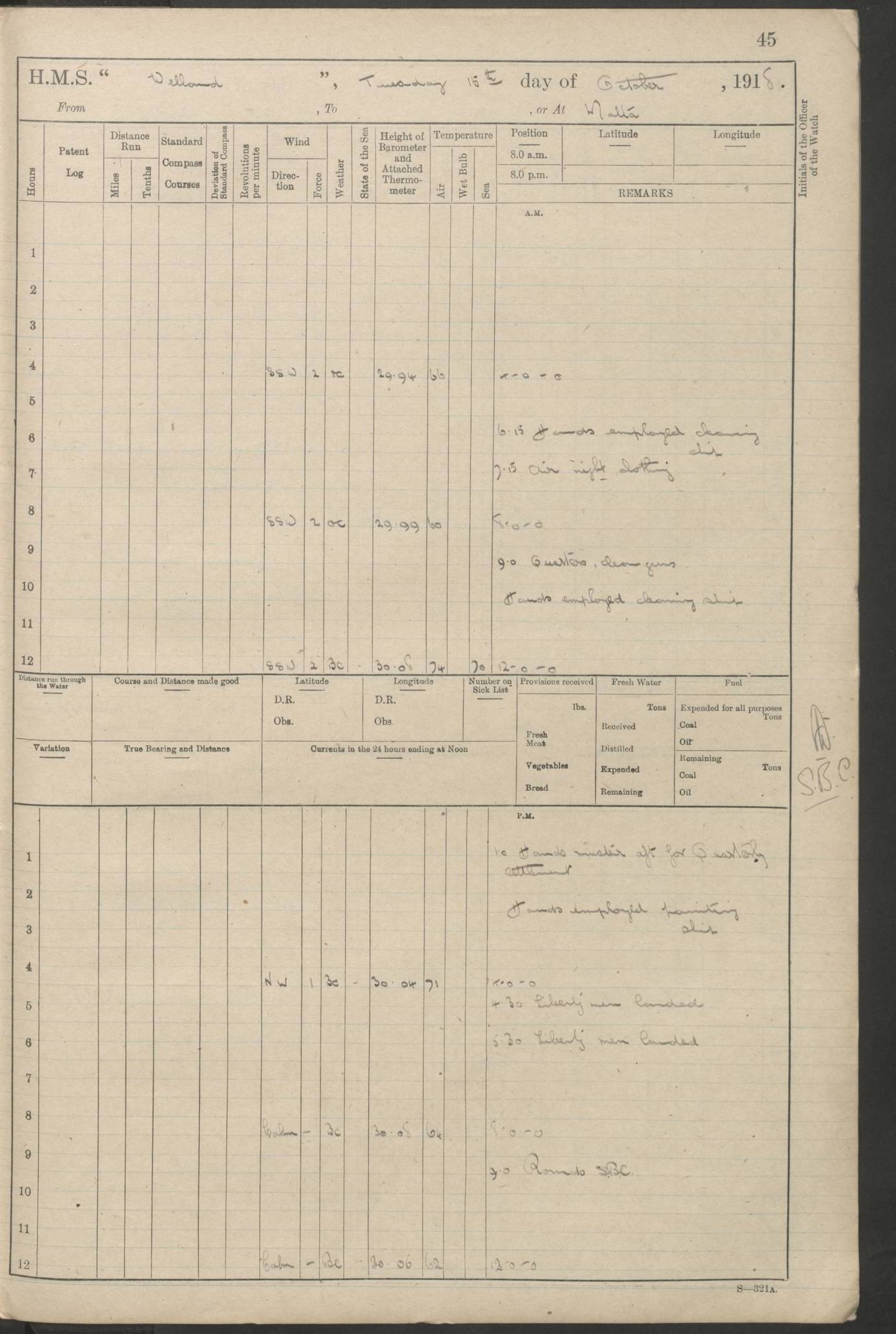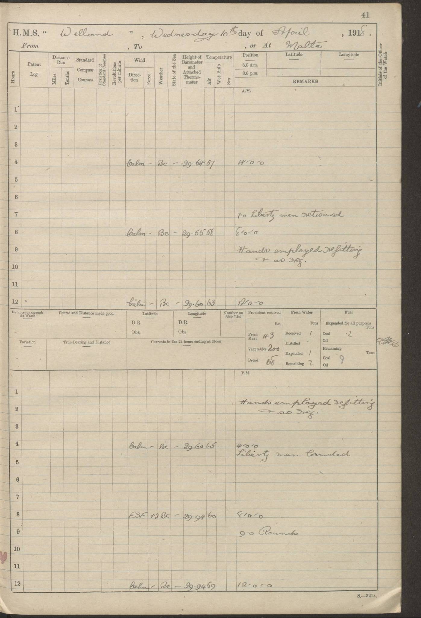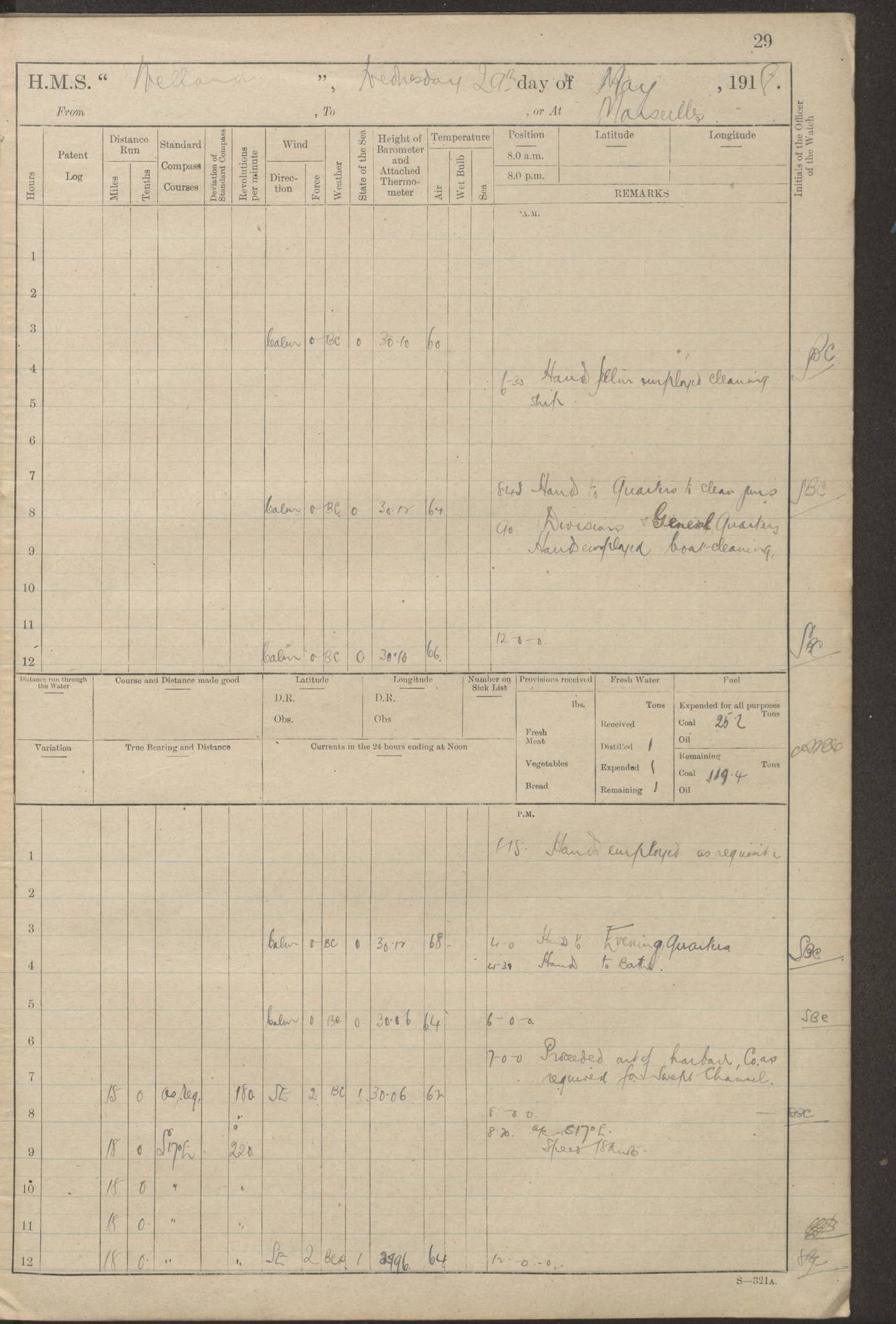 4caf8cadcadfd34197037692: (http://oldweather.s3.amazonaws.com/ADM 53-68366/ADM 53-68366-017_0.jpg) 28 December 1914 Port Said Lat 31.3, Long 32.3 3.15am: Sighted Suez bearing North. 3.55am: Reduced to 7 knots as requisite for Suez. 5.45am: Came to with Starboard anchor off Suez. 6.00am: Hands preparing ship for passage up Canal. 10.30am: Hands employed cleaning guns & small arms. Weighed and proceeded as requisite for passing the Suez Canal. 1.30pm: Hands piped down. 7.05pm: Arrived Port Said. Secured by Starboard anchor & stern to Jetty. 9.00pm: Rounds. 4caf8cadcadfd34197037693: (http://oldweather.s3.amazonaws.com/ADM 53-68366/ADM 53-68366-017_1.jpg) 29 December 1914 Port Said Lat 31.3, Long 32.3 6.00am: Hands employed scrubbing decks & cleaning guns. 8.45am: Hands painting ship. 11.25am: Coal lighters came alongside. Commenced coaling. 1.00pm: Leave to Watch 4.30pm till 6.30pm. 2.00pm: Hands painting ship. 2.10pm: Finished coaling. Received 120 tons. 9.00pm: Rounds. 9.55pm: Russian Cruiser ASKOLD sailed. 4caf8cadcadfd34197037694: (http://oldweather.s3.amazonaws.com/ADM 53-68366/ADM 53-68366-018_0.jpg) 30 December 1914 Port Said to Malta Lat 31.7, Long 31.7 2.30am: Lit up No. 2 & 3 Boilers. 5.15am: Hands employed securing ship for Sea. 6.00am: Pilot came on board. Weighed & proceeded as requisite. 7.15am: Dropped Pilot. Course N 40º W. 9 knots. 9.55am: Damietta Light House bearing S 63º W. 10.00am: Altered course N 74º W. 11.00am: Hands employed cleaning ship & securing gear. 1.00pm: Hands piped down. 5.00pm: Night Defence Stations. Provided ammunition. 4caf8cadcadfd34197037695: (http://oldweather.s3.amazonaws.com/ADM 53-68366/ADM 53-68366-018_1.jpg) 31 December 1914 Port Said to Malta Lat 33.0, Long 27.3 6.15am: Fell out Special Lookouts. Returned ammunition. 7.30am: Formed Divisions Line Ahead to Starboard. Course N 67º W. 9.00am: Hands employed lashing & rigging Splinters Guard & unshipping & clearing away stanchions. 10.10am: Put clocks back 11 minutes. 1.30pm: Hands piped down. 5.5pm: Formed single Line Ahead. Provided ammunition. LOGS FOR JANUARY 1915 4caf8cadcadfd34197037696: (http://oldweather.s3.amazonaws.com/ADM 53-68366/ADM 53-68366-019_0.jpg) 1 January 1915 Port Said to Malta Lat 34.1, Long 22.8 8.30am: Stopped 8.45am: Proceeded. Single line ahead 9.30am: Hands employed making bridge screens 10.18am: Put clocks back 18 minutes 1.30pm: Hands piped down 5.30pm: Formed single line ahead. Provided ammunition. Fresh water: Distilled 1 ton; expended 1 ton; remaining 1.5 tons Fuel: expended for all purposes – coal 22.2 tons; remaining 77.1 tons [A sample complete day’s log] 4caf8cadcadfd34197037697: (http://oldweather.s3.amazonaws.com/ADM 53-68366/ADM 53-68366-019_1.jpg) 2 January 1915 Port Said to Malta Lat 35.2, Long 18.4 7.15am: Hands employed fitting life lines round upper deck 4caf8cadcadfd34197037698: (http://oldweather.s3.amazonaws.com/ADM 53-68366/ADM 53-68366-020_0.jpg) 3 January 1915 Malta Lat 35.9, Long 14.52 6.40am: Fell out special lookouts 10.45am: Secured head and stern at destroyers’ trot Lazaretto Creek 1.00pm: Chelmer shifted billet 4caf8cadcadfd34197037699: (http://oldweather.s3.amazonaws.com/ADM 53-68366/ADM 53-68366-020_1.jpg) 4 January 1915 Malta Lat 35.9, Long 14.52 8.00am: Gave general leave to port watch from 8am to 8am 6th. Coal lighter came alongside. 4caf8cadcadfd3419703769a: (http://oldweather.s3.amazonaws.com/ADM 53-68366/ADM 53-68366-021_0.jpg) 5 January 1915 [6 January in log] Malta Lat 35.9, Long 14.52 4caf8cadcadfd3419703769b: (http://oldweather.s3.amazonaws.com/ADM 53-68366/ADM 53-68366-021_1.jpg) 6 January 1915 Malta Lat 35.9, Long 14.52 12.30pm: Leave to watch from 8am to 8am Friday 4caf8cadcadfd3419703769c: (http://oldweather.s3.amazonaws.com/ADM 53-68366/ADM 53-68366-022_0.jpg) 7 January 1915 Malta Lat 35.9, Long 14.52 4caf8cadcadfd3419703769d: (http://oldweather.s3.amazonaws.com/ADM 53-68366/ADM 53-68366-022_1.jpg) 8 January 1915 Malta Lat 35.9, Long 14.52 6.45am: Hands employed preparing ship for sea 8.30am: Slipped buoy and left Lazaretto Creek. Proceeded as requisite for Grand Harbour. 9.00am: Secured alongside Chelmer at Burmola Wharf, French Creek 4caf8cadcadfd3419703769e: (http://oldweather.s3.amazonaws.com/ADM 53-68366/ADM 53-68366-023_0.jpg) 9 January 1915 Malta Lat 35.9, Long 14.52 8.25am: Hands employed in dockyard and refitting canvas gear 1.15pm: Hands employed returning stores to dockyard 4caf8cadcadfd3419703769f: (http://oldweather.s3.amazonaws.com/ADM 53-68366/ADM 53-68366-023_1.jpg) 10 January 1915 Malta Lat 35.9, Long 14.52 9.30am: Landed church parties 11.30am: Church parties returned 12.25pm: Colne left harbour 4caf8cadcadfd341970376a0: (http://oldweather.s3.amazonaws.com/ADM 53-68366/ADM 53-68366-024_0.jpg) 11 January 1915 Malta Lat 35.9, Long 14.52 8.30am: Sent 2 ratings to hospital 1.30pm: Hands employed refitting fenders Number on sick list: 2 4caf8cadcadfd341970376a1: (http://oldweather.s3.amazonaws.com/ADM 53-68366/ADM 53-68366-024_1.jpg) 12 January 1915 Malta Lat 35.9, Long 14.52 11.00am: Sent 1 rating (sick) to Egmont Number on sick list: 1 4caf8cadcadfd341970376a2: (http://oldweather.s3.amazonaws.com/ADM 53-68366/ADM 53-68366-025_0.jpg) 13 January 1915 Malta Lat 35.9, Long 14.52 10.00am: French battleship Danton docked 4caf8cadcadfd341970376a3: (http://oldweather.s3.amazonaws.com/ADM 53-68366/ADM 53-68366-025_1.jpg) 14 January 1915 Malta Lat 35.9, Long 14.52 6.30am: Hands employed preparing ship for sea 7.30am: Tug came alongside 7.45am: Ship shifted to buoy 8.35am: Commenced swinging for adjustment of compasses 9.30am: Finished swinging 11.30am: One rating rejoined from Egmont 12.10pm: Slipped and proceeded as requisite for leaving Malta, Chelmer and Kennet in company 12.25pm: Set course S87E speed 10 knots 12.35pm: Increased to 12 knots. Hands piped down. 4.00pm: Increased to 13 knots 4.50pm: Night Defence Stations provided ammunition 6.00pm: Placed look-outs 12 midnight: Altered course S88E 4caf8cadcad