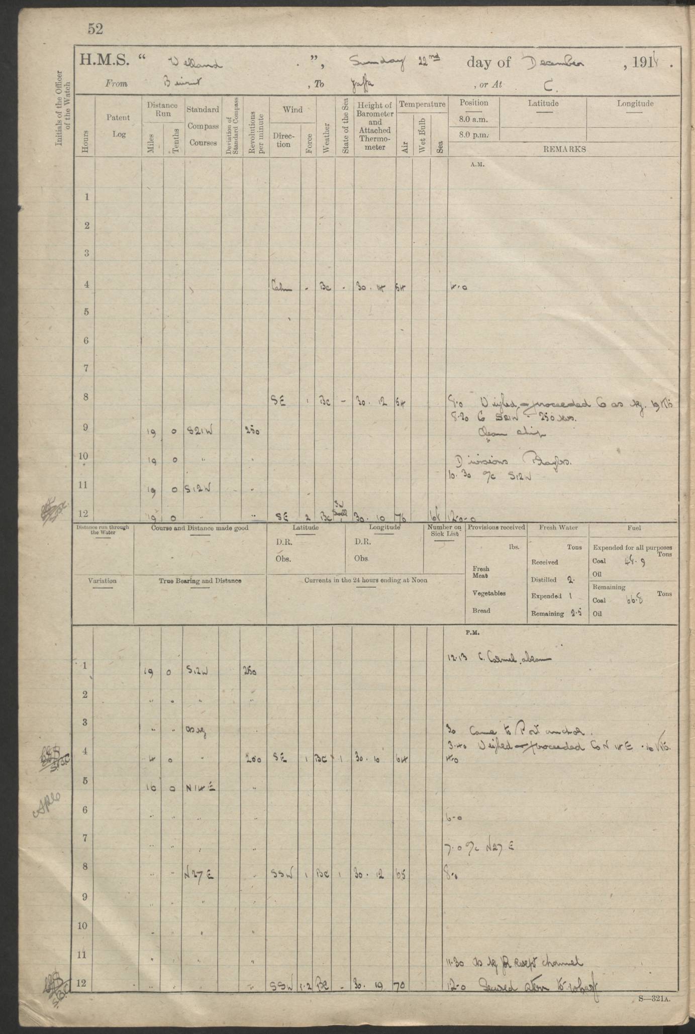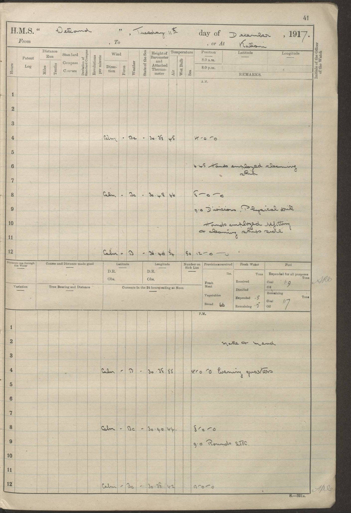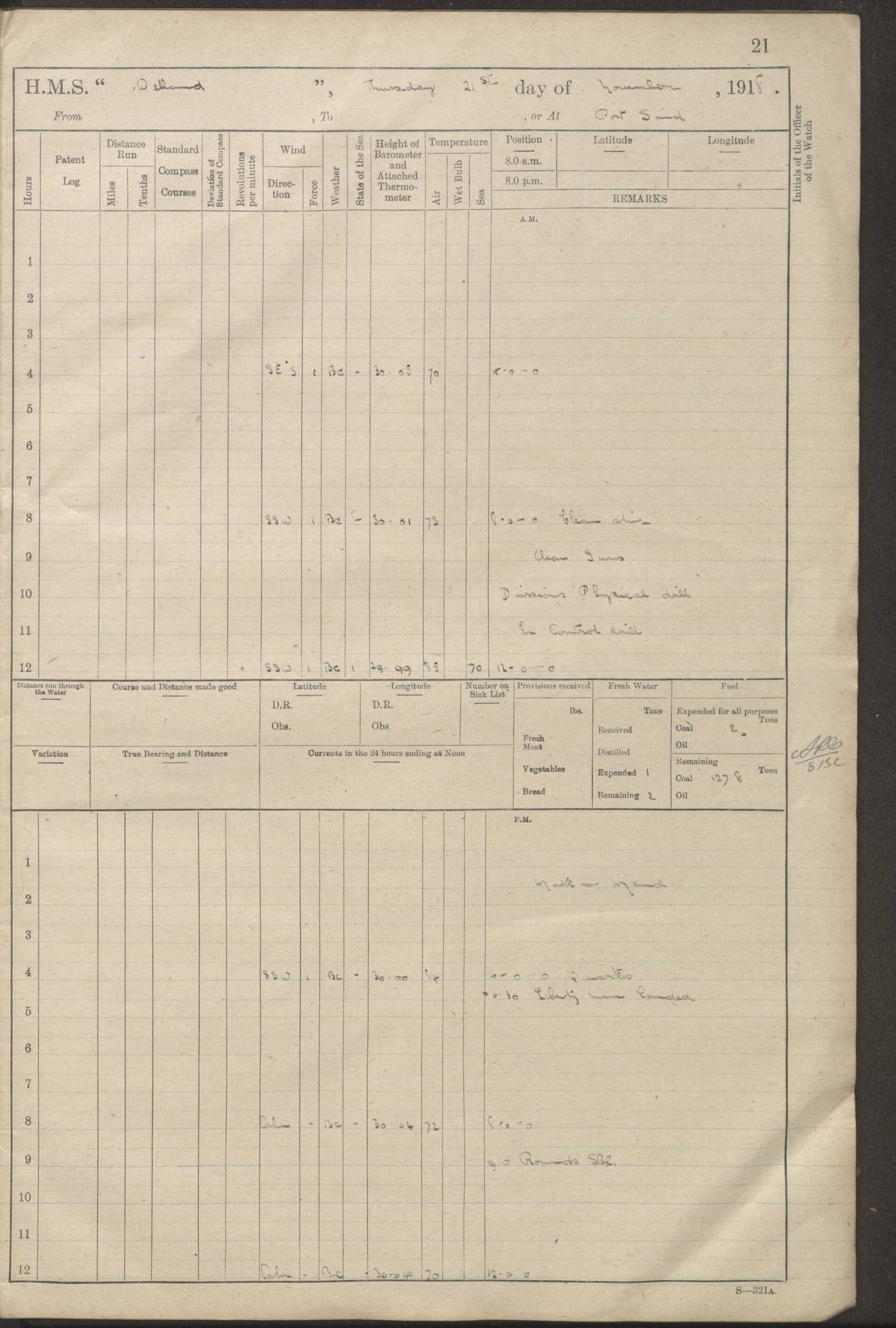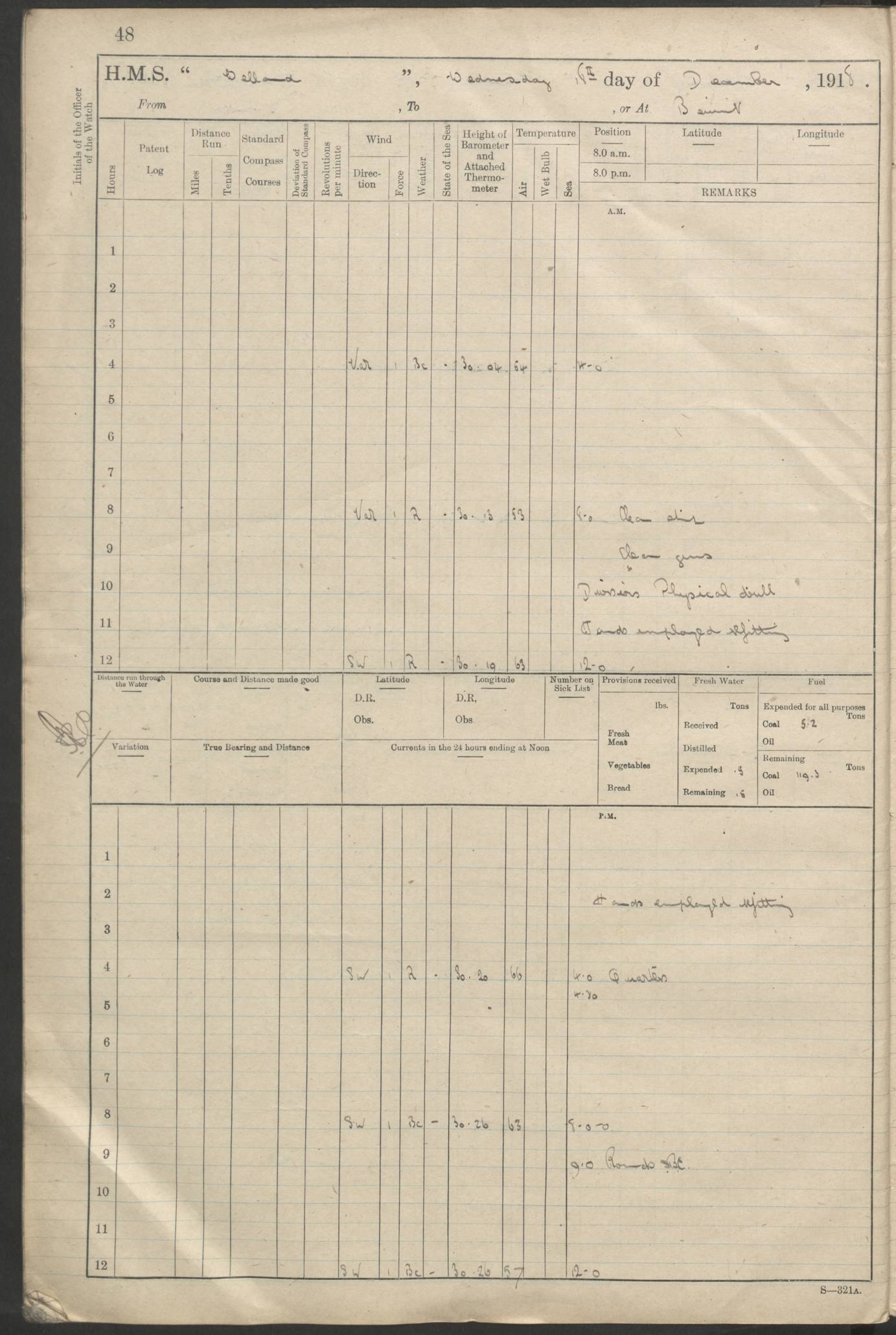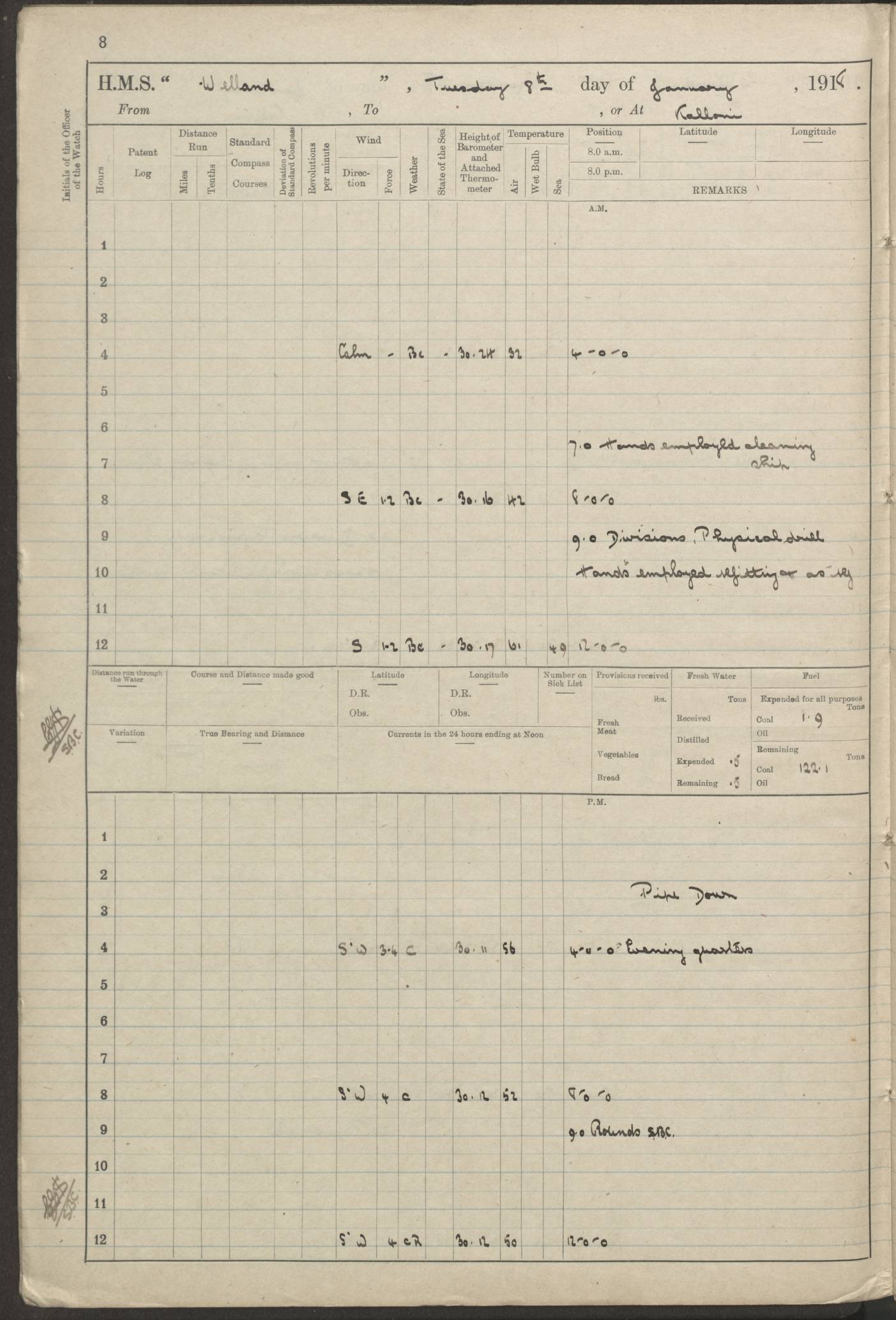 4caf8cadcadfd34197037692: (http://oldweather.s3.amazonaws.com/ADM 53-68366/ADM 53-68366-017_0.jpg) 28 December 1914 Port Said Lat 31.3, Long 32.3 3.15am: Sighted Suez bearing North. 3.55am: Reduced to 7 knots as requisite for Suez. 5.45am: Came to with Starboard anchor off Suez. 6.00am: Hands preparing ship for passage up Canal. 10.30am: Hands employed cleaning guns & small arms. Weighed and proceeded as requisite for passing the Suez Canal. 1.30pm: Hands piped down. 7.05pm: Arrived Port Said. Secured by Starboard anchor & stern to Jetty. 9.00pm: Rounds. 4caf8cadcadfd34197037693: (http://oldweather.s3.amazonaws.com/ADM 53-68366/ADM 53-68366-017_1.jpg) 29 December 1914 Port Said Lat 31.3, Long 32.3 6.00am: Hands employed scrubbing decks & cleaning guns. 8.45am: Hands painting ship. 11.25am: Coal lighters came alongside. Commenced coaling. 1.00pm: Leave to Watch 4.30pm till 6.30pm. 2.00pm: Hands painting ship. 2.10pm: Finished coaling. Received 120 tons. 9.00pm: Rounds. 9.55pm: Russian Cruiser ASKOLD sailed. 4caf8cadcadfd34197037694: (http://oldweather.s3.amazonaws.com/ADM 53-68366/ADM 53-68366-018_0.jpg) 30 December 1914 Port Said to Malta Lat 31.7, Long 31.7 2.30am: Lit up No. 2 & 3 Boilers. 5.15am: Hands employed securing ship for Sea. 6.00am: Pilot came on board. Weighed & proceeded as requisite. 7.15am: Dropped Pilot. Course N 40º W. 9 knots. 9.55am: Damietta Light House bearing S 63º W. 10.00am: Altered course N 74º W. 11.00am: Hands employed cleaning ship & securing gear. 1.00pm: Hands piped down. 5.00pm: Night Defence Stations. Provided ammunition. 4caf8cadcadfd34197037695: (http://oldweather.s3.amazonaws.com/ADM 53-68366/ADM 53-68366-018_1.jpg) 31 December 1914 Port Said to Malta Lat 33.0, Long 27.3 6.15am: Fell out Special Lookouts. Returned ammunition. 7.30am: Formed Divisions Line Ahead to Starboard. Course N 67º W. 9.00am: Hands employed lashing & rigging Splinters Guard & unshipping & clearing away stanchions. 10.10am: Put clocks back 11 minutes. 1.30pm: Hands piped down. 5.5pm: Formed single Line Ahead. Provided ammunition. LOGS FOR JANUARY 1915 4caf8cadcadfd34197037696: (http://oldweather.s3.amazonaws.com/ADM 53-68366/ADM 53-68366-019_0.jpg) 1 January 1915 Port Said to Malta Lat 34.1, Long 22.8 8.30am: Stopped 8.45am: Proceeded. Single line ahead 9.30am: Hands employed making bridge screens 10.18am: Put clocks back 18 minutes 1.30pm: Hands piped down 5.30pm: Formed single line ahead. Provided ammunition. Fresh water: Distilled 1 ton; expended 1 ton; remaining 1.5 tons Fuel: expended for all purposes – coal 22.2 tons; remaining 77.1 tons [A sample complete day’s log] 4caf8cadcadfd34197037697: (http://oldweather.s3.amazonaws.com/ADM 53-68366/ADM 53-68366-019_1.jpg) 2 January 1915 Port Said to Malta Lat 35.2, Long 18.4 7.15am: Hands employed fitting life lines round upper deck 4caf8cadcadfd34197037698: (http://oldweather.s3.amazonaws.com/ADM 53-68366/ADM 53-68366-020_0.jpg) 3 January 1915 Malta Lat 35.9, Long 14.52 6.40am: Fell out special lookouts 10.45am: Secured head and stern at destroyers’ trot Lazaretto Creek 1.00pm: Chelmer shifted billet 4caf8cadcadfd34197037699: (http://oldweather.s3.amazonaws.com/ADM 53-68366/ADM 53-68366-020_1.jpg) 4 January 1915 Malta Lat 35.9, Long 14.52 8.00am: Gave general leave to port watch from 8am to 8am 6th. Coal lighter came alongside. 4caf8cadcadfd3419703769a: (http://oldweather.s3.amazonaws.com/ADM 53-68366/ADM 53-68366-021_0.jpg) 5 January 1915 [6 January in log] Malta Lat 35.9, Long 14.52 4caf8cadcadfd3419703769b: (http://oldweather.s3.amazonaws.com/ADM 53-68366/ADM 53-68366-021_1.jpg) 6 January 1915 Malta Lat 35.9, Long 14.52 12.30pm: Leave to watch from 8am to 8am Friday 4caf8cadcadfd3419703769c: (http://oldweather.s3.amazonaws.com/ADM 53-68366/ADM 53-68366-022_0.jpg) 7 January 1915 Malta Lat 35.9, Long 14.52 4caf8cadcadfd3419703769d: (http://oldweather.s3.amazonaws.com/ADM 53-68366/ADM 53-68366-022_1.jpg) 8 January 1915 Malta Lat 35.9, Long 14.52 6.45am: Hands employed preparing ship for sea 8.30am: Slipped buoy and left Lazaretto Creek. Proceeded as requisite for Grand Harbour. 9.00am: Secured alongside Chelmer at Burmola Wharf, French Creek 4caf8cadcadfd3419703769e: (http://oldweather.s3.amazonaws.com/ADM 53-68366/ADM 53-68366-023_0.jpg) 9 January 1915 Malta Lat 35.9, Long 14.52 8.25am: Hands employed in dockyard and refitting canvas gear 1.15pm: Hands employed returning stores to dockyard 4caf8cadcadfd3419703769f: (http://oldweather.s3.amazonaws.com/ADM 53-68366/ADM 53-68366-023_1.jpg) 10 January 1915 Malta Lat 35.9, Long 14.52 9.30am: Landed church parties 11.30am: Church parties returned 12.25pm: Colne left harbour 4caf8cadcadfd341970376a0: (http://oldweather.s3.amazonaws.com/ADM 53-68366/ADM 53-68366-024_0.jpg) 11 January 1915 Malta Lat 35.9, Long 14.52 8.30am: Sent 2 ratings to hospital 1.30pm: Hands employed refitting fenders Number on sick list: 2 4caf8cadcadfd341970376a1: (http://oldweather.s3.amazonaws.com/ADM 53-68366/ADM 53-68366-024_1.jpg) 12 January 1915 Malta Lat 35.9, Long 14.52 11.00am: Sent 1 rating (sick) to Egmont Number on sick list: 1 4caf8cadcadfd341970376a2: (http://oldweather.s3.amazonaws.com/ADM 53-68366/ADM 53-68366-025_0.jpg) 13 January 1915 Malta Lat 35.9, Long 14.52 10.00am: French battleship Danton docked 4caf8cadcadfd341970376a3: (http://oldweather.s3.amazonaws.com/ADM 53-68366/ADM 53-68366-025_1.jpg) 14 January 1915 Malta Lat 35.9, Long 14.52 6.30am: Hands employed preparing ship for sea 7.30am: Tug came alongside 7.45am: Ship shifted to buoy 8.35am: Commenced swinging for adjustment of compasses 9.30am: Finished swinging 11.30am: One rating rejoined from Egmont 12.10pm: Slipped and proceeded as requisite for leaving Malta, Chelmer and Kennet in company 12.25pm: Set course S87E speed 10 knots 12.35pm: Increased to 12 knots. Hands piped down. 4.00pm: Increased to 13 knots 4.50pm: Night Defence Stations provided ammunition 6.00pm: Placed look-outs 12 midnight: Altered course S88E 4caf8cadcad