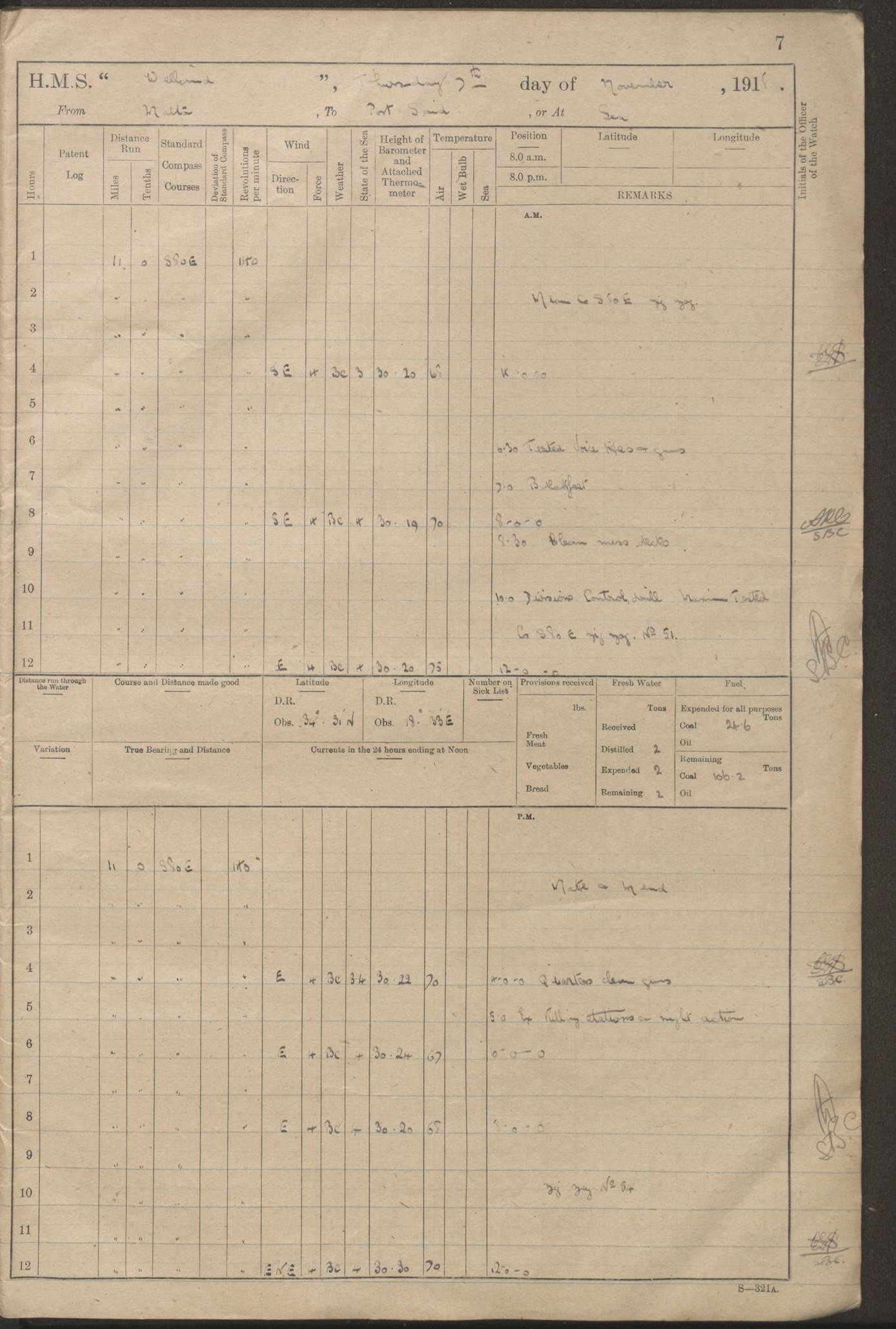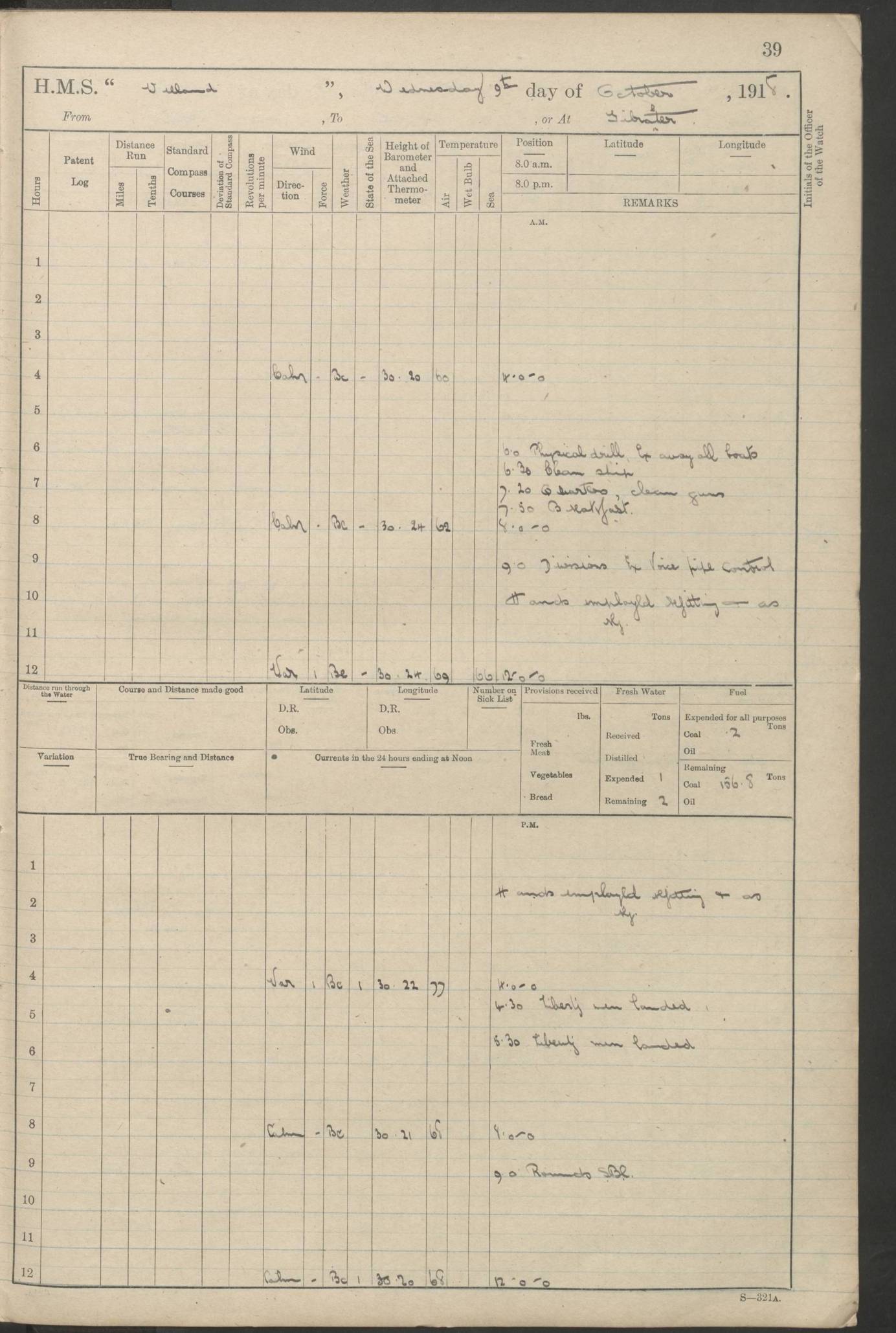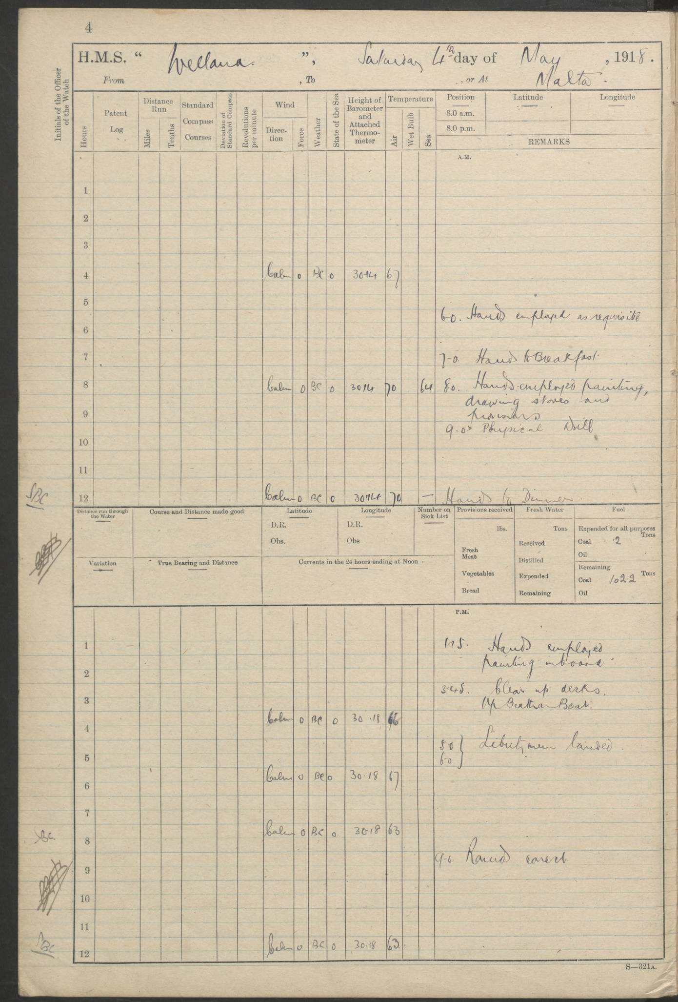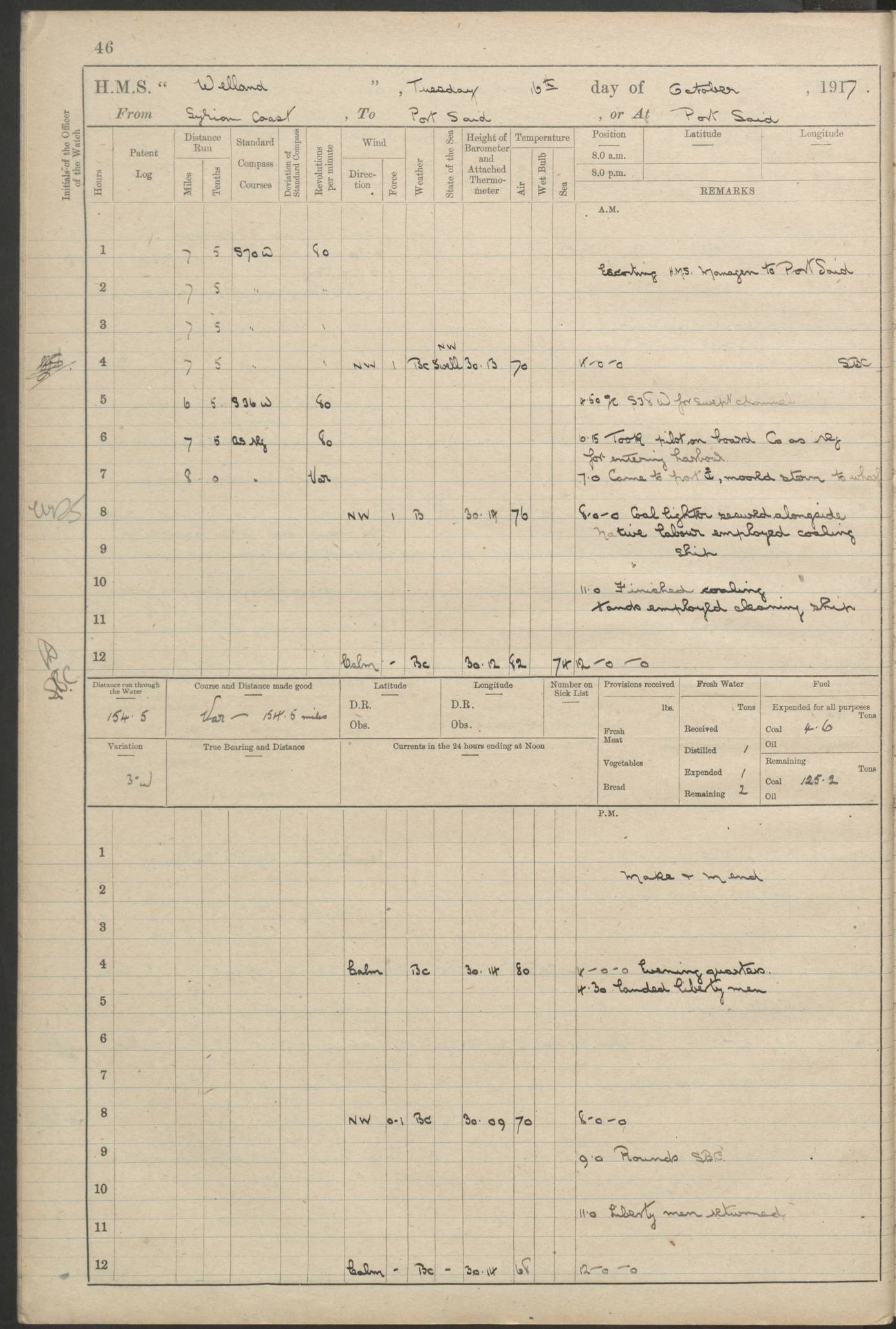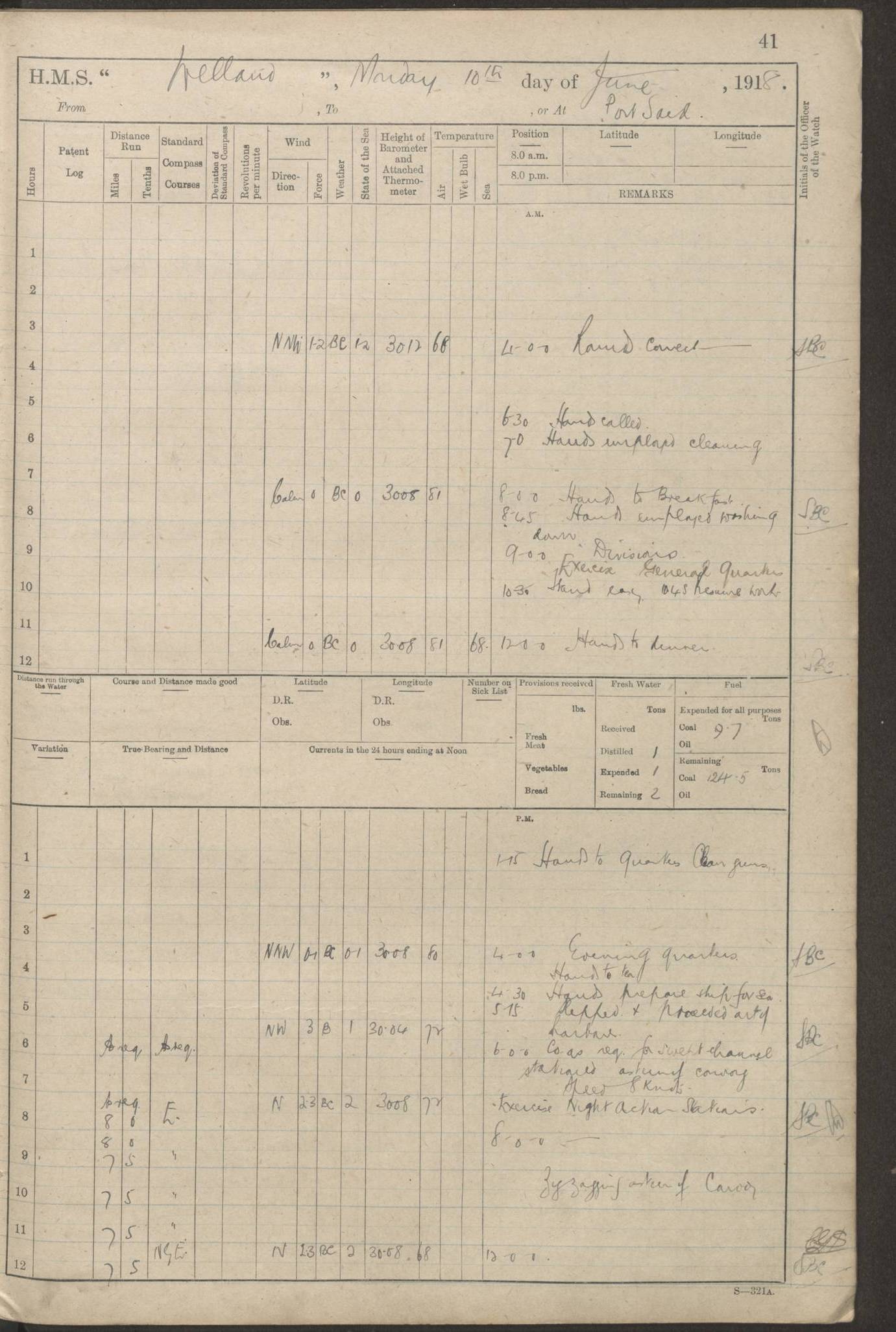 4caf8cadcadfd34197037692: (http://oldweather.s3.amazonaws.com/ADM 53-68366/ADM 53-68366-017_0.jpg) 28 December 1914 Port Said Lat 31.3, Long 32.3 3.15am: Sighted Suez bearing North. 3.55am: Reduced to 7 knots as requisite for Suez. 5.45am: Came to with Starboard anchor off Suez. 6.00am: Hands preparing ship for passage up Canal. 10.30am: Hands employed cleaning guns & small arms. Weighed and proceeded as requisite for passing the Suez Canal. 1.30pm: Hands piped down. 7.05pm: Arrived Port Said. Secured by Starboard anchor & stern to Jetty. 9.00pm: Rounds. 4caf8cadcadfd34197037693: (http://oldweather.s3.amazonaws.com/ADM 53-68366/ADM 53-68366-017_1.jpg) 29 December 1914 Port Said Lat 31.3, Long 32.3 6.00am: Hands employed scrubbing decks & cleaning guns. 8.45am: Hands painting ship. 11.25am: Coal lighters came alongside. Commenced coaling. 1.00pm: Leave to Watch 4.30pm till 6.30pm. 2.00pm: Hands painting ship. 2.10pm: Finished coaling. Received 120 tons. 9.00pm: Rounds. 9.55pm: Russian Cruiser ASKOLD sailed. 4caf8cadcadfd34197037694: (http://oldweather.s3.amazonaws.com/ADM 53-68366/ADM 53-68366-018_0.jpg) 30 December 1914 Port Said to Malta Lat 31.7, Long 31.7 2.30am: Lit up No. 2 & 3 Boilers. 5.15am: Hands employed securing ship for Sea. 6.00am: Pilot came on board. Weighed & proceeded as requisite. 7.15am: Dropped Pilot. Course N 40º W. 9 knots. 9.55am: Damietta Light House bearing S 63º W. 10.00am: Altered course N 74º W. 11.00am: Hands employed cleaning ship & securing gear. 1.00pm: Hands piped down. 5.00pm: Night Defence Stations. Provided ammunition. 4caf8cadcadfd34197037695: (http://oldweather.s3.amazonaws.com/ADM 53-68366/ADM 53-68366-018_1.jpg) 31 December 1914 Port Said to Malta Lat 33.0, Long 27.3 6.15am: Fell out Special Lookouts. Returned ammunition. 7.30am: Formed Divisions Line Ahead to Starboard. Course N 67º W. 9.00am: Hands employed lashing & rigging Splinters Guard & unshipping & clearing away stanchions. 10.10am: Put clocks back 11 minutes. 1.30pm: Hands piped down. 5.5pm: Formed single Line Ahead. Provided ammunition. LOGS FOR JANUARY 1915 4caf8cadcadfd34197037696: (http://oldweather.s3.amazonaws.com/ADM 53-68366/ADM 53-68366-019_0.jpg) 1 January 1915 Port Said to Malta Lat 34.1, Long 22.8 8.30am: Stopped 8.45am: Proceeded. Single line ahead 9.30am: Hands employed making bridge screens 10.18am: Put clocks back 18 minutes 1.30pm: Hands piped down 5.30pm: Formed single line ahead. Provided ammunition. Fresh water: Distilled 1 ton; expended 1 ton; remaining 1.5 tons Fuel: expended for all purposes – coal 22.2 tons; remaining 77.1 tons [A sample complete day’s log] 4caf8cadcadfd34197037697: (http://oldweather.s3.amazonaws.com/ADM 53-68366/ADM 53-68366-019_1.jpg) 2 January 1915 Port Said to Malta Lat 35.2, Long 18.4 7.15am: Hands employed fitting life lines round upper deck 4caf8cadcadfd34197037698: (http://oldweather.s3.amazonaws.com/ADM 53-68366/ADM 53-68366-020_0.jpg) 3 January 1915 Malta Lat 35.9, Long 14.52 6.40am: Fell out special lookouts 10.45am: Secured head and stern at destroyers’ trot Lazaretto Creek 1.00pm: Chelmer shifted billet 4caf8cadcadfd34197037699: (http://oldweather.s3.amazonaws.com/ADM 53-68366/ADM 53-68366-020_1.jpg) 4 January 1915 Malta Lat 35.9, Long 14.52 8.00am: Gave general leave to port watch from 8am to 8am 6th. Coal lighter came alongside. 4caf8cadcadfd3419703769a: (http://oldweather.s3.amazonaws.com/ADM 53-68366/ADM 53-68366-021_0.jpg) 5 January 1915 [6 January in log] Malta Lat 35.9, Long 14.52 4caf8cadcadfd3419703769b: (http://oldweather.s3.amazonaws.com/ADM 53-68366/ADM 53-68366-021_1.jpg) 6 January 1915 Malta Lat 35.9, Long 14.52 12.30pm: Leave to watch from 8am to 8am Friday 4caf8cadcadfd3419703769c: (http://oldweather.s3.amazonaws.com/ADM 53-68366/ADM 53-68366-022_0.jpg) 7 January 1915 Malta Lat 35.9, Long 14.52 4caf8cadcadfd3419703769d: (http://oldweather.s3.amazonaws.com/ADM 53-68366/ADM 53-68366-022_1.jpg) 8 January 1915 Malta Lat 35.9, Long 14.52 6.45am: Hands employed preparing ship for sea 8.30am: Slipped buoy and left Lazaretto Creek. Proceeded as requisite for Grand Harbour. 9.00am: Secured alongside Chelmer at Burmola Wharf, French Creek 4caf8cadcadfd3419703769e: (http://oldweather.s3.amazonaws.com/ADM 53-68366/ADM 53-68366-023_0.jpg) 9 January 1915 Malta Lat 35.9, Long 14.52 8.25am: Hands employed in dockyard and refitting canvas gear 1.15pm: Hands employed returning stores to dockyard 4caf8cadcadfd3419703769f: (http://oldweather.s3.amazonaws.com/ADM 53-68366/ADM 53-68366-023_1.jpg) 10 January 1915 Malta Lat 35.9, Long 14.52 9.30am: Landed church parties 11.30am: Church parties returned 12.25pm: Colne left harbour 4caf8cadcadfd341970376a0: (http://oldweather.s3.amazonaws.com/ADM 53-68366/ADM 53-68366-024_0.jpg) 11 January 1915 Malta Lat 35.9, Long 14.52 8.30am: Sent 2 ratings to hospital 1.30pm: Hands employed refitting fenders Number on sick list: 2 4caf8cadcadfd341970376a1: (http://oldweather.s3.amazonaws.com/ADM 53-68366/ADM 53-68366-024_1.jpg) 12 January 1915 Malta Lat 35.9, Long 14.52 11.00am: Sent 1 rating (sick) to Egmont Number on sick list: 1 4caf8cadcadfd341970376a2: (http://oldweather.s3.amazonaws.com/ADM 53-68366/ADM 53-68366-025_0.jpg) 13 January 1915 Malta Lat 35.9, Long 14.52 10.00am: French battleship Danton docked 4caf8cadcadfd341970376a3: (http://oldweather.s3.amazonaws.com/ADM 53-68366/ADM 53-68366-025_1.jpg) 14 January 1915 Malta Lat 35.9, Long 14.52 6.30am: Hands employed preparing ship for sea 7.30am: Tug came alongside 7.45am: Ship shifted to buoy 8.35am: Commenced swinging for adjustment of compasses 9.30am: Finished swinging 11.30am: One rating rejoined from Egmont 12.10pm: Slipped and proceeded as requisite for leaving Malta, Chelmer and Kennet in company 12.25pm: Set course S87E speed 10 knots 12.35pm: Increased to 12 knots. Hands piped down. 4.00pm: Increased to 13 knots 4.50pm: Night Defence Stations provided ammunition 6.00pm: Placed look-outs 12 midnight: Altered course S88E 4caf8cadcad