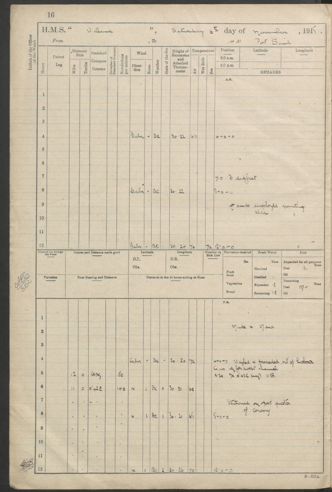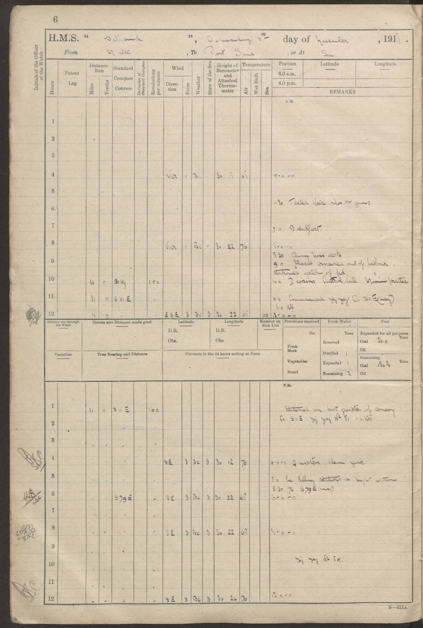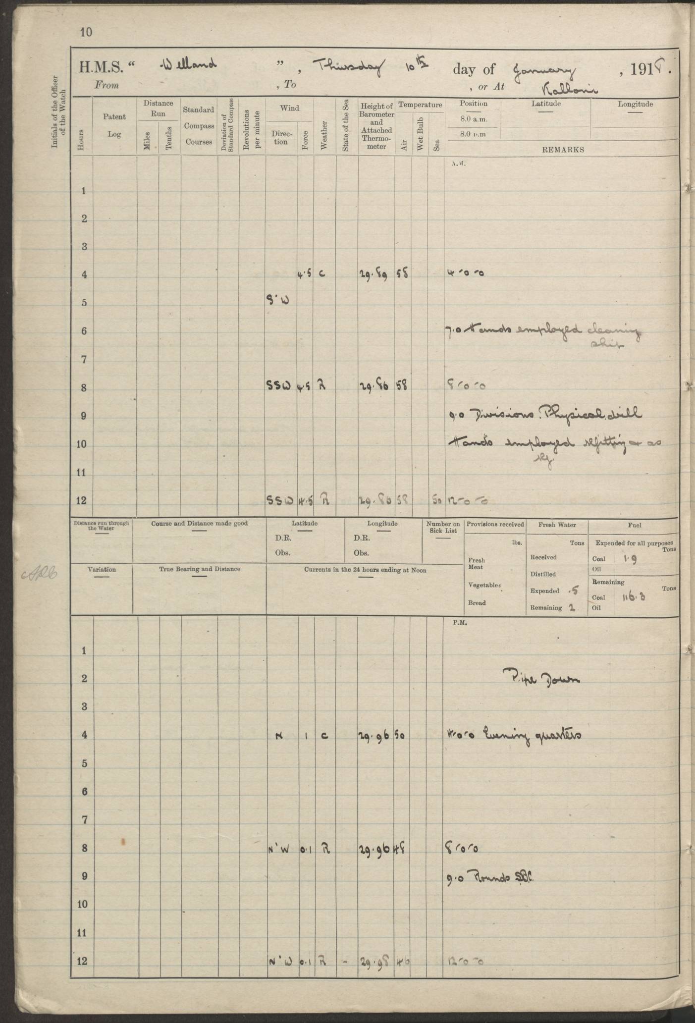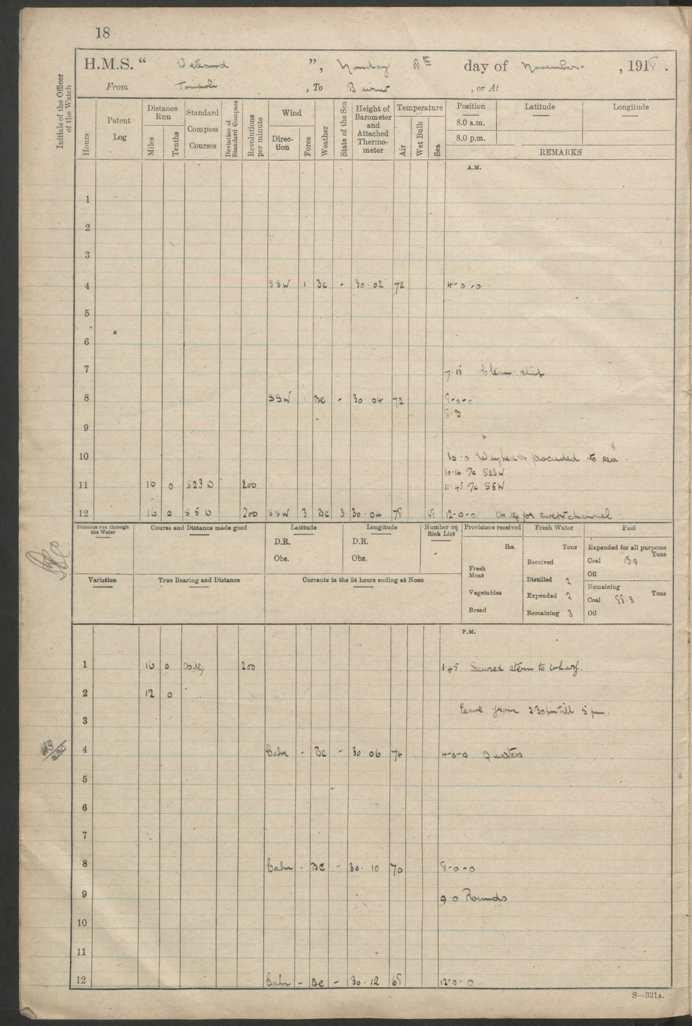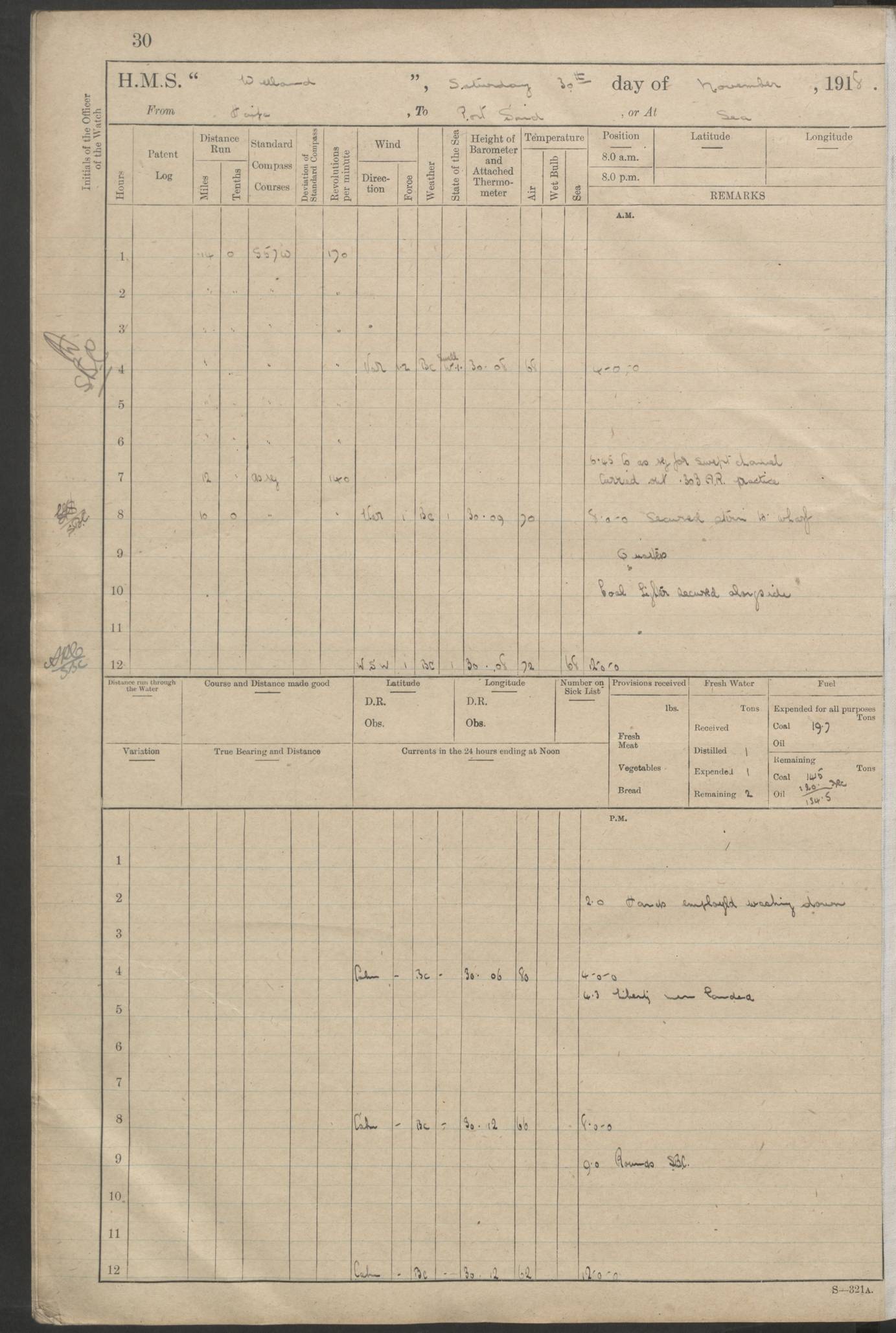 4caf8cadcadfd34197037692: (http://oldweather.s3.amazonaws.com/ADM 53-68366/ADM 53-68366-017_0.jpg) 28 December 1914 Port Said Lat 31.3, Long 32.3 3.15am: Sighted Suez bearing North. 3.55am: Reduced to 7 knots as requisite for Suez. 5.45am: Came to with Starboard anchor off Suez. 6.00am: Hands preparing ship for passage up Canal. 10.30am: Hands employed cleaning guns & small arms. Weighed and proceeded as requisite for passing the Suez Canal. 1.30pm: Hands piped down. 7.05pm: Arrived Port Said. Secured by Starboard anchor & stern to Jetty. 9.00pm: Rounds. 4caf8cadcadfd34197037693: (http://oldweather.s3.amazonaws.com/ADM 53-68366/ADM 53-68366-017_1.jpg) 29 December 1914 Port Said Lat 31.3, Long 32.3 6.00am: Hands employed scrubbing decks & cleaning guns. 8.45am: Hands painting ship. 11.25am: Coal lighters came alongside. Commenced coaling. 1.00pm: Leave to Watch 4.30pm till 6.30pm. 2.00pm: Hands painting ship. 2.10pm: Finished coaling. Received 120 tons. 9.00pm: Rounds. 9.55pm: Russian Cruiser ASKOLD sailed. 4caf8cadcadfd34197037694: (http://oldweather.s3.amazonaws.com/ADM 53-68366/ADM 53-68366-018_0.jpg) 30 December 1914 Port Said to Malta Lat 31.7, Long 31.7 2.30am: Lit up No. 2 & 3 Boilers. 5.15am: Hands employed securing ship for Sea. 6.00am: Pilot came on board. Weighed & proceeded as requisite. 7.15am: Dropped Pilot. Course N 40º W. 9 knots. 9.55am: Damietta Light House bearing S 63º W. 10.00am: Altered course N 74º W. 11.00am: Hands employed cleaning ship & securing gear. 1.00pm: Hands piped down. 5.00pm: Night Defence Stations. Provided ammunition. 4caf8cadcadfd34197037695: (http://oldweather.s3.amazonaws.com/ADM 53-68366/ADM 53-68366-018_1.jpg) 31 December 1914 Port Said to Malta Lat 33.0, Long 27.3 6.15am: Fell out Special Lookouts. Returned ammunition. 7.30am: Formed Divisions Line Ahead to Starboard. Course N 67º W. 9.00am: Hands employed lashing & rigging Splinters Guard & unshipping & clearing away stanchions. 10.10am: Put clocks back 11 minutes. 1.30pm: Hands piped down. 5.5pm: Formed single Line Ahead. Provided ammunition. LOGS FOR JANUARY 1915 4caf8cadcadfd34197037696: (http://oldweather.s3.amazonaws.com/ADM 53-68366/ADM 53-68366-019_0.jpg) 1 January 1915 Port Said to Malta Lat 34.1, Long 22.8 8.30am: Stopped 8.45am: Proceeded. Single line ahead 9.30am: Hands employed making bridge screens 10.18am: Put clocks back 18 minutes 1.30pm: Hands piped down 5.30pm: Formed single line ahead. Provided ammunition. Fresh water: Distilled 1 ton; expended 1 ton; remaining 1.5 tons Fuel: expended for all purposes – coal 22.2 tons; remaining 77.1 tons [A sample complete day’s log] 4caf8cadcadfd34197037697: (http://oldweather.s3.amazonaws.com/ADM 53-68366/ADM 53-68366-019_1.jpg) 2 January 1915 Port Said to Malta Lat 35.2, Long 18.4 7.15am: Hands employed fitting life lines round upper deck 4caf8cadcadfd34197037698: (http://oldweather.s3.amazonaws.com/ADM 53-68366/ADM 53-68366-020_0.jpg) 3 January 1915 Malta Lat 35.9, Long 14.52 6.40am: Fell out special lookouts 10.45am: Secured head and stern at destroyers’ trot Lazaretto Creek 1.00pm: Chelmer shifted billet 4caf8cadcadfd34197037699: (http://oldweather.s3.amazonaws.com/ADM 53-68366/ADM 53-68366-020_1.jpg) 4 January 1915 Malta Lat 35.9, Long 14.52 8.00am: Gave general leave to port watch from 8am to 8am 6th. Coal lighter came alongside. 4caf8cadcadfd3419703769a: (http://oldweather.s3.amazonaws.com/ADM 53-68366/ADM 53-68366-021_0.jpg) 5 January 1915 [6 January in log] Malta Lat 35.9, Long 14.52 4caf8cadcadfd3419703769b: (http://oldweather.s3.amazonaws.com/ADM 53-68366/ADM 53-68366-021_1.jpg) 6 January 1915 Malta Lat 35.9, Long 14.52 12.30pm: Leave to watch from 8am to 8am Friday 4caf8cadcadfd3419703769c: (http://oldweather.s3.amazonaws.com/ADM 53-68366/ADM 53-68366-022_0.jpg) 7 January 1915 Malta Lat 35.9, Long 14.52 4caf8cadcadfd3419703769d: (http://oldweather.s3.amazonaws.com/ADM 53-68366/ADM 53-68366-022_1.jpg) 8 January 1915 Malta Lat 35.9, Long 14.52 6.45am: Hands employed preparing ship for sea 8.30am: Slipped buoy and left Lazaretto Creek. Proceeded as requisite for Grand Harbour. 9.00am: Secured alongside Chelmer at Burmola Wharf, French Creek 4caf8cadcadfd3419703769e: (http://oldweather.s3.amazonaws.com/ADM 53-68366/ADM 53-68366-023_0.jpg) 9 January 1915 Malta Lat 35.9, Long 14.52 8.25am: Hands employed in dockyard and refitting canvas gear 1.15pm: Hands employed returning stores to dockyard 4caf8cadcadfd3419703769f: (http://oldweather.s3.amazonaws.com/ADM 53-68366/ADM 53-68366-023_1.jpg) 10 January 1915 Malta Lat 35.9, Long 14.52 9.30am: Landed church parties 11.30am: Church parties returned 12.25pm: Colne left harbour 4caf8cadcadfd341970376a0: (http://oldweather.s3.amazonaws.com/ADM 53-68366/ADM 53-68366-024_0.jpg) 11 January 1915 Malta Lat 35.9, Long 14.52 8.30am: Sent 2 ratings to hospital 1.30pm: Hands employed refitting fenders Number on sick list: 2 4caf8cadcadfd341970376a1: (http://oldweather.s3.amazonaws.com/ADM 53-68366/ADM 53-68366-024_1.jpg) 12 January 1915 Malta Lat 35.9, Long 14.52 11.00am: Sent 1 rating (sick) to Egmont Number on sick list: 1 4caf8cadcadfd341970376a2: (http://oldweather.s3.amazonaws.com/ADM 53-68366/ADM 53-68366-025_0.jpg) 13 January 1915 Malta Lat 35.9, Long 14.52 10.00am: French battleship Danton docked 4caf8cadcadfd341970376a3: (http://oldweather.s3.amazonaws.com/ADM 53-68366/ADM 53-68366-025_1.jpg) 14 January 1915 Malta Lat 35.9, Long 14.52 6.30am: Hands employed preparing ship for sea 7.30am: Tug came alongside 7.45am: Ship shifted to buoy 8.35am: Commenced swinging for adjustment of compasses 9.30am: Finished swinging 11.30am: One rating rejoined from Egmont 12.10pm: Slipped and proceeded as requisite for leaving Malta, Chelmer and Kennet in company 12.25pm: Set course S87E speed 10 knots 12.35pm: Increased to 12 knots. Hands piped down. 4.00pm: Increased to 13 knots 4.50pm: Night Defence Stations provided ammunition 6.00pm: Placed look-outs 12 midnight: Altered course S88E 4caf8cadcad